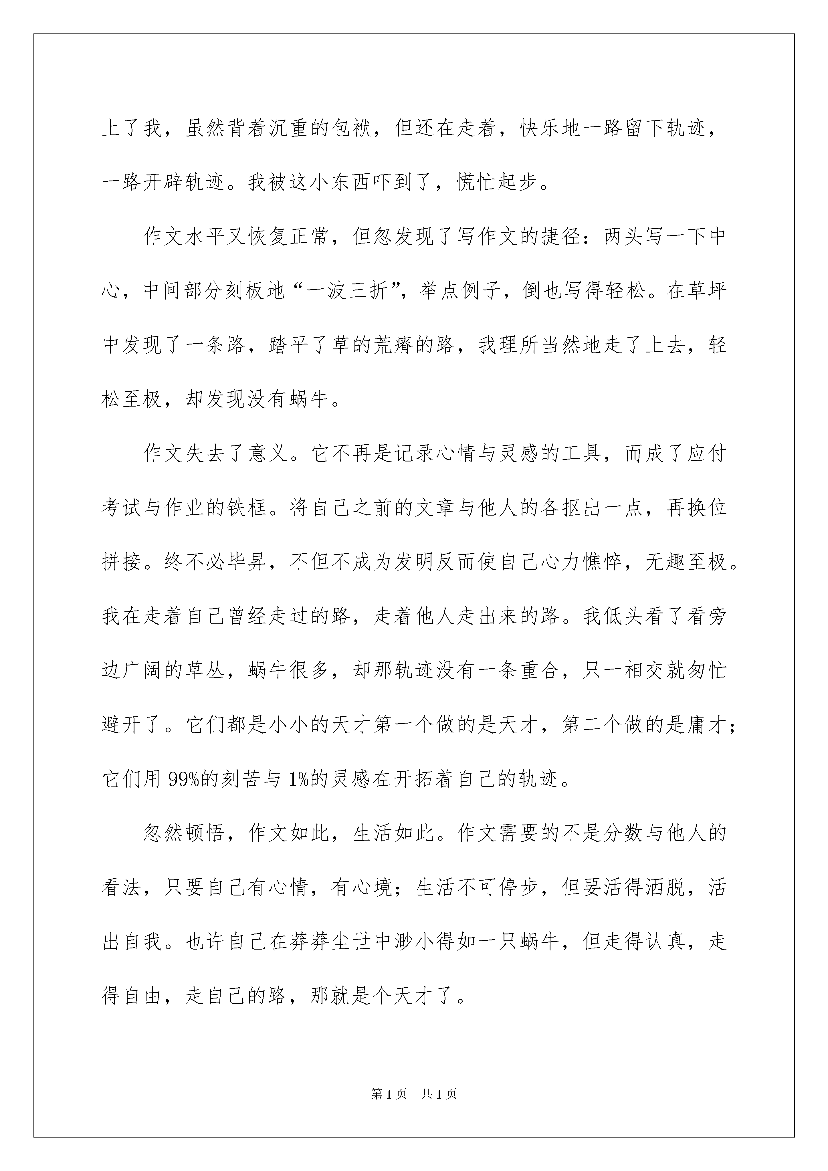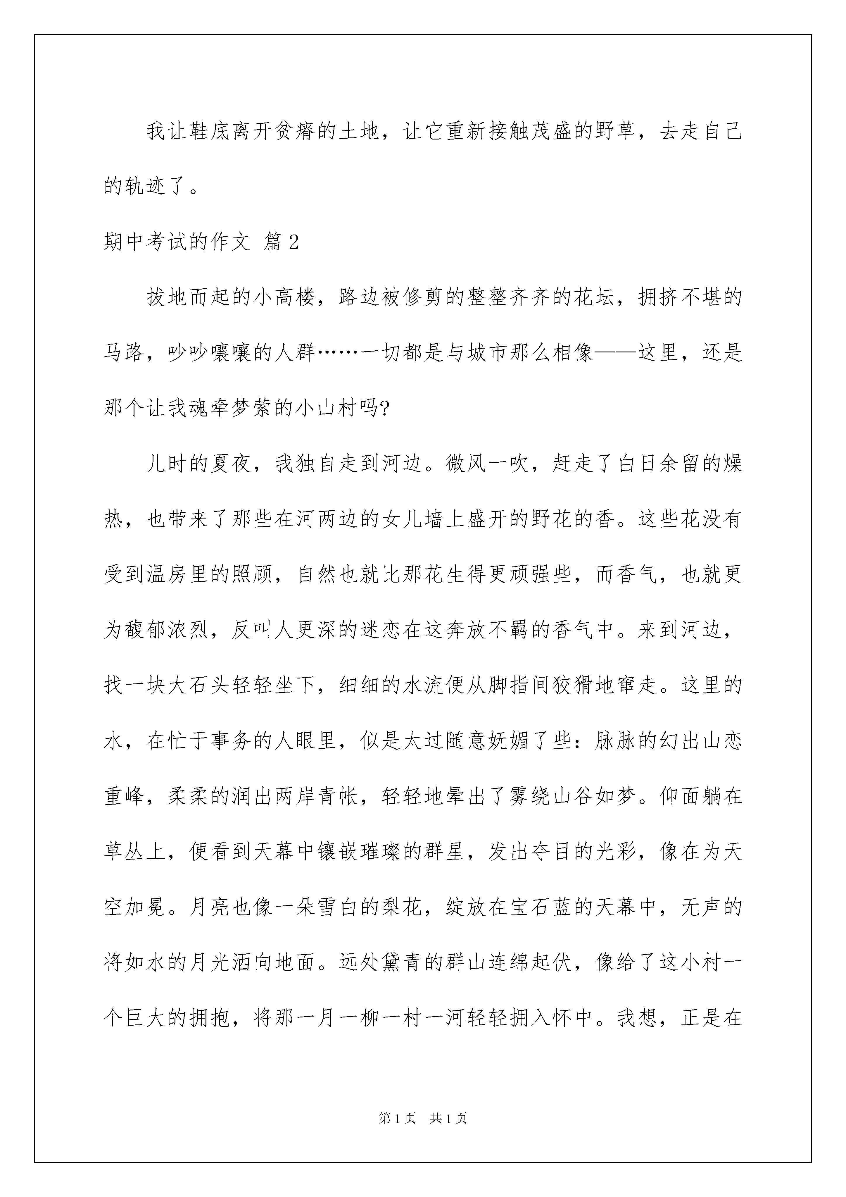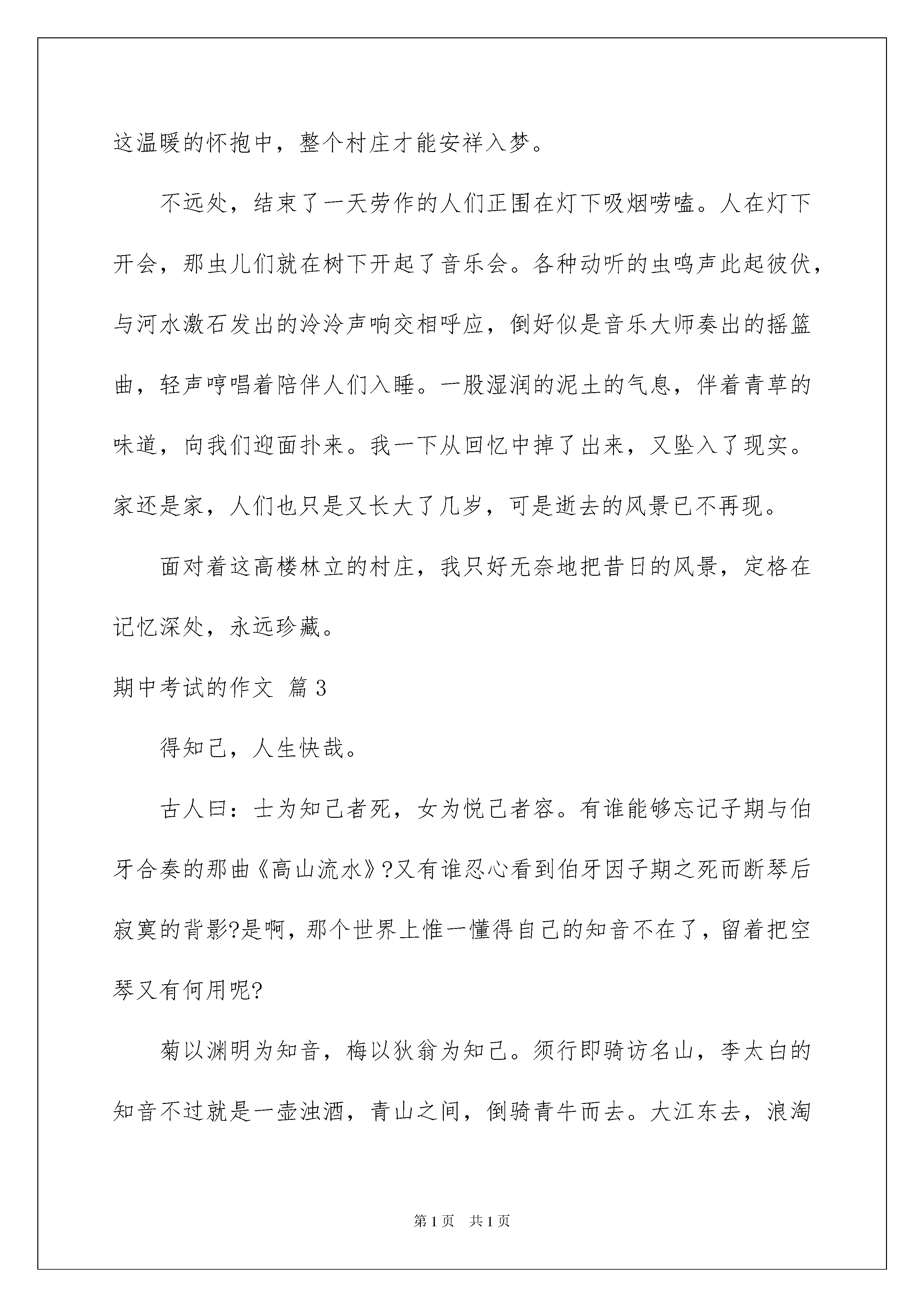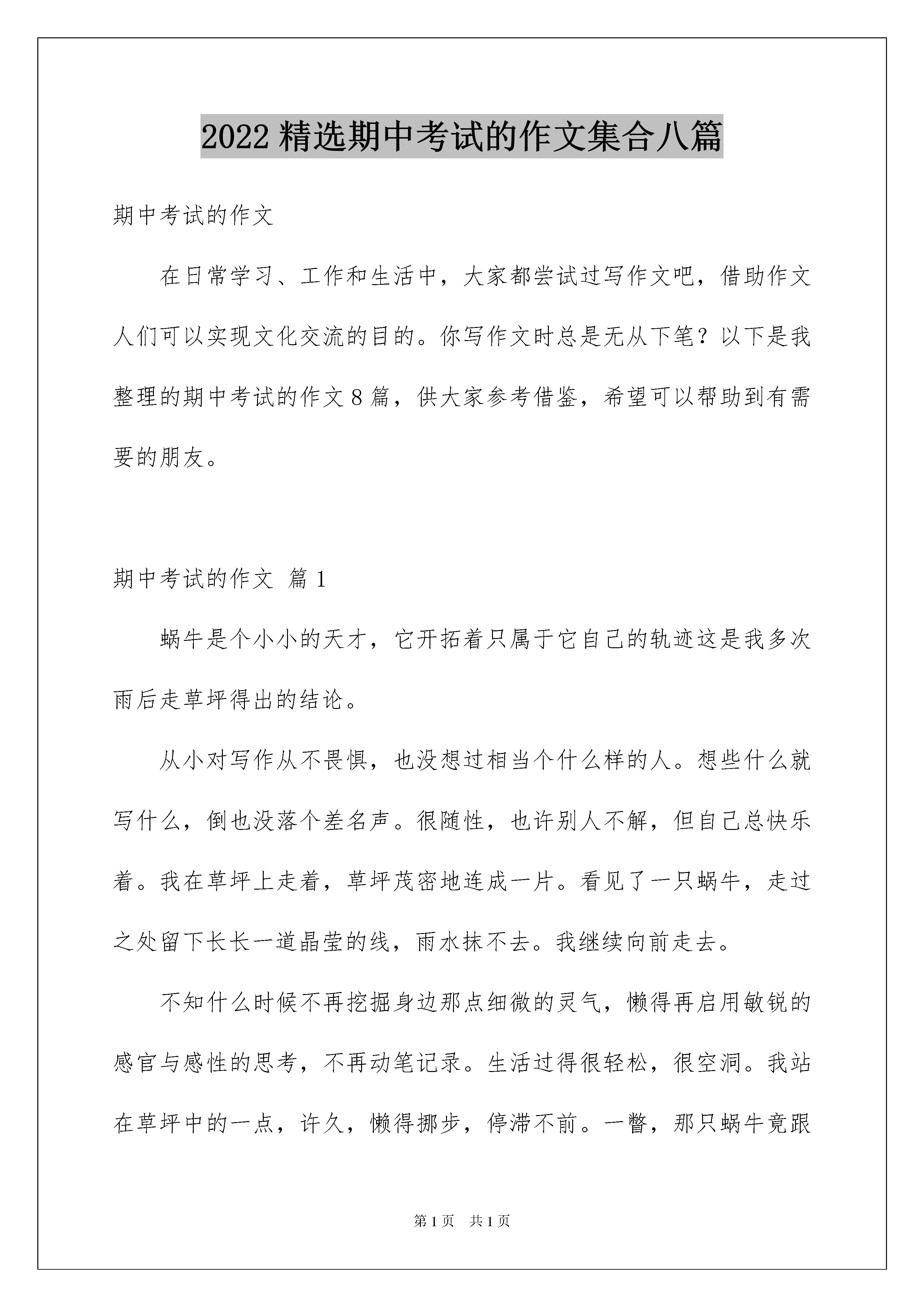 2022精选期中考试的作文集合八篇期中考试的作文在日常学习、工作和生活中,大家都尝试过写作文吧,借助作文人们可以实现文化交流的目的。你写作文时总是无从下笔?以下是我整理的期中考试的作文8篇,供大家参考借鉴,希望可以帮助到有需要的朋友。期中考试的作文篇1蜗牛是个小小的天才,它开拓着只属于它自己的轨迹这是我多次雨后走草坪得出的结论。从小对写作从不畏惧,也没想过相当个什么样的人。想些什么就写什么,倒也没落个差名声。很随性,也许别人不解,但自己总快乐着。我在草坪上走着,草坪茂密地连成一片。看见了一只蜗牛,走过之处留下长长一道晶莹的线,雨水抹不去。我继续向前走去。不知什么时候不再挖掘身边那点细微的灵气,懒得再启用敏锐的感官与感性的思考,不再动笔记录。生活过得很轻松,很空洞。我站在草坪中的一点,许久,懒得挪步,停滞不前。一瞥,那只蜗牛竟跟上了我,虽然背着沉重的包袱,但还在走着,快乐地一路留下轨迹,一路开辟轨迹。我被这小东西吓到了,慌忙起步。作文水平又恢复正常,但忽发现了写作文的捷径:两头写一下中心,中间部分刻板地“一波三折”,举点例子,倒也写得轻松。在草坪中发现了一条路,踏平了草的荒瘠的路,我理所当然地走了上去,轻松至极,却发现没有蜗牛。作文失去了意义。它不再是记录心情与灵感的工具,而成了应付考试与作业的铁框。将自己之前的文章与他人的各抠出一点,再换位拼接。终不必毕昇,不但不成为发明反而使自己心力憔悴,无趣至极。我在走着自己曾经走过的路,走着他人走出来的路。我低头看了看旁边广阔的草丛,蜗牛很多,却那轨迹没有一条重合,只一相交就匆忙避开了。它们都是小小的天才第一个做的是天才,第二个做的是庸才;它们用99%的刻苦与1%的灵感在开拓着自己的轨迹。忽然顿悟,作文如此,生活如此。作文需要的不是分数与他人的看法,只要自己有心情,有心境;生活不可停步,但要活得洒脱,活出自我。也许自己在莽莽尘世中渺小得如一只蜗牛,但走得认真,走得自由,走自己的路,那就是个天才了。我让鞋底离开贫瘠的土地,让它重新接触茂盛的野草,去走自己的轨迹了。期中考试的作文篇2拔地而起的小高楼,路边被修剪的整整齐齐的花坛,拥挤不堪的马路,吵吵嚷嚷的人群……一切都是与城市那么相像——这里,还是那个让我魂牵梦萦的小山村吗?儿时的夏夜,我独自走到河边。微风一吹,赶走了白日余留的燥热,也带来了那些在河两边的女儿墙上盛开的野花的香。这些花没有受到温房里的照顾,自然也就比那花生得更顽强些,而香气,也就更为馥郁浓烈,反叫人更深的迷恋在这奔放不羁的香气中。来到河边,找一块大石头轻轻坐下,细细的水流便从脚指间狡猾地窜走。这里的水,在忙于事务的人眼里,似是太过随意妩媚了些:脉脉的幻出山恋重峰,柔柔的润出两岸青帐,轻轻地晕出了雾绕山谷如梦。仰面躺在草丛上,便看到天幕中镶嵌璀璨的群星,发出夺目的光彩,像在为天空加冕。月亮也像一朵雪白的梨花,绽放在宝石蓝的天幕中,无声的将如水的月光洒向地面。远处黛青的群山连绵起伏,像给了这小村一个巨大的拥抱,将那一月一柳一村一河轻轻拥入怀中。我想,正是在这温暖的怀抱中,整个村庄才能安祥入梦。不远处,结束了一天劳作的人们正围在灯下吸烟唠嗑。人在灯下开会,那虫儿们就在树下开起了音乐会。各种动听的虫鸣声此起彼伏,与河水激石发出的泠泠声响交相呼应,倒好似是音乐大师奏出的摇篮曲,轻声哼唱着陪伴人们入睡。一股湿润的泥土的气息,伴着青草的味道,向我们迎面扑来。我一下从回忆中掉了出来,又坠入了现实。家还是家,人们也只是又长大了几岁,可是逝去的风景已不再现。面对着这高楼林立的村庄,我只好无奈地把昔日的风景,定格在记忆深处,永远珍藏。期中考试的作文篇3得知己,人生快哉。古人曰:士为知己者死,女为悦己者容。有谁能够忘记子期与伯牙合奏的那曲《高山流水》?又有谁忍心看到伯牙因子期之死而断琴后寂寞的背影?是啊,那个世界上惟一懂得自己的知音不在了,留着把空琴又有何用呢?菊以渊明为知音,梅以狄翁为知己。须行即骑访名山,李太白的知音不过就是一壶浊酒,青山之间,倒骑青牛而去。大江东去,浪淘尽千古风流人物,赤壁的知己是那“羽扇纶巾,谈笑间强虞灰飞烟灭”的周郎,这种穿越了时空的伟大心灵的对话,我仿佛可以听到这之中的那股巨大的失鸣声,无独有偶,忧国忧民的范仲淹,他的知己是那“先天下之忧而忧,后天下之乐而乐”的古代仁人志士,时空,从来都不是知音间可造成屏障的阻碍。但人生得一知己,何其难也!庄子笔下的鹏,即便是有着飞向苍穹的雄心壮志,但在面临蜩与学鸠的不解与嘲笑时,它仍是注定要遵行一场自己的圆舞曲,所谓高处不胜寒,得不到知音的鹏也许可以撑得住这种曲高和寡的孤独之旅吧!