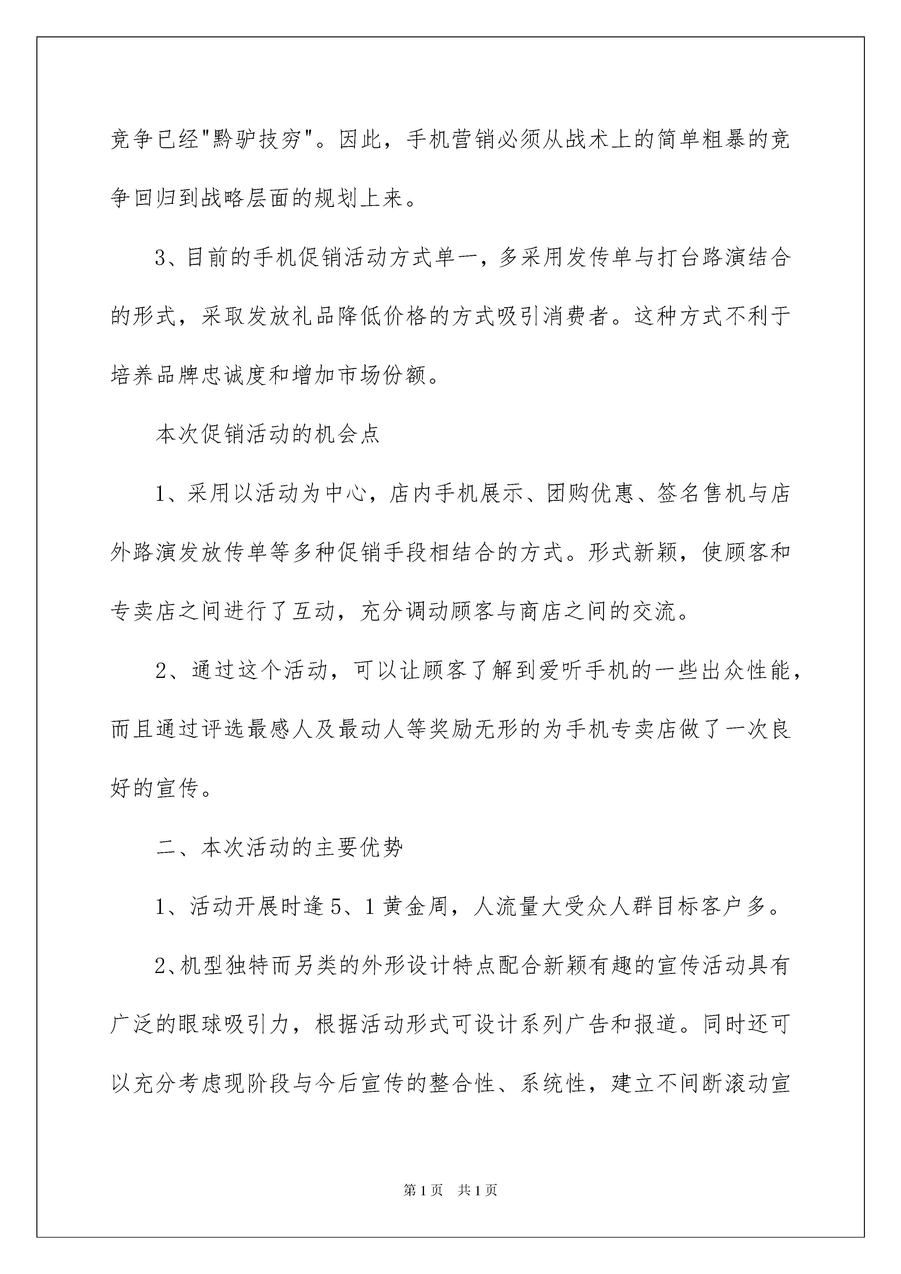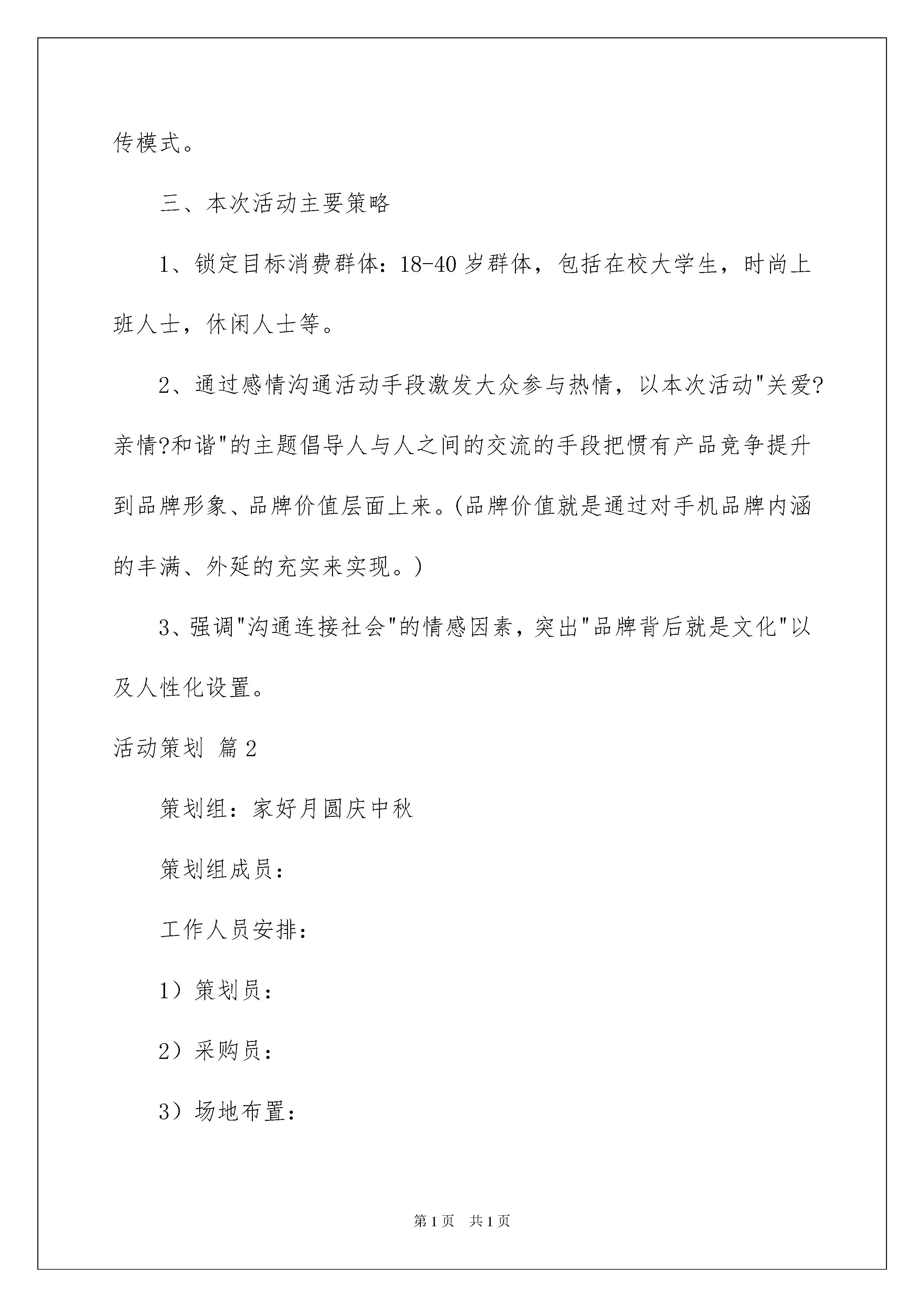 2022精选活动策划范文6篇精选活动策划范文6篇活动策划篇1第一部分:活动概况一、活动背景分析如果说若干年前的手机市场就是成功多失败少,而且还造就了许多"奇迹"的话,那么如今的手机市场则已经接近饱和状态,手机行业就是中国目前竞争度最高的行业之一。不包括黑手机,正常渠道中销售的手机就有1200多款,价格战已大大压缩了手机行业参与者(包括厂商、渠道商、零售商)的平均利润,投资人士也早已将这一行业列入高风险行业。要想在五一黄金周突出重围,抢占市场分额上演经典之战可谓难之又难。但我们大可不必为手机的营销过度担忧,随着社会的进步科技的发展,通讯产业蓬勃发展十几年的营销培育了广大消费者对手机的需求,有需求就会有市场。二、活动时间xx年5月1日--7日(暂定)三、活动地点终端销售店铺及门前搭台演出。四、活动方式实行柜台手机展示、团购优惠、签名售机与店外路演发放传单相结合的方式。五、活动主题爱怎么听就怎么听,绚出你自己。喜欢她/他就要让她/他听见。爱听也爱做,彩铃创作先锋。第二部分:活动分析及策略一、手机促销活动现状评述目前知名手机促销现主要存在的问题:1、目前手机品牌系列发展宣传已经到达一个品牌成熟期,如果宣传重点不及时调整,将面临广告信息老化,单调重复,受众注意力、关注程度和兴趣点都会改变的困境,同时,广告有效率下降,造成广告费的浪费。2、目前的营销方式基本上停留在战术层面,例如广告战、促销战、产品开发战、渠道战等等。从目前中国消费者的角度看,战术层面的竞争已经"黔驴技穷"。因此,手机营销必须从战术上的简单粗暴的竞争回归到战略层面的规划上来。3、目前的手机促销活动方式单一,多采用发传单与打台路演结合的形式,采取发放礼品降低价格的方式吸引消费者。这种方式不利于培养品牌忠诚度和增加市场份额。本次促销活动的机会点1、采用以活动为中心,店内手机展示、团购优惠、签名售机与店外路演发放传单等多种促销手段相结合的方式。形式新颖,使顾客和专卖店之间进行了互动,充分调动顾客与商店之间的交流。2、通过这个活动,可以让顾客了解到爱听手机的一些出众性能,而且通过评选最感人及最动人等奖励无形的为手机专卖店做了一次良好的宣传。二、本次活动的主要优势1、活动开展时逢5、1黄金周,人流量大受众人群目标客户多。2、机型独特而另类的外形设计特点配合新颖有趣的宣传活动具有广泛的眼球吸引力,根据活动形式可设计系列广告和报道。同时还可以充分考虑现阶段与今后宣传的整合性、系统性,建立不间断滚动宣传模式。三、本次活动主要策略1、锁定目标消费群体:18-40岁群体,包括在校大学生,时尚上班人士,休闲人士等。2、通过感情沟通活动手段激发大众参与热情,以本次活动"关爱?亲情?和谐"的主题倡导人与人之间的交流的手段把惯有产品竞争提升到品牌形象、品牌价值层面上来。(品牌价值就是通过对手机品牌内涵的丰满、外延的充实来实现。)3、强调"沟通连接社会"的情感因素,突出"品牌背后就是文化"以及人性化设置。活动策划篇2策划组:家好月圆庆中秋策划组成员:工作人员安排:1)策划员:2)采购员:3)场地布置:4)后勤员:月是民族、家庭幸福的象征,中秋节活动策划方案。自古以来,中秋节不仅是小家团圆的日子,更是举国欢庆的时刻。从时令上看,中秋是“秋收节”。从渊源上看,我国古代就有春祭日、秋祭月的礼制,中秋又叫“祭月节”。祭月的风俗始于魏晋,盛于唐宋,甚至被定为国节,烧斗香、放天灯、走月亮、舞火龙……中秋活动极大地丰富了起来。一个民族把宇宙天象最完美的时刻与农事巧妙结合,把月圆之夜作为举国同庆的节日,使得原本纯粹的自然现象有了丰富的人文寓意。文化是月的魂。我们不但要让传统文化植根于市场沃土中,还要不断赋予“中秋望月”新的时代内涵,重新找回“中秋望月”的时代感觉。今年的中秋节,我院为在校师生打造了“中秋望月”的平台。为此,我们设计了一个活动方案。内容如下:1、活动主题:“浓情中秋,情系火炬”2、活动目的:让全院的师生们都感受到节日的浓厚氛围,以及家庭的温暖。3、活动时间:零九年农历八月十五晚上(7点30分到9点45分)4、活动地点:院图书馆喷池广场5、主承办单位:经济管理系07级商务英语专业6、参与对象:全院师生活动的整体构思(活动的板块、各个板块的主题、基调等)活动形式:聚会+自助餐环境的布置:场地布置主要围着喷池进行,大致的布置情况如下:聚会地点选在图书馆的喷池广场上进行,场地分为7个部分,分别是主席台(包括唱歌场地)、喷池、餐台A和餐台B(三米长)、工作后台和游戏场地橘子灯、猜灯谜和“你信任我吗?”。场地布置饰品有横幅、灯笼、气球、丝带。以图示意:图书馆校