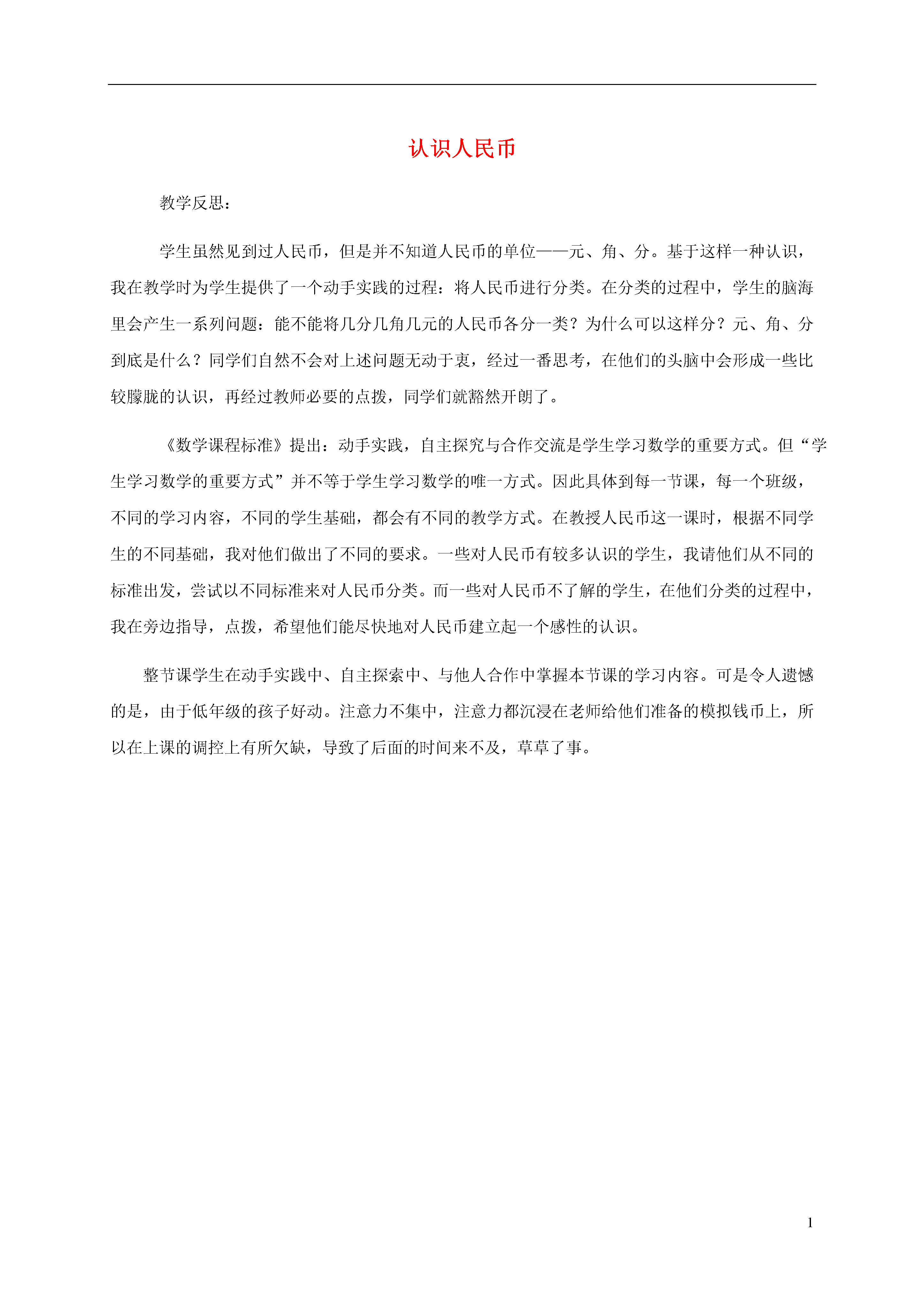 1认识人民币教学反思:学生虽然见到过人民币,但是并不知道人民币的单位——元、角、分。基于这样一种认识,我在教学时为学生提供了一个动手实践的过程:将人民币进行分类。在分类的过程中,学生的脑海里会产生一系列问题:能不能将几分几角几元的人民币各分一类?为什么可以这样分?元、角、分到底是什么?同学们自然不会对上述问题无动于衷,经过一番思考,在他们的头脑中会形成一些比较朦胧的认识,再经过教师必要的点拨,同学们就豁然开朗了。《数学课程标准》提出:动手实践,自主探究与合作交流是学生学习数学的重要方式。但“学生学习数学的重要方式”并不等于学生学习数学的唯一方式。因此具体到每一节课,每一个班级,不同的学习内容,不同的学生基础,都会有不同的教学方式。在教授人民币这一课时,根据不同学生的不同基础,我对他们做出了不同的要求。一些对人民币有较多认识的学生,我请他们从不同的标准出发,尝试以不同标准来对人民币分类。而一些对人民币不了解的学生,在他们分类的过程中,我在旁边指导,点拨,希望他们能尽快地对人民币建立起一个感性的认识。整节课学生在动手实践中、自主探索中、与他人合作中掌握本节课的学习内容。可是令人遗憾的是,由于低年级的孩子好动。注意力不集中,注意力都沉浸在老师给他们准备的模拟钱币上,所以在上课的调控上有所欠缺,导致了后面的时间来不及,草草了事。