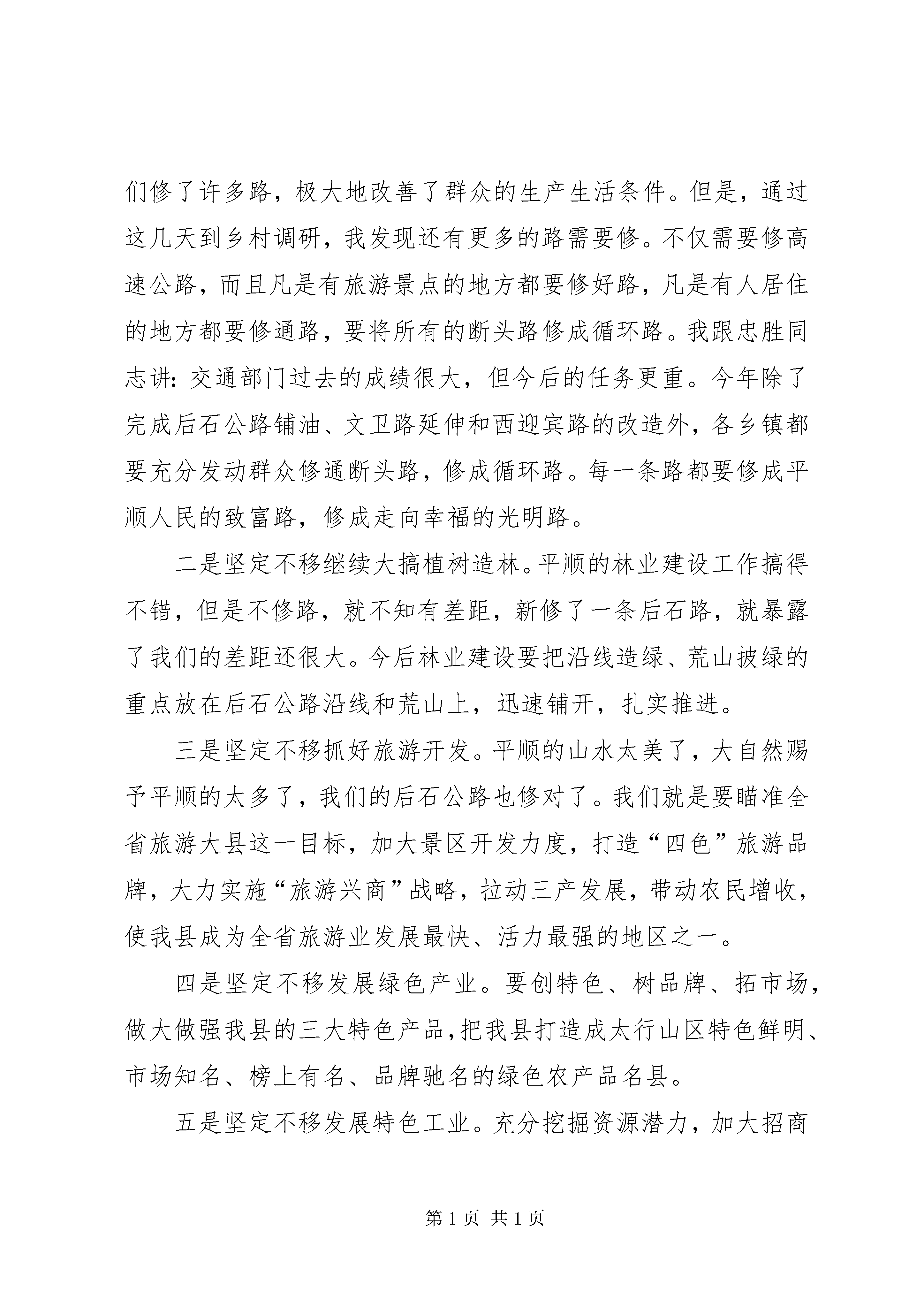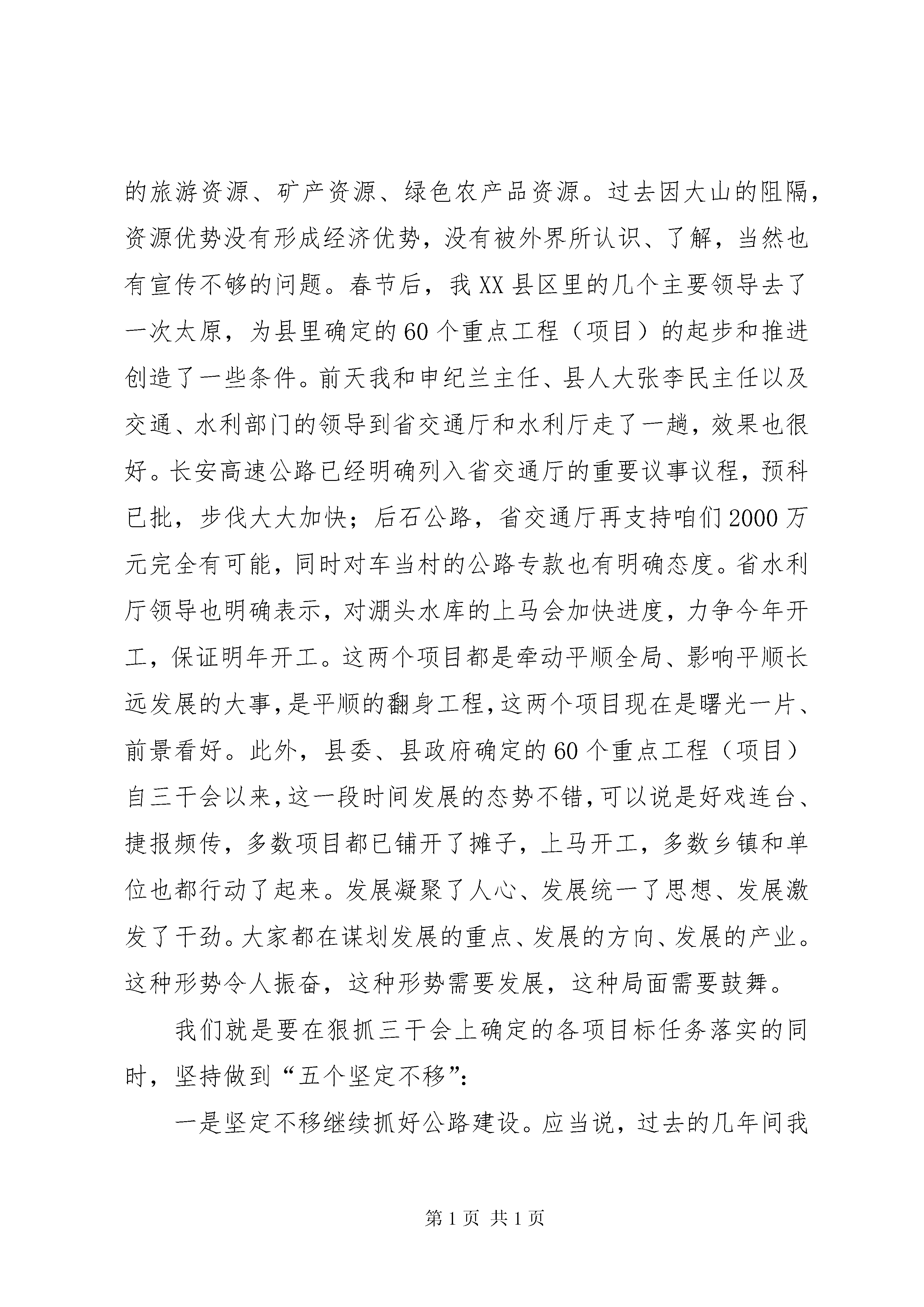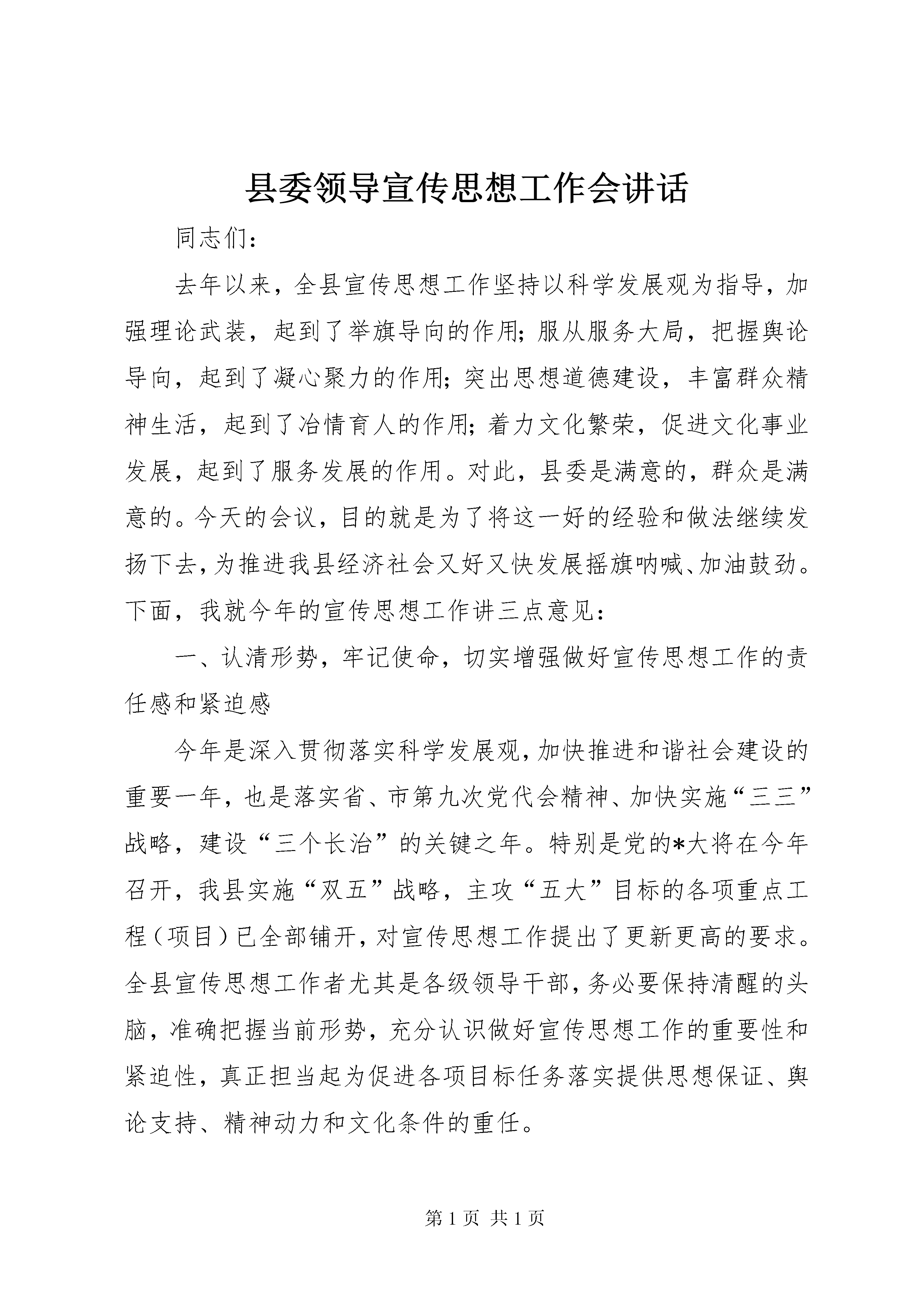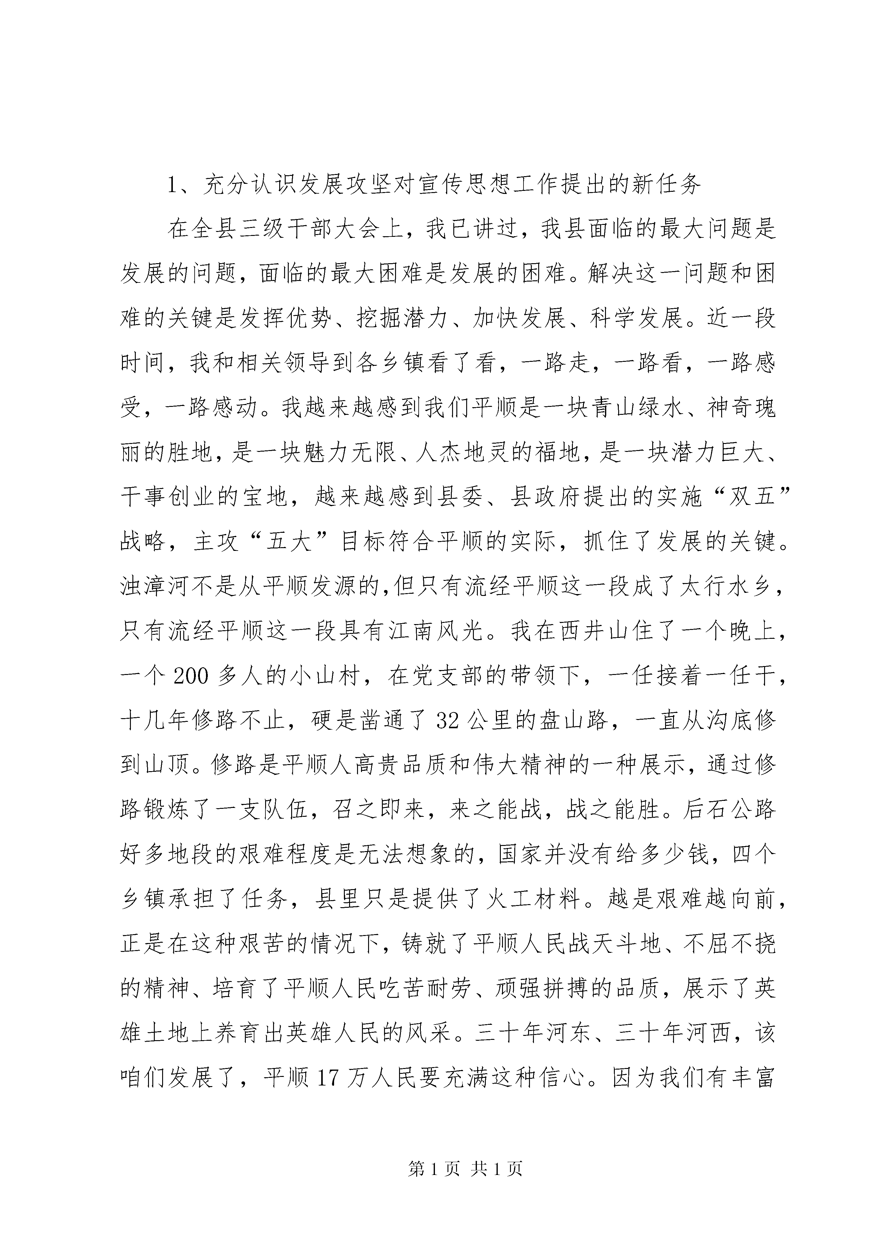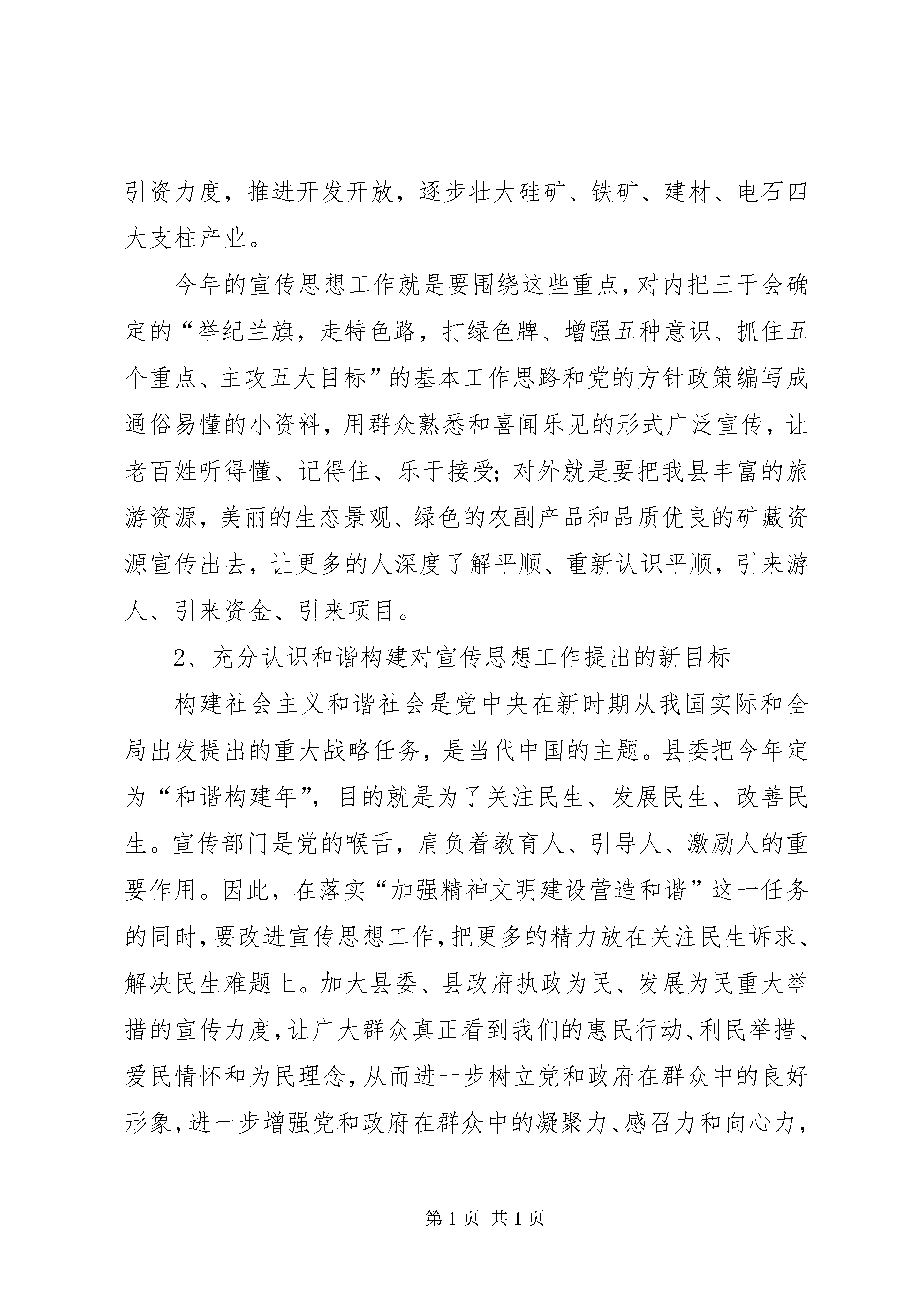 县委领导宣传思想工作会讲话同志们:去年以来,全县宣传思想工作坚持以科学发展观为指导,加强理论武装,起到了举旗导向的作用;服从服务大局,把握舆论导向,起到了凝心聚力的作用;突出思想道德建设,丰富群众精神生活,起到了冶情育人的作用;着力文化繁荣,促进文化事业发展,起到了服务发展的作用。对此,县委是满意的,群众是满意的。今天的会议,目的就是为了将这一好的经验和做法继续发扬下去,为推进我县经济社会又好又快发展摇旗呐喊、加油鼓劲。下面,我就今年的宣传思想工作讲三点意见:一、认清形势,牢记使命,切实增强做好宣传思想工作的责任感和紧迫感今年是深入贯彻落实科学发展观,加快推进和谐社会建设的重要一年,也是落实省、市第九次党代会精神、加快实施“三三”战略,建设“三个长治”的关键之年。特别是党的*大将在今年召开,我县实施“双五”战略,主攻“五大”目标的各项重点工程(项目)已全部铺开,对宣传思想工作提出了更新更高的要求。全县宣传思想工作者尤其是各级领导干部,务必要保持清醒的头脑,准确把握当前形势,充分认识做好宣传思想工作的重要性和紧迫性,真正担当起为促进各项目标任务落实提供思想保证、舆论支持、精神动力和文化条件的重任。1、充分认识发展攻坚对宣传思想工作提出的新任务在全县三级干部大会上,我已讲过,我县面临的最大问题是发展的问题,面临的最大困难是发展的困难。解决这一问题和困难的关键是发挥优势、挖掘潜力、加快发展、科学发展。近一段时间,我和相关领导到各乡镇看了看,一路走,一路看,一路感受,一路感动。我越来越感到我们平顺是一块青山绿水、神奇瑰丽的胜地,是一块魅力无限、人杰地灵的福地,是一块潜力巨大、干事创业的宝地,越来越感到县委、县政府提出的实施“双五”战略,主攻“五大”目标符合平顺的实际,抓住了发展的关键。浊漳河不是从平顺发源的,但只有流经平顺这一段成了太行水乡,只有流经平顺这一段具有江南风光。我在西井山住了一个晚上,一个200多人的小山村,在党支部的带领下,一任接着一任干,十几年修路不止,硬是凿通了32公里的盘山路,一直从沟底修到山顶。修路是平顺人高贵品质和伟大精神的一种展示,通过修路锻炼了一支队伍,召之即来,来之能战,战之能胜。后石公路好多地段的艰难程度是无法想象的,国家并没有给多少钱,四个乡镇承担了任务,县里只是提供了火工材料。越是艰难越向前,正是在这种艰苦的情况下,铸就了平顺人民战天斗地、不屈不挠的精神、培育了平顺人民吃苦耐劳、顽强拼搏的品质,展示了英雄土地上养育出英雄人民的风采。三十年河东、三十年河西,该咱们发展了,平顺17万人民要充满这种信心。因为我们有丰富的旅游资源、矿产资源、绿色农产品资源。过去因大山的阻隔,资源优势没有形成经济优势,没有被外界所认识、了解,当然也有宣传不够的问题。春节后,我XX县区里的几个主要领导去了一次太原,为县里确定的60个重点工程(项目)的起步和推进创造了一些条件。前天我和申纪兰主任、县人大张李民主任以及交通、水利部门的领导到省交通厅和水利厅走了一趟,效果也很好。长安高速公路已经明确列入省交通厅的重要议事议程,预科已批,步伐大大加快;后石公路,省交通厅再支持咱们2000万元完全有可能,同时对车当村的公路专款也有明确态度。省水利厅领导也明确表示,对淜头水库的上马会加快进度,力争今年开工,保证明年开工。这两个项目都是牵动平顺全局、影响平顺长远发展的大事,是平顺的翻身工程,这两个项目现在是曙光一片、前景看好。此外,县委、县政府确定的60个重点工程(项目)自三干会以来,这一段时间发展的态势不错,可以说是好戏连台、捷报频传,多数项目都已铺开了摊子,上马开工,多数乡镇和单位也都行动了起来。发展凝聚了人心、发展统一了思想、发展激发了干劲。大家都在谋划发展的重点、发展的方向、发展的产业。这种形势令人振奋,这种形势需要发展,这种局面需要鼓舞。我们就是要在狠抓三干会上确定的各项目标任务落实的同时,坚持做到“五个坚定不移”:一是坚定不移继续抓好公路建设。应当说,过去的几年间我们修了许多路,极大地改善了群众的生产生活条件。但是,通过这几天到乡村调研,我发现还有更多的路需要修。不仅需要修高速公路,而且凡是有旅游景点的地方都要修好路,凡是有人居住的地方都要修通路,要将所有的断头路修成循环路。我跟忠胜同志讲:交通部门过去的成绩很大,但今后的任务更重。今年除了完成后石公路铺油、文卫路延伸和西迎宾路的改造外,各乡镇都要充分发动群众修通断头路,修成循环路。每一条路都要修成平顺人民的致富路,修成走向幸福的光明路。二是坚定不移继续大搞植树造林。平顺的林业建设工作搞得不错,但是不修路,就不知有差距,新修了一条后石路,就暴露了我们的差距还很大。今后林业建设要把沿线造绿、荒山披绿的重点放在后石公路沿线和荒山上,迅速铺开,扎实推进。三是坚