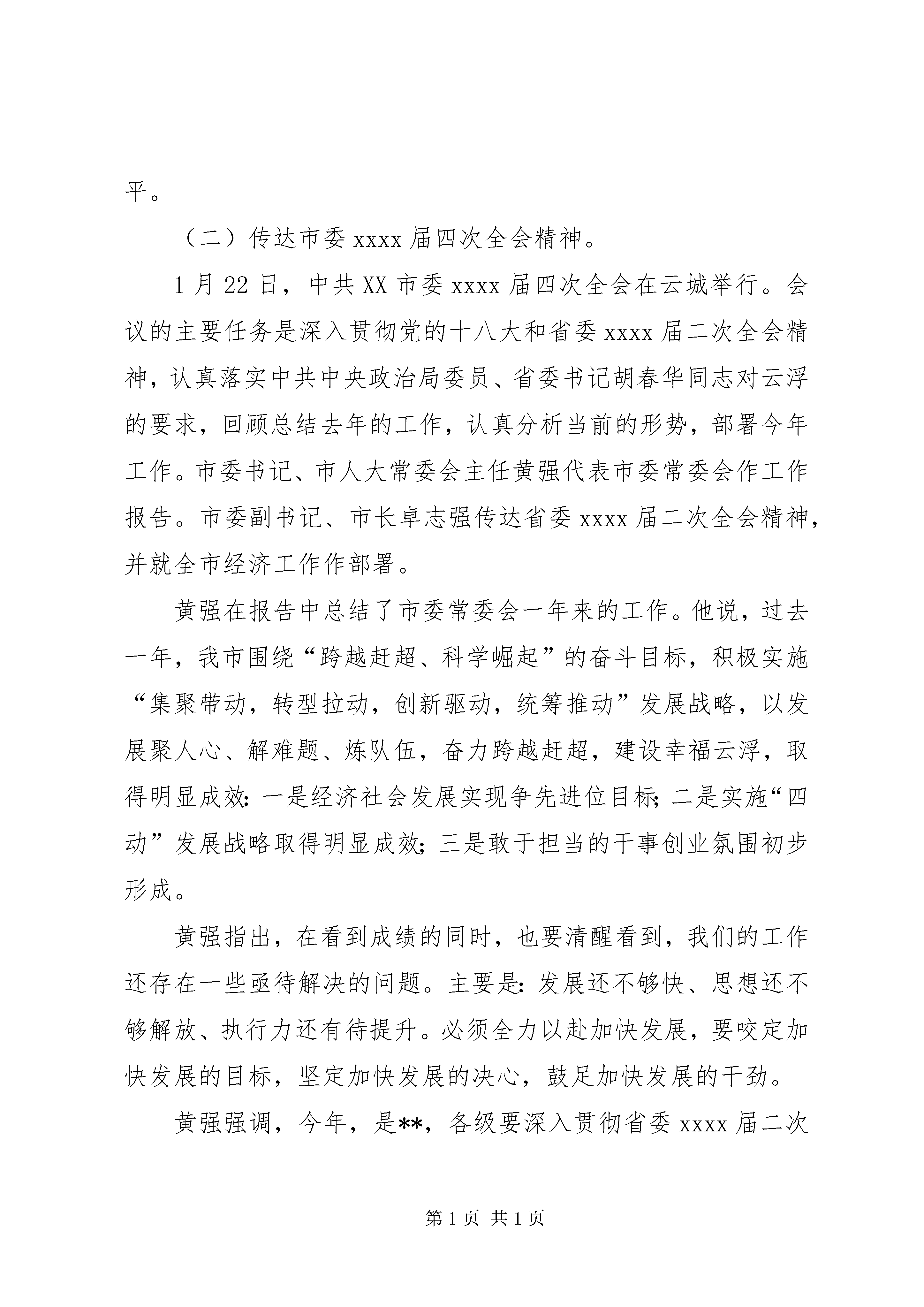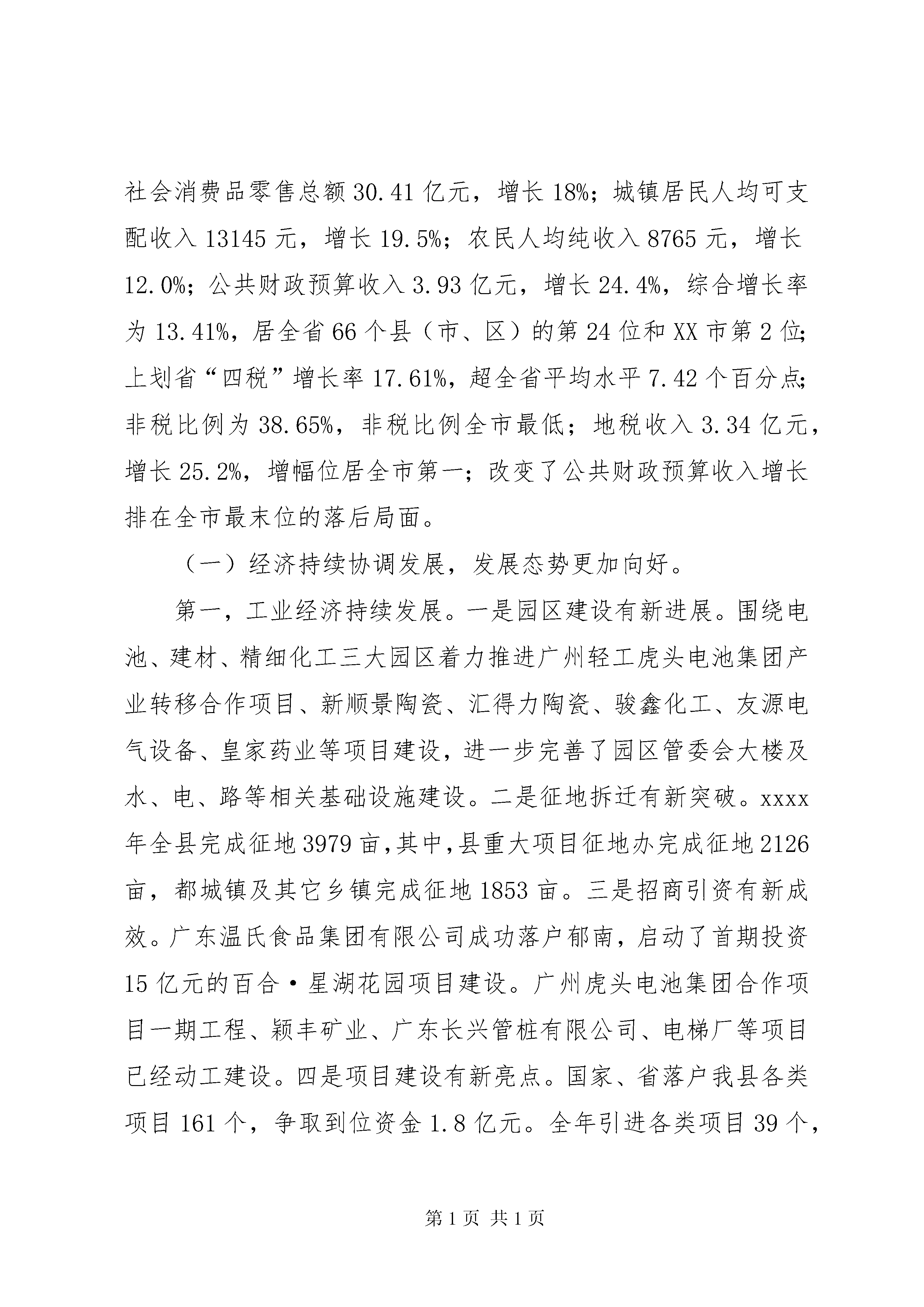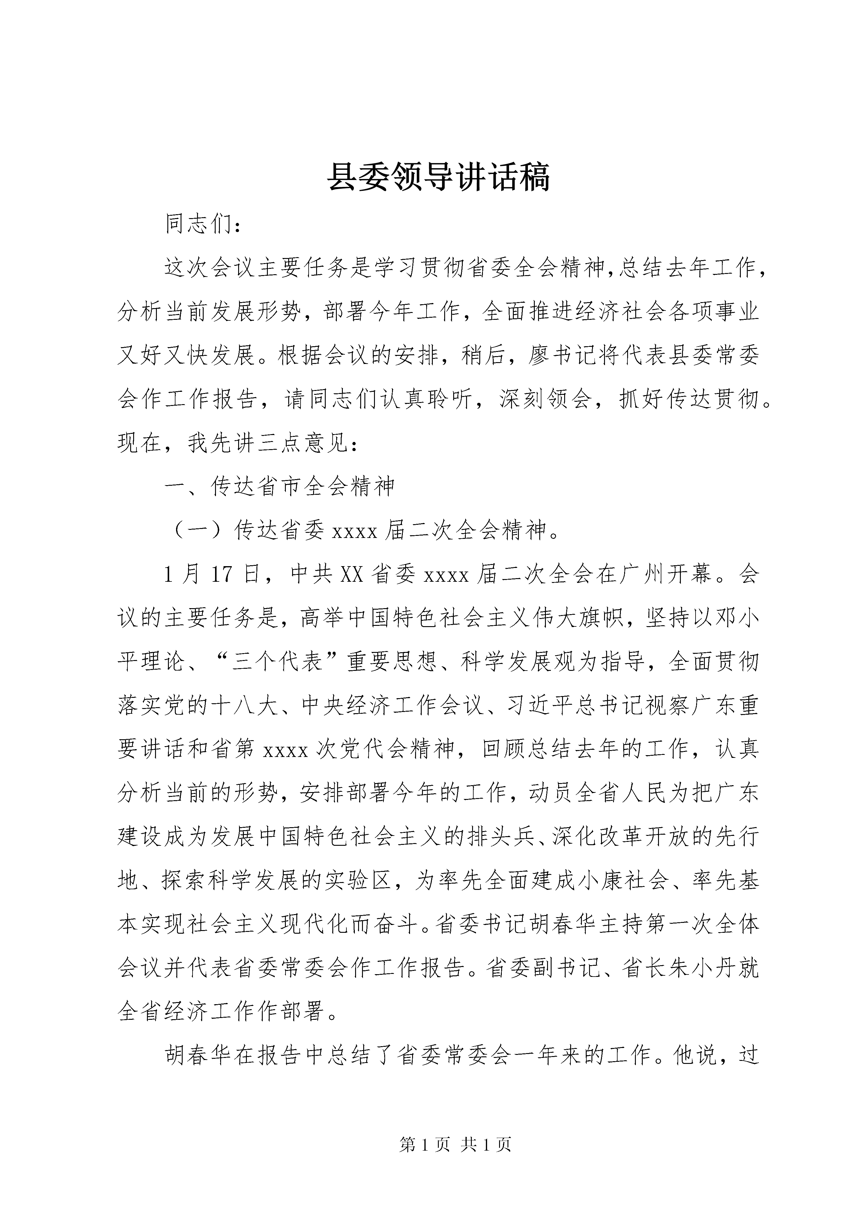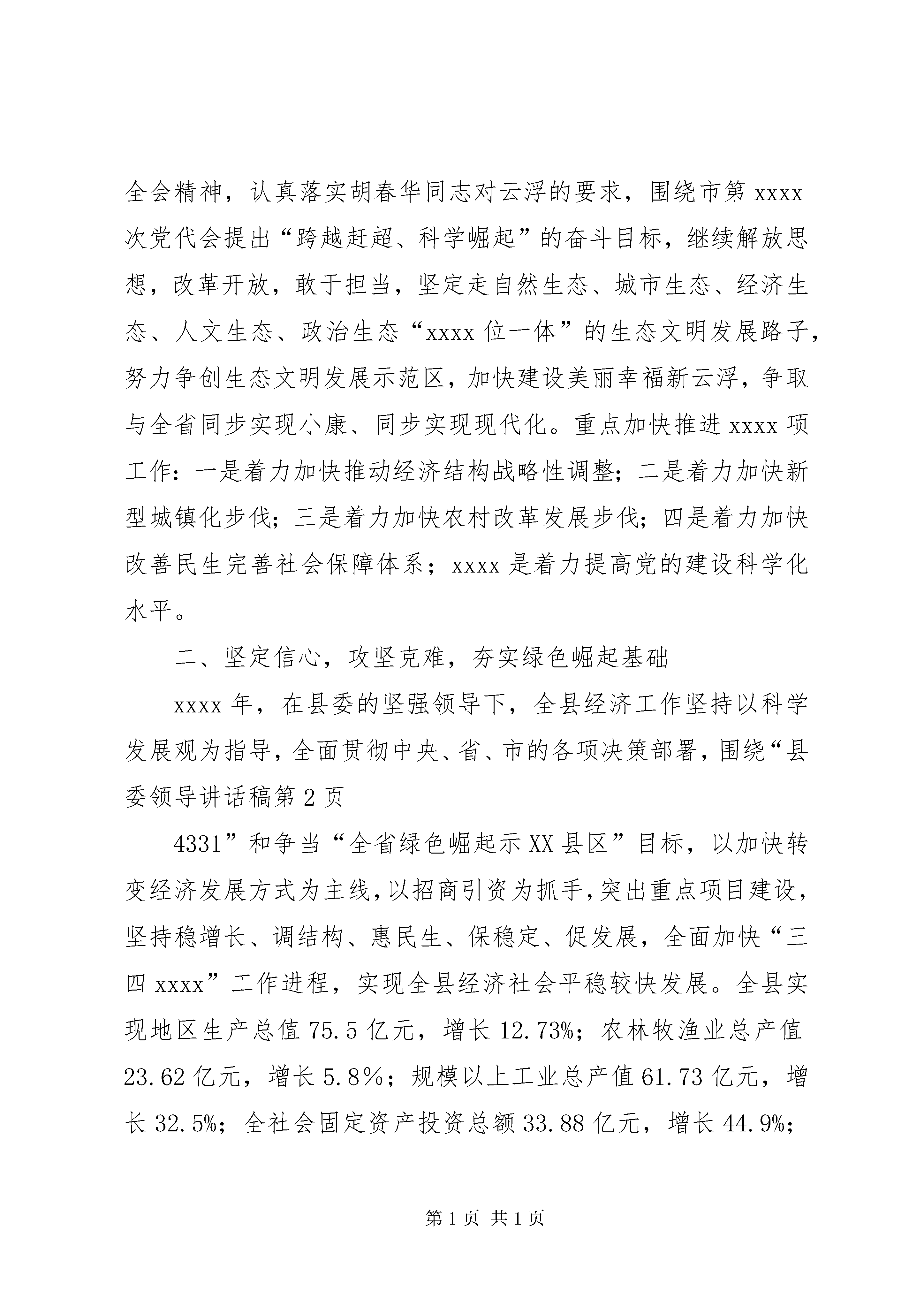 县委领导讲话稿同志们:这次会议主要任务是学习贯彻省委全会精神,总结去年工作,分析当前发展形势,部署今年工作,全面推进经济社会各项事业又好又快发展。根据会议的安排,稍后,廖书记将代表县委常委会作工作报告,请同志们认真聆听,深刻领会,抓好传达贯彻。现在,我先讲三点意见:一、传达省市全会精神(一)传达省委xxxx届二次全会精神。1月17日,中共XX省委xxxx届二次全会在广州开幕。会议的主要任务是,高举中国特色社会主义伟大旗帜,坚持以邓小平理论、“三个代表”重要思想、科学发展观为指导,全面贯彻落实党的十八大、中央经济工作会议、习近平总书记视察广东重要讲话和省第xxxx次党代会精神,回顾总结去年的工作,认真分析当前的形势,安排部署今年的工作,动员全省人民为把广东建设成为发展中国特色社会主义的排头兵、深化改革开放的先行地、探索科学发展的实验区,为率先全面建成小康社会、率先基本实现社会主义现代化而奋斗。省委书记胡春华主持第一次全体会议并代表省委常委会作工作报告。省委副书记、省长朱小丹就全省经济工作作部署。胡春华在报告中总结了省委常委会一年来的工作。他说,过去一年,我省以召开省第xxxx次党代会和学习贯彻党的十八大精神为契机,围绕主题主线,扎实推进加快转型升级、建设幸福广东各项工作,全省呈现经济平稳健康发展、结构调整扎实有效、民生事业明显加强、改革开放稳步推进、社会大局和谐稳定的良好局面,在率先全面建成小康社会进程中取得了新成绩。胡春华指出,深入学习贯彻党的十八大精神,贯彻落实好习近平总书记视察广东重要讲话精神,是当前和今后一个时期全省的首要政治任务。重点要在以下四个方面进一步统一思想、凝聚共识:一要坚定不移走中国特色社会主义道路,努力成为发展中国特色社会主义的排头兵;二要坚定不移推进改革开放,努力成为深化改革开放的先行地;三要坚定不移推动科学发展,努力成为探索科学发展的实验区;四要动员全省人民为实现“两个率先”而奋斗。胡春华强调,今年是贯彻落实党的十八大精神和省第xxxx次党代会精神的开局之年,是实施“xxxxxxxx”规划承前启后的关键之年,是为全面建成小康社会奠定坚实基础的重要一年。做好今年工作十分重要,要把握稳中求进的工作总基调,立足全局,突出重点,努力保持工作的连续性和稳定性,确保省委各项既定的工作部署落到实处、取得实效,在新起点上实现新发展。重点做好以下四方面工作:一要促进经济持续健康发展;二要保障和改善民生;三要确保社会和谐稳定;四要提高党的建设科学化水平。(二)传达市委xxxx届四次全会精神。1月22日,中共XX市委xxxx届四次全会在云城举行。会议的主要任务是深入贯彻党的十八大和省委xxxx届二次全会精神,认真落实中共中央政治局委员、省委书记胡春华同志对云浮的要求,回顾总结去年的工作,认真分析当前的形势,部署今年工作。市委书记、市人大常委会主任黄强代表市委常委会作工作报告。市委副书记、市长卓志强传达省委xxxx届二次全会精神,并就全市经济工作作部署。黄强在报告中总结了市委常委会一年来的工作。他说,过去一年,我市围绕“跨越赶超、科学崛起”的奋斗目标,积极实施“集聚带动,转型拉动,创新驱动,统筹推动”发展战略,以发展聚人心、解难题、炼队伍,奋力跨越赶超,建设幸福云浮,取得明显成效:一是经济社会发展实现争先进位目标;二是实施“四动”发展战略取得明显成效;三是敢于担当的干事创业氛围初步形成。黄强指出,在看到成绩的同时,也要清醒看到,我们的工作还存在一些亟待解决的问题。主要是:发展还不够快、思想还不够解放、执行力还有待提升。必须全力以赴加快发展,要咬定加快发展的目标,坚定加快发展的决心,鼓足加快发展的干劲。黄强强调,今年,是**,各级要深入贯彻省委xxxx届二次全会精神,认真落实胡春华同志对云浮的要求,围绕市第xxxx次党代会提出“跨越赶超、科学崛起”的奋斗目标,继续解放思想,改革开放,敢于担当,坚定走自然生态、城市生态、经济生态、人文生态、政治生态“xxxx位一体”的生态文明发展路子,努力争创生态文明发展示范区,加快建设美丽幸福新云浮,争取与全省同步实现小康、同步实现现代化。重点加快推进xxxx项工作:一是着力加快推动经济结构战略性调整;二是着力加快新型城镇化步伐;三是着力加快农村改革发展步伐;四是着力加快改善民生完善社会保障体系;xxxx是着力提高党的建设科学化水平。二、坚定信心,攻坚克难,夯实绿色崛起基础xxxx年,在县委的坚强领导下,全县经济工作坚持以科学发展观为指导,全面贯彻中央、省、市的各项决策部署,围绕“县委领导讲话稿4331”和争当“全省绿色崛起示XX县区”目标,以加快转变经济发展方式为主线,以招商引资为抓手,突出重点项目建设,坚持稳增长、调结构、惠民生、保稳定、促发展,全面加快“三四