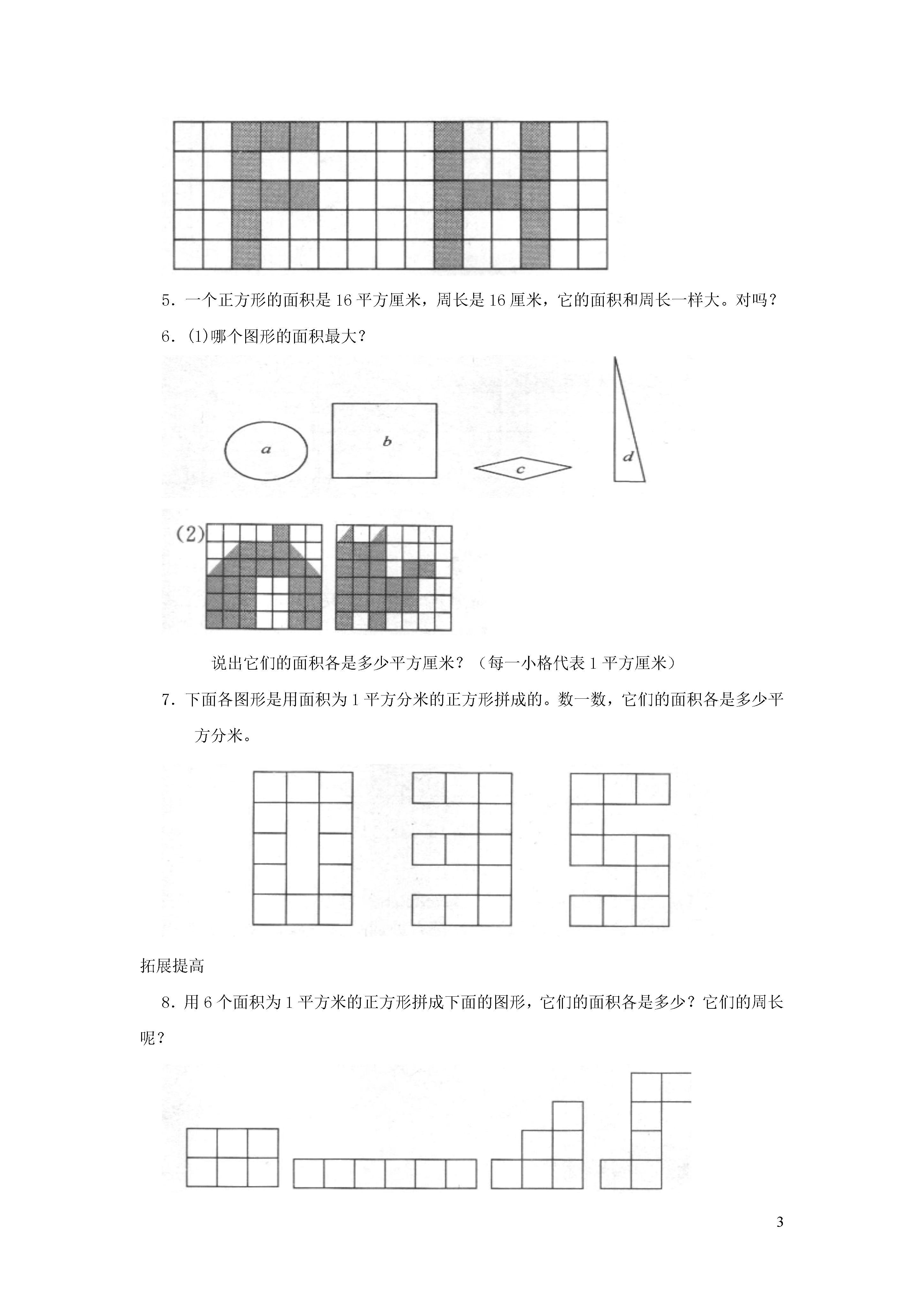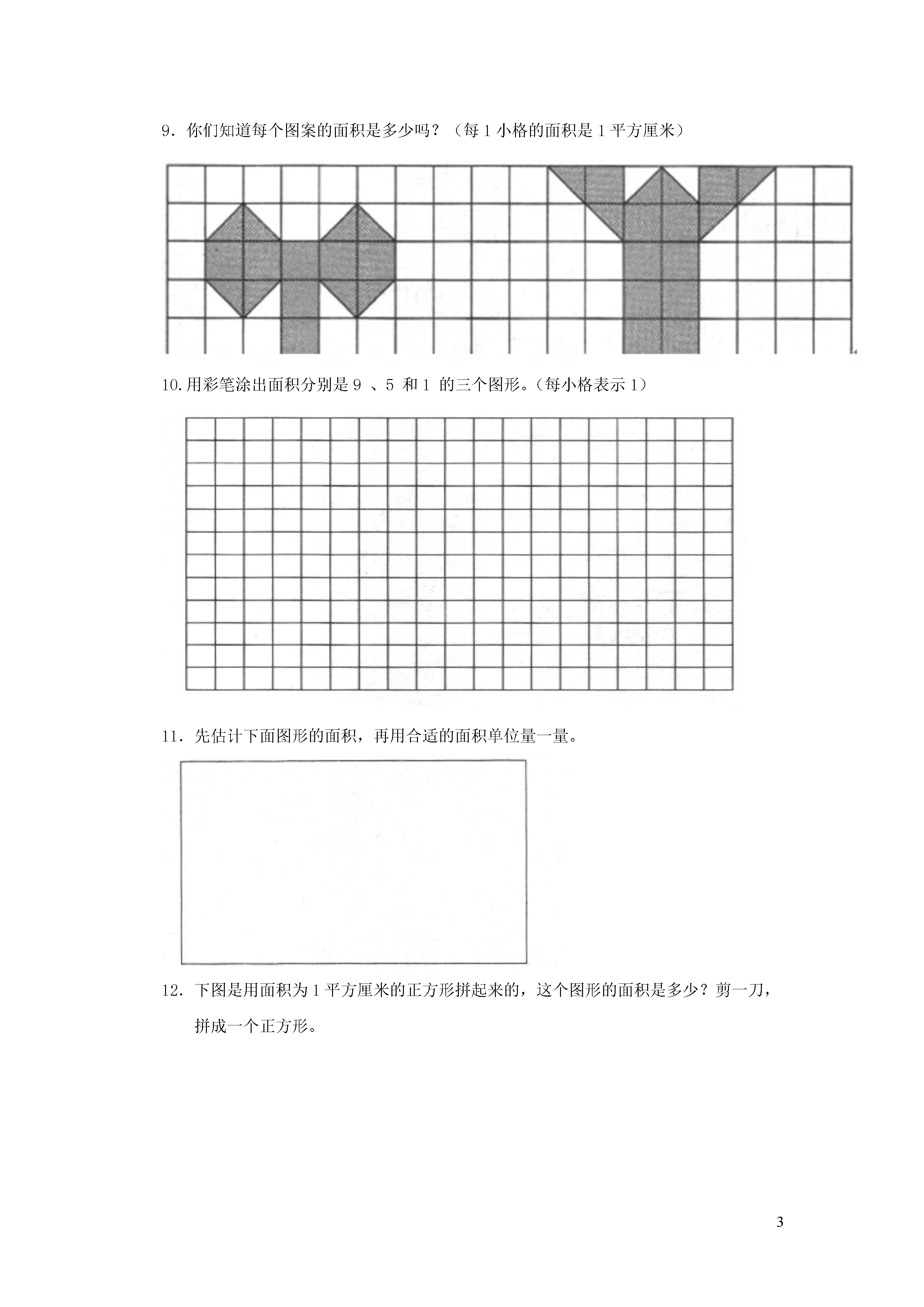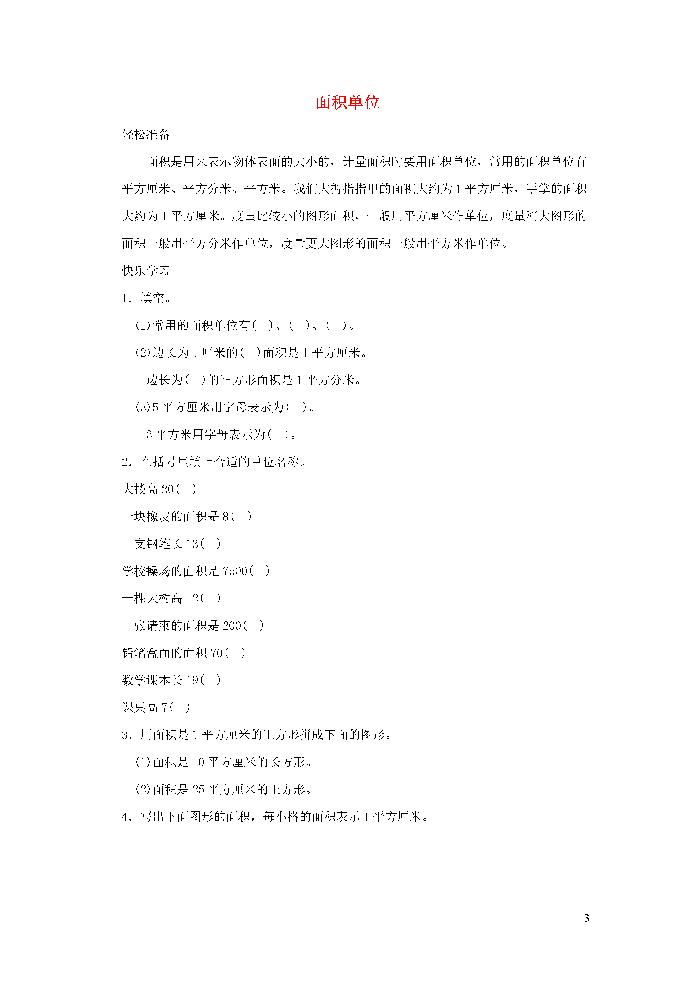 3面积单位轻松准备面积是用来表示物体表面的大小的,计量面积时要用面积单位,常用的面积单位有平方厘米、平方分米、平方米。我们大拇指指甲的面积大约为1平方厘米,手掌的面积大约为1平方厘米。度量比较小的图形面积,一般用平方厘米作单位,度量稍大图形的面积一般用平方分米作单位,度量更大图形的面积一般用平方米作单位。快乐学习1.填空。(1)常用的面积单位有()、()、()。(2)边长为1厘米的()面积是1平方厘米。边长为()的正方形面积是1平方分米。(3)5平方厘米用字母表示为()。3平方米用字母表示为()。2.在括号里填上合适的单位名称。大楼高20()一块橡皮的面积是8()一支钢笔长13()学校操场的面积是7500()一棵大树高12()一张请柬的面积是200()铅笔盒面的面积70()数学课本长19()课桌高7()3.用面积是1平方厘米的正方形拼成下面的图形。(1)面积是10平方厘米的长方形。(2)面积是25平方厘米的正方形。4.写出下面图形的面积,每小格的面积表示1平方厘米。5.一个正方形的面积是16平方厘米,周长是16厘米,它的面积和周长一样大。对吗?6.(1)哪个图形的面积最大?说出它们的面积各是多少平方厘米?(每一小格代表1平方厘米)7.下面各图形是用面积为1平方分米的正方形拼成的。数一数,它们的面积各是多少平方分米。拓展提高8.用6个面积为1平方米的正方形拼成下面的图形,它们的面积各是多少?它们的周长呢?9.你们知道每个图案的面积是多少吗?(每1小格的面积是1平方厘米)10.用彩笔涂出面积分别是9、5和1的三个图形。(每小格表示1)11.先估计下面图形的面积,再用合适的面积单位量一量。12.下图是用面积为1平方厘米的正方形拼起来的,这个图形的面积是多少?剪一刀,拼成一个正方形。13.动手剪一剪:(1)一个正方形,剪去一个角还有几个角?(2)边长是10厘米的正方形,把它剪成边长是整厘米数的小正方形共有几种剪法?每种剪法可以剪出多少个小正方形?答案与点拨1.(1)平方厘米平方分米平方米(2)正方形1分米(3)532.米平方厘米厘米平方米米平方厘米平方厘米厘米分米4.9平方厘米12平方厘米5.这样说不对。因为一个是面积单位,一个是长度单位,不能比较大小。6.(2)26平方厘米21平方厘米7.12平方分米11平方分米11平方分米8.它们的面积都是6平方米。它们的周长分别是10米、14米、12米、14米。9.左边图案的面积是11平方厘米右边图案的面积是13平方厘米12.本题的图形,从上到下每排的方格分别是1、3、5、7个,一共是16个,就是16平方厘米。沿上面第一排正方形的右边往下剪,剪掉的部分包括第二排右面1个,第三排右面2个,第四排右面3个。再把这部分补在另一部分的左边,就拼成一个正方形。13.(1)可能还有3个、4个、5个。(2)3种剪法。每次剪成1厘米的,可剪出100个小正方形;每次剪成2厘米的,可剪出25个小正方形;每次剪成5厘米的,可剪出4个小正方形。