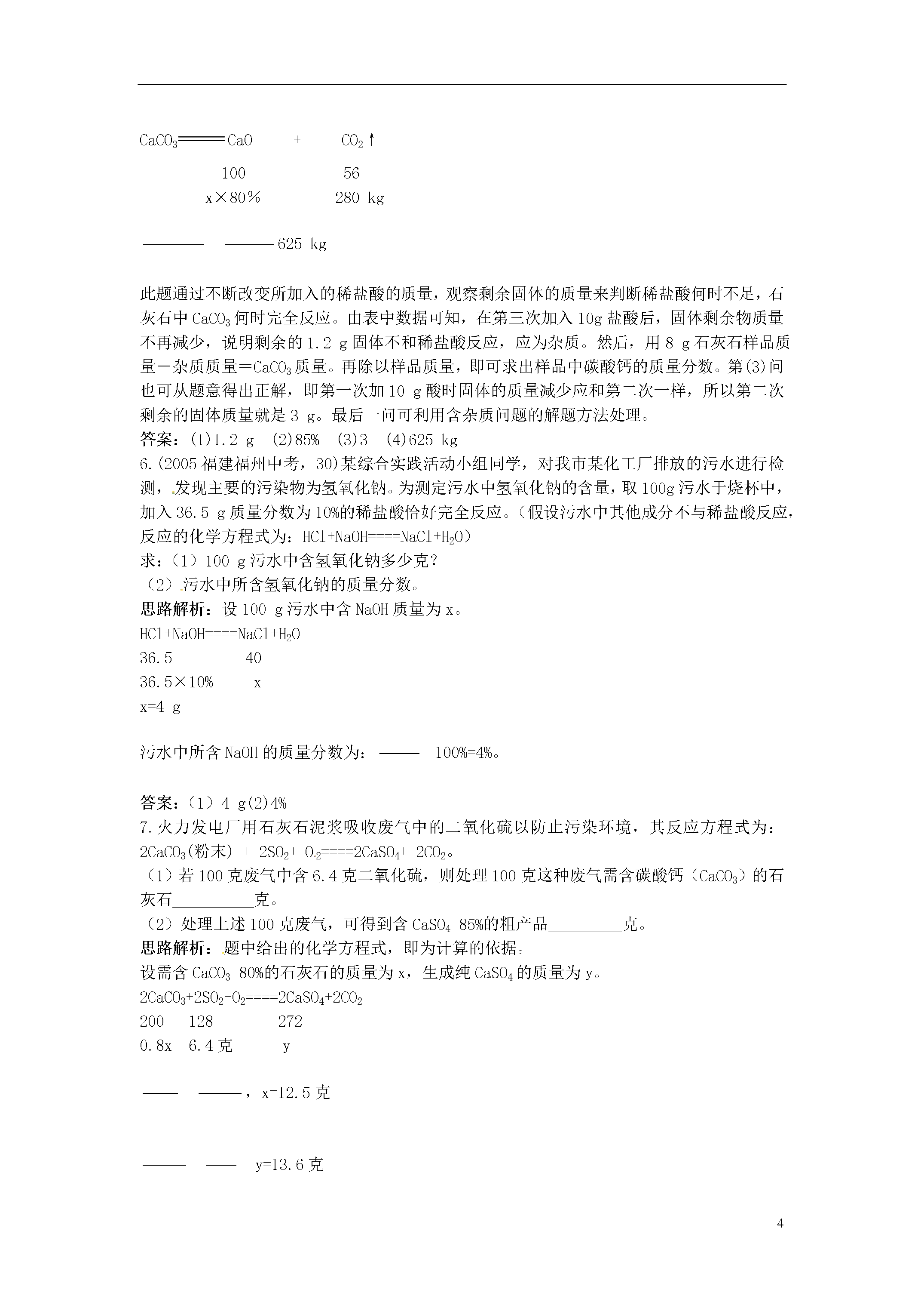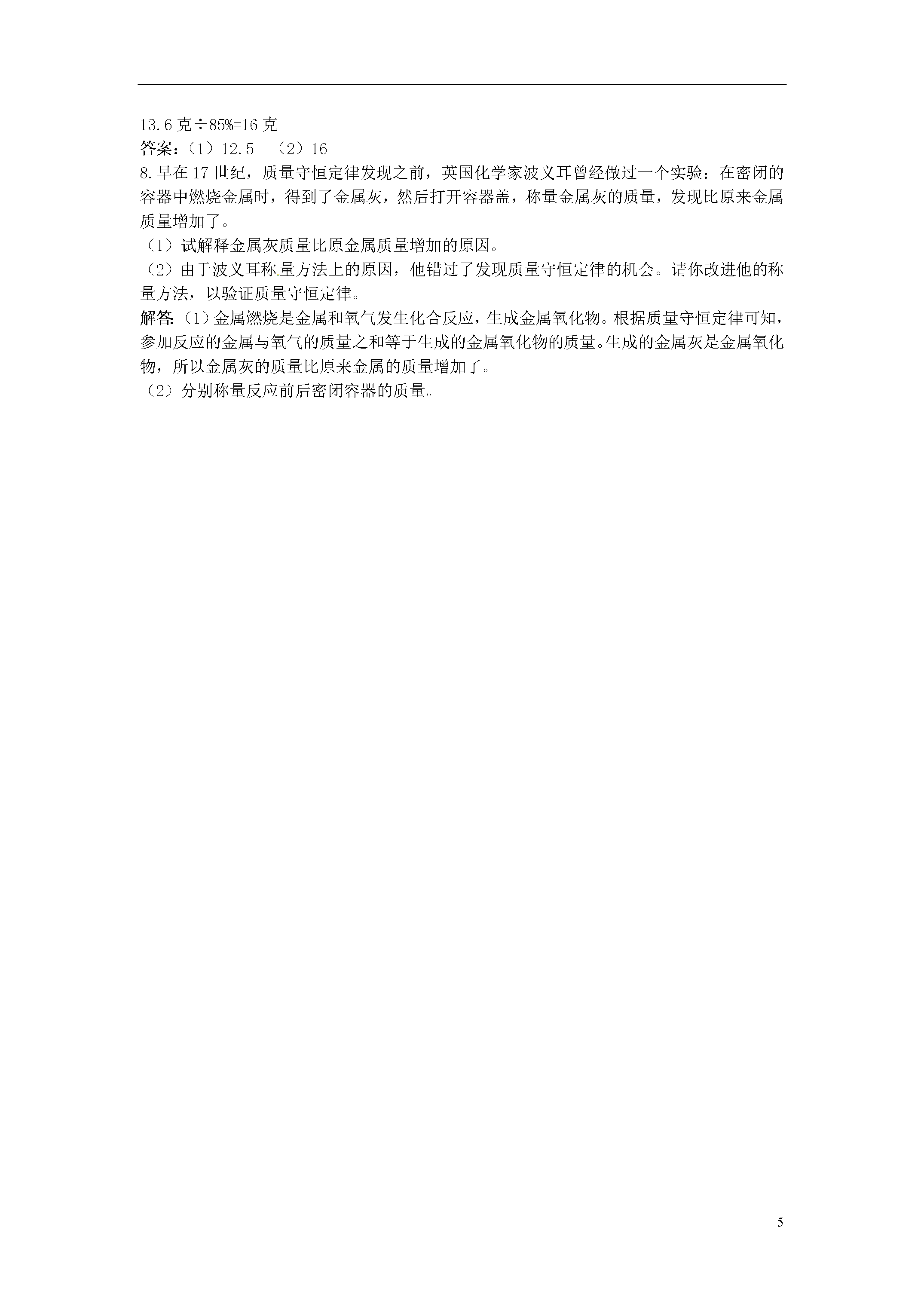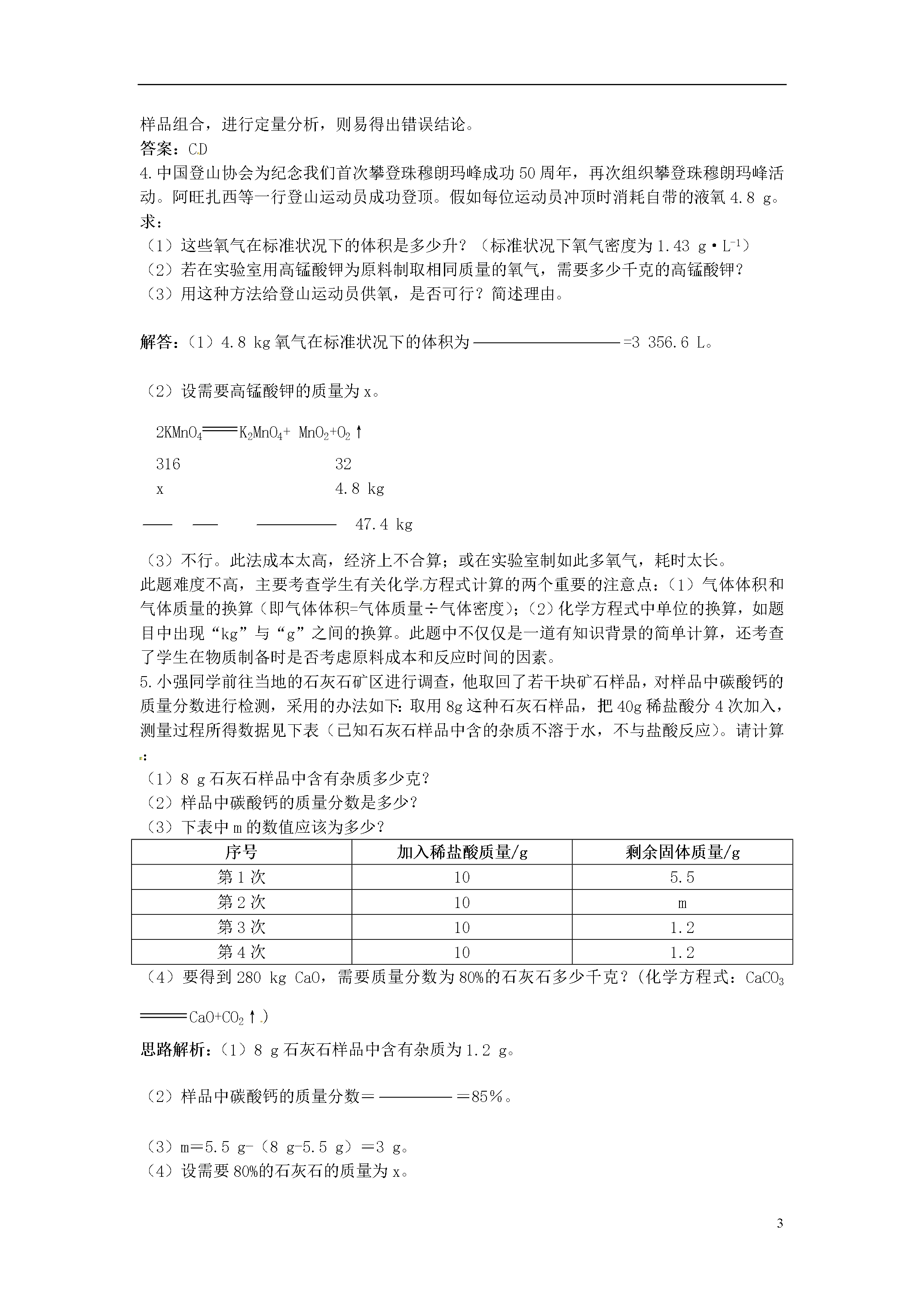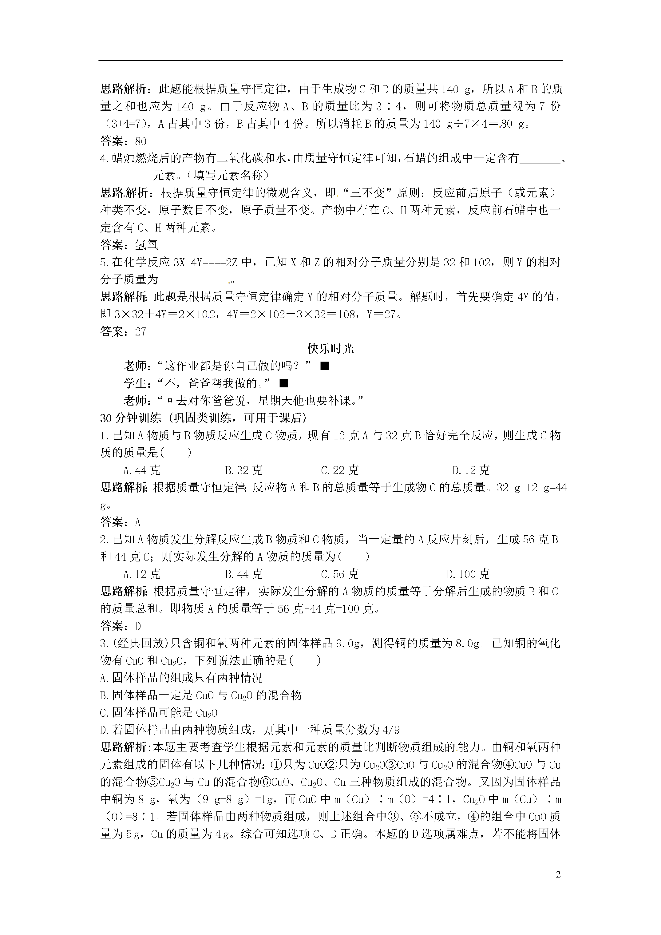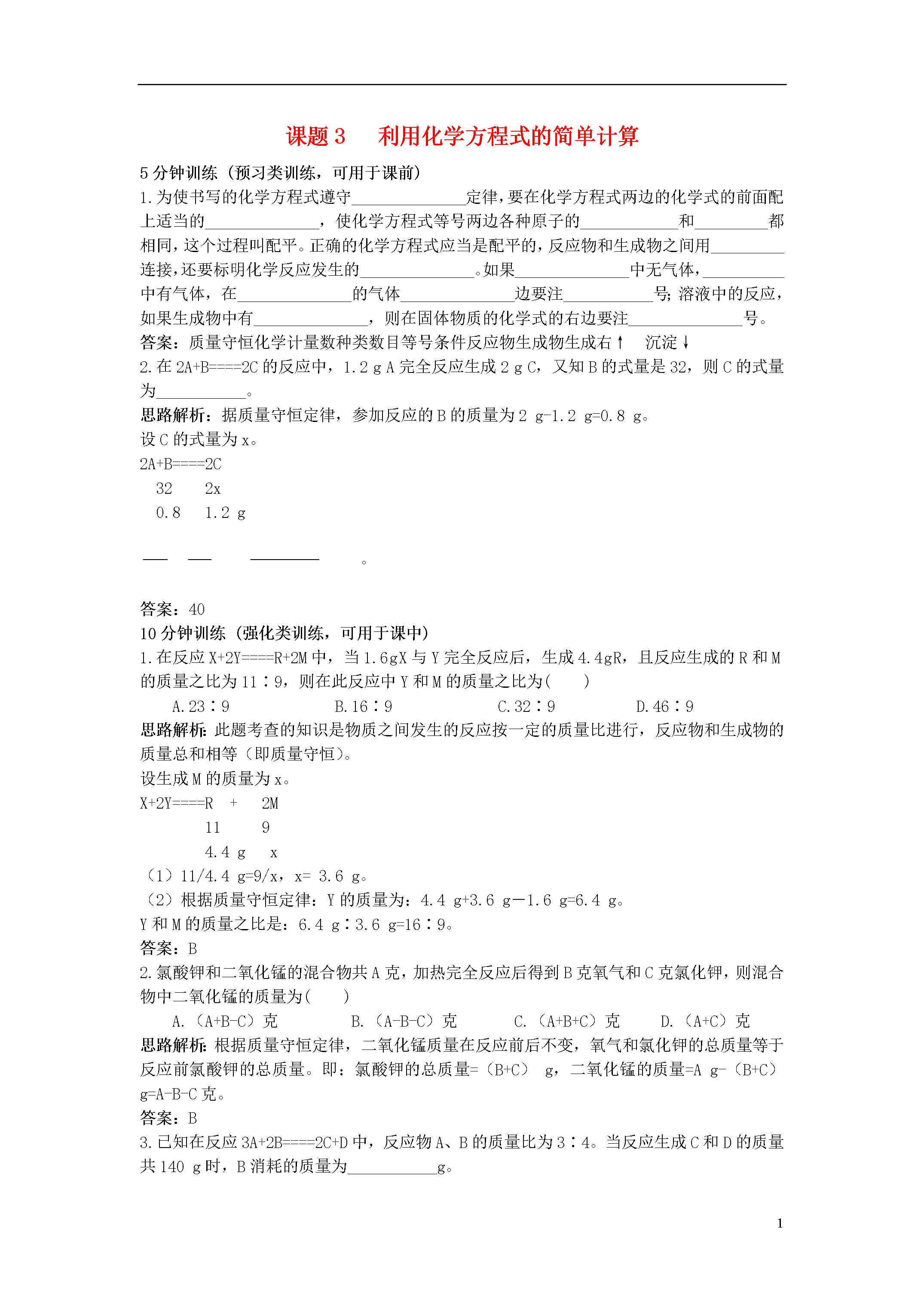 5课题3利用化学方程式的简单计算5分钟训练(预习类训练,可用于课前)1.为使书写的化学方程式遵守______________定律,要在化学方程式两边的化学式的前面配上适当的______________,使化学方程式等号两边各种原子的____________和_________都相同,这个过程叫配平。正确的化学方程式应当是配平的,反应物和生成物之间用_________连接,还要标明化学反应发生的______________。如果______________中无气体,__________中有气体,在______________的气体______________边要注___________号;溶液中的反应,如果生成物中有______________,则在固体物质的化学式的右边要注______________号。答案:质量守恒化学计量数种类数目等号条件反应物生成物生成右↑沉淀↓2.在2A+B====2C的反应中,1.2gA完全反应生成2gC,又知B的式量是32,则C的式量为___________。思路解析:据质量守恒定律,参加反应的B的质量为2g-1.2g=0.8g。设C的式量为x。2A+B====2C322x0.81.2g。答案:4010分钟训练(强化类训练,可用于课中)1.在反应X+2Y====R+2M中,当1.6gX与Y完全反应后,生成4.4gR,且反应生成的R和M的质量之比为11∶9,则在此反应中Y和M的质量之比为()A.23∶9B.16∶9C.32∶9D.46∶9思路解析:此题考查的知识是物质之间发生的反应按一定的质量比进行,反应物和生成物的质量总和相等(即质量守恒)。设生成M的质量为x。X+2Y====R+2M1194.4gx(1)11/4.4g=9/x,x=3.6g。(2)根据质量守恒定律:Y的质量为:4.4g+3.6g-1.6g=6.4g。Y和M的质量之比是:6.4g∶3.6g=16∶9。答案:B2.氯酸钾和二氧化锰的混合物共A克,加热完全反应后得到B克氧气和C克氯化钾,则混合物中二氧化锰的质量为()A.(A+B-C)克B.(A-B-C)克C.(A+B+C)克D.(A+C)克思路解析:根据质量守恒定律,二氧化锰质量在反应前后不变,氧气和氯化钾的总质量等于反应前氯酸钾的总质量。即:氯酸钾的总质量=(B+C)g,二氧化锰的质量=Ag-(B+C)g=A-B-C克。答案:B3.已知在反应3A+2B====2C+D中,反应物A、B的质量比为3∶4。当反应生成C和D的质量共140g时,B消耗的质量为___________g。思路解析:此题能根据质量守恒定律,由于生成物C和D的质量共140g,所以A和B的质量之和也应为140g。由于反应物A、B的质量比为3∶4,则可将物质总质量视为7份(3+4=7),A占其中3份,B占其中4份。所以消耗B的质量为140g÷7×4=80g。答案:804.蜡烛燃烧后的产物有二氧化碳和水,由质量守恒定律可知,石蜡的组成中一定含有_______、_________元素。(填写元素名称)思路解析:根据质量守恒定律的微观含义,即“三不变”原则:反应前后原子(或元素)种类不变,原子数目不变,原子质量不变。产物中存在C、H两种元素,反应前石蜡中也一定含有C、H两种元素。答案:氢氧5.在化学反应3X+4Y====2Z中,已知X和Z的相对分子质量分别是32和102,则Y的相对分子质量为____________。思路解析:此题是根据质量守恒定律确定Y的相对分子质量。解题时,首先要确定4Y的值,即3×32+4Y=2×102,4Y=2×102-3×32=108,Y=27。答案:27快乐时光老师:“这作业都是你自己做的吗?”学生:“不,爸爸帮我做的。”老师:“回去对你爸爸说,星期天他也要补课。”30分钟训练(巩固类训练,可用于课后)1.已知A物质与B物质反应生成C物质,现有12克A与32克B恰好完全反应,则生成C物质的质量是()A.44克B.32克C.22克D.12克思路解析:根据质量守恒定律:反应物A和B的总质量等于生成物C的总质量。32g+12g=44g。答案:A2.已知A物质发生分解反应生成B物质和C物质,当一定量的A反应片刻后,生成56克B和44克C;则实际发生分解的A物质的质量为()A.12克B.44克C.56克D.100克思路解析:根据质量守恒定律,实际发生分解的A物质的质量等于分解后生成的物质B和C的质量总和。即物质A的质量等于56克+44克=100克。答案:D3.(经典回放)只含铜和氧两种元素的固体样品9.0g,测得铜的质量为8.0g。已知铜的氧化物有CuO和Cu2O,下列说法正确的是()A.固体样品的组成只有两种情况B.固体样品一定是CuO与Cu2O的混合物C.固体样品可能是Cu2OD.若固体样品由两种物