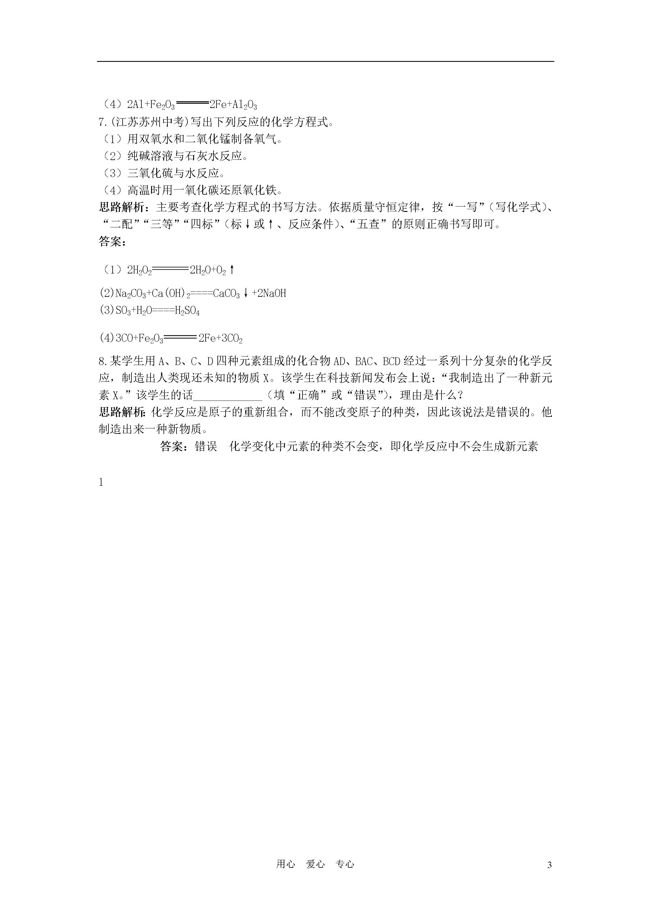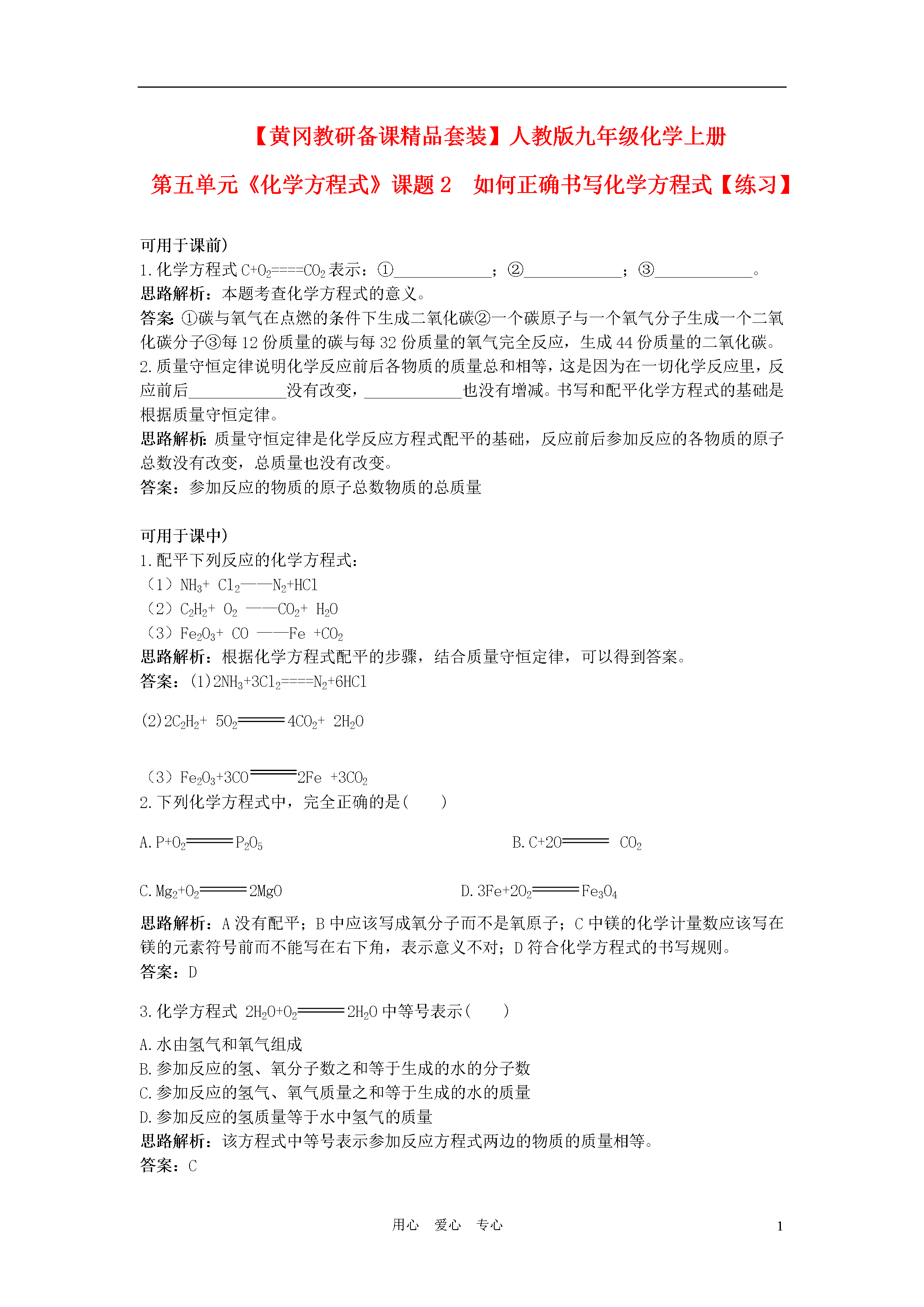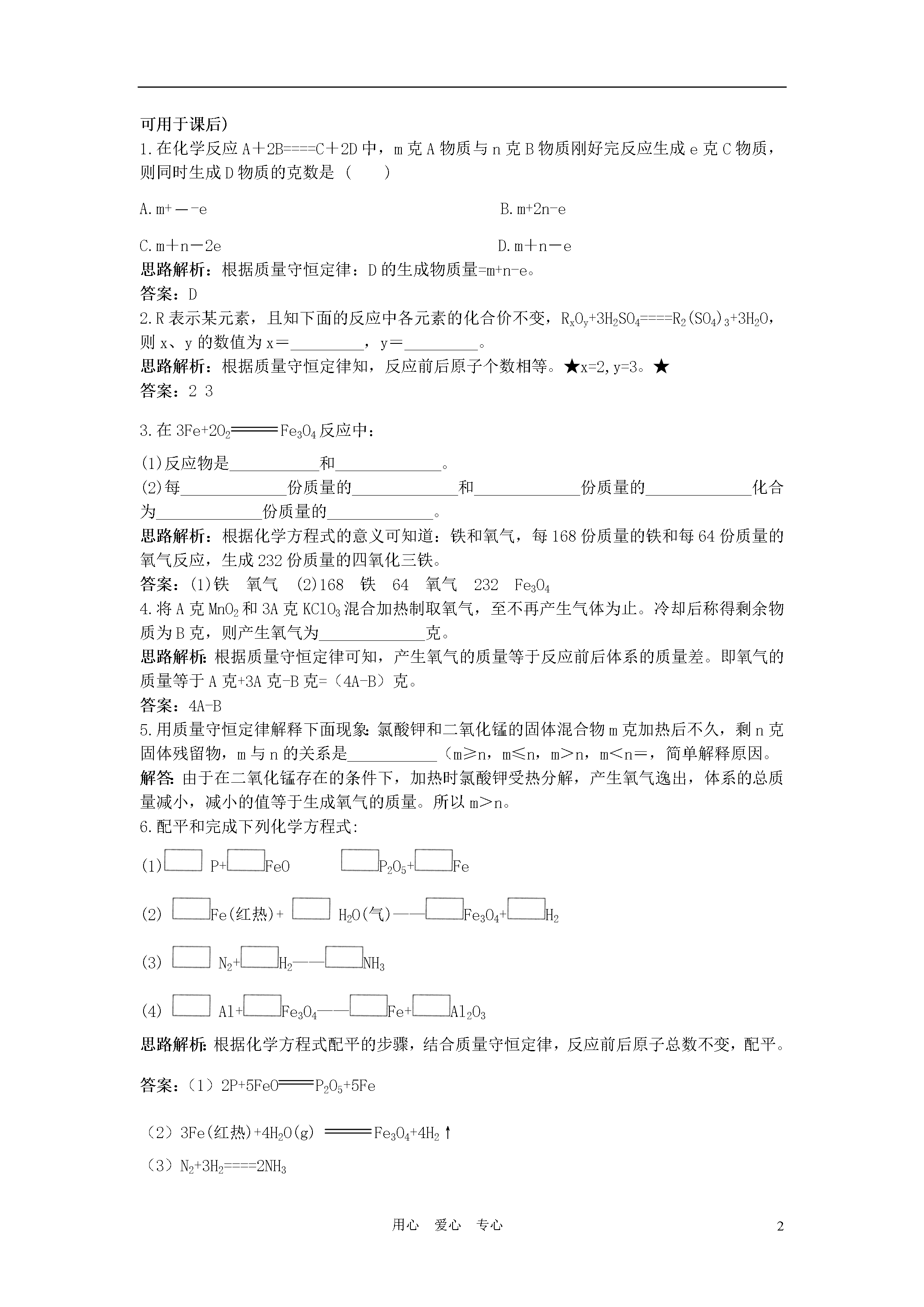 3用心爱心专心【黄冈教研备课精品套装】人教版九年级化学上册第五单元《化学方程式》课题2如何正确书写化学方程式【练习】可用于课前)1.化学方程式C+O2====CO2表示:①____________;②____________;③____________。思路解析:本题考查化学方程式的意义。答案:①碳与氧气在点燃的条件下生成二氧化碳②一个碳原子与一个氧气分子生成一个二氧化碳分子③每12份质量的碳与每32份质量的氧气完全反应,生成44份质量的二氧化碳。2.质量守恒定律说明化学反应前后各物质的质量总和相等,这是因为在一切化学反应里,反应前后____________没有改变,____________也没有增减。书写和配平化学方程式的基础是根据质量守恒定律。思路解析:质量守恒定律是化学反应方程式配平的基础,反应前后参加反应的各物质的原子总数没有改变,总质量也没有改变。答案:参加反应的物质的原子总数物质的总质量可用于课中)1.配平下列反应的化学方程式:(1)NH3+Cl2——N2+HCl(2)C2H2+O2——CO2+H2O(3)Fe2O3+CO——Fe+CO2思路解析:根据化学方程式配平的步骤,结合质量守恒定律,可以得到答案。答案:(1)2NH3+3Cl2====N2+6HCl(2)2C2H2+5O24CO2+2H2O(3)Fe2O3+3CO2Fe+3CO22.下列化学方程式中,完全正确的是()A.P+O2P2O5B.C+2OCO2C.Mg2+O22MgOD.3Fe+2O2Fe3O4思路解析:A没有配平;B中应该写成氧分子而不是氧原子;C中镁的化学计量数应该写在镁的元素符号前而不能写在右下角,表示意义不对;D符合化学方程式的书写规则。答案:D3.化学方程式2H2O+O22H2O中等号表示()A.水由氢气和氧气组成B.参加反应的氢、氧分子数之和等于生成的水的分子数C.参加反应的氢气、氧气质量之和等于生成的水的质量D.参加反应的氢质量等于水中氢气的质量思路解析:该方程式中等号表示参加反应方程式两边的物质的质量相等。答案:C可用于课后)1.在化学反应A+2B====C+2D中,m克A物质与n克B物质刚好完反应生成e克C物质,则同时生成D物质的克数是()A.m+-eB.m+2n-eC.m+n-2eD.m+n-e思路解析:根据质量守恒定律:D的生成物质量=m+n-e。答案:D2.R表示某元素,且知下面的反应中各元素的化合价不变,RxOy+3H2SO4====R2(SO4)3+3H2O,则x、y的数值为x=_________,y=_________。思路解析:根据质量守恒定律知,反应前后原子个数相等。x=2,y=3。答案:233.在3Fe+2O2Fe3O4反应中:(1)反应物是___________和_____________。(2)每_____________份质量的_____________和_____________份质量的_____________化合为_____________份质量的_____________。思路解析:根据化学方程式的意义可知道:铁和氧气,每168份质量的铁和每64份质量的氧气反应,生成232份质量的四氧化三铁。答案:(1)铁氧气(2)168铁64氧气232Fe3O44.将A克MnO2和3A克KClO3混合加热制取氧气,至不再产生气体为止。冷却后称得剩余物质为B克,则产生氧气为_____________克。思路解析:根据质量守恒定律可知,产生氧气的质量等于反应前后体系的质量差。即氧气的质量等于A克+3A克-B克=(4A-B)克。答案:4A-B5.用质量守恒定律解释下面现象:氯酸钾和二氧化锰的固体混合物m克加热后不久,剩n克固体残留物,m与n的关系是___________(m≥n,m≤n,m>n,m<n=,简单解释原因。解答:由于在二氧化锰存在的条件下,加热时氯酸钾受热分解,产生氧气逸出,体系的总质量减小,减小的值等于生成氧气的质量。所以m>n。6.配平和完成下列化学方程式:(1)P+FeOP2O5+Fe(2)Fe(红热)+H2O(气)——Fe3O4+H2(3)N2+H2——NH3(4)Al+Fe3O4——Fe+Al2O3思路解析:根据化学方程式配平的步骤,结合质量守恒定律,反应前后原子总数不变,配平。答案:(1)2P+5FeOP2O5+5Fe(2)3Fe(红热)+4H2O(g)Fe3O4+4H2↑(3)N2+3H2====2NH3(4)2Al+Fe2O32Fe+Al2O37.(江苏苏州中考)写出下列反应的化学方程式。(1)用双氧水和二氧化锰制备氧气。(2)纯碱溶液与石灰水反应。(3)三氧化硫与水反应。(4)高温时用一氧化碳还原氧化铁。思路解析:主要考查化学方程式的书写方法。依据质量守恒定律,按“一写”(写化学式)、