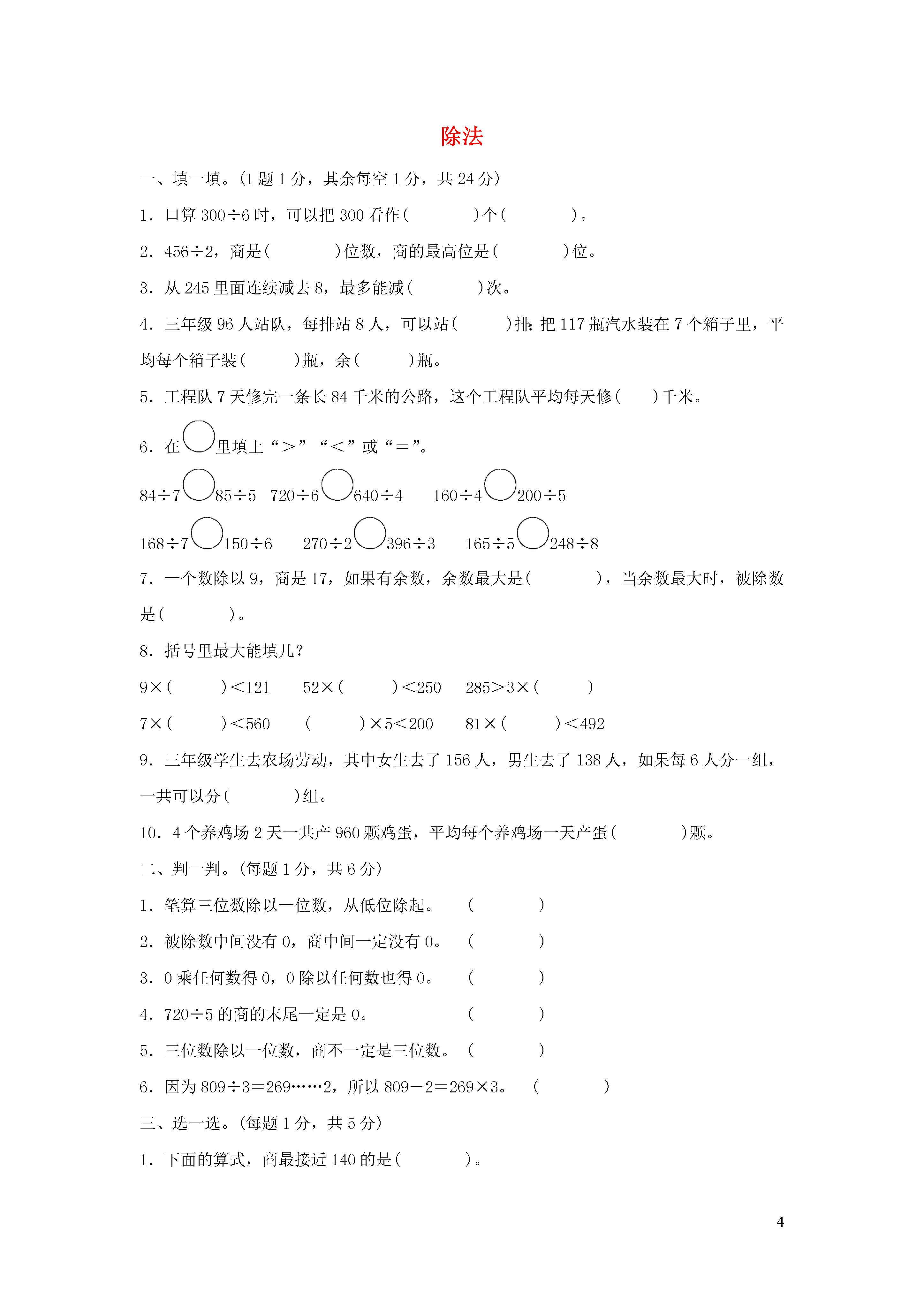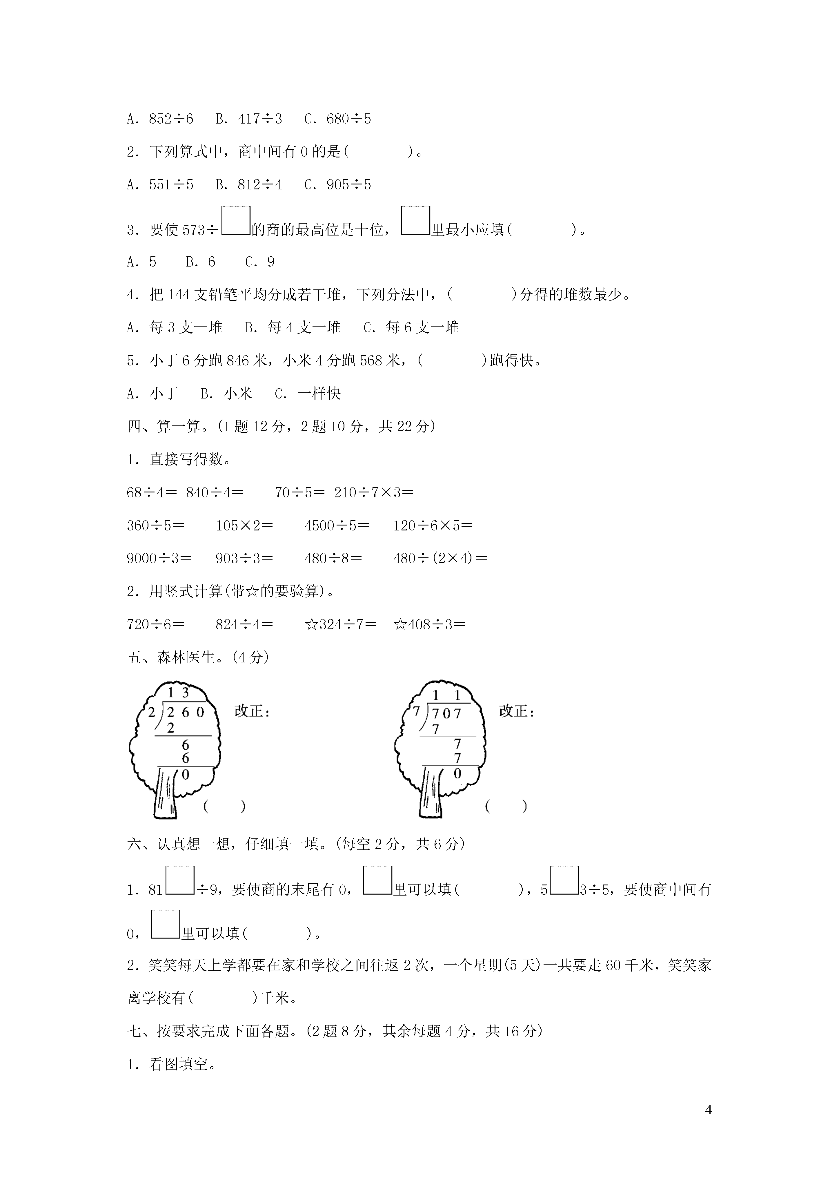 4除法一、填一填。(1题1分,其余每空1分,共24分)1.口算300÷6时,可以把300看作()个()。2.456÷2,商是()位数,商的最高位是()位。3.从245里面连续减去8,最多能减()次。4.三年级96人站队,每排站8人,可以站()排;把117瓶汽水装在7个箱子里,平均每个箱子装()瓶,余()瓶。5.工程队7天修完一条长84千米的公路,这个工程队平均每天修()千米。6.在里填上“>”“<”或“=”。84÷785÷5720÷6640÷4160÷4200÷5168÷7150÷6270÷2396÷3165÷5248÷87.一个数除以9,商是17,如果有余数,余数最大是(),当余数最大时,被除数是()。8.括号里最大能填几?9×()<12152×()<250285>3×()7×()<560()×5<20081×()<4929.三年级学生去农场劳动,其中女生去了156人,男生去了138人,如果每6人分一组,一共可以分()组。10.4个养鸡场2天一共产960颗鸡蛋,平均每个养鸡场一天产蛋()颗。二、判一判。(每题1分,共6分)1.笔算三位数除以一位数,从低位除起。()2.被除数中间没有0,商中间一定没有0。()3.0乘任何数得0,0除以任何数也得0。()4.720÷5的商的末尾一定是0。()5.三位数除以一位数,商不一定是三位数。()6.因为809÷3=269……2,所以809-2=269×3。()三、选一选。(每题1分,共5分)1.下面的算式,商最接近140的是()。A.852÷6B.417÷3C.680÷52.下列算式中,商中间有0的是()。A.551÷5B.812÷4C.905÷53.要使573÷的商的最高位是十位,里最小应填()。A.5B.6C.94.把144支铅笔平均分成若干堆,下列分法中,()分得的堆数最少。A.每3支一堆B.每4支一堆C.每6支一堆5.小丁6分跑846米,小米4分跑568米,()跑得快。A.小丁B.小米C.一样快四、算一算。(1题12分,2题10分,共22分)1.直接写得数。68÷4=840÷4=70÷5=210÷7×3=360÷5=105×2=4500÷5=120÷6×5=9000÷3=903÷3=480÷8=480÷(2×4)=2.用竖式计算(带☆的要验算)。720÷6=824÷4=☆324÷7=☆408÷3=五、森林医生。(4分)六、认真想一想,仔细填一填。(每空2分,共6分)1.81÷9,要使商的末尾有0,里可以填(),53÷5,要使商中间有0,里可以填()。2.笑笑每天上学都要在家和学校之间往返2次,一个星期(5天)一共要走60千米,笑笑家离学校有()千米。七、按要求完成下面各题。(2题8分,其余每题4分,共16分)1.看图填空。(1)(2)一共60个◇,分成_______行,一共72个,平均每行平均每行________个◇。可以铺________个,铺成________行。2.(变式题)看图列式计算。(1)(2)(3)(4)3.填一填。(1)用0,2,4,6这四个数字组成一个除法算式,商最大时,算式为()。(2)在除法算式824÷4中,除数不变,被除数增加(),商就增加1。八、解决问题。(4题5分,其余每题4分,共17分)1.(变式题)有8筐苹果,每筐80个,把这些苹果平均放入4个纸箱,每个纸箱要装多少个?2.(变式题)先画一画图,再列式计算。3.李叔叔4天卖了8箱冰棍,每箱30根,每根2元钱。(1)李叔叔平均每天卖多少根冰棍?(2)李叔叔4天共卖了多少钱?4.一天奇思站在一座山头的对面,大喊一声“你好”,他同时按下手中的秒表,喊声刚落,对面的山头也传来了“你好”,他立即看了一下秒表,距离他刚才呼喊的时间正好是6秒,你能知道奇思离对面的山头有多远吗?(声音在空气中的传播速度是每秒340米)参考答案一、1.30十2.三百3.30[点拨]求最多能减几次,就是要算245里面有几个8,商后有余数,舍去。4.121655.126.<<=<>>7.8161[点拨]余数要比除数小,比9小,最大是8,被除数=除数×商+余数,即9×17+8=161。8.13494793969.4910.120二、1.×2.×[点拨]举反例:824÷4=206。3.×[点拨]错在后半句,应强调除数不为0,即0除以任何不是0的数都得0。4.×[点拨]720÷5=144。5.√6.√[点拨]在有余数的除法里,被除数-余数=商×除数。三、1.B2.B3.B4.C5.B四、1.172101490722109001003000301