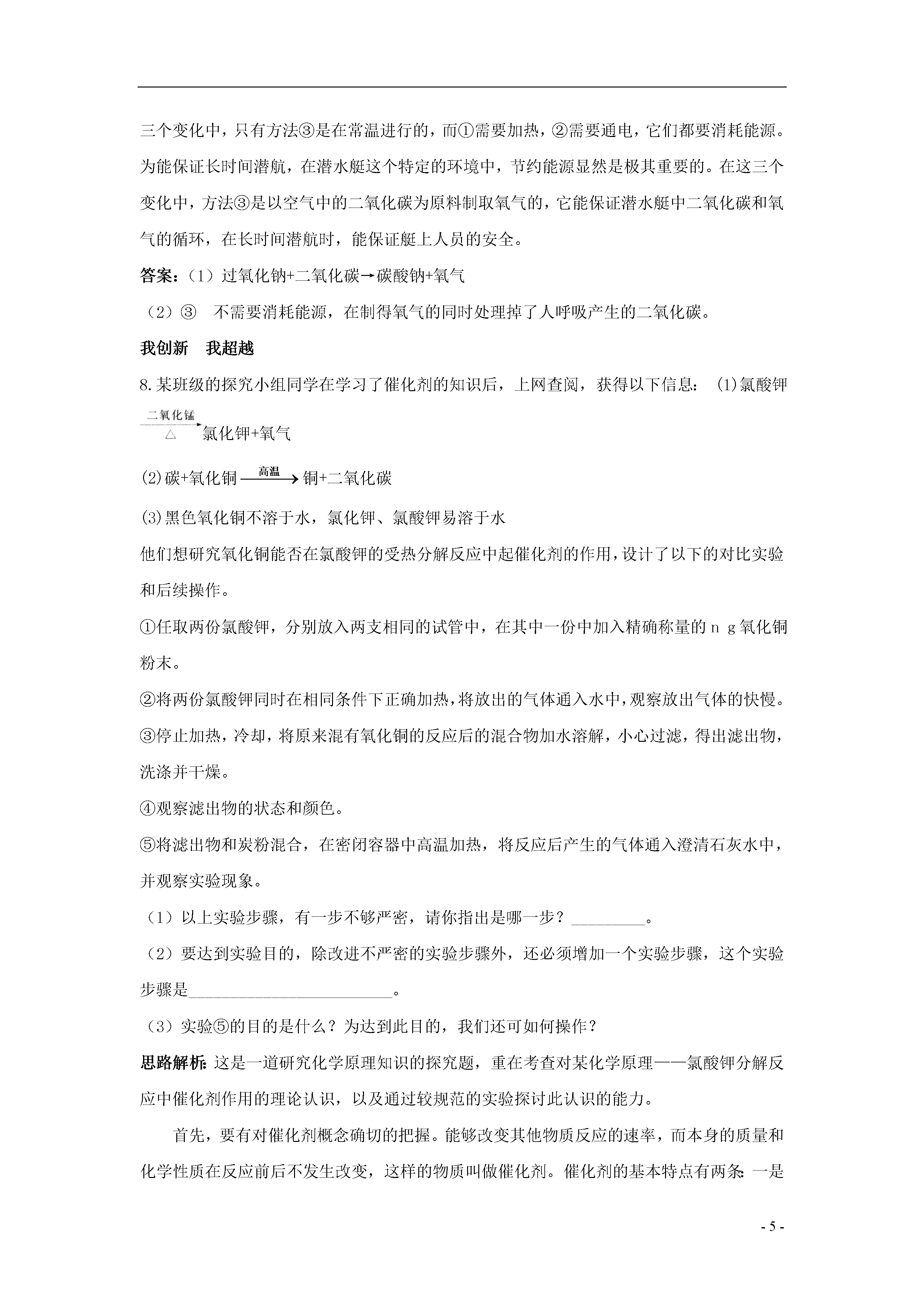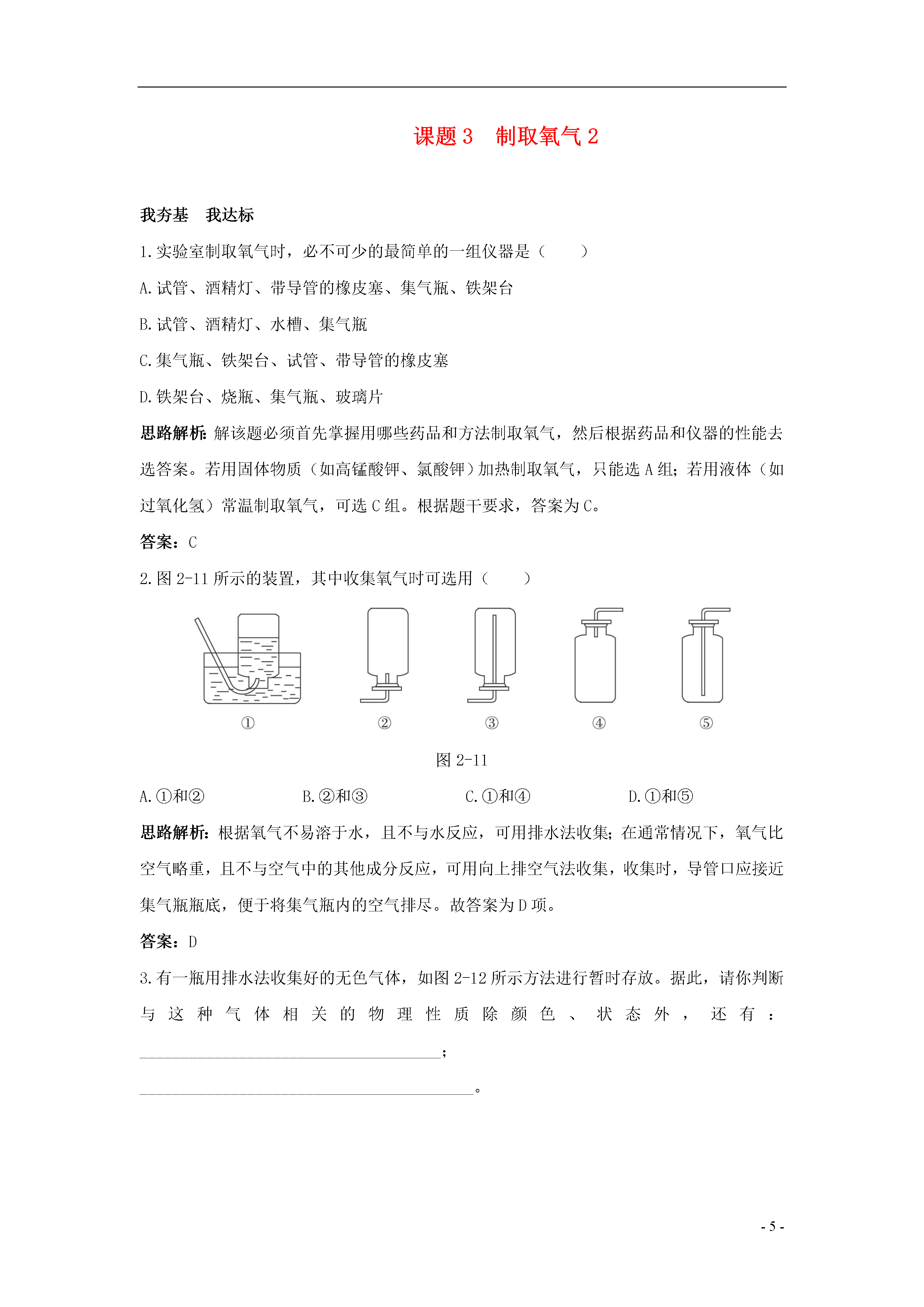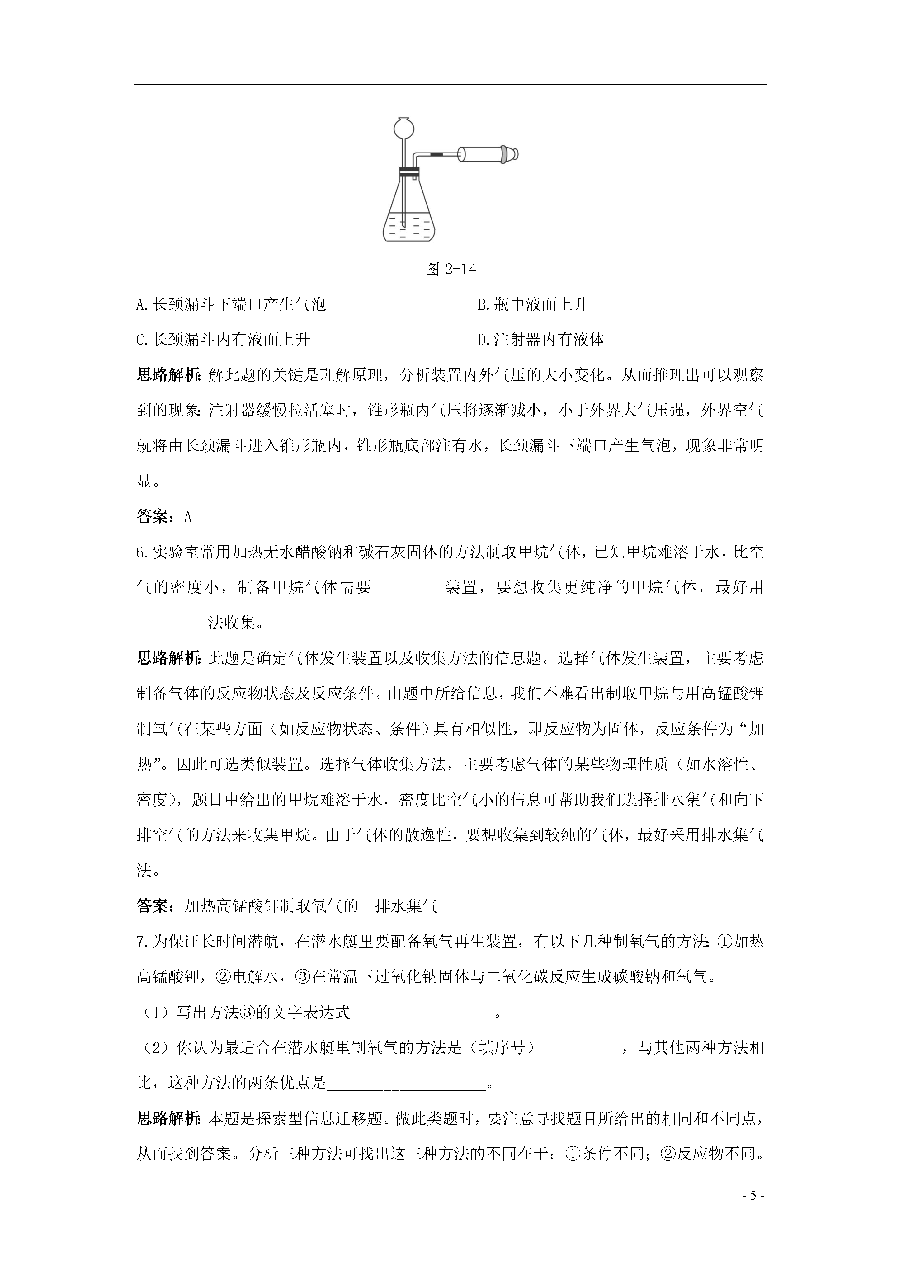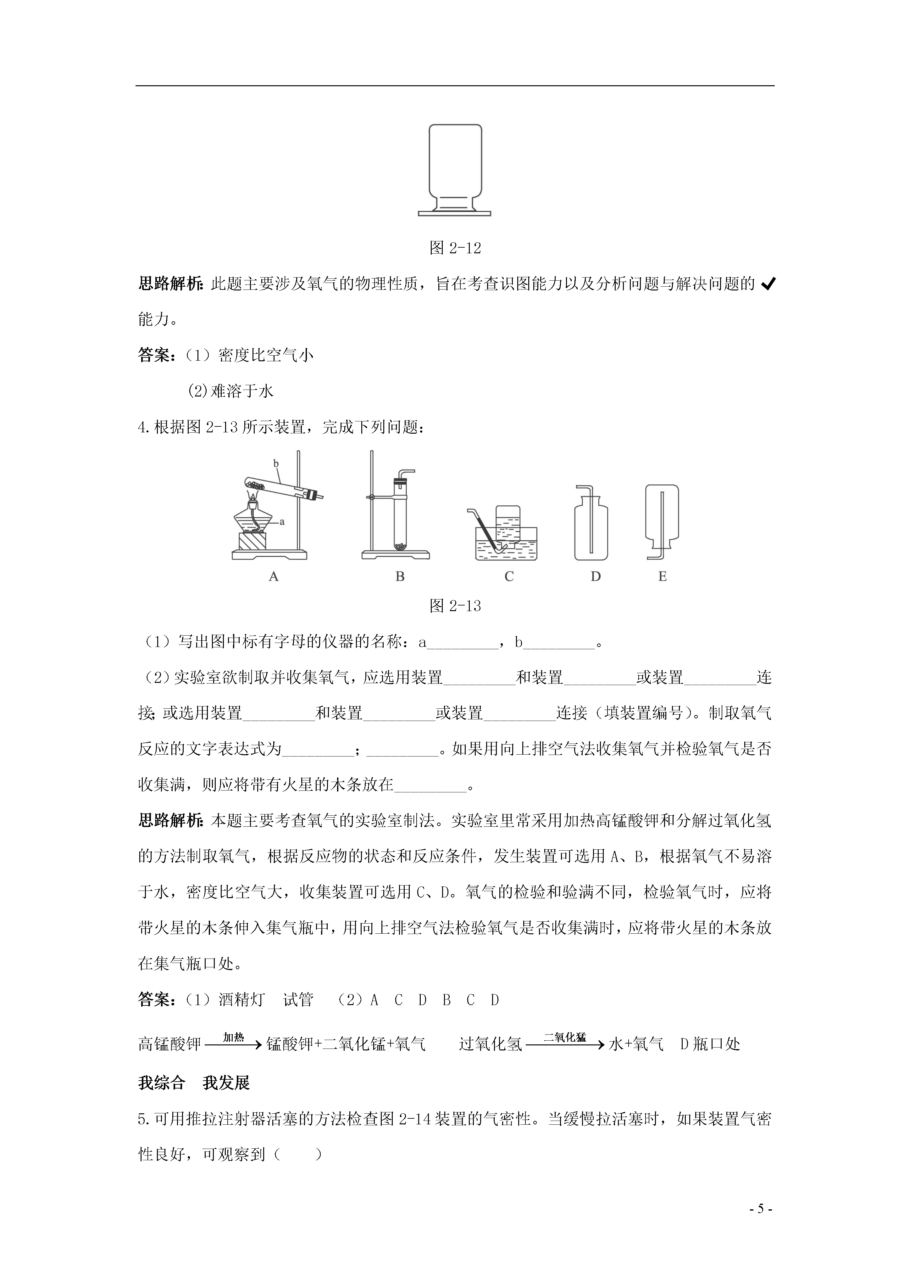 -5-课题3制取氧气2我夯基我达标1.实验室制取氧气时,必不可少的最简单的一组仪器是()A.试管、酒精灯、带导管的橡皮塞、集气瓶、铁架台B.试管、酒精灯、水槽、集气瓶C.集气瓶、铁架台、试管、带导管的橡皮塞D.铁架台、烧瓶、集气瓶、玻璃片思路解析:解该题必须首先掌握用哪些药品和方法制取氧气,然后根据药品和仪器的性能去选答案。若用固体物质(如高锰酸钾、氯酸钾)加热制取氧气,只能选A组;若用液体(如过氧化氢)常温制取氧气,可选C组。根据题干要求,答案为C。答案:C2.图2-11所示的装置,其中收集氧气时可选用()图2-11A.①和②B.②和③C.①和④D.①和⑤思路解析:根据氧气不易溶于水,且不与水反应,可用排水法收集;在通常情况下,氧气比空气略重,且不与空气中的其他成分反应,可用向上排空气法收集,收集时,导管口应接近集气瓶瓶底,便于将集气瓶内的空气排尽。故答案为D项。答案:D3.有一瓶用排水法收集好的无色气体,如图2-12所示方法进行暂时存放。据此,请你判断与这种气体相关的物理性质除颜色、状态外,还有:_____________________________________;_________________________________________。图2-12思路解析:此题主要涉及氧气的物理性质,旨在考查识图能力以及分析问题与解决问题的能力。答案:(1)密度比空气小(2)难溶于水4.根据图2-13所示装置,完成下列问题:图2-13(1)写出图中标有字母的仪器的名称:a_________,b_________。(2)实验室欲制取并收集氧气,应选用装置_________和装置_________或装置_________连接;或选用装置_________和装置_________或装置_________连接(填装置编号)。制取氧气反应的文字表达式为_________;_________。如果用向上排空气法收集氧气并检验氧气是否收集满,则应将带有火星的木条放在_________。思路解析:本题主要考查氧气的实验室制法。实验室里常采用加热高锰酸钾和分解过氧化氢的方法制取氧气,根据反应物的状态和反应条件,发生装置可选用A、B,根据氧气不易溶于水,密度比空气大,收集装置可选用C、D。氧气的检验和验满不同,检验氧气时,应将带火星的木条伸入集气瓶中,用向上排空气法检验氧气是否收集满时,应将带火星的木条放在集气瓶口处。答案:(1)酒精灯试管(2)ACDBCD高锰酸钾锰酸钾+二氧化锰+氧气过氧化氢水+氧气D瓶口处我综合我发展5.可用推拉注射器活塞的方法检查图2-14装置的气密性。当缓慢拉活塞时,如果装置气密性良好,可观察到()图2-14A.长颈漏斗下端口产生气泡B.瓶中液面上升C.长颈漏斗内有液面上升D.注射器内有液体思路解析:解此题的关键是理解原理,分析装置内外气压的大小变化。从而推理出可以观察到的现象:注射器缓慢拉活塞时,锥形瓶内气压将逐渐减小,小于外界大气压强,外界空气就将由长颈漏斗进入锥形瓶内,锥形瓶底部注有水,长颈漏斗下端口产生气泡,现象非常明显。答案:A6.实验室常用加热无水醋酸钠和碱石灰固体的方法制取甲烷气体,已知甲烷难溶于水,比空气的密度小,制备甲烷气体需要_________装置,要想收集更纯净的甲烷气体,最好用_________法收集。思路解析:此题是确定气体发生装置以及收集方法的信息题。选择气体发生装置,主要考虑制备气体的反应物状态及反应条件。由题中所给信息,我们不难看出制取甲烷与用高锰酸钾制氧气在某些方面(如反应物状态、条件)具有相似性,即反应物为固体,反应条件为“加热”。因此可选类似装置。选择气体收集方法,主要考虑气体的某些物理性质(如水溶性、密度),题目中给出的甲烷难溶于水,密度比空气小的信息可帮助我们选择排水集气和向下排空气的方法来收集甲烷。由于气体的散逸性,要想收集到较纯的气体,最好采用排水集气法。答案:加热高锰酸钾制取氧气的排水集气7.为保证长时间潜航,在潜水艇里要配备氧气再生装置,有以下几种制氧气的方法:①加热高锰酸钾,②电解水,③在常温下过氧化钠固体与二氧化碳反应生成碳酸钠和氧气。(1)写出方法③的文字表达式__________________。(2)你认为最适合在潜水艇里制氧气的方法是(填序号)__________,与其他两种方法相比,这种方法的两条优点是____________________。思路解析:本题是探索型信息迁移题。做此类题时,要注意寻找题目所给出的相同和不同点,从而找到答案。分析三种方法可找出这三种方法的不同在于:①条件不同;②反应物不同。三个变化中,只有方法③是在常温进行的,而①需要