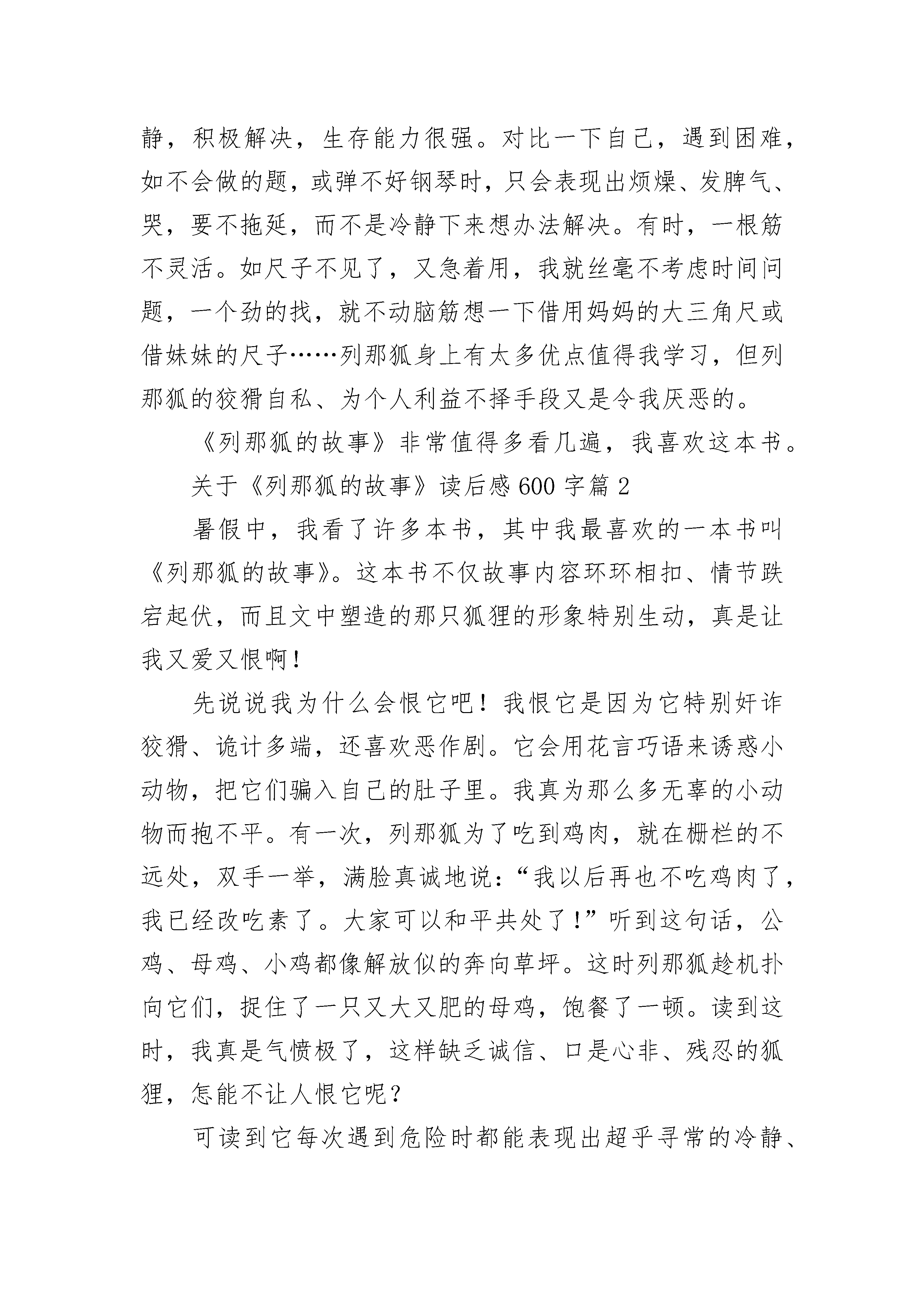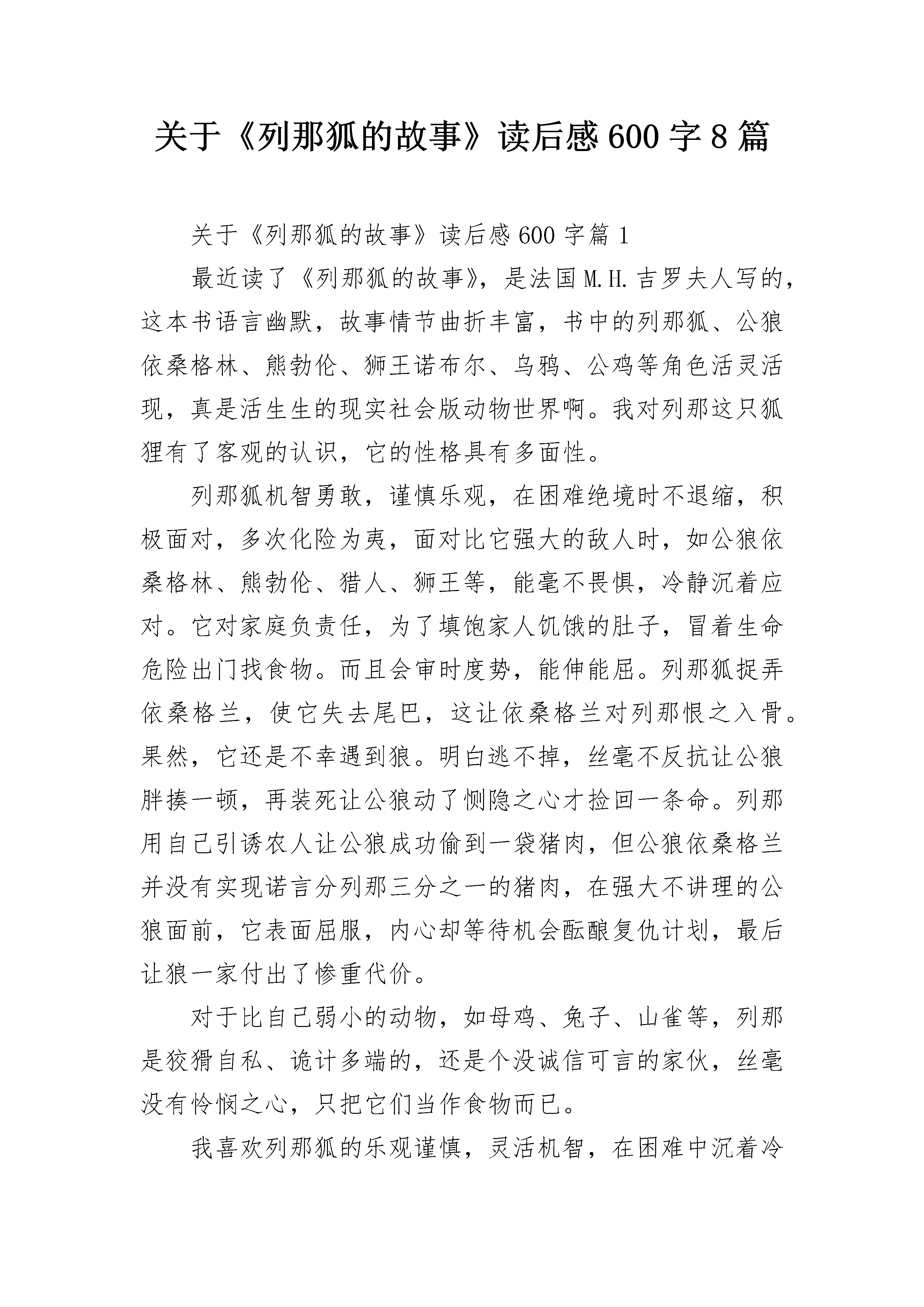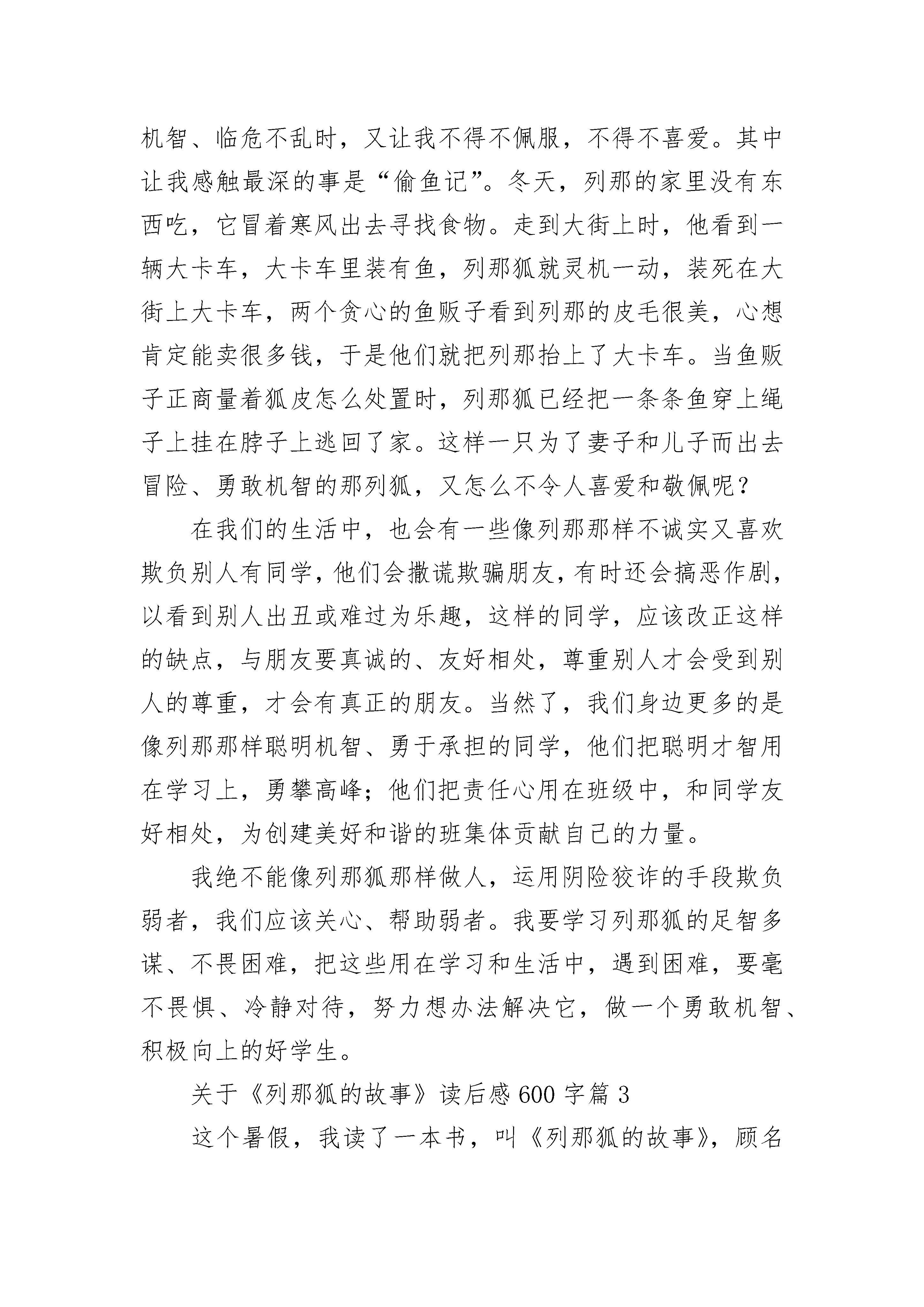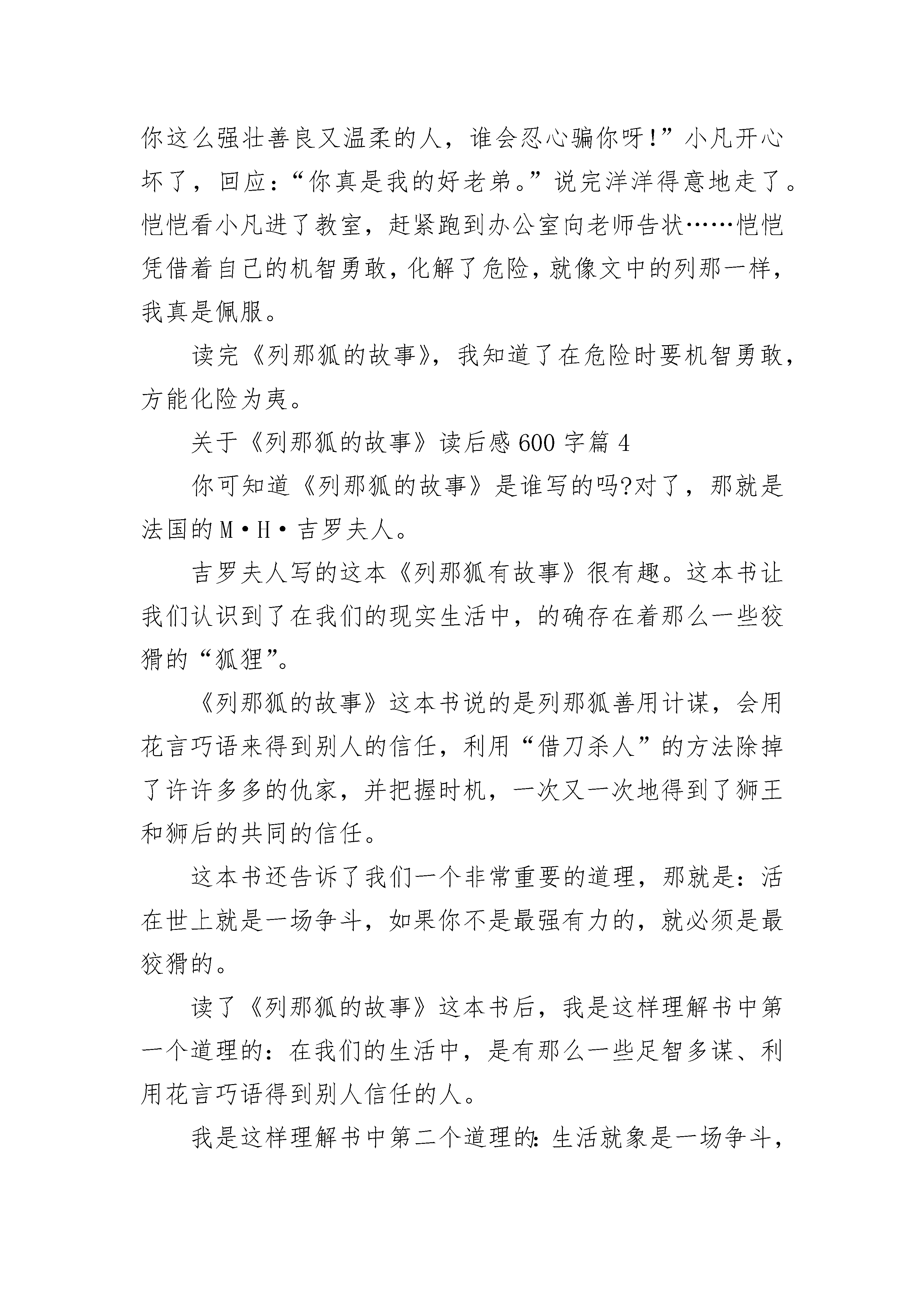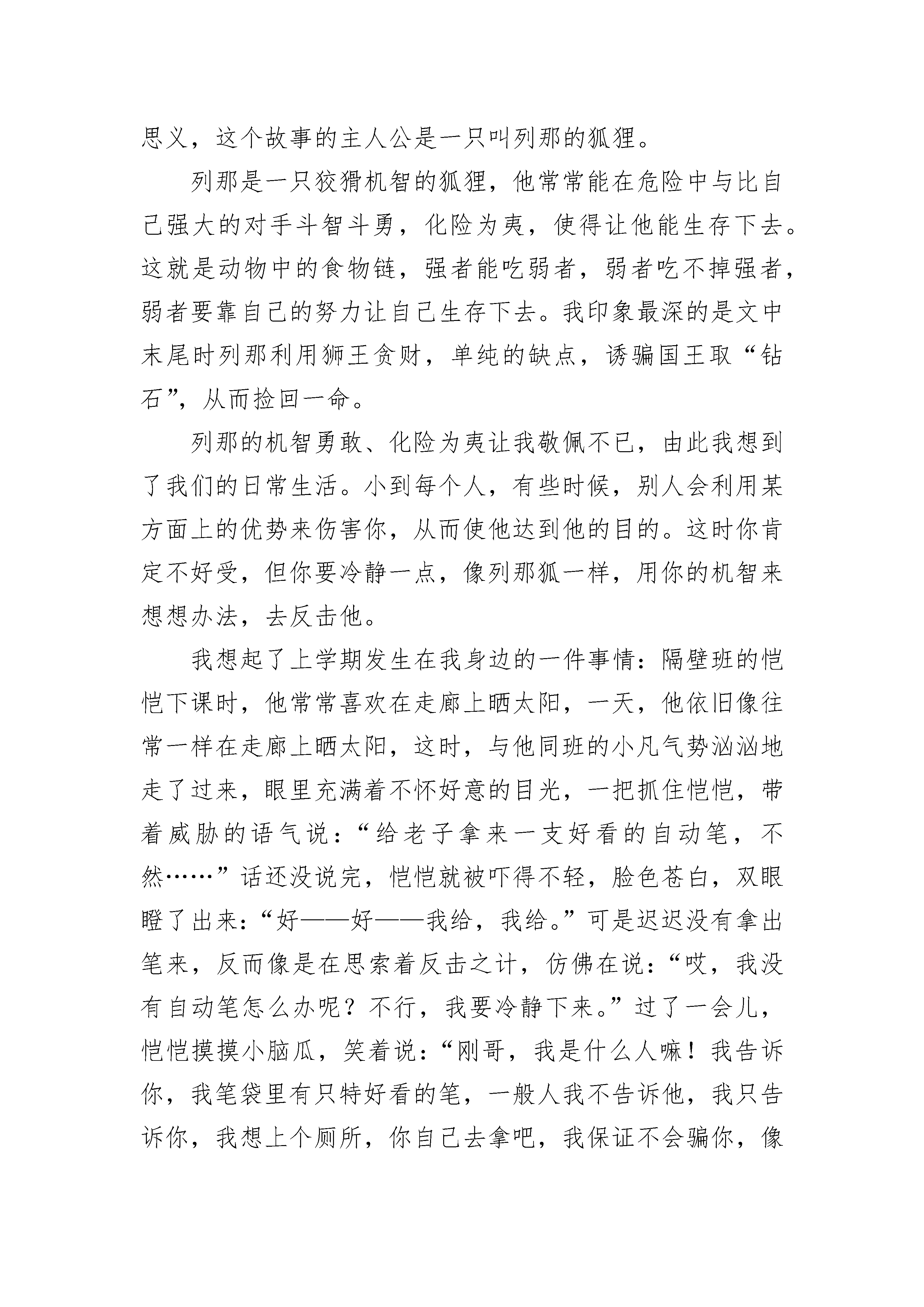 关于《列那狐的故事》读后感600字8篇关于《列那狐的故事》读后感600字篇1最近读了《列那狐的故事》,是法国M.H.吉罗夫人写的,这本书语言幽默,故事情节曲折丰富,书中的列那狐、公狼依桑格林、熊勃伦、狮王诺布尔、乌鸦、公鸡等角色活灵活现,真是活生生的现实社会版动物世界啊。我对列那这只狐狸有了客观的认识,它的性格具有多面性。列那狐机智勇敢,谨慎乐观,在困难绝境时不退缩,积极面对,多次化险为夷,面对比它强大的敌人时,如公狼依桑格林、熊勃伦、猎人、狮王等,能毫不畏惧,冷静沉着应对。它对家庭负责任,为了填饱家人饥饿的肚子,冒着生命危险出门找食物。而且会审时度势,能伸能屈。列那狐捉弄依桑格兰,使它失去尾巴,这让依桑格兰对列那恨之入骨。果然,它还是不幸遇到狼。明白逃不掉,丝毫不反抗让公狼胖揍一顿,再装死让公狼动了恻隐之心才捡回一条命。列那用自己引诱农人让公狼成功偷到一袋猪肉,但公狼依桑格兰并没有实现诺言分列那三分之一的猪肉,在强大不讲理的公狼面前,它表面屈服,内心却等待机会酝酿复仇计划,最后让狼一家付出了惨重代价。对于比自己弱小的动物,如母鸡、兔子、山雀等,列那是狡猾自私、诡计多端的,还是个没诚信可言的家伙,丝毫没有怜悯之心,只把它们当作食物而已。我喜欢列那狐的乐观谨慎,灵活机智,在困难中沉着冷静,积极解决,生存能力很强。对比一下自己,遇到困难,如不会做的题,或弹不好钢琴时,只会表现出烦燥、发脾气、哭,要不拖延,而不是冷静下来想办法解决。有时,一根筋不灵活。如尺子不见了,又急着用,我就丝毫不考虑时间问题,一个劲的找,就不动脑筋想一下借用妈妈的大三角尺或借妹妹的尺子……列那狐身上有太多优点值得我学习,但列那狐的狡猾自私、为个人利益不择手段又是令我厌恶的。《列那狐的故事》非常值得多看几遍,我喜欢这本书。关于《列那狐的故事》读后感600字篇2暑假中,我看了许多本书,其中我最喜欢的一本书叫《列那狐的故事》。这本书不仅故事内容环环相扣、情节跌宕起伏,而且文中塑造的那只狐狸的形象特别生动,真是让我又爱又恨啊!先说说我为什么会恨它吧!我恨它是因为它特别奸诈狡猾、诡计多端,还喜欢恶作剧。它会用花言巧语来诱惑小动物,把它们骗入自己的肚子里。我真为那么多无辜的小动物而抱不平。有一次,列那狐为了吃到鸡肉,就在栅栏的不远处,双手一举,满脸真诚地说:“我以后再也不吃鸡肉了,我已经改吃素了。大家可以和平共处了!”听到这句话,公鸡、母鸡、小鸡都像解放似的奔向草坪。这时列那狐趁机扑向它们,捉住了一只又大又肥的母鸡,饱餐了一顿。读到这时,我真是气愤极了,这样缺乏诚信、口是心非、残忍的狐狸,怎能不让人恨它呢?可读到它每次遇到危险时都能表现出超乎寻常的冷静、机智、临危不乱时,又让我不得不佩服,不得不喜爱。其中让我感触最深的事是“偷鱼记”。冬天,列那的家里没有东西吃,它冒着寒风出去寻找食物。走到大街上时,他看到一辆大卡车,大卡车里装有鱼,列那狐就灵机一动,装死在大街上大卡车,两个贪心的鱼贩子看到列那的皮毛很美,心想肯定能卖很多钱,于是他们就把列那抬上了大卡车。当鱼贩子正商量着狐皮怎么处置时,列那狐已经把一条条鱼穿上绳子上挂在脖子上逃回了家。这样一只为了妻子和儿子而出去冒险、勇敢机智的那列狐,又怎么不令人喜爱和敬佩呢?在我们的生活中,也会有一些像列那那样不诚实又喜欢欺负别人有同学,他们会撒谎欺骗朋友,有时还会搞恶作剧,以看到别人出丑或难过为乐趣,这样的同学,应该改正这样的缺点,与朋友要真诚的、友好相处,尊重别人才会受到别人的尊重,才会有真正的朋友。当然了,我们身边更多的是像列那那样聪明机智、勇于承担的同学,他们把聪明才智用在学习上,勇攀高峰;他们把责任心用在班级中,和同学友好相处,为创建美好和谐的班集体贡献自己的力量。我绝不能像列那狐那样做人,运用阴险狡诈的手段欺负弱者,我们应该关心、帮助弱者。我要学习列那狐的足智多谋、不畏困难,把这些用在学习和生活中,遇到困难,要毫不畏惧、冷静对待,努力想办法解决它,做一个勇敢机智、积极向上的好学生。关于《列那狐的故事》读后感600字篇3这个暑假,我读了一本书,叫《列那狐的故事》,顾名思义,这个故事的主人公是一只叫列那的狐狸。列那是一只狡猾机智的狐狸,他常常能在危险中与比自己强大的对手斗智斗勇,化险为夷,使得让他能生存下去。这就是动物中的食物链,强者能吃弱者,弱者吃不掉强者,弱者要靠自己的努力让自己生存下去。我印象最深的是文中末尾时列那利用狮王贪财,单纯的缺点,诱骗国王取“钻石”,从而捡回一命。列那的机智勇敢、化险为夷让我敬佩不已,由此我想到了我们的日常生活。小到每个人,有些时候,别人会利用某方面上的优势来伤害你,从而使他达到他的目的。这时你肯定不好受,但你要冷静一点,像列那狐一样,用你的机智来想想办法,去反击他。我想起了上学期发生在我身边