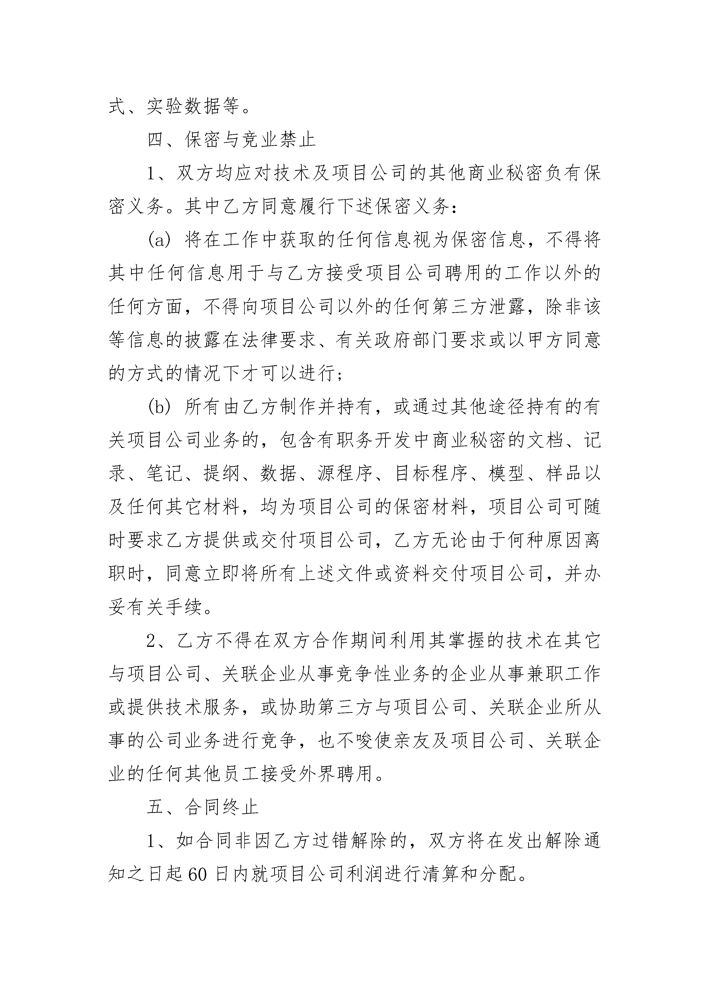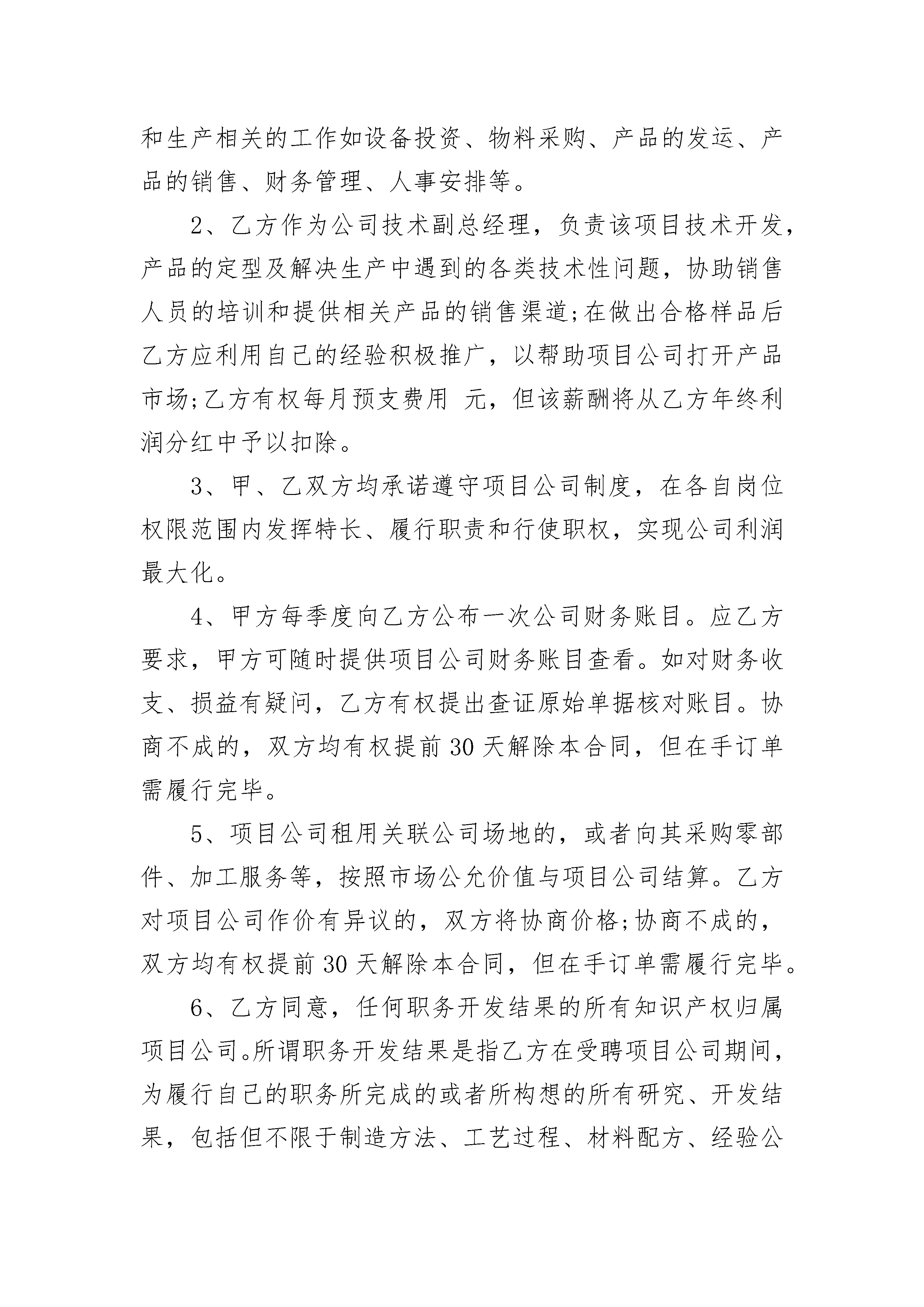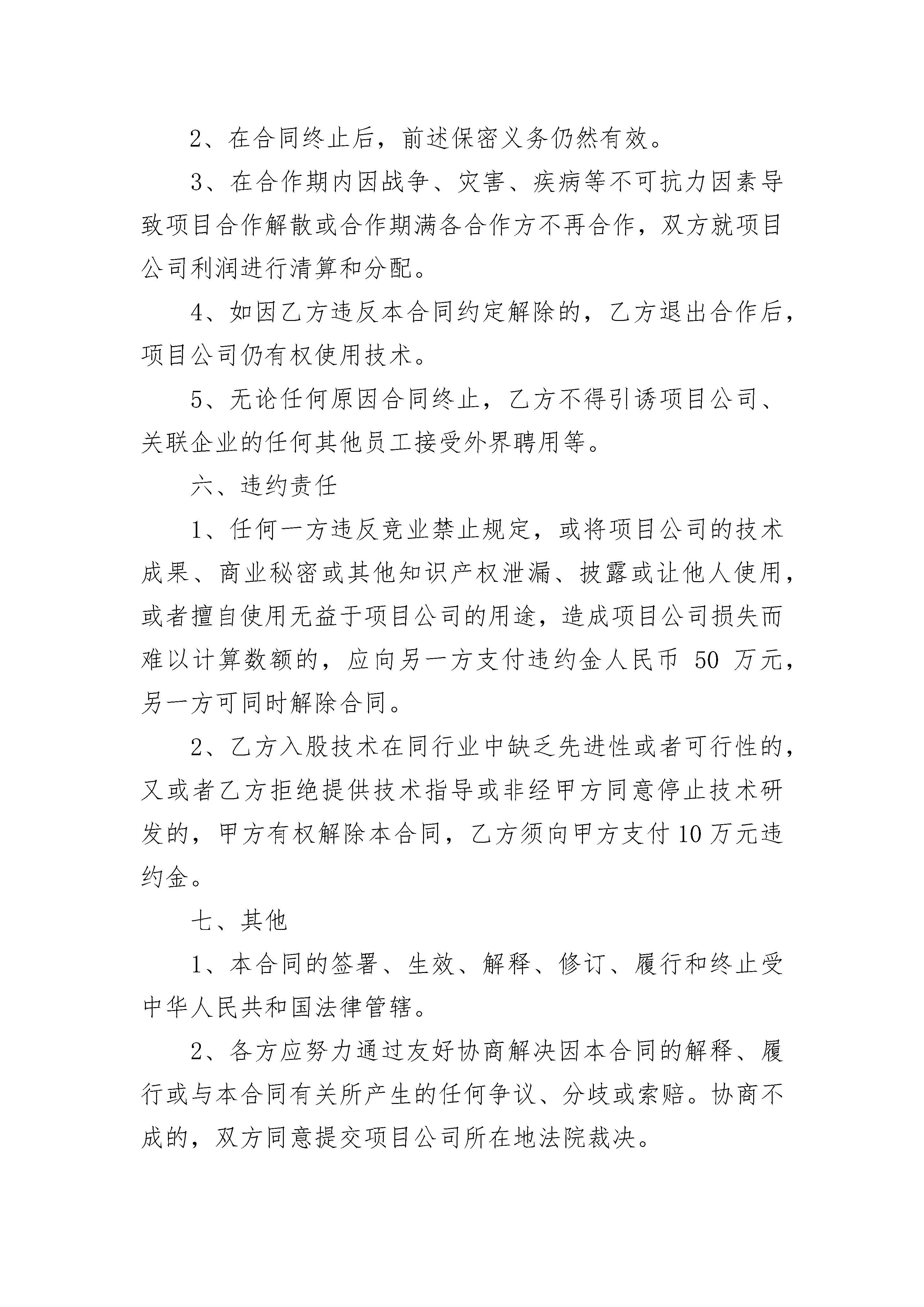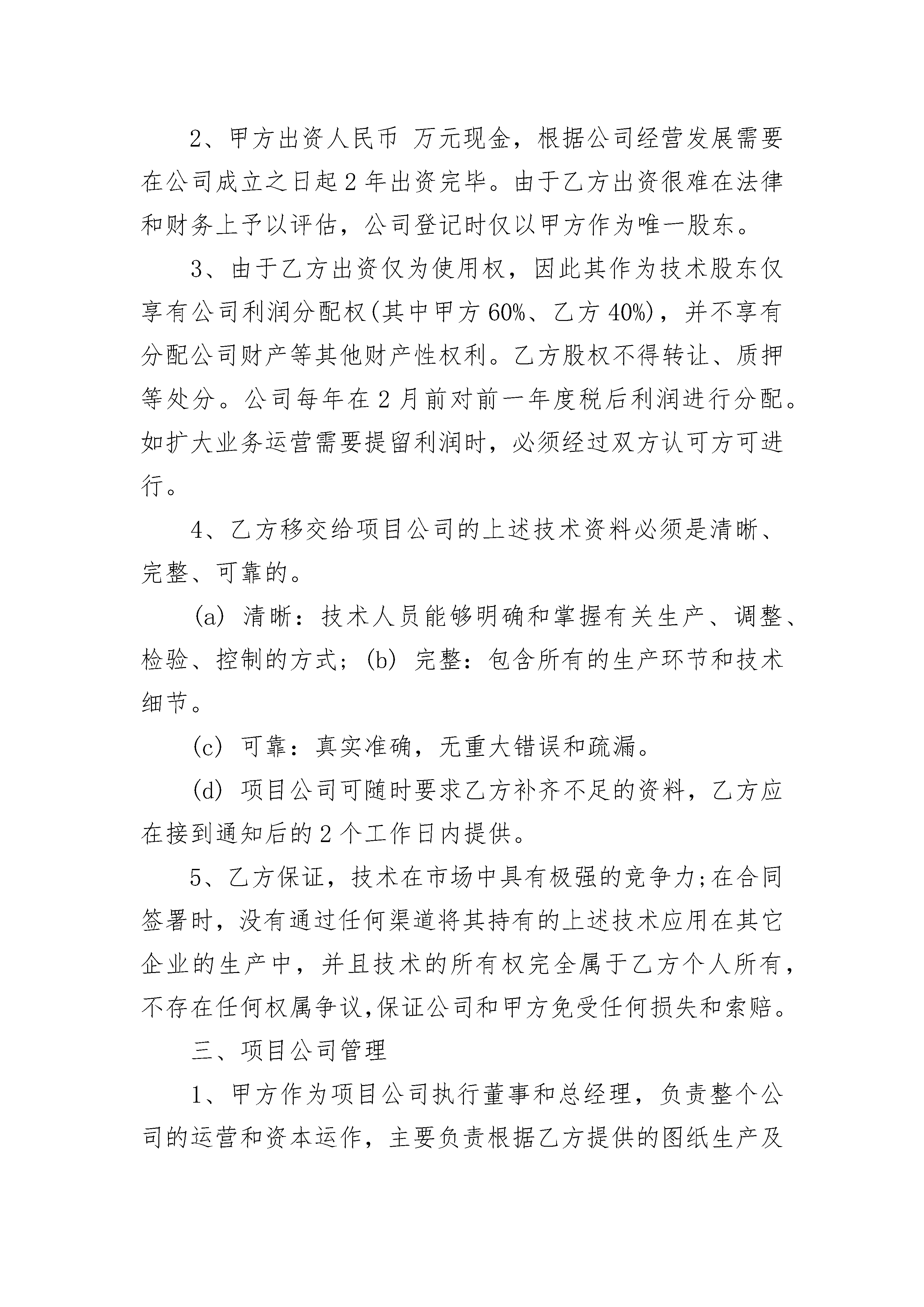 科技公司技术入股合同科技公司技术入股合同(通用3篇)科技公司技术入股合同篇1甲方:住址:身份证号:乙方:住址:身份证号:鉴于甲方目前投资有XX有限公司(以下简称“关联公司”),已拥有相当规模的市场客户,管理团队的组建和运作已趋完善,具有一定的品牌知名度和运作资金,经营运作状况良好;乙方具有自动化设备机械生产的技术秘密和诀窍;因此,甲乙双方在平等自愿,互惠互利,协商一致的基础上,就甲方以资金、乙方以技术共同出资设立项目公司一事达成本合同,以资遵照履行:一、项目公司概况1、项目公司名称暂定为有限公司。2、项目公司注册资本为人民币万元。3、项目公司的主要业务范围为自动化设备机械生产和销售等,暂定经营期限为10年。4、项目公司具体设立事宜和前期筹办事项由甲方安排,相关费用计入公司开办费用。二、各方出资1、乙方同意以其拥有的自动化设备机械生产的`技术秘密和诀窍(以下简称“技术”)的独家使用权和乙方的长期劳务服务作为出资。2、甲方出资人民币万元现金,根据公司经营发展需要在公司成立之日起2年出资完毕。由于乙方出资很难在法律和财务上予以评估,公司登记时仅以甲方作为唯一股东。3、由于乙方出资仅为使用权,因此其作为技术股东仅享有公司利润分配权(其中甲方60%、乙方40%),并不享有分配公司财产等其他财产性权利。乙方股权不得转让、质押等处分。公司每年在2月前对前一年度税后利润进行分配。如扩大业务运营需要提留利润时,必须经过双方认可方可进行。4、乙方移交给项目公司的上述技术资料必须是清晰、完整、可靠的。(a)清晰:技术人员能够明确和掌握有关生产、调整、检验、控制的方式;(b)完整:包含所有的生产环节和技术细节。(c)可靠:真实准确,无重大错误和疏漏。(d)项目公司可随时要求乙方补齐不足的资料,乙方应在接到通知后的2个工作日内提供。5、乙方保证,技术在市场中具有极强的竞争力;在合同签署时,没有通过任何渠道将其持有的上述技术应用在其它企业的生产中,并且技术的所有权完全属于乙方个人所有,不存在任何权属争议,保证公司和甲方免受任何损失和索赔。三、项目公司管理1、甲方作为项目公司执行董事和总经理,负责整个公司的运营和资本运作,主要负责根据乙方提供的图纸生产及和生产相关的工作如设备投资、物料采购、产品的发运、产品的销售、财务管理、人事安排等。2、乙方作为公司技术副总经理,负责该项目技术开发,产品的定型及解决生产中遇到的各类技术性问题,协助销售人员的培训和提供相关产品的销售渠道;在做出合格样品后乙方应利用自己的经验积极推广,以帮助项目公司打开产品市场;乙方有权每月预支费用元,但该薪酬将从乙方年终利润分红中予以扣除。3、甲、乙双方均承诺遵守项目公司制度,在各自岗位权限范围内发挥特长、履行职责和行使职权,实现公司利润最大化。4、甲方每季度向乙方公布一次公司财务账目。应乙方要求,甲方可随时提供项目公司财务账目查看。如对财务收支、损益有疑问,乙方有权提出查证原始单据核对账目。协商不成的,双方均有权提前30天解除本合同,但在手订单需履行完毕。5、项目公司租用关联公司场地的,或者向其采购零部件、加工服务等,按照市场公允价值与项目公司结算。乙方对项目公司作价有异议的,双方将协商价格;协商不成的,双方均有权提前30天解除本合同,但在手订单需履行完毕。6、乙方同意,任何职务开发结果的所有知识产权归属项目公司。所谓职务开发结果是指乙方在受聘项目公司期间,为履行自己的职务所完成的或者所构想的所有研究、开发结果,包括但不限于制造方法、工艺过程、材料配方、经验公式、实验数据等。四、保密与竞业禁止1、双方均应对技术及项目公司的其他商业秘密负有保密义务。其中乙方同意履行下述保密义务:(a)将在工作中获取的任何信息视为保密信息,不得将其中任何信息用于与乙方接受项目公司聘用的工作以外的任何方面,不得向项目公司以外的任何第三方泄露,除非该等信息的披露在法律要求、有关政府部门要求或以甲方同意的方式的情况下才可以进行;(b)所有由乙方制作并持有,或通过其他途径持有的有关项目公司业务的,包含有职务开发中商业秘密的文档、记录、笔记、提纲、数据、源程序、目标程序、模型、样品以及任何其它材料,均为项目公司的保密材料,项目公司可随时要求乙方提供或交付项目公司,乙方无论由于何种原因离职时,同意立即将所有上述文件或资料交付项目公司,并办妥有关手续。2、乙方不得在双方合作期间利用其掌握的技术在其它与项目公司、关联企业从事竞争性业务的企业从事兼职工作或提供技术服务,或协助第三方与项目公司、关联企业所从事的公司业务进行竞争,也不唆使亲友及项目公司、关联企业的任何其他员工接受外界聘用。五、合同终止1、如合同非因乙方过错解除的,双方将在发出解除通知之日起60日内就项目公司利润进行清算和分配。2、在合同终止后,前述保密义务仍