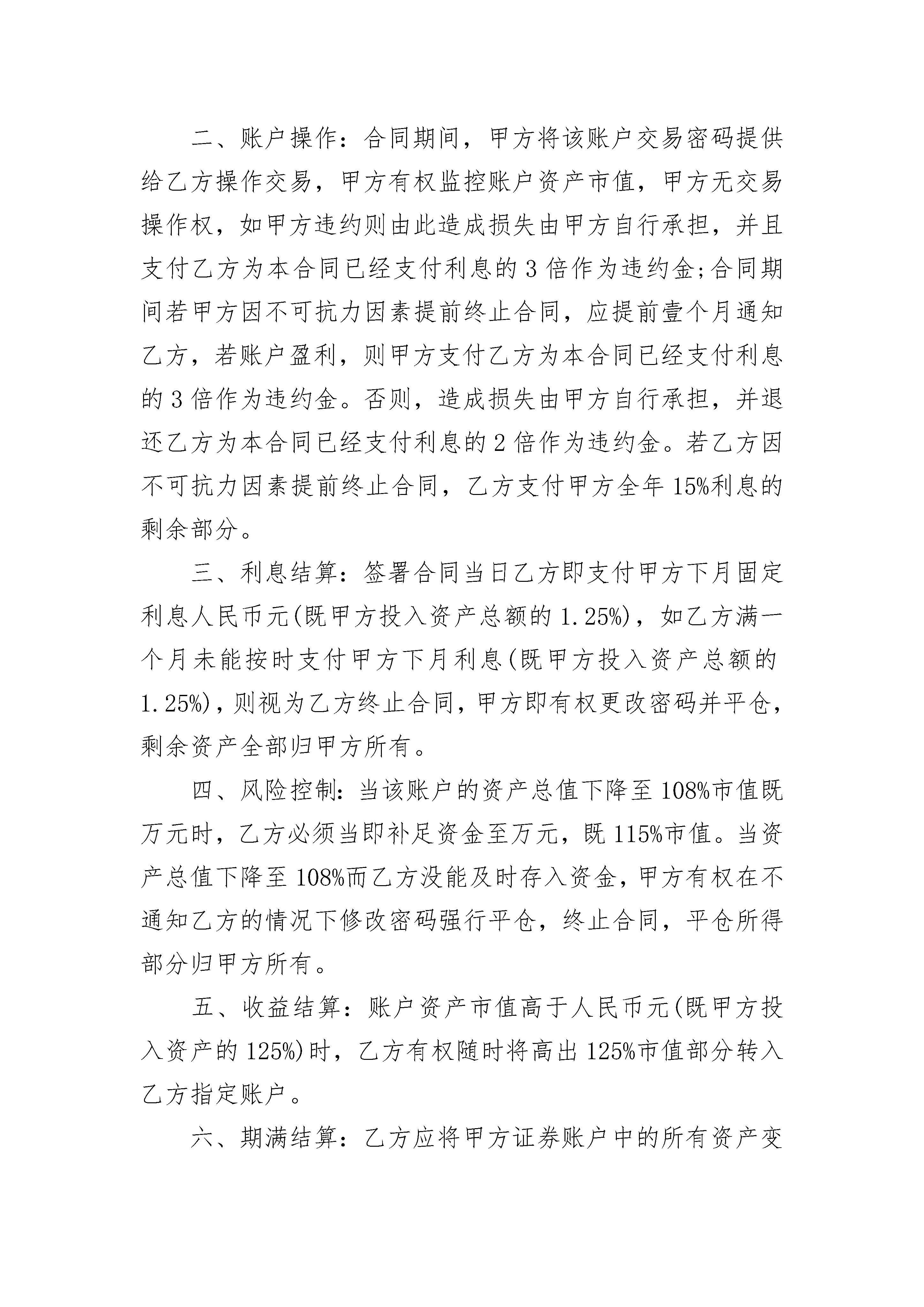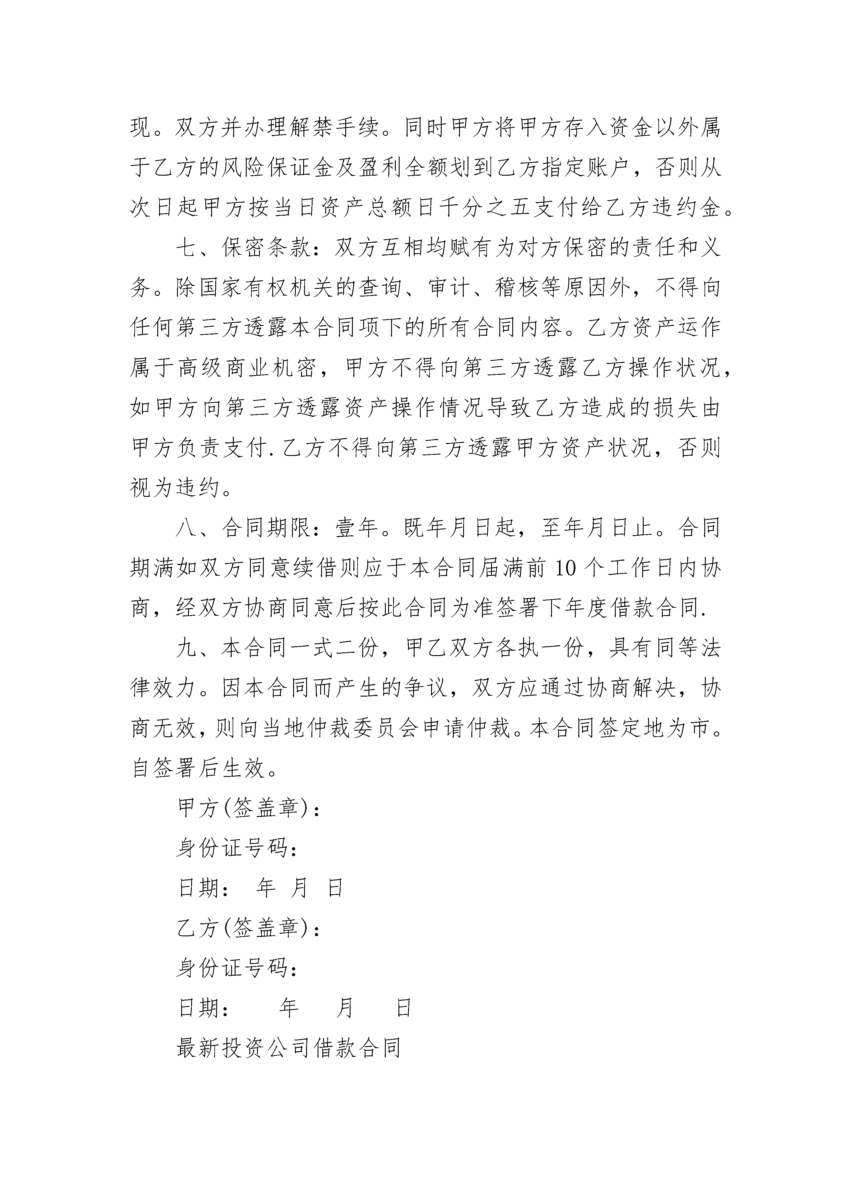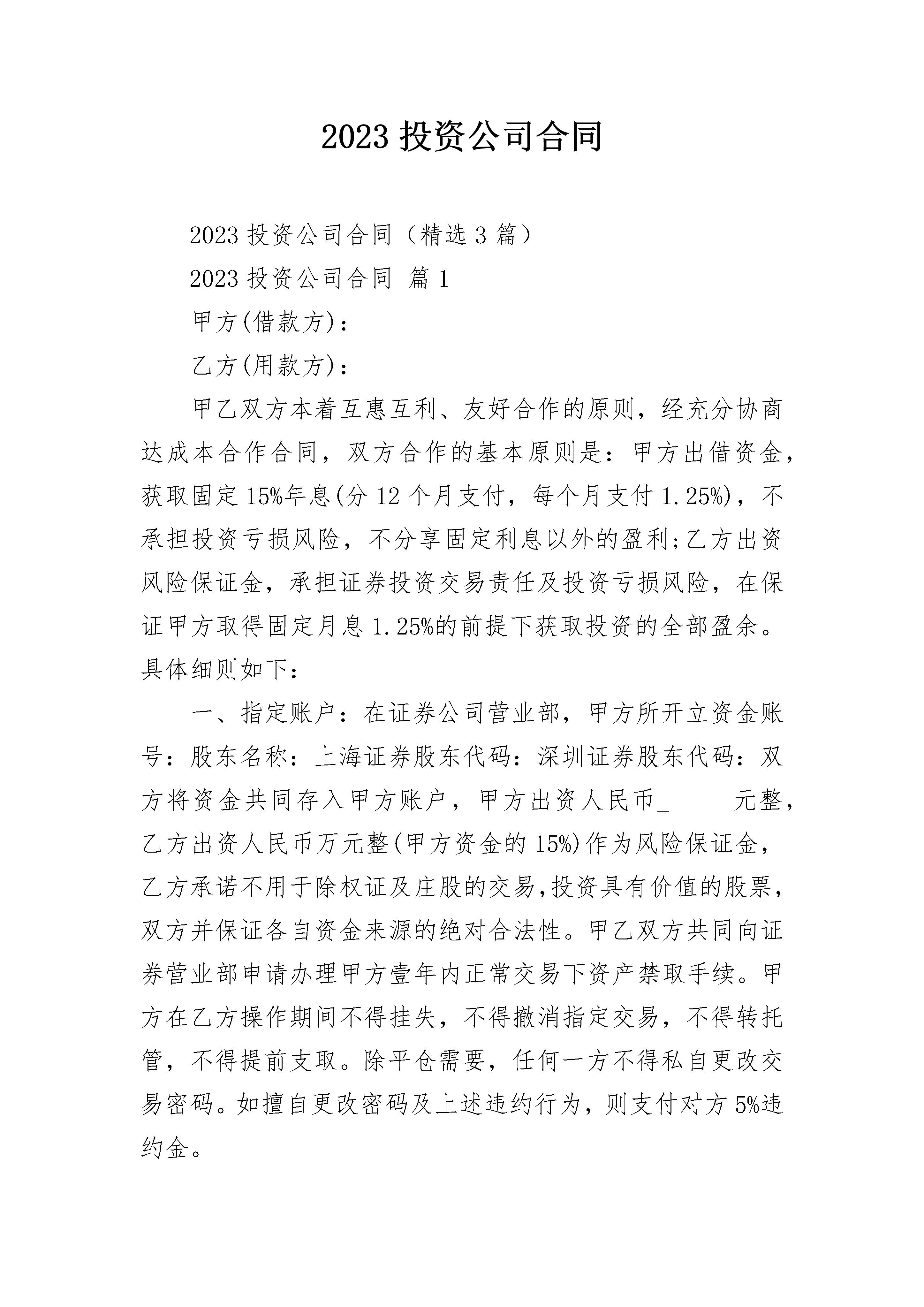 2023投资公司合同2023投资公司合同(精选3篇)2023投资公司合同篇1甲方(借款方):乙方(用款方):甲乙双方本着互惠互利、友好合作的原则,经充分协商达成本合作合同,双方合作的基本原则是:甲方出借资金,获取固定15%年息(分12个月支付,每个月支付1.25%),不承担投资亏损风险,不分享固定利息以外的盈利;乙方出资风险保证金,承担证券投资交易责任及投资亏损风险,在保证甲方取得固定月息1.25%的前提下获取投资的全部盈余。具体细则如下:一、指定账户:在证券公司营业部,甲方所开立资金账号:股东名称:上海证券股东代码:深圳证券股东代码:双方将资金共同存入甲方账户,甲方出资人民币_元整,乙方出资人民币万元整(甲方资金的15%)作为风险保证金,乙方承诺不用于除权证及庄股的交易,投资具有价值的股票,双方并保证各自资金来源的绝对合法性。甲乙双方共同向证券营业部申请办理甲方壹年内正常交易下资产禁取手续。甲方在乙方操作期间不得挂失,不得撤消指定交易,不得转托管,不得提前支取。除平仓需要,任何一方不得私自更改交易密码。如擅自更改密码及上述违约行为,则支付对方5%违约金。二、账户操作:合同期间,甲方将该账户交易密码提供给乙方操作交易,甲方有权监控账户资产市值,甲方无交易操作权,如甲方违约则由此造成损失由甲方自行承担,并且支付乙方为本合同已经支付利息的3倍作为违约金;合同期间若甲方因不可抗力因素提前终止合同,应提前壹个月通知乙方,若账户盈利,则甲方支付乙方为本合同已经支付利息的3倍作为违约金。否则,造成损失由甲方自行承担,并退还乙方为本合同已经支付利息的2倍作为违约金。若乙方因不可抗力因素提前终止合同,乙方支付甲方全年15%利息的剩余部分。三、利息结算:签署合同当日乙方即支付甲方下月固定利息人民币元(既甲方投入资产总额的1.25%),如乙方满一个月未能按时支付甲方下月利息(既甲方投入资产总额的1.25%),则视为乙方终止合同,甲方即有权更改密码并平仓,剩余资产全部归甲方所有。四、风险控制:当该账户的资产总值下降至108%市值既万元时,乙方必须当即补足资金至万元,既115%市值。当资产总值下降至108%而乙方没能及时存入资金,甲方有权在不通知乙方的情况下修改密码强行平仓,终止合同,平仓所得部分归甲方所有。五、收益结算:账户资产市值高于人民币元(既甲方投入资产的125%)时,乙方有权随时将高出125%市值部分转入乙方指定账户。六、期满结算:乙方应将甲方证券账户中的所有资产变现。双方并办理解禁手续。同时甲方将甲方存入资金以外属于乙方的风险保证金及盈利全额划到乙方指定账户,否则从次日起甲方按当日资产总额日千分之五支付给乙方违约金。七、保密条款:双方互相均赋有为对方保密的责任和义务。除国家有权机关的查询、审计、稽核等原因外,不得向任何第三方透露本合同项下的所有合同内容。乙方资产运作属于高级商业机密,甲方不得向第三方透露乙方操作状况,如甲方向第三方透露资产操作情况导致乙方造成的损失由甲方负责支付.乙方不得向第三方透露甲方资产状况,否则视为违约。八、合同期限:壹年。既年月日起,至年月日止。合同期满如双方同意续借则应于本合同届满前10个工作日内协商,经双方协商同意后按此合同为准签署下年度借款合同.九、本合同一式二份,甲乙双方各执一份,具有同等法律效力。因本合同而产生的争议,双方应通过协商解决,协商无效,则向当地仲裁委员会申请仲裁。本合同签定地为市。自签署后生效。甲方(签盖章):身份证号码:日期:年月日乙方(签盖章):身份证号码:日期:年月日最新投资公司借款合同贷款方:__________________身份证号码:_________________________借款方:__________________身份证号码:_________________________一、借款期限为日。二、借款用途为三、借款金额借款方向贷款方借款人民币元。四、借款利息自支用贷款之日起,按实际支用数计算利息,并计算复利。在合同规定的借款期内,年利息为%,月利息为%。借款方如果不按期归还借款,逾期部分按金额加收利息%。五、借款期限借款方保证从年月起至年月止,按本合同规定的利息偿还借款。逾期不还的部分,贷款方有权限期追回贷款。六、保证条款(一)借款方用__________________做抵押,到期不能归还贷款方的贷款,贷款方有权处理抵押品。借款方到期如数归还贷款的,抵押权消灭。(二)借款方必须按照借款合同规定的用途使用借款,不得挪作他用,不得用借款进行违法活动。(三)借款方必须按合同规定的期限还本付息。(四)乙方还款保证人____________,为确保本契约的履行,愿与乙方负连带返还借款本息的责任。七、合同争议的解决方式双方协商解决,解决不成,同意提交_______