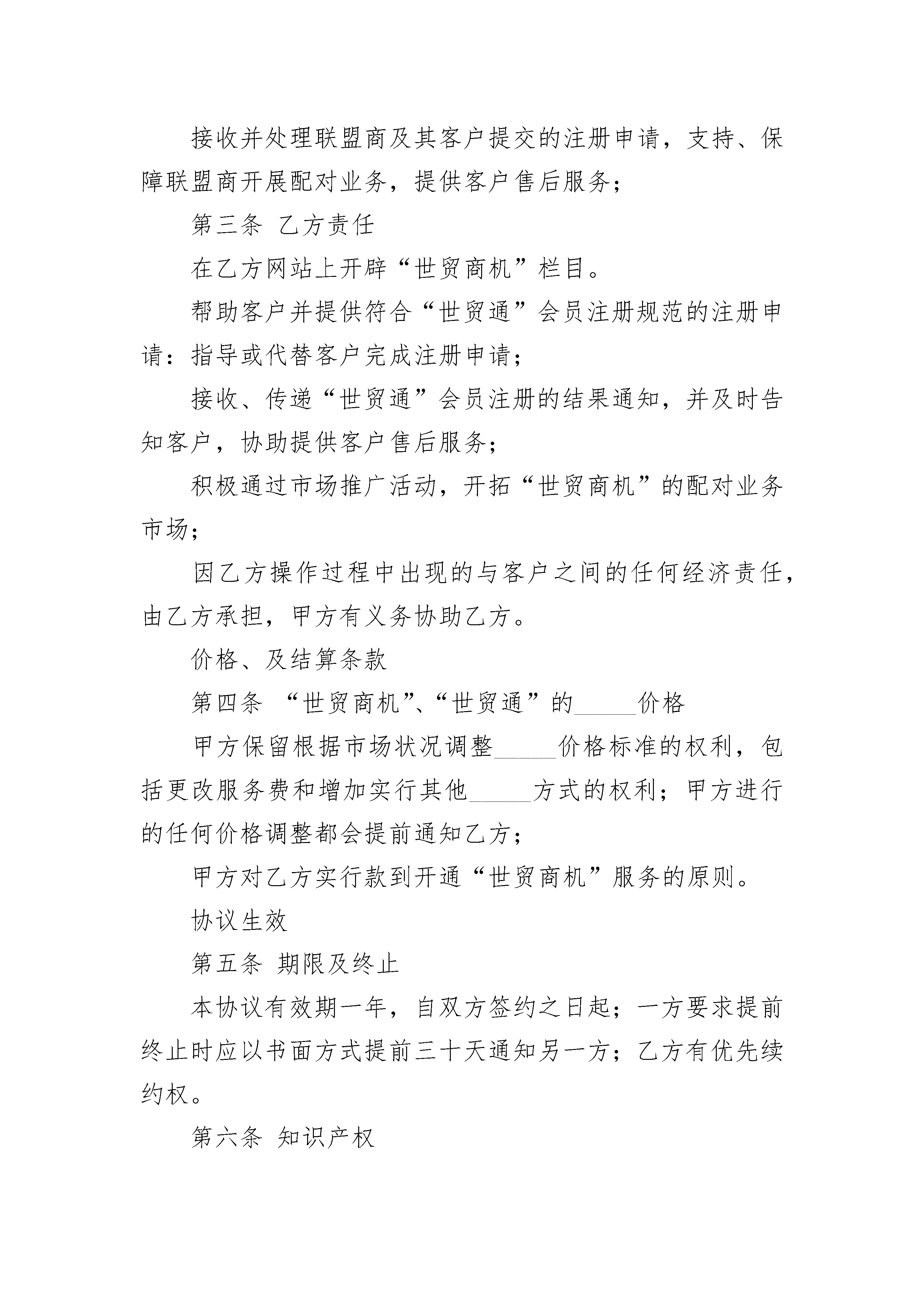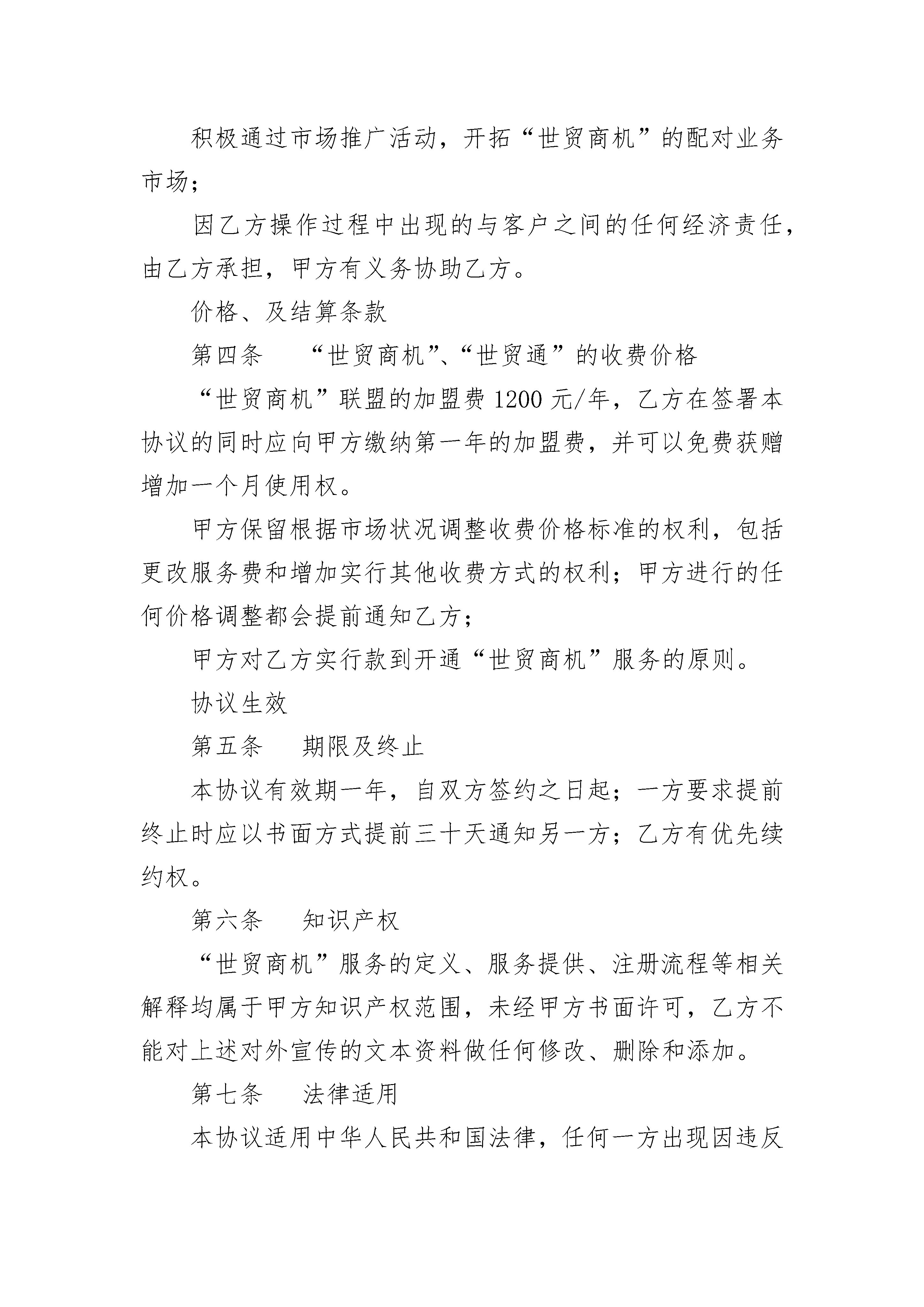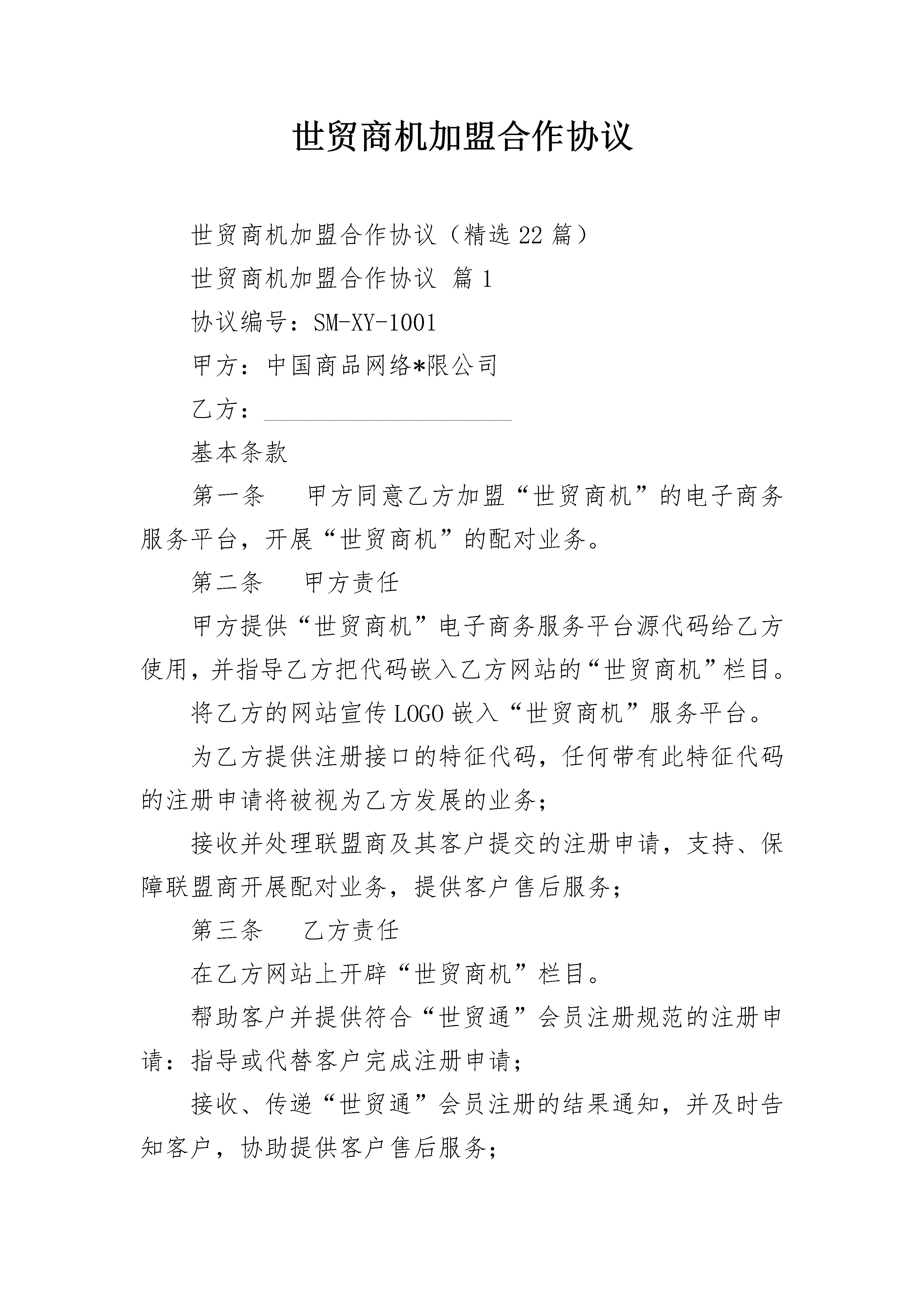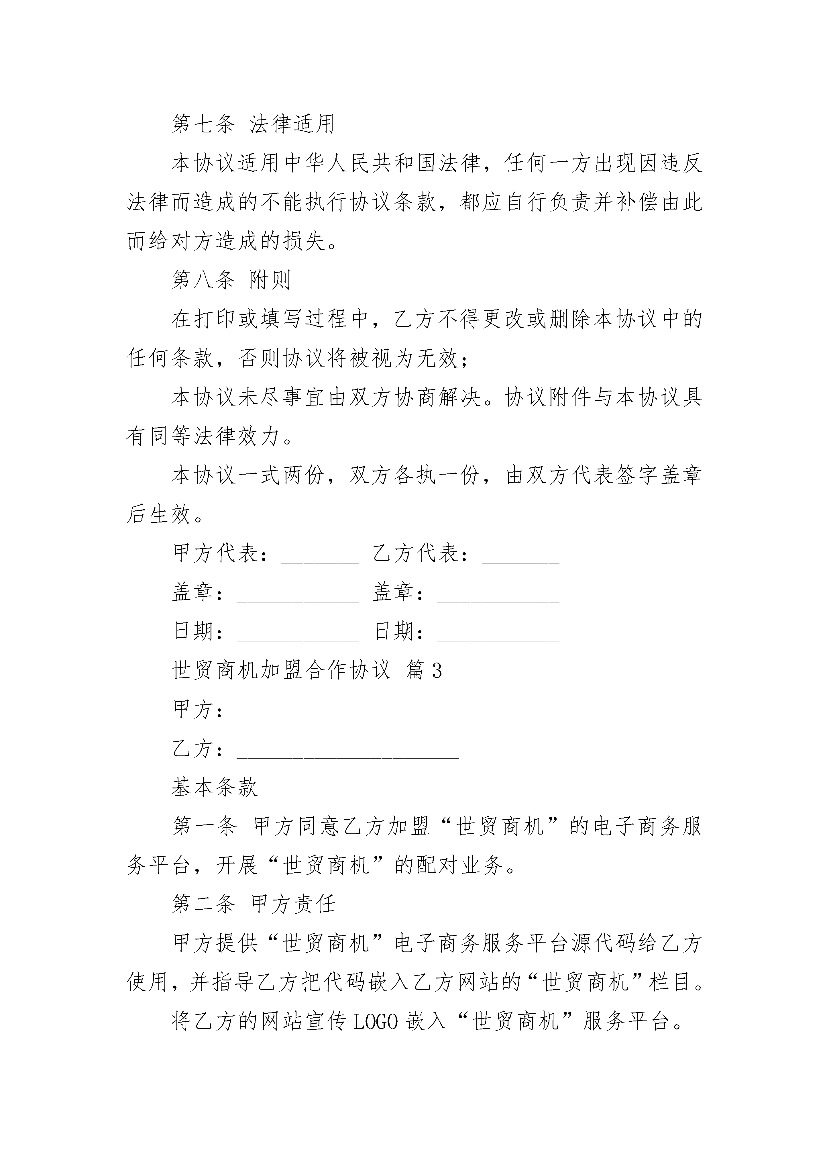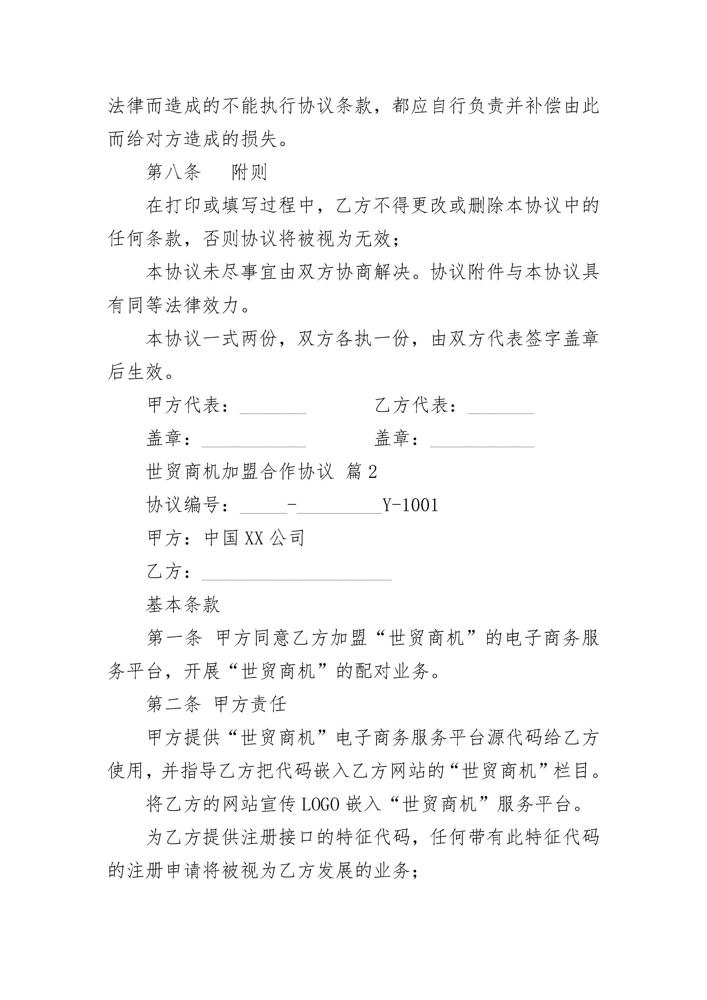 世贸商机加盟合作协议世贸商机加盟合作协议(精选22篇)世贸商机加盟合作协议篇1协议编号:SM-XY-1001甲方:中国商品网络*限公司乙方:____________________基本条款第一条甲方同意乙方加盟“世贸商机”的电子商务服务平台,开展“世贸商机”的配对业务。第二条甲方责任甲方提供“世贸商机”电子商务服务平台源代码给乙方使用,并指导乙方把代码嵌入乙方网站的“世贸商机”栏目。将乙方的网站宣传LOGO嵌入“世贸商机”服务平台。为乙方提供注册接口的特征代码,任何带有此特征代码的注册申请将被视为乙方发展的业务;接收并处理联盟商及其客户提交的注册申请,支持、保障联盟商开展配对业务,提供客户售后服务;第三条乙方责任在乙方网站上开辟“世贸商机”栏目。帮助客户并提供符合“世贸通”会员注册规范的注册申请:指导或代替客户完成注册申请;接收、传递“世贸通”会员注册的结果通知,并及时告知客户,协助提供客户售后服务;积极通过市场推广活动,开拓“世贸商机”的配对业务市场;因乙方操作过程中出现的与客户之间的任何经济责任,由乙方承担,甲方有义务协助乙方。价格、及结算条款第四条“世贸商机”、“世贸通”的收费价格“世贸商机”联盟的加盟费1200元/年,乙方在签署本协议的同时应向甲方缴纳第一年的加盟费,并可以免费获赠增加一个月使用权。甲方保留根据市场状况调整收费价格标准的权利,包括更改服务费和增加实行其他收费方式的权利;甲方进行的任何价格调整都会提前通知乙方;甲方对乙方实行款到开通“世贸商机”服务的原则。协议生效第五条期限及终止本协议有效期一年,自双方签约之日起;一方要求提前终止时应以书面方式提前三十天通知另一方;乙方有优先续约权。第六条知识产权“世贸商机”服务的定义、服务提供、注册流程等相关解释均属于甲方知识产权范围,未经甲方书面许可,乙方不能对上述对外宣传的文本资料做任何修改、删除和添加。第七条法律适用本协议适用中华人民共和国法律,任何一方出现因违反法律而造成的不能执行协议条款,都应自行负责并补偿由此而给对方造成的损失。第八条附则在打印或填写过程中,乙方不得更改或删除本协议中的任何条款,否则协议将被视为无效;本协议未尽事宜由双方协商解决。协议附件与本协议具有同等法律效力。本协议一式两份,双方各执一份,由双方代表签字盖章后生效。甲方代表:_______乙方代表:_______盖章:___________盖章:___________世贸商机加盟合作协议篇2协议编号:_____-_________Y-1001甲方:中国XX公司乙方:____________________基本条款第一条甲方同意乙方加盟“世贸商机”的电子商务服务平台,开展“世贸商机”的配对业务。第二条甲方责任甲方提供“世贸商机”电子商务服务平台源代码给乙方使用,并指导乙方把代码嵌入乙方网站的“世贸商机”栏目。将乙方的网站宣传LOGO嵌入“世贸商机”服务平台。为乙方提供注册接口的特征代码,任何带有此特征代码的注册申请将被视为乙方发展的业务;接收并处理联盟商及其客户提交的注册申请,支持、保障联盟商开展配对业务,提供客户售后服务;第三条乙方责任在乙方网站上开辟“世贸商机”栏目。帮助客户并提供符合“世贸通”会员注册规范的注册申请:指导或代替客户完成注册申请;接收、传递“世贸通”会员注册的结果通知,并及时告知客户,协助提供客户售后服务;积极通过市场推广活动,开拓“世贸商机”的配对业务市场;因乙方操作过程中出现的与客户之间的任何经济责任,由乙方承担,甲方有义务协助乙方。价格、及结算条款第四条“世贸商机”、“世贸通”的_____价格甲方保留根据市场状况调整_____价格标准的权利,包括更改服务费和增加实行其他_____方式的权利;甲方进行的任何价格调整都会提前通知乙方;甲方对乙方实行款到开通“世贸商机”服务的原则。协议生效第五条期限及终止本协议有效期一年,自双方签约之日起;一方要求提前终止时应以书面方式提前三十天通知另一方;乙方有优先续约权。第六条知识产权第七条法律适用本协议适用中华人民共和国法律,任何一方出现因违反法律而造成的不能执行协议条款,都应自行负责并补偿由此而给对方造成的损失。第八条附则在打印或填写过程中,乙方不得更改或删除本协议中的任何条款,否则协议将被视为无效;本协议未尽事宜由双方协商解决。协议附件与本协议具有同等法律效力。本协议一式两份,双方各执一份,由双方代表签字盖章后生效。甲方代表:_______乙方代表:_______盖章:___________盖章:___________日期:___________日期:___________世贸商机加盟合作协议篇3甲方:乙方:____________________基本条款第一条甲方同意乙方加盟“世贸商机”的电子商