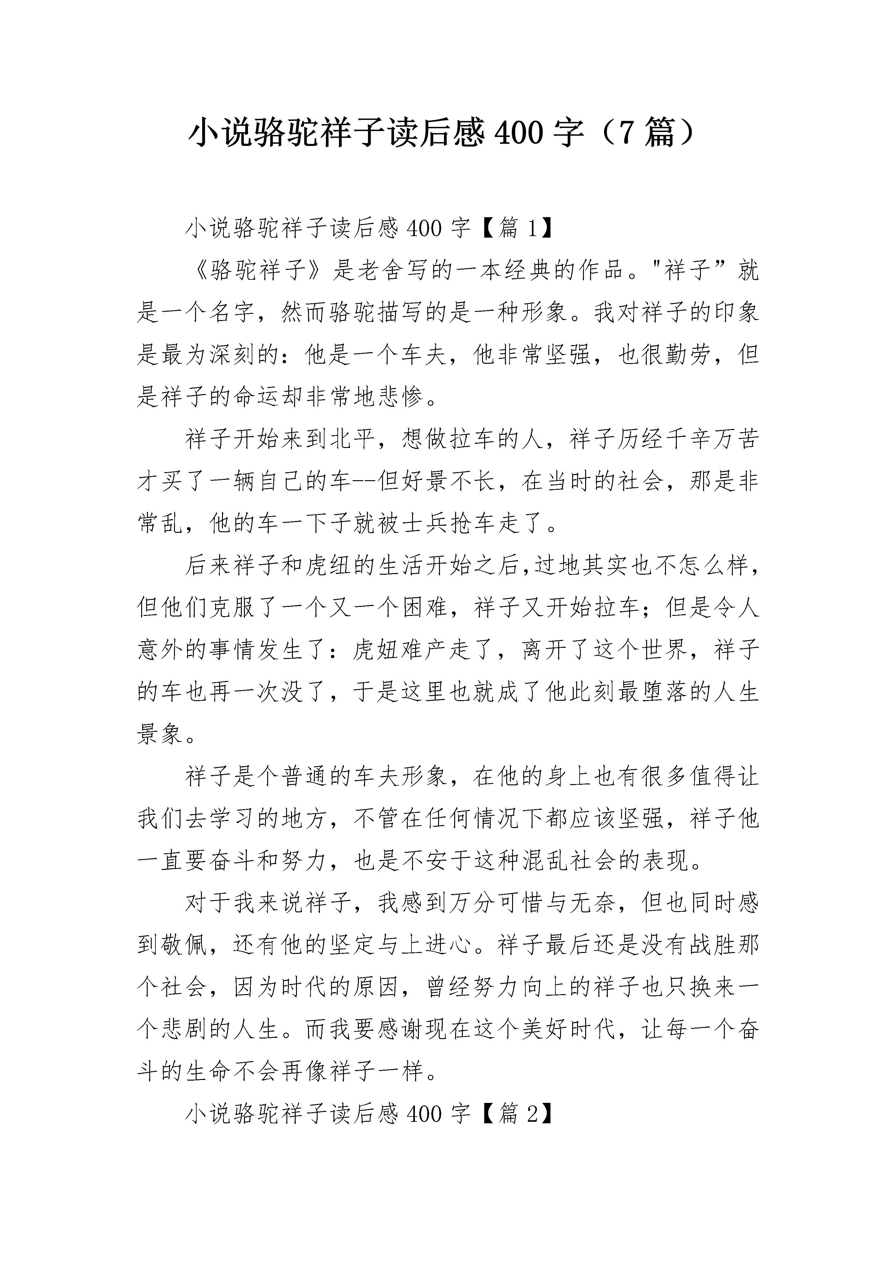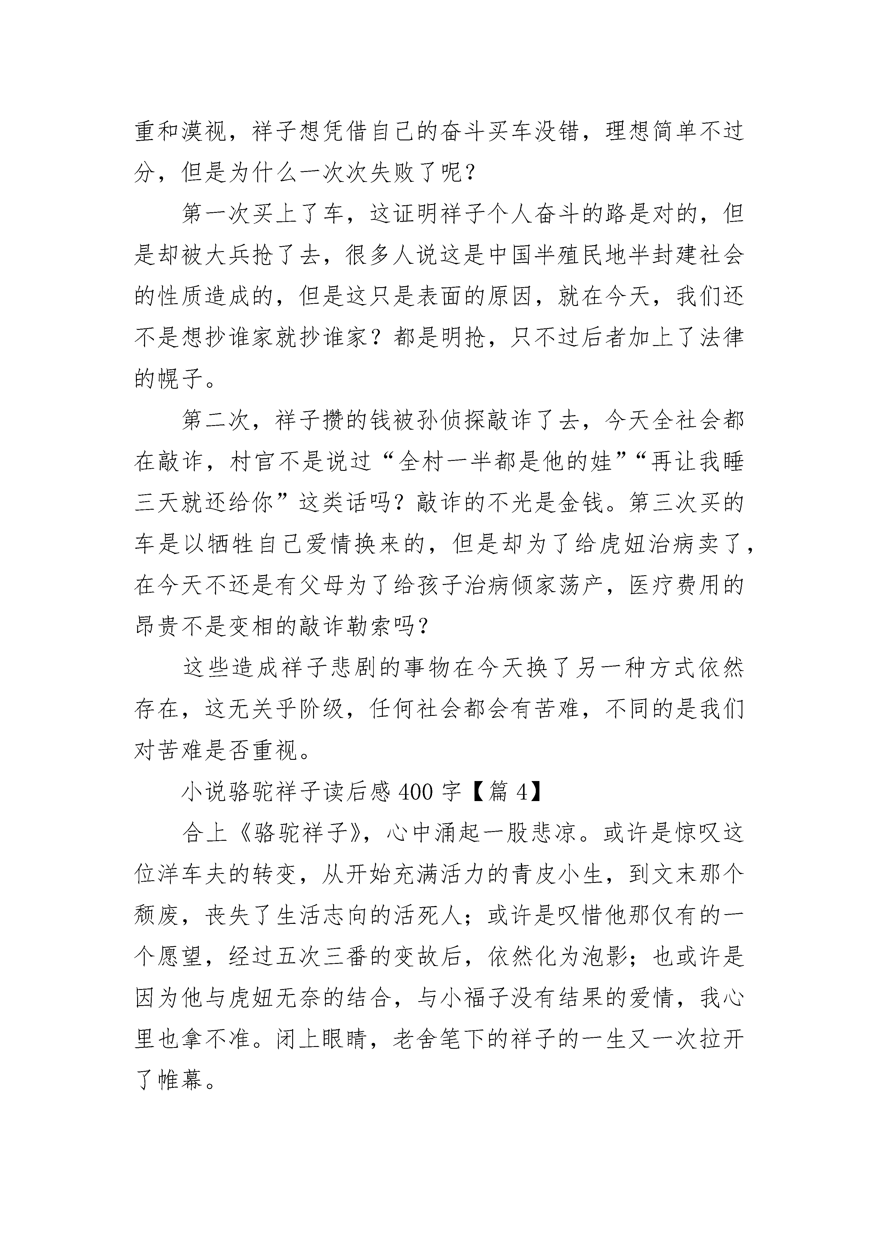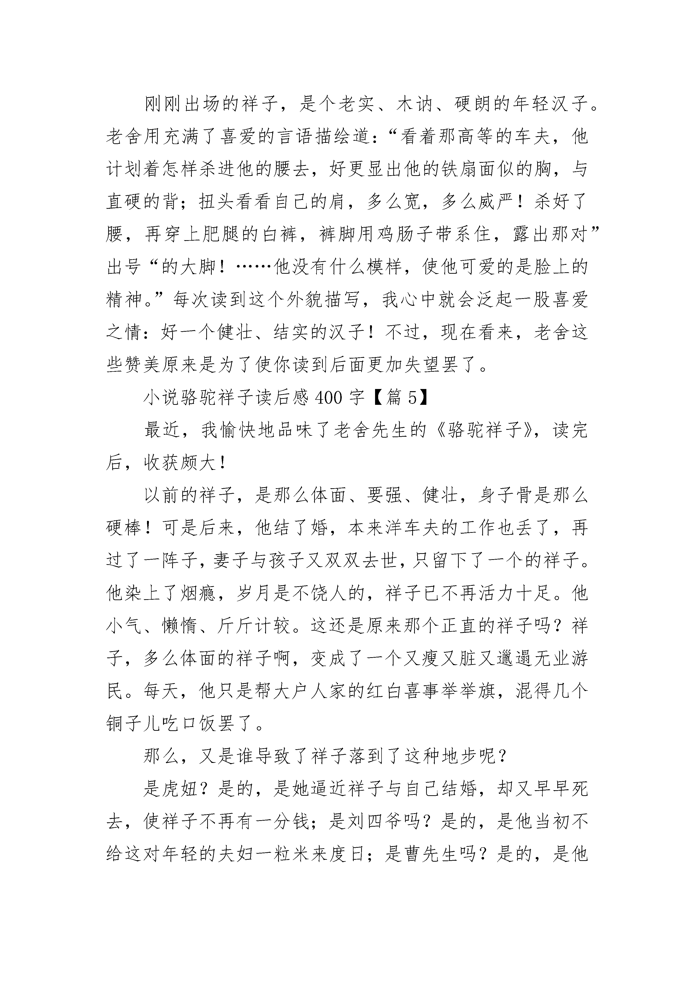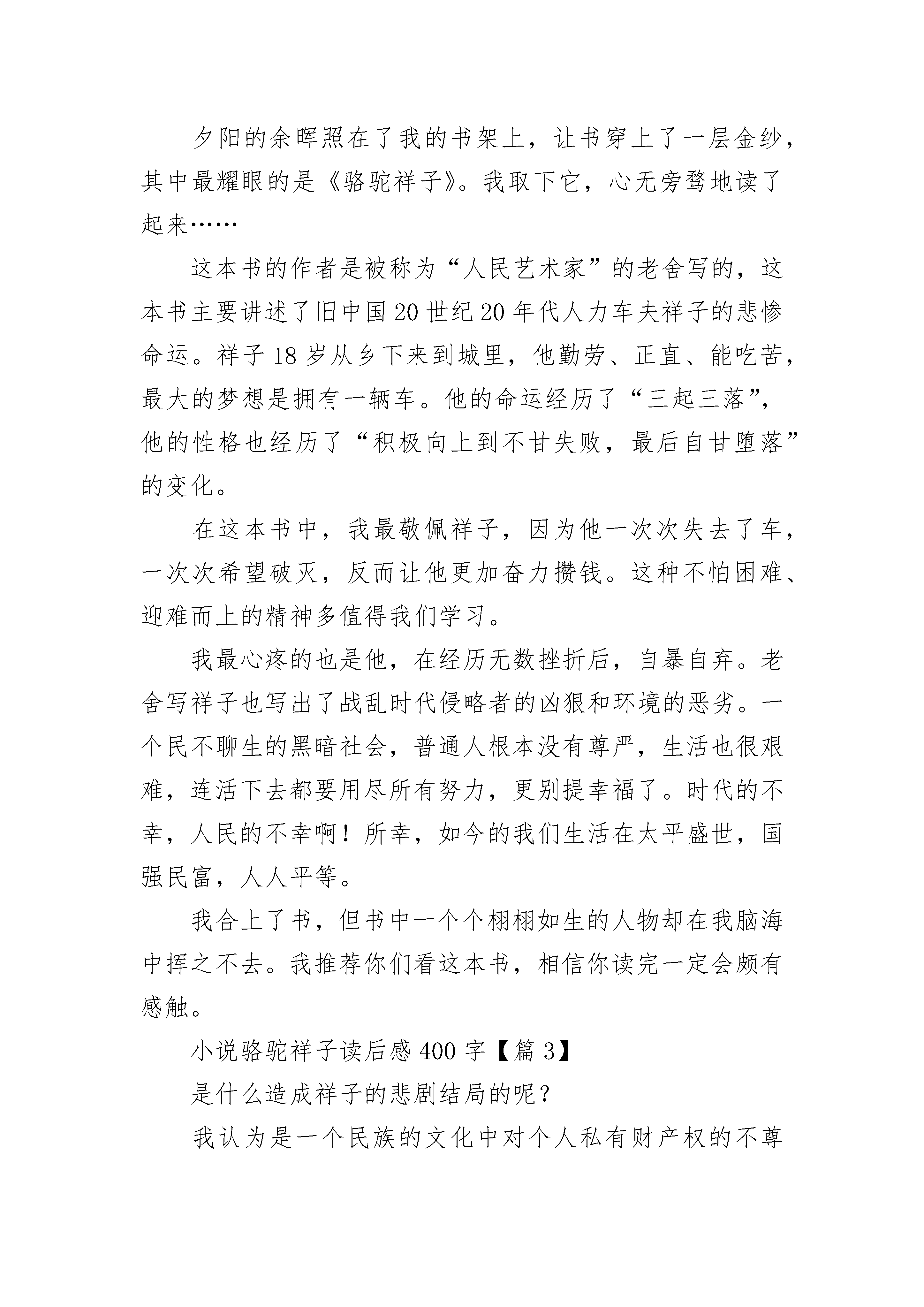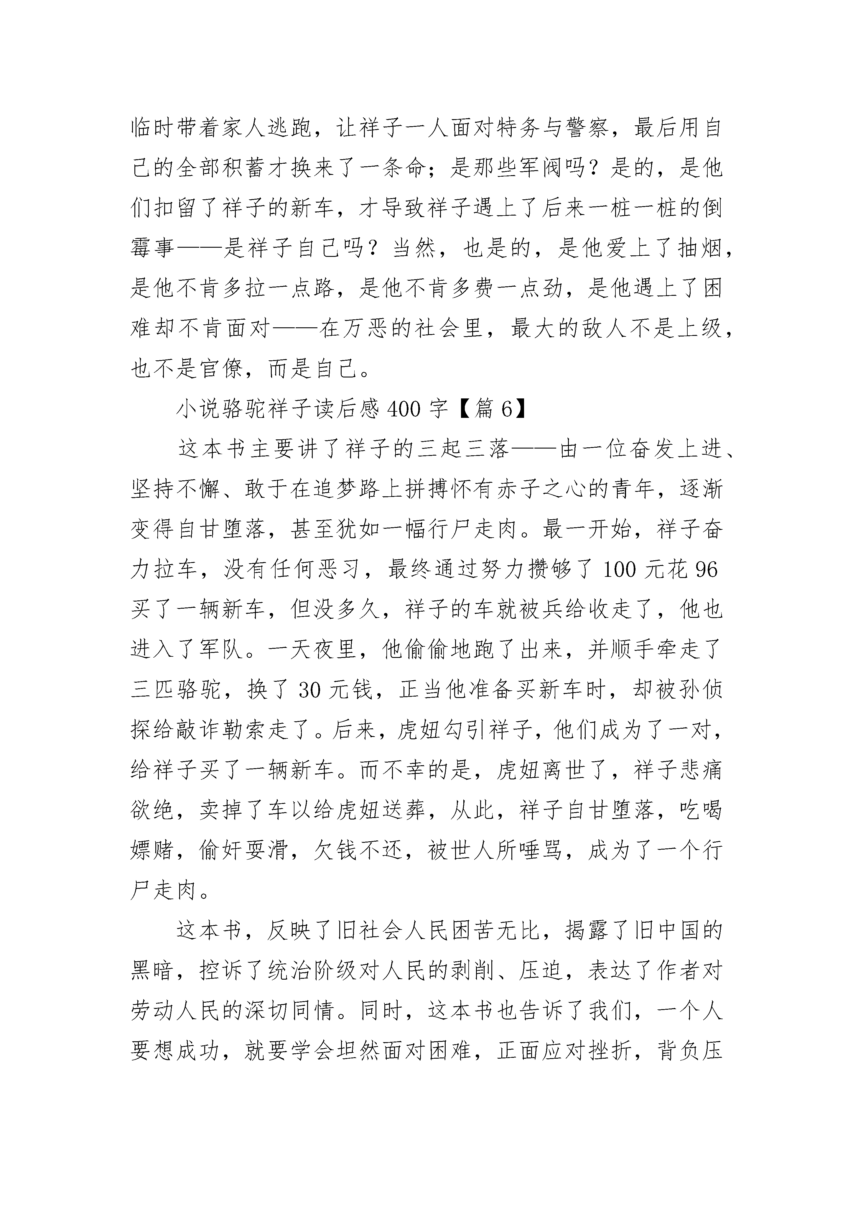 小说骆驼祥子读后感400字(7篇)小说骆驼祥子读后感400字【篇1】《骆驼祥子》是老舍写的一本经典的作品。"祥子”就是一个名字,然而骆驼描写的是一种形象。我对祥子的印象是最为深刻的:他是一个车夫,他非常坚强,也很勤劳,但是祥子的命运却非常地悲惨。祥子开始来到北平,想做拉车的人,祥子历经千辛万苦才买了一辆自己的车--但好景不长,在当时的社会,那是非常乱,他的车一下子就被士兵抢车走了。后来祥子和虎纽的生活开始之后,过地其实也不怎么样,但他们克服了一个又一个困难,祥子又开始拉车;但是令人意外的事情发生了:虎妞难产走了,离开了这个世界,祥子的车也再一次没了,于是这里也就成了他此刻最堕落的人生景象。祥子是个普通的车夫形象,在他的身上也有很多值得让我们去学习的地方,不管在任何情况下都应该坚强,祥子他一直要奋斗和努力,也是不安于这种混乱社会的表现。对于我来说祥子,我感到万分可惜与无奈,但也同时感到敬佩,还有他的坚定与上进心。祥子最后还是没有战胜那个社会,因为时代的原因,曾经努力向上的祥子也只换来一个悲剧的人生。而我要感谢现在这个美好时代,让每一个奋斗的生命不会再像祥子一样。小说骆驼祥子读后感400字【篇2】夕阳的余晖照在了我的书架上,让书穿上了一层金纱,其中最耀眼的是《骆驼祥子》。我取下它,心无旁骛地读了起来……这本书的作者是被称为“人民艺术家”的老舍写的,这本书主要讲述了旧中国20世纪20年代人力车夫祥子的悲惨命运。祥子18岁从乡下来到城里,他勤劳、正直、能吃苦,最大的梦想是拥有一辆车。他的命运经历了“三起三落”,他的性格也经历了“积极向上到不甘失败,最后自甘堕落”的变化。在这本书中,我最敬佩祥子,因为他一次次失去了车,一次次希望破灭,反而让他更加奋力攒钱。这种不怕困难、迎难而上的精神多值得我们学习。我最心疼的也是他,在经历无数挫折后,自暴自弃。老舍写祥子也写出了战乱时代侵略者的凶狠和环境的恶劣。一个民不聊生的黑暗社会,普通人根本没有尊严,生活也很艰难,连活下去都要用尽所有努力,更别提幸福了。时代的不幸,人民的不幸啊!所幸,如今的我们生活在太平盛世,国强民富,人人平等。我合上了书,但书中一个个栩栩如生的人物却在我脑海中挥之不去。我推荐你们看这本书,相信你读完一定会颇有感触。小说骆驼祥子读后感400字【篇3】是什么造成祥子的悲剧结局的呢?我认为是一个民族的文化中对个人私有财产权的不尊重和漠视,祥子想凭借自己的奋斗买车没错,理想简单不过分,但是为什么一次次失败了呢?第一次买上了车,这证明祥子个人奋斗的路是对的,但是却被大兵抢了去,很多人说这是中国半殖民地半封建社会的性质造成的,但是这只是表面的原因,就在今天,我们还不是想抄谁家就抄谁家?都是明抢,只不过后者加上了法律的幌子。第二次,祥子攒的钱被孙侦探敲诈了去,今天全社会都在敲诈,村官不是说过“全村一半都是他的娃”“再让我睡三天就还给你”这类话吗?敲诈的不光是金钱。第三次买的车是以牺牲自己爱情换来的,但是却为了给虎妞治病卖了,在今天不还是有父母为了给孩子治病倾家荡产,医疗费用的昂贵不是变相的敲诈勒索吗?这些造成祥子悲剧的事物在今天换了另一种方式依然存在,这无关乎阶级,任何社会都会有苦难,不同的是我们对苦难是否重视。小说骆驼祥子读后感400字【篇4】合上《骆驼祥子》,心中涌起一股悲凉。或许是惊叹这位洋车夫的转变,从开始充满活力的青皮小生,到文末那个颓废,丧失了生活志向的活死人;或许是叹惜他那仅有的一个愿望,经过五次三番的变故后,依然化为泡影;也或许是因为他与虎妞无奈的结合,与小福子没有结果的爱情,我心里也拿不准。闭上眼睛,老舍笔下的祥子的一生又一次拉开了帷幕。刚刚出场的祥子,是个老实、木讷、硬朗的年轻汉子。老舍用充满了喜爱的言语描绘道:“看着那高等的车夫,他计划着怎样杀进他的腰去,好更显出他的铁扇面似的胸,与直硬的背;扭头看看自己的肩,多么宽,多么威严!杀好了腰,再穿上肥腿的白裤,裤脚用鸡肠子带系住,露出那对”出号“的大脚!……他没有什么模样,使他可爱的是脸上的精神。”每次读到这个外貌描写,我心中就会泛起一股喜爱之情:好一个健壮、结实的汉子!不过,现在看来,老舍这些赞美原来是为了使你读到后面更加失望罢了。小说骆驼祥子读后感400字【篇5】最近,我愉快地品味了老舍先生的《骆驼祥子》,读完后,收获颇大!以前的祥子,是那么体面、要强、健壮,身子骨是那么硬棒!可是后来,他结了婚,本来洋车夫的工作也丢了,再过了一阵子,妻子与孩子又双双去世,只留下了一个的祥子。他染上了烟瘾,岁月是不饶人的,祥子已不再活力十足。他小气、懒惰、斤斤计较。这还是原来那个正直的祥子吗?祥子,多么体面的祥子啊,变成了一个又瘦又脏又邋遢无业游民。每天,他只是帮大户人家的红白喜事举举旗,混得几个铜子儿吃口饭罢了。那么,又是谁导致了祥子
