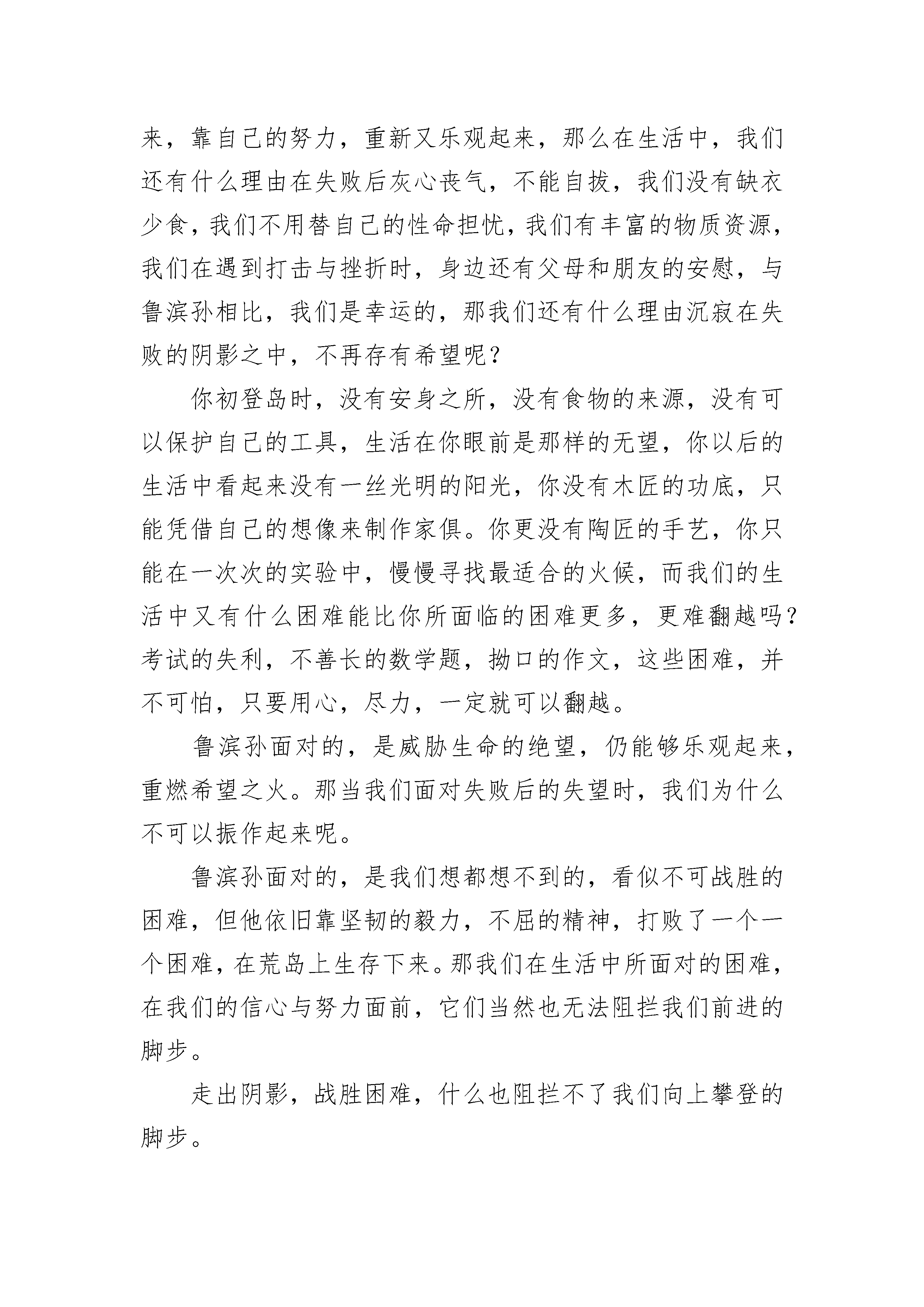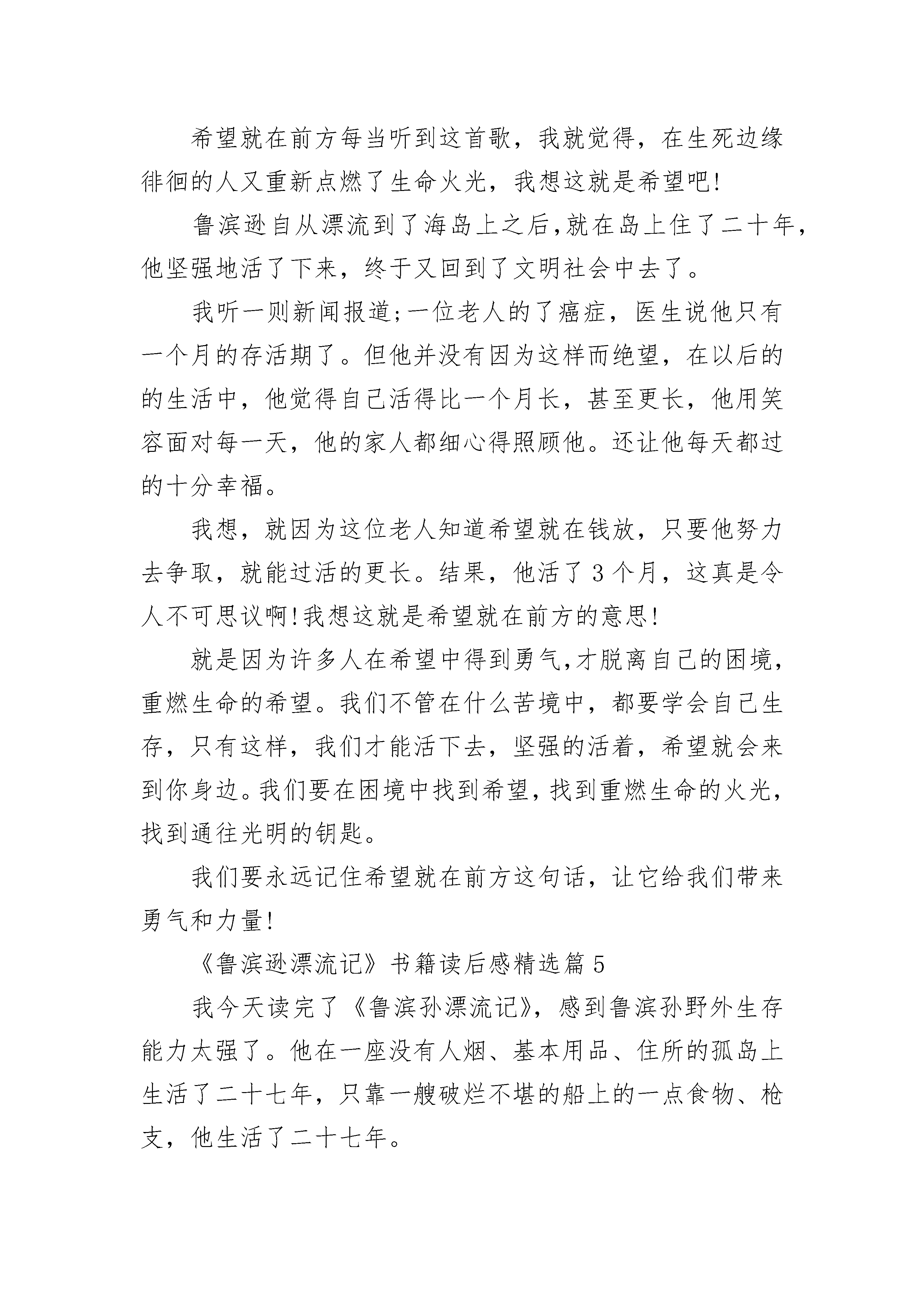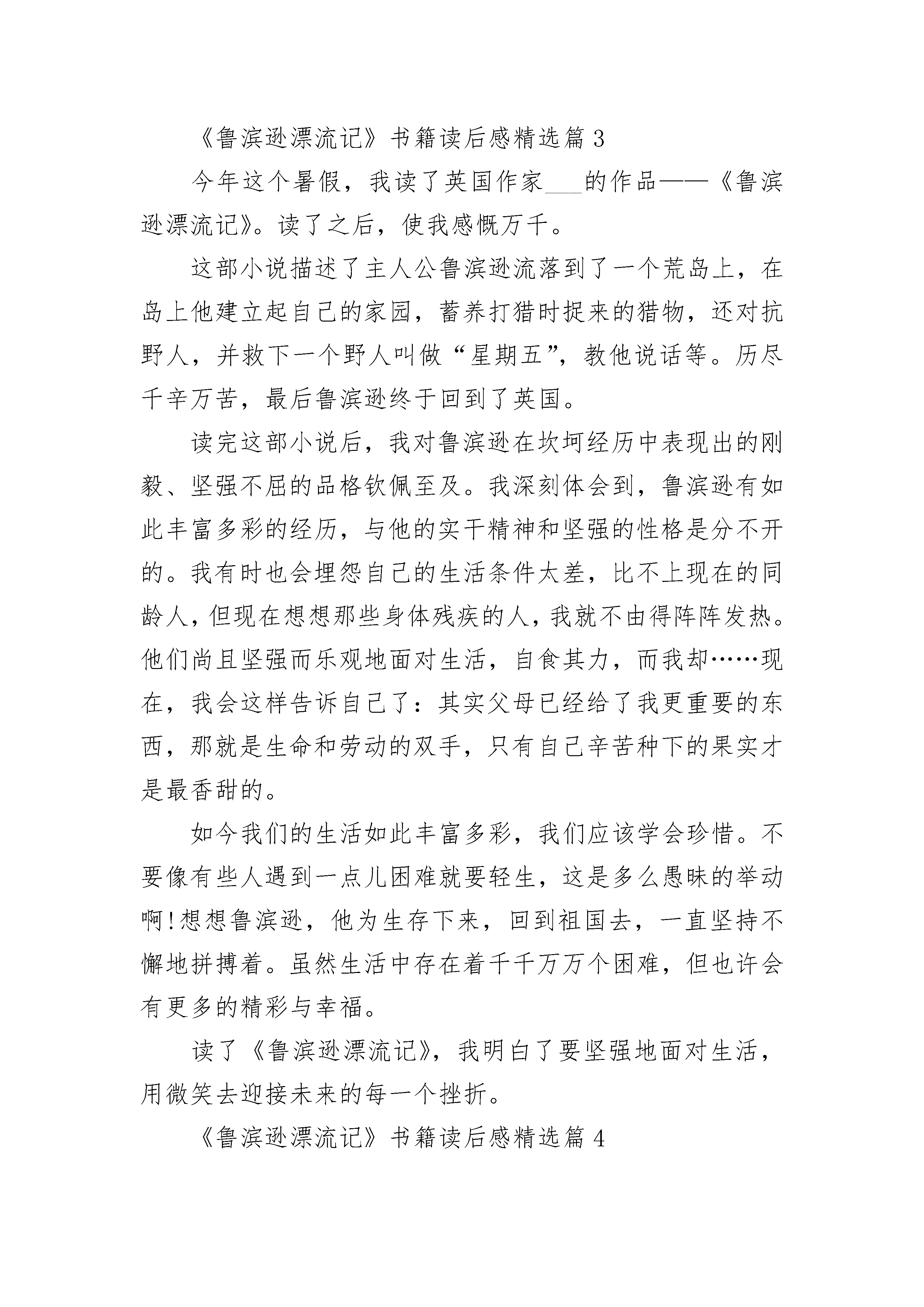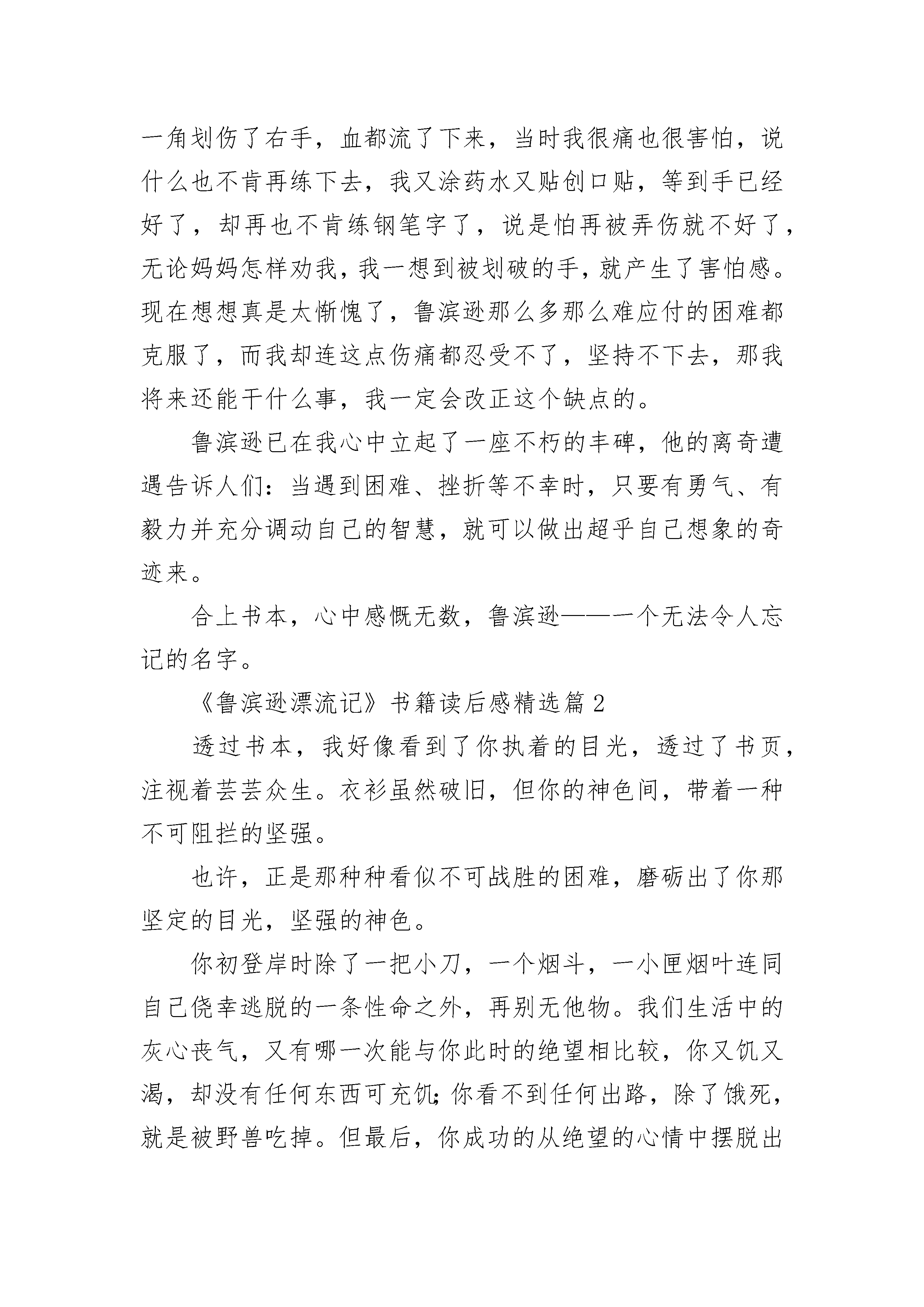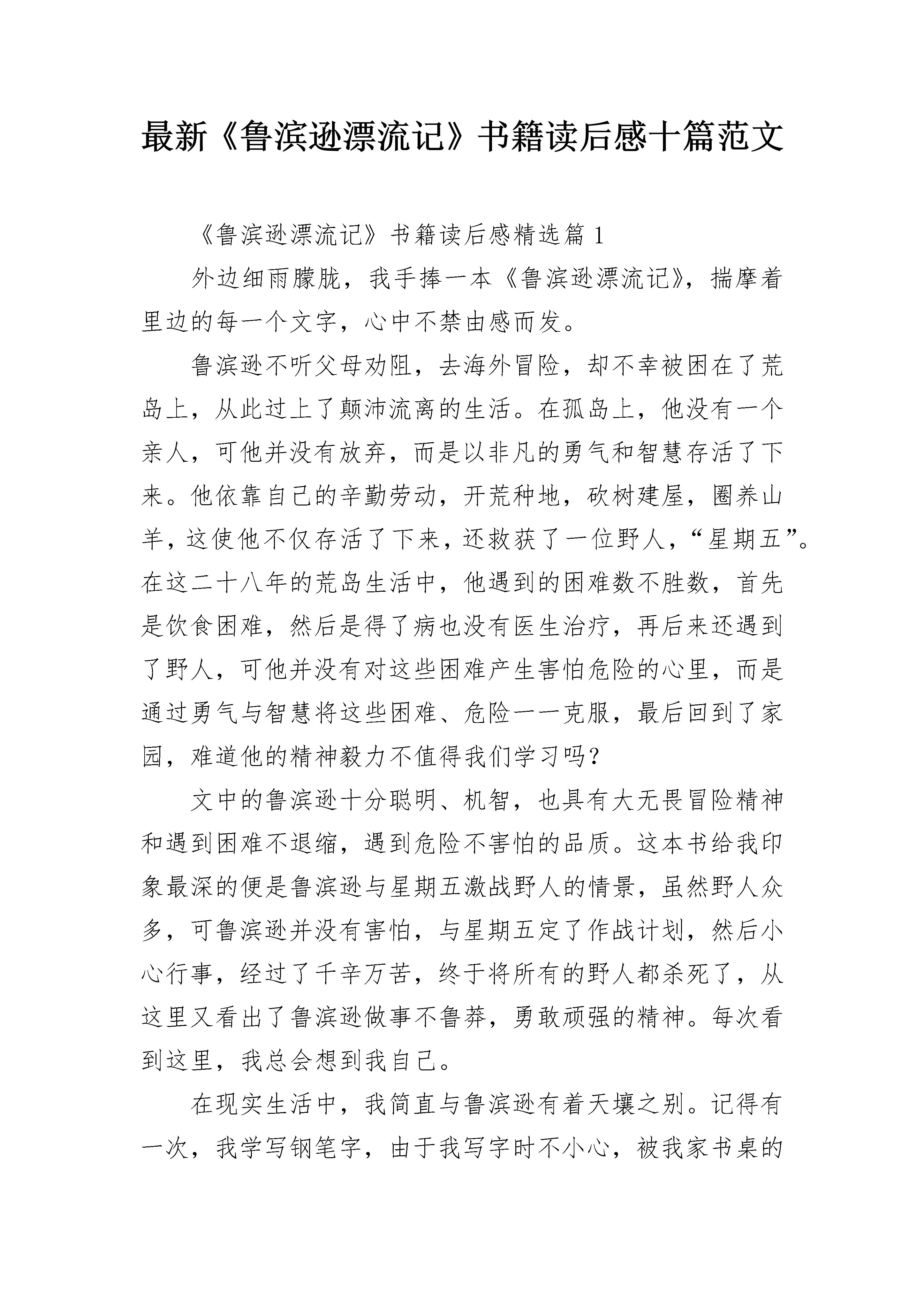 最新《鲁滨逊漂流记》书籍读后感十篇范文《鲁滨逊漂流记》书籍读后感精选篇1外边细雨朦胧,我手捧一本《鲁滨逊漂流记》,揣摩着里边的每一个文字,心中不禁由感而发。鲁滨逊不听父母劝阻,去海外冒险,却不幸被困在了荒岛上,从此过上了颠沛流离的生活。在孤岛上,他没有一个亲人,可他并没有放弃,而是以非凡的勇气和智慧存活了下来。他依靠自己的辛勤劳动,开荒种地,砍树建屋,圈养山羊,这使他不仅存活了下来,还救获了一位野人,“星期五”。在这二十八年的荒岛生活中,他遇到的困难数不胜数,首先是饮食困难,然后是得了病也没有医生治疗,再后来还遇到了野人,可他并没有对这些困难产生害怕危险的心里,而是通过勇气与智慧将这些困难、危险一一克服,最后回到了家园,难道他的精神毅力不值得我们学习吗?文中的鲁滨逊十分聪明、机智,也具有大无畏冒险精神和遇到困难不退缩,遇到危险不害怕的品质。这本书给我印象最深的便是鲁滨逊与星期五激战野人的情景,虽然野人众多,可鲁滨逊并没有害怕,与星期五定了作战计划,然后小心行事,经过了千辛万苦,终于将所有的野人都杀死了,从这里又看出了鲁滨逊做事不鲁莽,勇敢顽强的精神。每次看到这里,我总会想到我自己。在现实生活中,我简直与鲁滨逊有着天壤之别。记得有一次,我学写钢笔字,由于我写字时不小心,被我家书桌的一角划伤了右手,血都流了下来,当时我很痛也很害怕,说什么也不肯再练下去,我又涂药水又贴创口贴,等到手已经好了,却再也不肯练钢笔字了,说是怕再被弄伤就不好了,无论妈妈怎样劝我,我一想到被划破的手,就产生了害怕感。现在想想真是太惭愧了,鲁滨逊那么多那么难应付的困难都克服了,而我却连这点伤痛都忍受不了,坚持不下去,那我将来还能干什么事,我一定会改正这个缺点的。鲁滨逊已在我心中立起了一座不朽的丰碑,他的离奇遭遇告诉人们:当遇到困难、挫折等不幸时,只要有勇气、有毅力并充分调动自己的智慧,就可以做出超乎自己想象的奇迹来。合上书本,心中感慨无数,鲁滨逊——一个无法令人忘记的名字。《鲁滨逊漂流记》书籍读后感精选篇2透过书本,我好像看到了你执着的目光,透过了书页,注视着芸芸众生。衣衫虽然破旧,但你的神色间,带着一种不可阻拦的坚强。也许,正是那种种看似不可战胜的困难,磨砺出了你那坚定的目光,坚强的神色。你初登岸时除了一把小刀,一个烟斗,一小匣烟叶连同自己侥幸逃脱的一条性命之外,再别无他物。我们生活中的灰心丧气,又有哪一次能与你此时的绝望相比较,你又饥又渴,却没有任何东西可充饥;你看不到任何出路,除了饿死,就是被野兽吃掉。但最后,你成功的从绝望的心情中摆脱出来,靠自己的努力,重新又乐观起来,那么在生活中,我们还有什么理由在失败后灰心丧气,不能自拔,我们没有缺衣少食,我们不用替自己的性命担忧,我们有丰富的物质资源,我们在遇到打击与挫折时,身边还有父母和朋友的安慰,与鲁滨孙相比,我们是幸运的,那我们还有什么理由沉寂在失败的阴影之中,不再存有希望呢?你初登岛时,没有安身之所,没有食物的来源,没有可以保护自己的工具,生活在你眼前是那样的无望,你以后的生活中看起来没有一丝光明的阳光,你没有木匠的功底,只能凭借自己的想像来制作家俱。你更没有陶匠的手艺,你只能在一次次的实验中,慢慢寻找最适合的火候,而我们的生活中又有什么困难能比你所面临的困难更多,更难翻越吗?考试的失利,不善长的数学题,拗口的作文,这些困难,并不可怕,只要用心,尽力,一定就可以翻越。鲁滨孙面对的,是威胁生命的绝望,仍能够乐观起来,重燃希望之火。那当我们面对失败后的失望时,我们为什么不可以振作起来呢。鲁滨孙面对的,是我们想都想不到的,看似不可战胜的困难,但他依旧靠坚韧的毅力,不屈的精神,打败了一个一个困难,在荒岛上生存下来。那我们在生活中所面对的困难,在我们的信心与努力面前,它们当然也无法阻拦我们前进的脚步。走出阴影,战胜困难,什么也阻拦不了我们向上攀登的脚步。《鲁滨逊漂流记》书籍读后感精选篇3今年这个暑假,我读了英国作家___的作品——《鲁滨逊漂流记》。读了之后,使我感慨万千。这部小说描述了主人公鲁滨逊流落到了一个荒岛上,在岛上他建立起自己的家园,蓄养打猎时捉来的猎物,还对抗野人,并救下一个野人叫做“星期五”,教他说话等。历尽千辛万苦,最后鲁滨逊终于回到了英国。读完这部小说后,我对鲁滨逊在坎坷经历中表现出的刚毅、坚强不屈的品格钦佩至及。我深刻体会到,鲁滨逊有如此丰富多彩的经历,与他的实干精神和坚强的性格是分不开的。我有时也会埋怨自己的生活条件太差,比不上现在的同龄人,但现在想想那些身体残疾的人,我就不由得阵阵发热。他们尚且坚强而乐观地面对生活,自食其力,而我却……现在,我会这样告诉自己了:其实父母已经给了我更重要的东西,那就是生命和劳动的双手,只有自己辛苦种下的果实才是最香甜的。如今我们的生活如此丰富多彩,我们应该学
