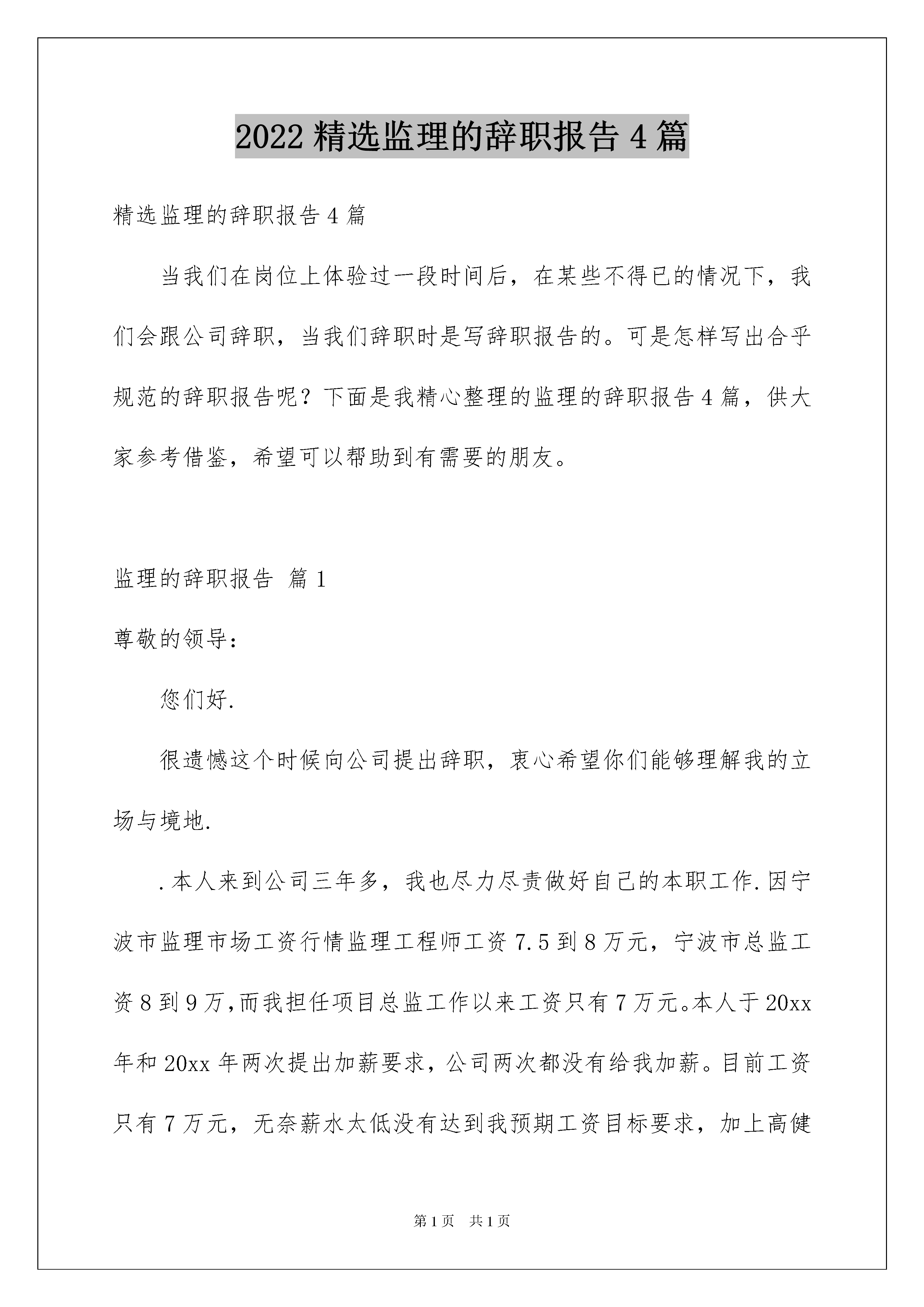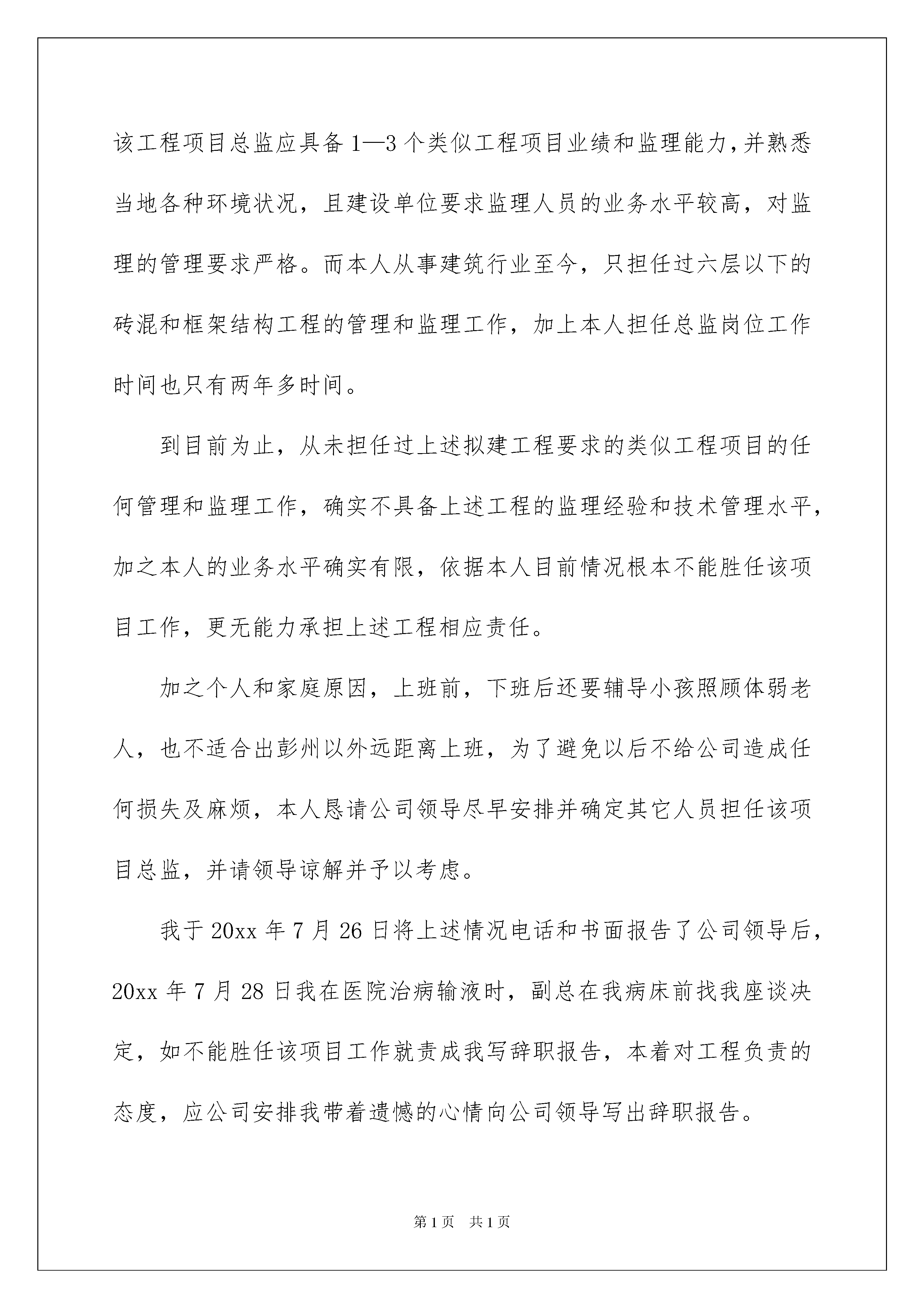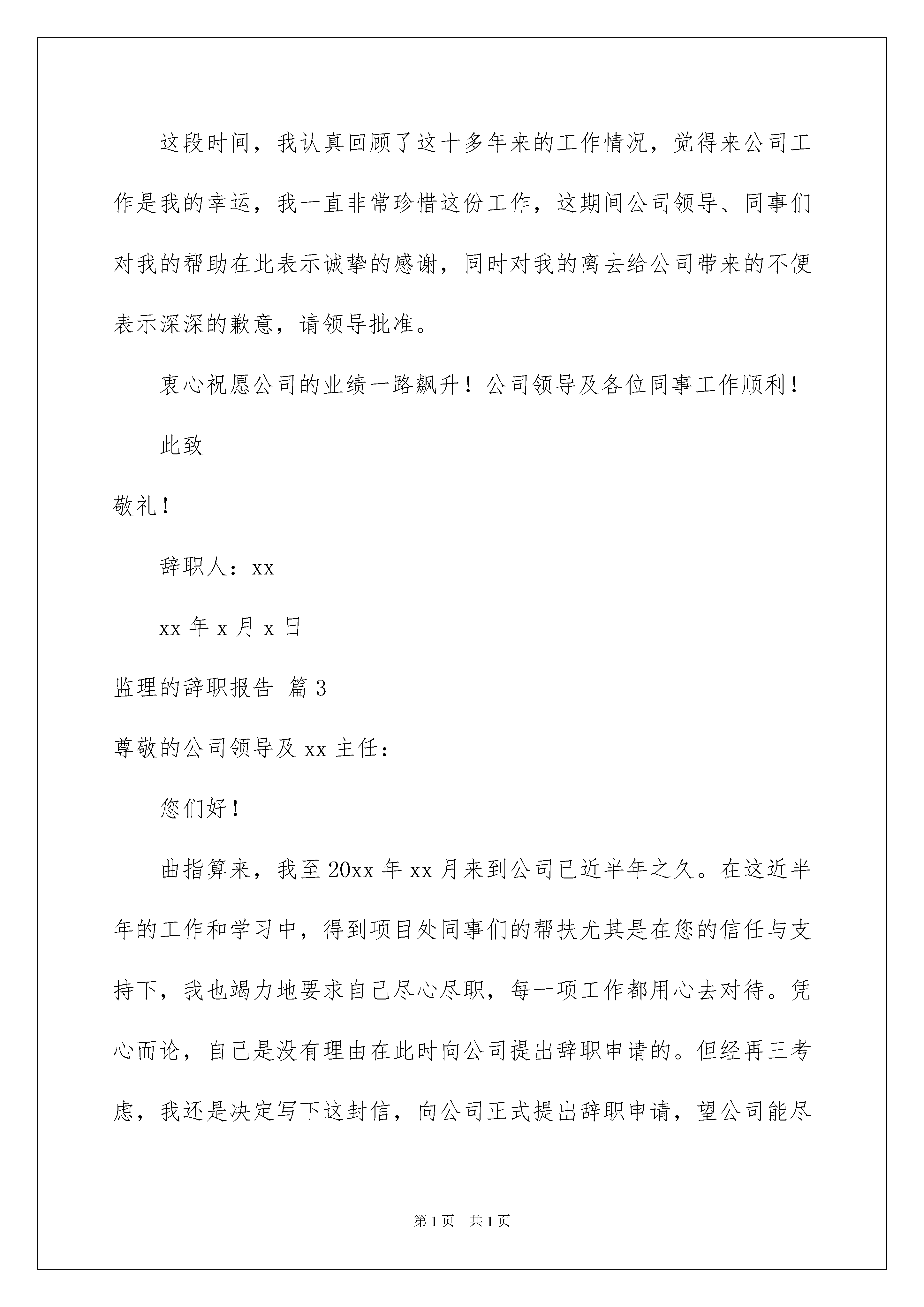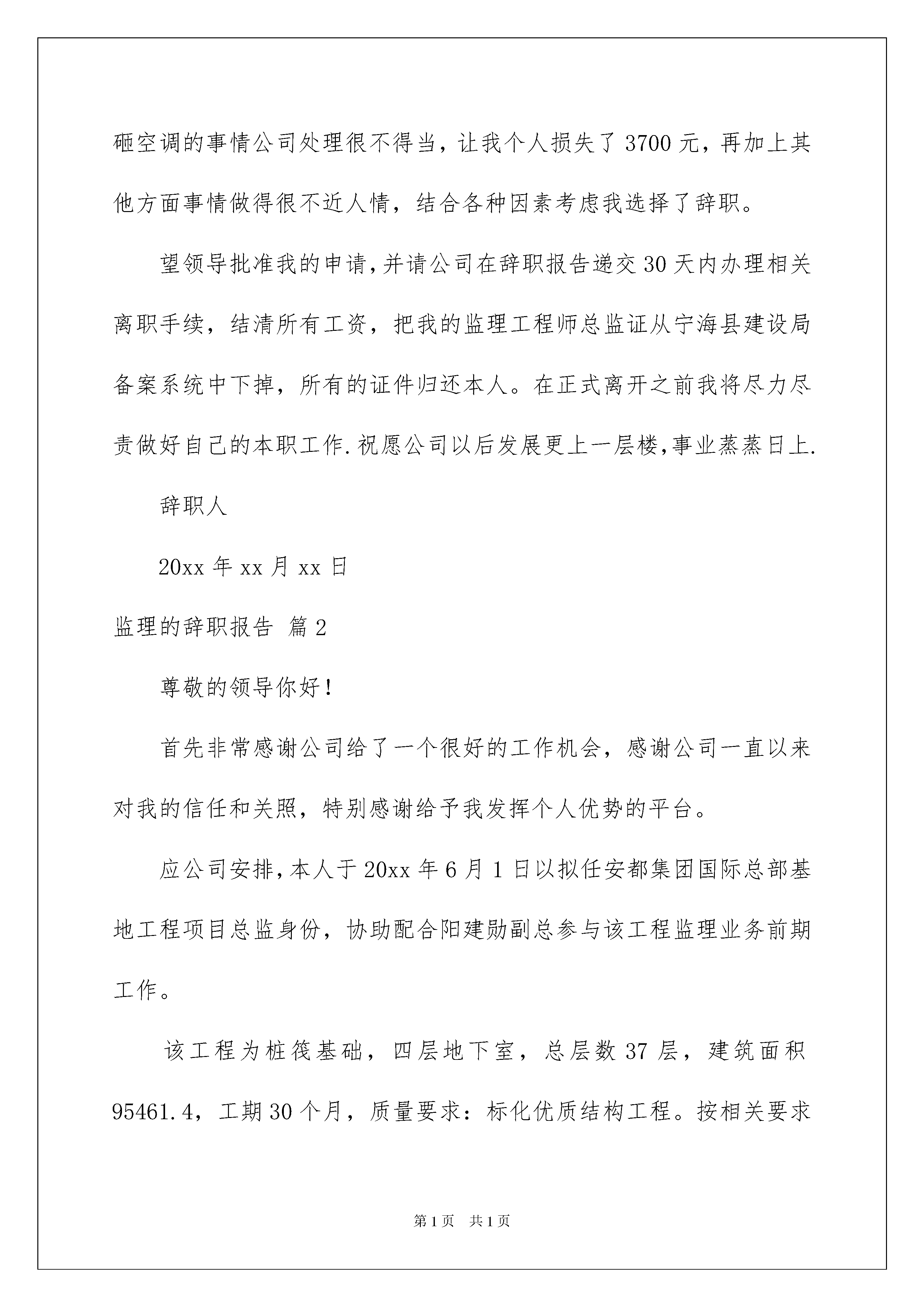 2022精选监理的辞职报告4篇精选监理的辞职报告4篇当我们在岗位上体验过一段时间后,在某些不得已的情况下,我们会跟公司辞职,当我们辞职时是写辞职报告的。可是怎样写出合乎规范的辞职报告呢?下面是我精心整理的监理的辞职报告4篇,供大家参考借鉴,希望可以帮助到有需要的朋友。监理的辞职报告篇1尊敬的领导:您们好.很遗憾这个时候向公司提出辞职,衷心希望你们能够理解我的立场与境地..本人来到公司三年多,我也尽力尽责做好自己的本职工作.因宁波市监理市场工资行情监理工程师工资7.5到8万元,宁波市总监工资8到9万,而我担任项目总监工作以来工资只有7万元。本人于20xx年和20xx年两次提出加薪要求,公司两次都没有给我加薪。目前工资只有7万元,无奈薪水太低没有达到我预期工资目标要求,加上高健砸空调的事情公司处理很不得当,让我个人损失了3700元,再加上其他方面事情做得很不近人情,结合各种因素考虑我选择了辞职。望领导批准我的申请,并请公司在辞职报告递交30天内办理相关离职手续,结清所有工资,把我的监理工程师总监证从宁海县建设局备案系统中下掉,所有的证件归还本人。在正式离开之前我将尽力尽责做好自己的本职工作.祝愿公司以后发展更上一层楼,事业蒸蒸日上.辞职人20xx年xx月xx日监理的辞职报告篇2尊敬的领导你好!首先非常感谢公司给了一个很好的工作机会,感谢公司一直以来对我的信任和关照,特别感谢给予我发挥个人优势的平台。应公司安排,本人于20xx年6月1日以拟任安都集团国际总部基地工程项目总监身份,协助配合阳建勋副总参与该工程监理业务前期工作。该工程为桩筏基础,四层地下室,总层数37层,建筑面积95461.4,工期30个月,质量要求:标化优质结构工程。按相关要求该工程项目总监应具备1—3个类似工程项目业绩和监理能力,并熟悉当地各种环境状况,且建设单位要求监理人员的业务水平较高,对监理的管理要求严格。而本人从事建筑行业至今,只担任过六层以下的砖混和框架结构工程的管理和监理工作,加上本人担任总监岗位工作时间也只有两年多时间。到目前为止,从未担任过上述拟建工程要求的类似工程项目的任何管理和监理工作,确实不具备上述工程的监理经验和技术管理水平,加之本人的业务水平确实有限,依据本人目前情况根本不能胜任该项目工作,更无能力承担上述工程相应责任。加之个人和家庭原因,上班前,下班后还要辅导小孩照顾体弱老人,也不适合出彭州以外远距离上班,为了避免以后不给公司造成任何损失及麻烦,本人恳请公司领导尽早安排并确定其它人员担任该项目总监,并请领导谅解并予以考虑。我于20xx年7月26日将上述情况电话和书面报告了公司领导后,20xx年7月28日我在医院治病输液时,副总在我病床前找我座谈决定,如不能胜任该项目工作就责成我写辞职报告,本着对工程负责的态度,应公司安排我带着遗憾的心情向公司领导写出辞职报告。这段时间,我认真回顾了这十多年来的工作情况,觉得来公司工作是我的幸运,我一直非常珍惜这份工作,这期间公司领导、同事们对我的帮助在此表示诚挚的感谢,同时对我的离去给公司带来的不便表示深深的歉意,请领导批准。衷心祝愿公司的业绩一路飙升!公司领导及各位同事工作顺利!此致敬礼!辞职人:xxxx年x月x日监理的辞职报告篇3尊敬的公司领导及xx主任:您们好!曲指算来,我至20xx年xx月来到公司已近半年之久。在这近半年的工作和学习中,得到项目处同事们的帮扶尤其是在您的信任与支持下,我也竭力地要求自己尽心尽职,每一项工作都用心去对待。凭心而论,自己是没有理由在此时向公司提出辞职申请的。但经再三考虑,我还是决定写下这封信,向公司正式提出辞职申请,望公司能尽快给予回复理解。其实,我在作出此决定时,我也明白自己即将承受来至各方的压力会有多大,也清楚在经济环境日益恶化的今天,能放下一份较为优越的工作去选择辞职后所带来的转职成本孰轻孰重。但在转职时我想我应该向公司澄清几个问题:第一,我的转职主要是结合自身的职业规划和发展方向所考虑的。我们常说“男怕选错行,女怕嫁错郎”。特别是在今天这个信息知识大爆炸的时代,时间和方向每时每刻都显得如此的重要。我的大学所主修专业是市场营销,与财经相关的专业,而我在公司所所从事的工作却全是与通信、建筑有关的。这在某种程度上就决定了我在这一方面上的先天不足。俗话说,隔行如隔山;在同等工作条件下,对同一相关的业务技能接受上就远比别人慢一拍,花的时间就自然会比别人多很多;同时我也明白之间的优势在那些方面。因此,如果在有选择的情况下,我会去选择一个更利于自我本身发展的领域去工作,这样也更有利于自己将来的职业规划和发展。第二,之选择