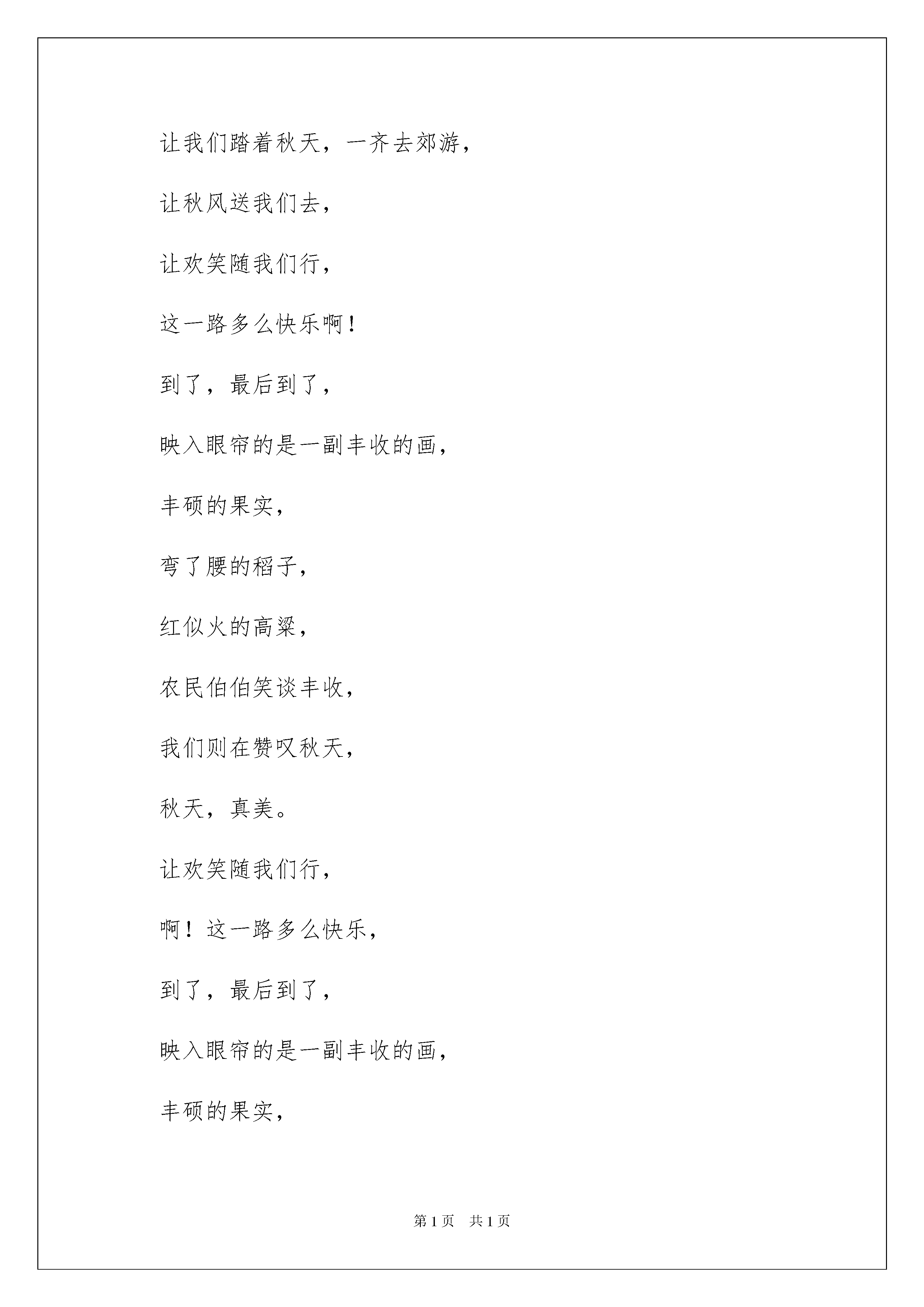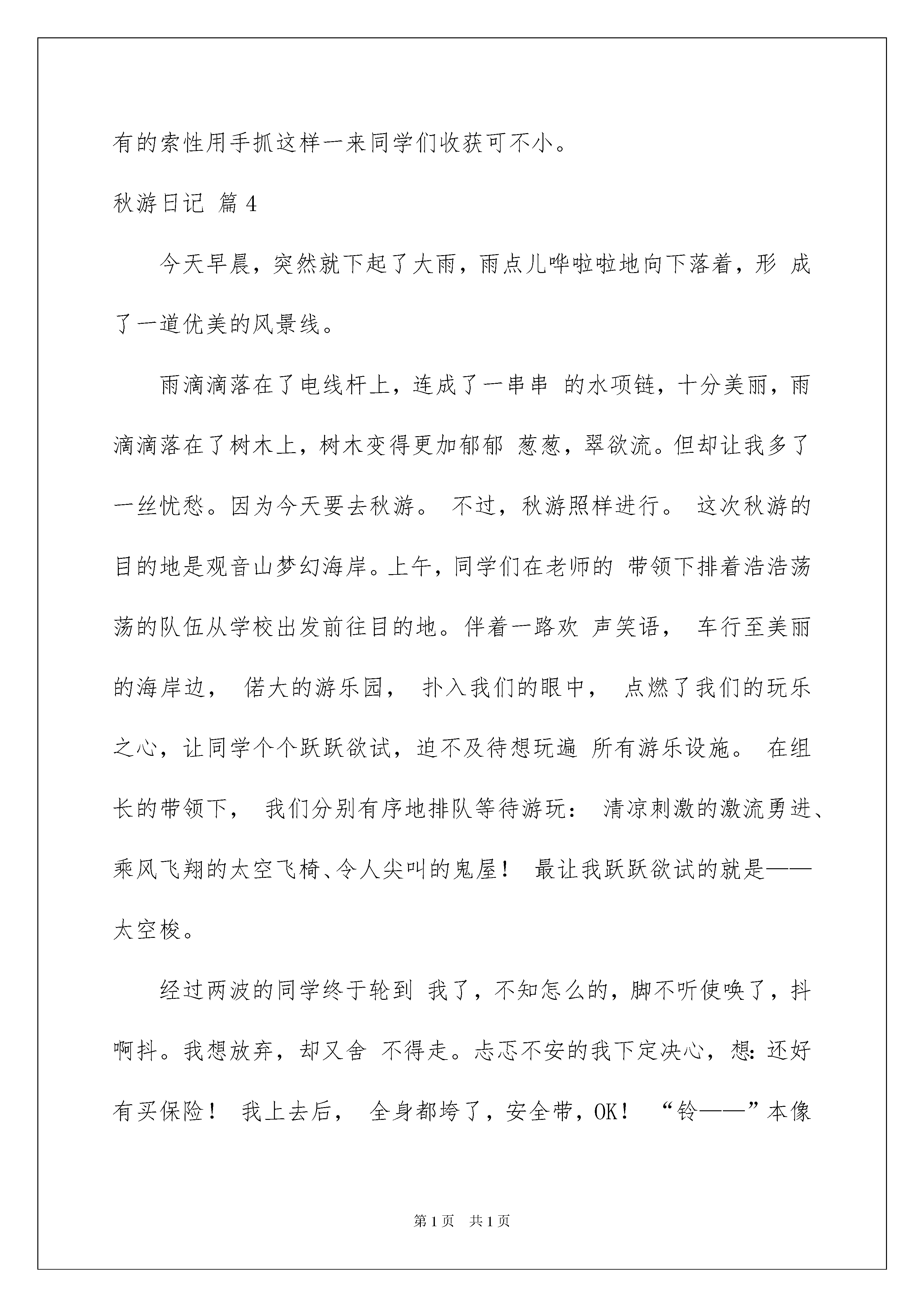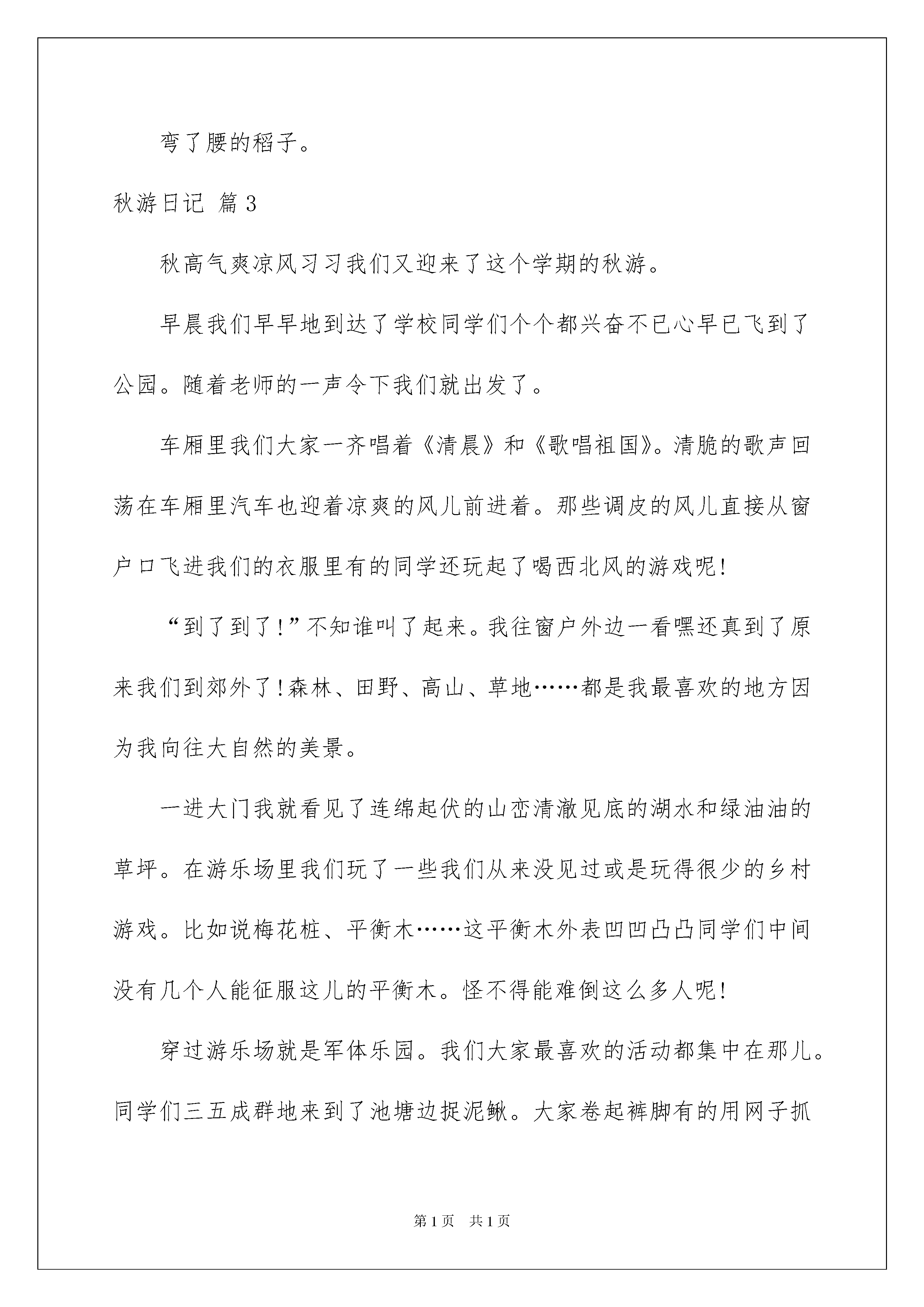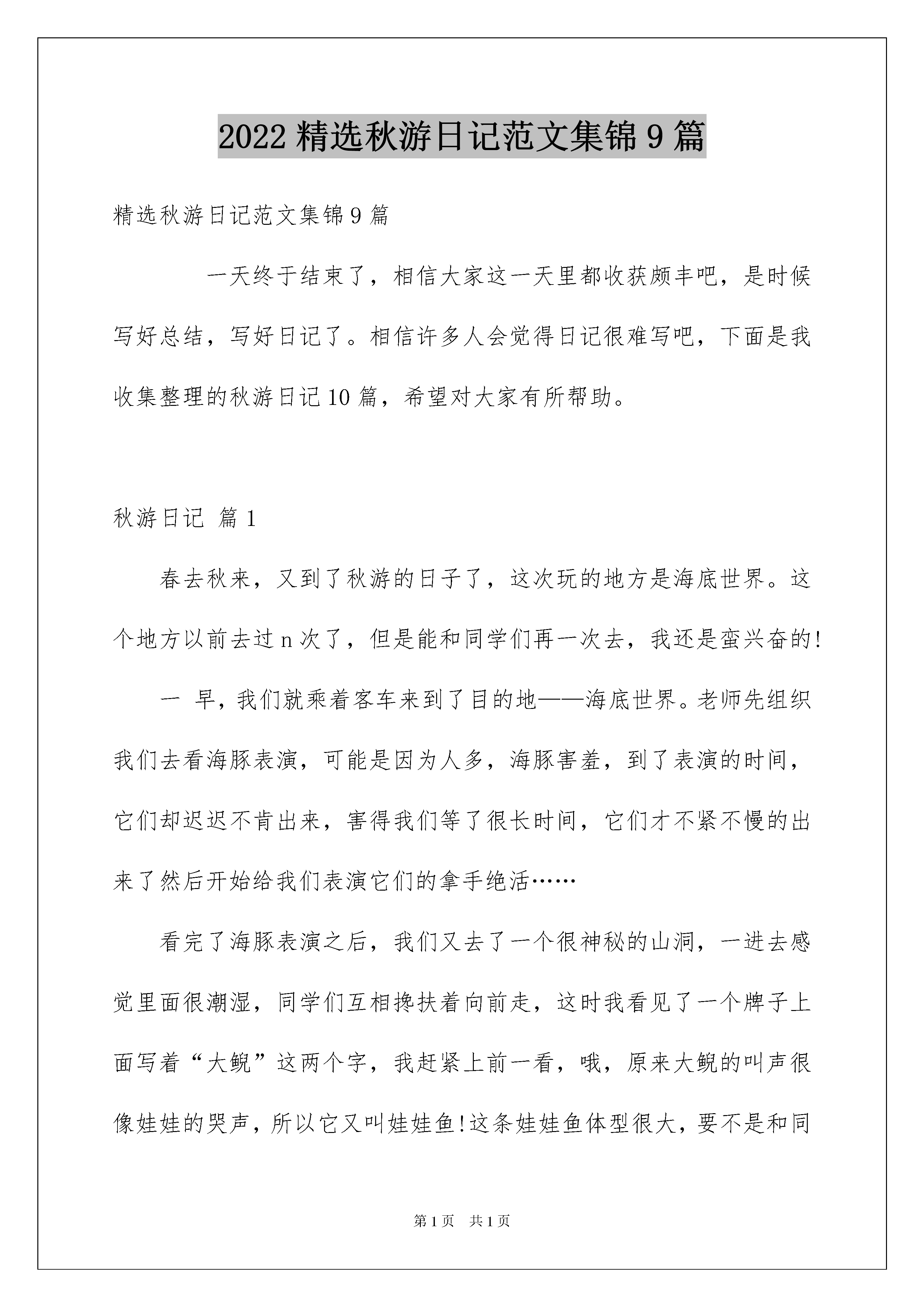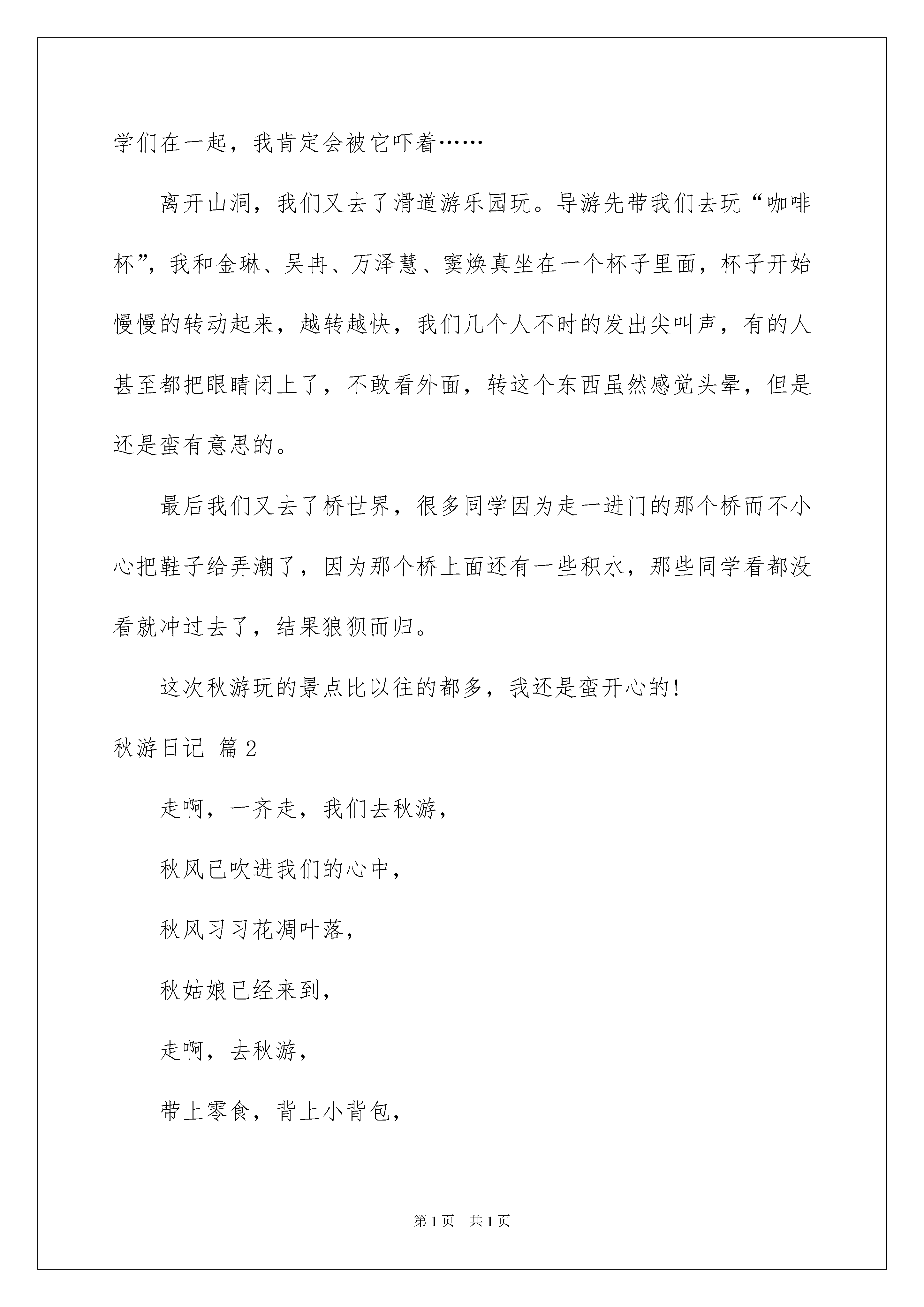 2022精选秋游日记范文集锦9篇精选秋游日记范文集锦9篇一天终于结束了,相信大家这一天里都收获颇丰吧,是时候写好总结,写好日记了。相信许多人会觉得日记很难写吧,下面是我收集整理的秋游日记10篇,希望对大家有所帮助。秋游日记篇1春去秋来,又到了秋游的日子了,这次玩的地方是海底世界。这个地方以前去过n次了,但是能和同学们再一次去,我还是蛮兴奋的!一早,我们就乘着客车来到了目的地——海底世界。老师先组织我们去看海豚表演,可能是因为人多,海豚害羞,到了表演的时间,它们却迟迟不肯出来,害得我们等了很长时间,它们才不紧不慢的出来了然后开始给我们表演它们的拿手绝活……看完了海豚表演之后,我们又去了一个很神秘的山洞,一进去感觉里面很潮湿,同学们互相搀扶着向前走,这时我看见了一个牌子上面写着“大鲵”这两个字,我赶紧上前一看,哦,原来大鲵的叫声很像娃娃的哭声,所以它又叫娃娃鱼!这条娃娃鱼体型很大,要不是和同学们在一起,我肯定会被它吓着……离开山洞,我们又去了滑道游乐园玩。导游先带我们去玩“咖啡杯”,我和金琳、吴冉、万泽慧、窦焕真坐在一个杯子里面,杯子开始慢慢的转动起来,越转越快,我们几个人不时的发出尖叫声,有的人甚至都把眼睛闭上了,不敢看外面,转这个东西虽然感觉头晕,但是还是蛮有意思的。最后我们又去了桥世界,很多同学因为走一进门的那个桥而不小心把鞋子给弄潮了,因为那个桥上面还有一些积水,那些同学看都没看就冲过去了,结果狼狈而归。这次秋游玩的景点比以往的都多,我还是蛮开心的!秋游日记篇2走啊,一齐走,我们去秋游,秋风已吹进我们的心中,秋风习习花凋叶落,秋姑娘已经来到,走啊,去秋游,带上零食,背上小背包,让我们踏着秋天,一齐去郊游,让秋风送我们去,让欢笑随我们行,这一路多么快乐啊!到了,最后到了,映入眼帘的是一副丰收的画,丰硕的果实,弯了腰的稻子,红似火的高粱,农民伯伯笑谈丰收,我们则在赞叹秋天,秋天,真美。让欢笑随我们行,啊!这一路多么快乐,到了,最后到了,映入眼帘的是一副丰收的画,丰硕的果实,弯了腰的稻子。秋游日记篇3秋高气爽凉风习习我们又迎来了这个学期的秋游。早晨我们早早地到达了学校同学们个个都兴奋不已心早已飞到了公园。随着老师的一声令下我们就出发了。车厢里我们大家一齐唱着《清晨》和《歌唱祖国》。清脆的歌声回荡在车厢里汽车也迎着凉爽的风儿前进着。那些调皮的风儿直接从窗户口飞进我们的衣服里有的同学还玩起了喝西北风的游戏呢!“到了到了!”不知谁叫了起来。我往窗户外边一看嘿还真到了原来我们到郊外了!森林、田野、高山、草地……都是我最喜欢的地方因为我向往大自然的美景。一进大门我就看见了连绵起伏的山峦清澈见底的湖水和绿油油的草坪。在游乐场里我们玩了一些我们从来没见过或是玩得很少的乡村游戏。比如说梅花桩、平衡木……这平衡木外表凹凹凸凸同学们中间没有几个人能征服这儿的平衡木。怪不得能难倒这么多人呢!穿过游乐场就是军体乐园。我们大家最喜欢的活动都集中在那儿。同学们三五成群地来到了池塘边捉泥鳅。大家卷起裤脚有的用网子抓有的索性用手抓这样一来同学们收获可不小。秋游日记篇4今天早晨,突然就下起了大雨,雨点儿哗啦啦地向下落着,形成了一道优美的风景线。雨滴滴落在了电线杆上,连成了一串串的水项链,十分美丽,雨滴滴落在了树木上,树木变得更加郁郁葱葱,翠欲流。但却让我多了一丝忧愁。因为今天要去秋游。不过,秋游照样进行。这次秋游的目的地是观音山梦幻海岸。上午,同学们在老师的带领下排着浩浩荡荡的队伍从学校出发前往目的地。伴着一路欢声笑语,车行至美丽的海岸边,偌大的游乐园,扑入我们的眼中,点燃了我们的玩乐之心,让同学个个跃跃欲试,迫不及待想玩遍所有游乐设施。在组长的带领下,我们分别有序地排队等待游玩:清凉刺激的激流勇进、乘风飞翔的太空飞椅、令人尖叫的鬼屋!最让我跃跃欲试的就是——太空梭。经过两波的同学终于轮到我了,不知怎么的,脚不听使唤了,抖啊抖。我想放弃,却又舍不得走。忐忑不安的我下定决心,想:还好有买保险!我上去后,全身都垮了,安全带,OK!“铃——”本像上课铃声的声音,却比以往常要来的恐怖。升高,我闭上眼,不时好奇地往下看,很快就后悔了,我开始扯着喉咙大喊,几乎发出我有史以来最高的分贝。终于刺激的一轮过去了,当我下去时,手早已出汗了,脸烧得通红,脚也是早已发麻。接下来的人,冲上来问我们:“好玩吗?恐怖吗?刺激吗?”毋庸置疑,当然!虽回答不同,但意思相同。后来我们还玩了几样刺激的游戏都是让人失魂落魄的:鬼屋??高空飞翔让我像只雄鹰在晴空中飞翔。种种刺激,种种兴奋,种种紧张,在观音山梦幻海岸。“吃”也是我们秋游的一个主题。累