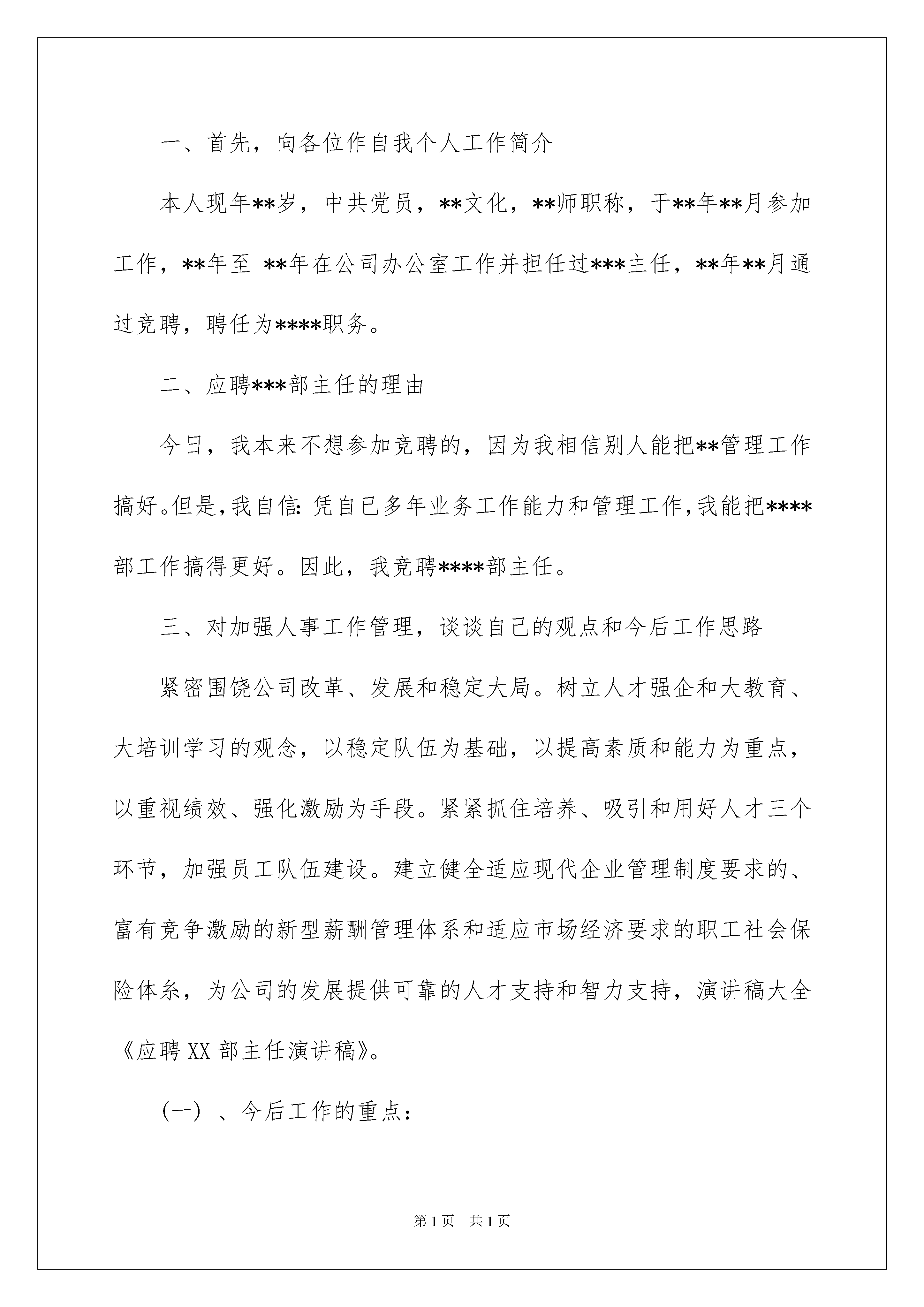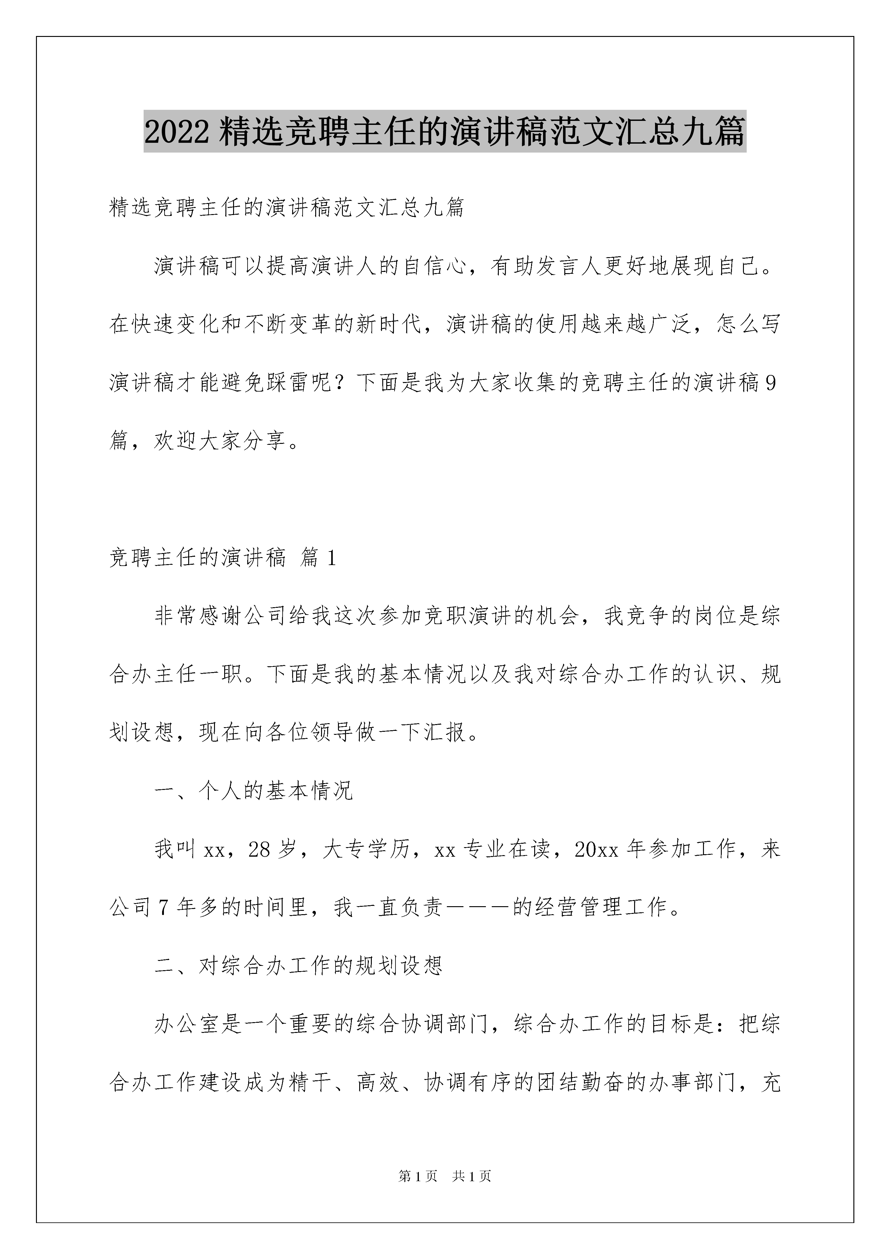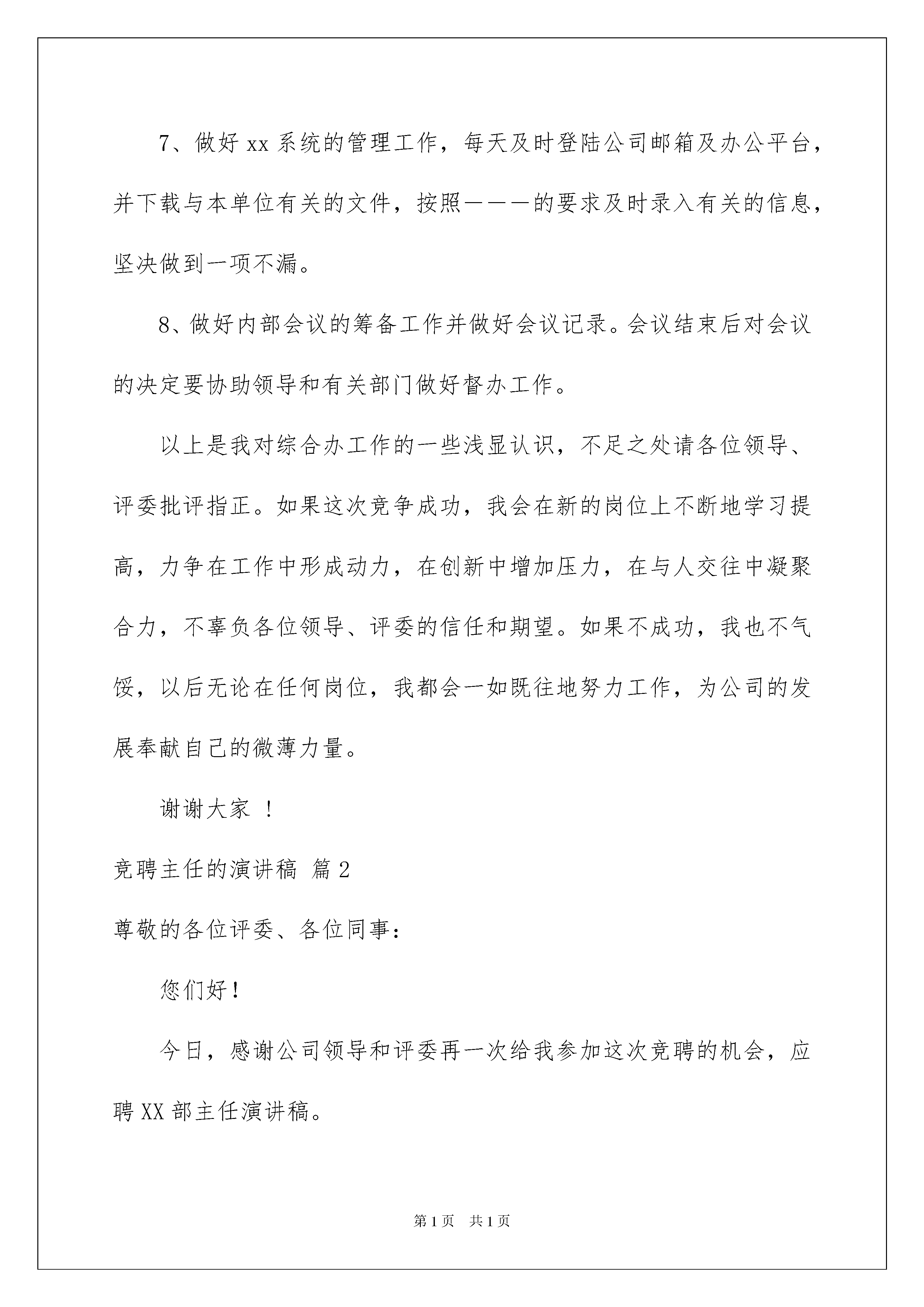 2022精选竞聘主任的演讲稿范文汇总九篇精选竞聘主任的演讲稿范文汇总九篇演讲稿可以提高演讲人的自信心,有助发言人更好地展现自己。在快速变化和不断变革的新时代,演讲稿的使用越来越广泛,怎么写演讲稿才能避免踩雷呢?下面是我为大家收集的竞聘主任的演讲稿9篇,欢迎大家分享。竞聘主任的演讲稿篇1非常感谢公司给我这次参加竞职演讲的机会,我竞争的岗位是综合办主任一职。下面是我的基本情况以及我对综合办工作的认识、规划设想,现在向各位领导做一下汇报。一、个人的基本情况我叫xx,28岁,大专学历,xx专业在读,20xx年参加工作,来公司7年多的时间里,我一直负责―――的经营管理工作。二、对综合办工作的规划设想办公室是一个重要的综合协调部门,综合办工作的目标是:把综合办工作建设成为精干、高效、协调有序的团结勤奋的办事部门,充分发挥它的参谋、助手作用、协调作用、枢纽作用和保障作用。根据这一目标,我将对综合办工作做以下设想。1、为领导当好参谋、做好助手。综合办要及时准确地掌握公司主要工作的进展情况,做到心中有数,从而能够及时、准确地向领导反馈各种信息,同时也将工作中的某些问题向领导提出合理化建议和意见,从而使领导的决策更加准确、更加合理。综合办负责人还应具备良好的协调能力,配合各科室制订好各项管理制度,处理好各科室之间的关系,坚持做到不推诿、不扯皮,团结协作,开拓进取,不断取得更大的工作成绩。2、充分发挥办公室的窗口作用,做好对外接待工作,处理好对外各方面的关系,为公司树立良好的外部形象。在来人来访接待工作中,我认为要做到不卑不亢、有节有礼,但是在牵扯到公司利益的时候要做到据理力争,确保公司的利益不受侵害。在处理对外各方面关系的时候,能单独处理的事情,不要再给领导添麻烦,自己处理不了的事情要及时向领导汇报,争取尽早处理。3、做好文秘档案、合同管理工作,对于文件要按正确的处理程序进行流转,档案要按照管理要求,及时、准确归档。文秘工作是综合办工作非常重要的一项。公司每年要收到大量的来文、来函,这就要求综合办要做到对来文、来函依据公文处理的有关规定快速处理,并按照要求督办来文、来函中所要办理的各项工作,检查落实情况,将办理情况及时、准确地反馈给领导从而使领导心中有数。对公司的档案管理要依据档案管理的有关规定规范管理,要及时归档,防止资料遗失,任何部门借用资料必须经过领导的批准。4、正确传达集团总部对安全工作的要求、指示,并及时地认真落实,积极的配合了集团总部进行安全检查,且做好隐患整改工作,并及时上报隐患整改结果。把隐患、整改情况,系统地纳入到微机管理中,我认为这样便于我们监督整改并及时了解情况,更迅速的处理情况,为领导提供第一手资料。5、做好各种办公用品、办公用具的购买和发放及各种物品的管理台帐工作。做好登记并统计好办公用品的消耗,严格控制办公用品的支出,降低办公费用的开支。6、认真做好印鉴的使用工作,印章要专人负责,未经领导同意,任何人不得随意使用印章,做到印章的使用有制度,有登记,确保在印章方面不出问题。7、做好xx系统的管理工作,每天及时登陆公司邮箱及办公平台,并下载与本单位有关的文件,按照―――的要求及时录入有关的信息,坚决做到一项不漏。8、做好内部会议的筹备工作并做好会议记录。会议结束后对会议的决定要协助领导和有关部门做好督办工作。以上是我对综合办工作的一些浅显认识,不足之处请各位领导、评委批评指正。如果这次竞争成功,我会在新的岗位上不断地学习提高,力争在工作中形成动力,在创新中增加压力,在与人交往中凝聚合力,不辜负各位领导、评委的信任和期望。如果不成功,我也不气馁,以后无论在任何岗位,我都会一如既往地努力工作,为公司的发展奉献自己的微薄力量。谢谢大家!竞聘主任的演讲稿篇2尊敬的各位评委、各位同事:您们好!今日,感谢公司领导和评委再一次给我参加这次竞聘的机会,应聘XX部主任演讲稿。一、首先,向各位作自我个人工作简介本人现年**岁,中共党员,**文化,**师职称,于**年**月参加工作,**年至**年在公司办公室工作并担任过***主任,**年**月通过竞聘,聘任为****职务。二、应聘***部主任的理由今日,我本来不想参加竞聘的,因为我相信别人能把**管理工作搞好。但是,我自信:凭自已多年业务工作能力和管理工作,我能把****部工作搞得更好。因此,我竞聘****部主任。三、对加强人事工作管理,谈谈自己的观点和今后工作思路紧密围饶公司改革、发展和稳定大局。树立人才强企和大教育、大培训学习的观念,以稳定队伍为基础,以提高素质和能力为重点,以重视绩效、强化激励为手段。紧紧抓住培养、吸引和用好人才三个