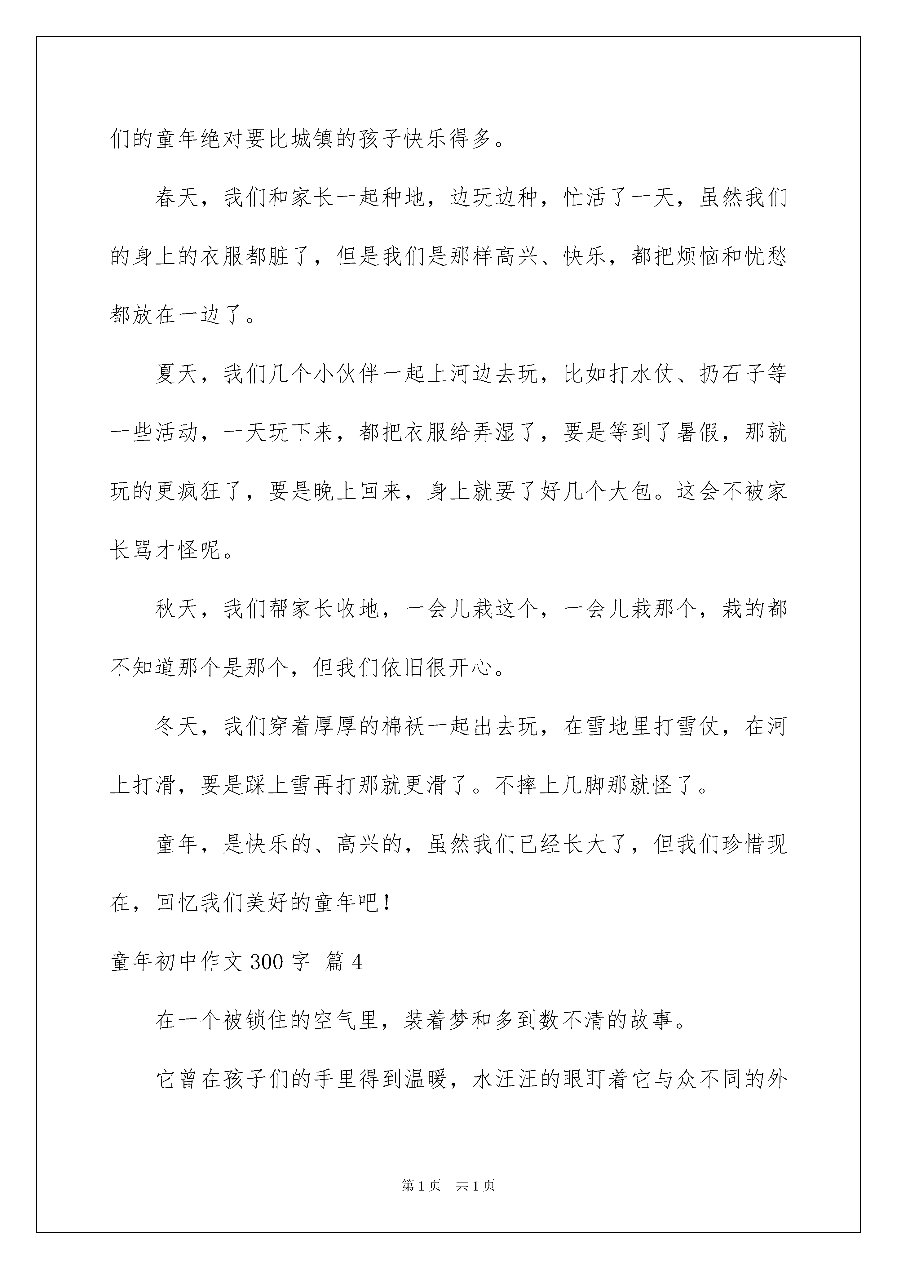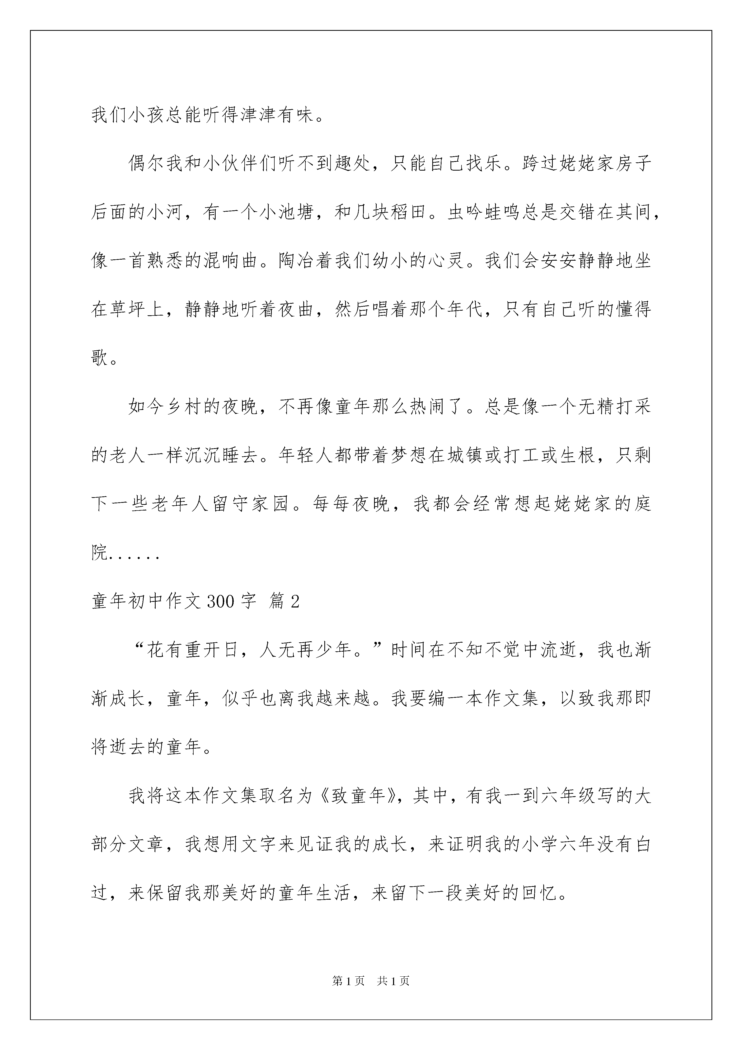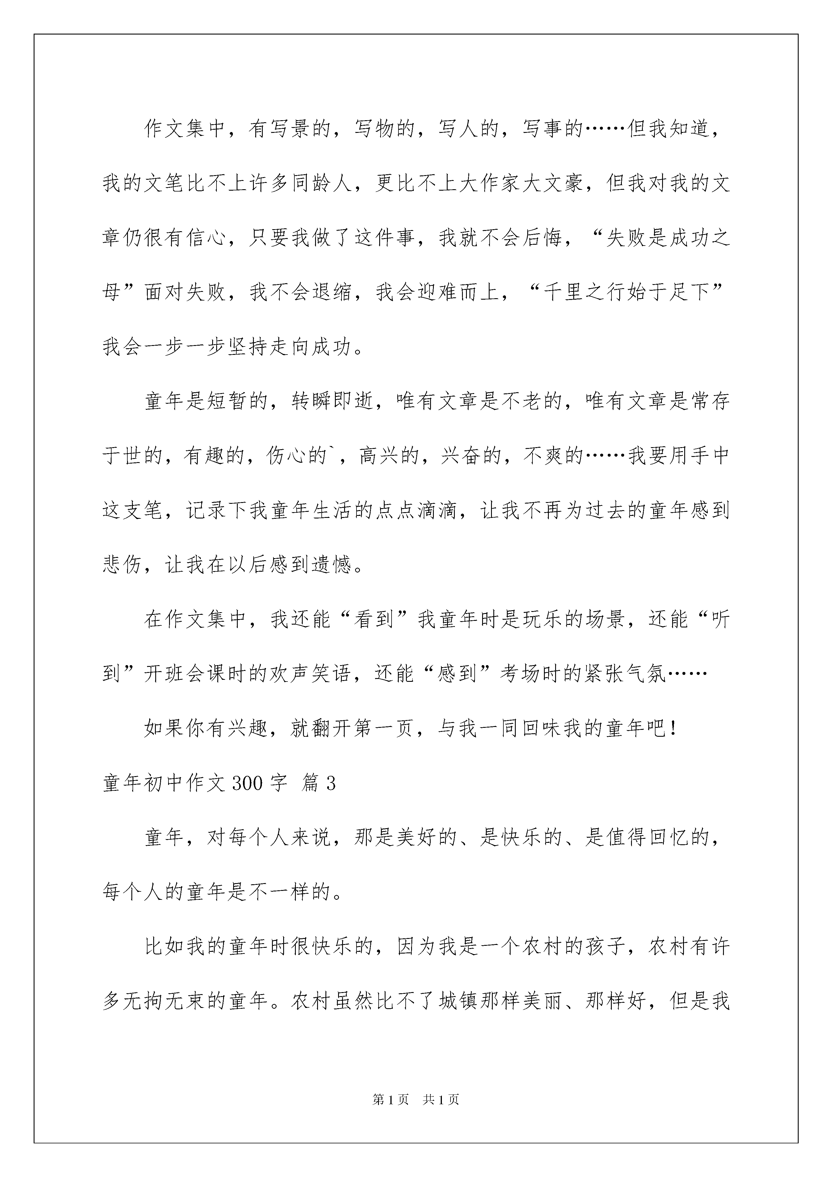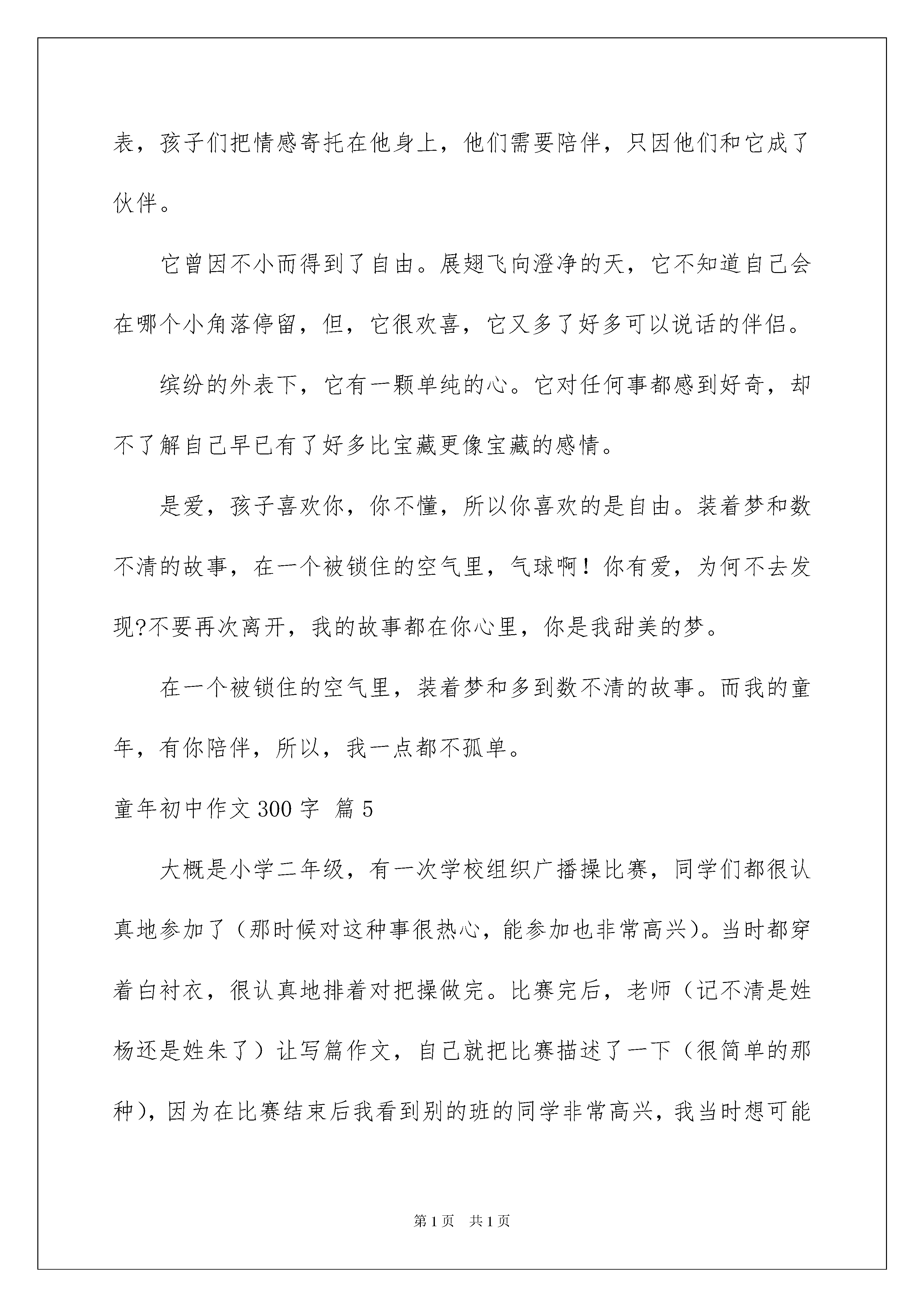 2022精选童年初中作文300字集合五篇精选童年初中作文300字集合五篇在日常学习、工作或生活中,大家都写过作文吧,作文可分为小学作文、中学作文、大学作文(论文)。为了让您在写作文时更加简单方便,下面是我精心整理的童年初中作文300字5篇,供大家参考借鉴,希望可以帮助到有需要的朋友。童年初中作文300字篇1童年,记忆是那么遥远,又仿佛在眼前。姥姥家有一个庭院,大舅和小舅都住在庭院里。也许算不上庭院,没有院墙,只是一块不大不小的谷场。大舅住在东边,小舅和姥姥住在西边。小时候我和姥姥小舅住在一起,自然就住在西边。每天早上起来,总能看到太阳从大舅家的屋顶端升起来,下午又从小舅家的屋顶落下去,总感觉很神奇。姥姥很和蔼,舅舅,舅妈又和善好客,庭院里晚上总是高朋满座的乡亲。总能闻到一股股茶香从庭院个个角落飘起,像春风拂过大地,在每个人脸上留下笑意。大人们都谈天说地,有时候也说一些故事,我们小孩总能听得津津有味。偶尔我和小伙伴们听不到趣处,只能自己找乐。跨过姥姥家房子后面的小河,有一个小池塘,和几块稻田。虫吟蛙鸣总是交错在其间,像一首熟悉的混响曲。陶冶着我们幼小的心灵。我们会安安静静地坐在草坪上,静静地听着夜曲,然后唱着那个年代,只有自己听的懂得歌。如今乡村的夜晚,不再像童年那么热闹了。总是像一个无精打采的老人一样沉沉睡去。年轻人都带着梦想在城镇或打工或生根,只剩下一些老年人留守家园。每每夜晚,我都会经常想起姥姥家的庭院......童年初中作文300字篇2“花有重开日,人无再少年。”时间在不知不觉中流逝,我也渐渐成长,童年,似乎也离我越来越。我要编一本作文集,以致我那即将逝去的童年。我将这本作文集取名为《致童年》,其中,有我一到六年级写的大部分文章,我想用文字来见证我的成长,来证明我的小学六年没有白过,来保留我那美好的童年生活,来留下一段美好的回忆。作文集中,有写景的,写物的,写人的,写事的……但我知道,我的文笔比不上许多同龄人,更比不上大作家大文豪,但我对我的文章仍很有信心,只要我做了这件事,我就不会后悔,“失败是成功之母”面对失败,我不会退缩,我会迎难而上,“千里之行始于足下”我会一步一步坚持走向成功。童年是短暂的,转瞬即逝,唯有文章是不老的,唯有文章是常存于世的,有趣的,伤心的`,高兴的,兴奋的,不爽的……我要用手中这支笔,记录下我童年生活的点点滴滴,让我不再为过去的童年感到悲伤,让我在以后感到遗憾。在作文集中,我还能“看到”我童年时是玩乐的场景,还能“听到”开班会课时的欢声笑语,还能“感到”考场时的紧张气氛……如果你有兴趣,就翻开第一页,与我一同回味我的童年吧!童年初中作文300字篇3童年,对每个人来说,那是美好的、是快乐的、是值得回忆的,每个人的童年是不一样的。比如我的童年时很快乐的,因为我是一个农村的孩子,农村有许多无拘无束的童年。农村虽然比不了城镇那样美丽、那样好,但是我们的童年绝对要比城镇的孩子快乐得多。春天,我们和家长一起种地,边玩边种,忙活了一天,虽然我们的身上的衣服都脏了,但是我们是那样高兴、快乐,都把烦恼和忧愁都放在一边了。夏天,我们几个小伙伴一起上河边去玩,比如打水仗、扔石子等一些活动,一天玩下来,都把衣服给弄湿了,要是等到了暑假,那就玩的更疯狂了,要是晚上回来,身上就要了好几个大包。这会不被家长骂才怪呢。秋天,我们帮家长收地,一会儿栽这个,一会儿栽那个,栽的都不知道那个是那个,但我们依旧很开心。冬天,我们穿着厚厚的棉袄一起出去玩,在雪地里打雪仗,在河上打滑,要是踩上雪再打那就更滑了。不摔上几脚那就怪了。童年,是快乐的、高兴的,虽然我们已经长大了,但我们珍惜现在,回忆我们美好的童年吧!童年初中作文300字篇4在一个被锁住的空气里,装着梦和多到数不清的故事。它曾在孩子们的手里得到温暖,水汪汪的眼盯着它与众不同的外表,孩子们把情感寄托在他身上,他们需要陪伴,只因他们和它成了伙伴。它曾因不小而得到了自由。展翅飞向澄净的天,它不知道自己会在哪个小角落停留,但,它很欢喜,它又多了好多可以说话的伴侣。缤纷的外表下,它有一颗单纯的心。它对任何事都感到好奇,却不了解自己早已有了好多比宝藏更像宝藏的感情。是爱,孩子喜欢你,你不懂,所以你喜欢的是自由。装着梦和数不清的故事,在一个被锁住的空气里,气球啊!你有爱,为何不去发现?不要再次离开,我的故事都在你心里,你是我甜美的梦。在一个被锁住的空气里,装着梦和多到数不清的故事。而我的童年,有你陪伴,所以,我一点都不孤单。童年初中作文300字篇5大概是小学二年级,有一次学校组织广播操比赛,同学们都很认真地参加了(那时候对这种事很热心,能参