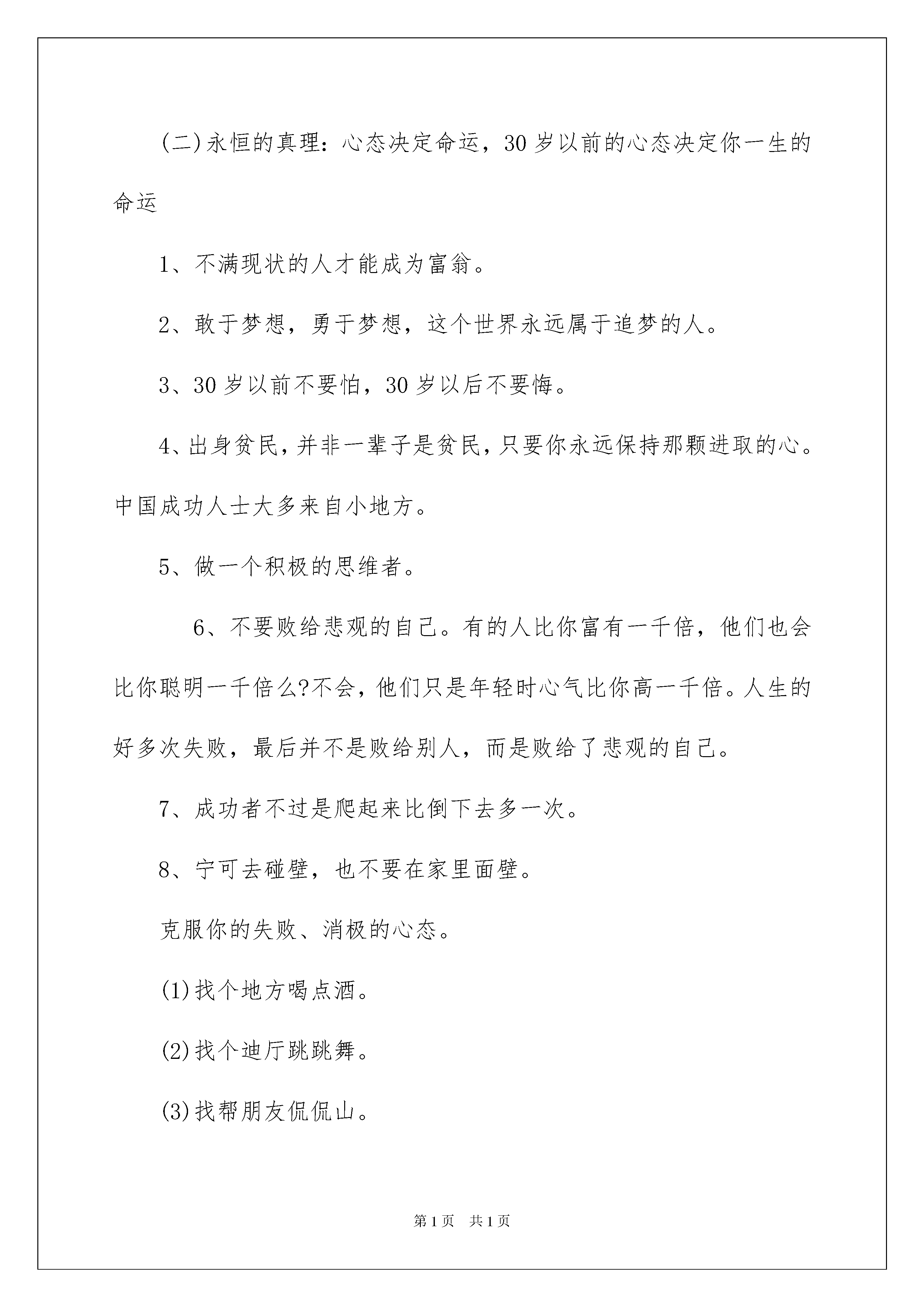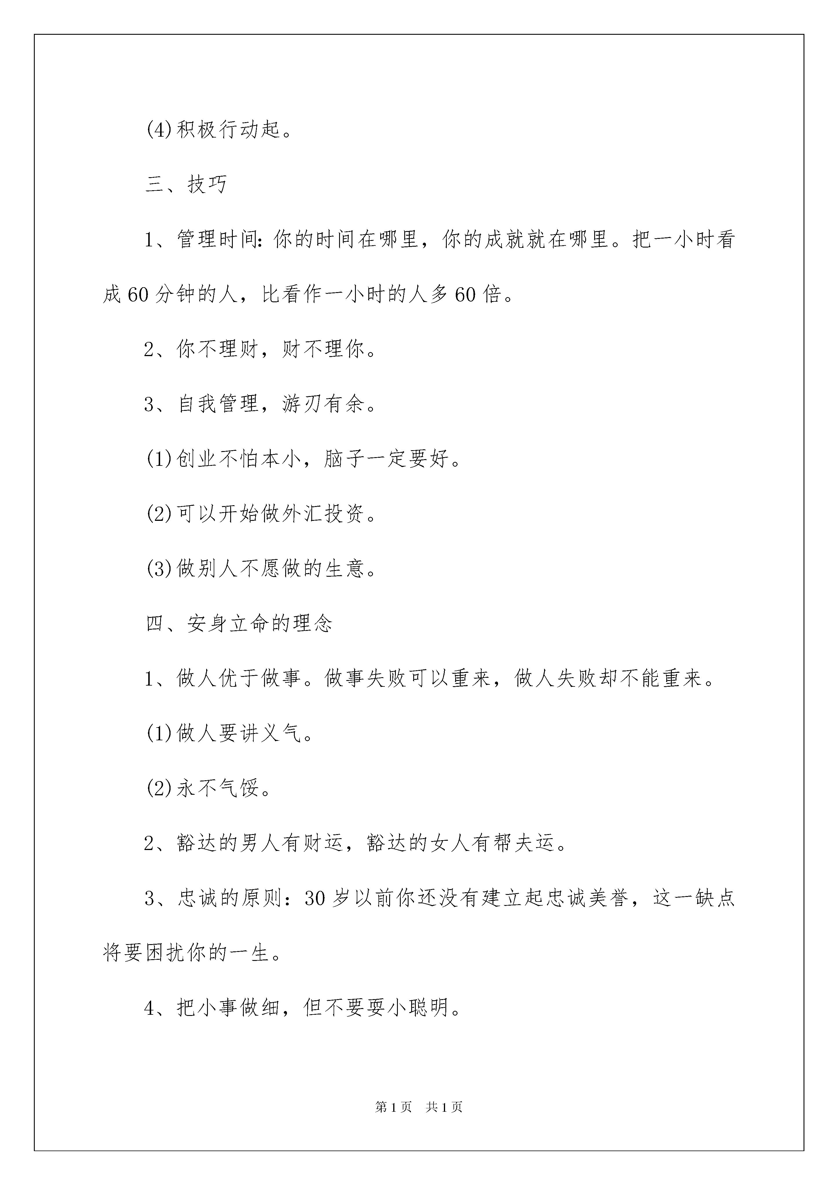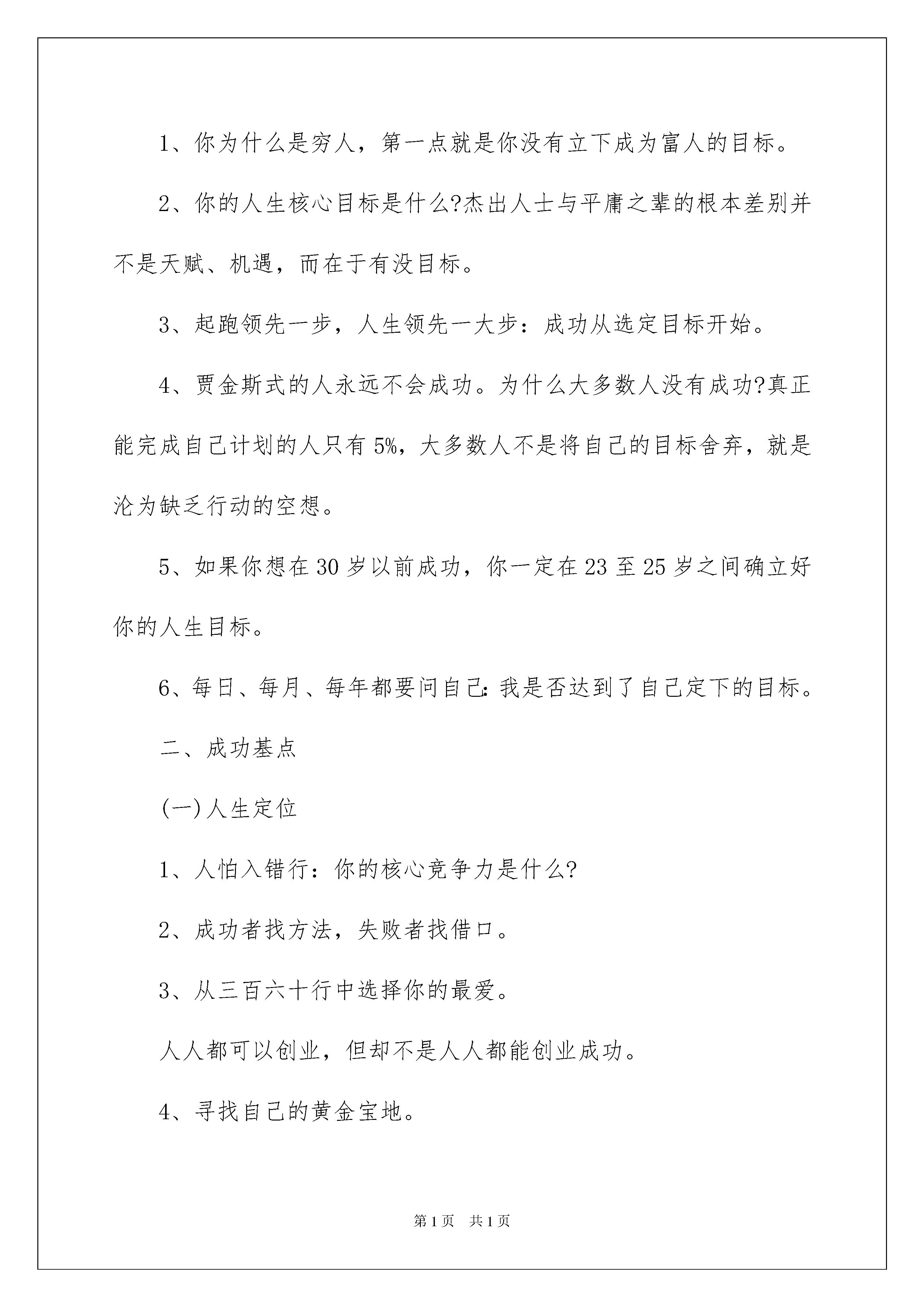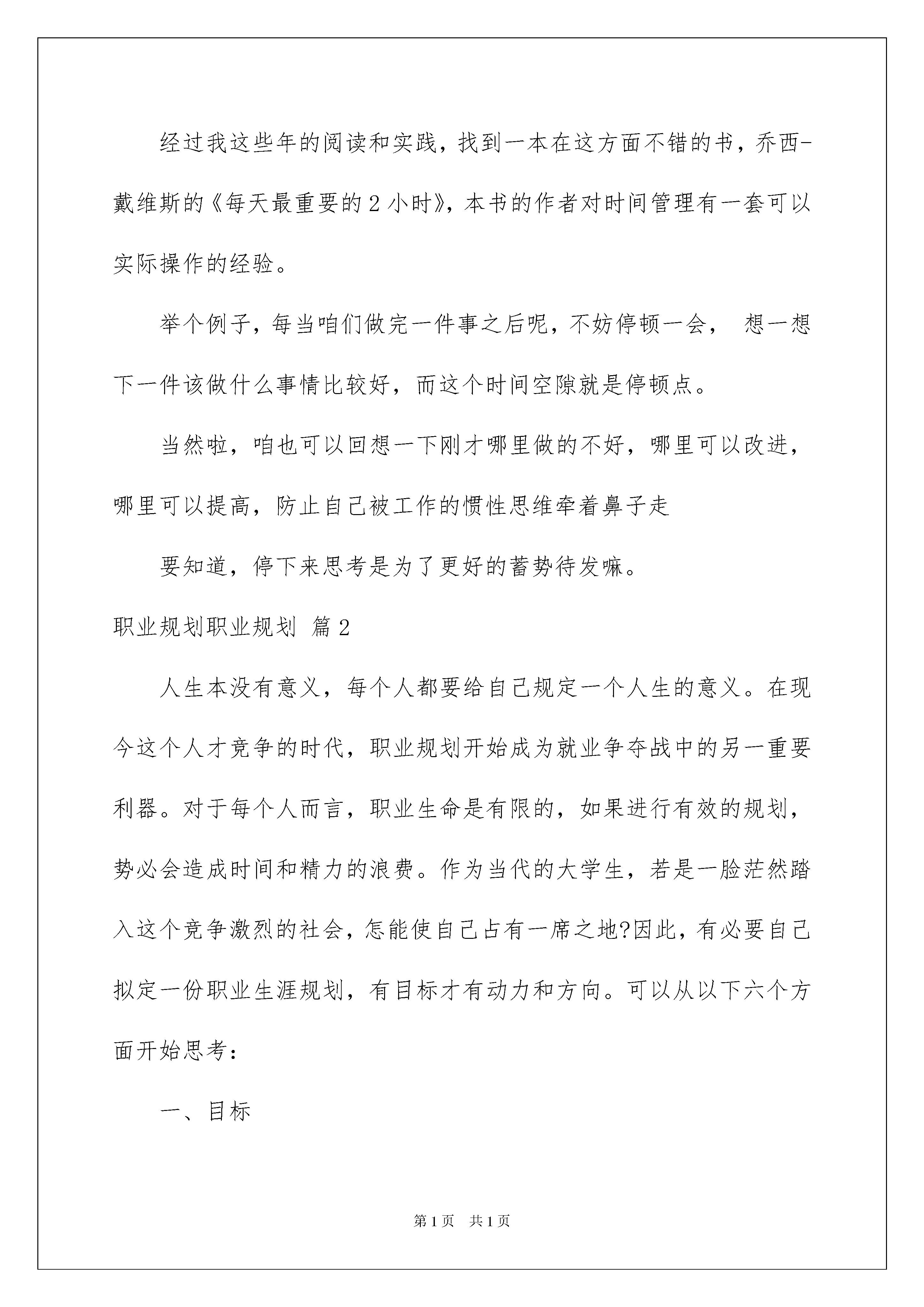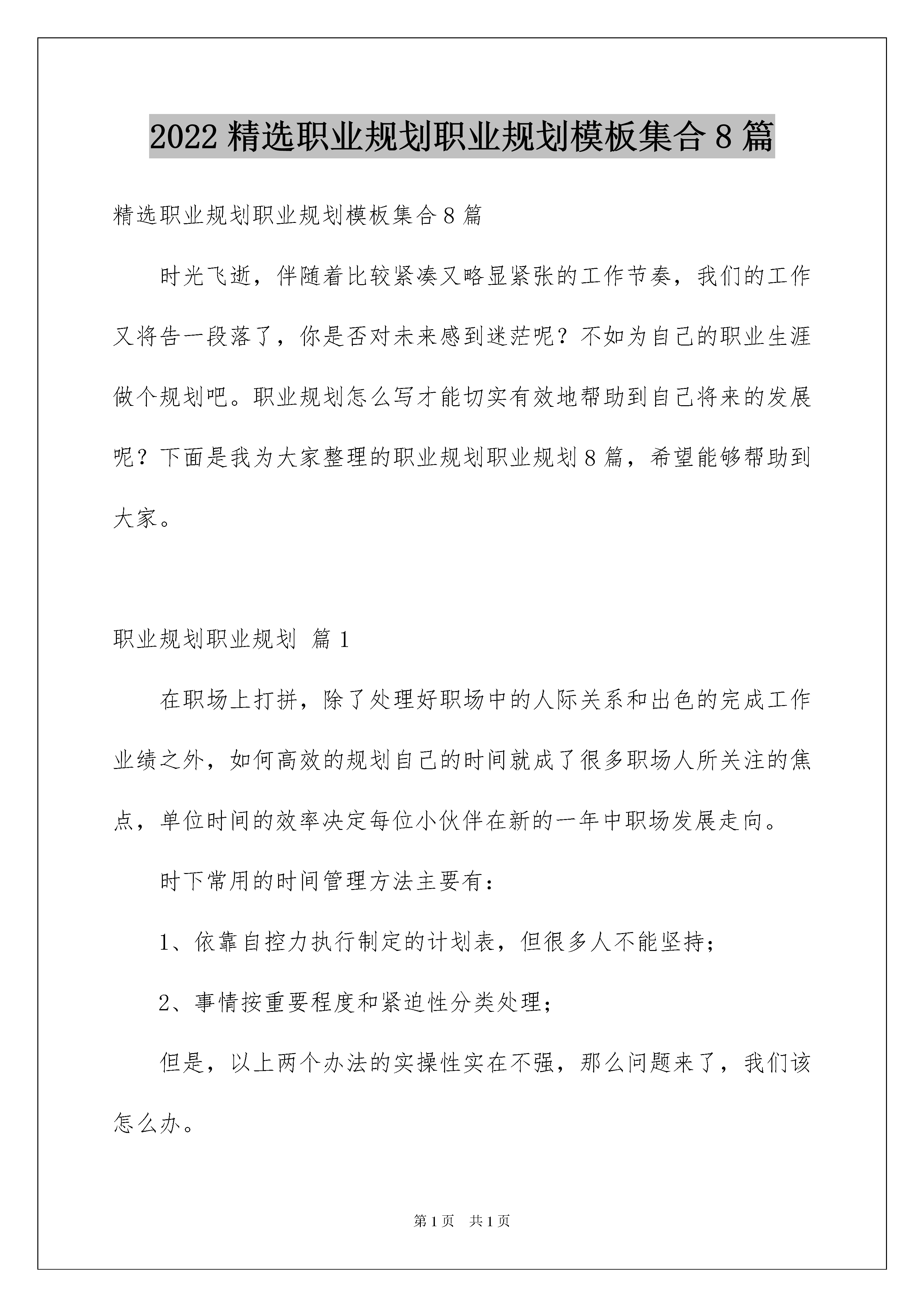 2022精选职业规划职业规划模板集合8篇精选职业规划职业规划模板集合8篇时光飞逝,伴随着比较紧凑又略显紧张的工作节奏,我们的工作又将告一段落了,你是否对未来感到迷茫呢?不如为自己的职业生涯做个规划吧。职业规划怎么写才能切实有效地帮助到自己将来的发展呢?下面是我为大家整理的职业规划职业规划8篇,希望能够帮助到大家。职业规划职业规划篇1在职场上打拼,除了处理好职场中的人际关系和出色的完成工作业绩之外,如何高效的规划自己的时间就成了很多职场人所关注的焦点,单位时间的效率决定每位小伙伴在新的一年中职场发展走向。时下常用的时间管理方法主要有:1、依靠自控力执行制定的计划表,但很多人不能坚持;2、事情按重要程度和紧迫性分类处理;但是,以上两个办法的实操性实在不强,那么问题来了,我们该怎么办。经过我这些年的阅读和实践,找到一本在这方面不错的书,乔西-戴维斯的《每天最重要的2小时》,本书的作者对时间管理有一套可以实际操作的经验。举个例子,每当咱们做完一件事之后呢,不妨停顿一会,想一想下一件该做什么事情比较好,而这个时间空隙就是停顿点。当然啦,咱也可以回想一下刚才哪里做的不好,哪里可以改进,哪里可以提高,防止自己被工作的惯性思维牵着鼻子走要知道,停下来思考是为了更好的蓄势待发嘛。职业规划职业规划篇2人生本没有意义,每个人都要给自己规定一个人生的意义。在现今这个人才竞争的时代,职业规划开始成为就业争夺战中的另一重要利器。对于每个人而言,职业生命是有限的,如果进行有效的规划,势必会造成时间和精力的浪费。作为当代的大学生,若是一脸茫然踏入这个竞争激烈的社会,怎能使自己占有一席之地?因此,有必要自己拟定一份职业生涯规划,有目标才有动力和方向。可以从以下六个方面开始思考:一、目标1、你为什么是穷人,第一点就是你没有立下成为富人的目标。2、你的人生核心目标是什么?杰出人士与平庸之辈的根本差别并不是天赋、机遇,而在于有没目标。3、起跑领先一步,人生领先一大步:成功从选定目标开始。4、贾金斯式的人永远不会成功。为什么大多数人没有成功?真正能完成自己计划的人只有5%,大多数人不是将自己的目标舍弃,就是沦为缺乏行动的空想。5、如果你想在30岁以前成功,你一定在23至25岁之间确立好你的人生目标。6、每日、每月、每年都要问自己:我是否达到了自己定下的目标。二、成功基点(一)人生定位1、人怕入错行:你的核心竞争力是什么?2、成功者找方法,失败者找借口。3、从三百六十行中选择你的最爱。人人都可以创业,但却不是人人都能创业成功。4、寻找自己的黄金宝地。(二)永恒的真理:心态决定命运,30岁以前的心态决定你一生的命运1、不满现状的人才能成为富翁。2、敢于梦想,勇于梦想,这个世界永远属于追梦的人。3、30岁以前不要怕,30岁以后不要悔。4、出身贫民,并非一辈子是贫民,只要你永远保持那颗进取的心。中国成功人士大多来自小地方。5、做一个积极的思维者。6、不要败给悲观的自己。有的人比你富有一千倍,他们也会比你聪明一千倍么?不会,他们只是年轻时心气比你高一千倍。人生的好多次失败,最后并不是败给别人,而是败给了悲观的自己。7、成功者不过是爬起来比倒下去多一次。8、宁可去碰壁,也不要在家里面壁。克服你的失败、消极的心态。(1)找个地方喝点酒。(2)找个迪厅跳跳舞。(3)找帮朋友侃侃山。(4)积极行动起。三、技巧1、管理时间:你的时间在哪里,你的成就就在哪里。把一小时看成60分钟的人,比看作一小时的人多60倍。2、你不理财,财不理你。3、自我管理,游刃有余。(1)创业不怕本小,脑子一定要好。(2)可以开始做外汇投资。(3)做别人不愿做的生意。四、安身立命的理念1、做人优于做事。做事失败可以重来,做人失败却不能重来。(1)做人要讲义气。(2)永不气馁。2、豁达的男人有财运,豁达的女人有帮夫运。3、忠诚的原则:30岁以前你还没有建立起忠诚美誉,这一缺点将要困扰你的一生。4、把小事做细,但不要耍小聪明。中国人想做大事的人太多,而愿把小事做完美的人太少。五、运气1、谋事在人,成事在天:中国的古训说明各占一半。2、机会时常意外地降临,但属于那些不应决不放弃的人。3、抓住人生的每一次机会,机会就像一只小鸟,如果你不抓住,它就会飞得无影无踪。4、智者早一步,愚者晚一步。六、要求1、智慧(1)别人可你以拿走你的一切,但拿不走你的智慧。(2)巧妙运用自己的智慧。2、勇气(1)敢于放弃,敢于“舍得”。3、培养自己的“领导才能、领袖气质”求职指导:先确定职业方向,再谈职业规划在对自己进行职业规划之前,先确定自己的职业方向。再就是给职业规划确立一个支点,这个