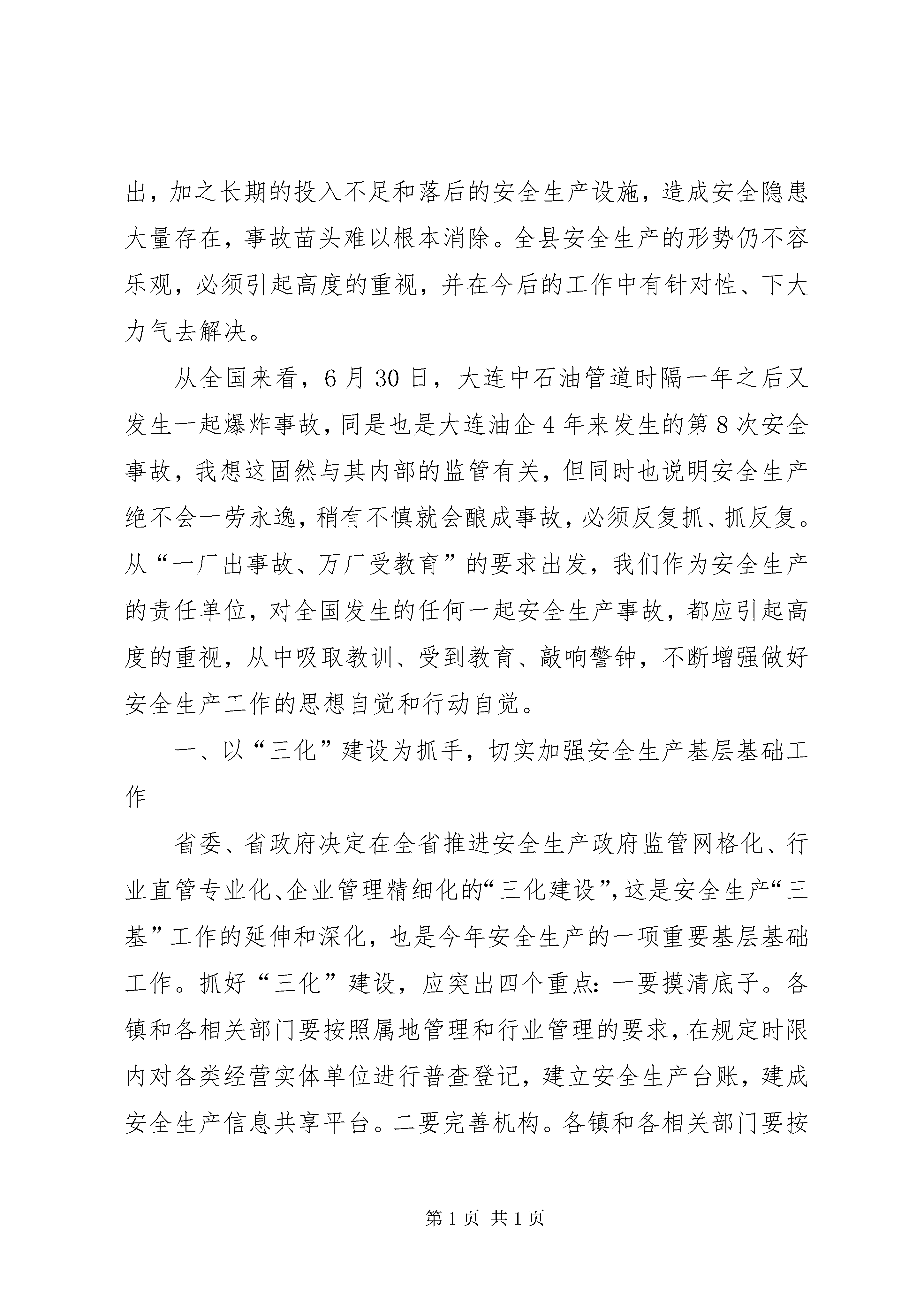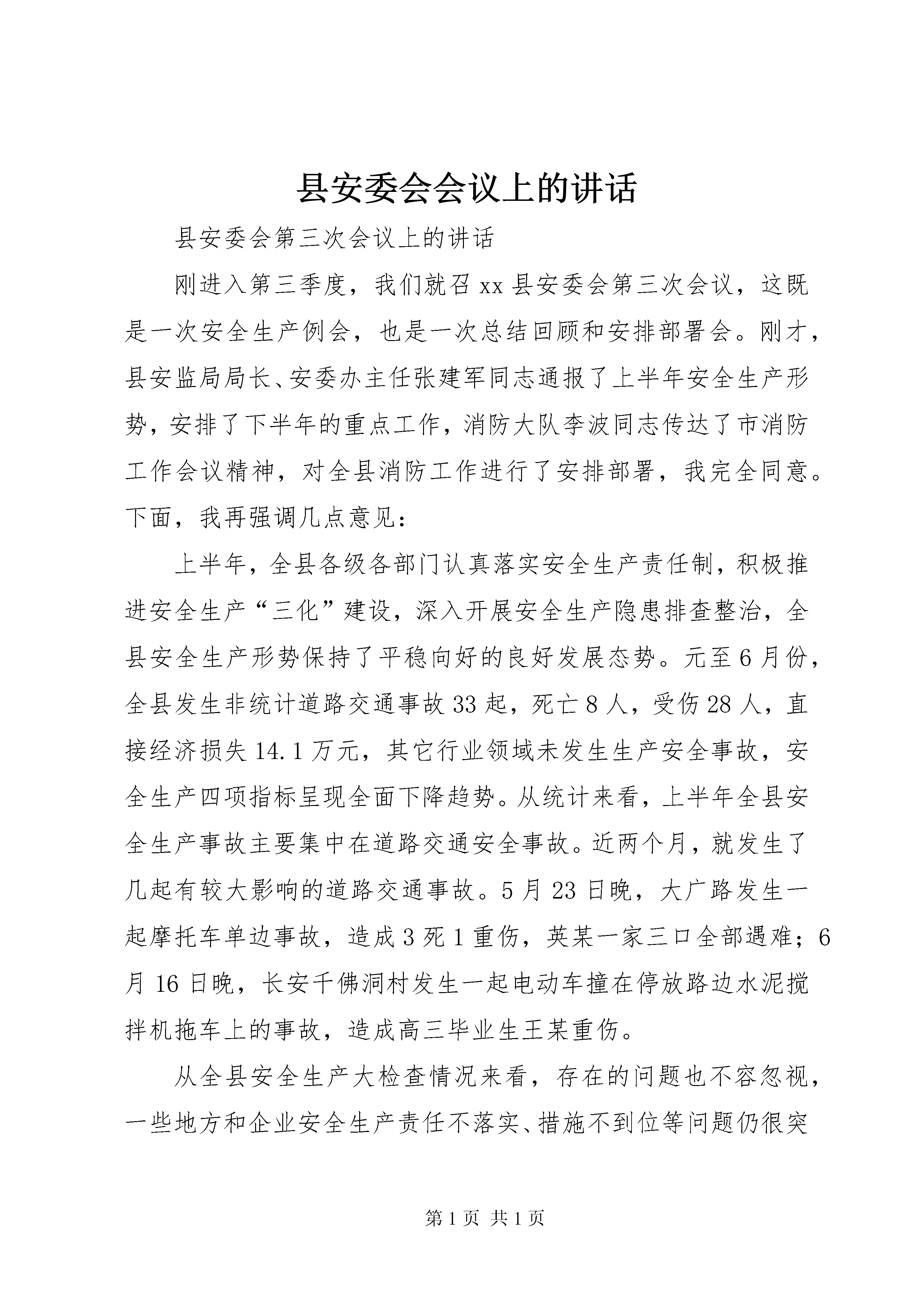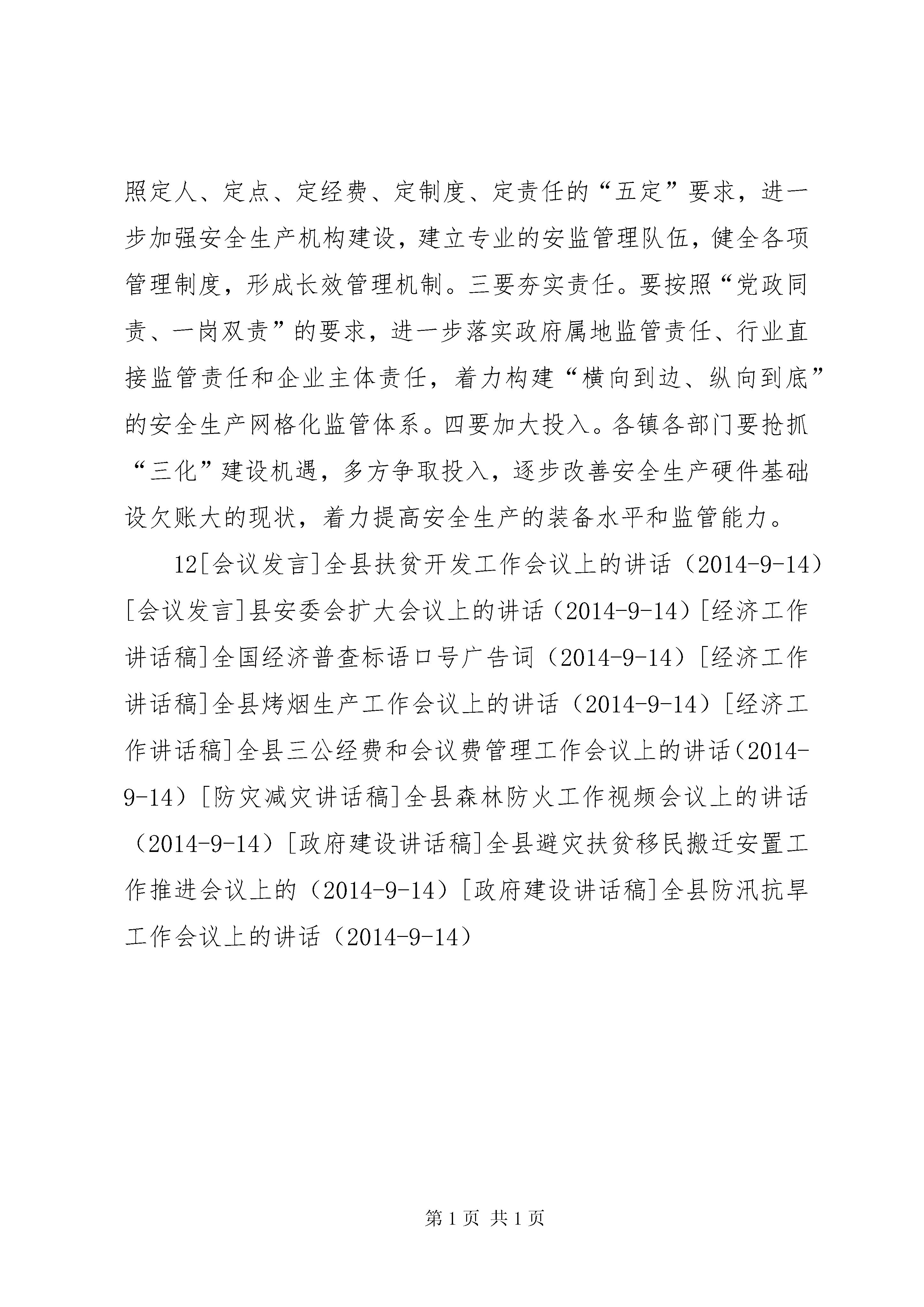 县安委会会议上的讲话县安委会第三次会议上的讲话刚进入第三季度,我们就召xx县安委会第三次会议,这既是一次安全生产例会,也是一次总结回顾和安排部署会。刚才,县安监局局长、安委办主任张建军同志通报了上半年安全生产形势,安排了下半年的重点工作,消防大队李波同志传达了市消防工作会议精神,对全县消防工作进行了安排部署,我完全同意。下面,我再强调几点意见:上半年,全县各级各部门认真落实安全生产责任制,积极推进安全生产“三化”建设,深入开展安全生产隐患排查整治,全县安全生产形势保持了平稳向好的良好发展态势。元至6月份,全县发生非统计道路交通事故33起,死亡8人,受伤28人,直接经济损失14.1万元,其它行业领域未发生生产安全事故,安全生产四项指标呈现全面下降趋势。从统计来看,上半年全县安全生产事故主要集中在道路交通安全事故。近两个月,就发生了几起有较大影响的道路交通事故。5月23日晚,大广路发生一起摩托车单边事故,造成3死1重伤,英某一家三口全部遇难;6月16日晚,长安千佛洞村发生一起电动车撞在停放路边水泥搅拌机拖车上的事故,造成高三毕业生王某重伤。从全县安全生产大检查情况来看,存在的问题也不容忽视,一些地方和企业安全生产责任不落实、措施不到位等问题仍很突出,加之长期的投入不足和落后的安全生产设施,造成安全隐患大量存在,事故苗头难以根本消除。全县安全生产的形势仍不容乐观,必须引起高度的重视,并在今后的工作中有针对性、下大力气去解决。从全国来看,6月30日,大连中石油管道时隔一年之后又发生一起爆炸事故,同是也是大连油企4年来发生的第8次安全事故,我想这固然与其内部的监管有关,但同时也说明安全生产绝不会一劳永逸,稍有不慎就会酿成事故,必须反复抓、抓反复。从“一厂出事故、万厂受教育”的要求出发,我们作为安全生产的责任单位,对全国发生的任何一起安全生产事故,都应引起高度的重视,从中吸取教训、受到教育、敲响警钟,不断增强做好安全生产工作的思想自觉和行动自觉。一、以“三化”建设为抓手,切实加强安全生产基层基础工作省委、省政府决定在全省推进安全生产政府监管网格化、行业直管专业化、企业管理精细化的“三化建设”,这是安全生产“三基”工作的延伸和深化,也是今年安全生产的一项重要基层基础工作。抓好“三化”建设,应突出四个重点:一要摸清底子。各镇和各相关部门要按照属地管理和行业管理的要求,在规定时限内对各类经营实体单位进行普查登记,建立安全生产台账,建成安全生产信息共享平台。二要完善机构。各镇和各相关部门要按照定人、定点、定经费、定制度、定责任的“五定”要求,进一步加强安全生产机构建设,建立专业的安监管理队伍,健全各项管理制度,形成长效管理机制。三要夯实责任。要按照“党政同责、一岗双责”的要求,进一步落实政府属地监管责任、行业直接监管责任和企业主体责任,着力构建“横向到边、纵向到底”的安全生产网格化监管体系。四要加大投入。各镇各部门要抢抓“三化”建设机遇,多方争取投入,逐步改善安全生产硬件基础设欠账大的现状,着力提高安全生产的装备水平和监管能力。12[会议发言]全县扶贫开发工作会议上的讲话(2014-9-14)[会议发言]县安委会扩大会议上的讲话(2014-9-14)[经济工作讲话稿]全国经济普查标语口号广告词(2014-9-14)[经济工作讲话稿]全县烤烟生产工作会议上的讲话(2014-9-14)[经济工作讲话稿]全县三公经费和会议费管理工作会议上的讲话(2014-9-14)[防灾减灾讲话稿]全县森林防火工作视频会议上的讲话(2014-9-14)[政府建设讲话稿]全县避灾扶贫移民搬迁安置工作推进会议上的(2014-9-14)[政府建设讲话稿]全县防汛抗旱工作会议上的讲话(2014-9-14)