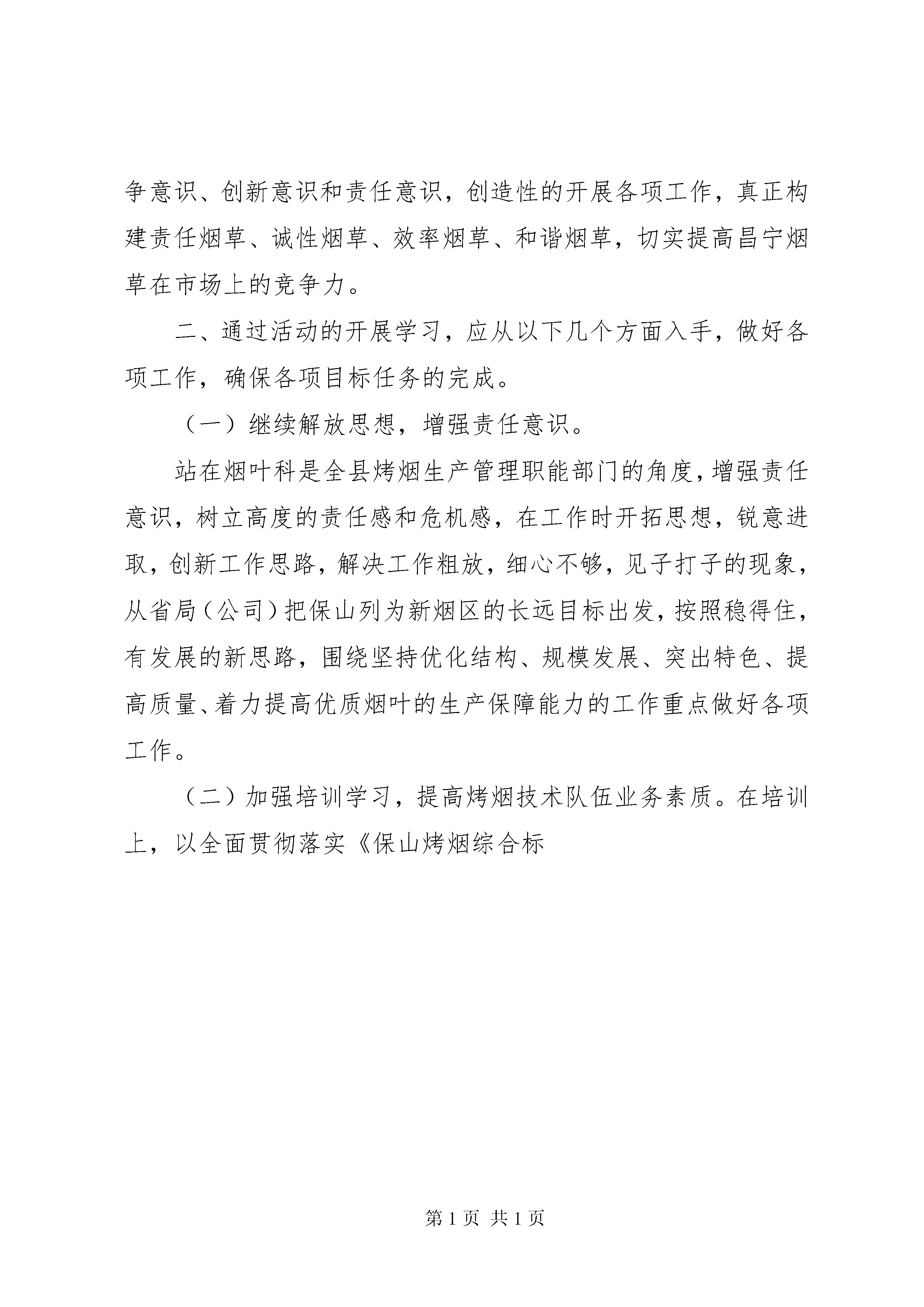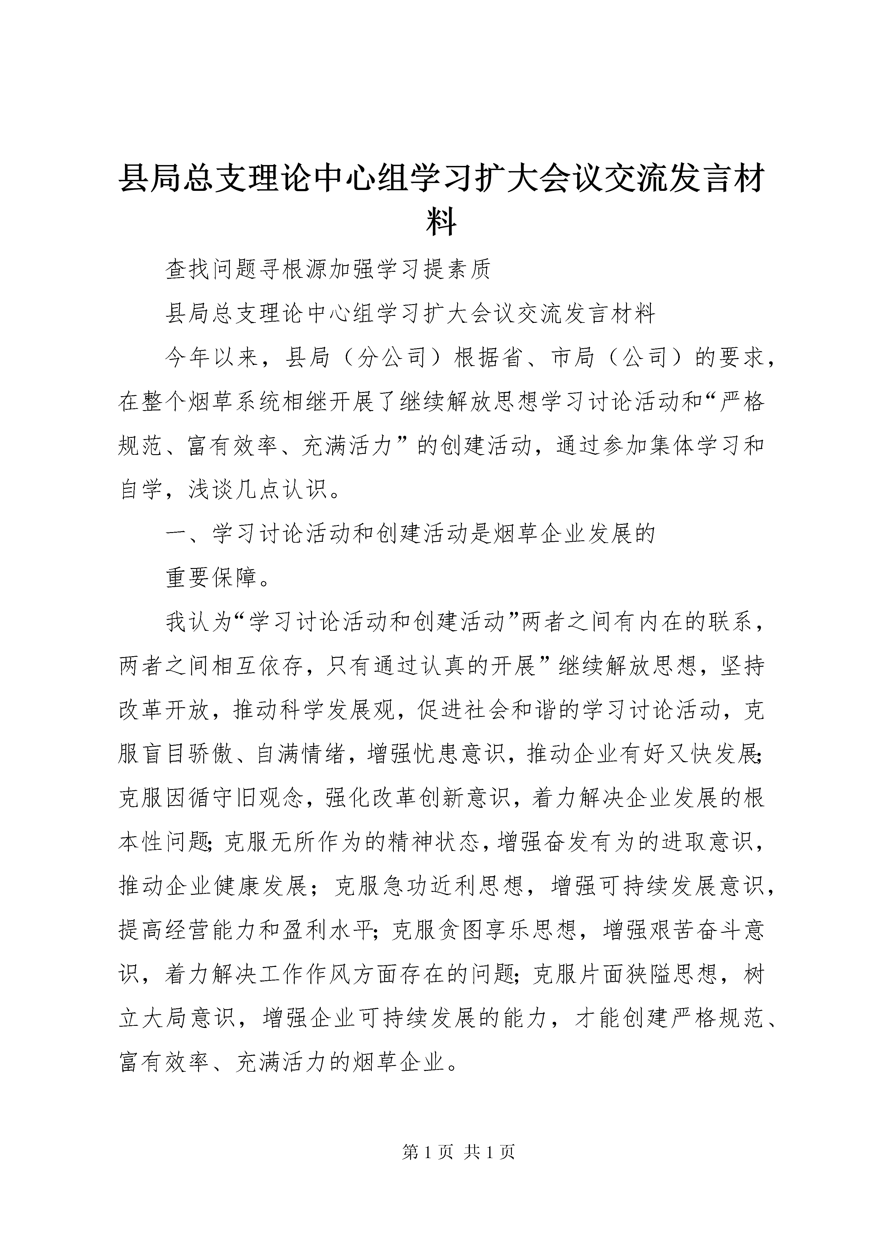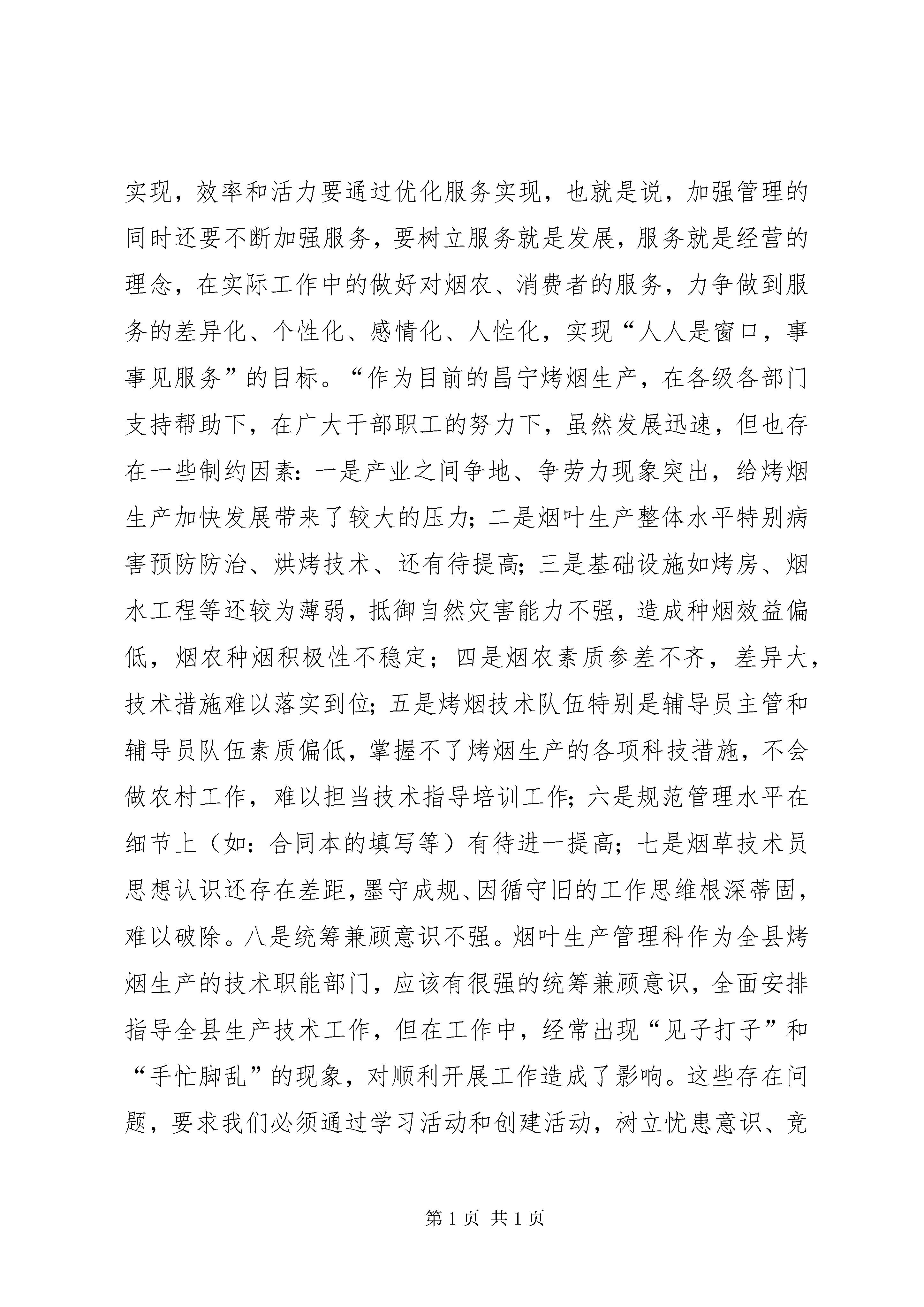 县局总支理论中心组学习扩大会议交流发言材料查找问题寻根源加强学习提素质县局总支理论中心组学习扩大会议交流发言材料今年以来,县局(分公司)根据省、市局(公司)的要求,在整个烟草系统相继开展了继续解放思想学习讨论活动和“严格规范、富有效率、充满活力”的创建活动,通过参加集体学习和自学,浅谈几点认识。一、学习讨论活动和创建活动是烟草企业发展的重要保障。我认为“学习讨论活动和创建活动”两者之间有内在的联系,两者之间相互依存,只有通过认真的开展”继续解放思想,坚持改革开放,推动科学发展观,促进社会和谐的学习讨论活动,克服盲目骄傲、自满情绪,增强忧患意识,推动企业有好又快发展;克服因循守旧观念,强化改革创新意识,着力解决企业发展的根本性问题;克服无所作为的精神状态,增强奋发有为的进取意识,推动企业健康发展;克服急功近利思想,增强可持续发展意识,提高经营能力和盈利水平;克服贪图享乐思想,增强艰苦奋斗意识,着力解决工作作风方面存在的问题;克服片面狭隘思想,树立大局意识,增强企业可持续发展的能力,才能创建严格规范、富有效率、充满活力的烟草企业。继续解放思想,就是要引导整个系统广大党员干部正确把握形势,客观认识昌宁烟草目前的实情,更新思想观念、适应新形势,坚持用改革的办法解决发展中的问题,深入贯彻科学发展观,破解发展难题,始终保持不甘落后,奋力争先的志气,始终保持敢想敢干,敢为人先的气貌,以崭新的精神面貌和工作作风推动我县烟草产业再上新台阶。继续解放思想,就是坚持注重实效,促进工作。务求实效,促进工作是开展这次继续解放思想大讨论活动和创建活动的基本原则和根本目标。继续解放思想大讨论活动和创建活动归根结底要体现在发展上,作为烟草企业来说促进发展的关键是优化服务,优化服务的关键是提高效率,提高效率的关键是改进作风,改进作风的关键是解放思想,这是一个良性循环过程,要通过解放思想大讨论活动,使烟草系统广大干部职工的思想和行动更好的统一到市局(公司)的工作部署上来,以更加先进的思想和理念,更加宽阔的胸怀和眼界,更加强烈的事业心和使命感,更加昂扬的精神风貌,更加务实的工作作风,投入到实现我县烟草企业发展新跨越的实践中来。创建“严格规范、富有效率、充满活力”全国烟草企业的发展目标,体现了解放思想,坚持改革,科学发展,与时俱进的时代精神。是烟草企业确立和增强核心竞争优势的内在需要,也是承担社会责任的外部需要,在创建活动中,规范要通过加强管理实现,效率和活力要通过优化服务实现,也就是说,加强管理的同时还要不断加强服务,要树立服务就是发展,服务就是经营的理念,在实际工作中的做好对烟农、消费者的服务,力争做到服务的差异化、个性化、感情化、人性化,实现“人人是窗口,事事见服务”的目标。“作为目前的昌宁烤烟生产,在各级各部门支持帮助下,在广大干部职工的努力下,虽然发展迅速,但也存在一些制约因素:一是产业之间争地、争劳力现象突出,给烤烟生产加快发展带来了较大的压力;二是烟叶生产整体水平特别病害预防防治、烘烤技术、还有待提高;三是基础设施如烤房、烟水工程等还较为薄弱,抵御自然灾害能力不强,造成种烟效益偏低,烟农种烟积极性不稳定;四是烟农素质参差不齐,差异大,技术措施难以落实到位;五是烤烟技术队伍特别是辅导员主管和辅导员队伍素质偏低,掌握不了烤烟生产的各项科技措施,不会做农村工作,难以担当技术指导培训工作;六是规范管理水平在细节上(如:合同本的填写等)有待进一提高;七是烟草技术员思想认识还存在差距,墨守成规、因循守旧的工作思维根深蒂固,难以破除。八是统筹兼顾意识不强。烟叶生产管理科作为全县烤烟生产的技术职能部门,应该有很强的统筹兼顾意识,全面安排指导全县生产技术工作,但在工作中,经常出现“见子打子”和“手忙脚乱”的现象,对顺利开展工作造成了影响。这些存在问题,要求我们必须通过学习活动和创建活动,树立忧患意识、竞争意识、创新意识和责任意识,创造性的开展各项工作,真正构建责任烟草、诚性烟草、效率烟草、和谐烟草,切实提高昌宁烟草在市场上的竞争力。二、通过活动的开展学习,应从以下几个方面入手,做好各项工作,确保各项目标任务的完成。(一)继续解放思想,增强责任意识。站在烟叶科是全县烤烟生产管理职能部门的角度,增强责任意识,树立高度的责任感和危机感,在工作时开拓思想,锐意进取,创新工作思路,解决工作粗放,细心不够,见子打子的现象,从省局(公司)把保山列为新烟区的长远目标出发,按照稳得住,有发展的新思路,围绕坚持优化结构、规模发展、突出特色、提高质量、着力提高优质烟叶的生产保障能力的工作重点做好各项工作。(二)加强培训学习,提高烤烟技术队伍业务素质。在培训上,以全面贯彻落实《保山烤烟综合标