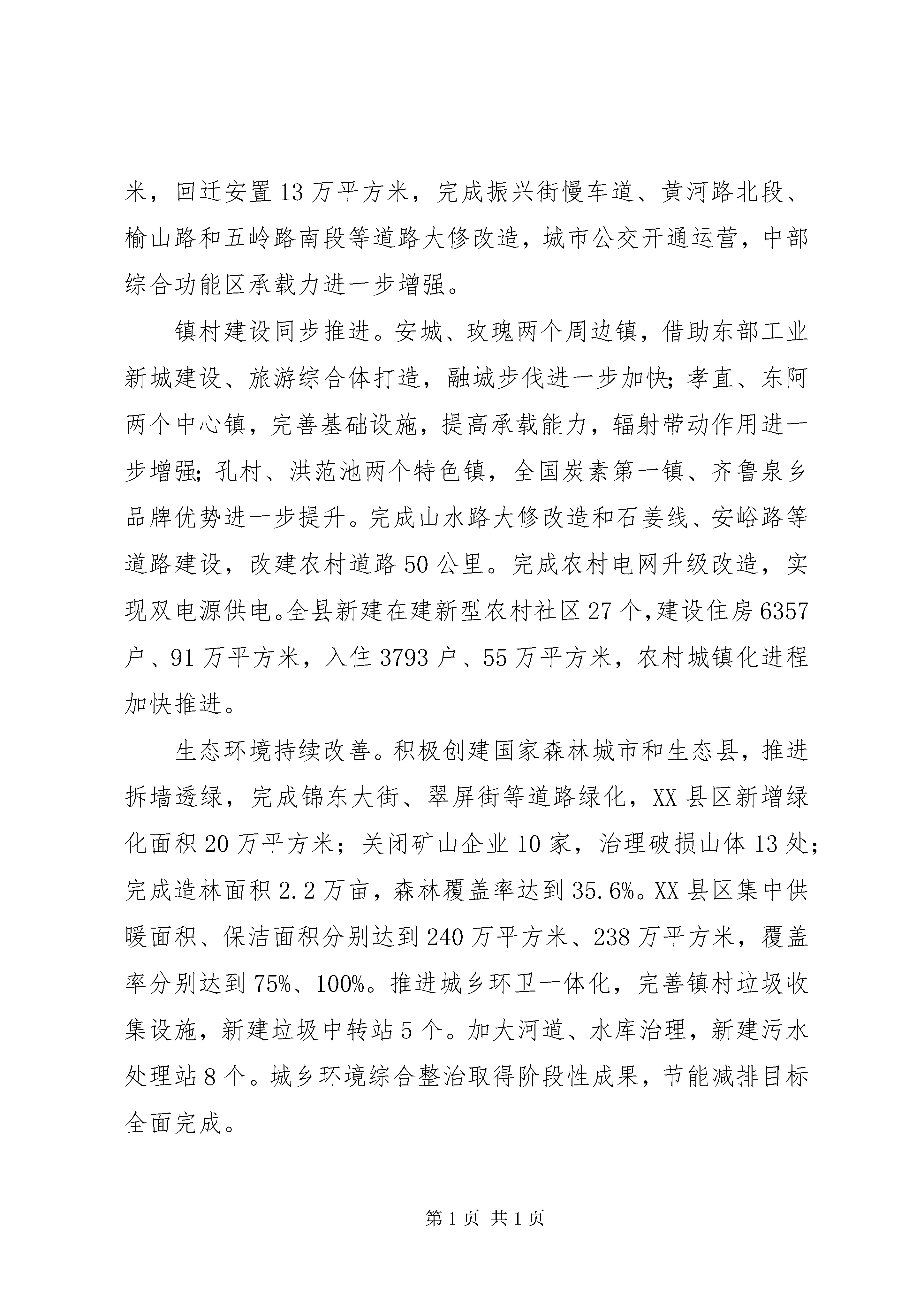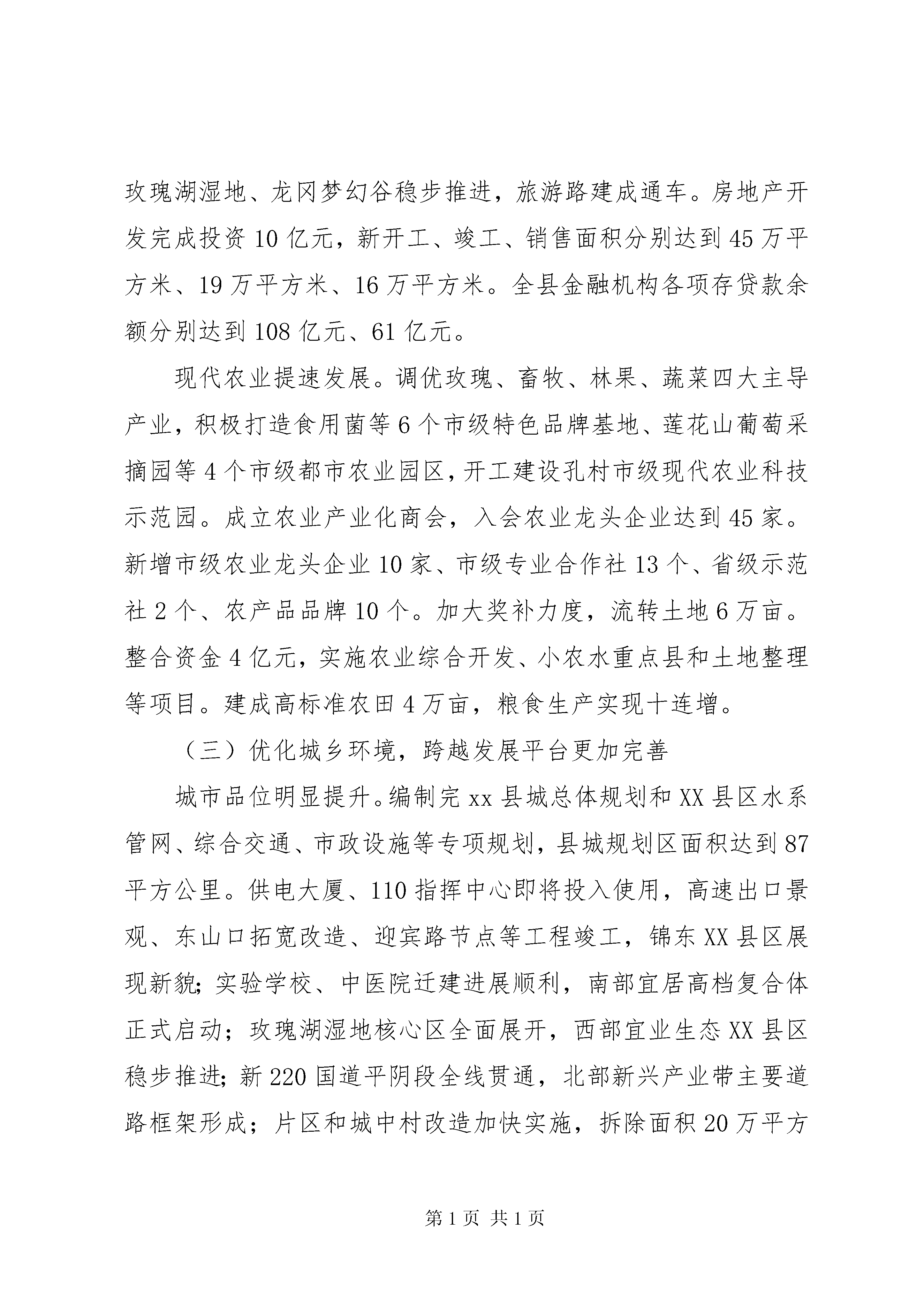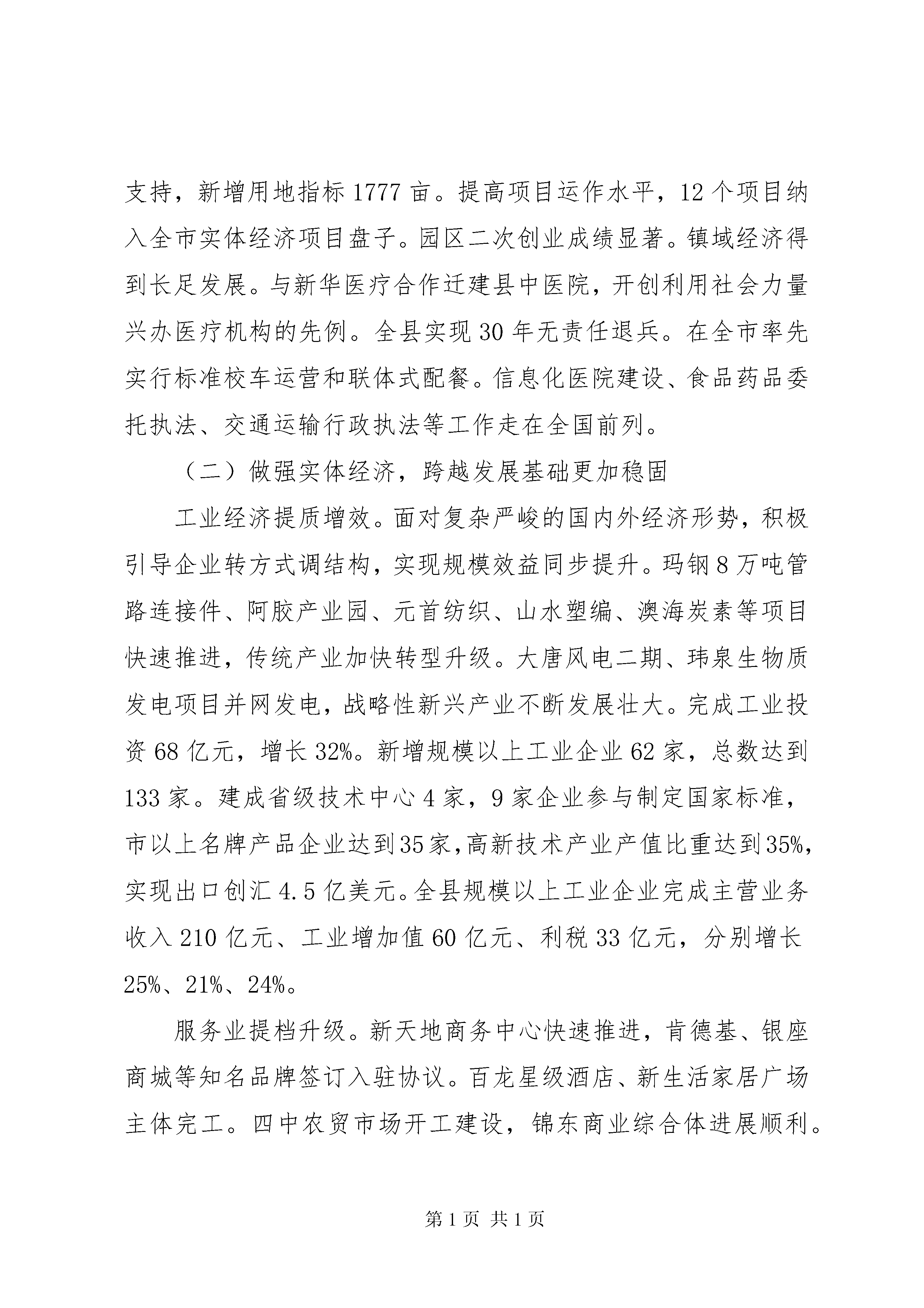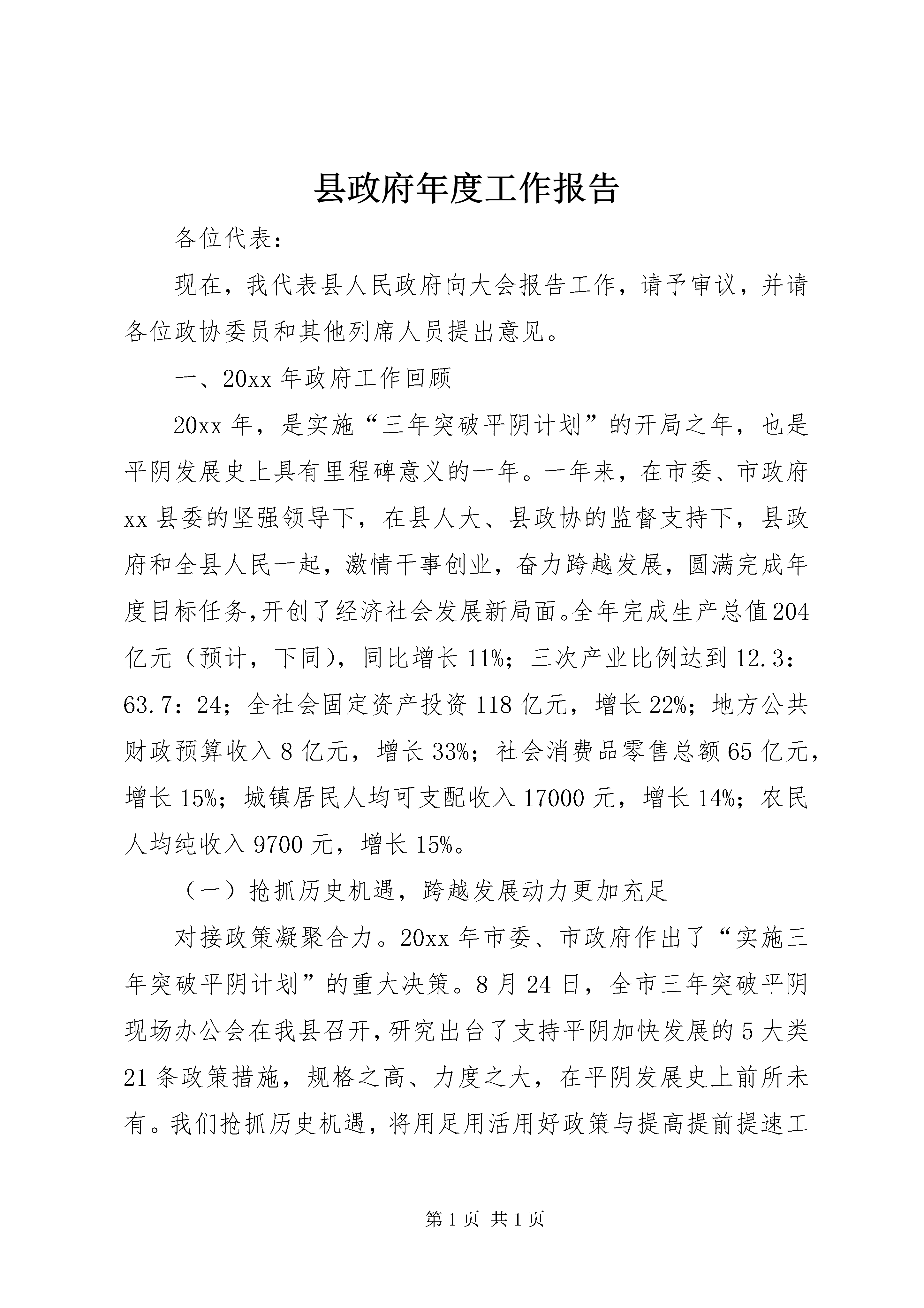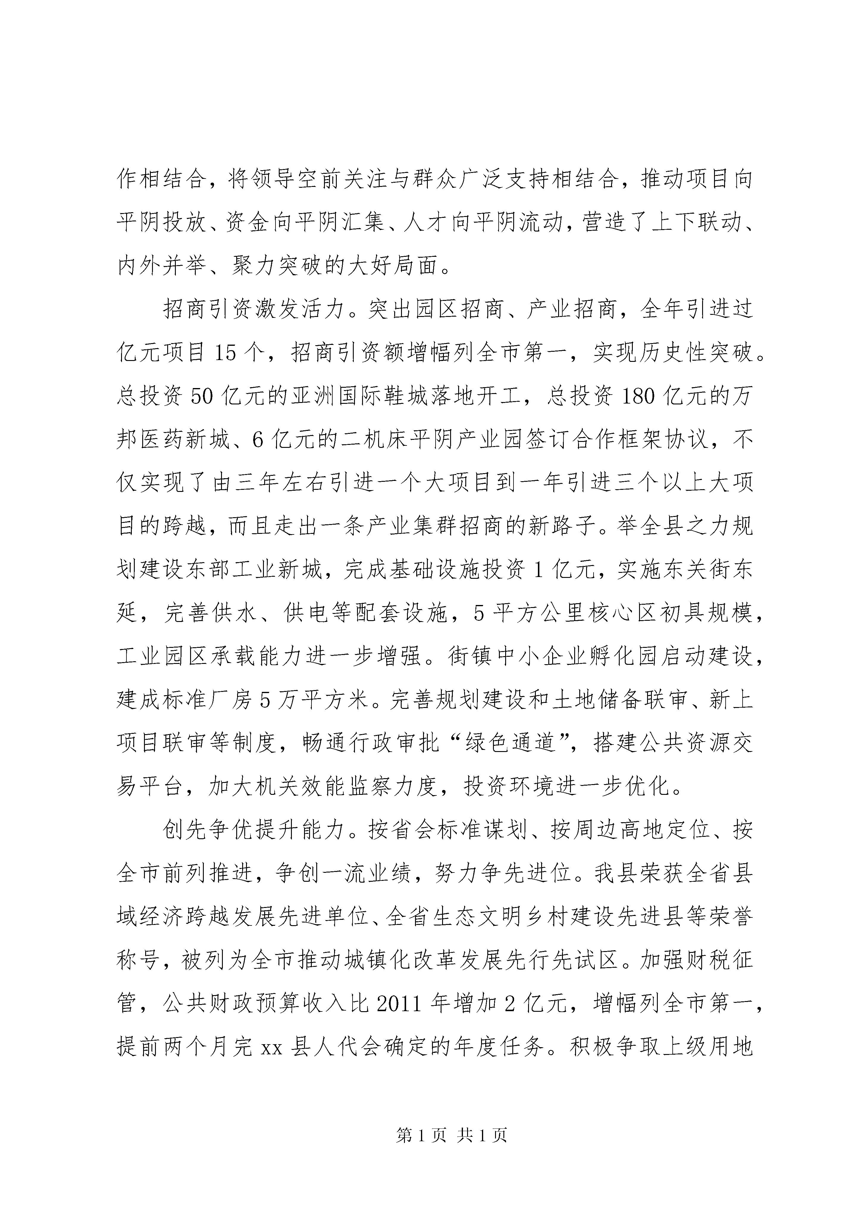 县政府年度工作报告各位代表:现在,我代表县人民政府向大会报告工作,请予审议,并请各位政协委员和其他列席人员提出意见。一、20xx年政府工作回顾20xx年,是实施“三年突破平阴计划”的开局之年,也是平阴发展史上具有里程碑意义的一年。一年来,在市委、市政府xx县委的坚强领导下,在县人大、县政协的监督支持下,县政府和全县人民一起,激情干事创业,奋力跨越发展,圆满完成年度目标任务,开创了经济社会发展新局面。全年完成生产总值204亿元(预计,下同),同比增长11%;三次产业比例达到12.3:63.7:24;全社会固定资产投资118亿元,增长22%;地方公共财政预算收入8亿元,增长33%;社会消费品零售总额65亿元,增长15%;城镇居民人均可支配收入17000元,增长14%;农民人均纯收入9700元,增长15%。(一)抢抓历史机遇,跨越发展动力更加充足对接政策凝聚合力。20xx年市委、市政府作出了“实施三年突破平阴计划”的重大决策。8月24日,全市三年突破平阴现场办公会在我县召开,研究出台了支持平阴加快发展的5大类21条政策措施,规格之高、力度之大,在平阴发展史上前所未有。我们抢抓历史机遇,将用足用活用好政策与提高提前提速工作相结合,将领导空前关注与群众广泛支持相结合,推动项目向平阴投放、资金向平阴汇集、人才向平阴流动,营造了上下联动、内外并举、聚力突破的大好局面。招商引资激发活力。突出园区招商、产业招商,全年引进过亿元项目15个,招商引资额增幅列全市第一,实现历史性突破。总投资50亿元的亚洲国际鞋城落地开工,总投资180亿元的万邦医药新城、6亿元的二机床平阴产业园签订合作框架协议,不仅实现了由三年左右引进一个大项目到一年引进三个以上大项目的跨越,而且走出一条产业集群招商的新路子。举全县之力规划建设东部工业新城,完成基础设施投资1亿元,实施东关街东延,完善供水、供电等配套设施,5平方公里核心区初具规模,工业园区承载能力进一步增强。街镇中小企业孵化园启动建设,建成标准厂房5万平方米。完善规划建设和土地储备联审、新上项目联审等制度,畅通行政审批“绿色通道”,搭建公共资源交易平台,加大机关效能监察力度,投资环境进一步优化。创先争优提升能力。按省会标准谋划、按周边高地定位、按全市前列推进,争创一流业绩,努力争先进位。我县荣获全省县域经济跨越发展先进单位、全省生态文明乡村建设先进县等荣誉称号,被列为全市推动城镇化改革发展先行先试区。加强财税征管,公共财政预算收入比2011年增加2亿元,增幅列全市第一,提前两个月完xx县人代会确定的年度任务。积极争取上级用地支持,新增用地指标1777亩。提高项目运作水平,12个项目纳入全市实体经济项目盘子。园区二次创业成绩显著。镇域经济得到长足发展。与新华医疗合作迁建县中医院,开创利用社会力量兴办医疗机构的先例。全县实现30年无责任退兵。在全市率先实行标准校车运营和联体式配餐。信息化医院建设、食品药品委托执法、交通运输行政执法等工作走在全国前列。(二)做强实体经济,跨越发展基础更加稳固工业经济提质增效。面对复杂严峻的国内外经济形势,积极引导企业转方式调结构,实现规模效益同步提升。玛钢8万吨管路连接件、阿胶产业园、元首纺织、山水塑编、澳海炭素等项目快速推进,传统产业加快转型升级。大唐风电二期、玮泉生物质发电项目并网发电,战略性新兴产业不断发展壮大。完成工业投资68亿元,增长32%。新增规模以上工业企业62家,总数达到133家。建成省级技术中心4家,9家企业参与制定国家标准,市以上名牌产品企业达到35家,高新技术产业产值比重达到35%,实现出口创汇4.5亿美元。全县规模以上工业企业完成主营业务收入210亿元、工业增加值60亿元、利税33亿元,分别增长25%、21%、24%。服务业提档升级。新天地商务中心快速推进,肯德基、银座商城等知名品牌签订入驻协议。百龙星级酒店、新生活家居广场主体完工。四中农贸市场开工建设,锦东商业综合体进展顺利。玫瑰湖湿地、龙冈梦幻谷稳步推进,旅游路建成通车。房地产开发完成投资10亿元,新开工、竣工、销售面积分别达到45万平方米、19万平方米、16万平方米。全县金融机构各项存贷款余额分别达到108亿元、61亿元。现代农业提速发展。调优玫瑰、畜牧、林果、蔬菜四大主导产业,积极打造食用菌等6个市级特色品牌基地、莲花山葡萄采摘园等4个市级都市农业园区,开工建设孔村市级现代农业科技示范园。成立农业产业化商会,入会农业龙头企业达到45家。新增市级农业龙头企业10家、市级专业合作社13个、省级示范社2个、农产品品牌10个。加大奖补力度,流转土地6万亩。整合资金4亿元,实施农业综合开发、小农水重点县和土地整理等项目。建成高标准农田4万亩,粮食生产实现十连增。(三)优化城乡环境,跨越发展平