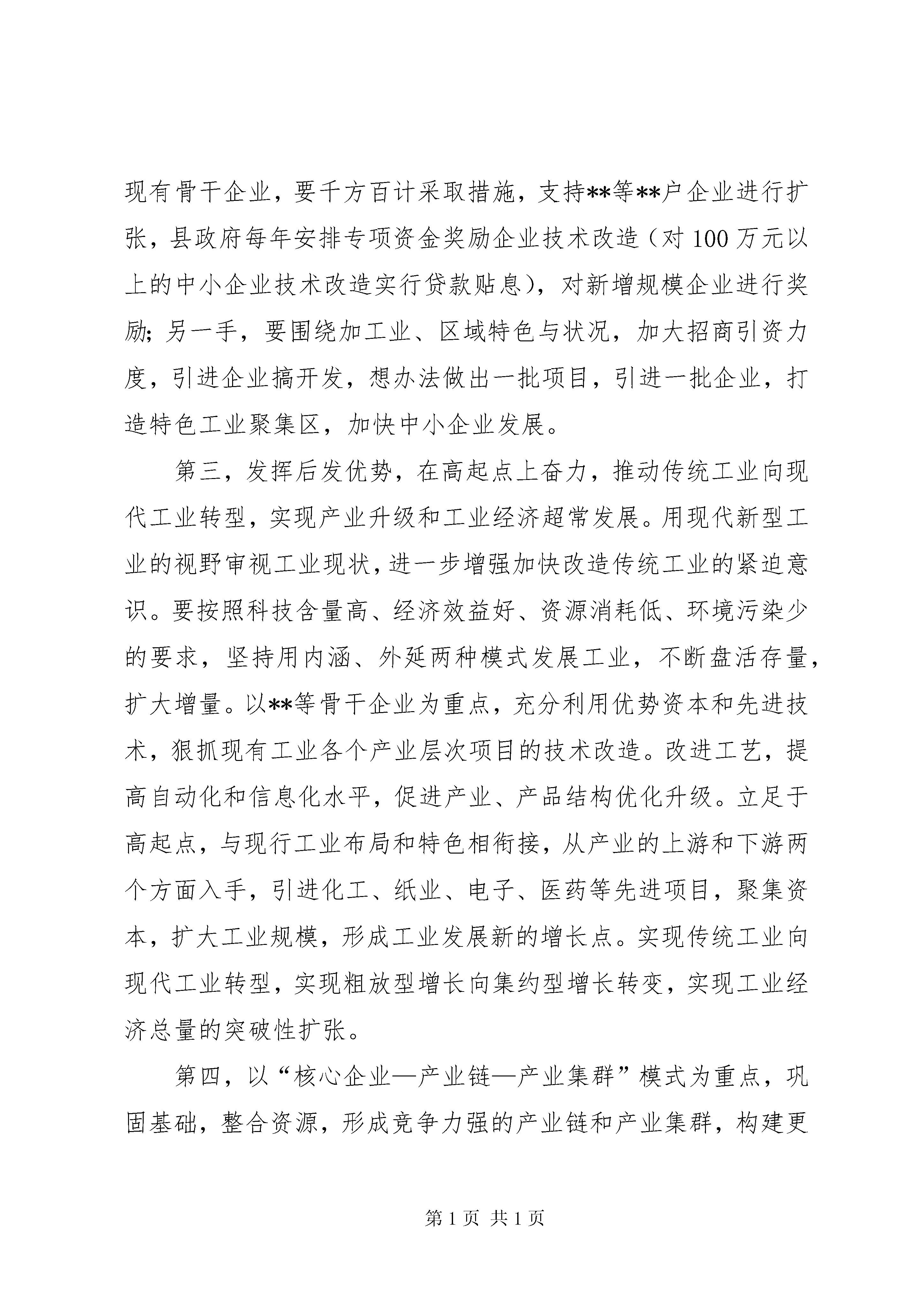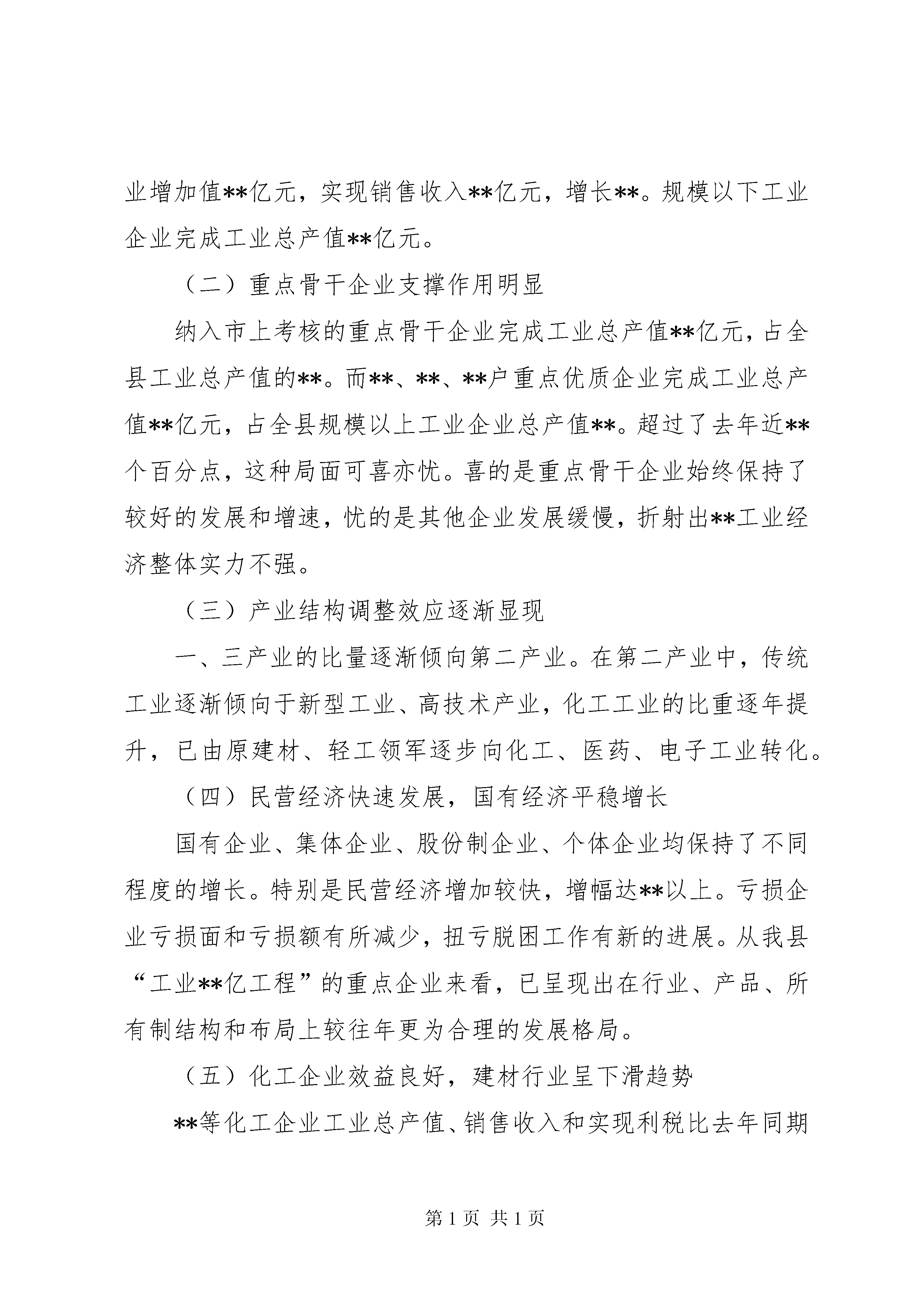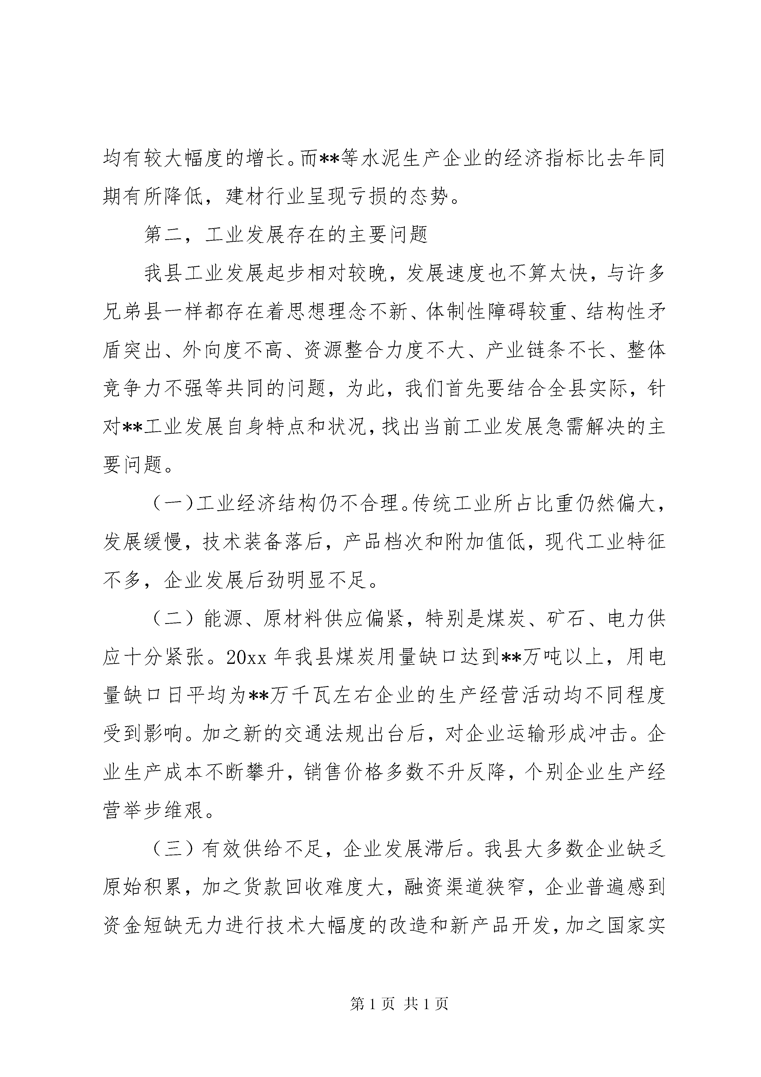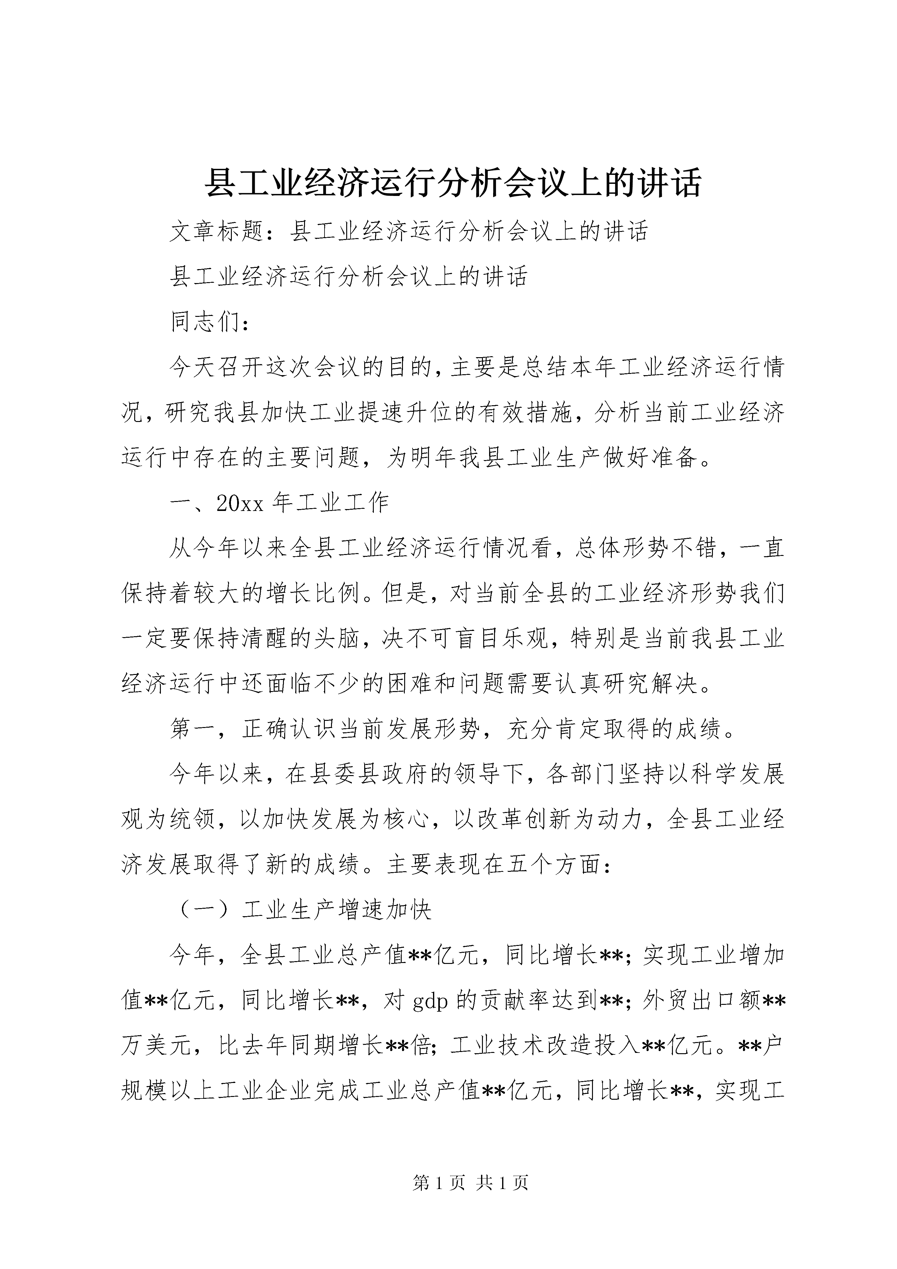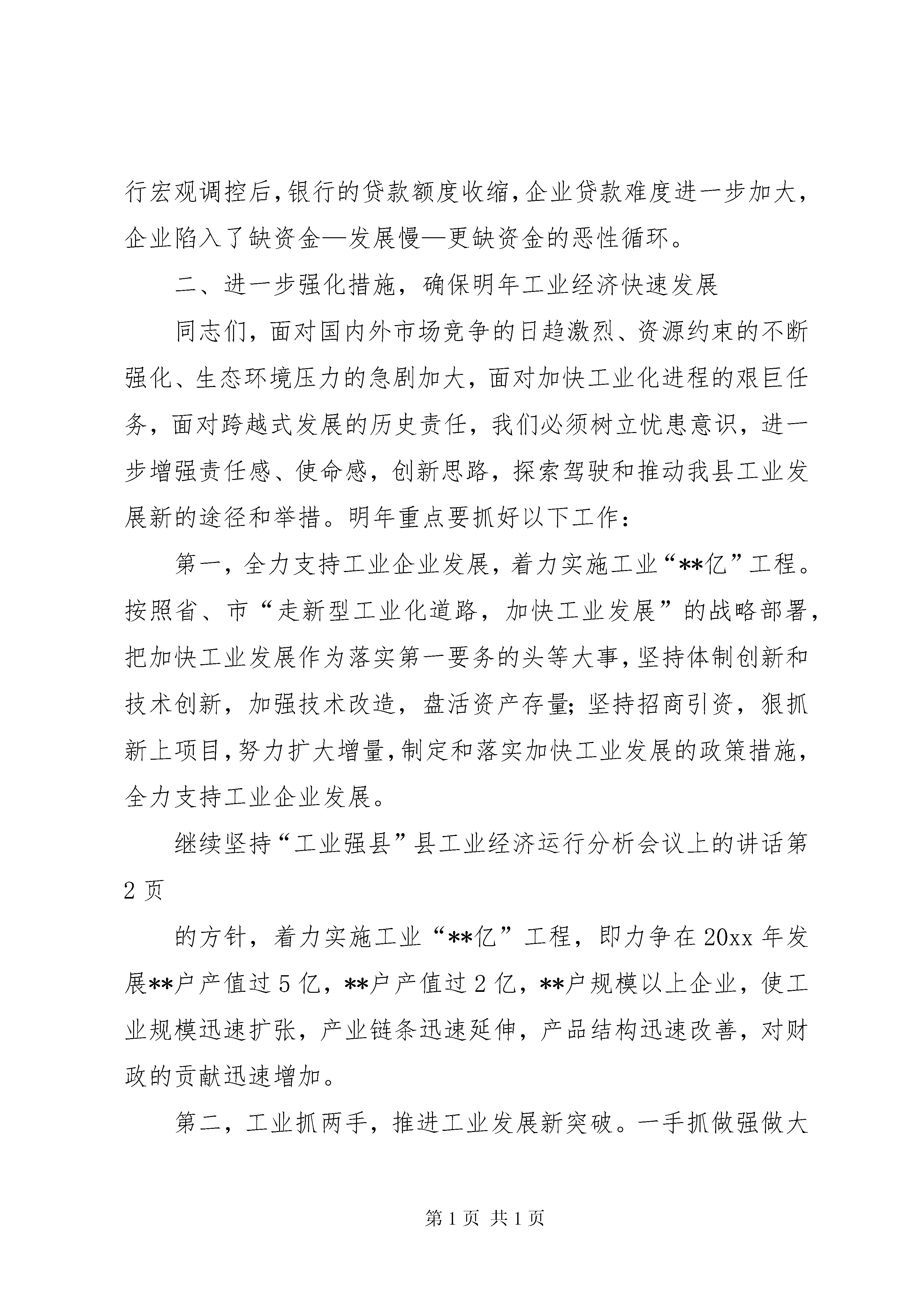 县工业经济运行分析会议上的讲话文章标题:县工业经济运行分析会议上的讲话县工业经济运行分析会议上的讲话同志们:今天召开这次会议的目的,主要是总结本年工业经济运行情况,研究我县加快工业提速升位的有效措施,分析当前工业经济运行中存在的主要问题,为明年我县工业生产做好准备。一、20xx年工业工作从今年以来全县工业经济运行情况看,总体形势不错,一直保持着较大的增长比例。但是,对当前全县的工业经济形势我们一定要保持清醒的头脑,决不可盲目乐观,特别是当前我县工业经济运行中还面临不少的困难和问题需要认真研究解决。第一,正确认识当前发展形势,充分肯定取得的成绩。今年以来,在县委县政府的领导下,各部门坚持以科学发展观为统领,以加快发展为核心,以改革创新为动力,全县工业经济发展取得了新的成绩。主要表现在五个方面:(一)工业生产增速加快今年,全县工业总产值**亿元,同比增长**;实现工业增加值**亿元,同比增长**,对gdp的贡献率达到**;外贸出口额**万美元,比去年同期增长**倍;工业技术改造投入**亿元。**户规模以上工业企业完成工业总产值**亿元,同比增长**,实现工业增加值**亿元,实现销售收入**亿元,增长**。规模以下工业企业完成工业总产值**亿元。(二)重点骨干企业支撑作用明显纳入市上考核的重点骨干企业完成工业总产值**亿元,占全县工业总产值的**。而**、**、**户重点优质企业完成工业总产值**亿元,占全县规模以上工业企业总产值**。超过了去年近**个百分点,这种局面可喜亦忧。喜的是重点骨干企业始终保持了较好的发展和增速,忧的是其他企业发展缓慢,折射出**工业经济整体实力不强。(三)产业结构调整效应逐渐显现一、三产业的比量逐渐倾向第二产业。在第二产业中,传统工业逐渐倾向于新型工业、高技术产业,化工工业的比重逐年提升,已由原建材、轻工领军逐步向化工、医药、电子工业转化。(四)民营经济快速发展,国有经济平稳增长国有企业、集体企业、股份制企业、个体企业均保持了不同程度的增长。特别是民营经济增加较快,增幅达**以上。亏损企业亏损面和亏损额有所减少,扭亏脱困工作有新的进展。从我县“工业**亿工程”的重点企业来看,已呈现出在行业、产品、所有制结构和布局上较往年更为合理的发展格局。(五)化工企业效益良好,建材行业呈下滑趋势**等化工企业工业总产值、销售收入和实现利税比去年同期均有较大幅度的增长。而**等水泥生产企业的经济指标比去年同期有所降低,建材行业呈现亏损的态势。第二,工业发展存在的主要问题我县工业发展起步相对较晚,发展速度也不算太快,与许多兄弟县一样都存在着思想理念不新、体制性障碍较重、结构性矛盾突出、外向度不高、资源整合力度不大、产业链条不长、整体竞争力不强等共同的问题,为此,我们首先要结合全县实际,针对**工业发展自身特点和状况,找出当前工业发展急需解决的主要问题。(一)工业经济结构仍不合理。传统工业所占比重仍然偏大,发展缓慢,技术装备落后,产品档次和附加值低,现代工业特征不多,企业发展后劲明显不足。(二)能源、原材料供应偏紧,特别是煤炭、矿石、电力供应十分紧张。20xx年我县煤炭用量缺口达到**万吨以上,用电量缺口日平均为**万千瓦左右企业的生产经营活动均不同程度受到影响。加之新的交通法规出台后,对企业运输形成冲击。企业生产成本不断攀升,销售价格多数不升反降,个别企业生产经营举步维艰。(三)有效供给不足,企业发展滞后。我县大多数企业缺乏原始积累,加之货款回收难度大,融资渠道狭窄,企业普遍感到资金短缺无力进行技术大幅度的改造和新产品开发,加之国家实行宏观调控后,银行的贷款额度收缩,企业贷款难度进一步加大,企业陷入了缺资金—发展慢—更缺资金的恶性循环。二、进一步强化措施,确保明年工业经济快速发展同志们,面对国内外市场竞争的日趋激烈、资源约束的不断强化、生态环境压力的急剧加大,面对加快工业化进程的艰巨任务,面对跨越式发展的历史责任,我们必须树立忧患意识,进一步增强责任感、使命感,创新思路,探索驾驶和推动我县工业发展新的途径和举措。明年重点要抓好以下工作:第一,全力支持工业企业发展,着力实施工业“**亿”工程。按照省、市“走新型工业化道路,加快工业发展”的战略部署,把加快工业发展作为落实第一要务的头等大事,坚持体制创新和技术创新,加强技术改造,盘活资产存量;坚持招商引资,狠抓新上项目,努力扩大增量,制定和落实加快工业发展的政策措施,全力支持工业企业发展。继续坚持“工业强县”县工业经济运行分析会议上的讲话的方针,着力实施工业“**亿”工程,即力争在20xx年发展**户产值过5亿,**户产值过2亿,**户规模以上企业,使工业规模迅速扩张,产业链条迅速延伸,产品结构迅速改善,对财政的贡献迅速增加。第二,工业抓两手,