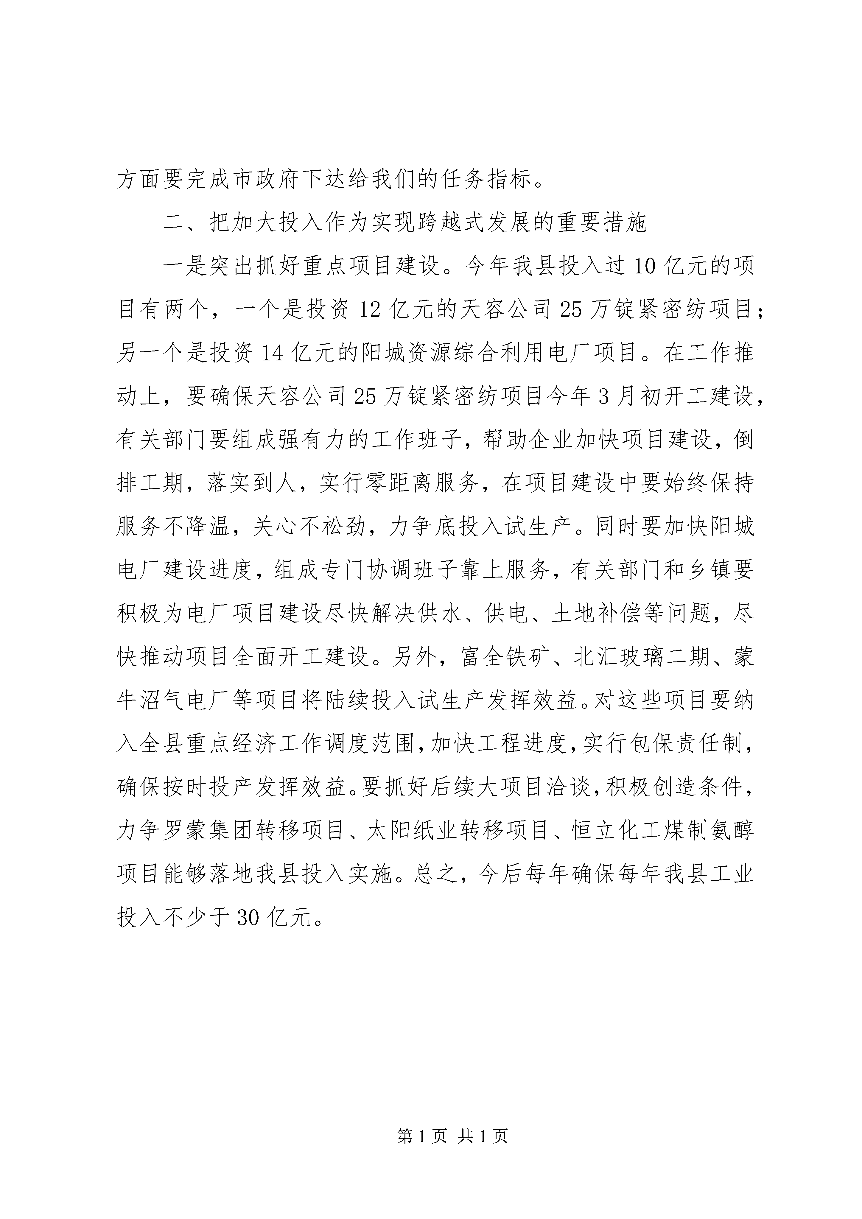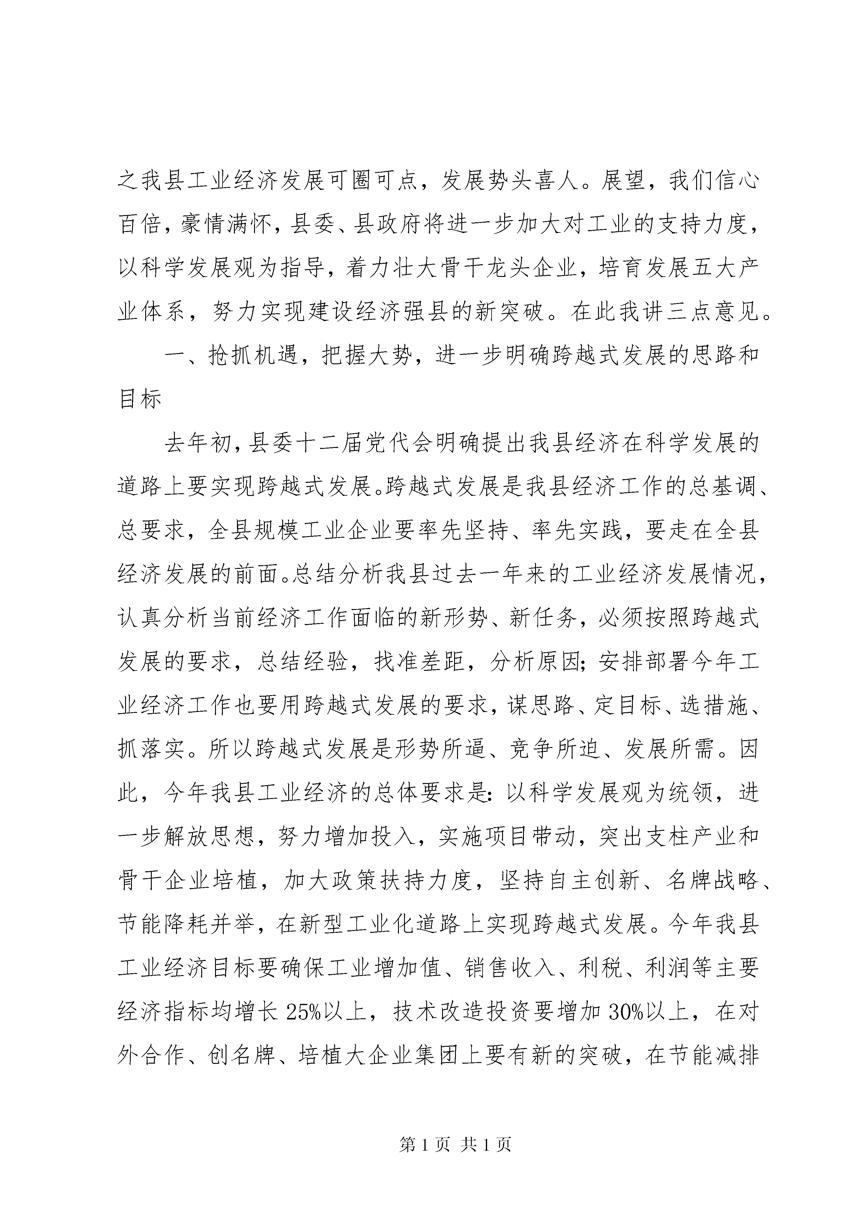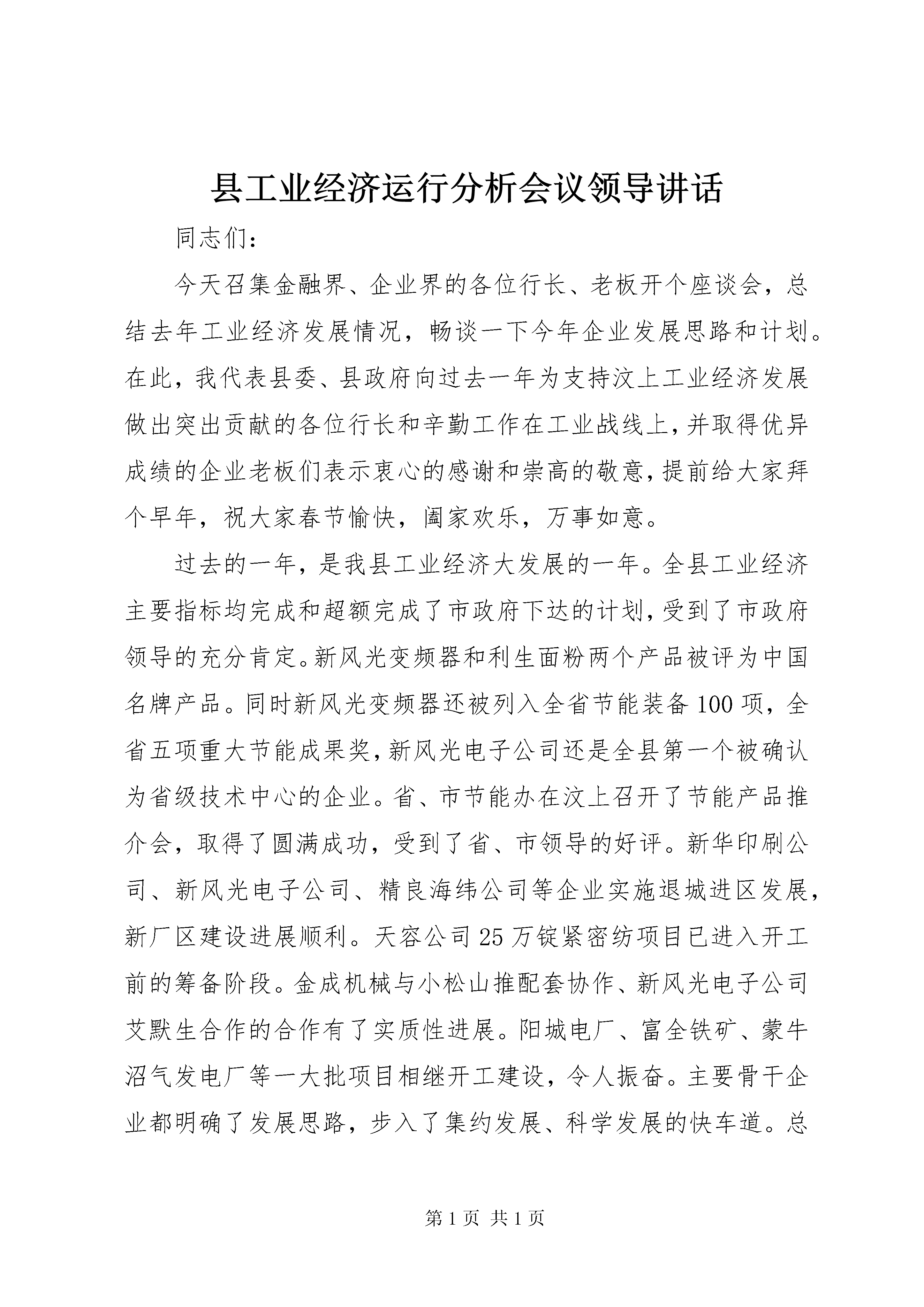 县工业经济运行分析会议领导讲话同志们:今天召集金融界、企业界的各位行长、老板开个座谈会,总结去年工业经济发展情况,畅谈一下今年企业发展思路和计划。在此,我代表县委、县政府向过去一年为支持汶上工业经济发展做出突出贡献的各位行长和辛勤工作在工业战线上,并取得优异成绩的企业老板们表示衷心的感谢和崇高的敬意,提前给大家拜个早年,祝大家春节愉快,阖家欢乐,万事如意。过去的一年,是我县工业经济大发展的一年。全县工业经济主要指标均完成和超额完成了市政府下达的计划,受到了市政府领导的充分肯定。新风光变频器和利生面粉两个产品被评为中国名牌产品。同时新风光变频器还被列入全省节能装备100项,全省五项重大节能成果奖,新风光电子公司还是全县第一个被确认为省级技术中心的企业。省、市节能办在汶上召开了节能产品推介会,取得了圆满成功,受到了省、市领导的好评。新华印刷公司、新风光电子公司、精良海纬公司等企业实施退城进区发展,新厂区建设进展顺利。天容公司25万锭紧密纺项目已进入开工前的筹备阶段。金成机械与小松山推配套协作、新风光电子公司艾默生合作的合作有了实质性进展。阳城电厂、富全铁矿、蒙牛沼气发电厂等一大批项目相继开工建设,令人振奋。主要骨干企业都明确了发展思路,步入了集约发展、科学发展的快车道。总之我县工业经济发展可圈可点,发展势头喜人。展望,我们信心百倍,豪情满怀,县委、县政府将进一步加大对工业的支持力度,以科学发展观为指导,着力壮大骨干龙头企业,培育发展五大产业体系,努力实现建设经济强县的新突破。在此我讲三点意见。一、抢抓机遇,把握大势,进一步明确跨越式发展的思路和目标去年初,县委十二届党代会明确提出我县经济在科学发展的道路上要实现跨越式发展。跨越式发展是我县经济工作的总基调、总要求,全县规模工业企业要率先坚持、率先实践,要走在全县经济发展的前面。总结分析我县过去一年来的工业经济发展情况,认真分析当前经济工作面临的新形势、新任务,必须按照跨越式发展的要求,总结经验,找准差距,分析原因;安排部署今年工业经济工作也要用跨越式发展的要求,谋思路、定目标、选措施、抓落实。所以跨越式发展是形势所逼、竞争所迫、发展所需。因此,今年我县工业经济的总体要求是:以科学发展观为统领,进一步解放思想,努力增加投入,实施项目带动,突出支柱产业和骨干企业培植,加大政策扶持力度,坚持自主创新、名牌战略、节能降耗并举,在新型工业化道路上实现跨越式发展。今年我县工业经济目标要确保工业增加值、销售收入、利税、利润等主要经济指标均增长25%以上,技术改造投资要增加30%以上,在对外合作、创名牌、培植大企业集团上要有新的突破,在节能减排方面要完成市政府下达给我们的任务指标。二、把加大投入作为实现跨越式发展的重要措施一是突出抓好重点项目建设。今年我县投入过10亿元的项目有两个,一个是投资12亿元的天容公司25万锭紧密纺项目;另一个是投资14亿元的阳城资源综合利用电厂项目。在工作推动上,要确保天容公司25万锭紧密纺项目今年3月初开工建设,有关部门要组成强有力的工作班子,帮助企业加快项目建设,倒排工期,落实到人,实行零距离服务,在项目建设中要始终保持服务不降温,关心不松劲,力争底投入试生产。同时要加快阳城电厂建设进度,组成专门协调班子靠上服务,有关部门和乡镇要积极为电厂项目建设尽快解决供水、供电、土地补偿等问题,尽快推动项目全面开工建设。另外,富全铁矿、北汇玻璃二期、蒙牛沼气电厂等项目将陆续投入试生产发挥效益。对这些项目要纳入全县重点经济工作调度范围,加快工程进度,实行包保责任制,确保按时投产发挥效益。要抓好后续大项目洽谈,积极创造条件,力争罗蒙集团转移项目、太阳纸业转移项目、恒立化工煤制氨醇项目能够落地我县投入实施。总之,今后每年确保每年我县工业投入不少于30亿元。
