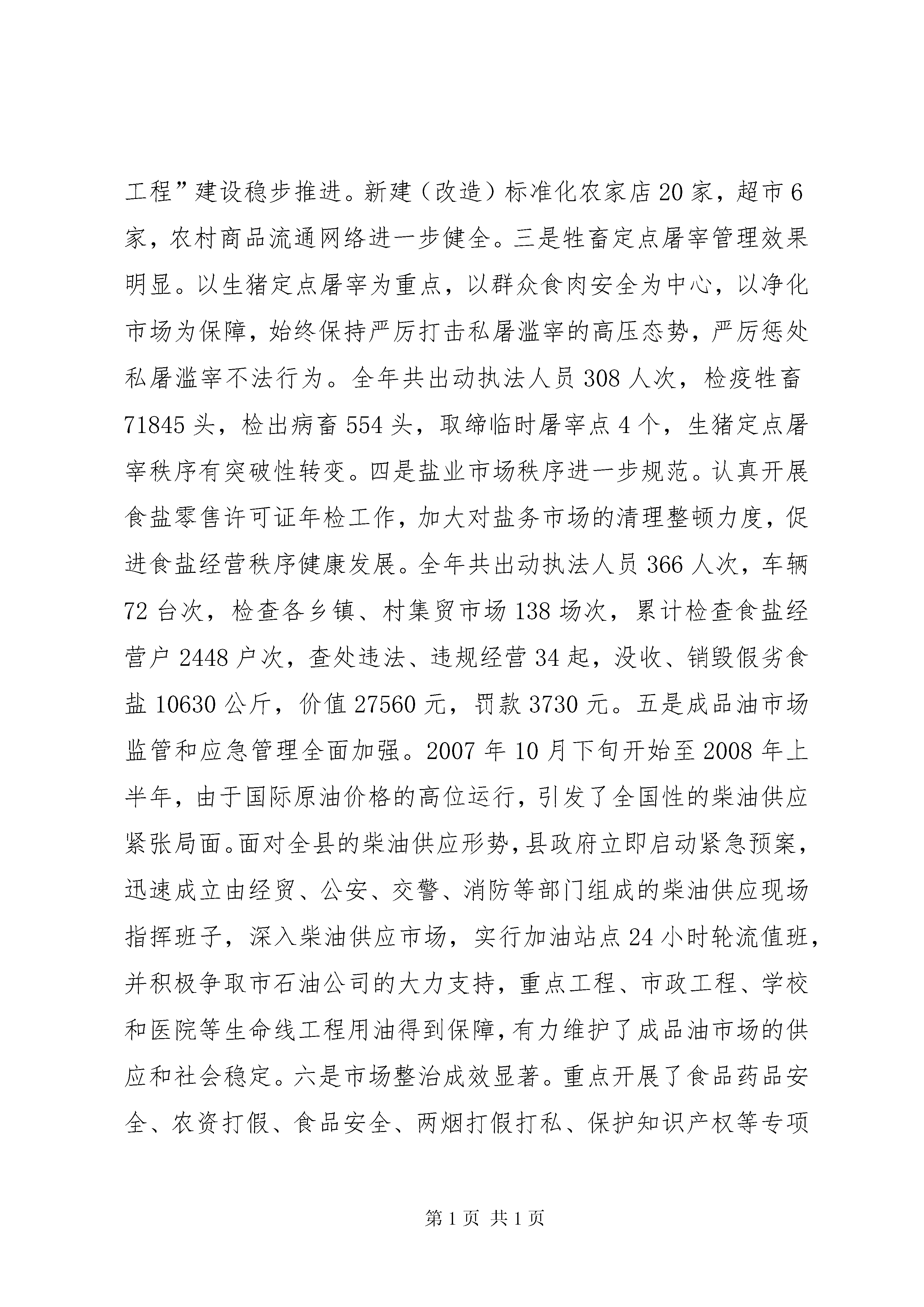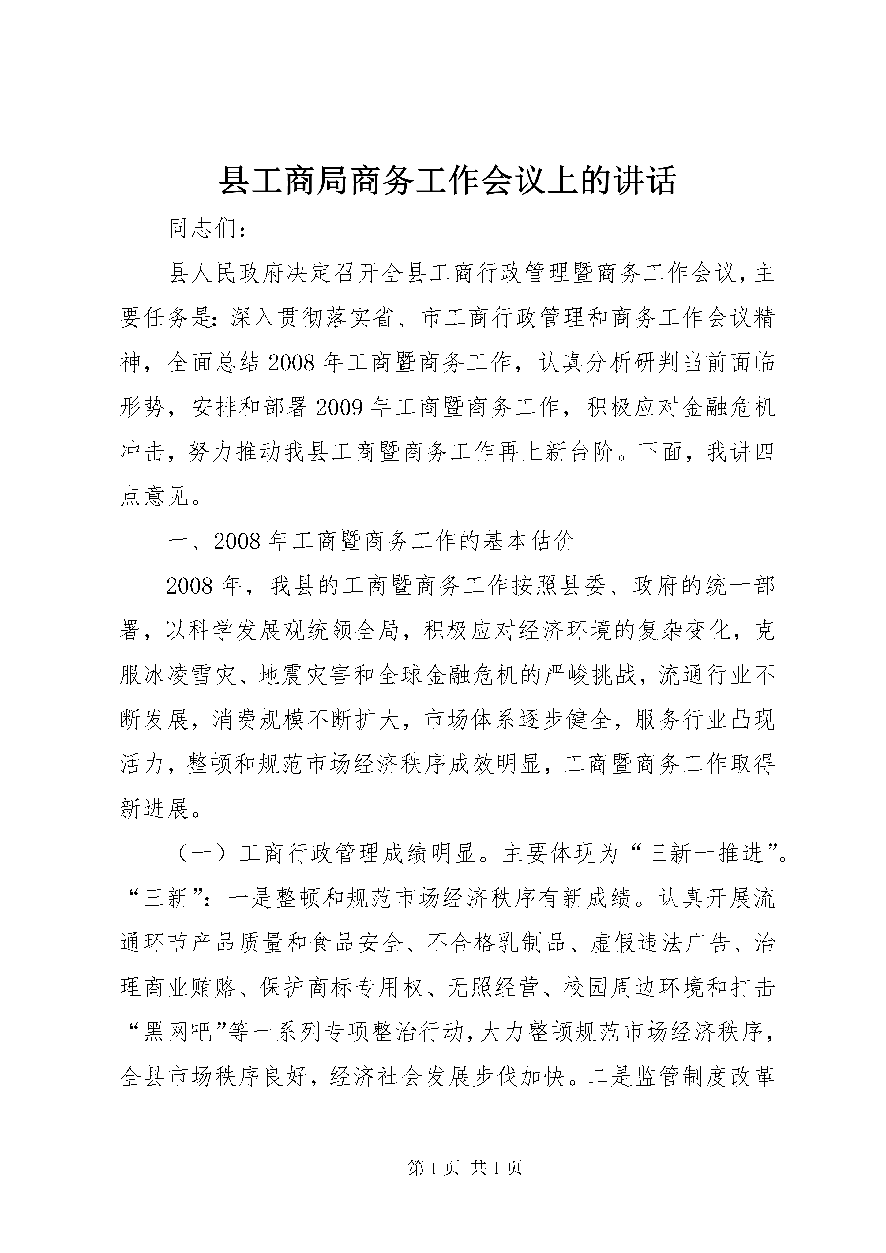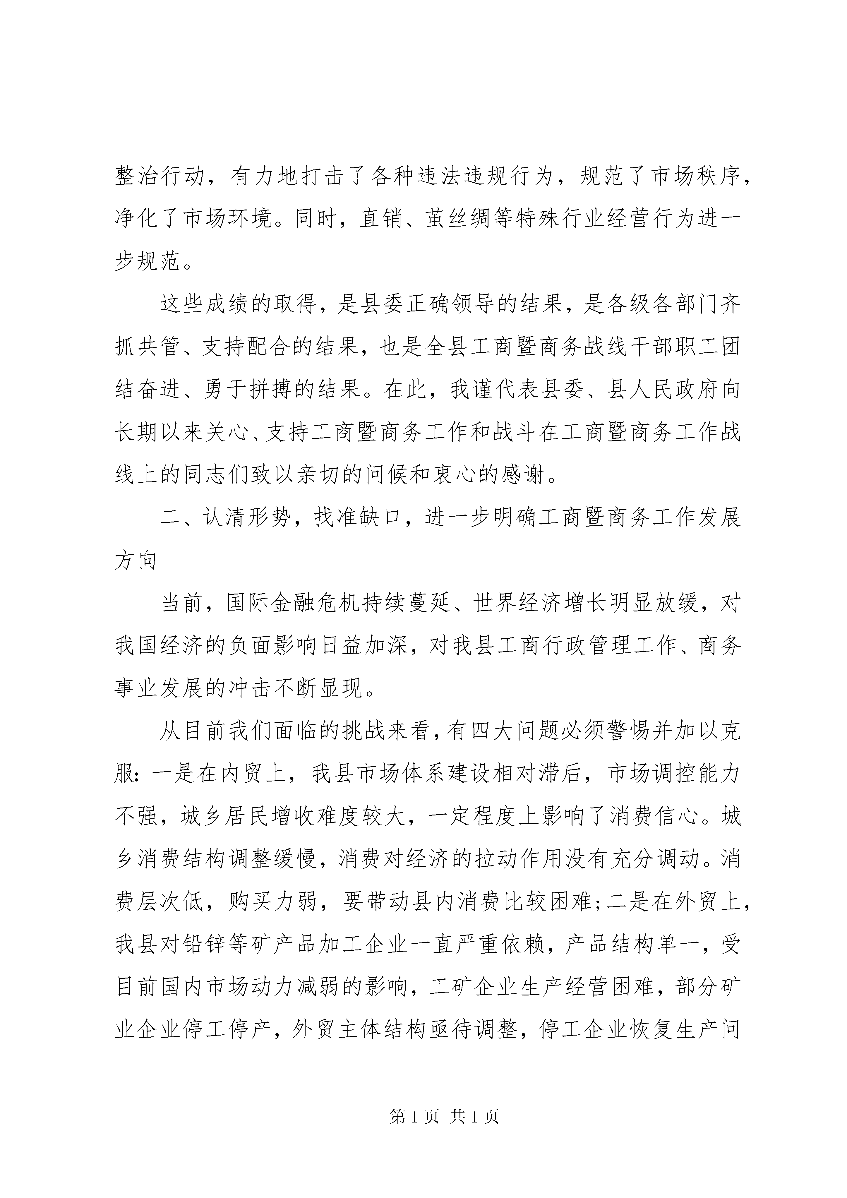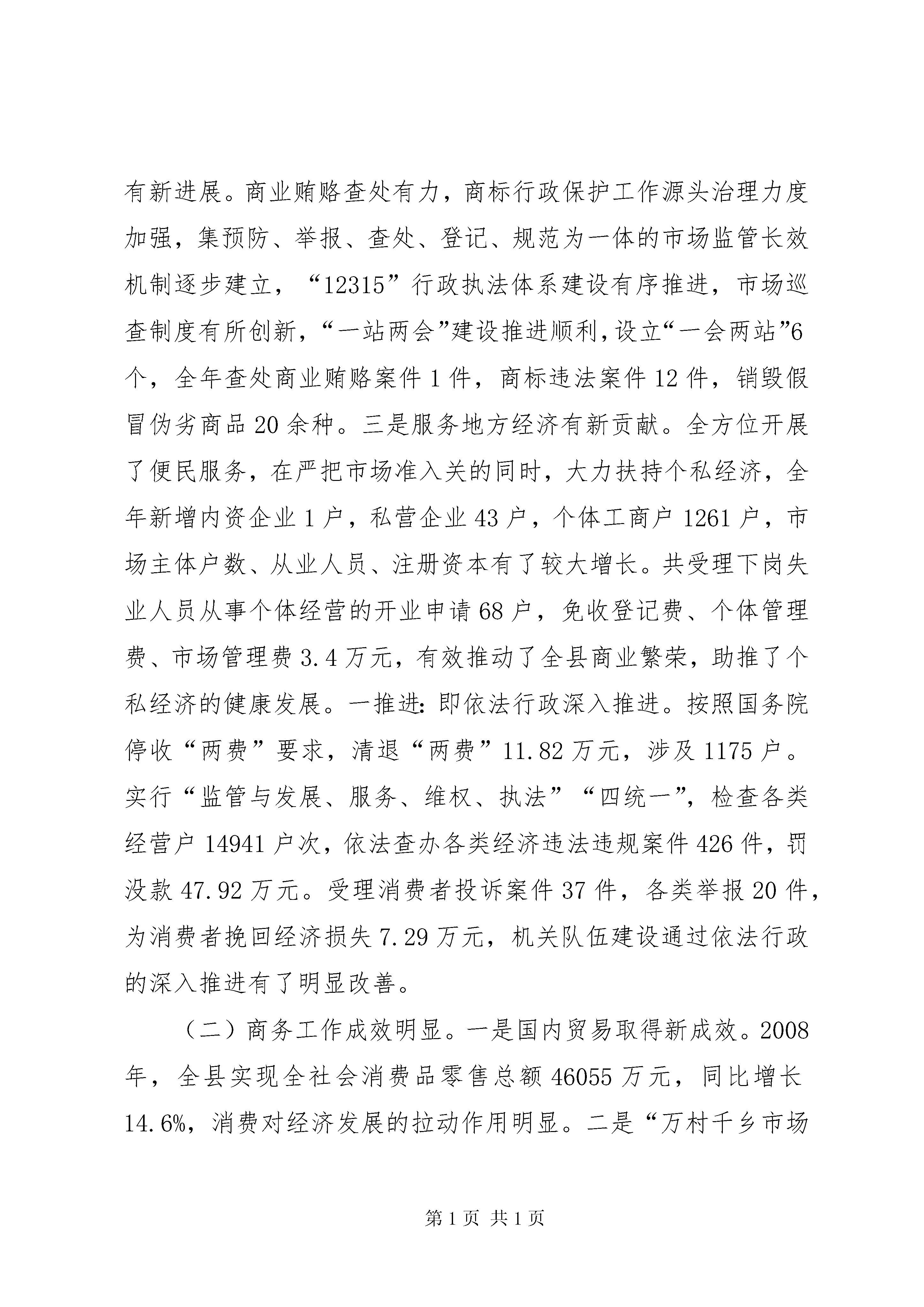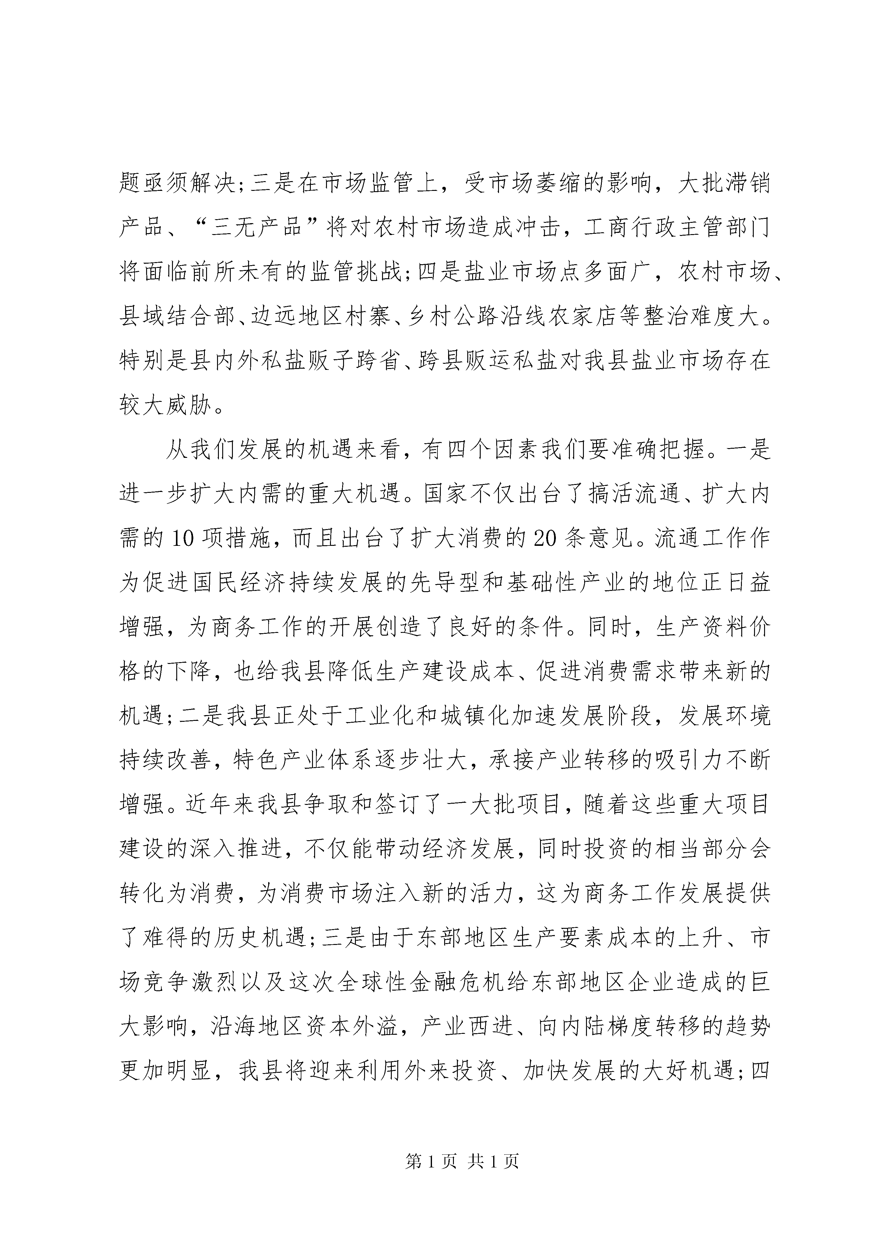 县工商局商务工作会议上的讲话同志们:县人民政府决定召开全县工商行政管理暨商务工作会议,主要任务是:深入贯彻落实省、市工商行政管理和商务工作会议精神,全面总结2008年工商暨商务工作,认真分析研判当前面临形势,安排和部署2009年工商暨商务工作,积极应对金融危机冲击,努力推动我县工商暨商务工作再上新台阶。下面,我讲四点意见。一、2008年工商暨商务工作的基本估价2008年,我县的工商暨商务工作按照县委、政府的统一部署,以科学发展观统领全局,积极应对经济环境的复杂变化,克服冰凌雪灾、地震灾害和全球金融危机的严峻挑战,流通行业不断发展,消费规模不断扩大,市场体系逐步健全,服务行业凸现活力,整顿和规范市场经济秩序成效明显,工商暨商务工作取得新进展。(一)工商行政管理成绩明显。主要体现为“三新一推进”。“三新”:一是整顿和规范市场经济秩序有新成绩。认真开展流通环节产品质量和食品安全、不合格乳制品、虚假违法广告、治理商业贿赂、保护商标专用权、无照经营、校园周边环境和打击“黑网吧”等一系列专项整治行动,大力整顿规范市场经济秩序,全县市场秩序良好,经济社会发展步伐加快。二是监管制度改革有新进展。商业贿赂查处有力,商标行政保护工作源头治理力度加强,集预防、举报、查处、登记、规范为一体的市场监管长效机制逐步建立,“12315”行政执法体系建设有序推进,市场巡查制度有所创新,“一站两会”建设推进顺利,设立“一会两站”6个,全年查处商业贿赂案件1件,商标违法案件12件,销毁假冒伪劣商品20余种。三是服务地方经济有新贡献。全方位开展了便民服务,在严把市场准入关的同时,大力扶持个私经济,全年新增内资企业1户,私营企业43户,个体工商户1261户,市场主体户数、从业人员、注册资本有了较大增长。共受理下岗失业人员从事个体经营的开业申请68户,免收登记费、个体管理费、市场管理费3.4万元,有效推动了全县商业繁荣,助推了个私经济的健康发展。一推进:即依法行政深入推进。按照国务院停收“两费”要求,清退“两费”11.82万元,涉及1175户。实行“监管与发展、服务、维权、执法”“四统一”,检查各类经营户14941户次,依法查办各类经济违法违规案件426件,罚没款47.92万元。受理消费者投诉案件37件,各类举报20件,为消费者挽回经济损失7.29万元,机关队伍建设通过依法行政的深入推进有了明显改善。(二)商务工作成效明显。一是国内贸易取得新成效。2008年,全县实现全社会消费品零售总额46055万元,同比增长14.6%,消费对经济发展的拉动作用明显。二是“万村千乡市场工程”建设稳步推进。新建(改造)标准化农家店20家,超市6家,农村商品流通网络进一步健全。三是牲畜定点屠宰管理效果明显。以生猪定点屠宰为重点,以群众食肉安全为中心,以净化市场为保障,始终保持严厉打击私屠滥宰的高压态势,严厉惩处私屠滥宰不法行为。全年共出动执法人员308人次,检疫牲畜71845头,检出病畜554头,取缔临时屠宰点4个,生猪定点屠宰秩序有突破性转变。四是盐业市场秩序进一步规范。认真开展食盐零售许可证年检工作,加大对盐务市场的清理整顿力度,促进食盐经营秩序健康发展。全年共出动执法人员366人次,车辆72台次,检查各乡镇、村集贸市场138场次,累计检查食盐经营户2448户次,查处违法、违规经营34起,没收、销毁假劣食盐10630公斤,价值27560元,罚款3730元。五是成品油市场监管和应急管理全面加强。2007年10月下旬开始至2008年上半年,由于国际原油价格的高位运行,引发了全国性的柴油供应紧张局面。面对全县的柴油供应形势,县政府立即启动紧急预案,迅速成立由经贸、公安、交警、消防等部门组成的柴油供应现场指挥班子,深入柴油供应市场,实行加油站点24小时轮流值班,并积极争取市石油公司的大力支持,重点工程、市政工程、学校和医院等生命线工程用油得到保障,有力维护了成品油市场的供应和社会稳定。六是市场整治成效显著。重点开展了食品药品安全、农资打假、食品安全、两烟打假打私、保护知识产权等专项整治行动,有力地打击了各种违法违规行为,规范了市场秩序,净化了市场环境。同时,直销、茧丝绸等特殊行业经营行为进一步规范。这些成绩的取得,是县委正确领导的结果,是各级各部门齐抓共管、支持配合的结果,也是全县工商暨商务战线干部职工团结奋进、勇于拼搏的结果。在此,我谨代表县委、县人民政府向长期以来关心、支持工商暨商务工作和战斗在工商暨商务工作战线上的同志们致以亲切的问候和衷心的感谢。二、认清形势,找准缺口,进一步明确工商暨商务工作发展方向当前,国际金融危机持续蔓延、世界经济增长明显放缓,对我国经济的负面影响日益加深,对我县工商行政管理工作、商务事业发展的冲击不断显现。从目前我们面临的挑战来看,有