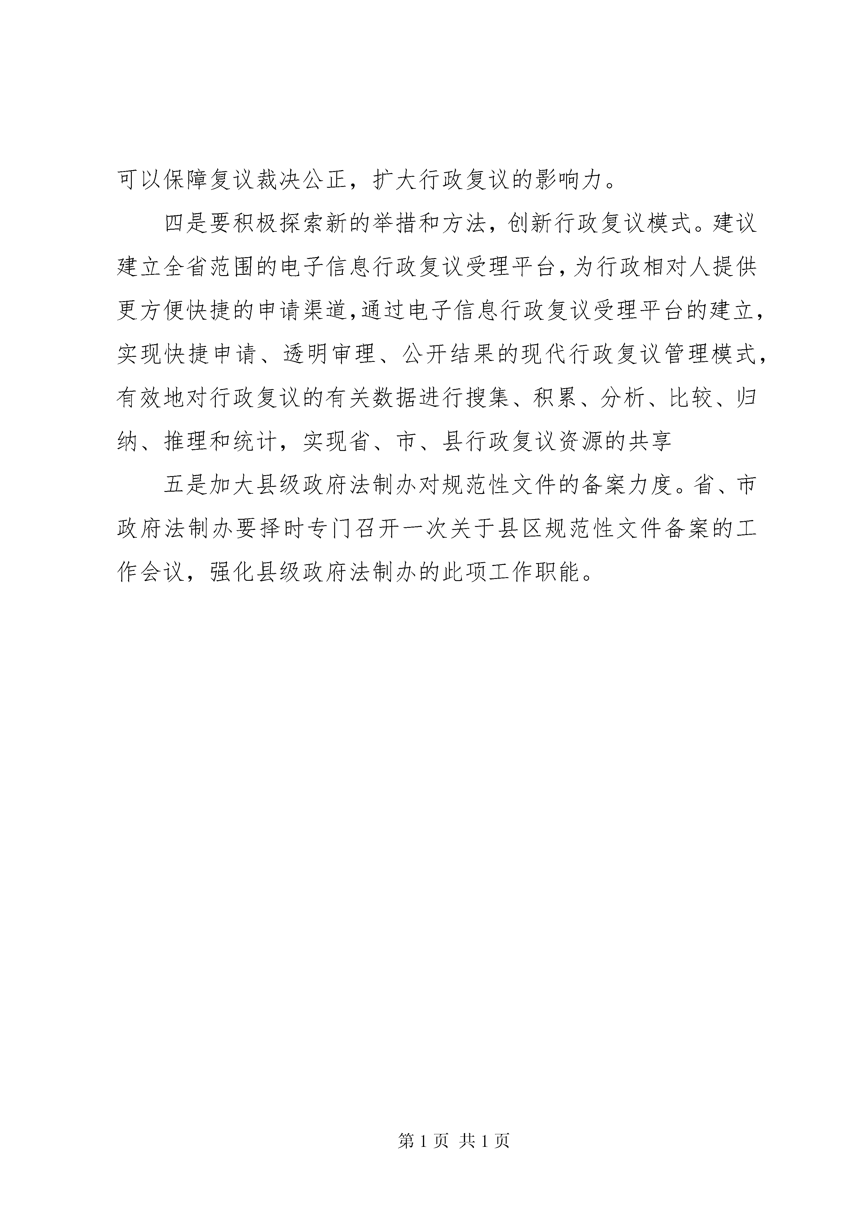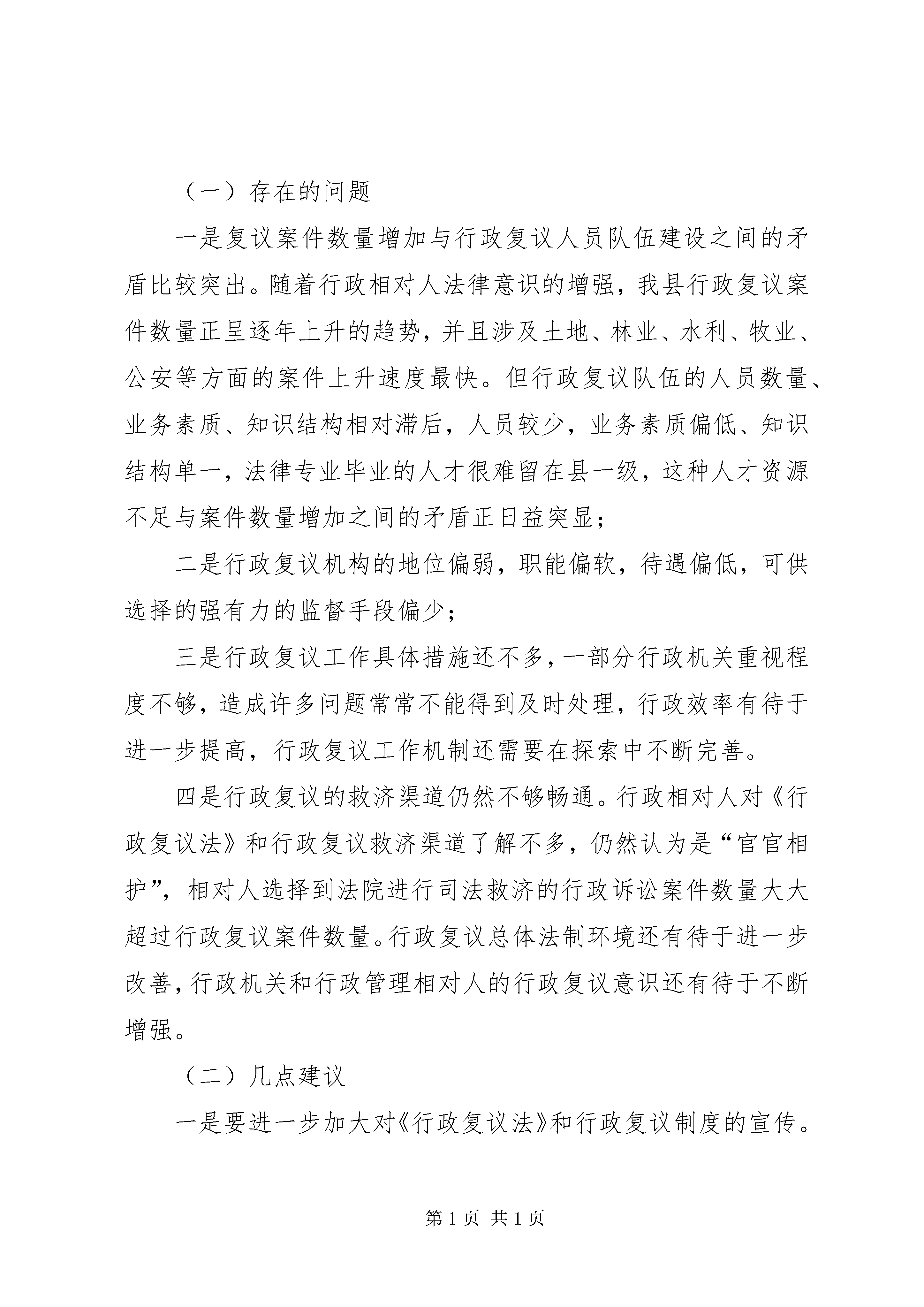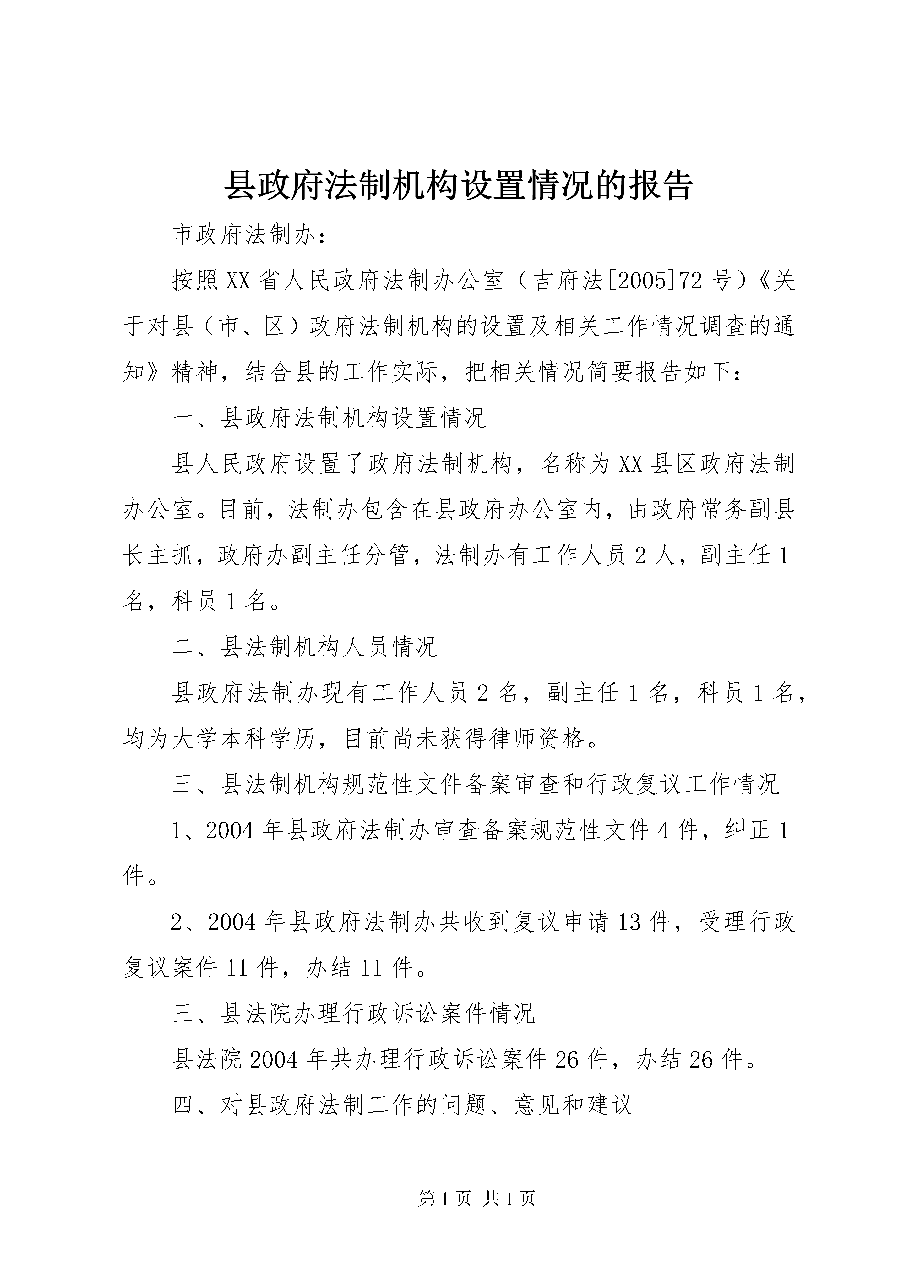 县政府法制机构设置情况的报告市政府法制办:按照XX省人民政府法制办公室(吉府法[2005]72号)《关于对县(市、区)政府法制机构的设置及相关工作情况调查的通知》精神,结合县的工作实际,把相关情况简要报告如下:一、县政府法制机构设置情况县人民政府设置了政府法制机构,名称为XX县区政府法制办公室。目前,法制办包含在县政府办公室内,由政府常务副县长主抓,政府办副主任分管,法制办有工作人员2人,副主任1名,科员1名。二、县法制机构人员情况县政府法制办现有工作人员2名,副主任1名,科员1名,均为大学本科学历,目前尚未获得律师资格。三、县法制机构规范性文件备案审查和行政复议工作情况1、2004年县政府法制办审查备案规范性文件4件,纠正1件。2、2004年县政府法制办共收到复议申请13件,受理行政复议案件11件,办结11件。三、县法院办理行政诉讼案件情况县法院2004年共办理行政诉讼案件26件,办结26件。四、对县政府法制工作的问题、意见和建议(一)存在的问题一是复议案件数量增加与行政复议人员队伍建设之间的矛盾比较突出。随着行政相对人法律意识的增强,我县行政复议案件数量正呈逐年上升的趋势,并且涉及土地、林业、水利、牧业、公安等方面的案件上升速度最快。但行政复议队伍的人员数量、业务素质、知识结构相对滞后,人员较少,业务素质偏低、知识结构单一,法律专业毕业的人才很难留在县一级,这种人才资源不足与案件数量增加之间的矛盾正日益突显;二是行政复议机构的地位偏弱,职能偏软,待遇偏低,可供选择的强有力的监督手段偏少;三是行政复议工作具体措施还不多,一部分行政机关重视程度不够,造成许多问题常常不能得到及时处理,行政效率有待于进一步提高,行政复议工作机制还需要在探索中不断完善。四是行政复议的救济渠道仍然不够畅通。行政相对人对《行政复议法》和行政复议救济渠道了解不多,仍然认为是“官官相护”,相对人选择到法院进行司法救济的行政诉讼案件数量大大超过行政复议案件数量。行政复议总体法制环境还有待于进一步改善,行政机关和行政管理相对人的行政复议意识还有待于不断增强。(二)几点建议一是要进一步加大对《行政复议法》和行政复议制度的宣传。改变以往的宣传重点,建议由对行政机关宣传的多,对群众宣传的少向两者都加强的方向转变;由宣传形式比较传统和单一向宣传形式多元化方向转变;由注重法律宣传向法律与案例宣传相结合的方向转变;由时段性宣传向经常性宣传转变。二是要进一步加强队伍建设,提高复议人员素质。行政复议人员工作人员水平高低,直接影响行政复议工作的开展,也直接影响今后行政复议工作的发展。必须要提高行政复议人员素质,以适应新形势发展的需要。加强对行政复议人员的培训。复议人员要掌握党和国家的路线、方针、政策,又要了解政府各部门的行政管理业务,既要学好实体法,又要掌握程序法;要加强交流,针对不同时期行政复议案件的不同特点,省、市法制办要多举办一些行政复议案件研讨会,进行专项讨论,公布一些典型案件和行政复议决定,使各地各部门复议机构工作办案时有所借鉴;要实行行政复议人员资格认证,对行政复议人员的资格进行统一的认定和管理,把好行政复议人员的资格准入关,并研究解决行政复议人员的岗位津贴问题。三是要改革复议案件审理方式。在审查形式上,建议将书面审查原则改为公开审查原则,逐步推行听证制度,以增加复议案件办理的透明度,促成一些影响大、涉及面宽、群众关注的复议案件得到妥善解决。这样,不仅有利于密切政府与群众关系,树立政府良好形象,维护政府权威,而且案件审查过程的公开,也可以保障复议裁决公正,扩大行政复议的影响力。四是要积极探索新的举措和方法,创新行政复议模式。建议建立全省范围的电子信息行政复议受理平台,为行政相对人提供更方便快捷的申请渠道,通过电子信息行政复议受理平台的建立,实现快捷申请、透明审理、公开结果的现代行政复议管理模式,有效地对行政复议的有关数据进行搜集、积累、分析、比较、归纳、推理和统计,实现省、市、县行政复议资源的共享五是加大县级政府法制办对规范性文件的备案力度。省、市政府法制办要择时专门召开一次关于县区规范性文件备案的工作会议,强化县级政府法制办的此项工作职能。