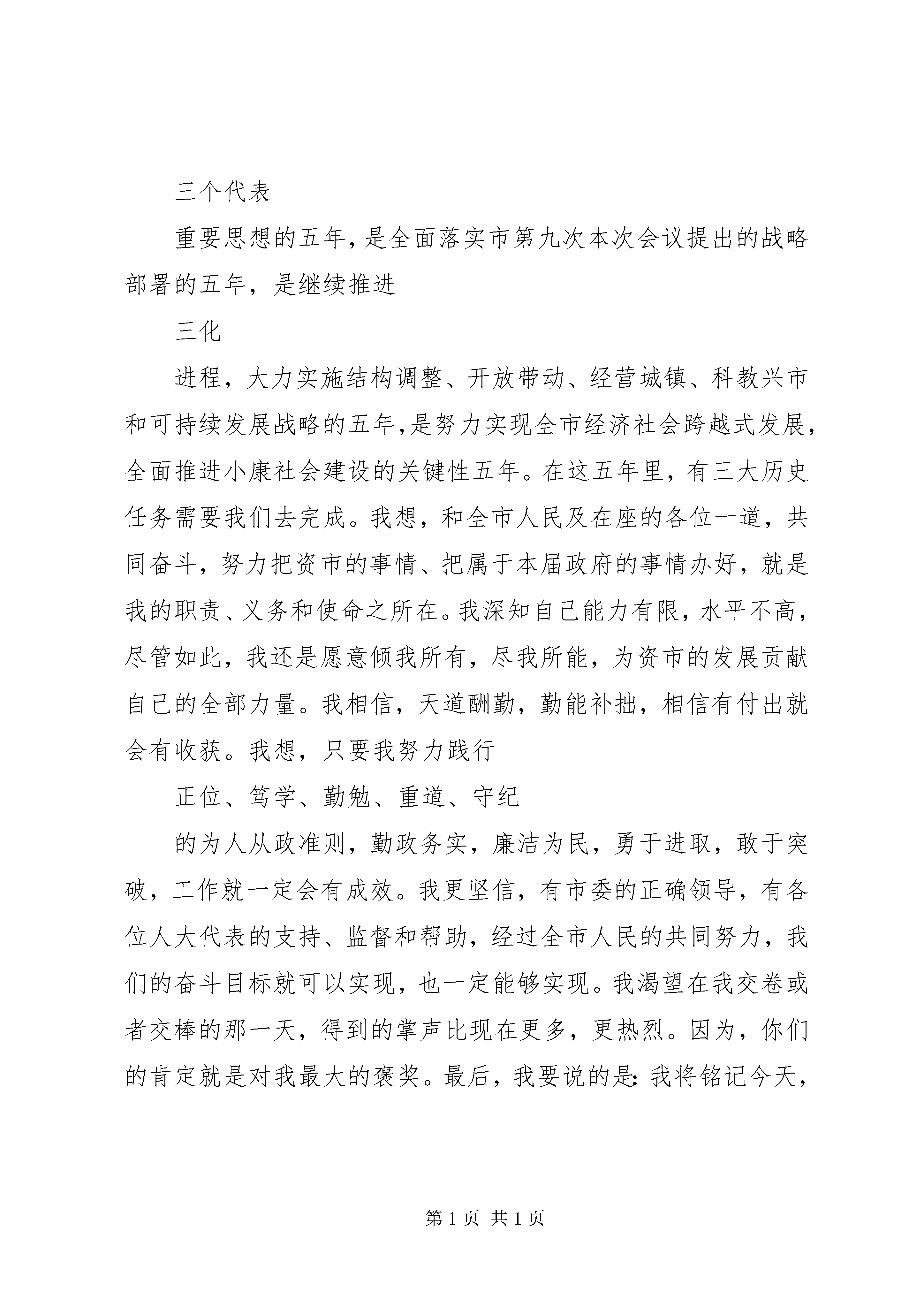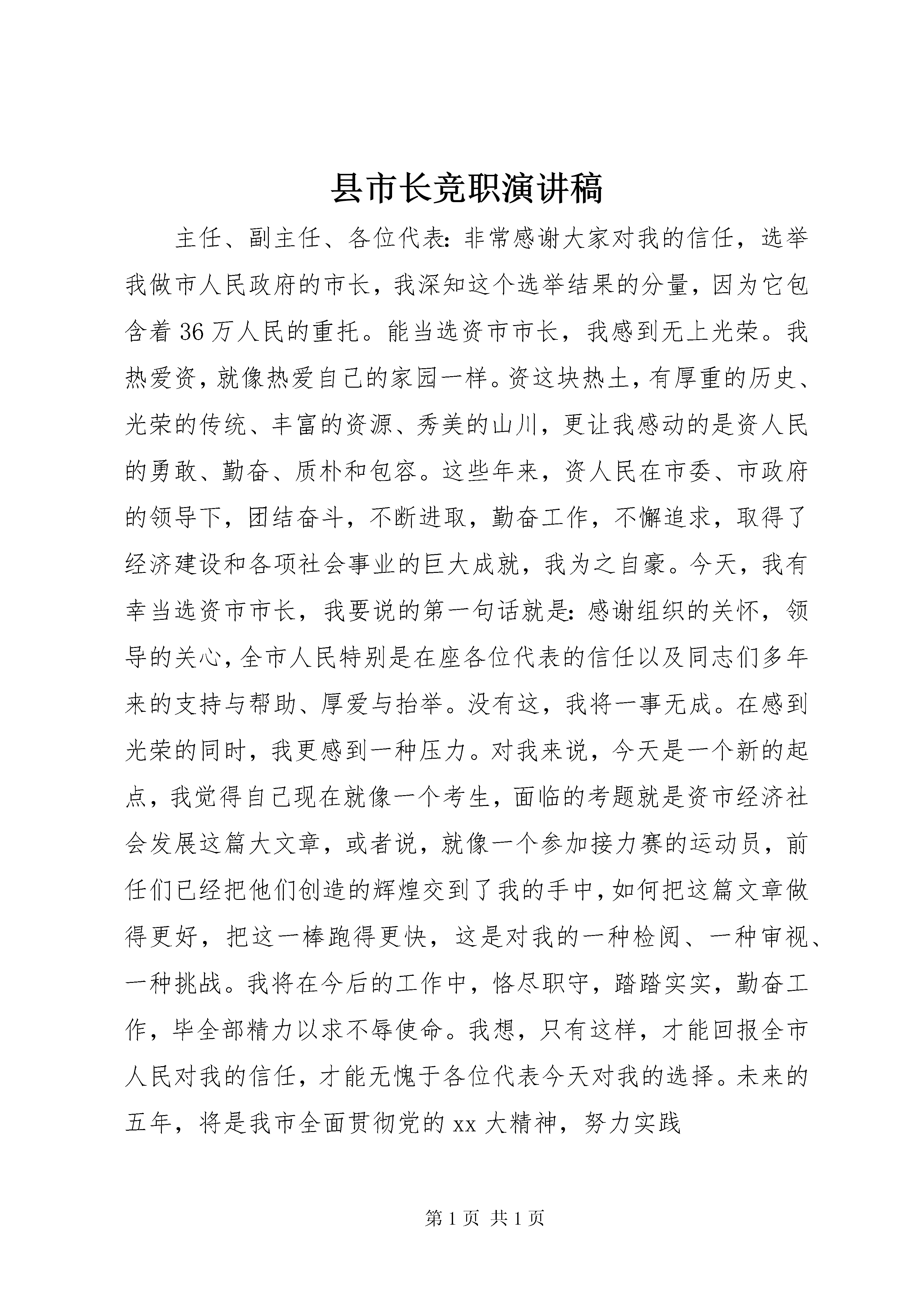 县市长竞职演讲稿主任、副主任、各位代表:非常感谢大家对我的信任,选举我做市人民政府的市长,我深知这个选举结果的分量,因为它包含着36万人民的重托。能当选资市市长,我感到无上光荣。我热爱资,就像热爱自己的家园一样。资这块热土,有厚重的历史、光荣的传统、丰富的资源、秀美的山川,更让我感动的是资人民的勇敢、勤奋、质朴和包容。这些年来,资人民在市委、市政府的领导下,团结奋斗,不断进取,勤奋工作,不懈追求,取得了经济建设和各项社会事业的巨大成就,我为之自豪。今天,我有幸当选资市市长,我要说的第一句话就是:感谢组织的关怀,领导的关心,全市人民特别是在座各位代表的信任以及同志们多年来的支持与帮助、厚爱与抬举。没有这,我将一事无成。在感到光荣的同时,我更感到一种压力。对我来说,今天是一个新的起点,我觉得自己现在就像一个考生,面临的考题就是资市经济社会发展这篇大文章,或者说,就像一个参加接力赛的运动员,前任们已经把他们创造的辉煌交到了我的手中,如何把这篇文章做得更好,把这一棒跑得更快,这是对我的一种检阅、一种审视、一种挑战。我将在今后的工作中,恪尽职守,踏踏实实,勤奋工作,毕全部精力以求不辱使命。我想,只有这样,才能回报全市人民对我的信任,才能无愧于各位代表今天对我的选择。未来的五年,将是我市全面贯彻党的xx大精神,努力实践三个代表重要思想的五年,是全面落实市第九次本次会议提出的战略部署的五年,是继续推进三化进程,大力实施结构调整、开放带动、经营城镇、科教兴市和可持续发展战略的五年,是努力实现全市经济社会跨越式发展,全面推进小康社会建设的关键性五年。在这五年里,有三大历史任务需要我们去完成。我想,和全市人民及在座的各位一道,共同奋斗,努力把资市的事情、把属于本届政府的事情办好,就是我的职责、义务和使命之所在。我深知自己能力有限,水平不高,尽管如此,我还是愿意倾我所有,尽我所能,为资市的发展贡献自己的全部力量。我相信,天道酬勤,勤能补拙,相信有付出就会有收获。我想,只要我努力践行正位、笃学、勤勉、重道、守纪的为人从政准则,勤政务实,廉洁为民,勇于进取,敢于突破,工作就一定会有成效。我更坚信,有市委的正确领导,有各位人大代表的支持、监督和帮助,经过全市人民的共同努力,我们的奋斗目标就可以实现,也一定能够实现。我渴望在我交卷或者交棒的那一天,得到的掌声比现在更多,更热烈。因为,你们的肯定就是对我最大的褒奖。最后,我要说的是:我将铭记今天,我将忠实履行诺言。谢谢大家。