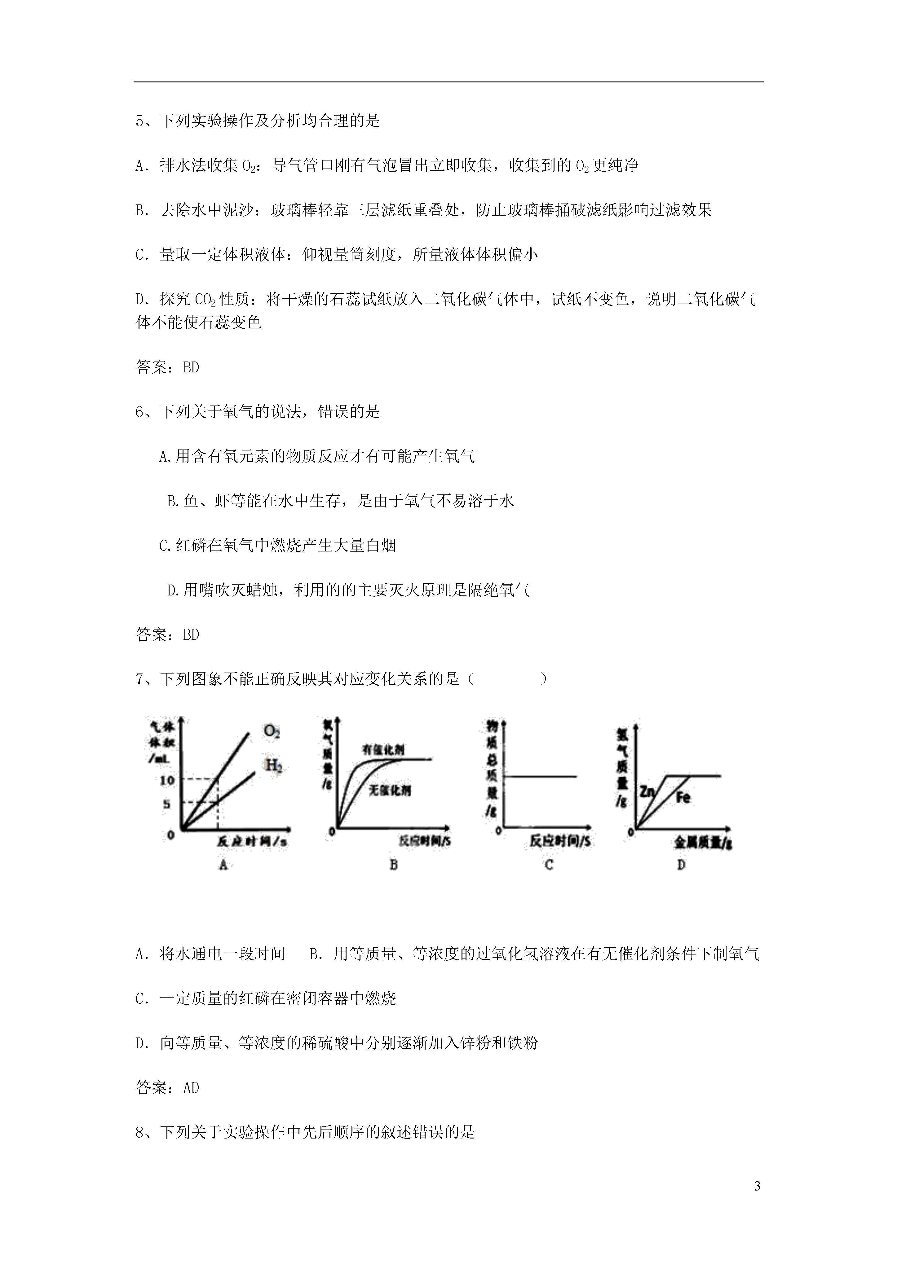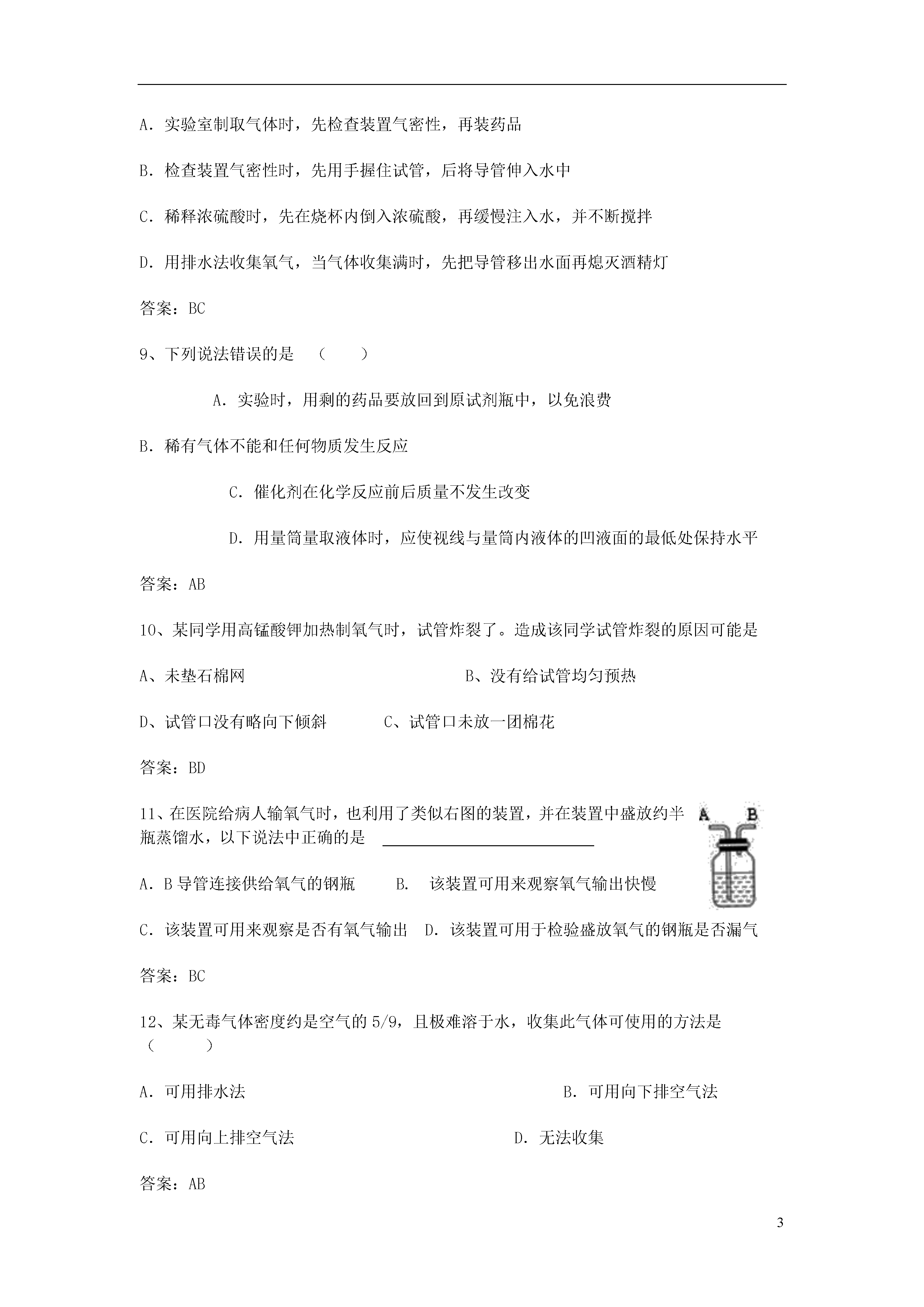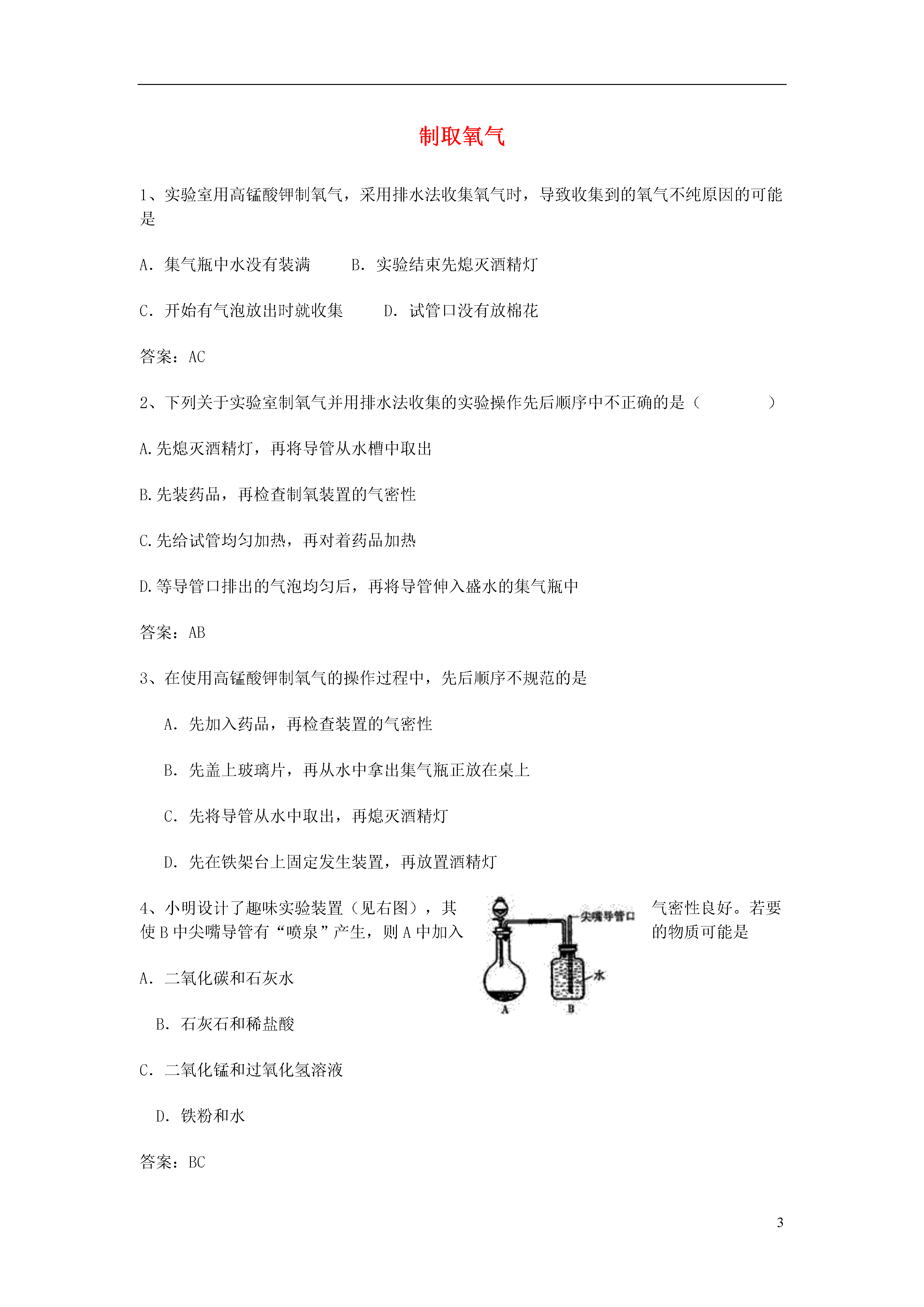 3制取氧气1、实验室用高锰酸钾制氧气,采用排水法收集氧气时,导致收集到的氧气不纯原因的可能是A.集气瓶中水没有装满B.实验结束先熄灭酒精灯C.开始有气泡放出时就收集D.试管口没有放棉花答案:AC2、下列关于实验室制氧气并用排水法收集的实验操作先后顺序中不正确的是()A.先熄灭酒精灯,再将导管从水槽中取出B.先装药品,再检查制氧装置的气密性C.先给试管均匀加热,再对着药品加热D.等导管口排出的气泡均匀后,再将导管伸入盛水的集气瓶中答案:AB3、在使用高锰酸钾制氧气的操作过程中,先后顺序不规范的是A.先加入药品,再检查装置的气密性B.先盖上玻璃片,再从水中拿出集气瓶正放在桌上C.先将导管从水中取出,再熄灭酒精灯D.先在铁架台上固定发生装置,再放置酒精灯4、小明设计了趣味实验装置(见右图),其气密性良好。若要使B中尖嘴导管有“喷泉”产生,则A中加入的物质可能是A.二氧化碳和石灰水B.石灰石和稀盐酸C.二氧化锰和过氧化氢溶液D.铁粉和水答案:BC5、下列实验操作及分析均合理的是A.排水法收集O2:导气管口刚有气泡冒出立即收集,收集到的O2更纯净B.去除水中泥沙:玻璃棒轻靠三层滤纸重叠处,防止玻璃棒捅破滤纸影响过滤效果C.量取一定体积液体:仰视量筒刻度,所量液体体积偏小D.探究CO2性质:将干燥的石蕊试纸放入二氧化碳气体中,试纸不变色,说明二氧化碳气体不能使石蕊变色答案:BD6、下列关于氧气的说法,错误的是A.用含有氧元素的物质反应才有可能产生氧气B.鱼、虾等能在水中生存,是由于氧气不易溶于水C.红磷在氧气中燃烧产生大量白烟D.用嘴吹灭蜡烛,利用的的主要灭火原理是隔绝氧气答案:BD7、下列图象不能正确反映其对应变化关系的是()A.将水通电一段时间B.用等质量、等浓度的过氧化氢溶液在有无催化剂条件下制氧气C.一定质量的红磷在密闭容器中燃烧D.向等质量、等浓度的稀硫酸中分别逐渐加入锌粉和铁粉答案:AD8、下列关于实验操作中先后顺序的叙述错误的是A.实验室制取气体时,先检查装置气密性,再装药品B.检查装置气密性时,先用手握住试管,后将导管伸入水中C.稀释浓硫酸时,先在烧杯内倒入浓硫酸,再缓慢注入水,并不断搅拌D.用排水法收集氧气,当气体收集满时,先把导管移出水面再熄灭酒精灯答案:BC9、下列说法错误的是()A.实验时,用剩的药品要放回到原试剂瓶中,以免浪费B.稀有气体不能和任何物质发生反应C.催化剂在化学反应前后质量不发生改变D.用量筒量取液体时,应使视线与量筒内液体的凹液面的最低处保持水平答案:AB10、某同学用高锰酸钾加热制氧气时,试管炸裂了。造成该同学试管炸裂的原因可能是A、未垫石棉网B、没有给试管均匀预热D、试管口没有略向下倾斜C、试管口未放一团棉花答案:BD11、在医院给病人输氧气时,也利用了类似右图的装置,并在装置中盛放约半瓶蒸馏水,以下说法中正确的是A.B导管连接供给氧气的钢瓶B.该装置可用来观察氧气输出快慢C.该装置可用来观察是否有氧气输出D.该装置可用于检验盛放氧气的钢瓶是否漏气答案:BC12、某无毒气体密度约是空气的5/9,且极难溶于水,收集此气体可使用的方法是()A.可用排水法B.可用向下排空气法C.可用向上排空气法D.无法收集答案:AB