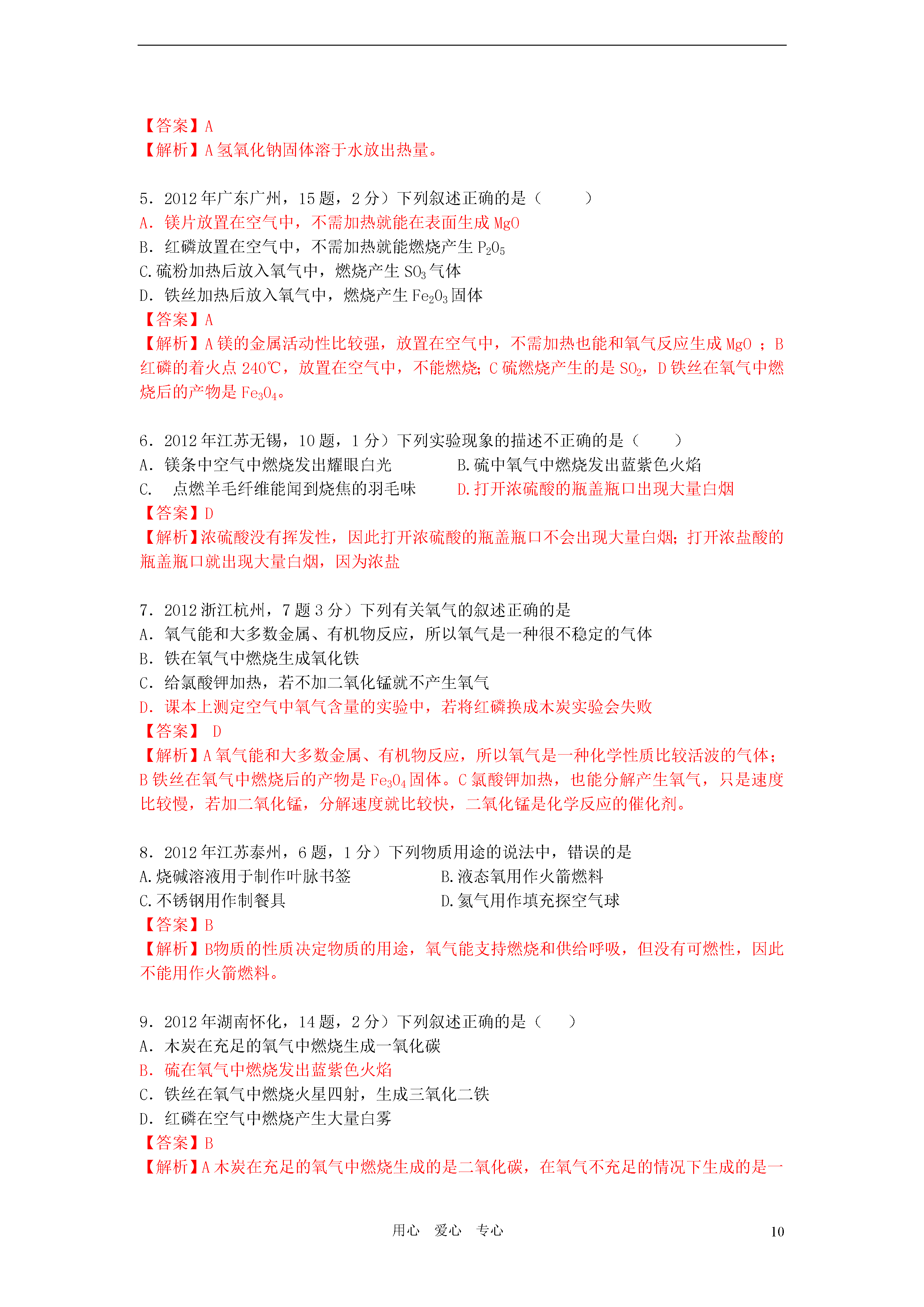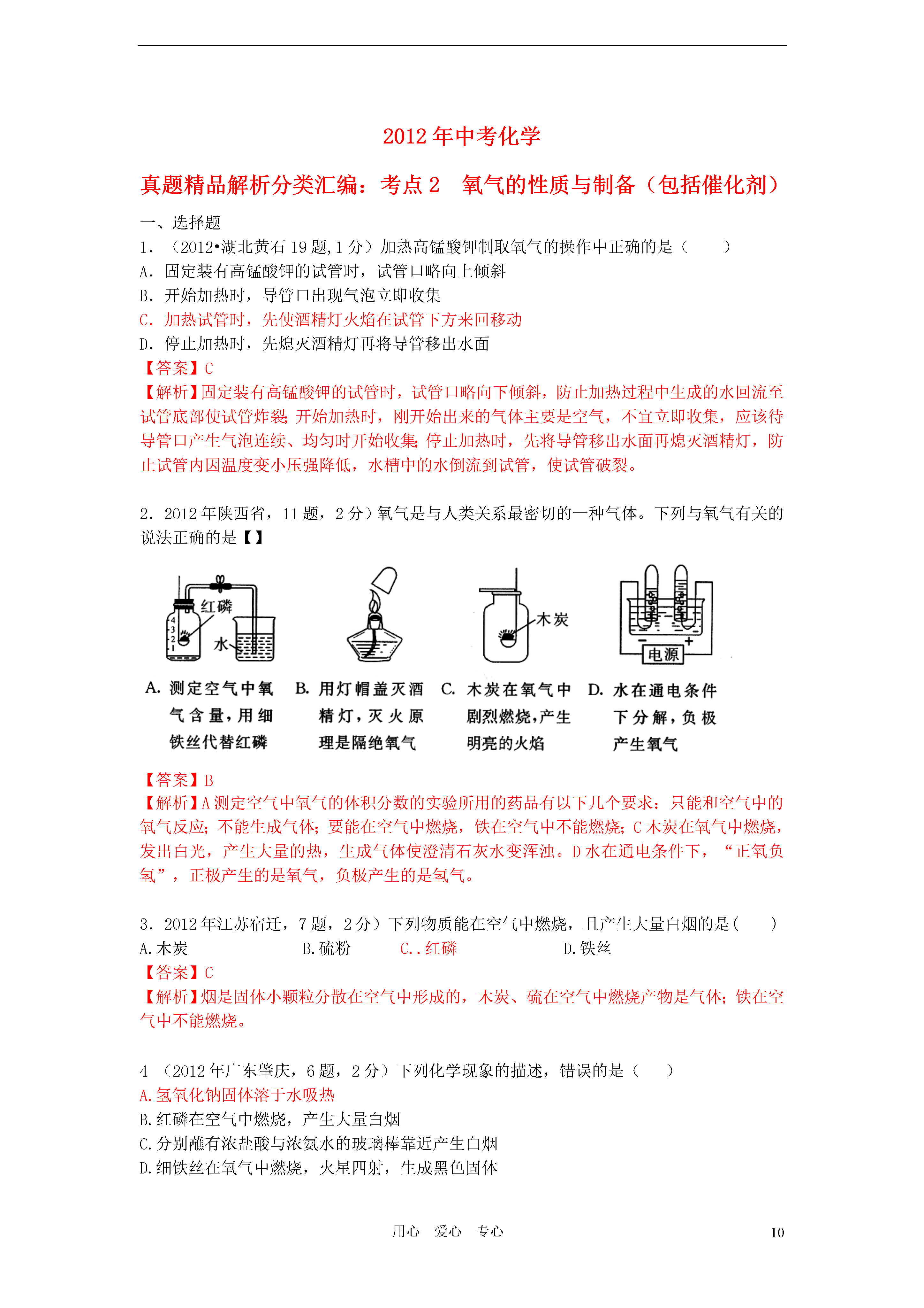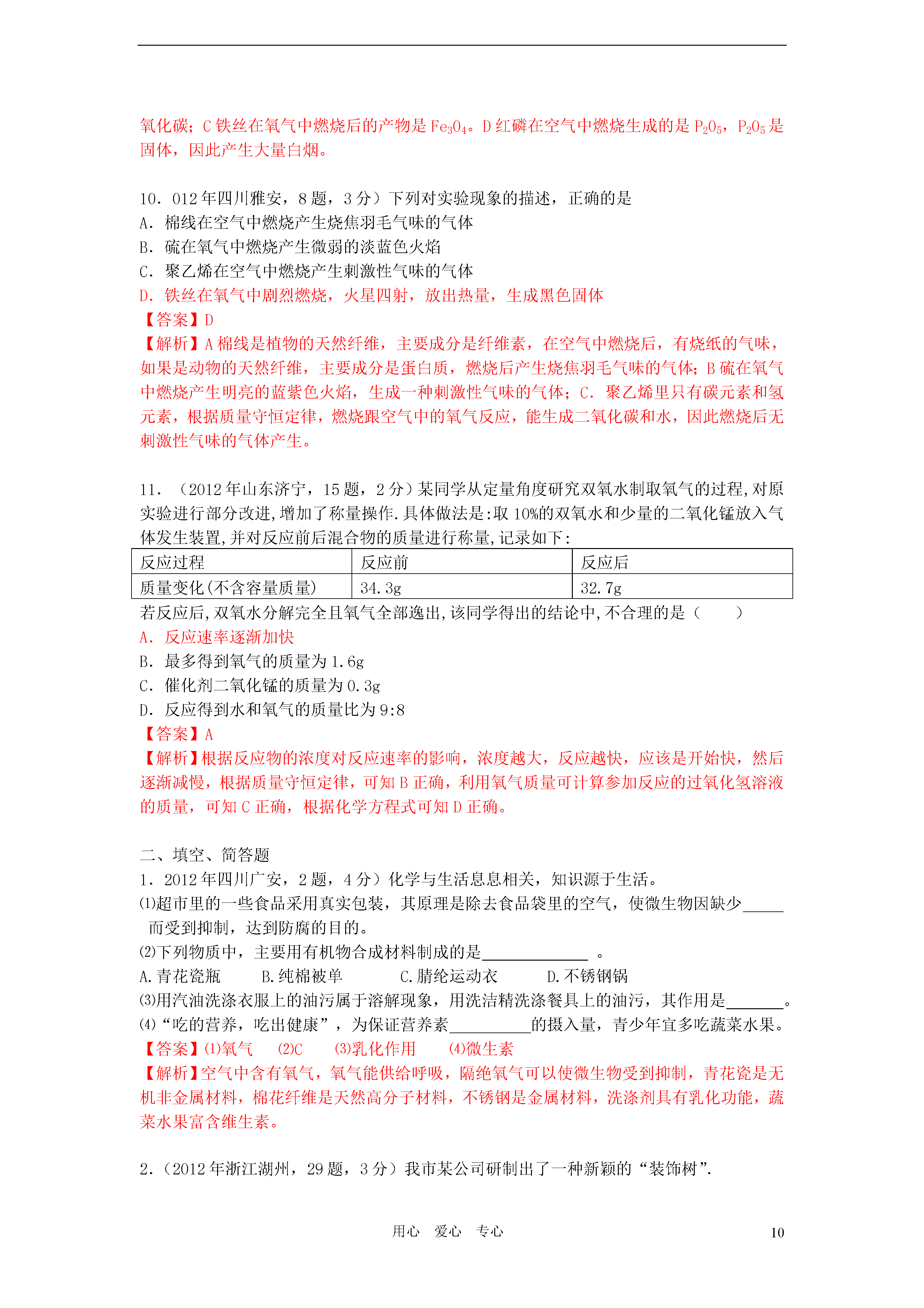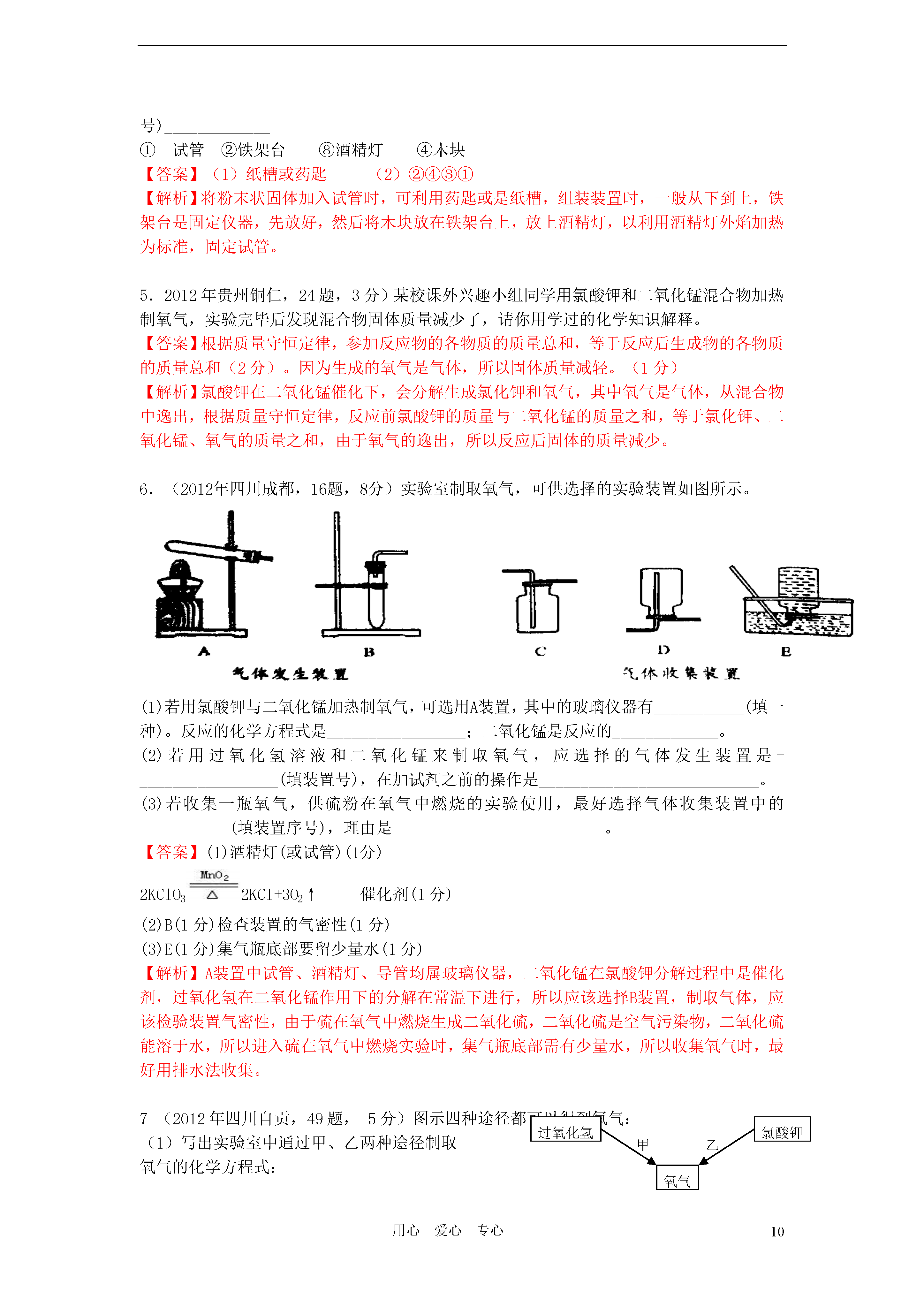 10用心爱心专心2012年中考化学真题精品解析分类汇编:考点2氧气的性质与制备(包括催化剂)一、选择题1.(2012•湖北黄石19题,1分)加热高锰酸钾制取氧气的操作中正确的是()A.固定装有高锰酸钾的试管时,试管口略向上倾斜B.开始加热时,导管口出现气泡立即收集C.加热试管时,先使酒精灯火焰在试管下方来回移动D.停止加热时,先熄灭酒精灯再将导管移出水面【答案】C【解析】固定装有高锰酸钾的试管时,试管口略向下倾斜,防止加热过程中生成的水回流至试管底部使试管炸裂;开始加热时,刚开始出来的气体主要是空气,不宜立即收集,应该待导管口产生气泡连续、均匀时开始收集;停止加热时,先将导管移出水面再熄灭酒精灯,防止试管内因温度变小压强降低,水槽中的水倒流到试管,使试管破裂。2.2012年陕西省,11题,2分)氧气是与人类关系最密切的一种气体。下列与氧气有关的说法正确的是【】【答案】B【解析】A测定空气中氧气的体积分数的实验所用的药品有以下几个要求:只能和空气中的氧气反应;不能生成气体;要能在空气中燃烧,铁在空气中不能燃烧;C木炭在氧气中燃烧,发出白光,产生大量的热,生成气体使澄清石灰水变浑浊。D水在通电条件下,“正氧负氢”,正极产生的是氧气,负极产生的是氢气。3.2012年江苏宿迁,7题,2分)下列物质能在空气中燃烧,且产生大量白烟的是()A.木炭B.硫粉C..红磷D.铁丝【答案】C【解析】烟是固体小颗粒分散在空气中形成的,木炭、硫在空气中燃烧产物是气体;铁在空气中不能燃烧。4(2012年广东肇庆,6题,2分)下列化学现象的描述,错误的是()A.氢氧化钠固体溶于水吸热B.红磷在空气中燃烧,产生大量白烟C.分别蘸有浓盐酸与浓氨水的玻璃棒靠近产生白烟D.细铁丝在氧气中燃烧,火星四射,生成黑色固体【答案】A【解析】A氢氧化钠固体溶于水放出热量。5.2012年广东广州,15题,2分)下列叙述正确的是()A.镁片放置在空气中,不需加热就能在表面生成MgOB.红磷放置在空气中,不需加热就能燃烧产生P205C.硫粉加热后放入氧气中,燃烧产生SO3气体D.铁丝加热后放入氧气中,燃烧产生Fe203固体【答案】A【解析】A镁的金属活动性比较强,放置在空气中,不需加热也能和氧气反应生成MgO;B红磷的着火点240℃,放置在空气中,不能燃烧;C硫燃烧产生的是SO2,D铁丝在氧气中燃烧后的产物是Fe304。6.2012年江苏无锡,10题,1分)下列实验现象的描述不正确的是()A.镁条中空气中燃烧发出耀眼白光B.硫中氧气中燃烧发出蓝紫色火焰C.点燃羊毛纤维能闻到烧焦的羽毛味D.打开浓硫酸的瓶盖瓶口出现大量白烟【答案】D【解析】浓硫酸没有挥发性,因此打开浓硫酸的瓶盖瓶口不会出现大量白烟;打开浓盐酸的瓶盖瓶口就出现大量白烟,因为浓盐7.2012浙江杭州,7题3分)下列有关氧气的叙述正确的是A.氧气能和大多数金属、有机物反应,所以氧气是一种很不稳定的气体B.铁在氧气中燃烧生成氧化铁C.给氯酸钾加热,若不加二氧化锰就不产生氧气D.课本上测定空气中氧气含量的实验中,若将红磷换成木炭实验会失败【答案】D【解析】A氧气能和大多数金属、有机物反应,所以氧气是一种化学性质比较活波的气体;B铁丝在氧气中燃烧后的产物是Fe304固体。C氯酸钾加热,也能分解产生氧气,只是速度比较慢,若加二氧化锰,分解速度就比较快,二氧化锰是化学反应的催化剂。8.2012年江苏泰州,6题,1分)下列物质用途的说法中,错误的是A.烧碱溶液用于制作叶脉书签B.液态氧用作火箭燃料C.不锈钢用作制餐具D.氦气用作填充探空气球【答案】B【解析】B物质的性质决定物质的用途,氧气能支持燃烧和供给呼吸,但没有可燃性,因此不能用作火箭燃料。9.2012年湖南怀化,14题,2分)下列叙述正确的是()A.木炭在充足的氧气中燃烧生成一氧化碳B.硫在氧气中燃烧发出蓝紫色火焰C.铁丝在氧气中燃烧火星四射,生成三氧化二铁D.红磷在空气中燃烧产生大量白雾【答案】B【解析】A木炭在充足的氧气中燃烧生成的是二氧化碳,在氧气不充足的情况下生成的是一氧化碳;C铁丝在氧气中燃烧后的产物是Fe304。D红磷在空气中燃烧生成的是P205,P205是固体,因此产生大量白烟。10.012年四川雅安,8题,3分)下列对实验现象的描述,正确的是A.棉线在空气中燃烧产生烧焦羽毛气味的气体B.硫在氧气中燃烧产生微弱的淡蓝色火焰C.聚乙烯在空气中燃烧产生刺激性气味的气体D.铁丝在氧气中剧烈燃烧,火星四射,放出热量,生成黑色固体【答案】D【解析】A棉线是植物的天然纤维,主要成分是纤维素,在空气中燃烧后,有烧纸的气味