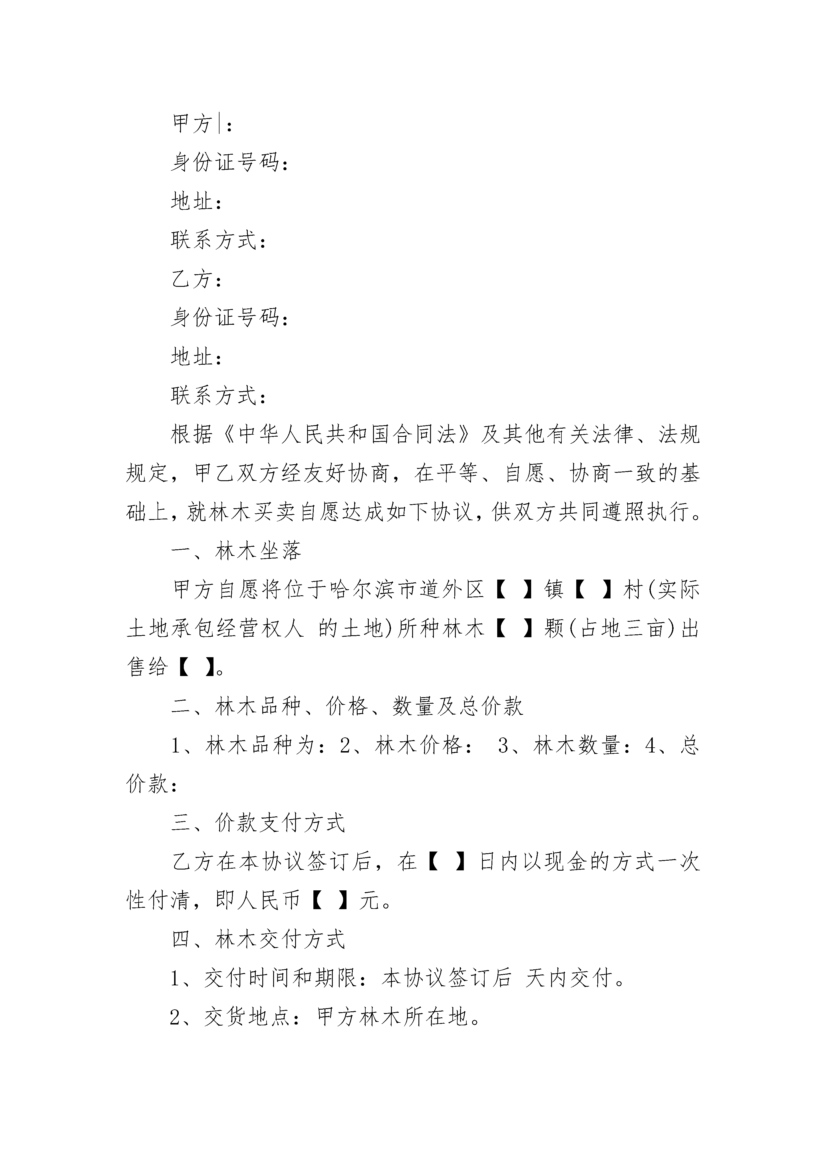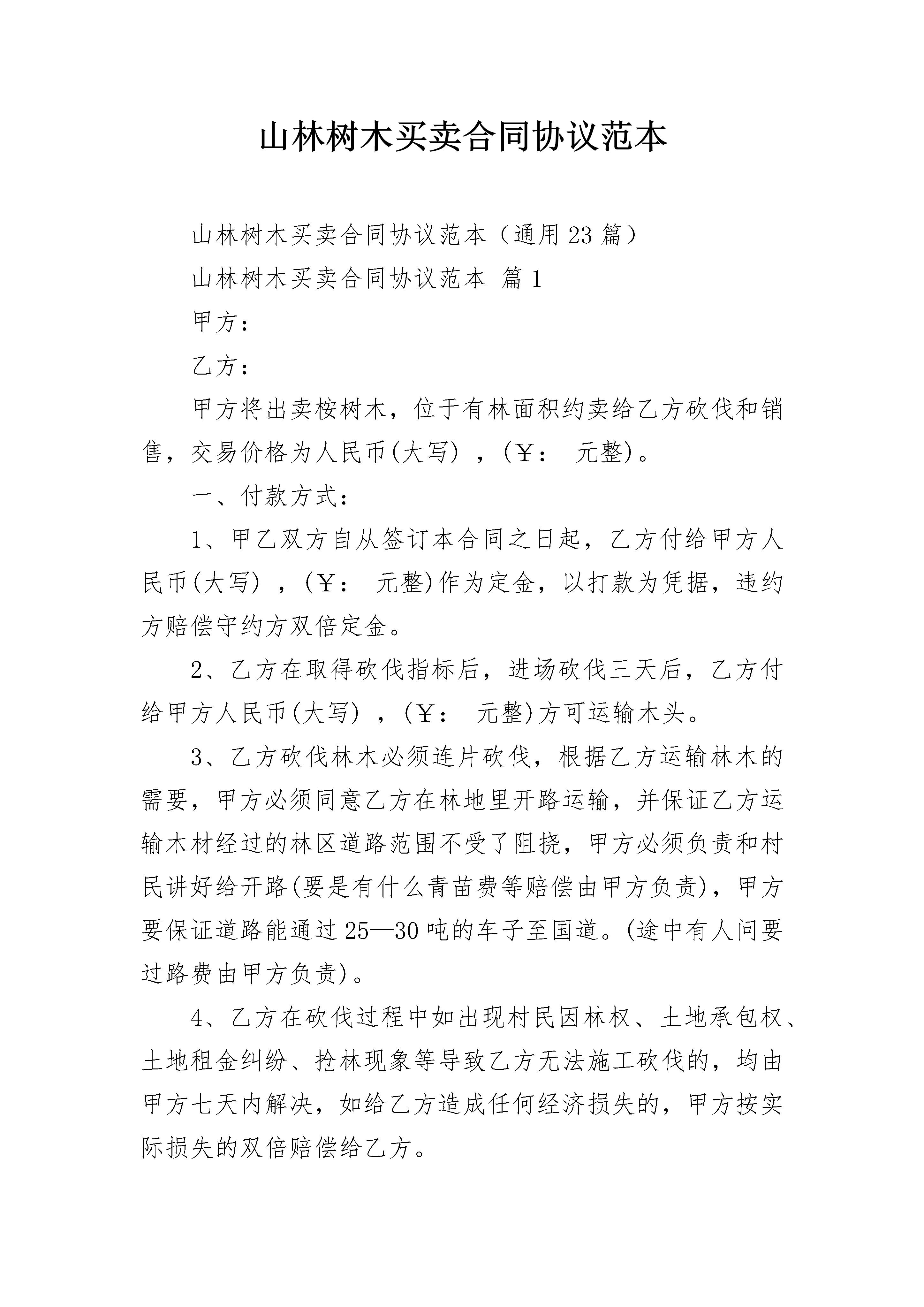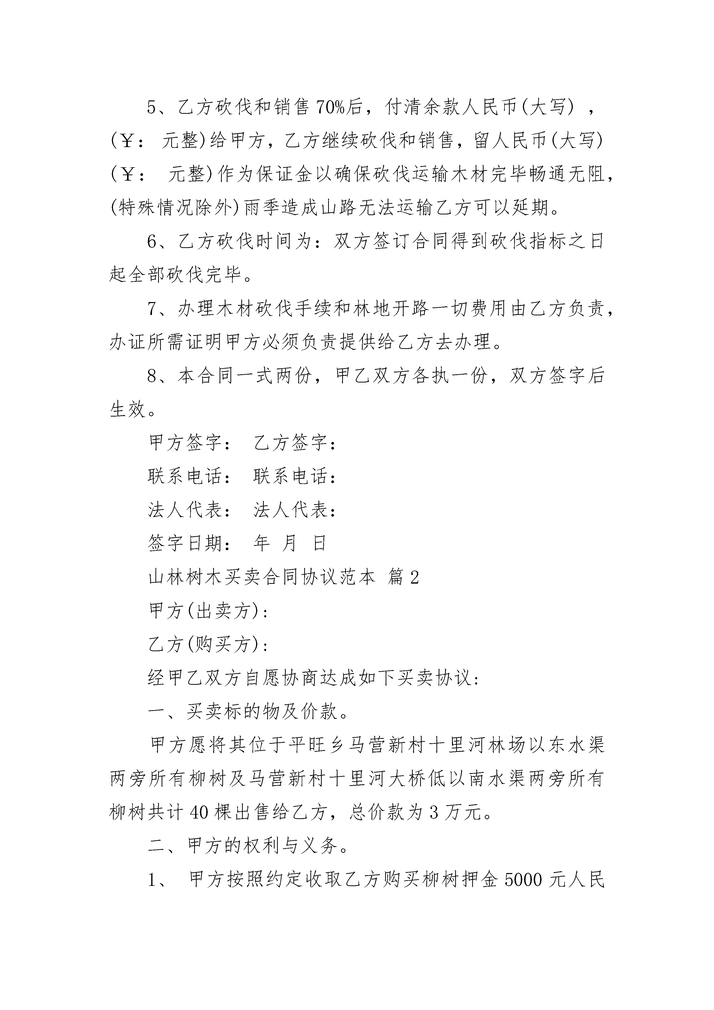 山林树木买卖合同协议范本山林树木买卖合同协议范本(通用23篇)山林树木买卖合同协议范本篇1甲方:乙方:甲方将出卖桉树木,位于有林面积约卖给乙方砍伐和销售,交易价格为人民币(大写),(¥:元整)。一、付款方式:1、甲乙双方自从签订本合同之日起,乙方付给甲方人民币(大写),(¥:元整)作为定金,以打款为凭据,违约方赔偿守约方双倍定金。2、乙方在取得砍伐指标后,进场砍伐三天后,乙方付给甲方人民币(大写),(¥:元整)方可运输木头。3、乙方砍伐林木必须连片砍伐,根据乙方运输林木的需要,甲方必须同意乙方在林地里开路运输,并保证乙方运输木材经过的林区道路范围不受了阻挠,甲方必须负责和村民讲好给开路(要是有什么青苗费等赔偿由甲方负责),甲方要保证道路能通过25—30吨的车子至国道。(途中有人问要过路费由甲方负责)。4、乙方在砍伐过程中如出现村民因林权、土地承包权、土地租金纠纷、抢林现象等导致乙方无法施工砍伐的,均由甲方七天内解决,如给乙方造成任何经济损失的,甲方按实际损失的双倍赔偿给乙方。5、乙方砍伐和销售70%后,付清余款人民币(大写),(¥:元整)给甲方,乙方继续砍伐和销售,留人民币(大写)(¥:元整)作为保证金以确保砍伐运输木材完毕畅通无阻,(特殊情况除外)雨季造成山路无法运输乙方可以延期。6、乙方砍伐时间为:双方签订合同得到砍伐指标之日起全部砍伐完毕。7、办理木材砍伐手续和林地开路一切费用由乙方负责,办证所需证明甲方必须负责提供给乙方去办理。8、本合同一式两份,甲乙双方各执一份,双方签字后生效。甲方签字:乙方签字:联系电话:联系电话:法人代表:法人代表:签字日期:年月日山林树木买卖合同协议范本篇2甲方(出卖方):乙方(购买方):经甲乙双方自愿协商达成如下买卖协议:一、买卖标的物及价款。甲方愿将其位于平旺乡马营新村十里河林场以东水渠两旁所有柳树及马营新村十里河大桥低以南水渠两旁所有柳树共计40棵出售给乙方,总价款为3万元。二、甲方的权利与义务。1、甲方按照约定收取乙方购买柳树押金5000元人民币及货款。2、甲方承诺有出售上述柳树的绝对的、合法的、完全的处分权,保证无任何权属争议和经济纠纷,否则,甲方愿意承担因此给乙方造成的一切经济损失。3、为乙方提供采挖树木的便利条件,负责处理采挖、运输树木过程中的一切纠纷及各部门、村委、人员阻碍、干涉、刁难等不利于采挖、运输、买卖的一切行为。否则,甲方愿意承担因此给乙方所造成的人工费、机械租凭费等一切经济损失。保证乙方的工作顺利进行。甲方收款应当向乙方提供相应的合法字据,否则,乙方有权拒绝付款。三、乙方的权利与义务。乙方自行采挖树木,所挖产品均归乙方所有。采挖开始时,付给甲方押金5000元,采挖过程中每运走3、5棵柳树付给甲方相近的款项3000元,收尾时与押金一并结算.合同文本:本合同一式二份,双方各执一份。合同效力:本合同经买卖双方签字按手印后生效。甲方(盖章):__________________乙方:_________________________代表人(签字):________________身份证号码:_____________________________年________月_______日_________年________月_______日山林树木买卖合同协议范本篇3甲方|:身份证号码:地址:联系方式:乙方:身份证号码:地址:联系方式:根据《中华人民共和国合同法》及其他有关法律、法规规定,甲乙双方经友好协商,在平等、自愿、协商一致的基础上,就林木买卖自愿达成如下协议,供双方共同遵照执行。一、林木坐落甲方自愿将位于哈尔滨市道外区【】镇【】村(实际土地承包经营权人的土地)所种林木【】颗(占地三亩)出售给【】。二、林木品种、价格、数量及总价款1、林木品种为:2、林木价格:3、林木数量:4、总价款:三、价款支付方式乙方在本协议签订后,在【】日内以现金的方式一次性付清,即人民币【】元。四、林木交付方式1、交付时间和期限:本协议签订后天内交付。2、交货地点:甲方林木所在地。3、交货方式:现场交接。五、甲乙双方权利与义务1、甲方保证所售林木已如实陈述上述林木权属状况和其他具体状况,保证所售林木没有设定担保、没有权属纠纷,保证所售林木不受他人合法追索。2、乙方保证按协议约定支付林木价款。3、甲方保证按协议约定交付林木。4、甲方按协议约定交付林木后,甲方放弃对林木的一切权利(包括但不限于林木出售收益、林木的孳息、因有关部门依法征地所得赔偿款等)。5、甲方负责协调乙方与土地经营权流转方法签订土地流转协议。6、本协议签订后,既而得到林木的全部权利,包括但不限于林木出售收益、林木的孳息、因有关部门依法征地所得赔偿款等权利。六、本协议的解除双方协商一致的,可以终止本协议的履行。一方根本性违约的,另一方