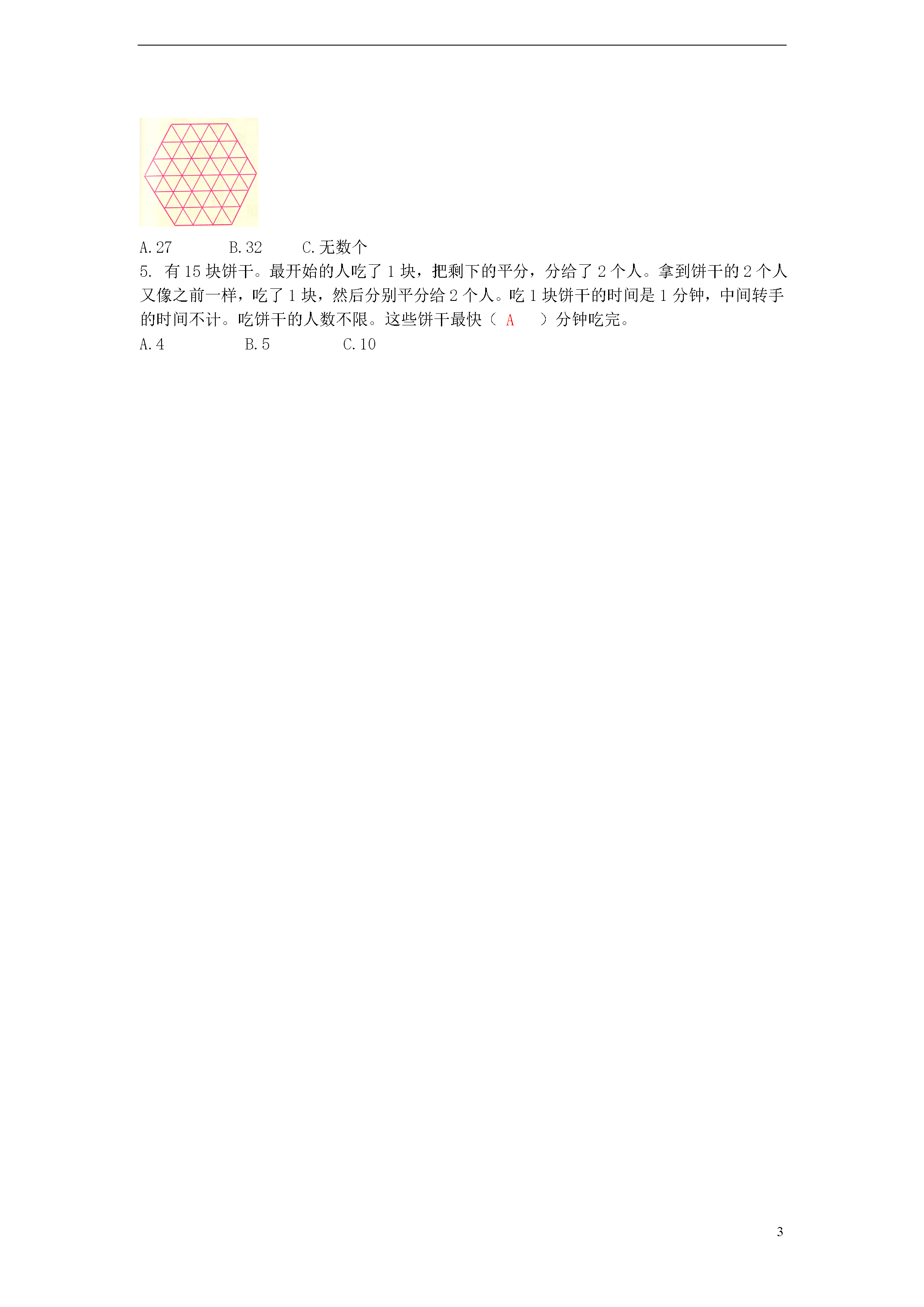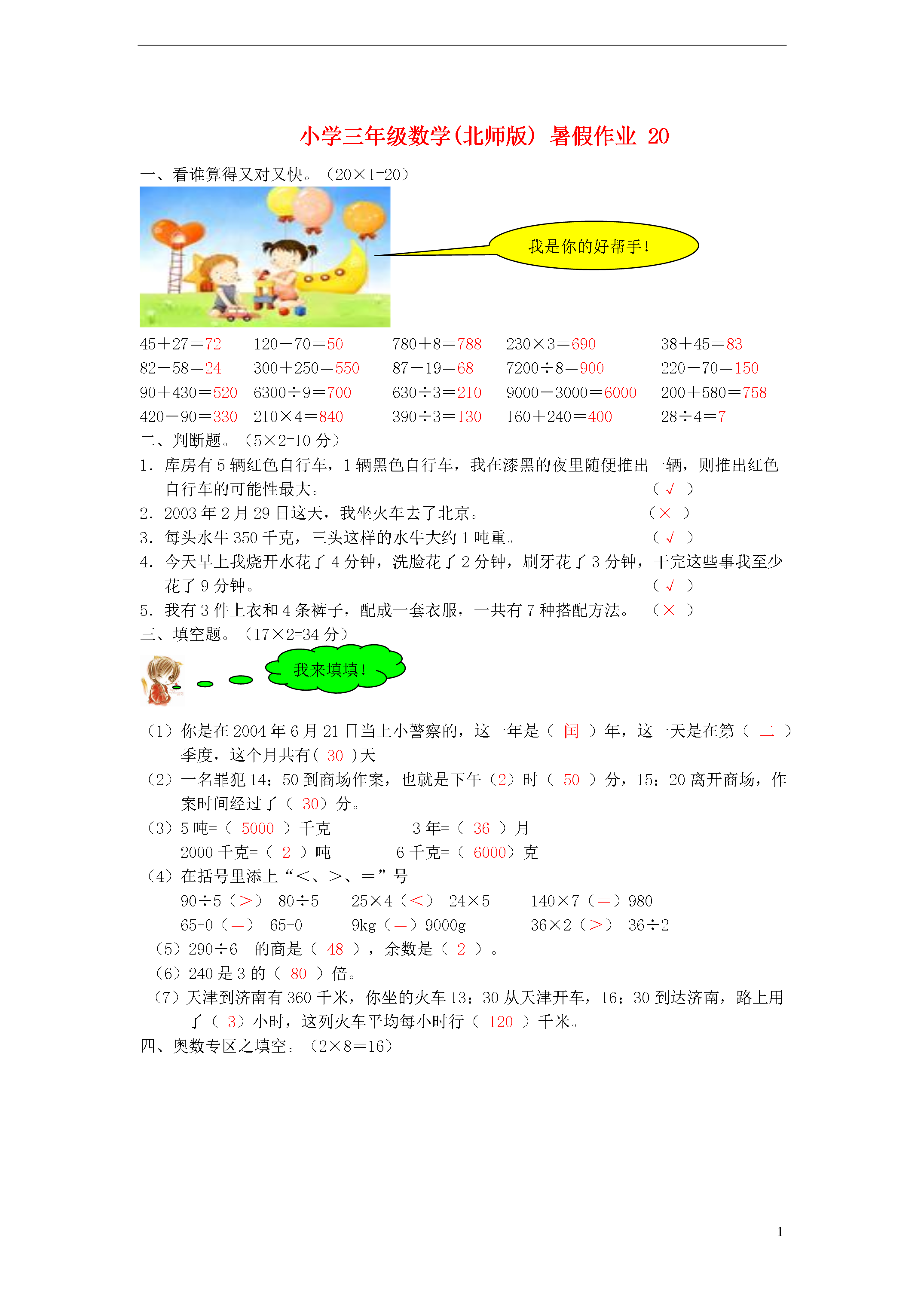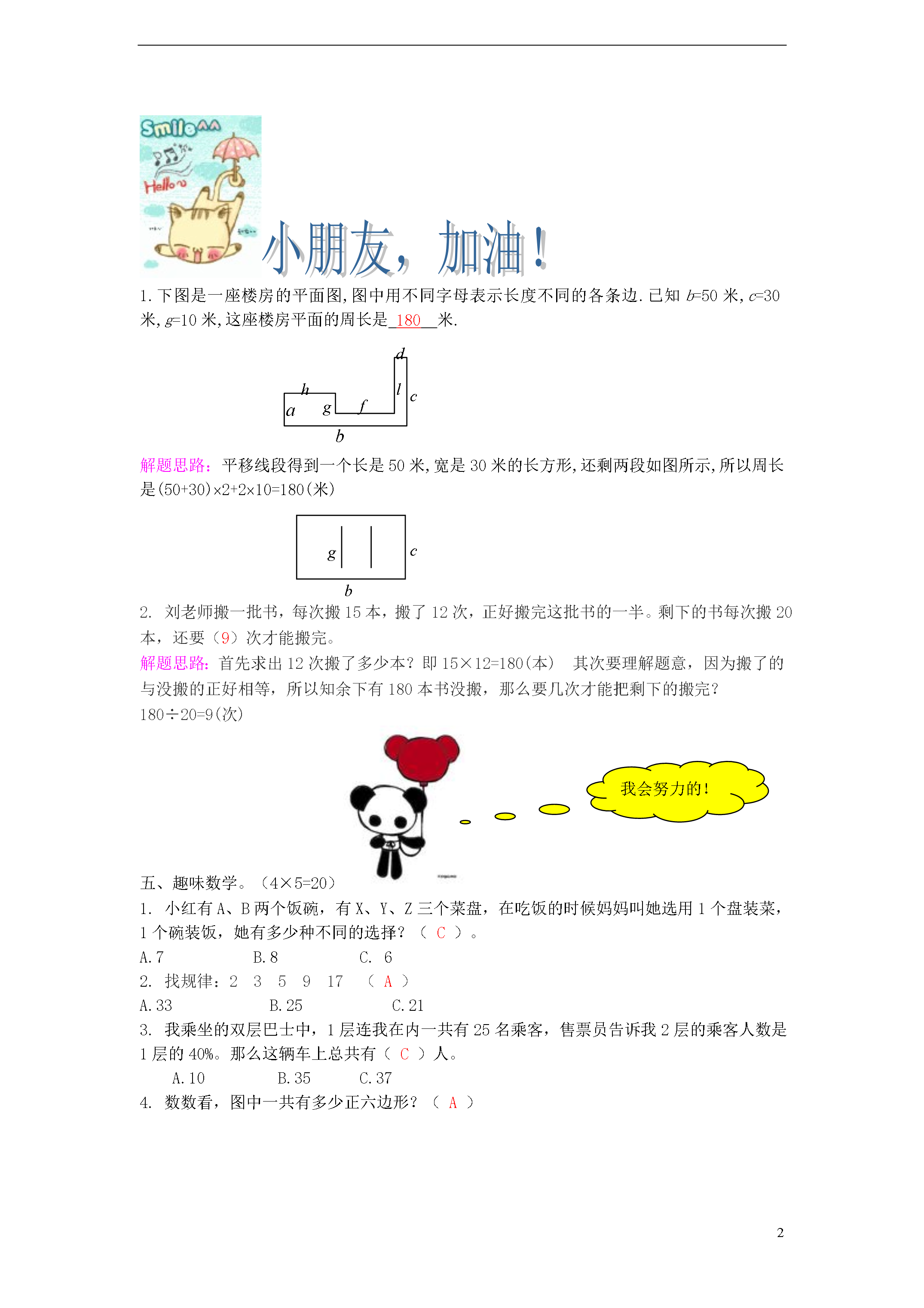 3小学三年级数学(北师版)暑假作业20一、看谁算得又对又快。(20×1=20)我是你的好帮手!45+27=72120-70=50780+8=788230×3=69038+45=8382-58=24300+250=55087-19=687200÷8=900220-70=15090+430=5206300÷9=700630÷3=2109000-3000=6000200+580=758420-90=330210×4=840390÷3=130160+240=40028÷4=7二、判断题。(5×2=10分)1.库房有5辆红色自行车,1辆黑色自行车,我在漆黑的夜里随便推出一辆,则推出红色自行车的可能性最大。(√)2.2003年2月29日这天,我坐火车去了北京。(×)3.每头水牛350千克,三头这样的水牛大约1吨重。(√)4.今天早上我烧开水花了4分钟,洗脸花了2分钟,刷牙花了3分钟,干完这些事我至少花了9分钟。(√)5.我有3件上衣和4条裤子,配成一套衣服,一共有7种搭配方法。(×)三、填空题。(17×2=34分)我来填填!(1)你是在2004年6月21日当上小警察的,这一年是(闰)年,这一天是在第(二)季度,这个月共有(30)天(2)一名罪犯14:50到商场作案,也就是下午(2)时(50)分,15:20离开商场,作案时间经过了(30)分。(3)5吨=(5000)千克3年=(36)月2000千克=(2)吨6千克=(6000)克(4)在括号里添上“<、>、=”号90÷5(>)80÷525×4(<)24×5140×7(=)98065+0(=)65-09kg(=)9000g36×2(>)36÷2(5)290÷6的商是(48),余数是(2)。(6)240是3的(80)倍。(7)天津到济南有360千米,你坐的火车13:30从天津开车,16:30到达济南,路上用了(3)小时,这列火车平均每小时行(120)千米。四、奥数专区之填空。(2×8=16)1.下图是一座楼房的平面图,图中用不同字母表示长度不同的各条边.已知b=50米,c=30米,g=10米,这座楼房平面的周长是180米.bacdhglf解题思路:平移线段得到一个长是50米,宽是30米的长方形,还剩两段如图所示,所以周长是(50+30)2+210=180(米)gcb2.刘老师搬一批书,每次搬15本,搬了12次,正好搬完这批书的一半。剩下的书每次搬20本,还要(9)次才能搬完。解题思路:首先求出12次搬了多少本?即15×12=180(本)其次要理解题意,因为搬了的与没搬的正好相等,所以知余下有180本书没搬,那么要几次才能把剩下的搬完?180÷20=9(次)我会努力的!五、趣味数学。(4×5=20)1.小红有A、B两个饭碗,有X、Y、Z三个菜盘,在吃饭的时候妈妈叫她选用1个盘装菜,1个碗装饭,她有多少种不同的选择?(C)。A.7B.8C.62.找规律:235917(A)A.33B.25C.213.我乘坐的双层巴士中,1层连我在内一共有25名乘客,售票员告诉我2层的乘客人数是1层的40%。那么这辆车上总共有(C)人。A.10B.35C.374.数数看,图中一共有多少正六边形?(A)A.27B.32C.无数个5.有15块饼干。最开始的人吃了1块,把剩下的平分,分给了2个人。拿到饼干的2个人又像之前一样,吃了1块,然后分别平分给2个人。吃1块饼干的时间是1分钟,中间转手的时间不计。吃饼干的人数不限。这些饼干最快(A)分钟吃完。A.4B.5C.10