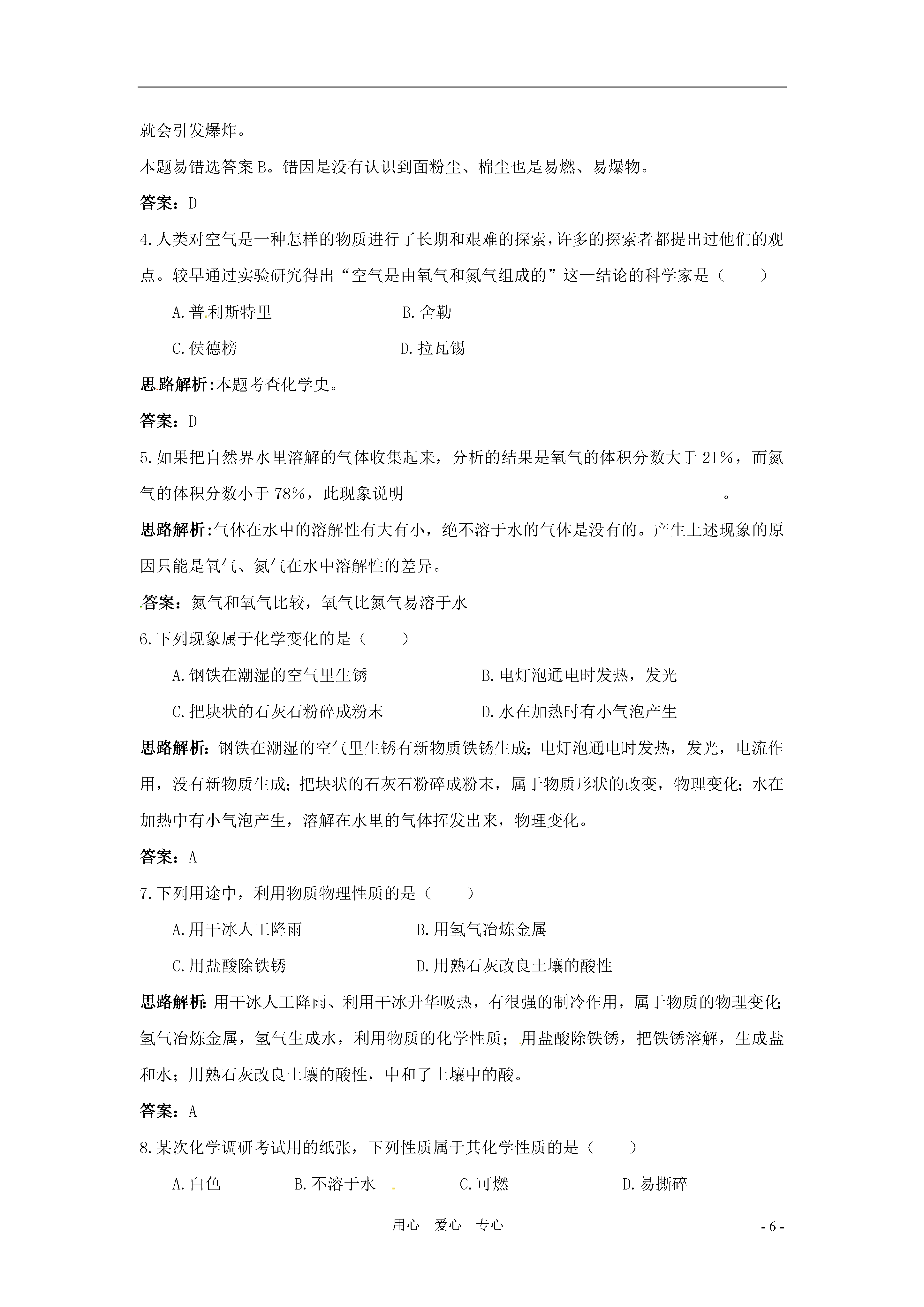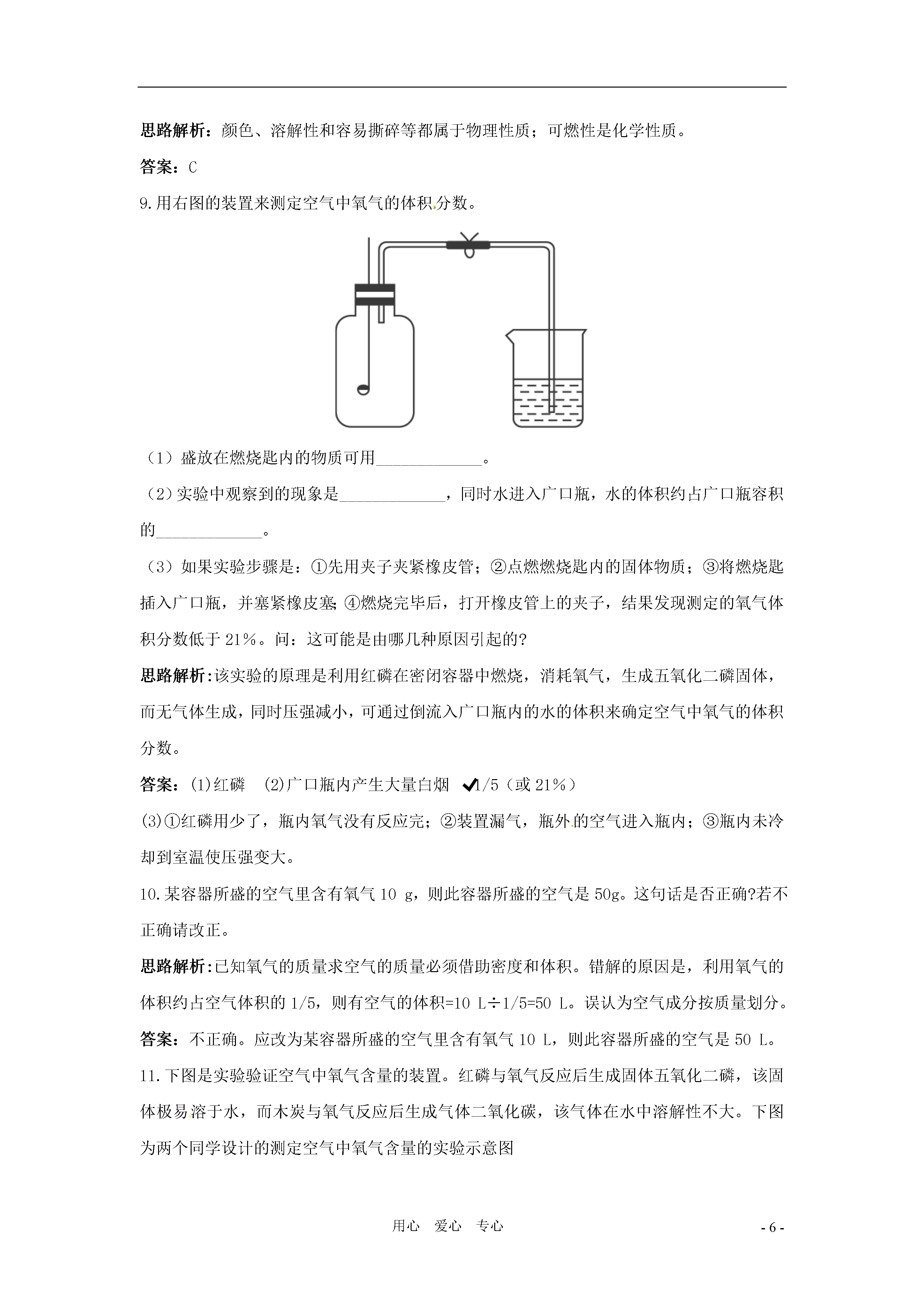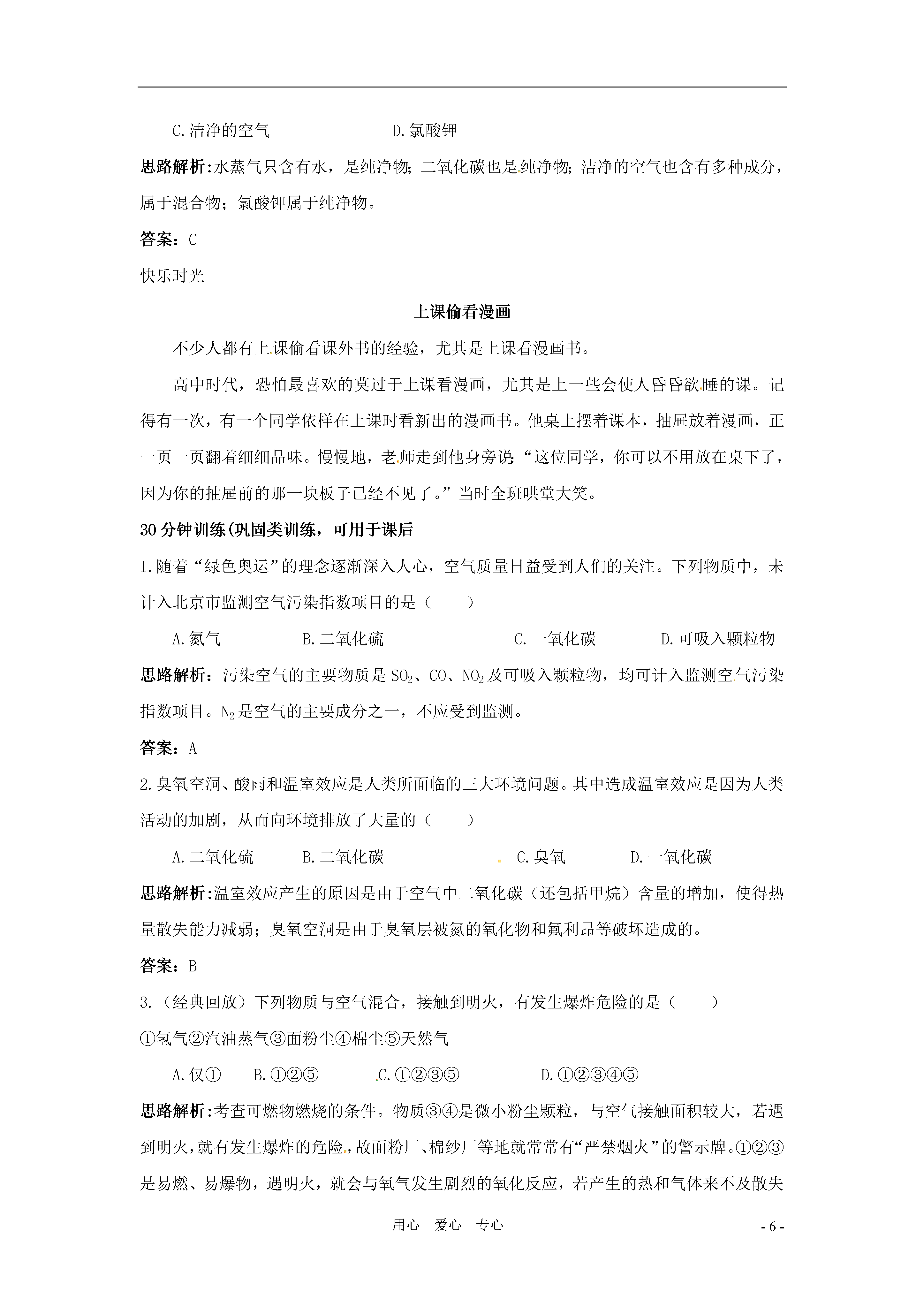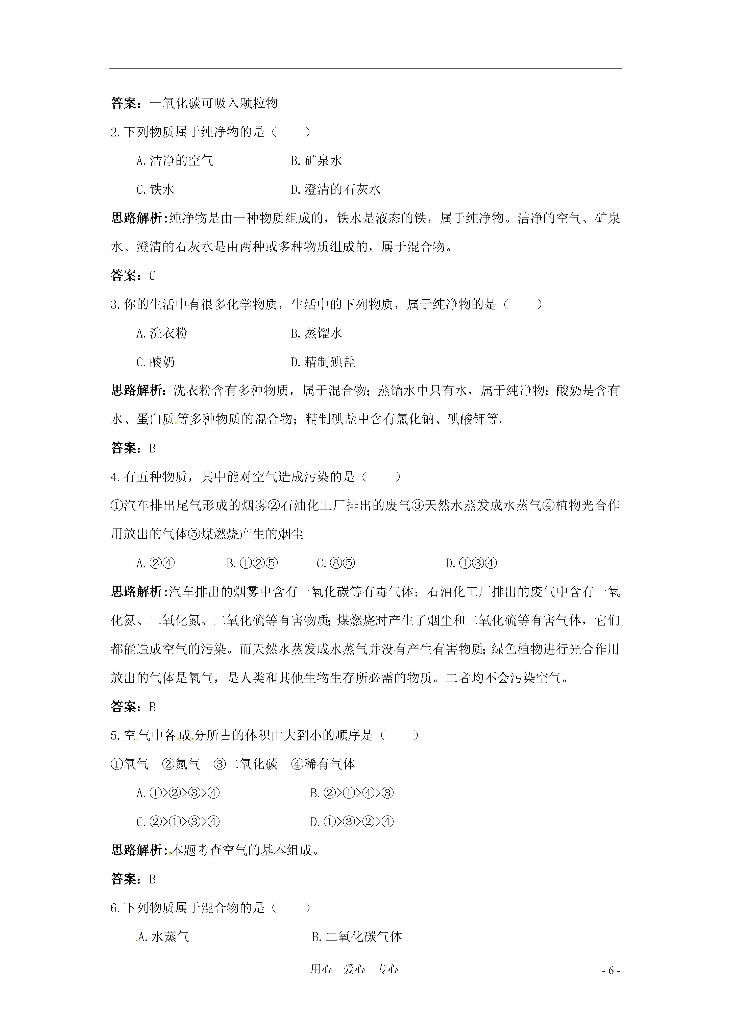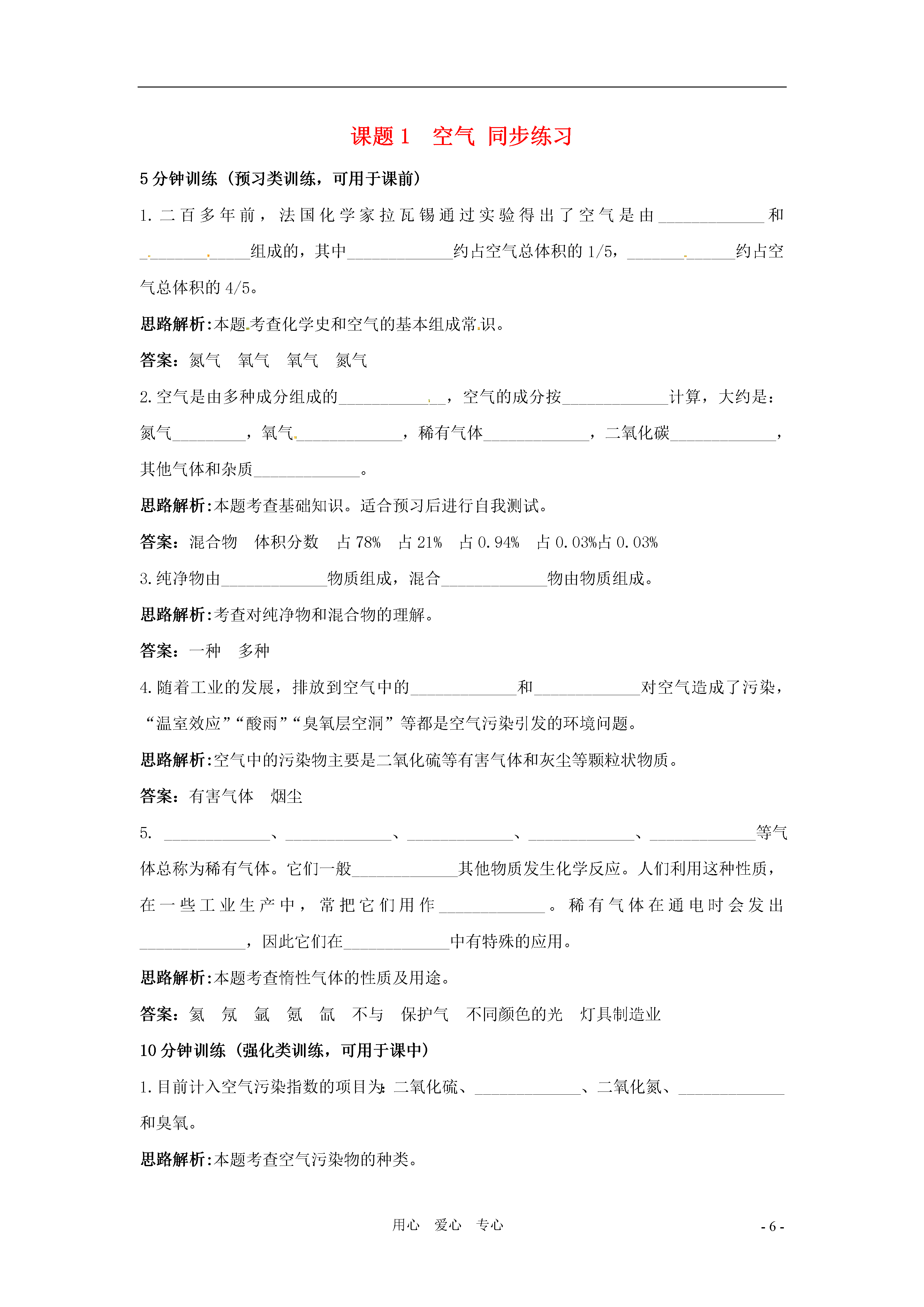 -6-用心爱心专心课题1空气同步练习5分钟训练(预习类训练,可用于课前)1.二百多年前,法国化学家拉瓦锡通过实验得出了空气是由_____________和_____________组成的,其中_____________约占空气总体积的1/5,_____________约占空气总体积的4/5。思路解析:本题考查化学史和空气的基本组成常识。答案:氮气氧气氧气氮气2.空气是由多种成分组成的_____________,空气的成分按_____________计算,大约是:氮气_________,氧气_____________,稀有气体_____________,二氧化碳_____________,其他气体和杂质_____________。思路解析:本题考查基础知识。适合预习后进行自我测试。答案:混合物体积分数占78%占21%占0.94%占0.03%占0.03%3.纯净物由_____________物质组成,混合_____________物由物质组成。思路解析:考查对纯净物和混合物的理解。答案:一种多种4.随着工业的发展,排放到空气中的_____________和_____________对空气造成了污染,“温室效应”“酸雨”“臭氧层空洞”等都是空气污染引发的环境问题。思路解析:空气中的污染物主要是二氧化硫等有害气体和灰尘等颗粒状物质。答案:有害气体烟尘5._____________、_____________、_____________、_____________、_____________等气体总称为稀有气体。它们一般_____________其他物质发生化学反应。人们利用这种性质,在一些工业生产中,常把它们用作_____________。稀有气体在通电时会发出_____________,因此它们在_____________中有特殊的应用。思路解析:本题考查惰性气体的性质及用途。答案:氦氖氩氪氙不与保护气不同颜色的光灯具制造业10分钟训练(强化类训练,可用于课中)1.目前计入空气污染指数的项目为:二氧化硫、_____________、二氧化氮、_____________和臭氧。思路解析:本题考查空气污染物的种类。答案:一氧化碳可吸入颗粒物2.下列物质属于纯净物的是()A.洁净的空气B.矿泉水C.铁水D.澄清的石灰水思路解析:纯净物是由一种物质组成的,铁水是液态的铁,属于纯净物。洁净的空气、矿泉水、澄清的石灰水是由两种或多种物质组成的,属于混合物。答案:C3.你的生活中有很多化学物质,生活中的下列物质,属于纯净物的是()A.洗衣粉B.蒸馏水C.酸奶D.精制碘盐思路解析:洗衣粉含有多种物质,属于混合物;蒸馏水中只有水,属于纯净物;酸奶是含有水、蛋白质等多种物质的混合物;精制碘盐中含有氯化钠、碘酸钾等。答案:B4.有五种物质,其中能对空气造成污染的是()①汽车排出尾气形成的烟雾②石油化工厂排出的废气③天然水蒸发成水蒸气④植物光合作用放出的气体⑤煤燃烧产生的烟尘A.②④B.①②⑤C.⑧⑤D.①③④思路解析:汽车排出的烟雾中含有一氧化碳等有毒气体;石油化工厂排出的废气中含有一氧化氮、二氧化氮、二氧化硫等有害物质;煤燃烧时产生了烟尘和二氧化硫等有害气体,它们都能造成空气的污染。而天然水蒸发成水蒸气并没有产生有害物质;绿色植物进行光合作用放出的气体是氧气,是人类和其他生物生存所必需的物质。二者均不会污染空气。答案:B5.空气中各成分所占的体积由大到小的顺序是()①氧气②氮气③二氧化碳④稀有气体A.①>②>③>④B.②>①>④>③C.②>①>③>④D.①>③>②>④思路解析:本题考查空气的基本组成。答案:B6.下列物质属于混合物的是()A.水蒸气B.二氧化碳气体C.洁净的空气D.氯酸钾思路解析:水蒸气只含有水,是纯净物;二氧化碳也是纯净物;洁净的空气也含有多种成分,属于混合物;氯酸钾属于纯净物。答案:C快乐时光上课偷看漫画不少人都有上课偷看课外书的经验,尤其是上课看漫画书。高中时代,恐怕最喜欢的莫过于上课看漫画,尤其是上一些会使人昏昏欲睡的课。记得有一次,有一个同学依样在上课时看新出的漫画书。他桌上摆着课本,抽屉放着漫画,正一页一页翻着细细品味。慢慢地,老师走到他身旁说:“这位同学,你可以不用放在桌下了,因为你的抽屉前的那一块板子已经不见了。”当时全班哄堂大笑。30分钟训练(巩固类训练,可用于课后1.随着“绿色奥运”的理念逐渐深入人心,空气质量日益受到人们的关注。下列物质中,未计入北京市监测空气污染指数项目的是()A.氮气B.二氧化硫C.一氧化碳D.可吸入颗粒物思路解析:污染空气的主要物质是SO2、CO、NO2及可吸入颗粒物,均