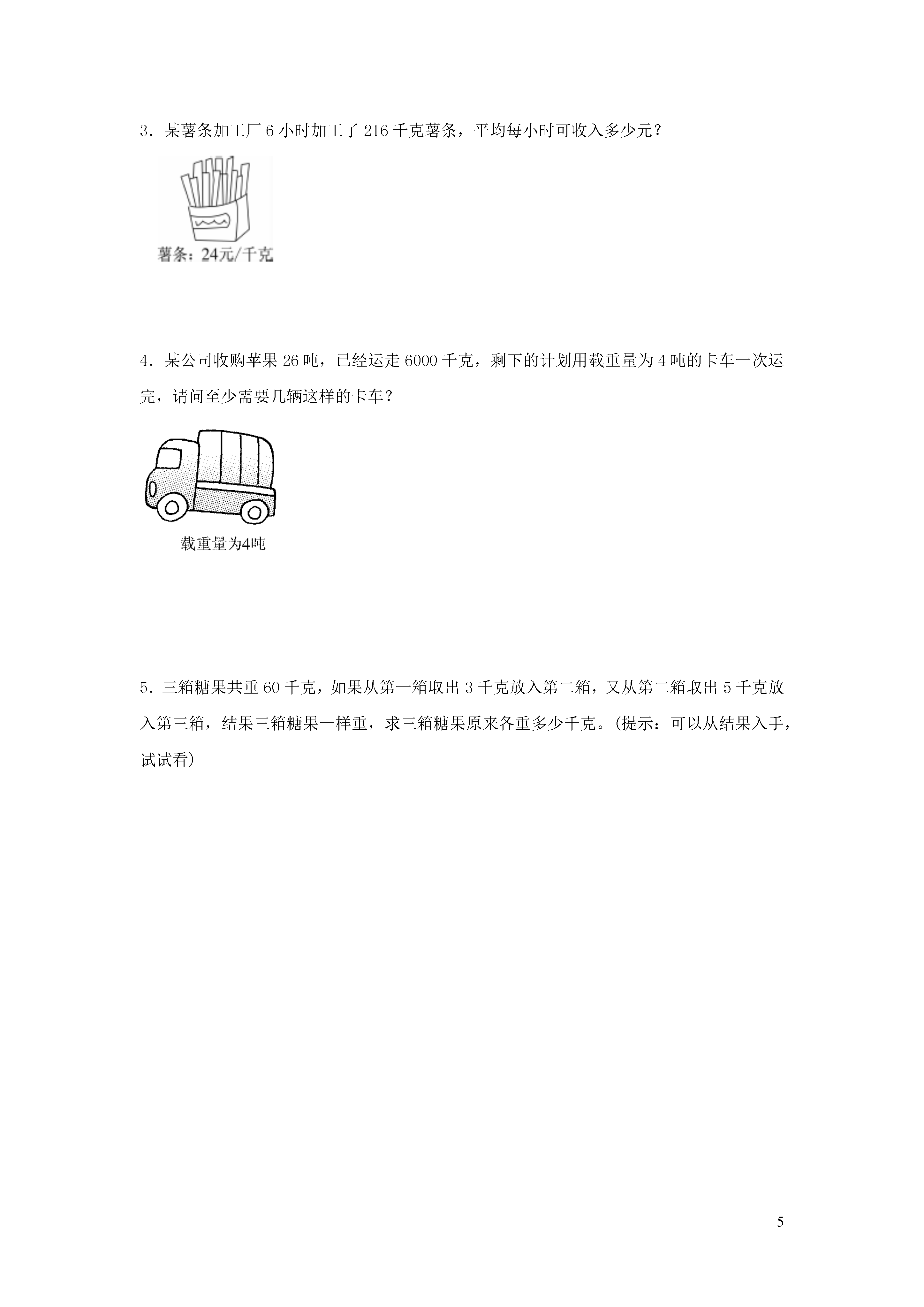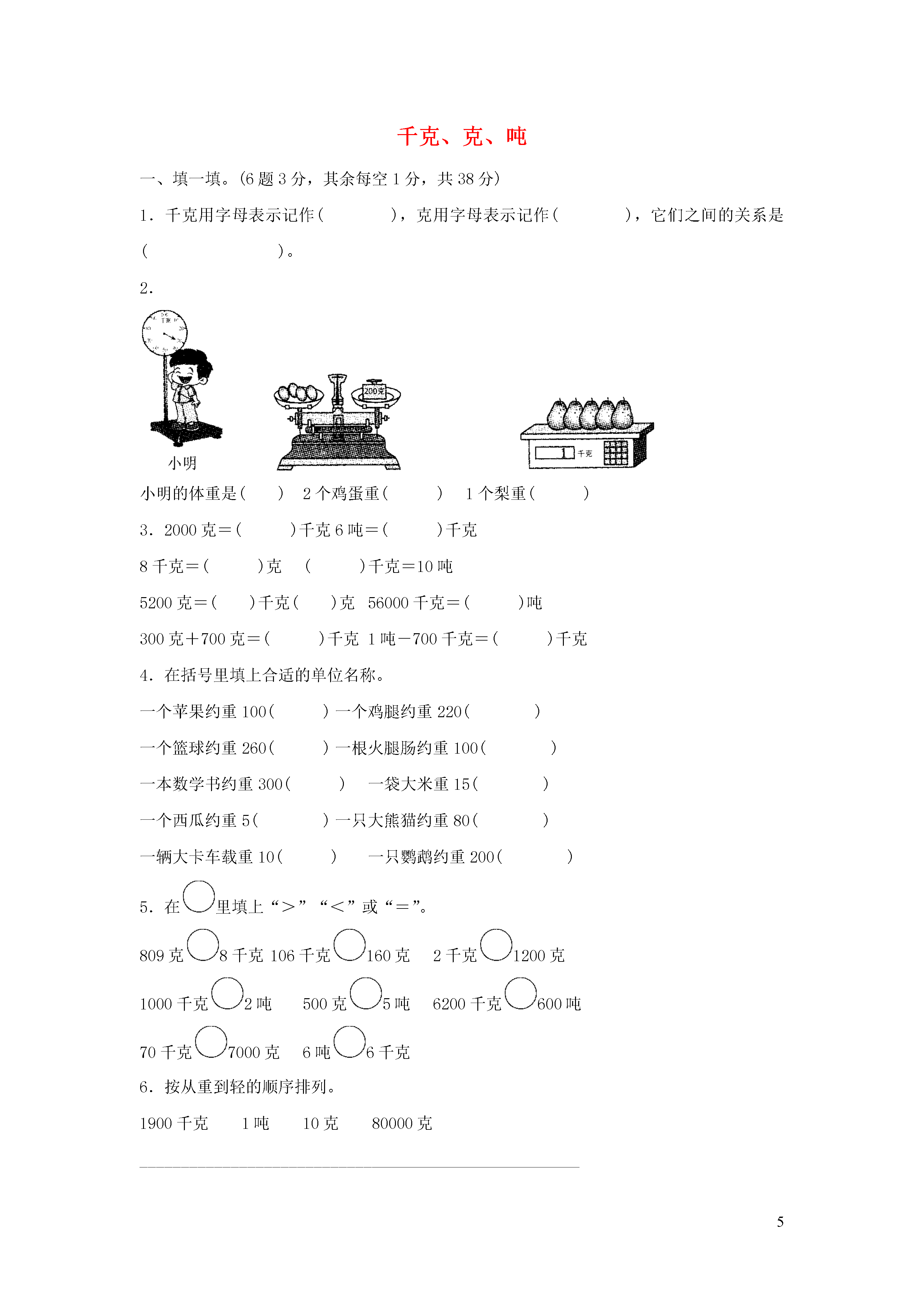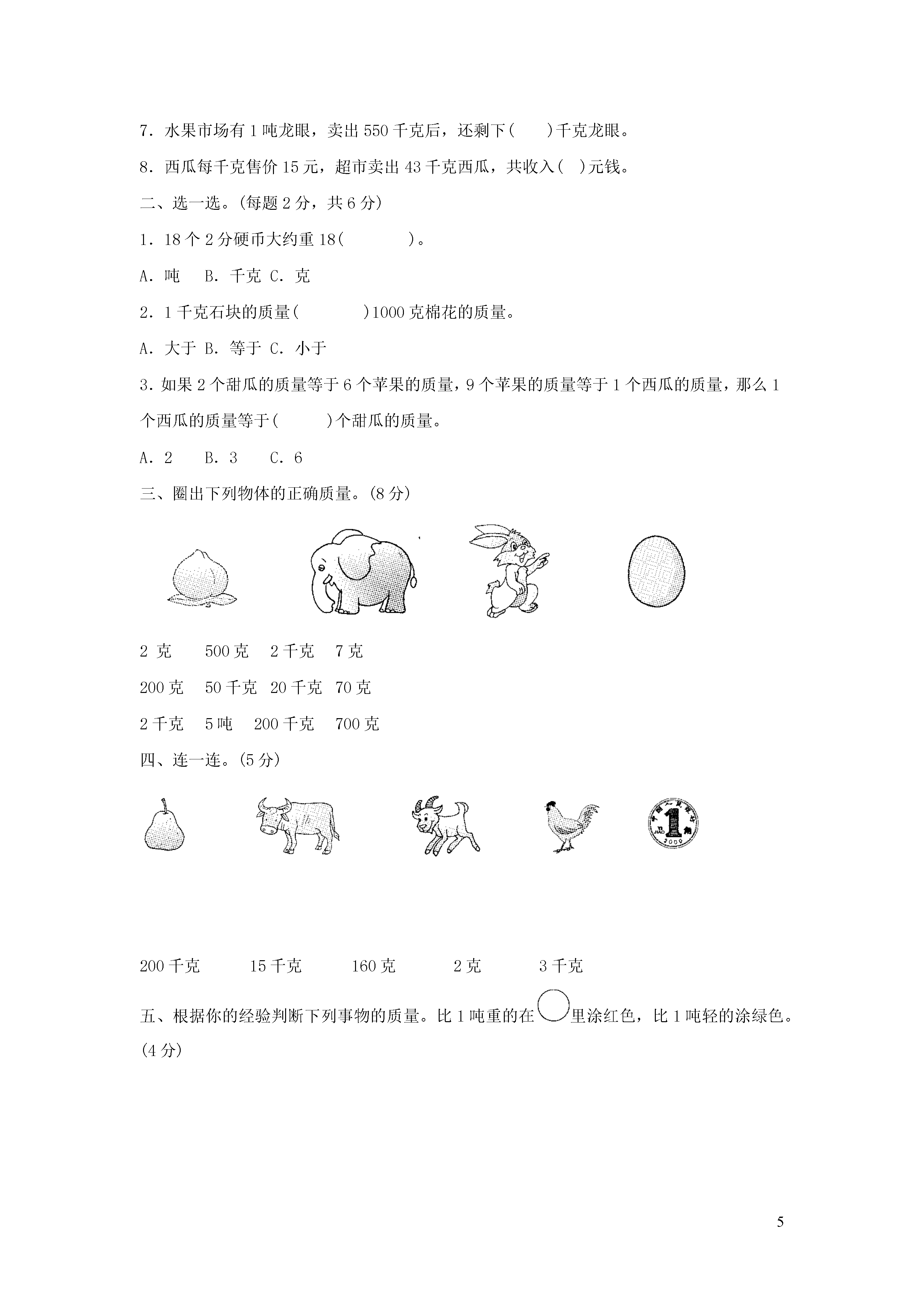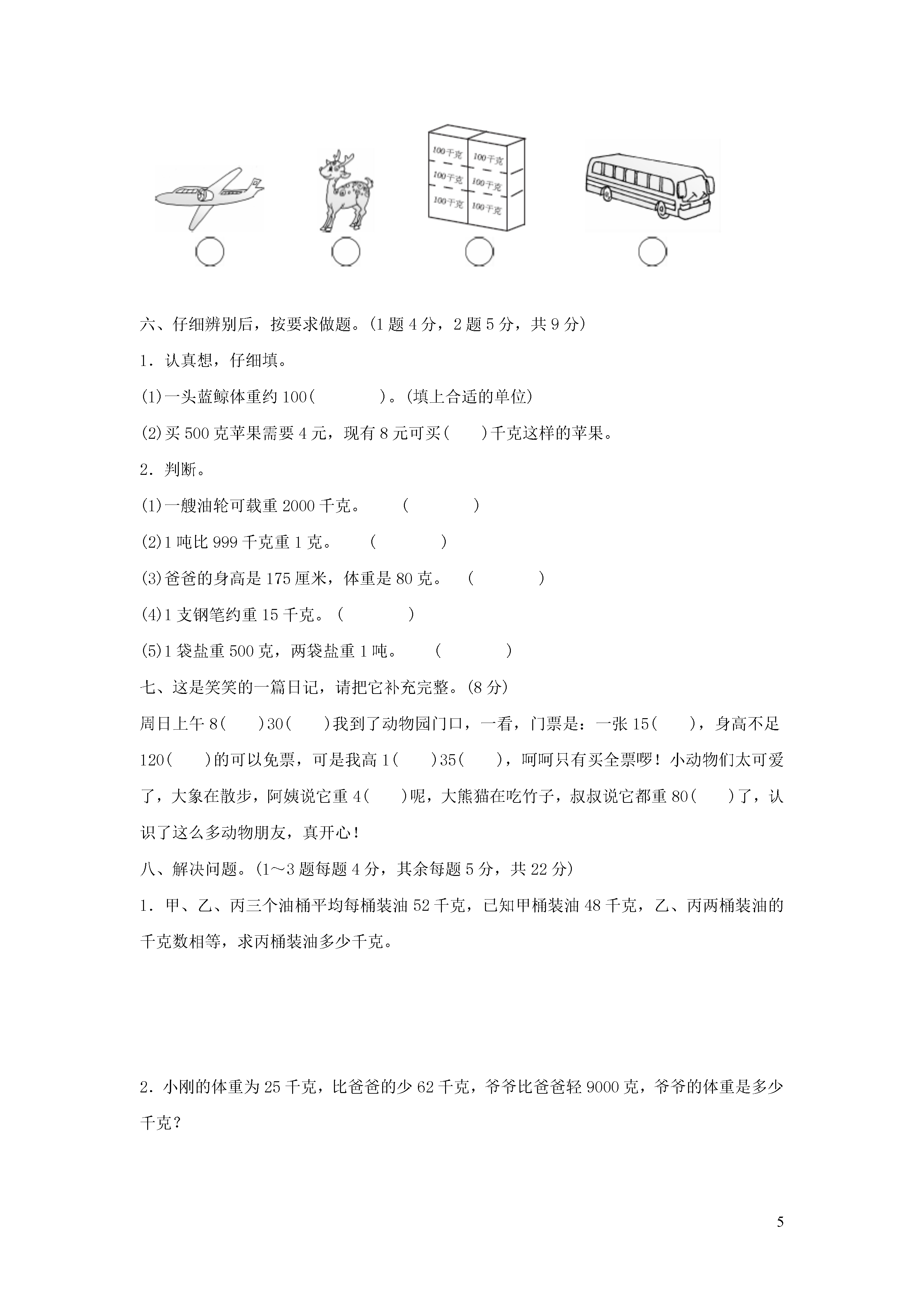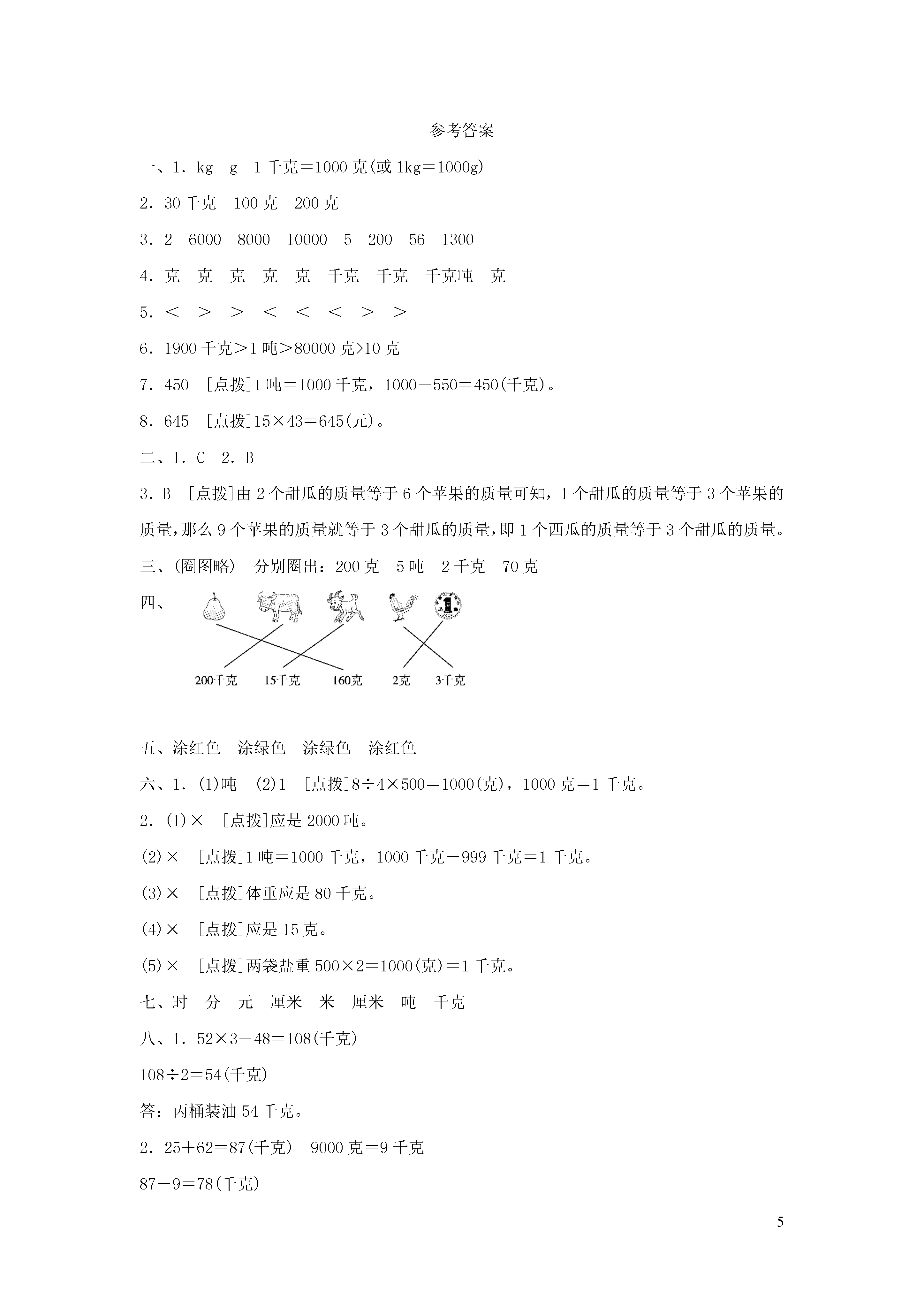 5千克、克、吨一、填一填。(6题3分,其余每空1分,共38分)1.千克用字母表示记作(),克用字母表示记作(),它们之间的关系是()。2.小明的体重是()2个鸡蛋重()1个梨重()3.2000克=()千克6吨=()千克8千克=()克()千克=10吨5200克=()千克()克56000千克=()吨300克+700克=()千克1吨-700千克=()千克4.在括号里填上合适的单位名称。一个苹果约重100()一个鸡腿约重220()一个篮球约重260()一根火腿肠约重100()一本数学书约重300()一袋大米重15()一个西瓜约重5()一只大熊猫约重80()一辆大卡车载重10()一只鹦鹉约重200()5.在里填上“>”“<”或“=”。809克8千克106千克160克2千克1200克1000千克2吨500克5吨6200千克600吨70千克7000克6吨6千克6.按从重到轻的顺序排列。1900千克1吨10克80000克______________________________________________________7.水果市场有1吨龙眼,卖出550千克后,还剩下()千克龙眼。8.西瓜每千克售价15元,超市卖出43千克西瓜,共收入()元钱。二、选一选。(每题2分,共6分)1.18个2分硬币大约重18()。A.吨B.千克C.克2.1千克石块的质量()1000克棉花的质量。A.大于B.等于C.小于3.如果2个甜瓜的质量等于6个苹果的质量,9个苹果的质量等于1个西瓜的质量,那么1个西瓜的质量等于()个甜瓜的质量。A.2B.3C.6三、圈出下列物体的正确质量。(8分)2克500克2千克7克200克50千克20千克70克2千克5吨200千克700克四、连一连。(5分)200千克15千克160克2克3千克五、根据你的经验判断下列事物的质量。比1吨重的在里涂红色,比1吨轻的涂绿色。(4分)六、仔细辨别后,按要求做题。(1题4分,2题5分,共9分)1.认真想,仔细填。(1)一头蓝鲸体重约100()。(填上合适的单位)(2)买500克苹果需要4元,现有8元可买()千克这样的苹果。2.判断。(1)一艘油轮可载重2000千克。()(2)1吨比999千克重1克。()(3)爸爸的身高是175厘米,体重是80克。()(4)1支钢笔约重15千克。()(5)1袋盐重500克,两袋盐重1吨。()七、这是笑笑的一篇日记,请把它补充完整。(8分)周日上午8()30()我到了动物园门口,一看,门票是:一张15(),身高不足120()的可以免票,可是我高1()35(),呵呵只有买全票啰!小动物们太可爱了,大象在散步,阿姨说它重4()呢,大熊猫在吃竹子,叔叔说它都重80()了,认识了这么多动物朋友,真开心!八、解决问题。(1~3题每题4分,其余每题5分,共22分)1.甲、乙、丙三个油桶平均每桶装油52千克,已知甲桶装油48千克,乙、丙两桶装油的千克数相等,求丙桶装油多少千克。2.小刚的体重为25千克,比爸爸的少62千克,爷爷比爸爸轻9000克,爷爷的体重是多少千克?3.某薯条加工厂6小时加工了216千克薯条,平均每小时可收入多少元?4.某公司收购苹果26吨,已经运走6000千克,剩下的计划用载重量为4吨的卡车一次运完,请问至少需要几辆这样的卡车?5.三箱糖果共重60千克,如果从第一箱取出3千克放入第二箱,又从第二箱取出5千克放入第三箱,结果三箱糖果一样重,求三箱糖果原来各重多少千克。(提示:可以从结果入手,试试看)参考答案一、1.kgg1千克=1000克(或1kg=1000g)2.30千克100克200克3.2600080001000052005613004.克克克克克千克千克千克吨克5.<>><<<>>6.1900千克>1吨>80000克>10克7.450[点拨]1吨=1000千克,1000-550=450(千克)。8.645[点拨]15×43=645(元)。二、1.C2.B3.B[点拨]由2个甜瓜的质量等于6个苹果的质量可知,1个甜瓜的质量等于3个苹果的质量,那么9个苹果的质量就等于3个甜瓜的质量,即1个西瓜的质量等于3个甜瓜的质量。三、(圈图略)分别圈出:200克5吨2千克70克四、五、涂红色涂绿色涂绿色涂红色六、1.(1)吨(2)1[点拨]8÷4×500=1000(克),1000克=1千克。2.(1)×[点拨]应是2000吨。(2)×[点拨]1吨=1000千克,1000千克-999千克=1千克。(3)×[点拨]体重应是80千克。(4)×[点拨]应是15克。(5)×[点