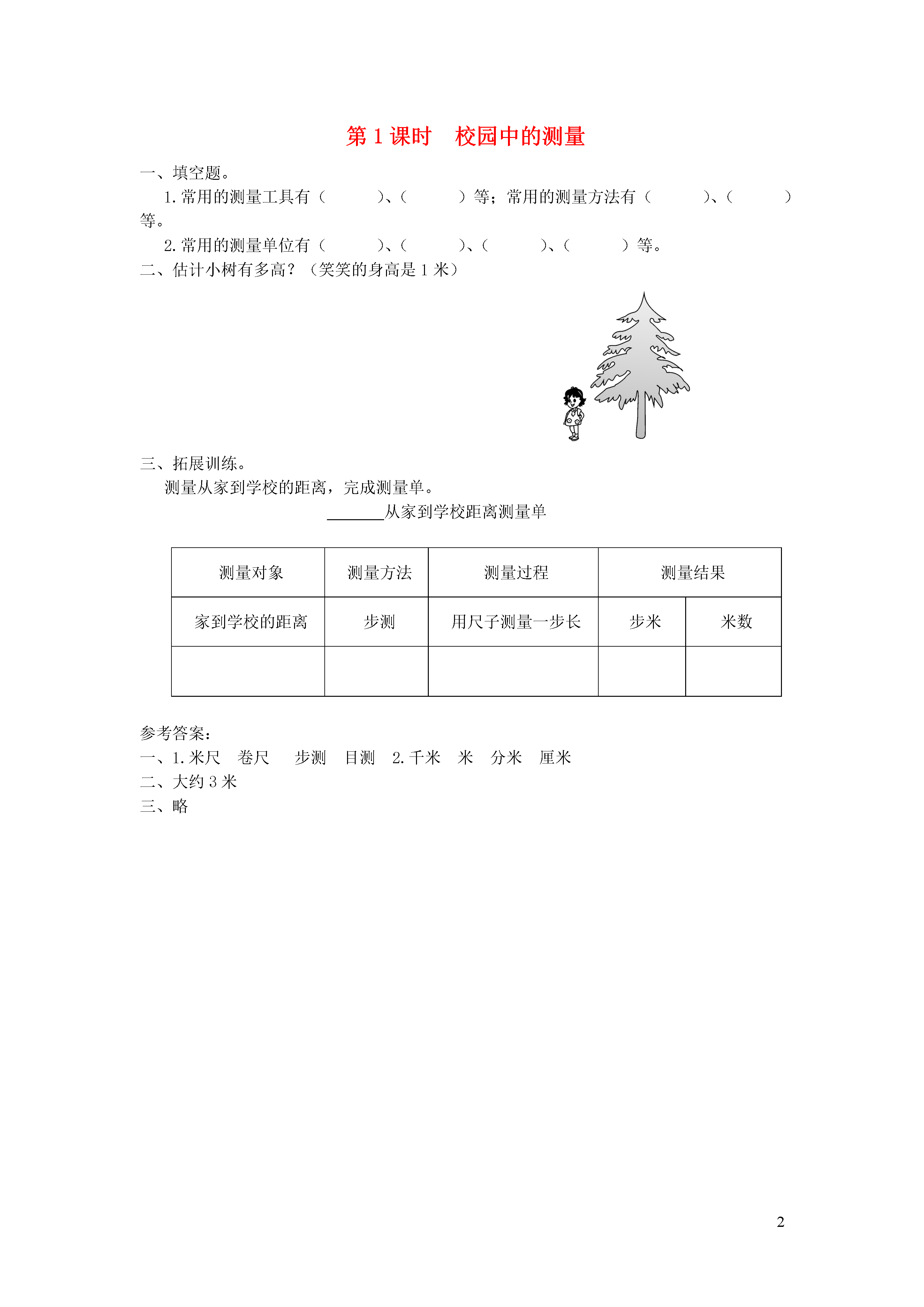 2第1课时校园中的测量填空题。1.常用的测量工具有()、()等;常用的测量方法有()、()等。2.常用的测量单位有()、()、()、()等。估计小树有多高?(笑笑的身高是1米)拓展训练。测量从家到学校的距离,完成测量单。从家到学校距离测量单测量对象测量方法测量过程测量结果家到学校的距离步测用尺子测量一步长步米米数参考答案:一、1.米尺卷尺步测目测2.千米米分米厘米大约3米略