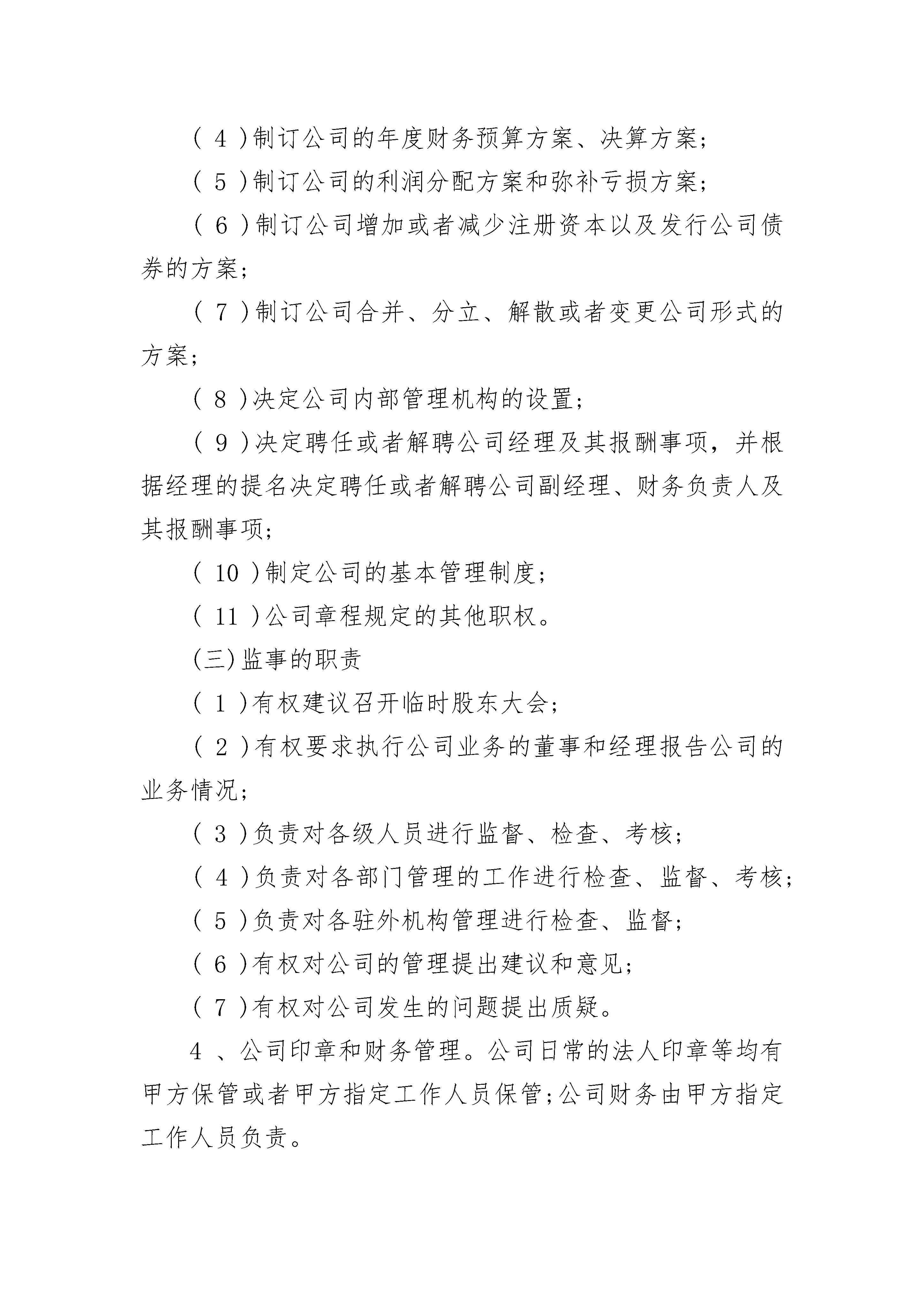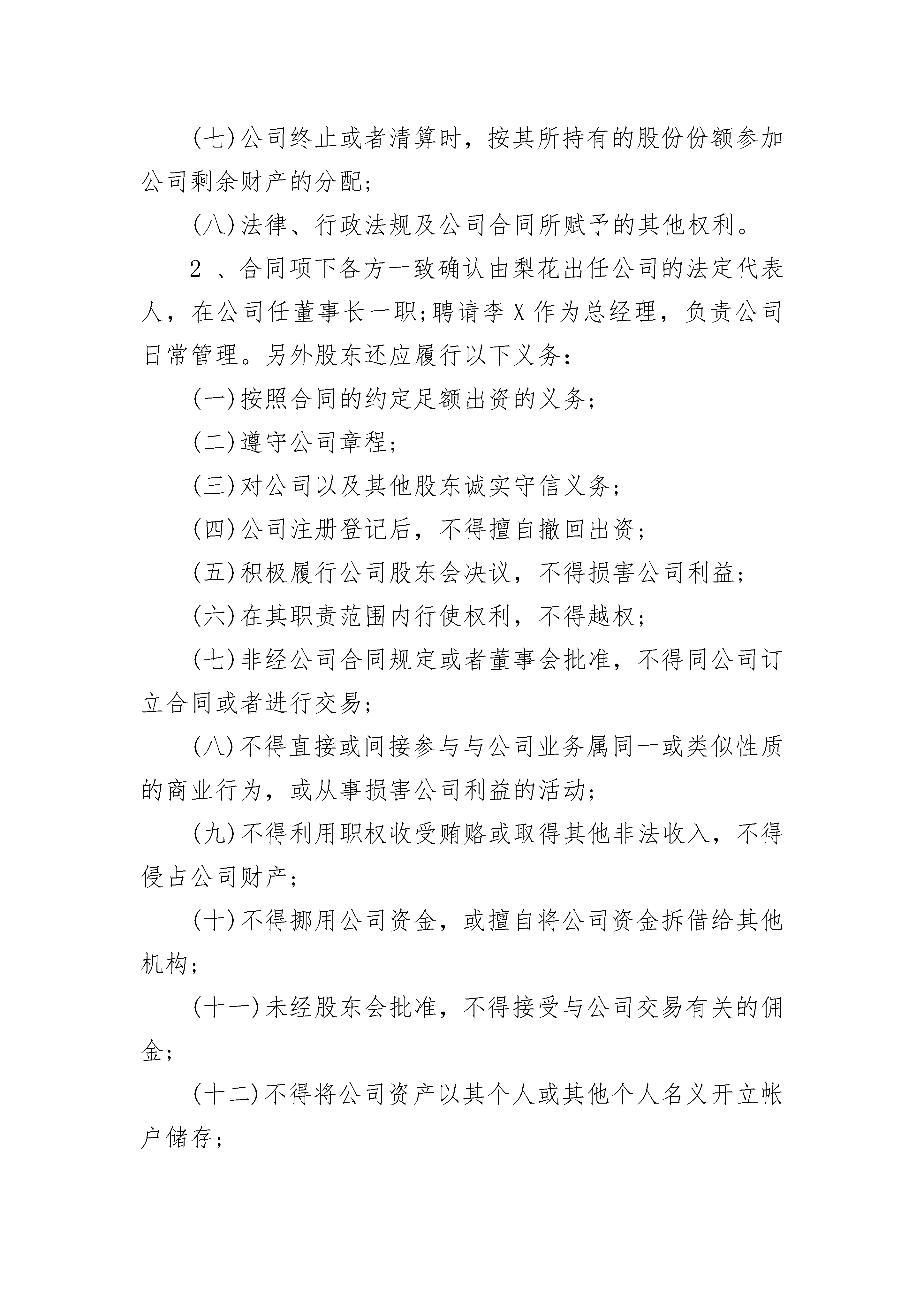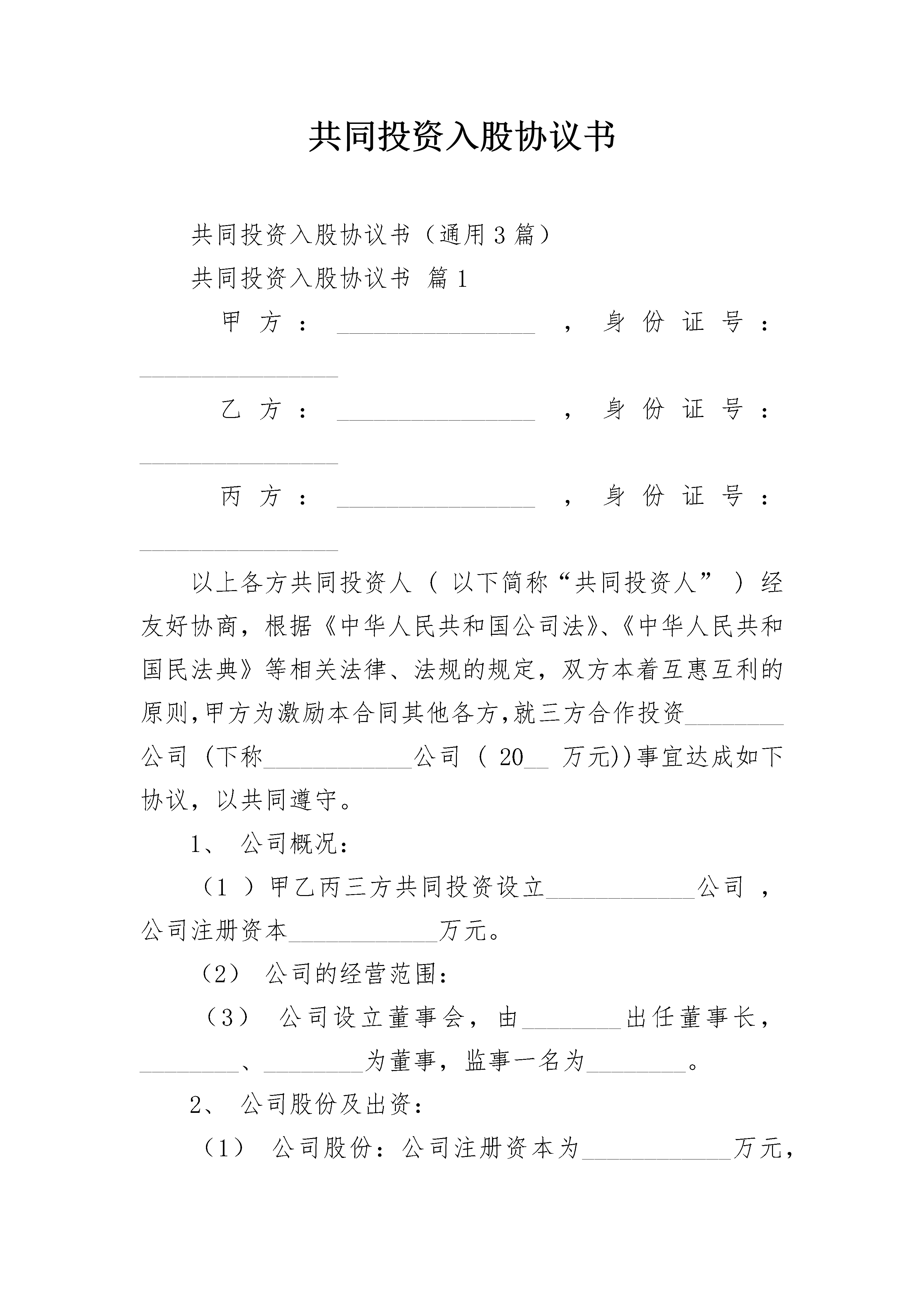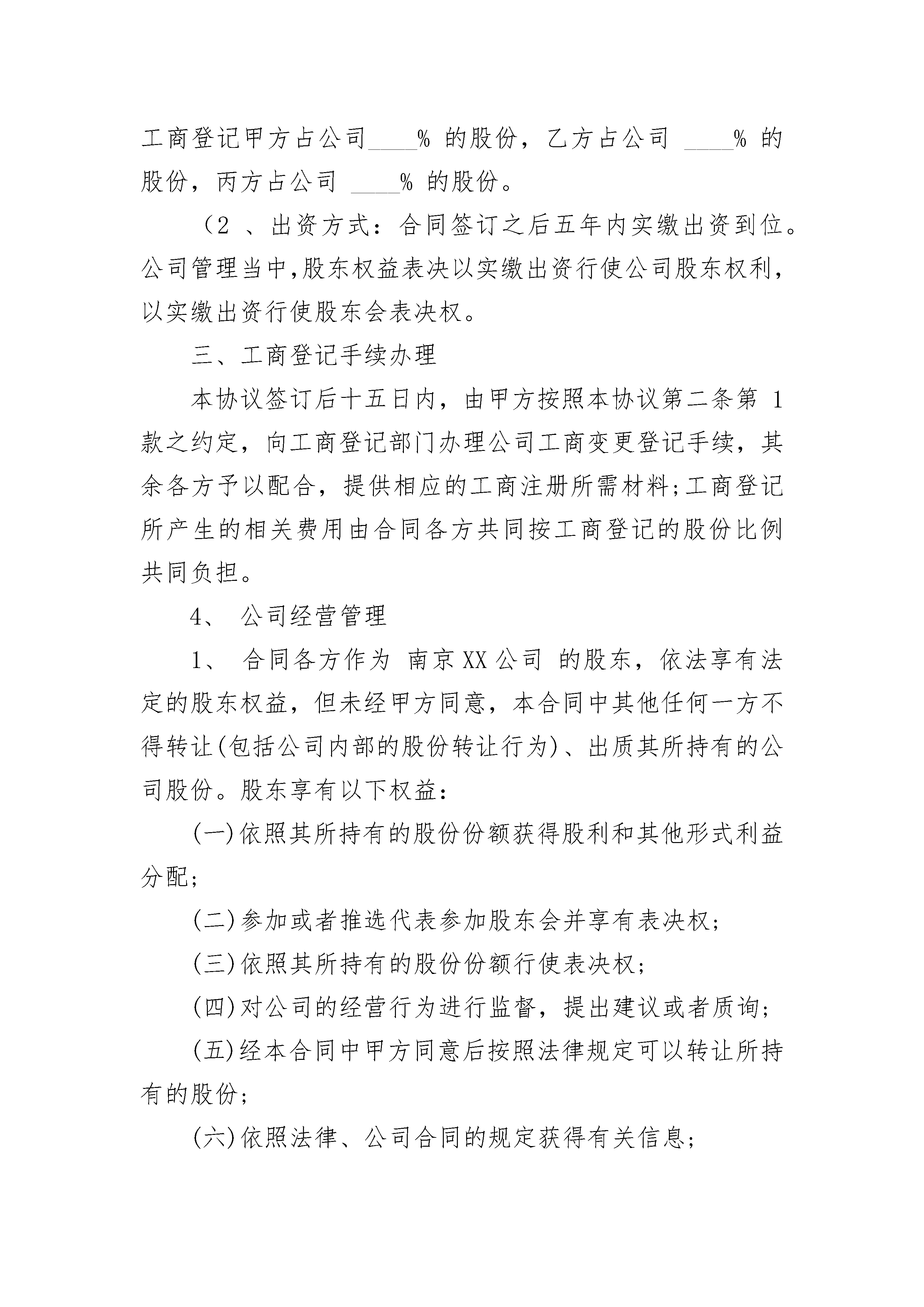 共同投资入股协议书共同投资入股协议书(通用3篇)共同投资入股协议书篇1甲方:________________,身份证号:________________乙方:________________,身份证号:________________丙方:________________,身份证号:________________以上各方共同投资人(以下简称“共同投资人”)经友好协商,根据《中华人民共和国公司法》、《中华人民共和国民法典》等相关法律、法规的规定,双方本着互惠互利的原则,甲方为激励本合同其他各方,就三方合作投资________公司(下称____________公司(20__万元))事宜达成如下协议,以共同遵守。1、公司概况:(1)甲乙丙三方共同投资设立____________公司,公司注册资本____________万元。(2)公司的经营范围:(3)公司设立董事会,由________出任董事长,________、________为董事,监事一名为________。2、公司股份及出资:(1)公司股份:公司注册资本为____________万元,工商登记甲方占公司____%的股份,乙方占公司____%的股份,丙方占公司____%的股份。(2、出资方式:合同签订之后五年内实缴出资到位。公司管理当中,股东权益表决以实缴出资行使公司股东权利,以实缴出资行使股东会表决权。三、工商登记手续办理本协议签订后十五日内,由甲方按照本协议第二条第1款之约定,向工商登记部门办理公司工商变更登记手续,其余各方予以配合,提供相应的工商注册所需材料;工商登记所产生的相关费用由合同各方共同按工商登记的股份比例共同负担。4、公司经营管理1、合同各方作为南京XX公司的股东,依法享有法定的股东权益,但未经甲方同意,本合同中其他任何一方不得转让(包括公司内部的股份转让行为)、出质其所持有的公司股份。股东享有以下权益:(一)依照其所持有的股份份额获得股利和其他形式利益分配;(二)参加或者推选代表参加股东会并享有表决权;(三)依照其所持有的股份份额行使表决权;(四)对公司的经营行为进行监督,提出建议或者质询;(五)经本合同中甲方同意后按照法律规定可以转让所持有的股份;(六)依照法律、公司合同的规定获得有关信息;(七)公司终止或者清算时,按其所持有的股份份额参加公司剩余财产的分配;(八)法律、行政法规及公司合同所赋予的其他权利。2、合同项下各方一致确认由梨花出任公司的法定代表人,在公司任董事长一职;聘请李X作为总经理,负责公司日常管理。另外股东还应履行以下义务:(一)按照合同的约定足额出资的义务;(二)遵守公司章程;(三)对公司以及其他股东诚实守信义务;(四)公司注册登记后,不得擅自撤回出资;(五)积极履行公司股东会决议,不得损害公司利益;(六)在其职责范围内行使权利,不得越权;(七)非经公司合同规定或者董事会批准,不得同公司订立合同或者进行交易;(八)不得直接或间接参与与公司业务属同一或类似性质的商业行为,或从事损害公司利益的活动;(九)不得利用职权收受贿赂或取得其他非法收入,不得侵占公司财产;(十)不得挪用公司资金,或擅自将公司资金拆借给其他机构;(十一)未经股东会批准,不得接受与公司交易有关的佣金;(十二)不得将公司资产以其个人或其他个人名义开立帐户储存;(十三)不得以公司资产为公司的股东或其他个人的债务提供担保;(十四)未经股东会同意,不得泄露公司秘密。3、股东大会、执行董事、监事职责(一)股东大会行使以下职权(1)决定公司的经营方针和投资计划;(2)选举和更换董事,决定有关董事的报酬事项;(3)选举和更换由股东代表出任的监事,决定有关监事的报酬事项;(4)审议批准执行董事的报告;(5)审议批准监事的报告;(6)审议批准公司的年度财务预算方案、决算方案;(7)审议批准公司的利润分配方案和弥补亏损方案;(8)对公司增加或者减少注册资本作出决议;(9)对发行公司债券作出决议;(10)对股东向股东以外的人转让出资作出决议;(11)对公司合并、分立、变更形式、解散和清算等事项作出决议;(12)修改公司合同;(13)其他重要事项。(二)董事会职权(1)召集股东会会议,并向股东会报告工作;(2)执行股东会的决议;(3)决定公司的经营计划和投资方案;(4)制订公司的年度财务预算方案、决算方案;(5)制订公司的利润分配方案和弥补亏损方案;(6)制订公司增加或者减少注册资本以及发行公司债券的方案;(7)制订公司合并、分立、解散或者变更公司形式的方案;(8)决定公司内部管理机构的设置;(9)决定聘任或者解聘公司经理及其报酬事项,并根据经理的提名决定聘任或者解聘公司副经理、财务负责人及其报酬事项;(10)制定公司的基本管理制度;(11)公司章程规定的其他职权。(三)监事的职责(1)有