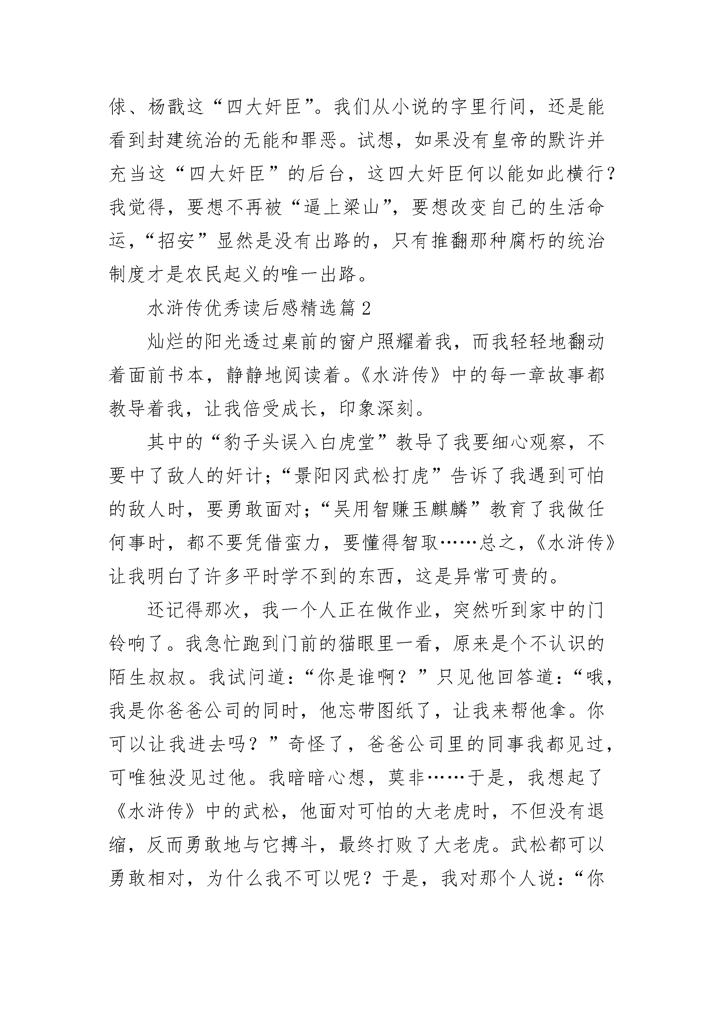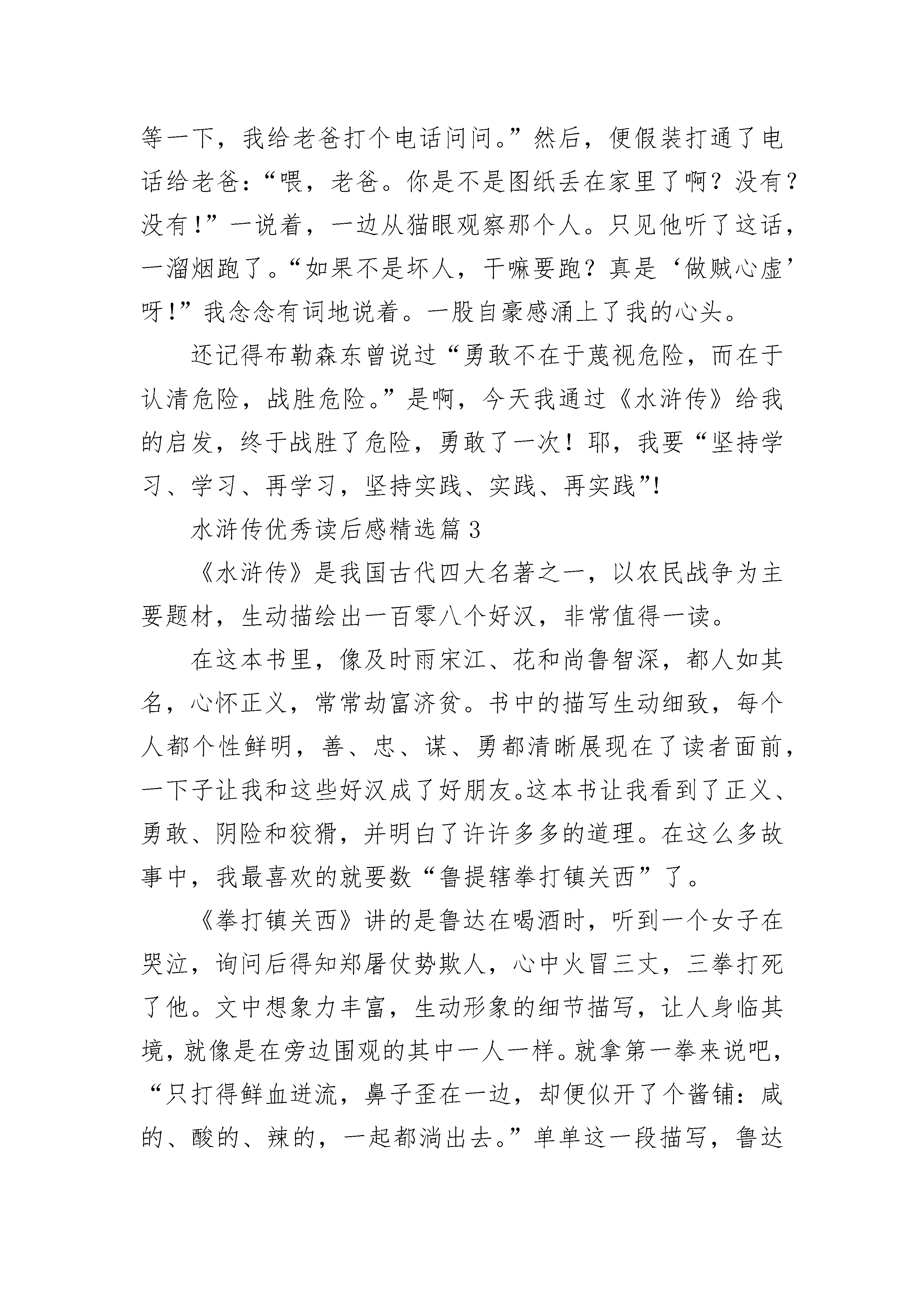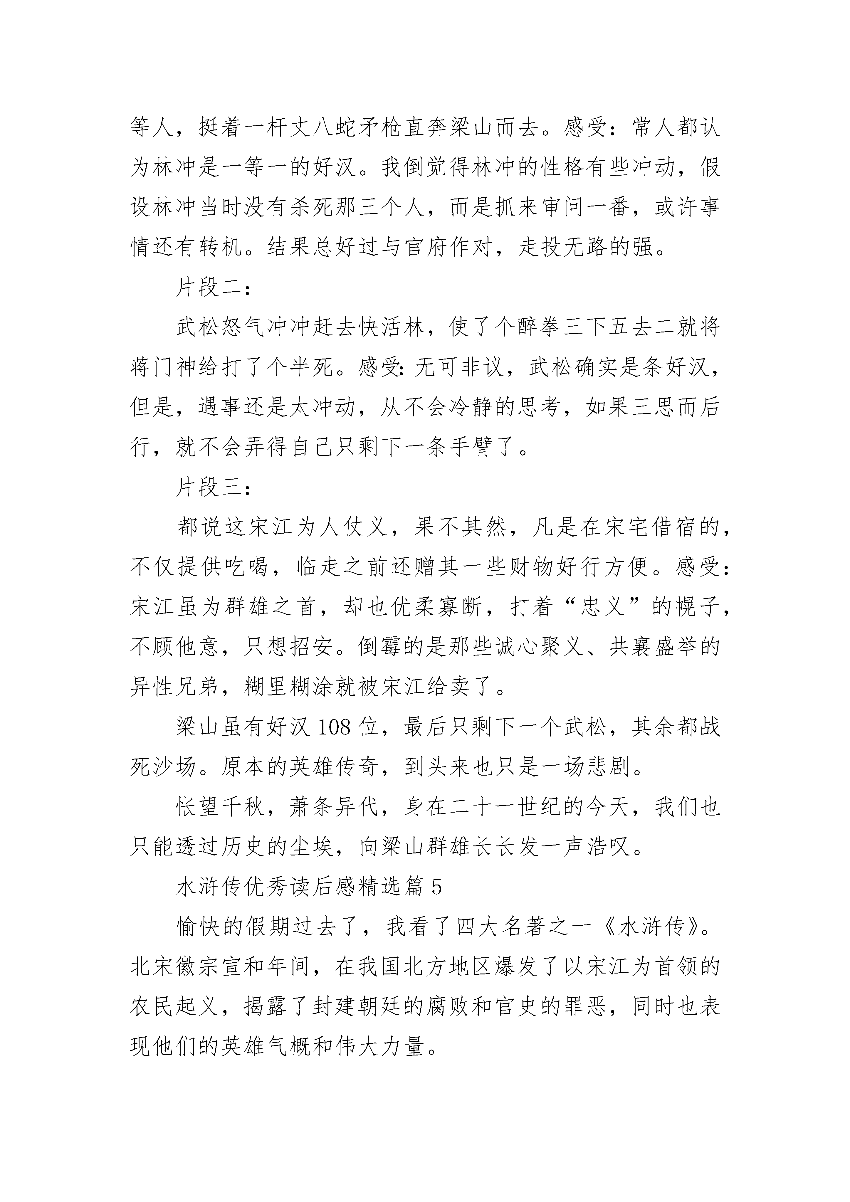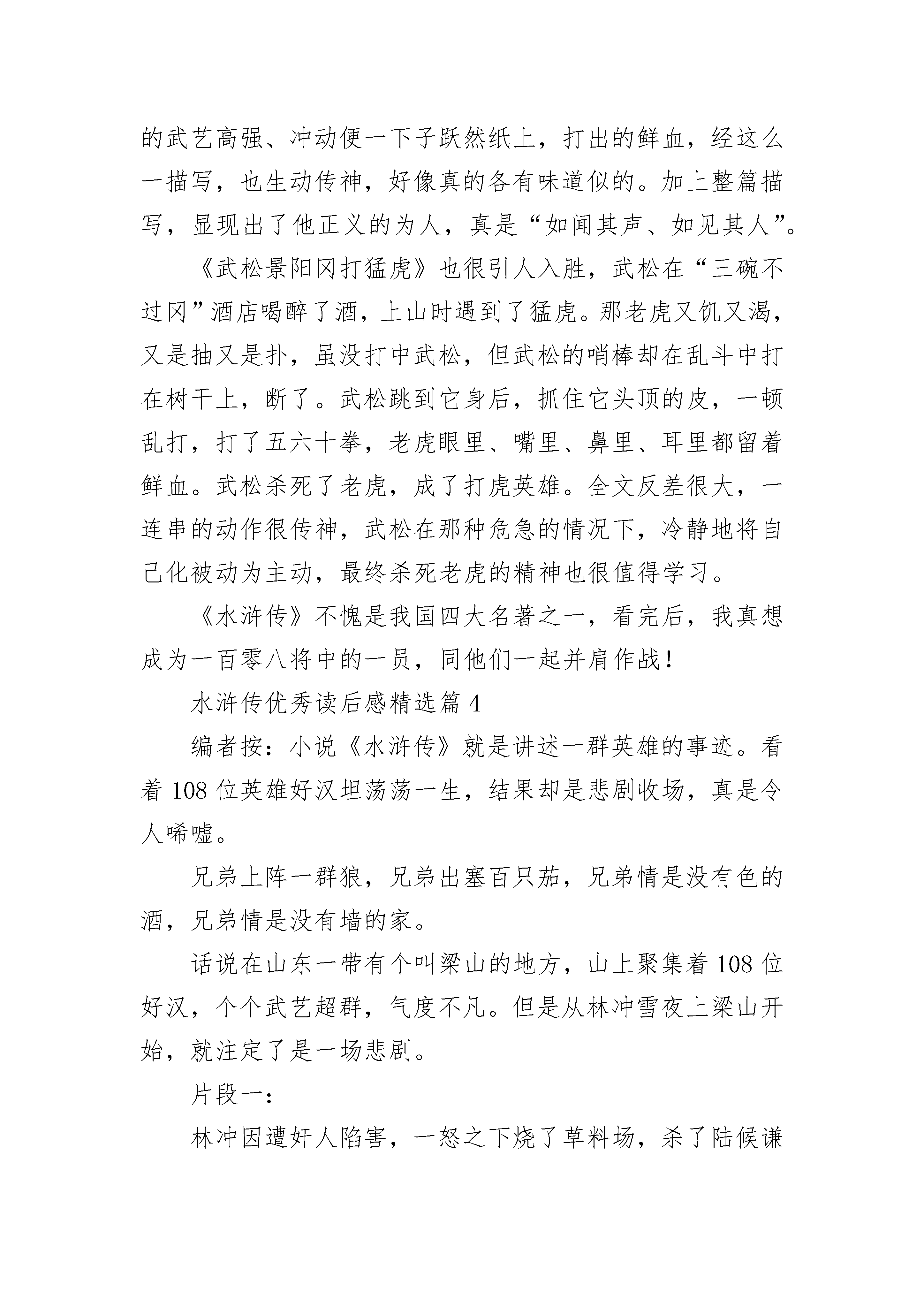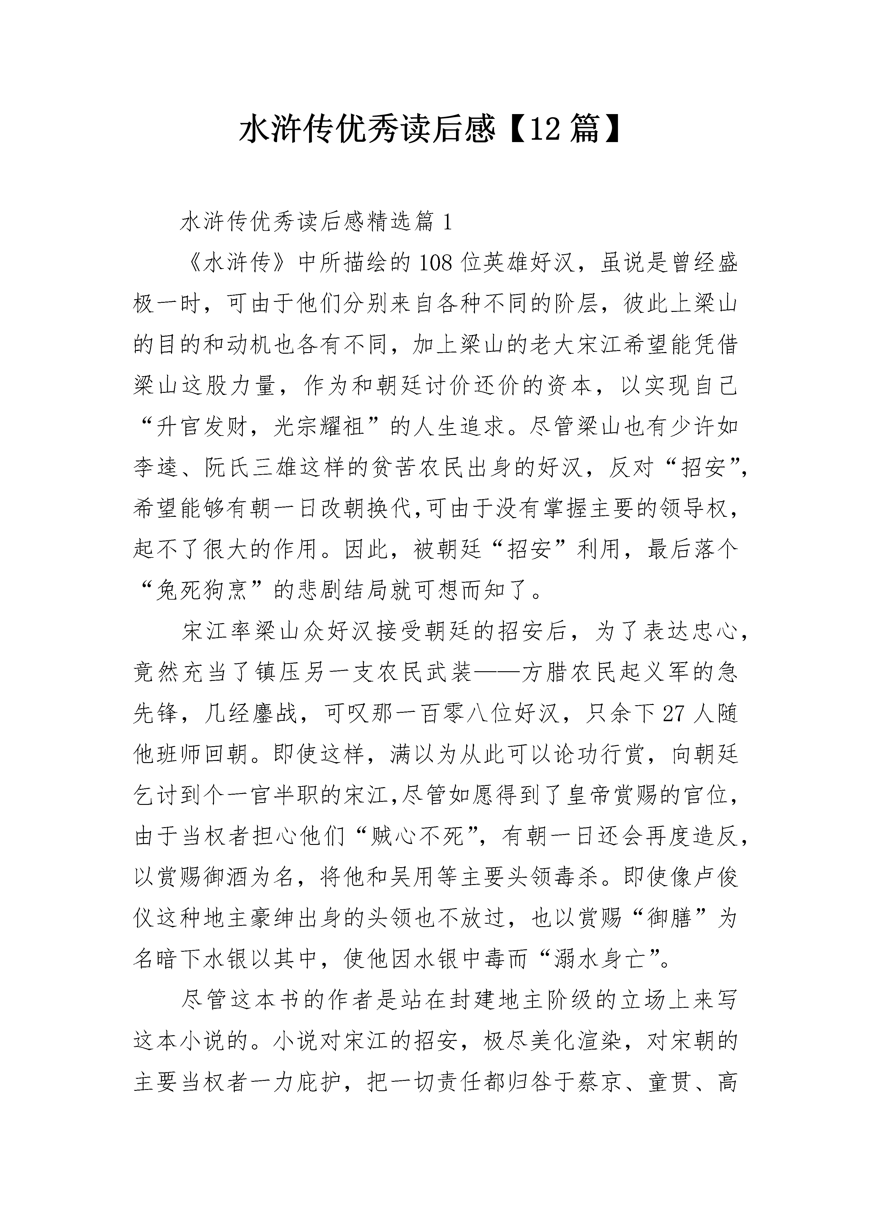 水浒传优秀读后感【12篇】水浒传优秀读后感精选篇1《水浒传》中所描绘的108位英雄好汉,虽说是曾经盛极一时,可由于他们分别来自各种不同的阶层,彼此上梁山的目的和动机也各有不同,加上梁山的老大宋江希望能凭借梁山这股力量,作为和朝廷讨价还价的资本,以实现自己“升官发财,光宗耀祖”的人生追求。尽管梁山也有少许如李逵、阮氏三雄这样的贫苦农民出身的好汉,反对“招安”,希望能够有朝一日改朝换代,可由于没有掌握主要的领导权,起不了很大的作用。因此,被朝廷“招安”利用,最后落个“兔死狗烹”的悲剧结局就可想而知了。宋江率梁山众好汉接受朝廷的招安后,为了表达忠心,竟然充当了镇压另一支农民武装——方腊农民起义军的急先锋,几经鏖战,可叹那一百零八位好汉,只余下27人随他班师回朝。即使这样,满以为从此可以论功行赏,向朝廷乞讨到个一官半职的宋江,尽管如愿得到了皇帝赏赐的官位,由于当权者担心他们“贼心不死”,有朝一日还会再度造反,以赏赐御酒为名,将他和吴用等主要头领毒杀。即使像卢俊仪这种地主豪绅出身的头领也不放过,也以赏赐“御膳”为名暗下水银以其中,使他因水银中毒而“溺水身亡”。尽管这本书的作者是站在封建地主阶级的立场上来写这本小说的。小说对宋江的招安,极尽美化渲染,对宋朝的主要当权者一力庇护,把一切责任都归咎于蔡京、童贯、高俅、杨戬这“四大奸臣”。我们从小说的字里行间,还是能看到封建统治的无能和罪恶。试想,如果没有皇帝的默许并充当这“四大奸臣”的后台,这四大奸臣何以能如此横行?我觉得,要想不再被“逼上梁山”,要想改变自己的生活命运,“招安”显然是没有出路的,只有推翻那种腐朽的统治制度才是农民起义的唯一出路。水浒传优秀读后感精选篇2灿烂的阳光透过桌前的窗户照耀着我,而我轻轻地翻动着面前书本,静静地阅读着。《水浒传》中的每一章故事都教导着我,让我倍受成长,印象深刻。其中的“豹子头误入白虎堂”教导了我要细心观察,不要中了敌人的奸计;“景阳冈武松打虎”告诉了我遇到可怕的敌人时,要勇敢面对;“吴用智赚玉麒麟”教育了我做任何事时,都不要凭借蛮力,要懂得智取……总之,《水浒传》让我明白了许多平时学不到的东西,这是异常可贵的。还记得那次,我一个人正在做作业,突然听到家中的门铃响了。我急忙跑到门前的猫眼里一看,原来是个不认识的陌生叔叔。我试问道:“你是谁啊?”只见他回答道:“哦,我是你爸爸公司的同时,他忘带图纸了,让我来帮他拿。你可以让我进去吗?”奇怪了,爸爸公司里的同事我都见过,可唯独没见过他。我暗暗心想,莫非……于是,我想起了《水浒传》中的武松,他面对可怕的大老虎时,不但没有退缩,反而勇敢地与它搏斗,最终打败了大老虎。武松都可以勇敢相对,为什么我不可以呢?于是,我对那个人说:“你等一下,我给老爸打个电话问问。”然后,便假装打通了电话给老爸:“喂,老爸。你是不是图纸丢在家里了啊?没有?没有!”一说着,一边从猫眼观察那个人。只见他听了这话,一溜烟跑了。“如果不是坏人,干嘛要跑?真是‘做贼心虚’呀!”我念念有词地说着。一股自豪感涌上了我的心头。还记得布勒森东曾说过“勇敢不在于蔑视危险,而在于认清危险,战胜危险。”是啊,今天我通过《水浒传》给我的启发,终于战胜了危险,勇敢了一次!耶,我要“坚持学习、学习、再学习,坚持实践、实践、再实践”!水浒传优秀读后感精选篇3《水浒传》是我国古代四大名著之一,以农民战争为主要题材,生动描绘出一百零八个好汉,非常值得一读。在这本书里,像及时雨宋江、花和尚鲁智深,都人如其名,心怀正义,常常劫富济贫。书中的描写生动细致,每个人都个性鲜明,善、忠、谋、勇都清晰展现在了读者面前,一下子让我和这些好汉成了好朋友。这本书让我看到了正义、勇敢、阴险和狡猾,并明白了许许多多的道理。在这么多故事中,我最喜欢的就要数“鲁提辖拳打镇关西”了。《拳打镇关西》讲的是鲁达在喝酒时,听到一个女子在哭泣,询问后得知郑屠仗势欺人,心中火冒三丈,三拳打死了他。文中想象力丰富,生动形象的细节描写,让人身临其境,就像是在旁边围观的其中一人一样。就拿第一拳来说吧,“只打得鲜血迸流,鼻子歪在一边,却便似开了个酱铺:咸的、酸的、辣的,一起都淌出去。”单单这一段描写,鲁达的武艺高强、冲动便一下子跃然纸上,打出的鲜血,经这么一描写,也生动传神,好像真的各有味道似的。加上整篇描写,显现出了他正义的为人,真是“如闻其声、如见其人”。《武松景阳冈打猛虎》也很引人入胜,武松在“三碗不过冈”酒店喝醉了酒,上山时遇到了猛虎。那老虎又饥又渴,又是抽又是扑,虽没打中武松,但武松的哨棒却在乱斗中打在树干上,断了。武松跳到它身后,抓住它头顶的皮,一顿乱打,打了五六十拳,老虎眼里、嘴里、鼻里、耳里都留着鲜血。武松杀死了老虎,成了打虎英雄。全文反差很大,一连串的动作很传神,武松在那种危急的情况下,冷静地将自己化