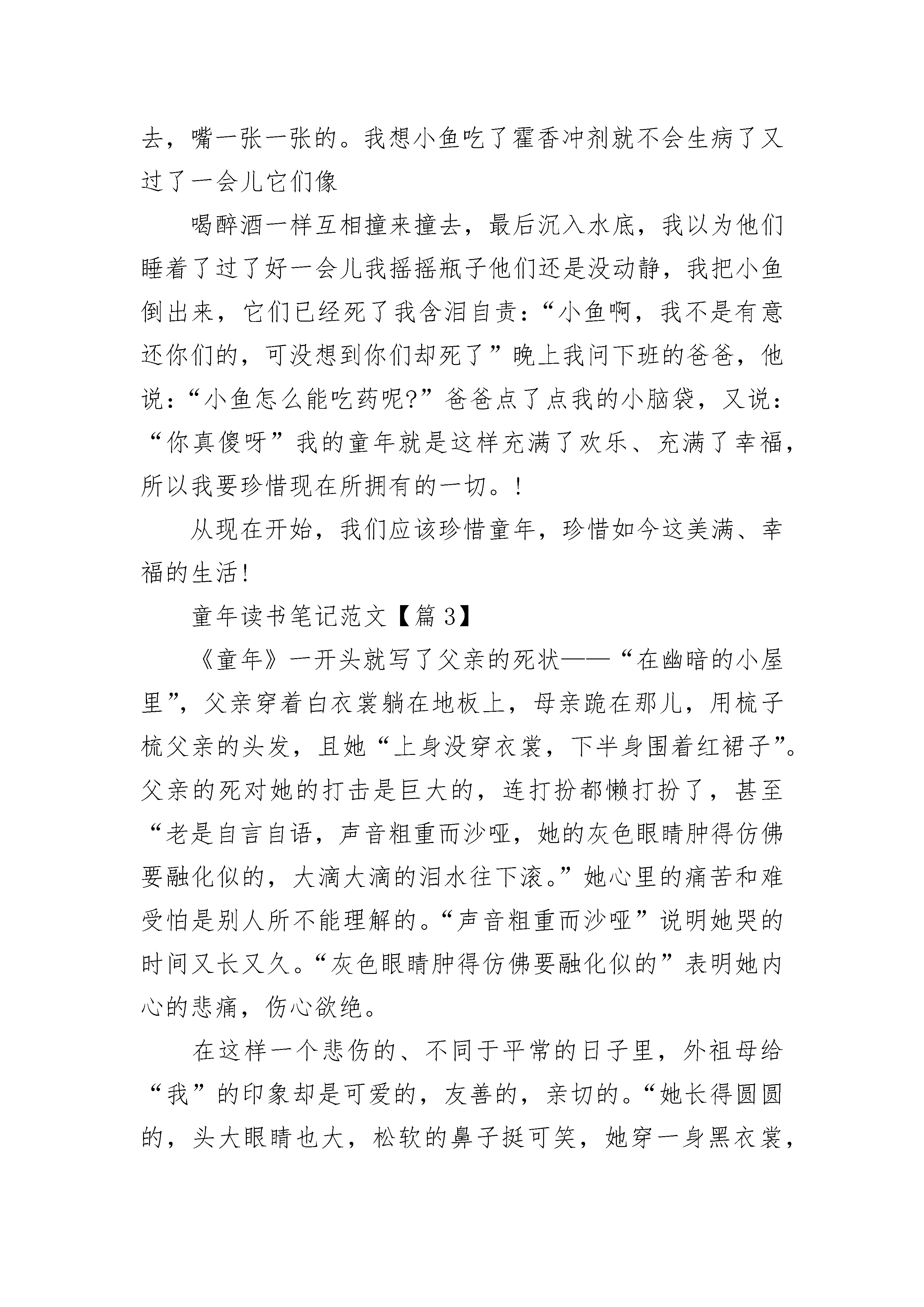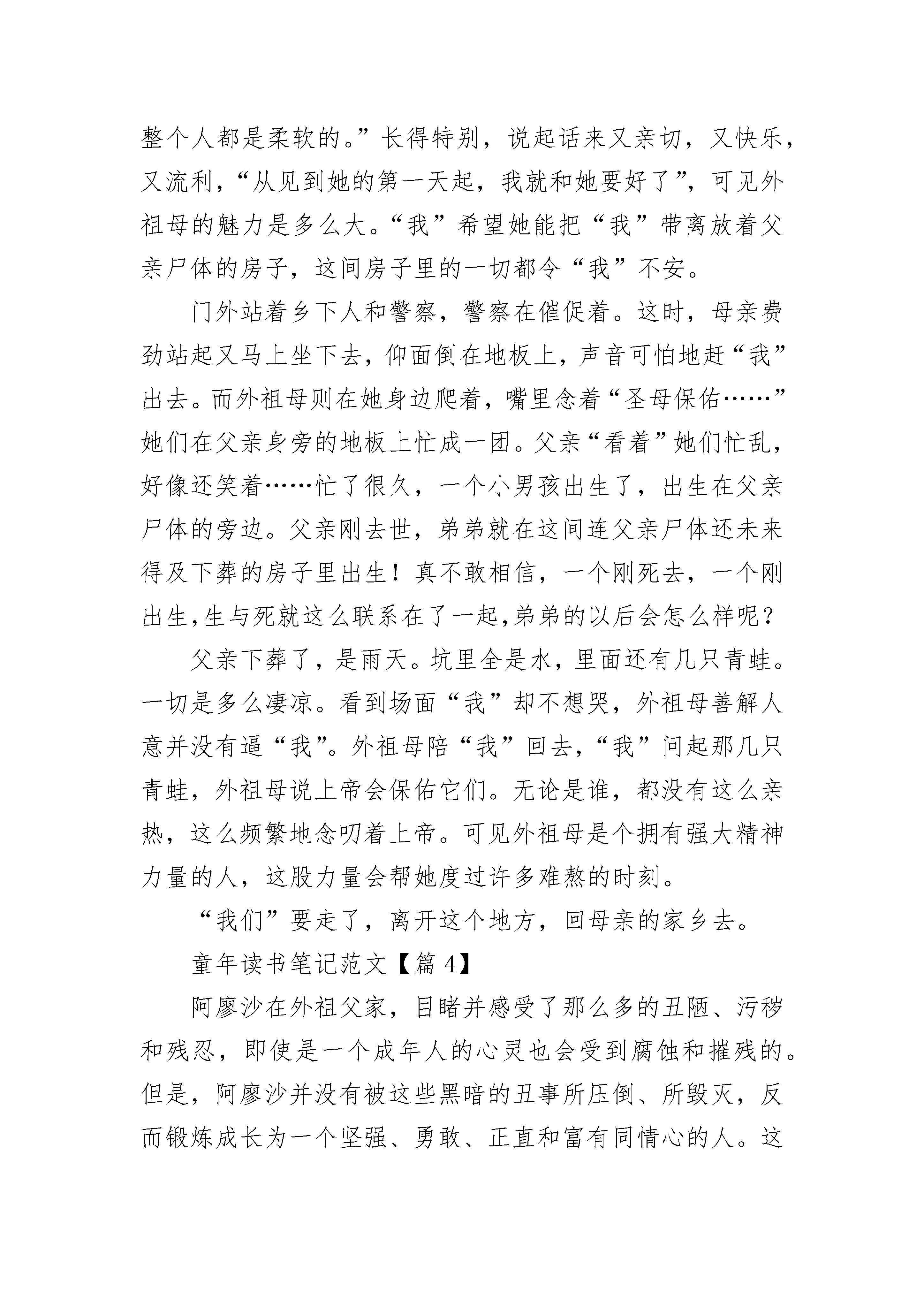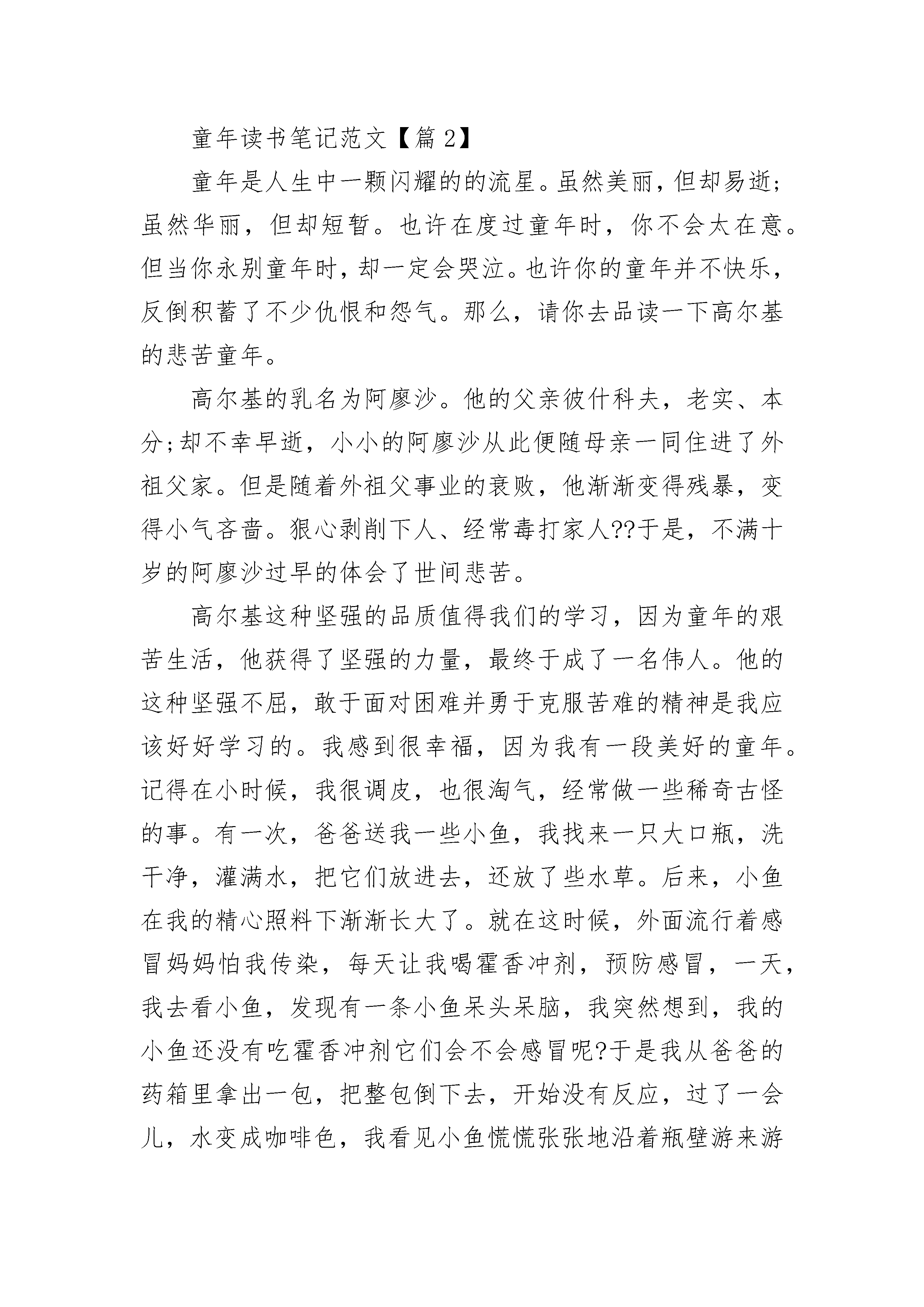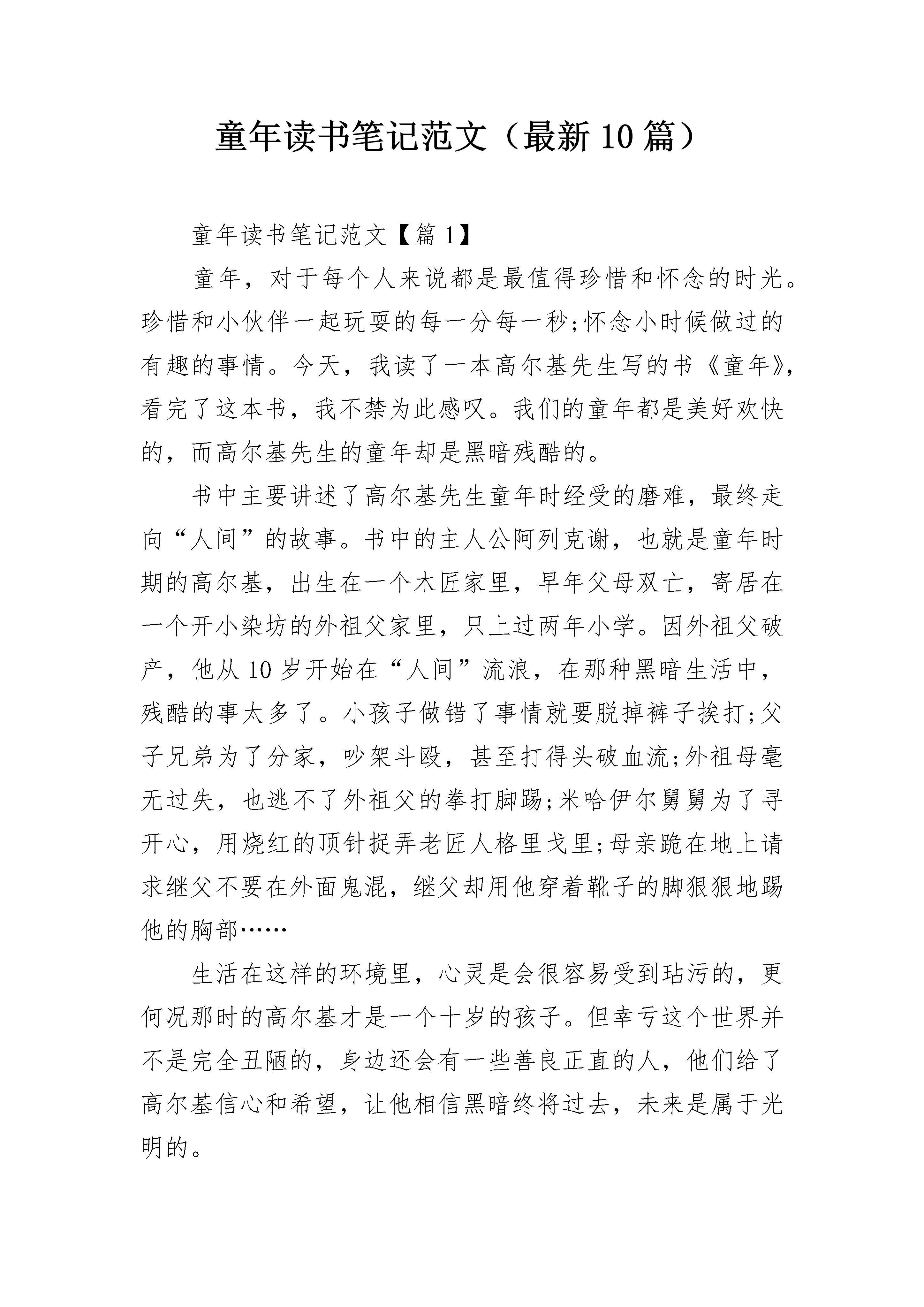 童年读书笔记范文(最新10篇)童年读书笔记范文【篇1】童年,对于每个人来说都是最值得珍惜和怀念的时光。珍惜和小伙伴一起玩耍的每一分每一秒;怀念小时候做过的有趣的事情。今天,我读了一本高尔基先生写的书《童年》,看完了这本书,我不禁为此感叹。我们的童年都是美好欢快的,而高尔基先生的童年却是黑暗残酷的。书中主要讲述了高尔基先生童年时经受的磨难,最终走向“人间”的故事。书中的主人公阿列克谢,也就是童年时期的高尔基,出生在一个木匠家里,早年父母双亡,寄居在一个开小染坊的外祖父家里,只上过两年小学。因外祖父破产,他从10岁开始在“人间”流浪,在那种黑暗生活中,残酷的事太多了。小孩子做错了事情就要脱掉裤子挨打;父子兄弟为了分家,吵架斗殴,甚至打得头破血流;外祖母毫无过失,也逃不了外祖父的拳打脚踢;米哈伊尔舅舅为了寻开心,用烧红的顶针捉弄老匠人格里戈里;母亲跪在地上请求继父不要在外面鬼混,继父却用他穿着靴子的脚狠狠地踢他的胸部……生活在这样的环境里,心灵是会很容易受到玷污的,更何况那时的高尔基才是一个十岁的孩子。但幸亏这个世界并不是完全丑陋的,身边还会有一些善良正直的人,他们给了高尔基信心和希望,让他相信黑暗终将过去,未来是属于光明的。童年读书笔记范文【篇2】童年是人生中一颗闪耀的的流星。虽然美丽,但却易逝;虽然华丽,但却短暂。也许在度过童年时,你不会太在意。但当你永别童年时,却一定会哭泣。也许你的童年并不快乐,反倒积蓄了不少仇恨和怨气。那么,请你去品读一下高尔基的悲苦童年。高尔基的乳名为阿廖沙。他的父亲彼什科夫,老实、本分;却不幸早逝,小小的阿廖沙从此便随母亲一同住进了外祖父家。但是随着外祖父事业的衰败,他渐渐变得残暴,变得小气吝啬。狠心剥削下人、经常毒打家人??于是,不满十岁的阿廖沙过早的体会了世间悲苦。高尔基这种坚强的品质值得我们的学习,因为童年的艰苦生活,他获得了坚强的力量,最终于成了一名伟人。他的这种坚强不屈,敢于面对困难并勇于克服苦难的精神是我应该好好学习的。我感到很幸福,因为我有一段美好的童年。记得在小时候,我很调皮,也很淘气,经常做一些稀奇古怪的事。有一次,爸爸送我一些小鱼,我找来一只大口瓶,洗干净,灌满水,把它们放进去,还放了些水草。后来,小鱼在我的精心照料下渐渐长大了。就在这时候,外面流行着感冒妈妈怕我传染,每天让我喝霍香冲剂,预防感冒,一天,我去看小鱼,发现有一条小鱼呆头呆脑,我突然想到,我的小鱼还没有吃霍香冲剂它们会不会感冒呢?于是我从爸爸的药箱里拿出一包,把整包倒下去,开始没有反应,过了一会儿,水变成咖啡色,我看见小鱼慌慌张张地沿着瓶壁游来游去,嘴一张一张的。我想小鱼吃了霍香冲剂就不会生病了又过了一会儿它们像喝醉酒一样互相撞来撞去,最后沉入水底,我以为他们睡着了过了好一会儿我摇摇瓶子他们还是没动静,我把小鱼倒出来,它们已经死了我含泪自责:“小鱼啊,我不是有意还你们的,可没想到你们却死了”晚上我问下班的爸爸,他说:“小鱼怎么能吃药呢?”爸爸点了点我的小脑袋,又说:“你真傻呀”我的童年就是这样充满了欢乐、充满了幸福,所以我要珍惜现在所拥有的一切。!从现在开始,我们应该珍惜童年,珍惜如今这美满、幸福的生活!童年读书笔记范文【篇3】《童年》一开头就写了父亲的死状——“在幽暗的小屋里”,父亲穿着白衣裳躺在地板上,母亲跪在那儿,用梳子梳父亲的头发,且她“上身没穿衣裳,下半身围着红裙子”。父亲的死对她的打击是巨大的,连打扮都懒打扮了,甚至“老是自言自语,声音粗重而沙哑,她的灰色眼睛肿得仿佛要融化似的,大滴大滴的泪水往下滚。”她心里的痛苦和难受怕是别人所不能理解的。“声音粗重而沙哑”说明她哭的时间又长又久。“灰色眼睛肿得仿佛要融化似的”表明她内心的悲痛,伤心欲绝。在这样一个悲伤的、不同于平常的日子里,外祖母给“我”的印象却是可爱的,友善的,亲切的。“她长得圆圆的,头大眼睛也大,松软的鼻子挺可笑,她穿一身黑衣裳,整个人都是柔软的。”长得特别,说起话来又亲切,又快乐,又流利,“从见到她的第一天起,我就和她要好了”,可见外祖母的魅力是多么大。“我”希望她能把“我”带离放着父亲尸体的房子,这间房子里的一切都令“我”不安。门外站着乡下人和警察,警察在催促着。这时,母亲费劲站起又马上坐下去,仰面倒在地板上,声音可怕地赶“我”出去。而外祖母则在她身边爬着,嘴里念着“圣母保佑……”她们在父亲身旁的地板上忙成一团。父亲“看着”她们忙乱,好像还笑着……忙了很久,一个小男孩出生了,出生在父亲尸体的旁边。父亲刚去世,弟弟就在这间连父亲尸体还未来得及下葬的房子里出生!真不敢相信,一个刚死去,一个刚出生,生与死就这么联系在了一起,弟弟的以后会怎么样呢?父亲下葬了,是雨天。坑里全是水,里面还有几只青蛙。一切是多么凄凉。看到场面“我”却不想哭,外祖母善解人意并