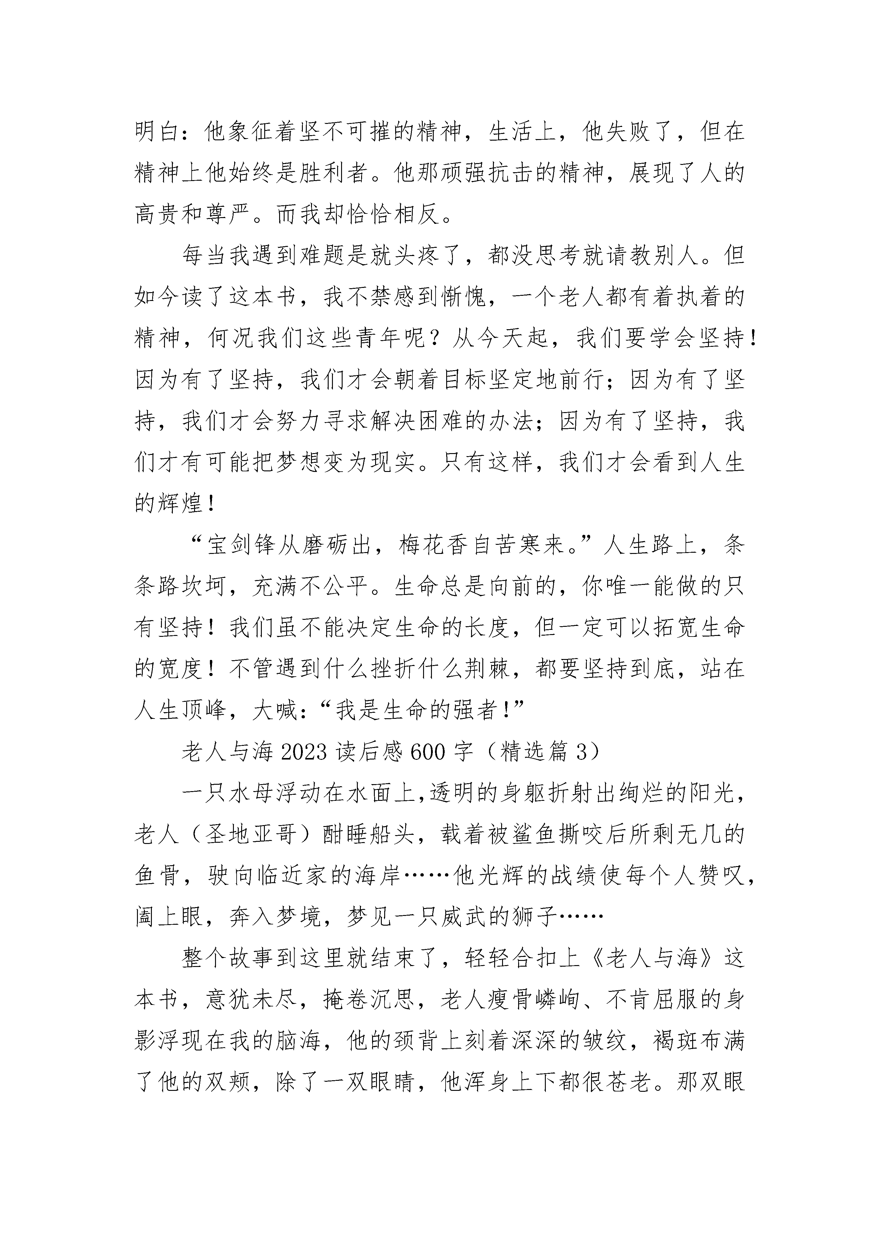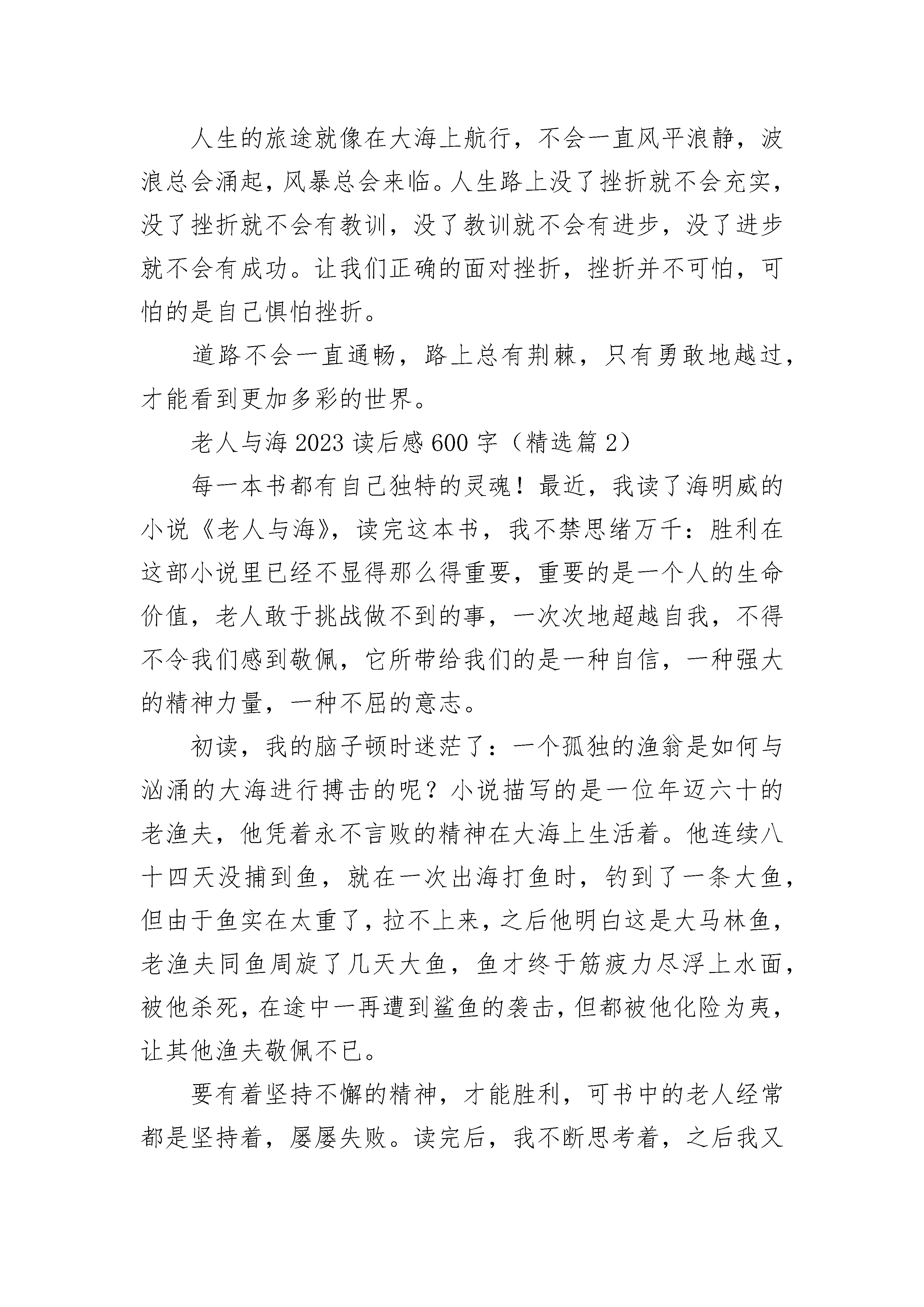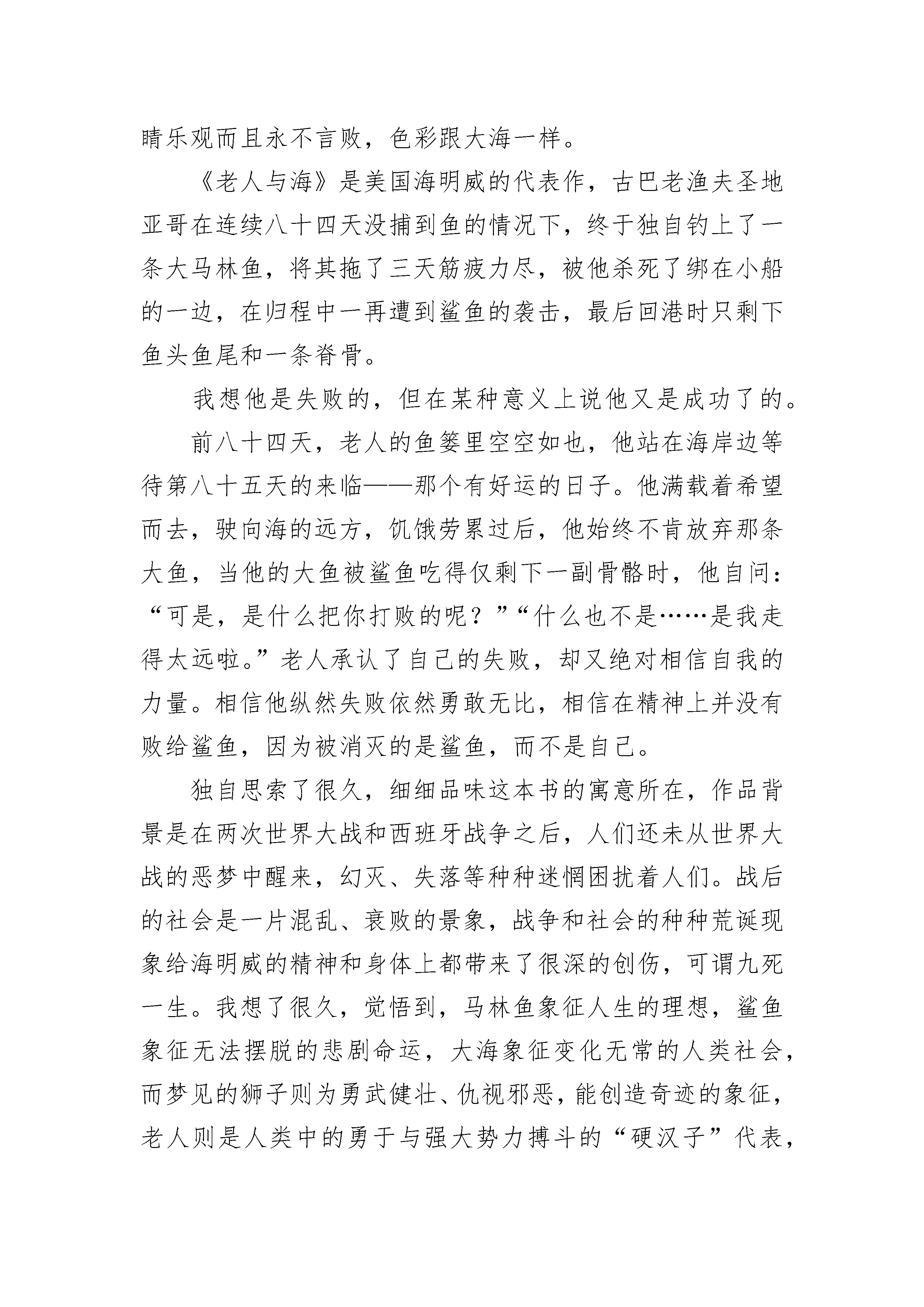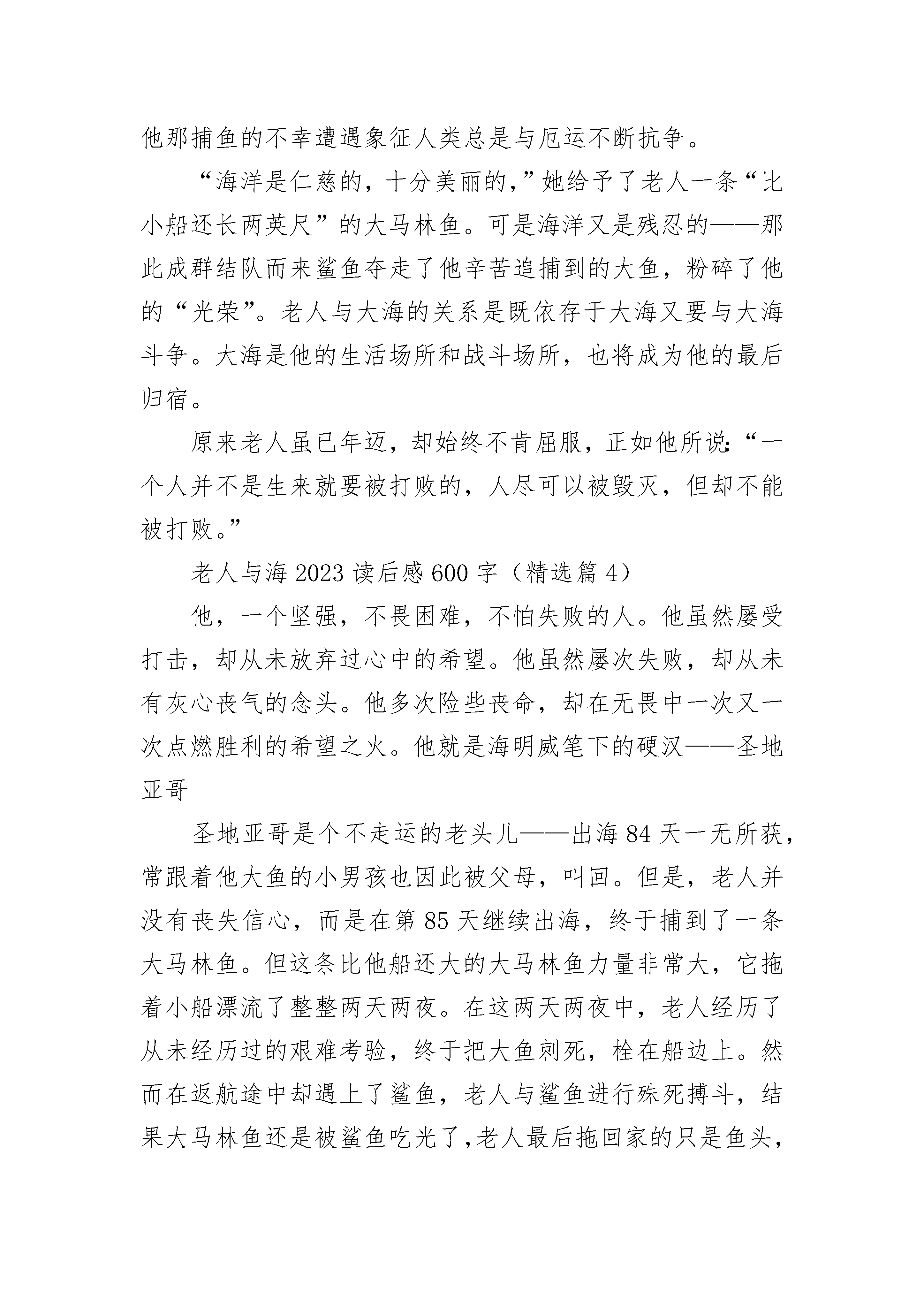 老人与海2023读后感600字(10篇)老人与海2023读后感600字(精选篇1)一个普普通通的老头竟然独自在海上与鲨鱼搏斗,一个无依无靠的老人竟然在海上和一条重达180英镑的大鱼周旋。一个年近花甲的老人竟带回一条比船都大的鱼。这位老人叫圣地亚哥,他在海上连续84天没有钓到鱼。起初,一个叫马洛林的男孩跟他出海,可是连续40天没打到鱼,男孩走了,第85天,老人再次出海,这次他把船开到很远的地方,他出乎意料地钓到了一条比船还大的鱼,老人和这条鱼周旋了两天,终于叉中了它,并用船艰难地拖回,但途中鱼却被鲨鱼吃个精光,最终鱼只剩下了一副巨大的鱼架。“人可以被毁灭,却不可以被打败”是出自于这本书中的经典名言,可是在现实生活中,我们中有的人当遇到挫折时是迎难而上,还是甘心被挫折打败呢?很多人在遇到了挫折时就会惧怕它,甚至连理都不理作文/,纵身跳下万丈深渊,这难道不是懦弱的表现吗?读了《老人与海》这本书后,每个人的心灵都会受到一种强烈的震撼。这种震撼便是圣地亚哥的那种坚持不懈、迎难而上和顽强不屈的精神特点。使人明白“不经一番彻骨寒,哪来梅花扑鼻香”的真正含义,使人想起“阳光总在一场风雨后”的真谛。在人生的旅途上,天空不会是一直蔚蓝的,草地不会是一直青绿的,花儿不会一直是芬芳的。人生的旅途就像在大海上航行,不会一直风平浪静,波浪总会涌起,风暴总会来临。人生路上没了挫折就不会充实,没了挫折就不会有教训,没了教训就不会有进步,没了进步就不会有成功。让我们正确的面对挫折,挫折并不可怕,可怕的是自己惧怕挫折。道路不会一直通畅,路上总有荆棘,只有勇敢地越过,才能看到更加多彩的世界。老人与海2023读后感600字(精选篇2)每一本书都有自己独特的灵魂!最近,我读了海明威的小说《老人与海》,读完这本书,我不禁思绪万千:胜利在这部小说里已经不显得那么得重要,重要的是一个人的生命价值,老人敢于挑战做不到的事,一次次地超越自我,不得不令我们感到敬佩,它所带给我们的是一种自信,一种强大的精神力量,一种不屈的意志。初读,我的脑子顿时迷茫了:一个孤独的渔翁是如何与汹涌的大海进行搏击的呢?小说描写的是一位年迈六十的老渔夫,他凭着永不言败的精神在大海上生活着。他连续八十四天没捕到鱼,就在一次出海打鱼时,钓到了一条大鱼,但由于鱼实在太重了,拉不上来,之后他明白这是大马林鱼,老渔夫同鱼周旋了几天大鱼,鱼才终于筋疲力尽浮上水面,被他杀死,在途中一再遭到鲨鱼的袭击,但都被他化险为夷,让其他渔夫敬佩不已。要有着坚持不懈的精神,才能胜利,可书中的老人经常都是坚持着,屡屡失败。读完后,我不断思考着,之后我又明白:他象征着坚不可摧的精神,生活上,他失败了,但在精神上他始终是胜利者。他那顽强抗击的精神,展现了人的高贵和尊严。而我却恰恰相反。每当我遇到难题是就头疼了,都没思考就请教别人。但如今读了这本书,我不禁感到惭愧,一个老人都有着执着的精神,何况我们这些青年呢?从今天起,我们要学会坚持!因为有了坚持,我们才会朝着目标坚定地前行;因为有了坚持,我们才会努力寻求解决困难的办法;因为有了坚持,我们才有可能把梦想变为现实。只有这样,我们才会看到人生的辉煌!“宝剑锋从磨砺出,梅花香自苦寒来。”人生路上,条条路坎坷,充满不公平。生命总是向前的,你唯一能做的只有坚持!我们虽不能决定生命的长度,但一定可以拓宽生命的宽度!不管遇到什么挫折什么荆棘,都要坚持到底,站在人生顶峰,大喊:“我是生命的强者!”老人与海2023读后感600字(精选篇3)一只水母浮动在水面上,透明的身躯折射出绚烂的阳光,老人(圣地亚哥)酣睡船头,载着被鲨鱼撕咬后所剩无几的鱼骨,驶向临近家的海岸……他光辉的战绩使每个人赞叹,阖上眼,奔入梦境,梦见一只威武的狮子……整个故事到这里就结束了,轻轻合扣上《老人与海》这本书,意犹未尽,掩卷沉思,老人瘦骨嶙峋、不肯屈服的身影浮现在我的脑海,他的颈背上刻着深深的皱纹,褐斑布满了他的双颊,除了一双眼睛,他浑身上下都很苍老。那双眼睛乐观而且永不言败,色彩跟大海一样。《老人与海》是美国海明威的代表作,古巴老渔夫圣地亚哥在连续八十四天没捕到鱼的情况下,终于独自钓上了一条大马林鱼,将其拖了三天筋疲力尽,被他杀死了绑在小船的一边,在归程中一再遭到鲨鱼的袭击,最后回港时只剩下鱼头鱼尾和一条脊骨。我想他是失败的,但在某种意义上说他又是成功了的。前八十四天,老人的鱼篓里空空如也,他站在海岸边等待第八十五天的来临——那个有好运的日子。他满载着希望而去,驶向海的远方,饥饿劳累过后,他始终不肯放弃那条大鱼,当他的大鱼被鲨鱼吃得仅剩下一副骨骼时,他自问:“可是,是什么把你打败的呢?”“什么也不是……是我走得太远啦。”老人承认了自己的失败,却又绝对相信自我的力量。相信他纵然失败依然勇敢无比,相信在精神上并没有败给鲨鱼,因为被