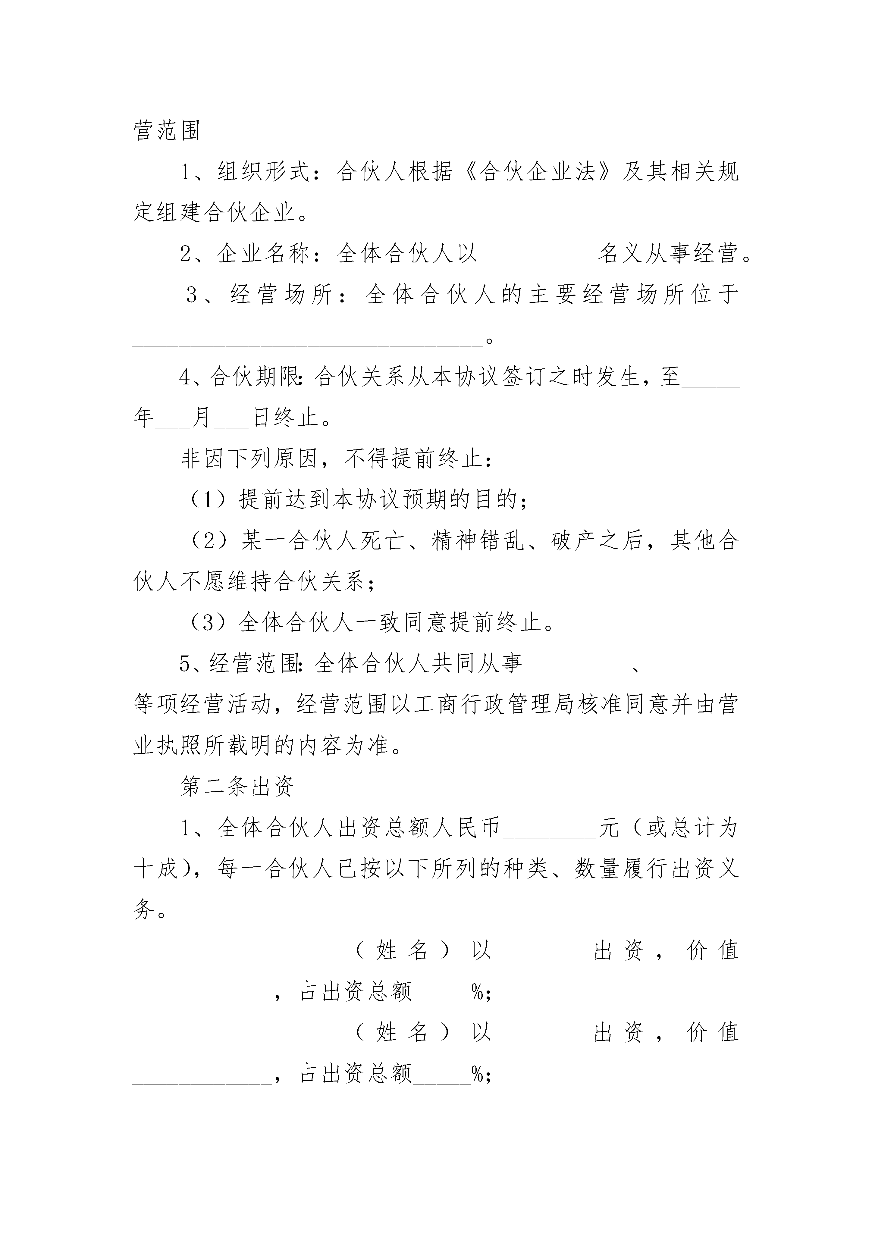 四人合伙投资协议书四人合伙投资协议书(精选22篇)四人合伙投资协议书篇1合伙人一:身份证号:住址:联系方式:合伙人二:身份证号:住址:联系方式:合伙人三:身份证号:住址:联系方式:合伙人四:身份证号:住址:联系方式:兹有_____、_____、_____、_____等人,为经营_______________而缔结本协议,当事人一致同意根据下列条款组建合伙企业。第一条组织形式、企业名称、经营场所、合伙期限、经营范围1、组织形式:合伙人根据《合伙企业法》及其相关规定组建合伙企业。2、企业名称:全体合伙人以__________名义从事经营。3、经营场所:全体合伙人的主要经营场所位于______________________________。4、合伙期限:合伙关系从本协议签订之时发生,至_____年___月___日终止。非因下列原因,不得提前终止:(1)提前达到本协议预期的目的;(2)某一合伙人死亡、精神错乱、破产之后,其他合伙人不愿维持合伙关系;(3)全体合伙人一致同意提前终止。5、经营范围:全体合伙人共同从事_________、________等项经营活动,经营范围以工商行政管理局核准同意并由营业执照所载明的内容为准。第二条出资1、全体合伙人出资总额人民币________元(或总计为十成),每一合伙人已按以下所列的种类、数量履行出资义务。____________(姓名)以_______出资,价值____________,占出资总额_____%;____________(姓名)以_______出资,价值____________,占出资总额_____%;____________(姓名)以_______出资,价值____________,占出资总额_____%;____________(姓名)以_______出资,价值____________,占出资总额_____%。合伙关系存续期间,为了扩大经营规模而有必要追回投资时,各合伙人自接到通知后_________日内,按上表所列的比例追回出资数额。以上出资为合伙人共有财产。2、合伙人除参与盈余分配外,不得因出资而要求其他报酬。3、合伙人的股权不得转让于本协议当事人以外的其他人。4、合伙人退伙时按退伙时的财产状况,根据本协议载明的出资比例和退伙人是否履行追回投资的义务返还出资。不能用实物返还的,应当允许折价返还现金。5、退伙人出卖已返还的财产时,本协议当事人在同等条件下有优先购买的权利。第三条盈余分配1、盈余是指每一会计年度内的营业总收入减去成本,并按营业总收入的____%,提前后备基金后的纯利润。2、纯利润的____%,按出资比例分配。纯利润的_____%,按工作量分配(工作量根据不同工种,由内部工作承包合同规定)。纯利润的___%,作为福利费用,按人数平均分配。3、本协议当事人均享有参加盈余分配的权利。4、盈余分配方案连同每会计年度经营收支明细账,在会计年度终止前的一个月公布。5、合伙人在分配方案公布之后,实施之前,可对分配方案和账目进行审核,任何人对分配方案持有异议,应由合伙人全体会议讨论裁决。第四条合伙事务的经营管理1、合伙事务由全体合伙人共同参与。若有争议,依半数以上的主导意见决定。合伙人无论出资数额大小,每人对合伙事务仅有一票表决权。2、全体合伙人推选______为合伙负责人,负责人根据过半数的主导意见制定执行方案,主管执行过程中的一切事务;负责人亦可提出经营方案,制定经营计划,交全体合伙人会议讨论通过。3、在合伙事务范围内,每一合伙人(或合伙负责人)都可以代表全体合伙人对外开展业务,每一合伙人(或合伙负责人)在经营业务范围内的活动由全体合伙人负责。4、合伙人处理合伙事务应像对待本人的事务一样慎重。5、合伙人处理合伙事务的劳动报酬由内部工作承包合同规定,合伙人不得以任何形式从经营体内索取回扣。6、合伙人有权在每月____日至___日查阅账簿,主管财会的合伙人不得拒绝。第五条合伙债务的分担1、合伙人按本协议第三条第二款所定的盈余分配比例(或出资比例)分组合伙债务,合伙人接到履行债务通知后应于_____日之内,将各自所应分担的份额,交给主管财会的合伙人。2、新的合伙人对他加入合伙前的合伙债务应按核定的出资比例和盈余分配比例分担清偿;退伙人对退伙时已存在的合伙债务,不论到期与否,都应承担清偿义务。第六条入伙与退伙1、接纳新的合伙人须由本协议当事人一致同意。2、合伙人在本协议存续期间不得声明退伙,但出现下列情形除外:(1)本协议第一条第四款所列的提前终止原因;(2)合伙经营连续在_____月内出现亏损;(3)一半以上的合伙人在表决中对合伙经营投不信任票。或者用下列规定:合伙人可以声明退伙,但在退伙前一个月应以书面形式向其他合伙人转达退伙意向。3、退伙时按本协议第七条规定进行清算。第七