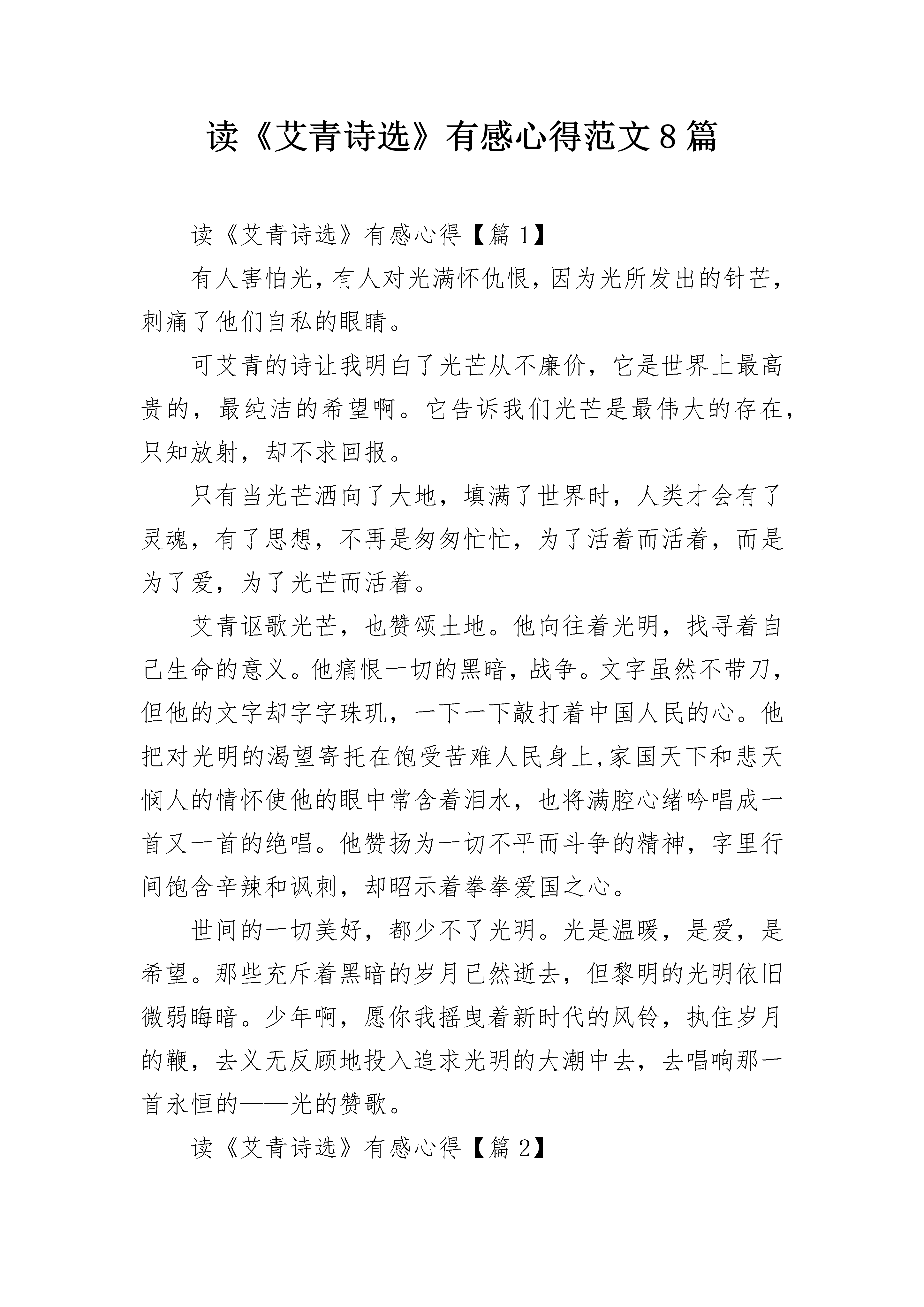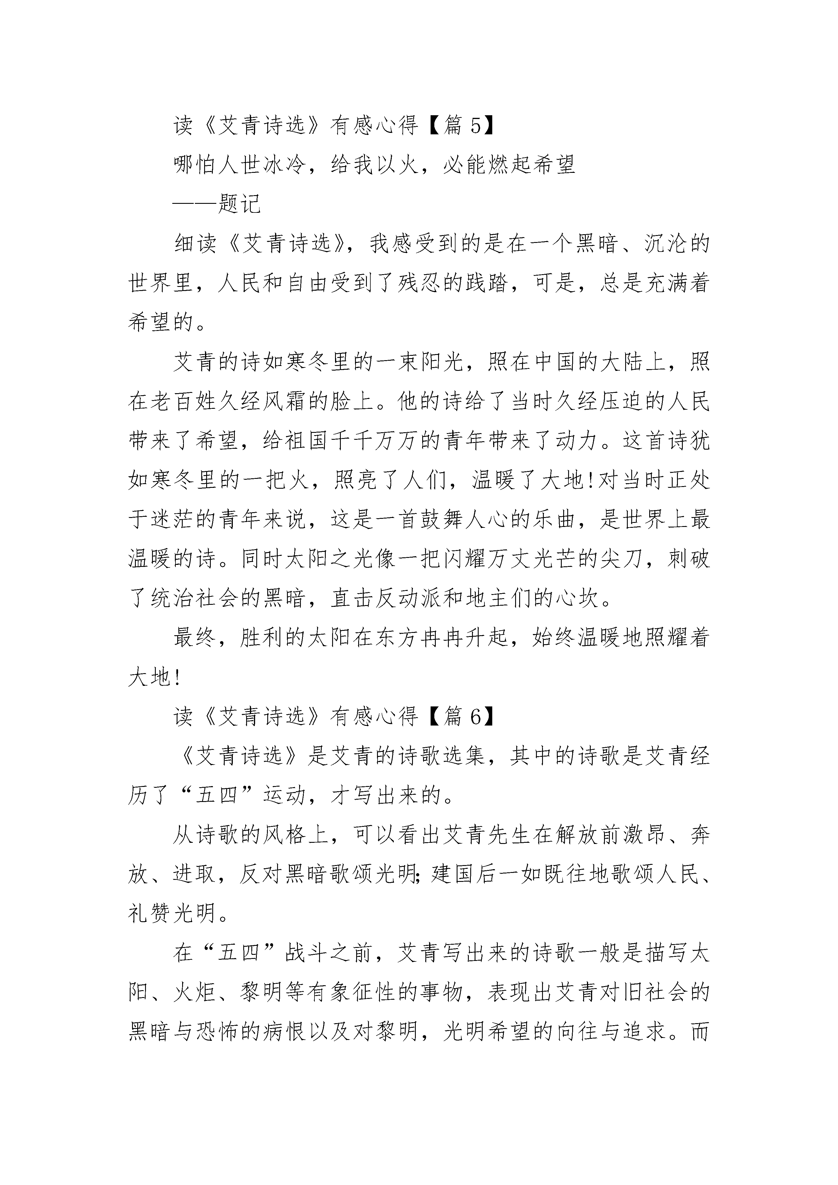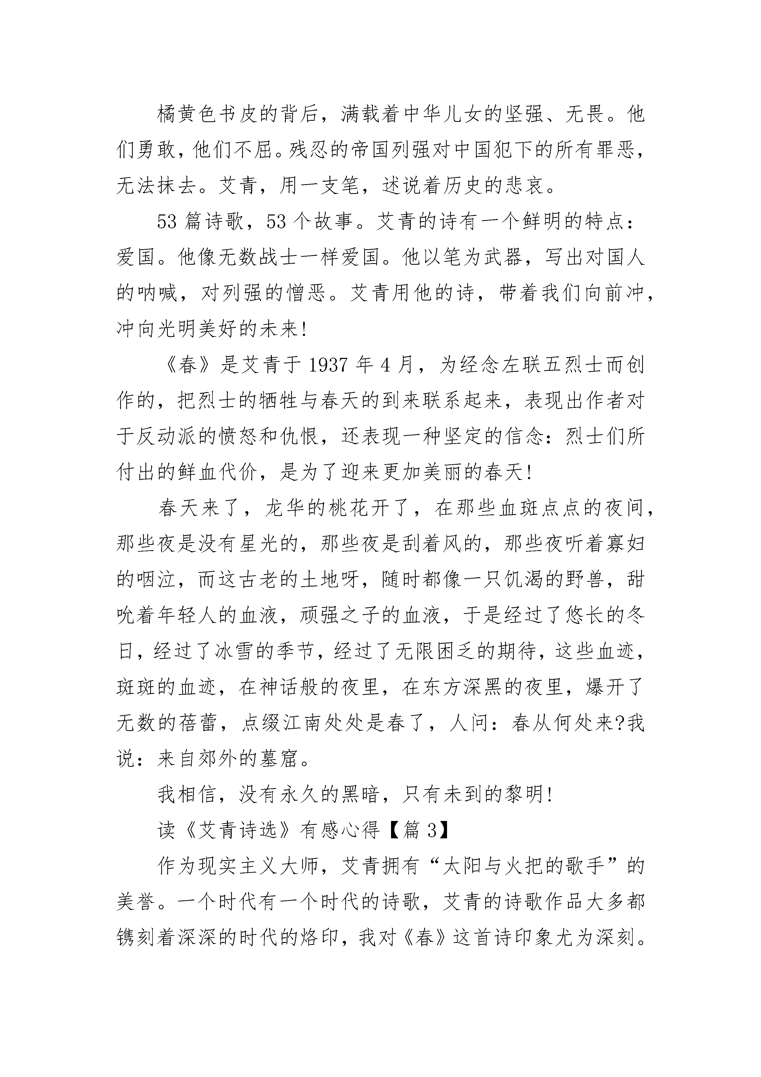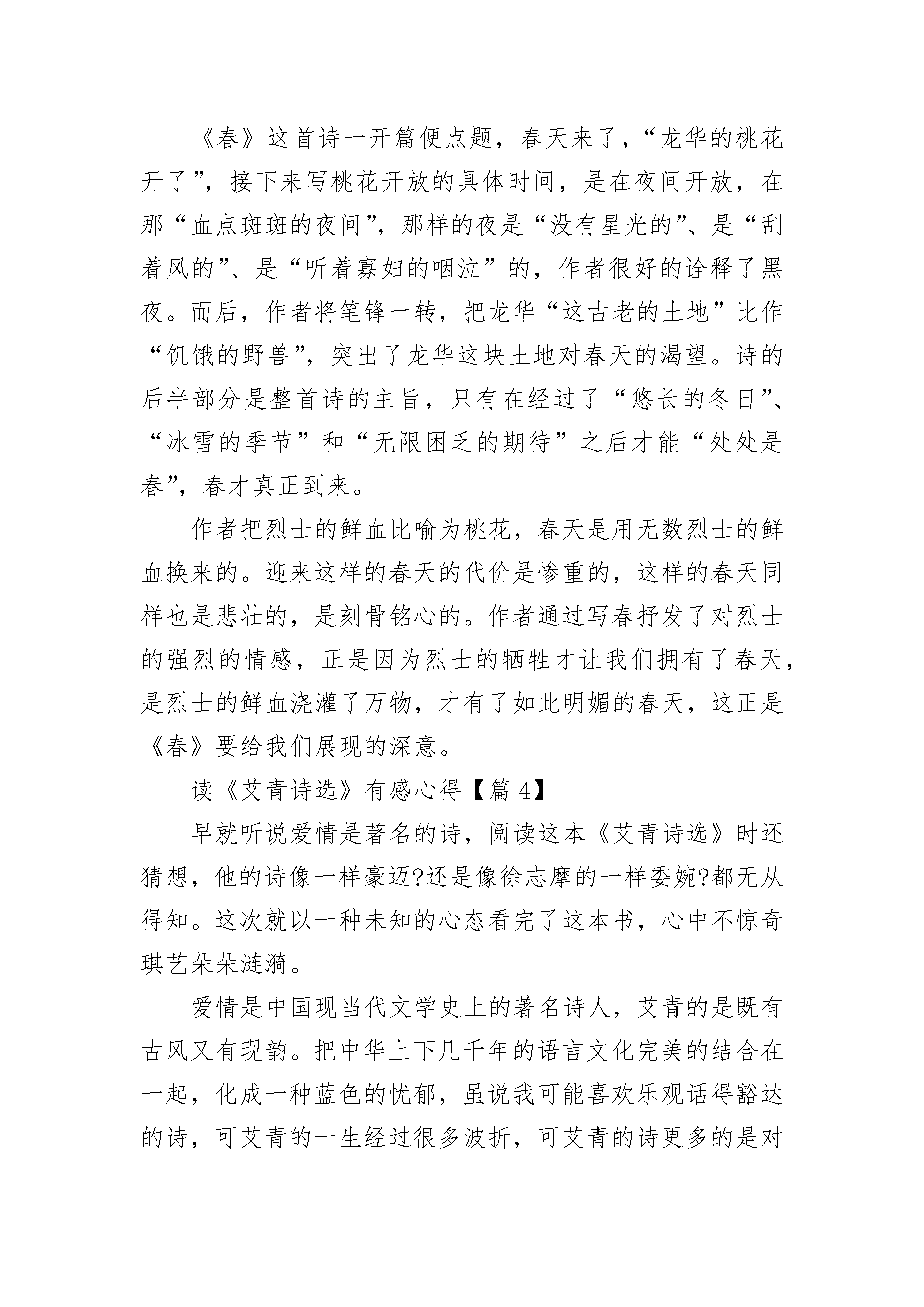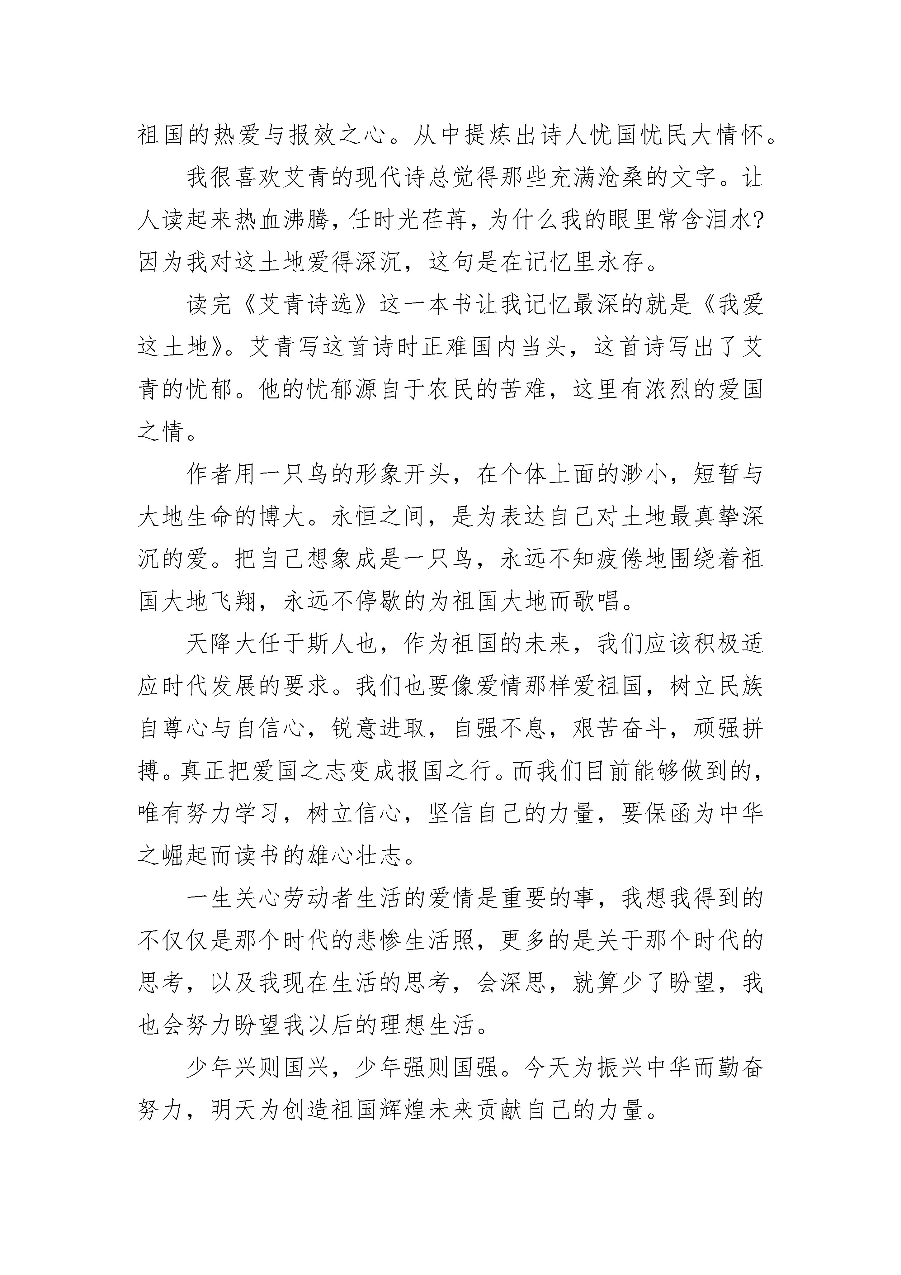 读《艾青诗选》有感心得范文8篇读《艾青诗选》有感心得【篇1】有人害怕光,有人对光满怀仇恨,因为光所发出的针芒,刺痛了他们自私的眼睛。可艾青的诗让我明白了光芒从不廉价,它是世界上最高贵的,最纯洁的希望啊。它告诉我们光芒是最伟大的存在,只知放射,却不求回报。只有当光芒洒向了大地,填满了世界时,人类才会有了灵魂,有了思想,不再是匆匆忙忙,为了活着而活着,而是为了爱,为了光芒而活着。艾青讴歌光芒,也赞颂土地。他向往着光明,找寻着自己生命的意义。他痛恨一切的黑暗,战争。文字虽然不带刀,但他的文字却字字珠玑,一下一下敲打着中国人民的心。他把对光明的渴望寄托在饱受苦难人民身上,家国天下和悲天悯人的情怀使他的眼中常含着泪水,也将满腔心绪吟唱成一首又一首的绝唱。他赞扬为一切不平而斗争的精神,字里行间饱含辛辣和讽刺,却昭示着拳拳爱国之心。世间的一切美好,都少不了光明。光是温暖,是爱,是希望。那些充斥着黑暗的岁月已然逝去,但黎明的光明依旧微弱晦暗。少年啊,愿你我摇曳着新时代的风铃,执住岁月的鞭,去义无反顾地投入追求光明的大潮中去,去唱响那一首永恒的——光的赞歌。读《艾青诗选》有感心得【篇2】橘黄色书皮的背后,满载着中华儿女的坚强、无畏。他们勇敢,他们不屈。残忍的帝国列强对中国犯下的所有罪恶,无法抹去。艾青,用一支笔,述说着历史的悲哀。53篇诗歌,53个故事。艾青的诗有一个鲜明的特点:爱国。他像无数战士一样爱国。他以笔为武器,写出对国人的呐喊,对列强的憎恶。艾青用他的诗,带着我们向前冲,冲向光明美好的未来!《春》是艾青于1937年4月,为经念左联五烈士而创作的,把烈士的牺牲与春天的到来联系起来,表现出作者对于反动派的愤怒和仇恨,还表现一种坚定的信念:烈士们所付出的鲜血代价,是为了迎来更加美丽的春天!春天来了,龙华的桃花开了,在那些血斑点点的夜间,那些夜是没有星光的,那些夜是刮着风的,那些夜听着寡妇的咽泣,而这古老的土地呀,随时都像一只饥渴的野兽,甜吮着年轻人的血液,顽强之子的血液,于是经过了悠长的冬日,经过了冰雪的季节,经过了无限困乏的期待,这些血迹,斑斑的血迹,在神话般的夜里,在东方深黑的夜里,爆开了无数的蓓蕾,点缀江南处处是春了,人问:春从何处来?我说:来自郊外的墓窟。我相信,没有永久的黑暗,只有未到的黎明!读《艾青诗选》有感心得【篇3】作为现实主义大师,艾青拥有“太阳与火把的歌手”的美誉。一个时代有一个时代的诗歌,艾青的诗歌作品大多都镌刻着深深的时代的烙印,我对《春》这首诗印象尤为深刻。《春》这首诗一开篇便点题,春天来了,“龙华的桃花开了”,接下来写桃花开放的具体时间,是在夜间开放,在那“血点斑斑的夜间”,那样的夜是“没有星光的”、是“刮着风的”、是“听着寡妇的咽泣”的,作者很好的诠释了黑夜。而后,作者将笔锋一转,把龙华“这古老的土地”比作“饥饿的野兽”,突出了龙华这块土地对春天的渴望。诗的后半部分是整首诗的主旨,只有在经过了“悠长的冬日”、“冰雪的季节”和“无限困乏的期待”之后才能“处处是春”,春才真正到来。作者把烈士的鲜血比喻为桃花,春天是用无数烈士的鲜血换来的。迎来这样的春天的代价是惨重的,这样的春天同样也是悲壮的,是刻骨铭心的。作者通过写春抒发了对烈士的强烈的情感,正是因为烈士的牺牲才让我们拥有了春天,是烈士的鲜血浇灌了万物,才有了如此明媚的春天,这正是《春》要给我们展现的深意。读《艾青诗选》有感心得【篇4】早就听说爱情是著名的诗,阅读这本《艾青诗选》时还猜想,他的诗像一样豪迈?还是像徐志摩的一样委婉?都无从得知。这次就以一种未知的心态看完了这本书,心中不惊奇琪艺朵朵涟漪。爱情是中国现当代文学史上的著名诗人,艾青的是既有古风又有现韵。把中华上下几千年的语言文化完美的结合在一起,化成一种蓝色的忧郁,虽说我可能喜欢乐观话得豁达的诗,可艾青的一生经过很多波折,可艾青的诗更多的是对祖国的热爱与报效之心。从中提炼出诗人忧国忧民大情怀。我很喜欢艾青的现代诗总觉得那些充满沧桑的文字。让人读起来热血沸腾,任时光荏苒,为什么我的眼里常含泪水?因为我对这土地爱得深沉,这句是在记忆里永存。读完《艾青诗选》这一本书让我记忆最深的就是《我爱这土地》。艾青写这首诗时正难国内当头,这首诗写出了艾青的忧郁。他的忧郁源自于农民的苦难,这里有浓烈的爱国之情。作者用一只鸟的形象开头,在个体上面的渺小,短暂与大地生命的博大。永恒之间,是为表达自己对土地最真挚深沉的爱。把自己想象成是一只鸟,永远不知疲倦地围绕着祖国大地飞翔,永远不停歇的为祖国大地而歌唱。天降大任于斯人也,作为祖国的未来,我们应该积极适应时代发展的要求。我们也要像爱情那样爱祖国,树立民族自尊心与自信心,锐意进取,自强不息,艰苦奋斗,顽强拼搏。真正把爱国之志变成报国之行。而我们目前能够做到的,唯有努力学习,树立