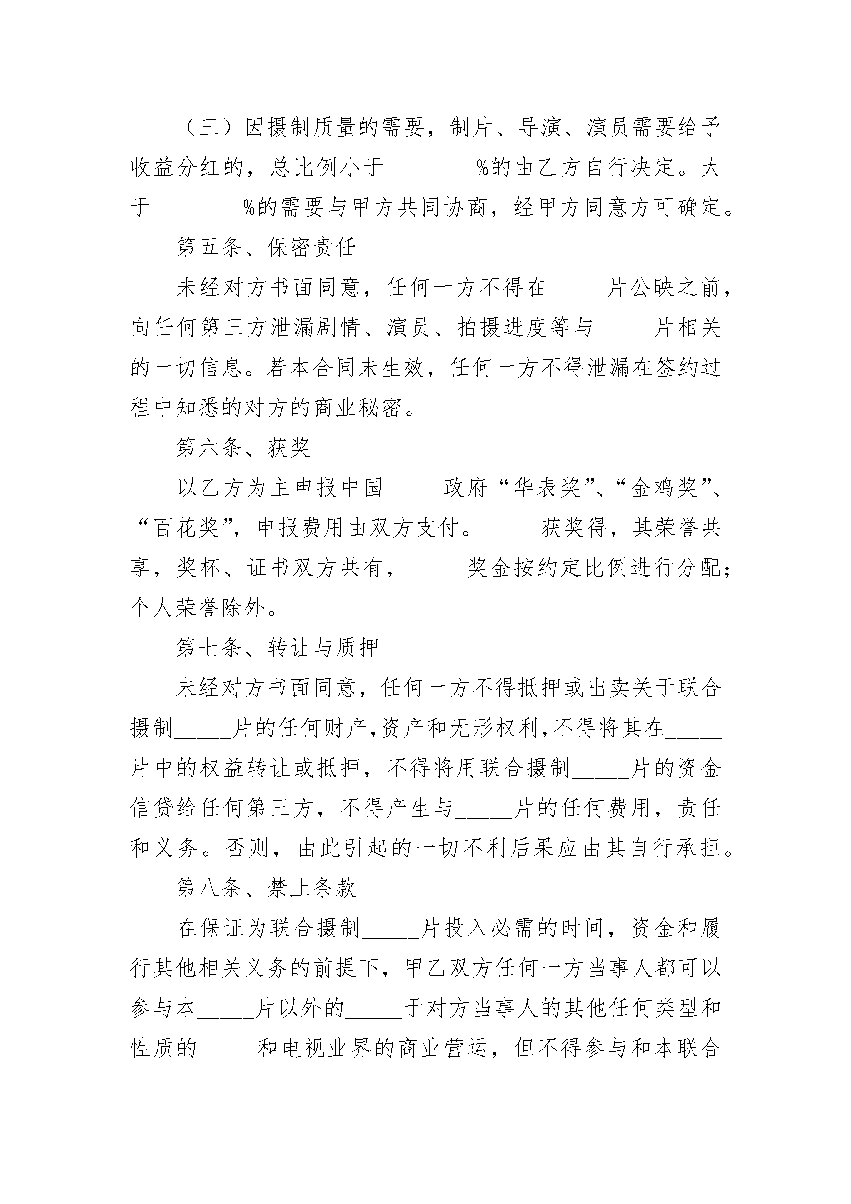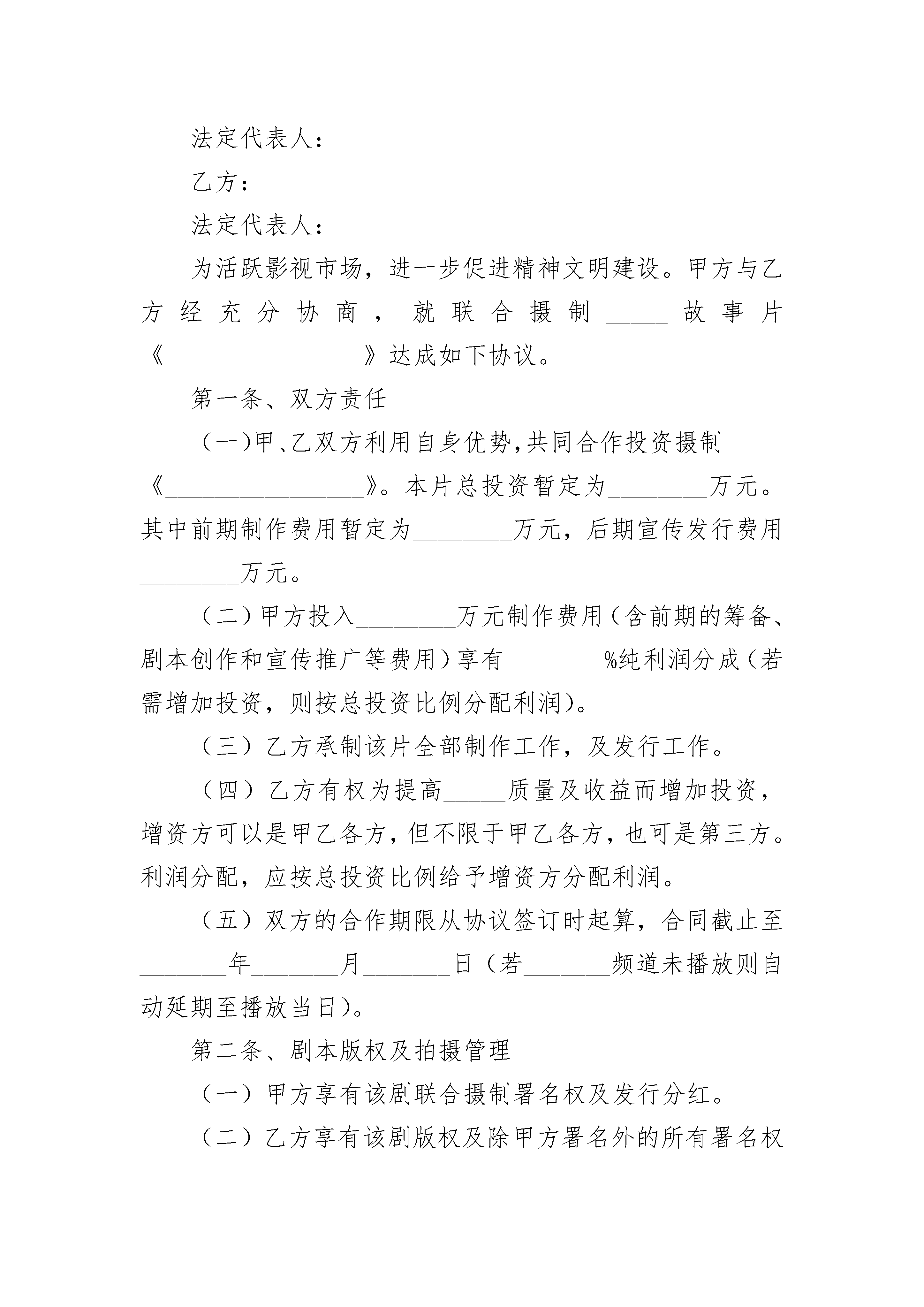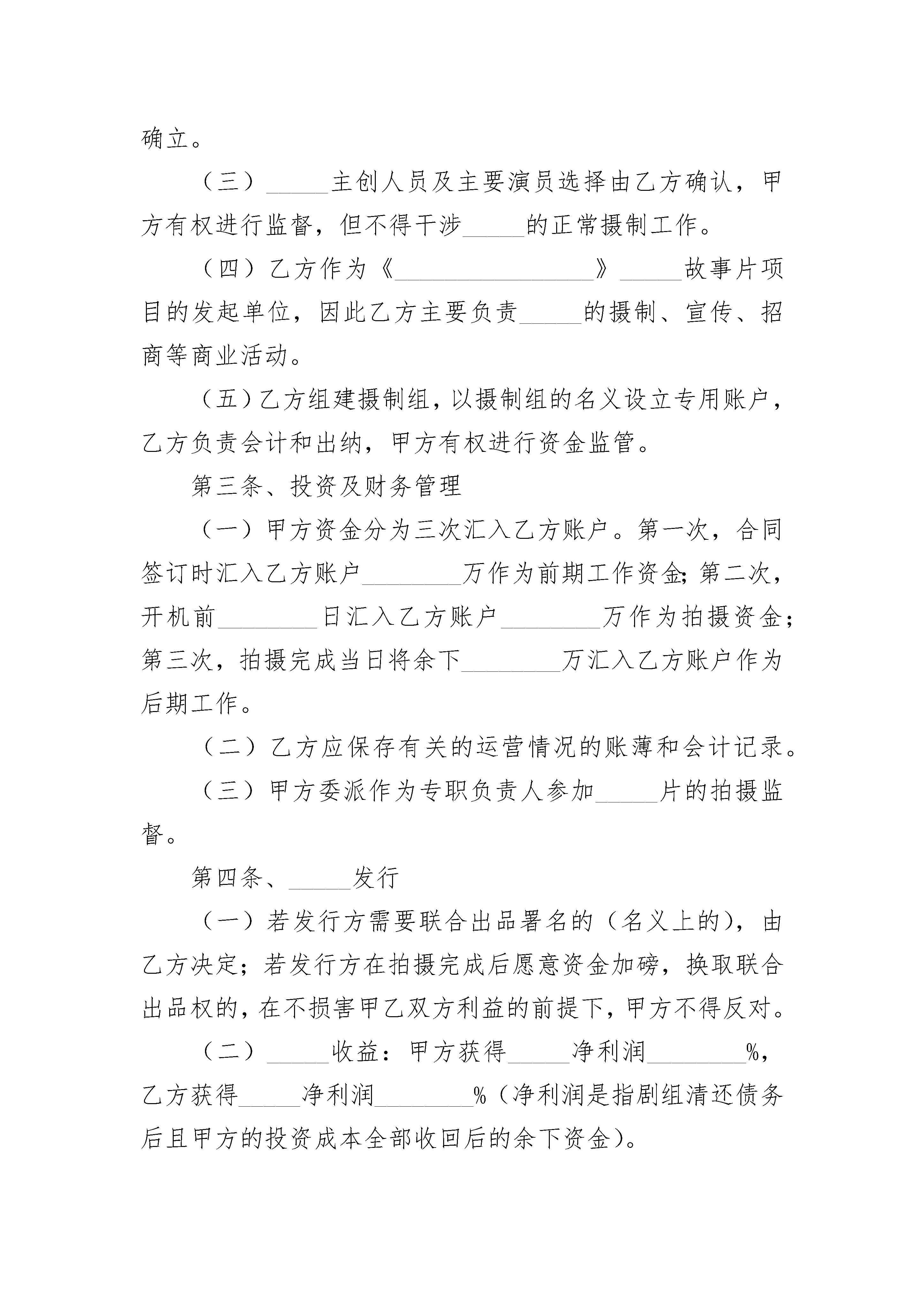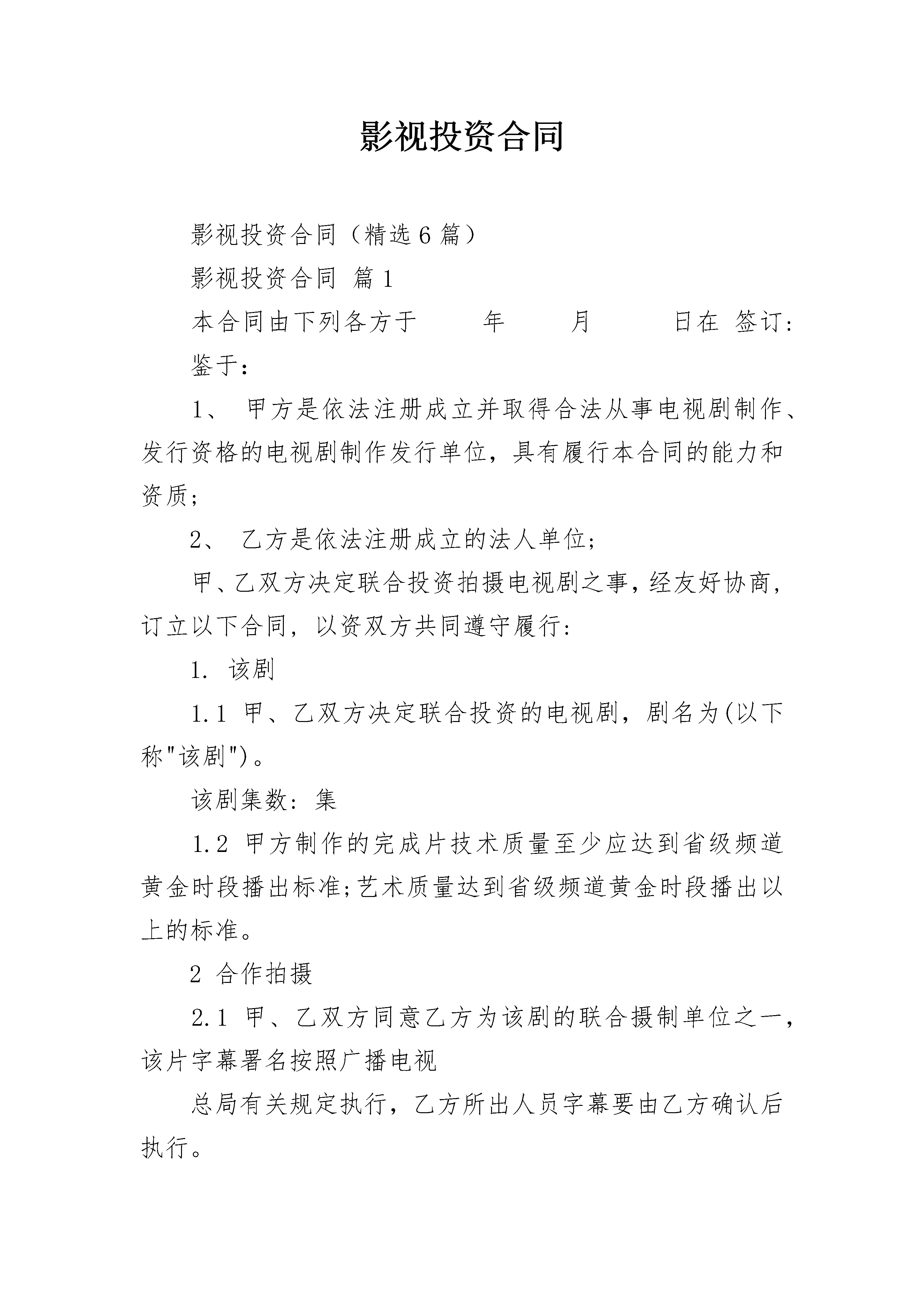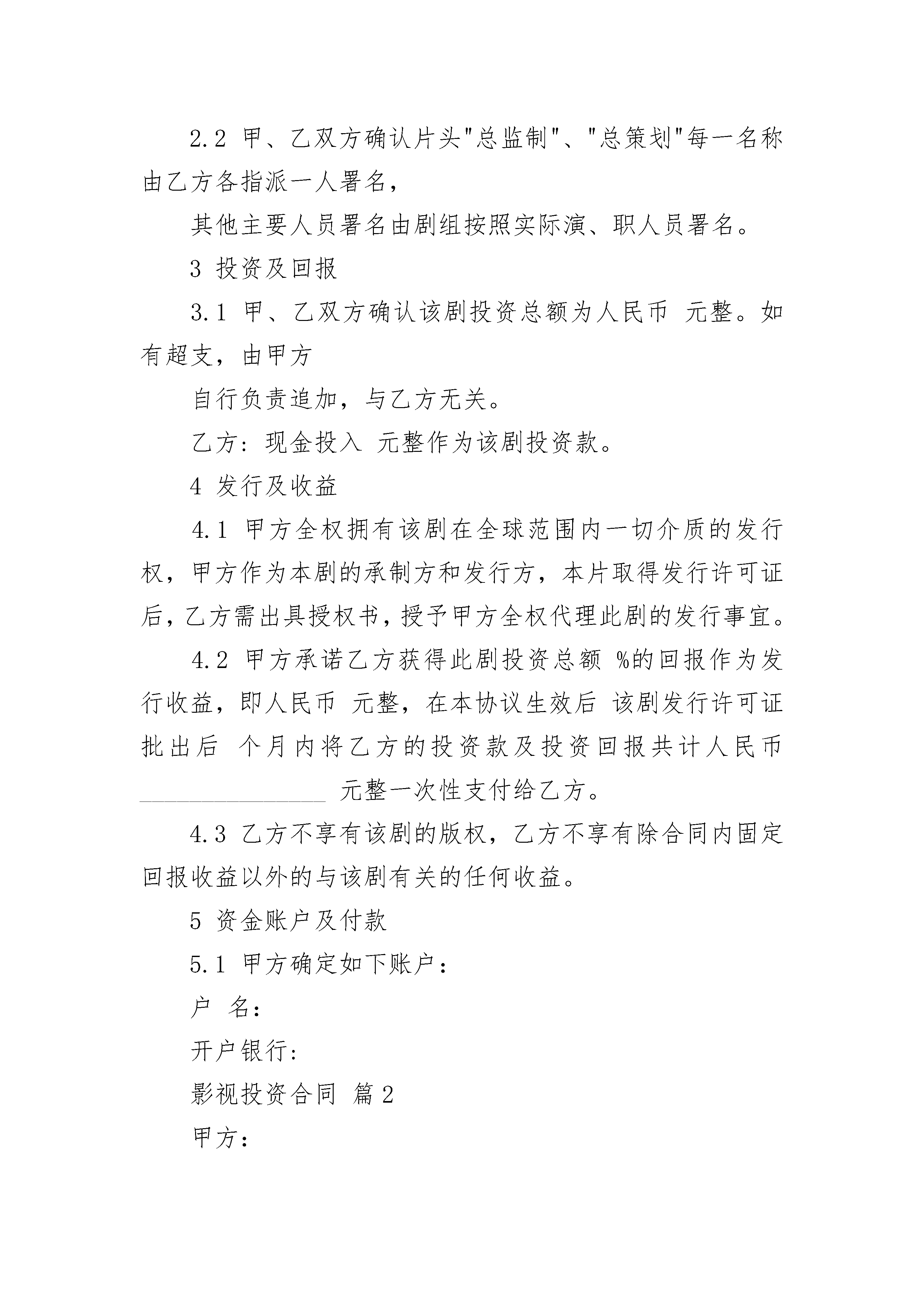 影视投资合同影视投资合同(精选6篇)影视投资合同篇1本合同由下列各方于年月日在签订:鉴于:1、甲方是依法注册成立并取得合法从事电视剧制作、发行资格的电视剧制作发行单位,具有履行本合同的能力和资质;2、乙方是依法注册成立的法人单位;甲、乙双方决定联合投资拍摄电视剧之事,经友好协商,订立以下合同,以资双方共同遵守履行:1.该剧1.1甲、乙双方决定联合投资的电视剧,剧名为(以下称"该剧")。该剧集数:集1.2甲方制作的完成片技术质量至少应达到省级频道黄金时段播出标准;艺术质量达到省级频道黄金时段播出以上的标准。2合作拍摄2.1甲、乙双方同意乙方为该剧的联合摄制单位之一,该片字幕署名按照广播电视总局有关规定执行,乙方所出人员字幕要由乙方确认后执行。2.2甲、乙双方确认片头"总监制"、"总策划"每一名称由乙方各指派一人署名,其他主要人员署名由剧组按照实际演、职人员署名。3投资及回报3.1甲、乙双方确认该剧投资总额为人民币元整。如有超支,由甲方自行负责追加,与乙方无关。乙方:现金投入元整作为该剧投资款。4发行及收益4.1甲方全权拥有该剧在全球范围内一切介质的发行权,甲方作为本剧的承制方和发行方,本片取得发行许可证后,乙方需出具授权书,授予甲方全权代理此剧的发行事宜。4.2甲方承诺乙方获得此剧投资总额%的回报作为发行收益,即人民币元整,在本协议生效后该剧发行许可证批出后个月内将乙方的投资款及投资回报共计人民币_______________元整一次性支付给乙方。4.3乙方不享有该剧的版权,乙方不享有除合同内固定回报收益以外的与该剧有关的任何收益。5资金账户及付款5.1甲方确定如下账户:户名:开户银行:影视投资合同篇2甲方:法定代表人:乙方:法定代表人:为活跃影视市场,进一步促进精神文明建设。甲方与乙方经充分协商,就联合摄制_____故事片《________________》达成如下协议。第一条、双方责任(一)甲、乙双方利用自身优势,共同合作投资摄制_____《________________》。本片总投资暂定为________万元。其中前期制作费用暂定为________万元,后期宣传发行费用________万元。(二)甲方投入________万元制作费用(含前期的筹备、剧本创作和宣传推广等费用)享有________%纯利润分成(若需增加投资,则按总投资比例分配利润)。(三)乙方承制该片全部制作工作,及发行工作。(四)乙方有权为提高_____质量及收益而增加投资,增资方可以是甲乙各方,但不限于甲乙各方,也可是第三方。利润分配,应按总投资比例给予增资方分配利润。(五)双方的合作期限从协议签订时起算,合同截止至_______年_______月_______日(若_______频道未播放则自动延期至播放当日)。第二条、剧本版权及拍摄管理(一)甲方享有该剧联合摄制署名权及发行分红。(二)乙方享有该剧版权及除甲方署名外的所有署名权确立。(三)_____主创人员及主要演员选择由乙方确认,甲方有权进行监督,但不得干涉_____的正常摄制工作。(四)乙方作为《________________》_____故事片项目的发起单位,因此乙方主要负责_____的摄制、宣传、招商等商业活动。(五)乙方组建摄制组,以摄制组的名义设立专用账户,乙方负责会计和出纳,甲方有权进行资金监管。第三条、投资及财务管理(一)甲方资金分为三次汇入乙方账户。第一次,合同签订时汇入乙方账户________万作为前期工作资金;第二次,开机前________日汇入乙方账户________万作为拍摄资金;第三次,拍摄完成当日将余下________万汇入乙方账户作为后期工作。(二)乙方应保存有关的运营情况的账薄和会计记录。(三)甲方委派作为专职负责人参加_____片的拍摄监督。第四条、_____发行(一)若发行方需要联合出品署名的(名义上的),由乙方决定;若发行方在拍摄完成后愿意资金加磅,换取联合出品权的,在不损害甲乙双方利益的前提下,甲方不得反对。(二)_____收益:甲方获得_____净利润________%,乙方获得_____净利润________%(净利润是指剧组清还债务后且甲方的投资成本全部收回后的余下资金)。(三)因摄制质量的需要,制片、导演、演员需要给予收益分红的,总比例小于________%的由乙方自行决定。大于________%的需要与甲方共同协商,经甲方同意方可确定。第五条、保密责任未经对方书面同意,任何一方不得在_____片公映之前,向任何第三方泄漏剧情、演员、拍摄进度等与_____片相关的一切信息。若本合同未生效,任何一方不得泄漏在签约过程中知悉的对方的商业秘密。第六条、获奖以乙方为主申报中国_____政府“华表奖”、“金鸡奖”、“百花奖”,申报费用由双方支付