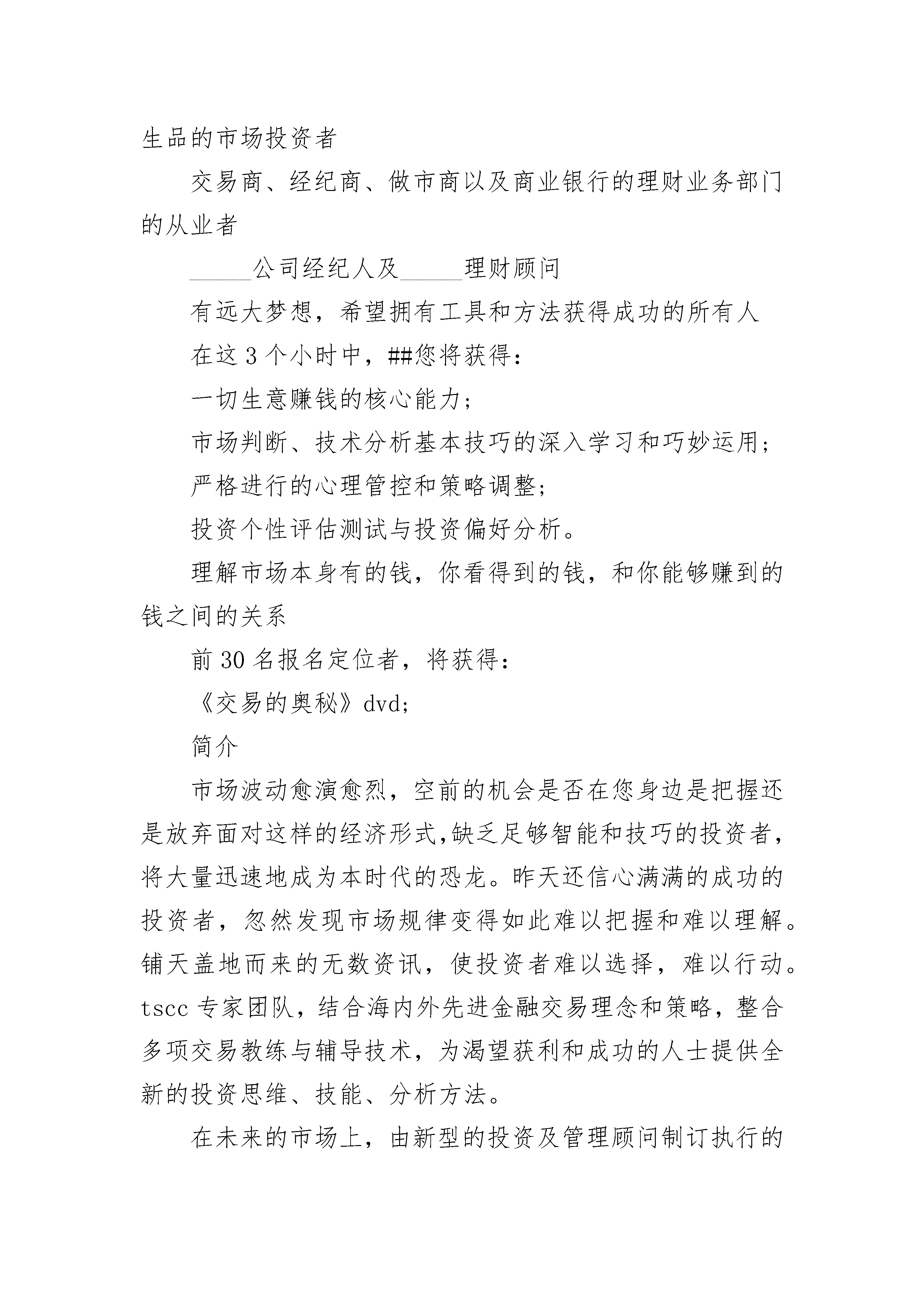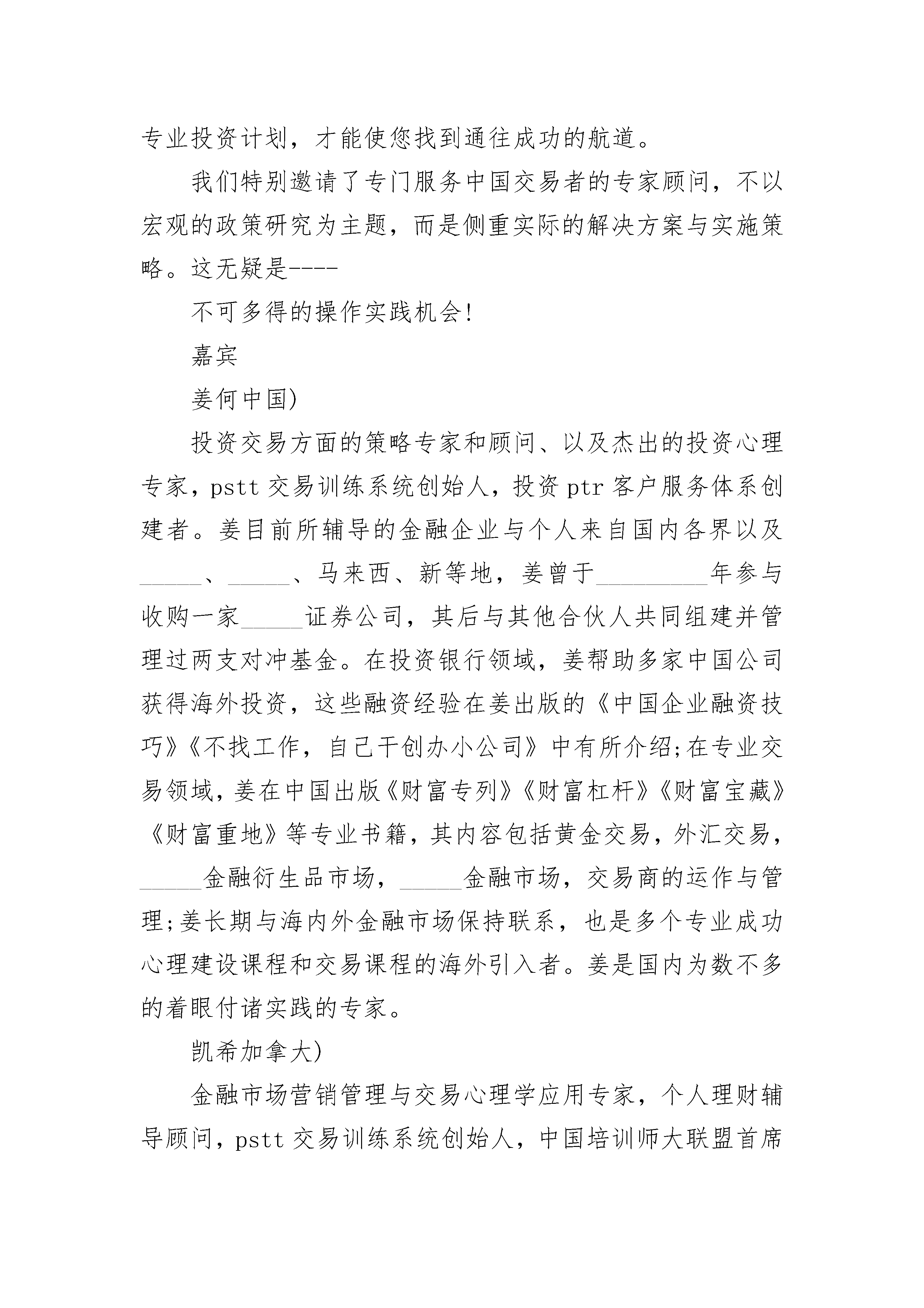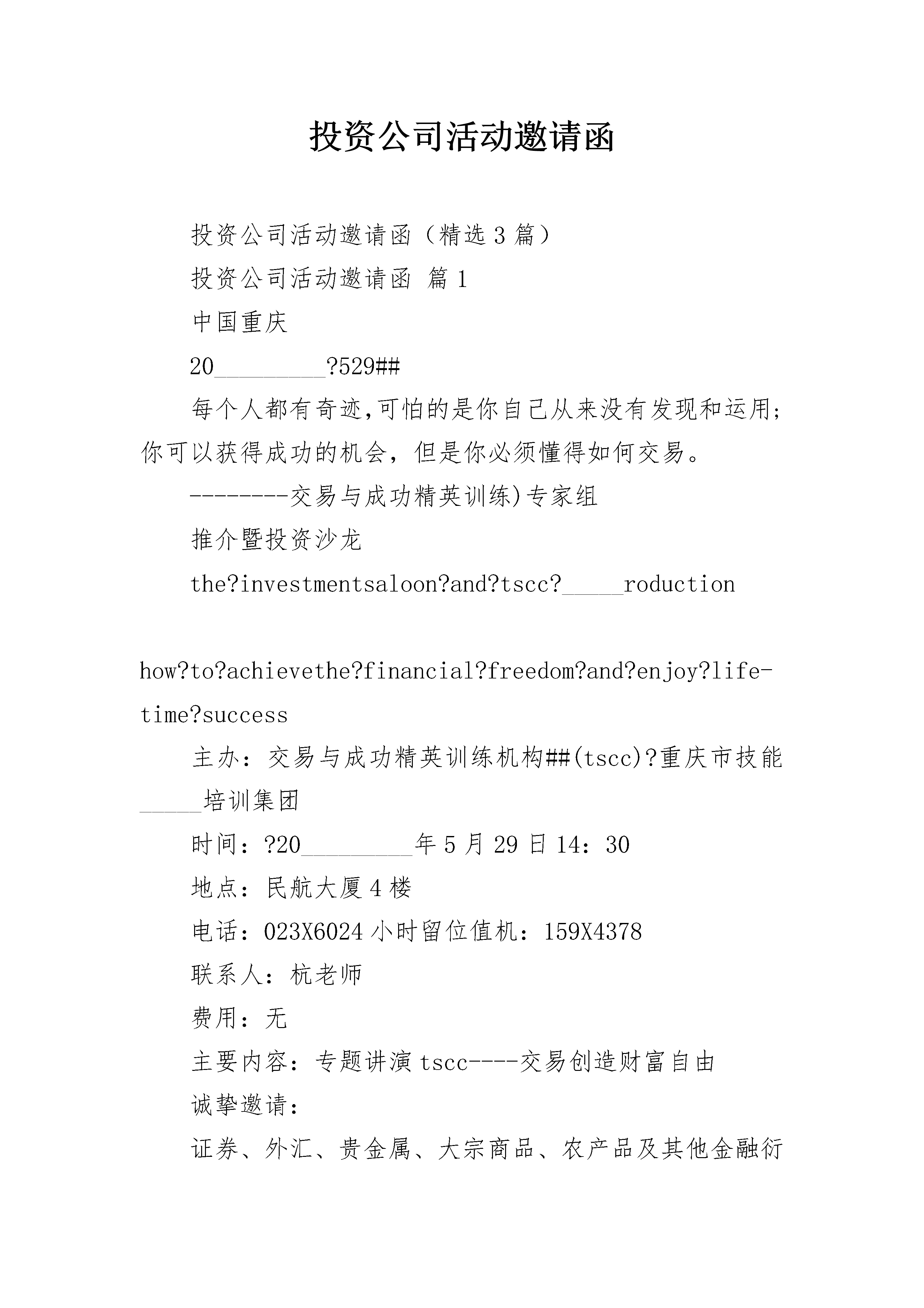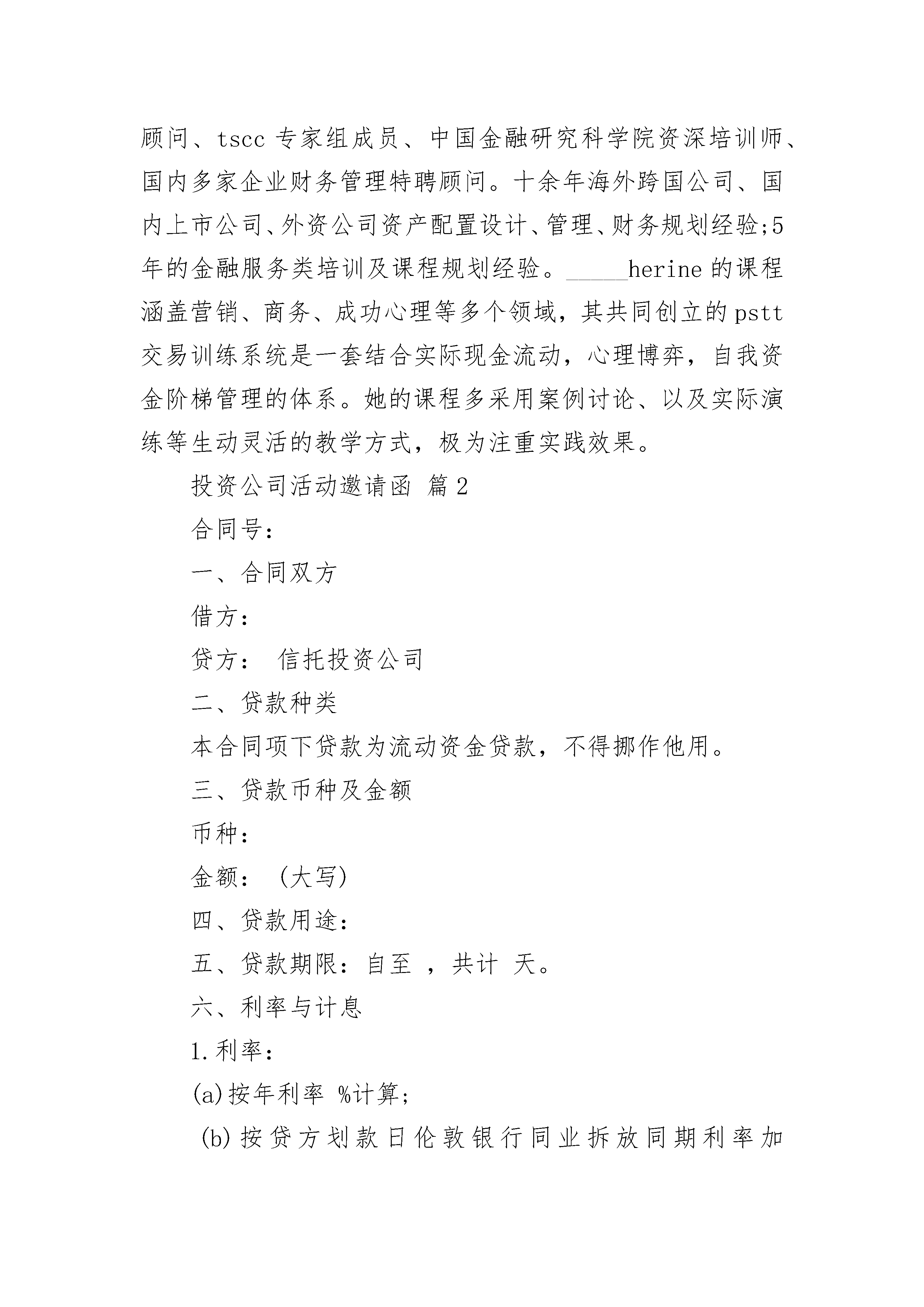 投资公司活动邀请函投资公司活动邀请函(精选3篇)投资公司活动邀请函篇1中国重庆20_________?529##每个人都有奇迹,可怕的是你自己从来没有发现和运用;你可以获得成功的机会,但是你必须懂得如何交易。--------交易与成功精英训练)专家组推介暨投资沙龙the?investmentsaloon?and?tscc?_____roductionhow?to?achievethe?financial?freedom?and?enjoy?life-time?success主办:交易与成功精英训练机构##(tscc)?重庆市技能_____培训集团时间:?20_________年5月29日14:30地点:民航大厦4楼电话:023X6024小时留位值机:159X4378联系人:杭老师费用:无主要内容:专题讲演tscc----交易创造财富自由诚挚邀请:证券、外汇、贵金属、大宗商品、农产品及其他金融衍生品的市场投资者交易商、经纪商、做市商以及商业银行的理财业务部门的从业者_____公司经纪人及_____理财顾问有远大梦想,希望拥有工具和方法获得成功的所有人在这3个小时中,##您将获得:一切生意赚钱的核心能力;市场判断、技术分析基本技巧的深入学习和巧妙运用;严格进行的心理管控和策略调整;投资个性评估测试与投资偏好分析。理解市场本身有的钱,你看得到的钱,和你能够赚到的钱之间的关系前30名报名定位者,将获得:《交易的奥秘》dvd;简介市场波动愈演愈烈,空前的机会是否在您身边是把握还是放弃面对这样的经济形式,缺乏足够智能和技巧的投资者,将大量迅速地成为本时代的恐龙。昨天还信心满满的成功的投资者,忽然发现市场规律变得如此难以把握和难以理解。铺天盖地而来的无数资讯,使投资者难以选择,难以行动。tscc专家团队,结合海内外先进金融交易理念和策略,整合多项交易教练与辅导技术,为渴望获利和成功的人士提供全新的投资思维、技能、分析方法。在未来的市场上,由新型的投资及管理顾问制订执行的专业投资计划,才能使您找到通往成功的航道。我们特别邀请了专门服务中国交易者的专家顾问,不以宏观的政策研究为主题,而是侧重实际的解决方案与实施策略。这无疑是----不可多得的操作实践机会!嘉宾姜何中国)投资交易方面的策略专家和顾问、以及杰出的投资心理专家,pstt交易训练系统创始人,投资ptr客户服务体系创建者。姜目前所辅导的金融企业与个人来自国内各界以及_____、_____、马来西、新等地,姜曾于_________年参与收购一家_____证券公司,其后与其他合伙人共同组建并管理过两支对冲基金。在投资银行领域,姜帮助多家中国公司获得海外投资,这些融资经验在姜出版的《中国企业融资技巧》《不找工作,自己干创办小公司》中有所介绍;在专业交易领域,姜在中国出版《财富专列》《财富杠杆》《财富宝藏》《财富重地》等专业书籍,其内容包括黄金交易,外汇交易,_____金融衍生品市场,_____金融市场,交易商的运作与管理;姜长期与海内外金融市场保持联系,也是多个专业成功心理建设课程和交易课程的海外引入者。姜是国内为数不多的着眼付诸实践的专家。凯希加拿大)金融市场营销管理与交易心理学应用专家,个人理财辅导顾问,pstt交易训练系统创始人,中国培训师大联盟首席顾问、tscc专家组成员、中国金融研究科学院资深培训师、国内多家企业财务管理特聘顾问。十余年海外跨国公司、国内上市公司、外资公司资产配置设计、管理、财务规划经验;5年的金融服务类培训及课程规划经验。_____herine的课程涵盖营销、商务、成功心理等多个领域,其共同创立的pstt交易训练系统是一套结合实际现金流动,心理博弈,自我资金阶梯管理的体系。她的课程多采用案例讨论、以及实际演练等生动灵活的教学方式,极为注重实践效果。投资公司活动邀请函篇2合同号:一、合同双方借方:贷方:信托投资公司二、贷款种类本合同项下贷款为流动资金贷款,不得挪作他用。三、贷款币种及金额币种:金额:(大写)四、贷款用途:五、贷款期限:自至,共计天。六、利率与计息1.利率:(a)按年利率%计算;(b)按贷方划款日伦敦银行同业拆放同期利率加(libor+)计算。2.计息:按贷款实际发生额半年结算一次,上半年六月二十日,下半年十二月二十日,如借方未于计息日付应付利息,上述贷款利率按实际用款天数(360日/年)计息。3.起息:按实际汇出日起计息。4.如中国银行总行制定的计息办法发生变化时,本合同将按新的办法执行。七、还款1.借方应严格按还款计划或本合同规定还款;2.借款方提前还款时,应在预计偿还日前十五天书面通知贷方并获得贷方的认可。对不经贷方认可而提前归还的贷款部分,贷方将向借方收取一次性%的承担费;3.借方因故无法按期还款时,应于规定还款日前一个月向贷方提出延期还款的