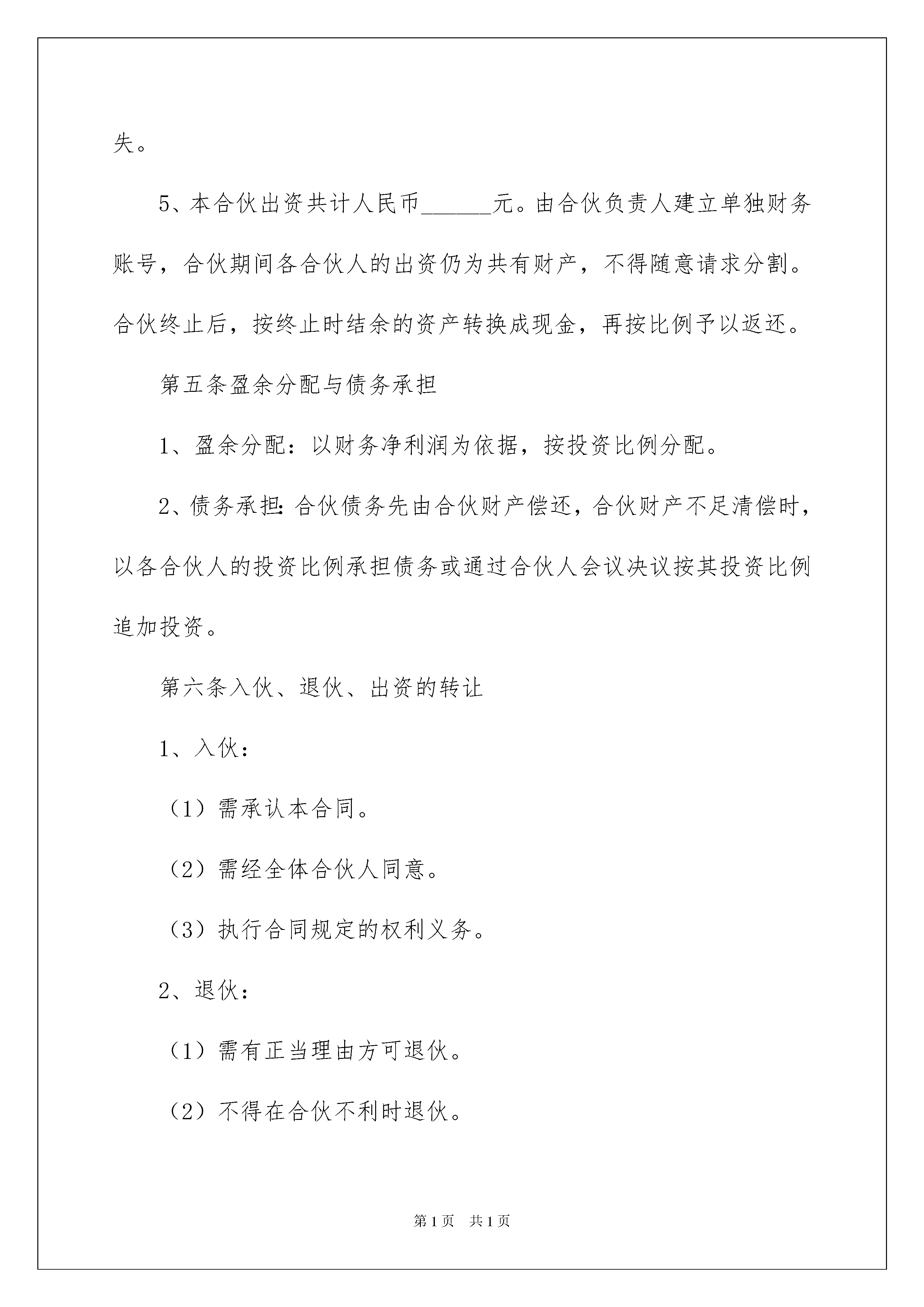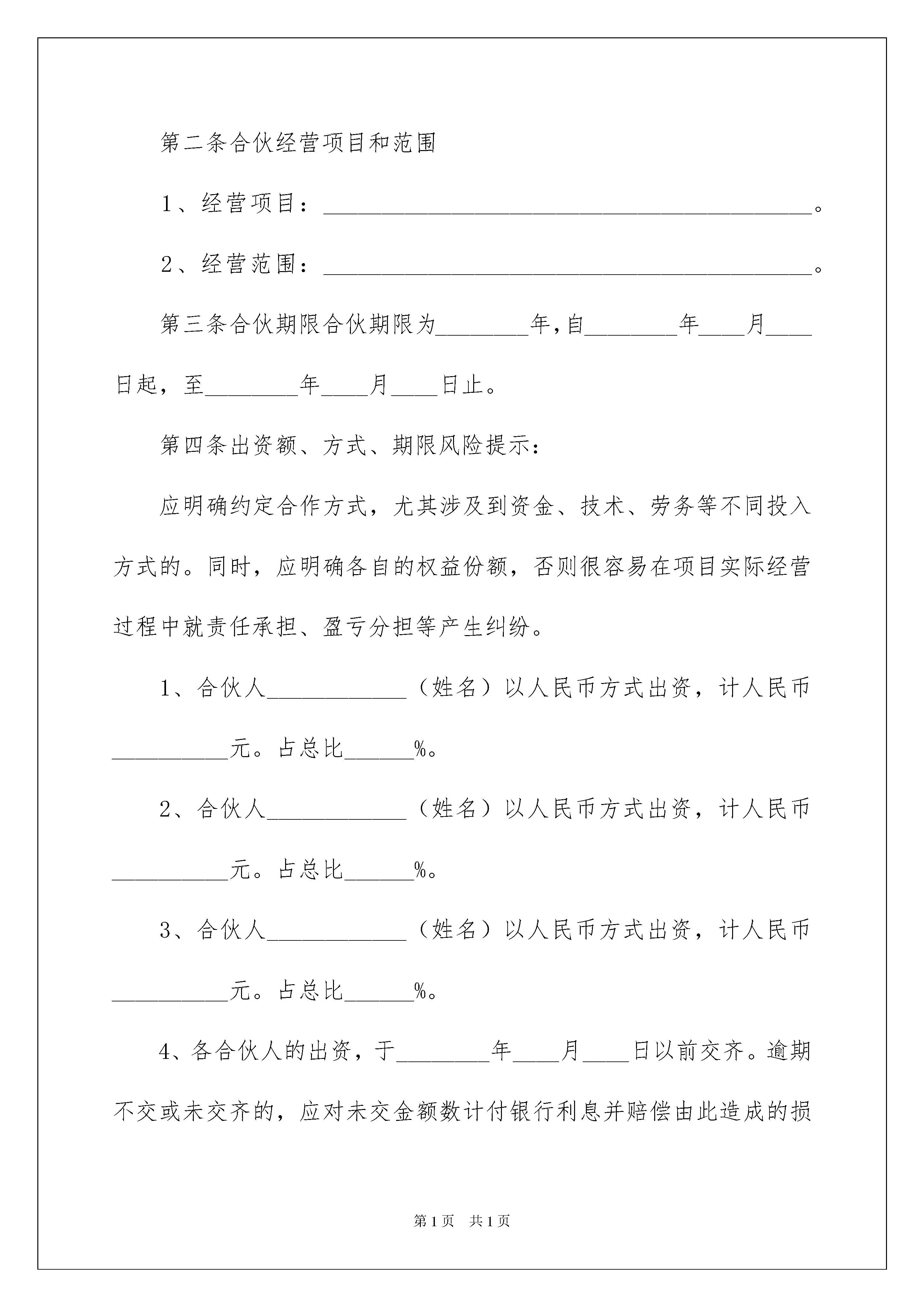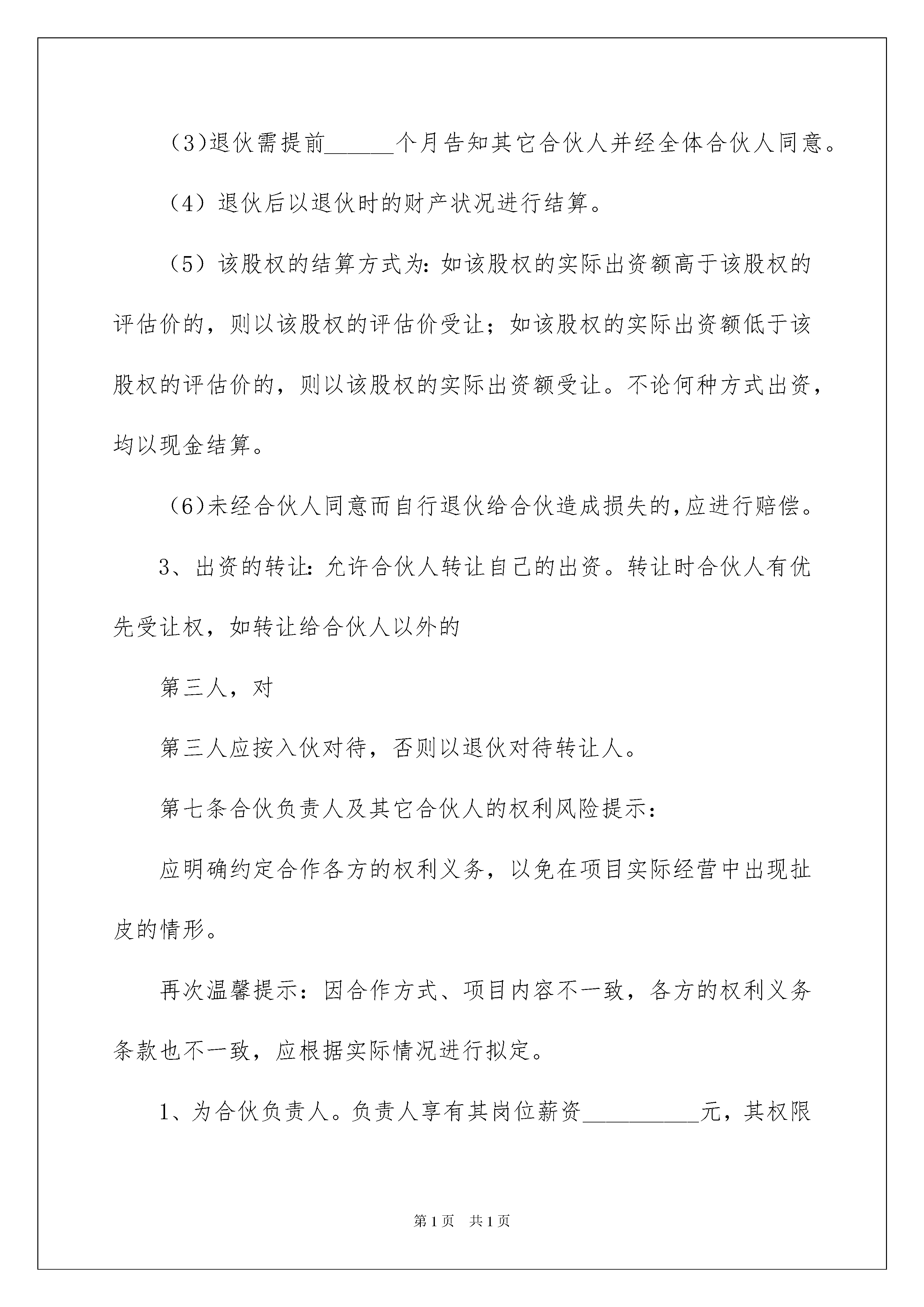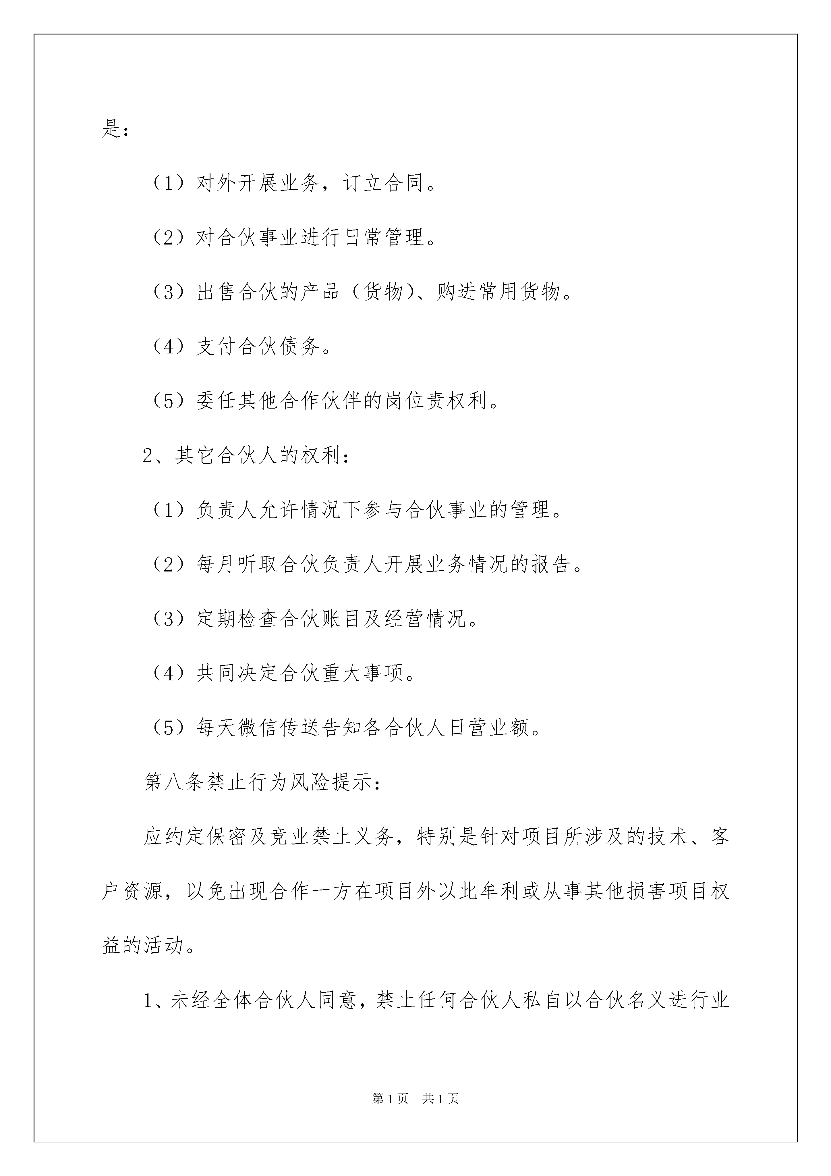 2022精选股份协议书汇总9篇精选股份协议书汇总9篇在日常生活和工作中,协议的使用成为日常生活的常态,签订协议可以保护当事人的合法权益。那么相关的协议到底怎么写呢?下面是我为大家收集的股份协议书9篇,仅供参考,大家一起来看看吧。股份协议书篇1合伙人:联系方式:住址:合伙人:联系方式:住址:合伙人:联系方式:住址:风险提示:合作的方式多种多样,如合作设立公司、合作开发软件、合作购销产品等等,不同合作方式涉及到不同的项目内容,相应的协议条款可能大不相同。本协议的条款设置建立在特定项目的基础上,仅供参考。实践中,需要根据双方实际的合作方式、项目内容、权利义务等,修改或重新拟定条款。第一条合伙宗旨诚信,互助,多赢。第二条合伙经营项目和范围1、经营项目:__________________________________________。2、经营范围:__________________________________________。第三条合伙期限合伙期限为________年,自________年____月____日起,至________年____月____日止。第四条出资额、方式、期限风险提示:应明确约定合作方式,尤其涉及到资金、技术、劳务等不同投入方式的。同时,应明确各自的权益份额,否则很容易在项目实际经营过程中就责任承担、盈亏分担等产生纠纷。1、合伙人____________(姓名)以人民币方式出资,计人民币__________元。占总比______%。2、合伙人____________(姓名)以人民币方式出资,计人民币__________元。占总比______%。3、合伙人____________(姓名)以人民币方式出资,计人民币__________元。占总比______%。4、各合伙人的出资,于________年____月____日以前交齐。逾期不交或未交齐的,应对未交金额数计付银行利息并赔偿由此造成的损失。5、本合伙出资共计人民币______元。由合伙负责人建立单独财务账号,合伙期间各合伙人的出资仍为共有财产,不得随意请求分割。合伙终止后,按终止时结余的资产转换成现金,再按比例予以返还。第五条盈余分配与债务承担1、盈余分配:以财务净利润为依据,按投资比例分配。2、债务承担:合伙债务先由合伙财产偿还,合伙财产不足清偿时,以各合伙人的投资比例承担债务或通过合伙人会议决议按其投资比例追加投资。第六条入伙、退伙、出资的转让1、入伙:(1)需承认本合同。(2)需经全体合伙人同意。(3)执行合同规定的权利义务。2、退伙:(1)需有正当理由方可退伙。(2)不得在合伙不利时退伙。(3)退伙需提前______个月告知其它合伙人并经全体合伙人同意。(4)退伙后以退伙时的财产状况进行结算。(5)该股权的结算方式为:如该股权的实际出资额高于该股权的评估价的,则以该股权的评估价受让;如该股权的实际出资额低于该股权的评估价的,则以该股权的实际出资额受让。不论何种方式出资,均以现金结算。(6)未经合伙人同意而自行退伙给合伙造成损失的,应进行赔偿。3、出资的转让:允许合伙人转让自己的出资。转让时合伙人有优先受让权,如转让给合伙人以外的第三人,对第三人应按入伙对待,否则以退伙对待转让人。第七条合伙负责人及其它合伙人的权利风险提示:应明确约定合作各方的权利义务,以免在项目实际经营中出现扯皮的情形。再次温馨提示:因合作方式、项目内容不一致,各方的权利义务条款也不一致,应根据实际情况进行拟定。1、为合伙负责人。负责人享有其岗位薪资__________元,其权限是:(1)对外开展业务,订立合同。(2)对合伙事业进行日常管理。(3)出售合伙的产品(货物)、购进常用货物。(4)支付合伙债务。(5)委任其他合作伙伴的岗位责权利。2、其它合伙人的权利:(1)负责人允许情况下参与合伙事业的管理。(2)每月听取合伙负责人开展业务情况的报告。(3)定期检查合伙账目及经营情况。(4)共同决定合伙重大事项。(5)每天微信传送告知各合伙人日营业额。第八条禁止行为风险提示:应约定保密及竞业禁止义务,特别是针对项目所涉及的技术、客户资源,以免出现合作一方在项目外以此牟利或从事其他损害项目权益的活动。1、未经全体合伙人同意,禁止任何合伙人私自以合伙名义进行业务活动。如其业务获得利益归合伙,造成损失按实际损失赔偿。2、禁止合伙人经营与合伙竞争的业务。第九条合伙营业的继续1、在退伙的情况下,其余合伙人有权继续以原企业名称继续经营原企业业务,也可以选择、吸收新的合伙人入伙经营。2、在合伙人死亡或被宣告死亡的情况下,依死亡合伙人的继承人的选择