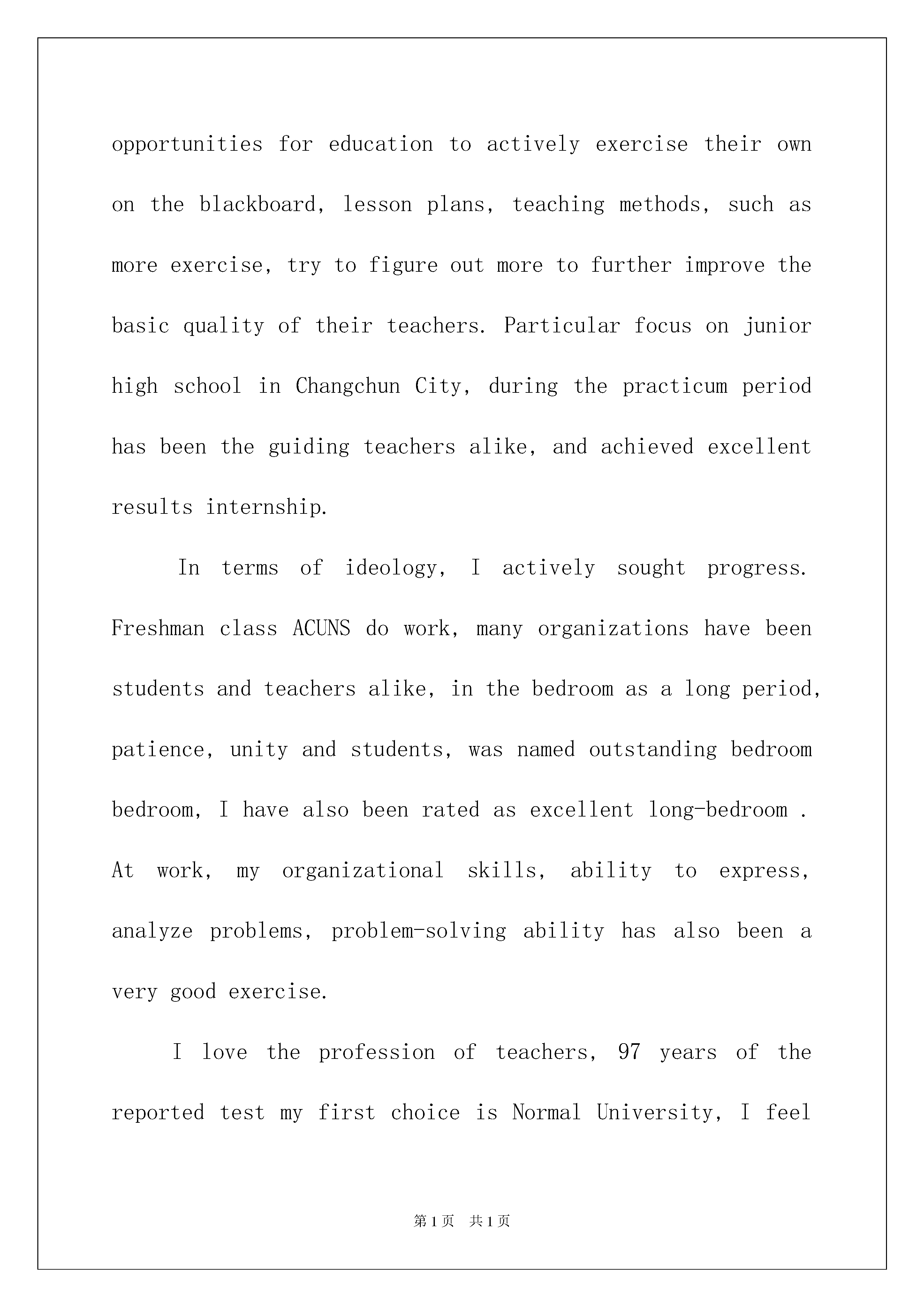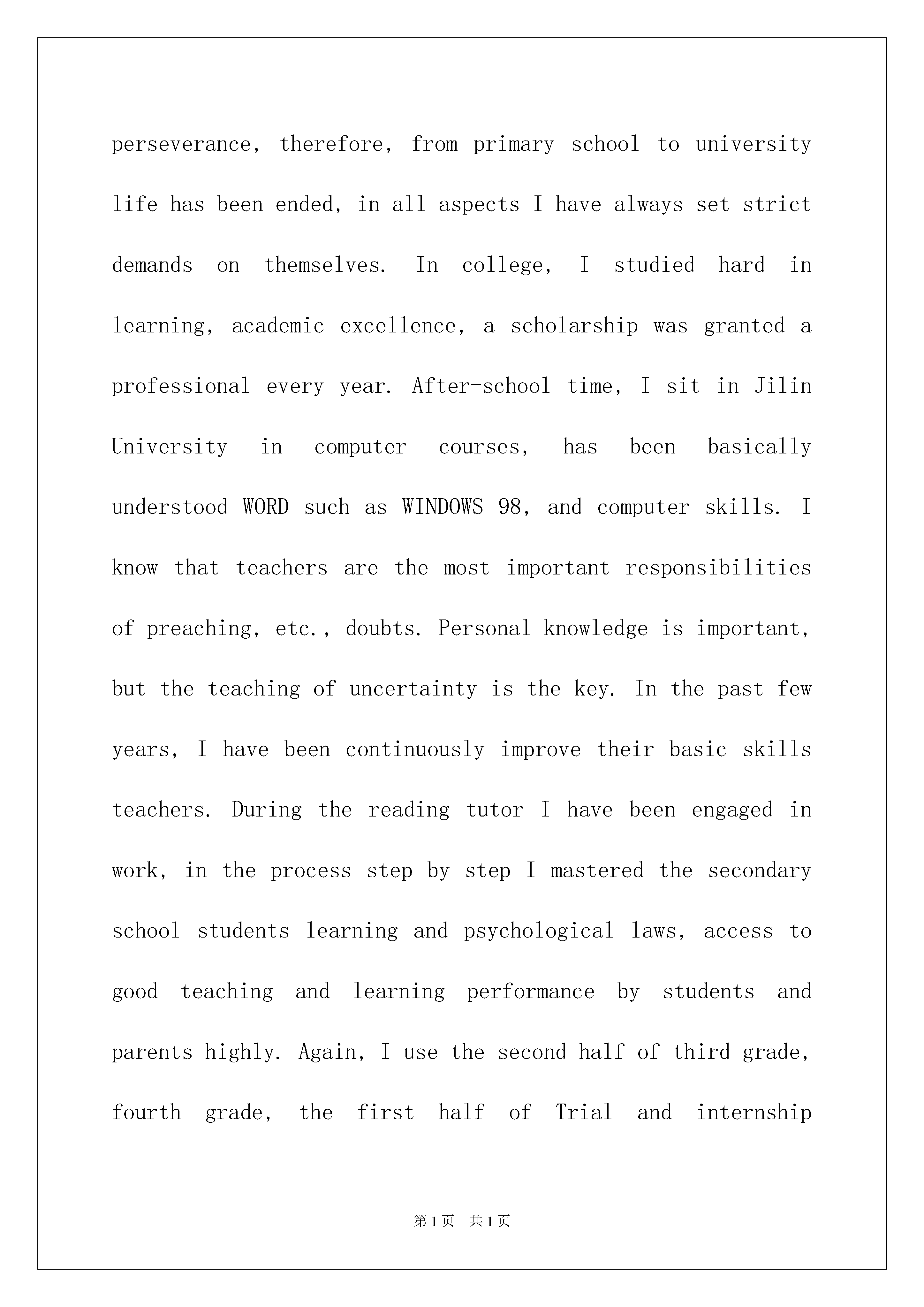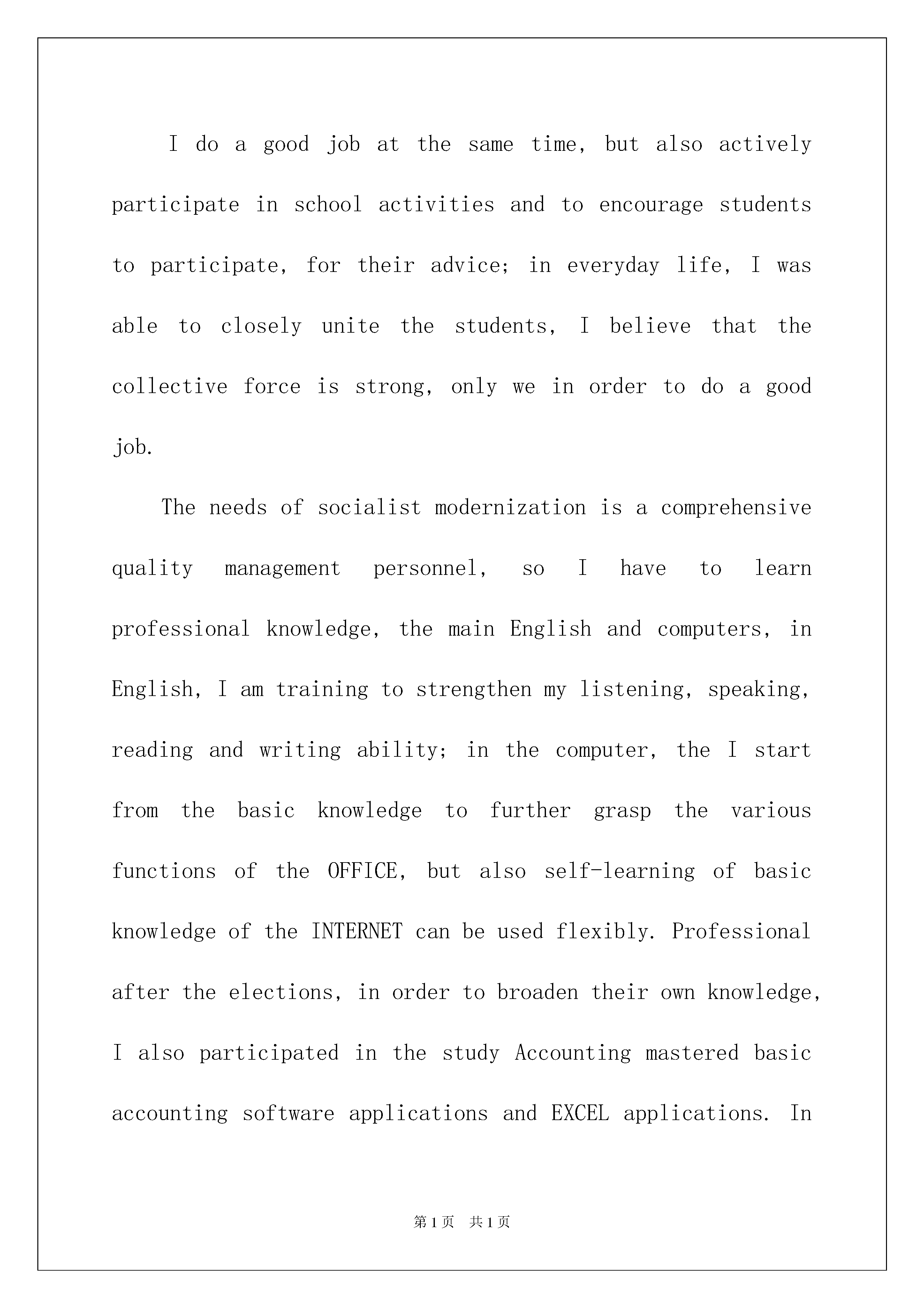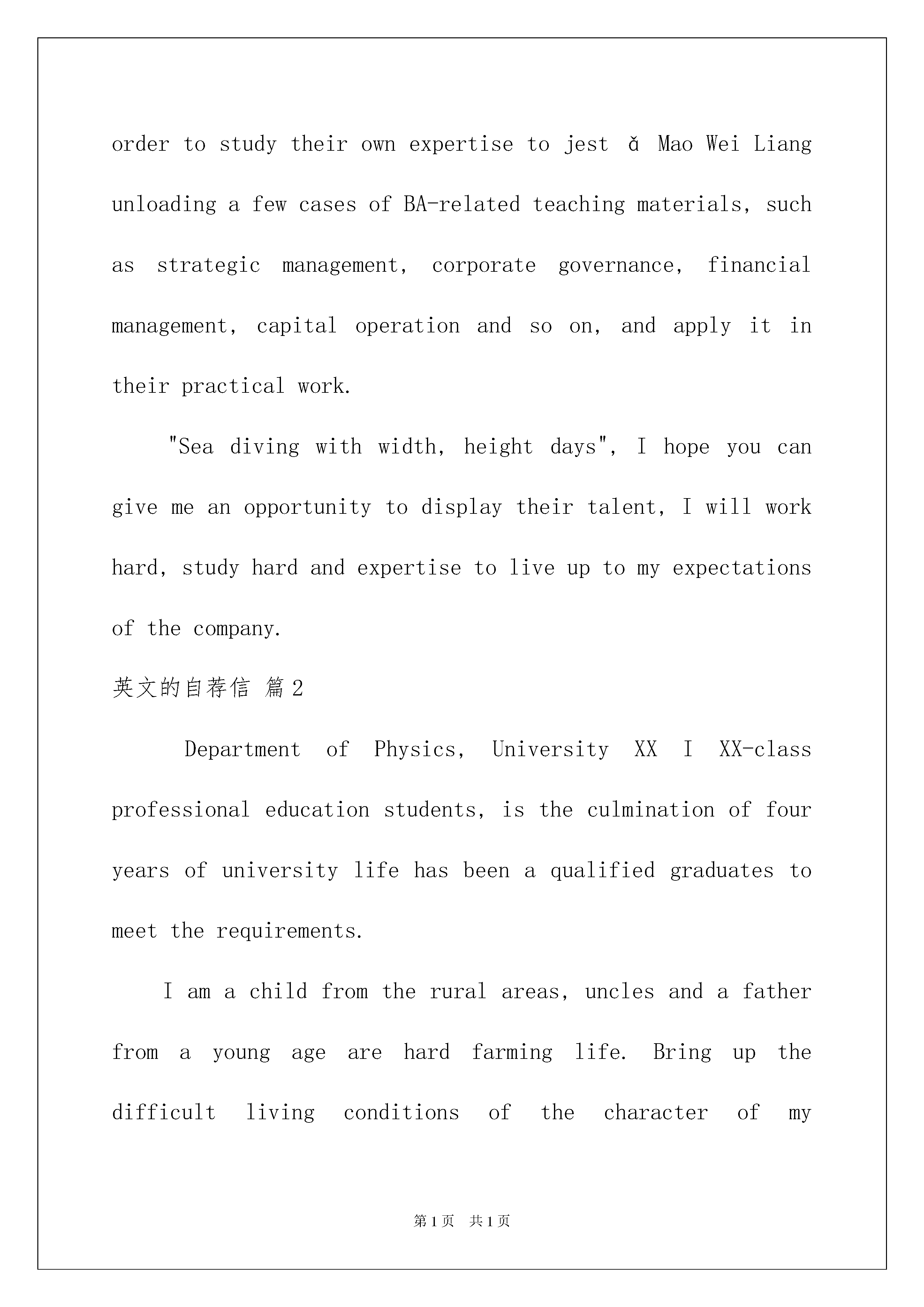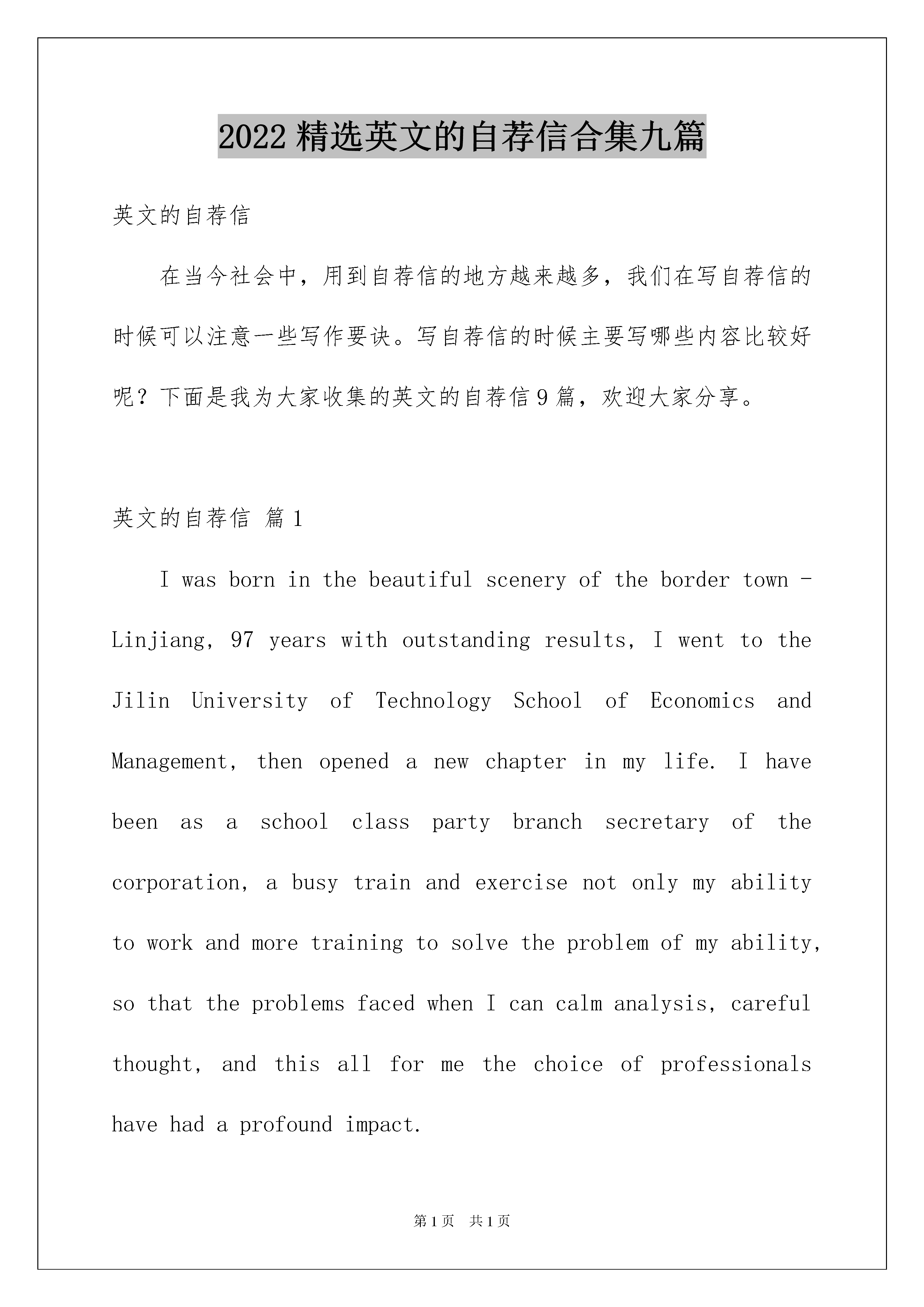 2022精选英文的自荐信合集九篇英文的自荐信在当今社会中,用到自荐信的地方越来越多,我们在写自荐信的时候可以注意一些写作要诀。写自荐信的时候主要写哪些内容比较好呢?下面是我为大家收集的英文的自荐信9篇,欢迎大家分享。英文的自荐信篇1Iwasborninthebeautifulsceneryofthebordertown-Linjiang,97yearswithoutstandingresults,IwenttotheJilinUniversityofTechnologySchoolofEconomicsandManagement,thenopenedanewchapterinmylife.Ihavebeenasaschoolclasspartybranchsecretaryofthecorporation,abusytrainandexercisenotonlymyabilitytoworkandmoretrainingtosolvetheproblemofmyability,sothattheproblemsfacedwhenIcancalmanalysis,carefulthought,andthisallformethechoiceofprofessionalshavehadaprofoundimpact.Idoagoodjobatthesametime,butalsoactivelyparticipateinschoolactivitiesandtoencouragestudentstoparticipate,fortheiradvice;ineverydaylife,Iwasabletocloselyunitethestudents,Ibelievethatthecollectiveforceisstrong,onlyweinordertodoagoodjob.Theneedsofsocialistmodernizationisacomprehensivequalitymanagementpersonnel,soIhavetolearnprofessionalknowledge,themainEnglishandcomputers,inEnglish,Iamtrainingtostrengthenmylistening,speaking,readingandwritingability;inthecomputer,theIstartfromthebasicknowledgetofurthergraspthevariousfunctionsoftheOFFICE,butalsoself-learningofbasicknowledgeoftheINTERNETcanbeusedflexibly.Professionalaftertheelections,inordertobroadentheirownknowledge,IalsoparticipatedinthestudyAccountingmasteredbasicaccountingsoftwareapplicationsandEXCELapplications.InordertostudytheirownexpertisetojestǎMaoWeiLiangunloadingafewcasesofBA-relatedteachingmaterials,suchasstrategicmanagement,corporategovernance,financialmanagement,capitaloperationandsoon,andapplyitintheirpracticalwork."Seadivingwithwidth,heightdays",Ihopeyoucangivemeanopportunitytodisplaytheirtalent,Iwillworkhard,studyhardandexpertisetoliveuptomyexpectationsofthecompany.英文的自荐信篇2DepartmentofPhysics,UniversityXXIXX-classprofessionaleducationstudents,istheculminationoffouryearsofuniversitylifehasbeenaqualifiedgraduatestomeettherequirements.Iamachildfromtheruralareas,unclesandafath