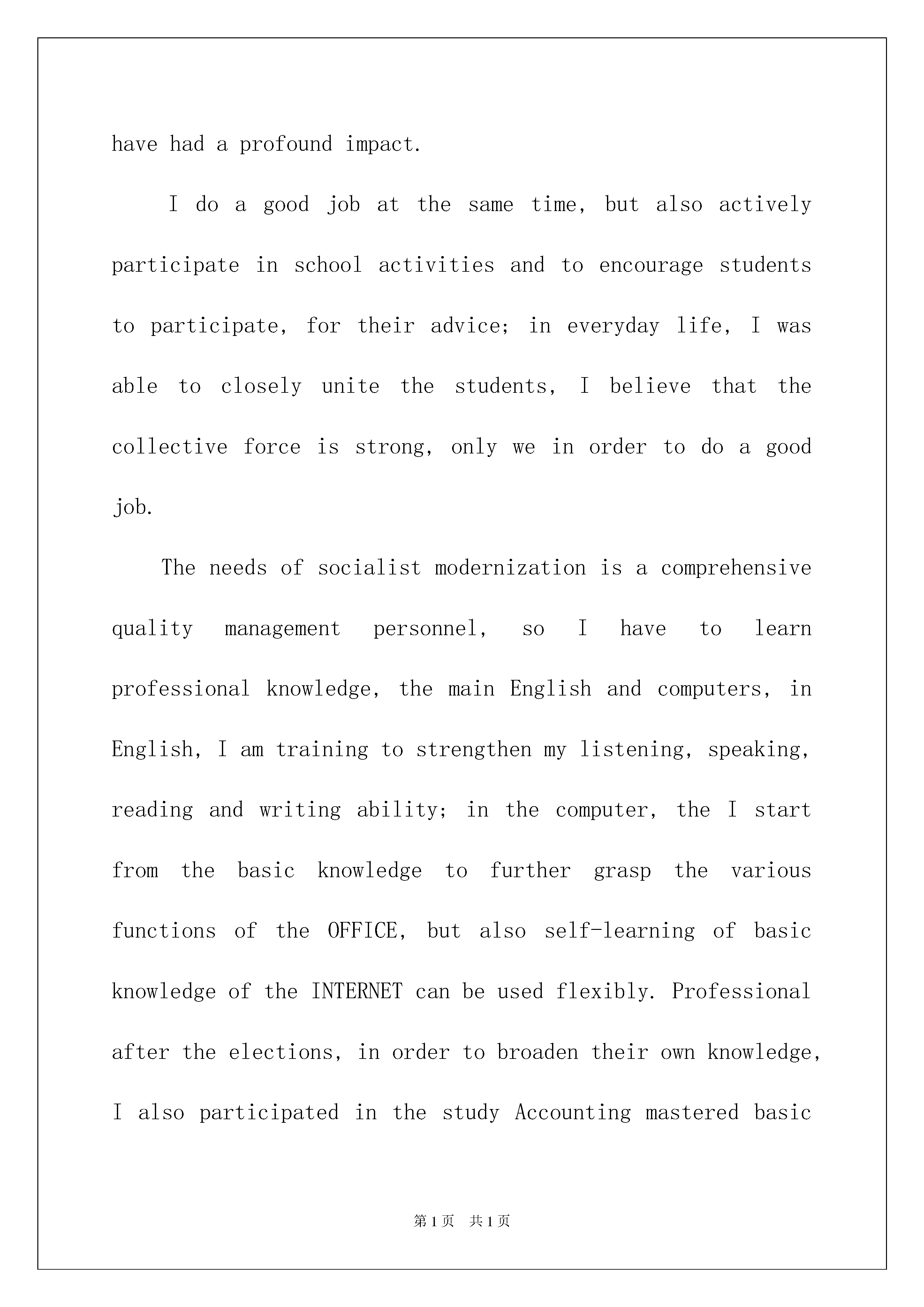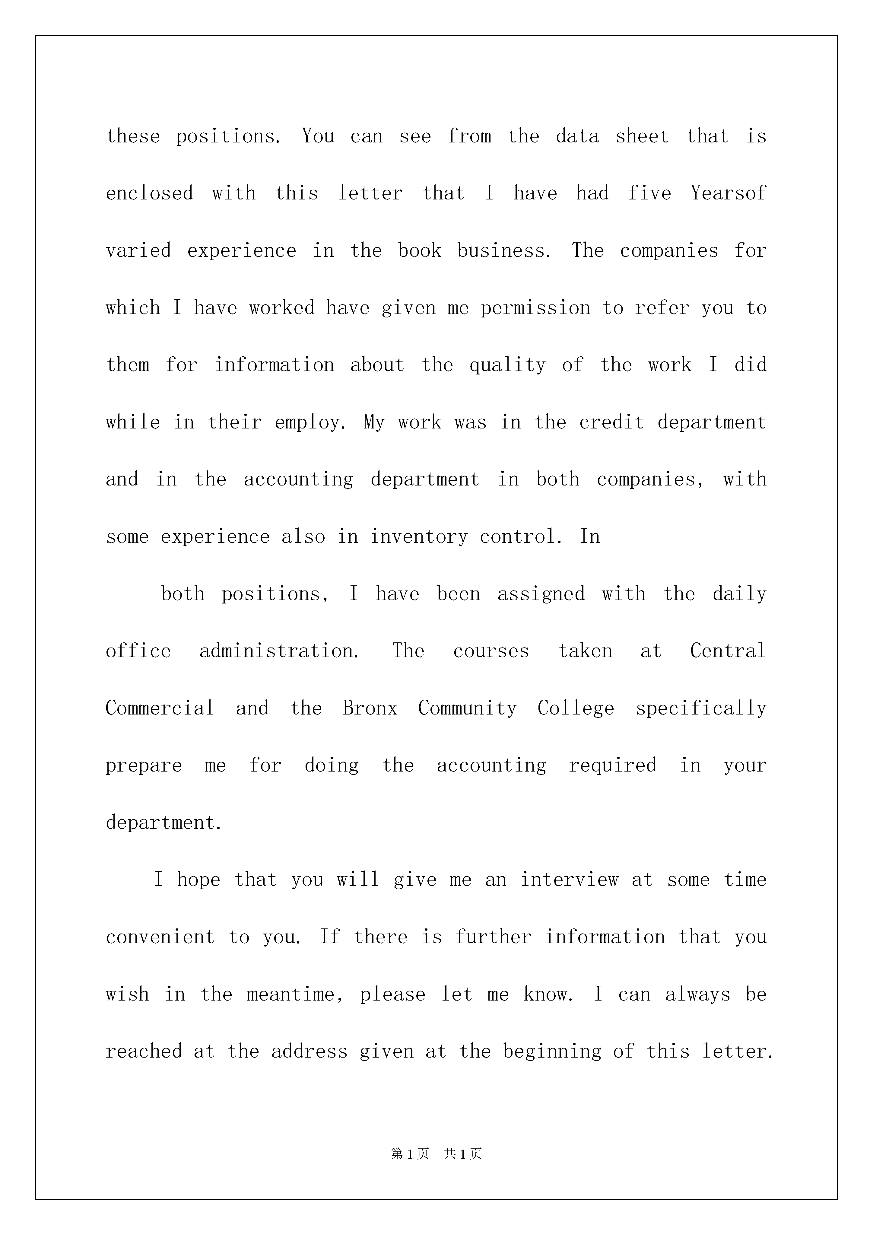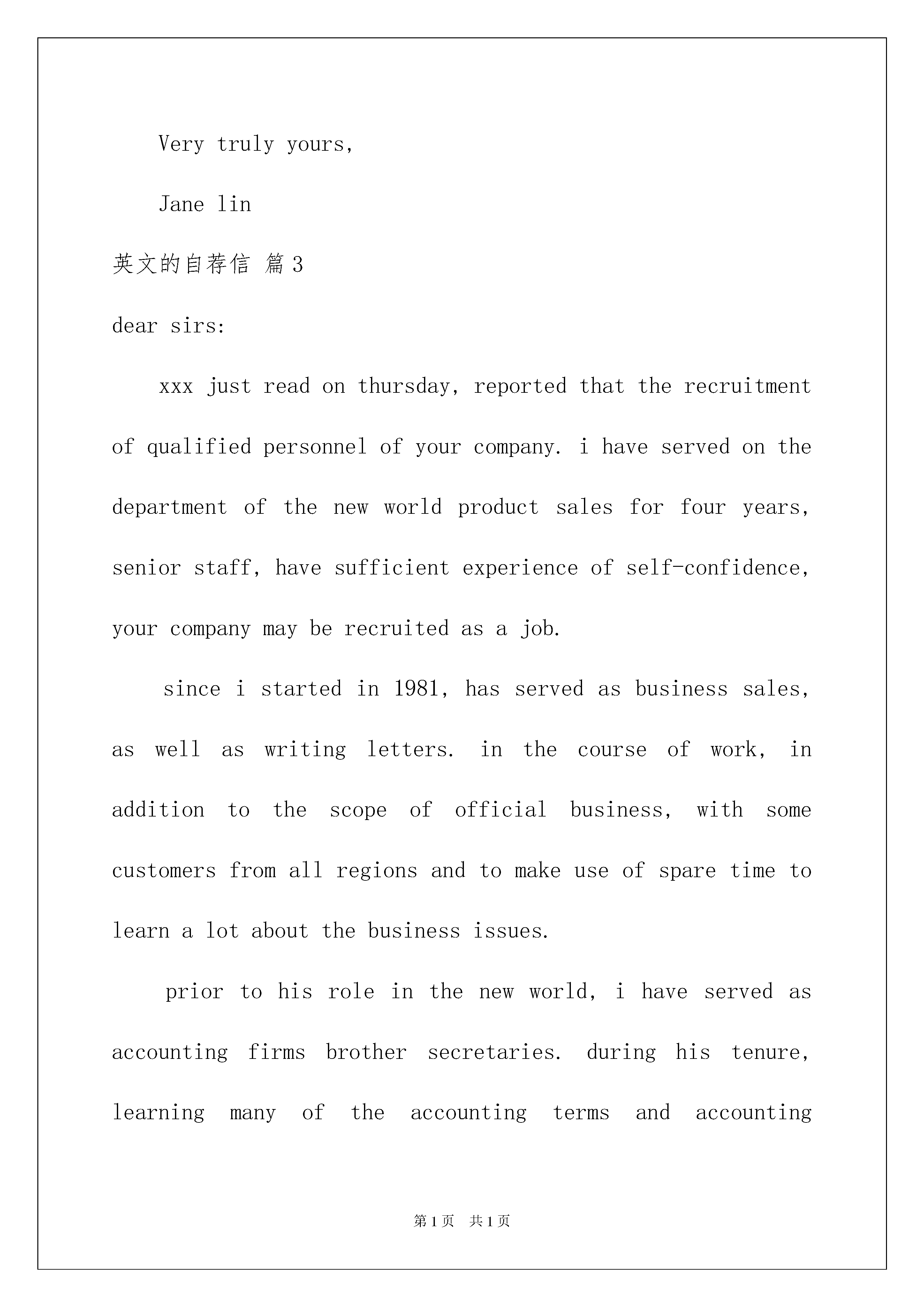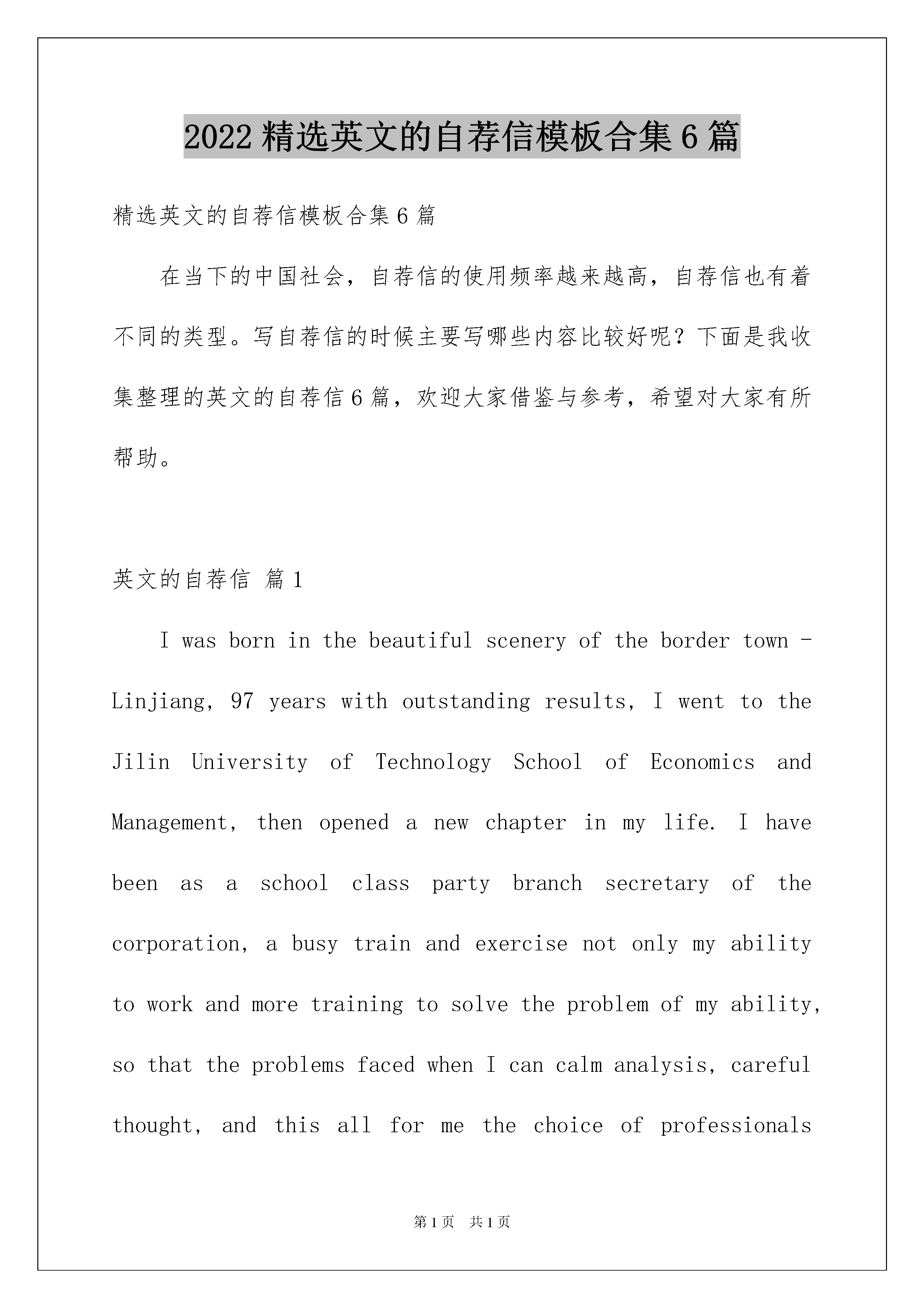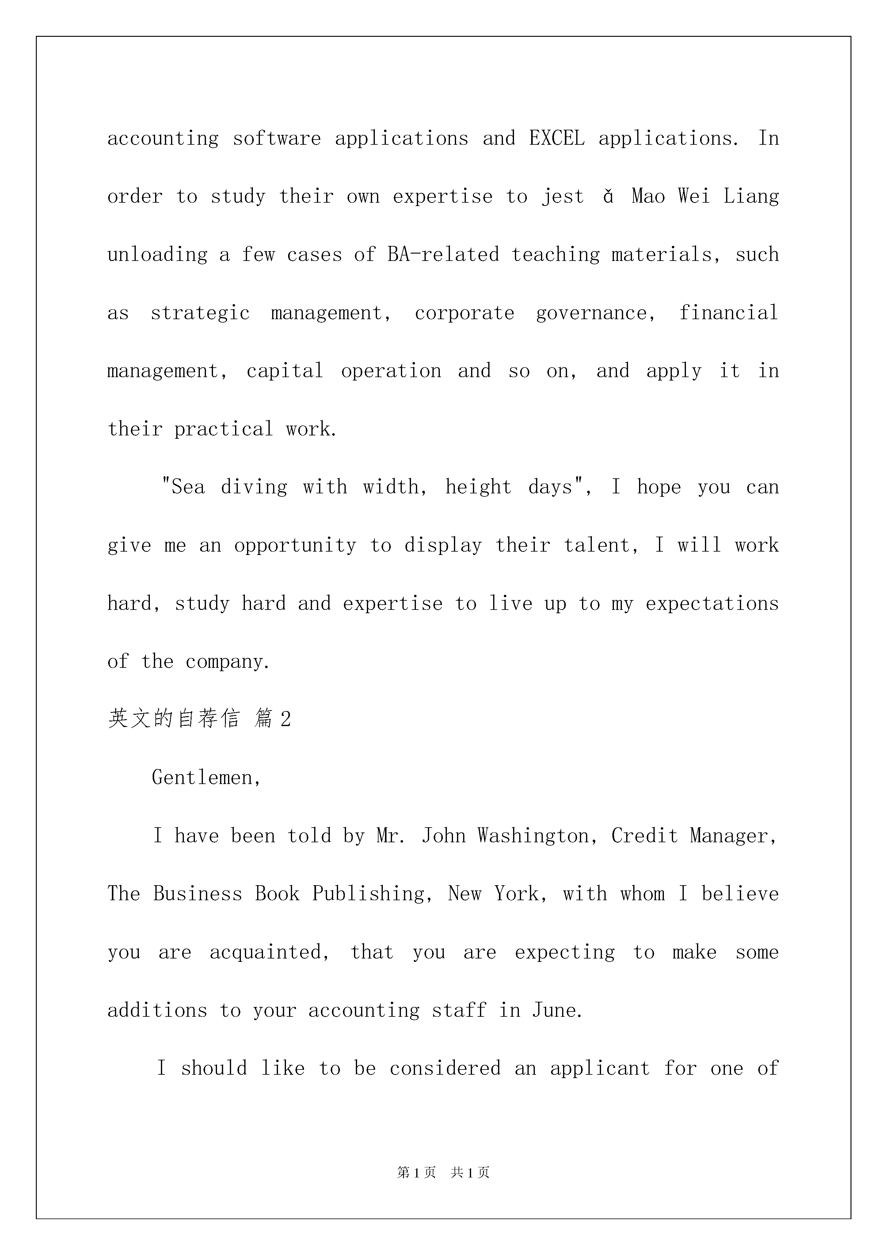 2022精选英文的自荐信模板合集6篇精选英文的自荐信模板合集6篇在当下的中国社会,自荐信的使用频率越来越高,自荐信也有着不同的类型。写自荐信的时候主要写哪些内容比较好呢?下面是我收集整理的英文的自荐信6篇,欢迎大家借鉴与参考,希望对大家有所帮助。英文的自荐信篇1Iwasborninthebeautifulsceneryofthebordertown-Linjiang,97yearswithoutstandingresults,IwenttotheJilinUniversityofTechnologySchoolofEconomicsandManagement,thenopenedanewchapterinmylife.Ihavebeenasaschoolclasspartybranchsecretaryofthecorporation,abusytrainandexercisenotonlymyabilitytoworkandmoretrainingtosolvetheproblemofmyability,sothattheproblemsfacedwhenIcancalmanalysis,carefulthought,andthisallformethechoiceofprofessionalshavehadaprofoundimpact.Idoagoodjobatthesametime,butalsoactivelyparticipateinschoolactivitiesandtoencouragestudentstoparticipate,fortheiradvice;ineverydaylife,Iwasabletocloselyunitethestudents,Ibelievethatthecollectiveforceisstrong,onlyweinordertodoagoodjob.Theneedsofsocialistmodernizationisacomprehensivequalitymanagementpersonnel,soIhavetolearnprofessionalknowledge,themainEnglishandcomputers,inEnglish,Iamtrainingtostrengthenmylistening,speaking,readingandwritingability;inthecomputer,theIstartfromthebasicknowledgetofurthergraspthevariousfunctionsoftheOFFICE,butalsoself-learningofbasicknowledgeoftheINTERNETcanbeusedflexibly.Professionalaftertheelections,inordertobroadentheirownknowledge,IalsoparticipatedinthestudyAccountingmasteredbasicaccountingsoftwareapplicationsandEXCELapplications.InordertostudytheirownexpertisetojestǎMaoWeiLiangunloadingafewcasesofBA-relatedteachingmaterials,suchasstrategicmanagement,corporategovernance,financialmanagement,capitaloperationandsoon,andapplyitintheirpracticalwork."Seadivingwithwidth,heightdays",Ihopeyoucangivemeanopportunitytodisplaytheirtalent,Iwillworkhard,studyhardandexpertisetoliveuptomyexpectationsofthecompany.英文的自荐信篇2Gentlemen,IhavebeentoldbyMr.JohnWashington,CreditManager,TheBusinessBookPublishing,NewYork,withwhomIbelieveyouareacquainted,thatyouareexpectingtomakesomeadditionstoyouraccountingstaffinJun