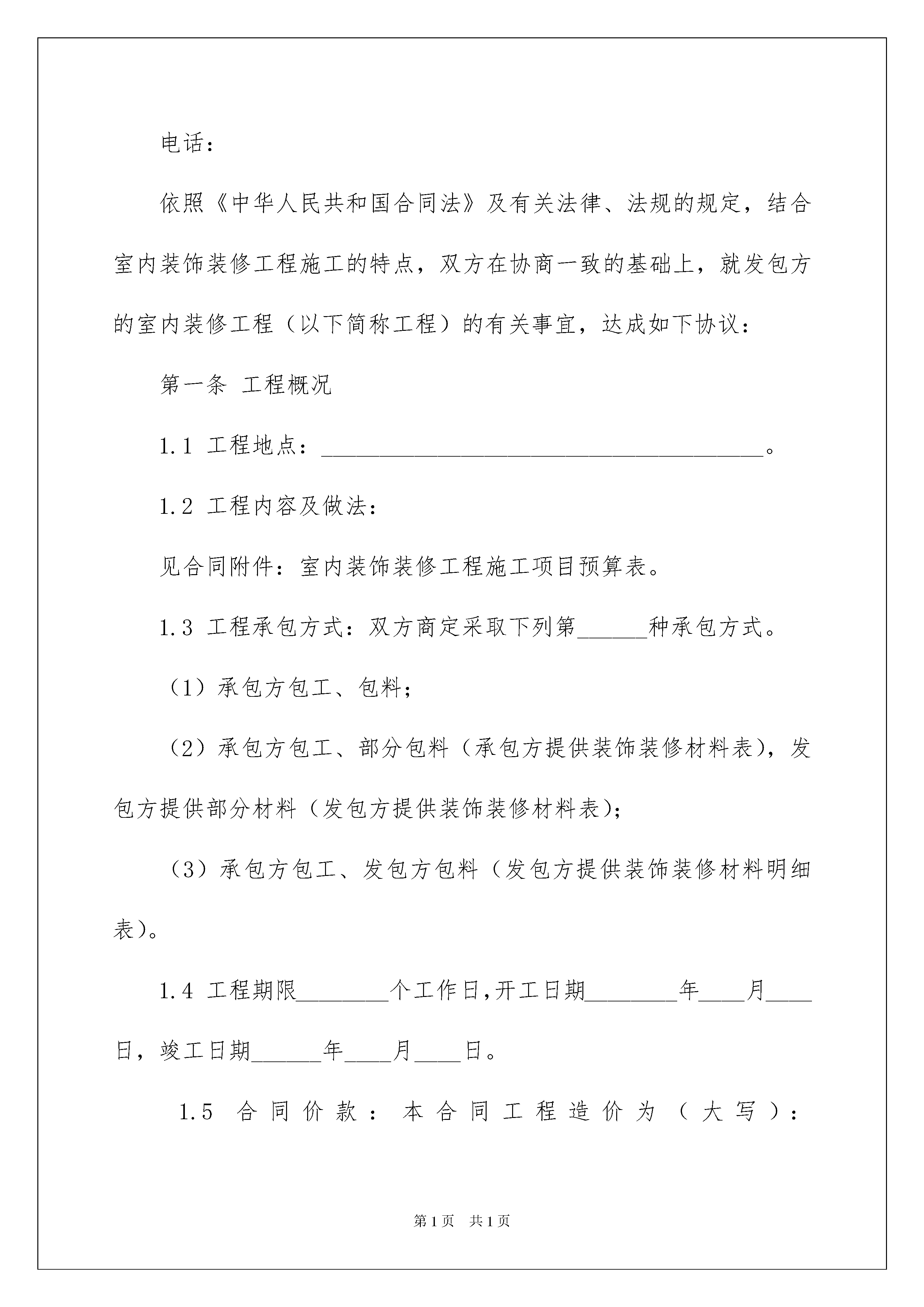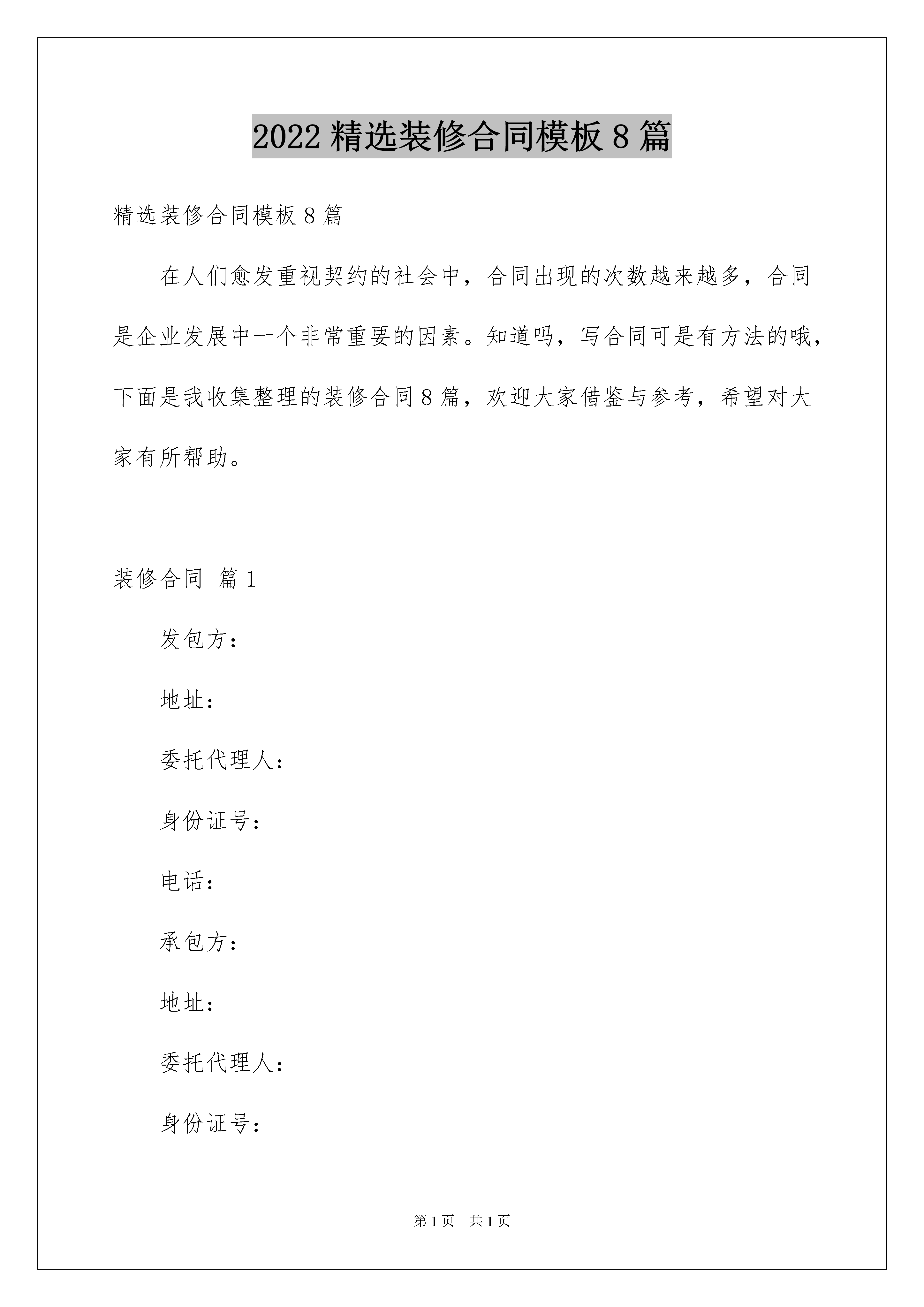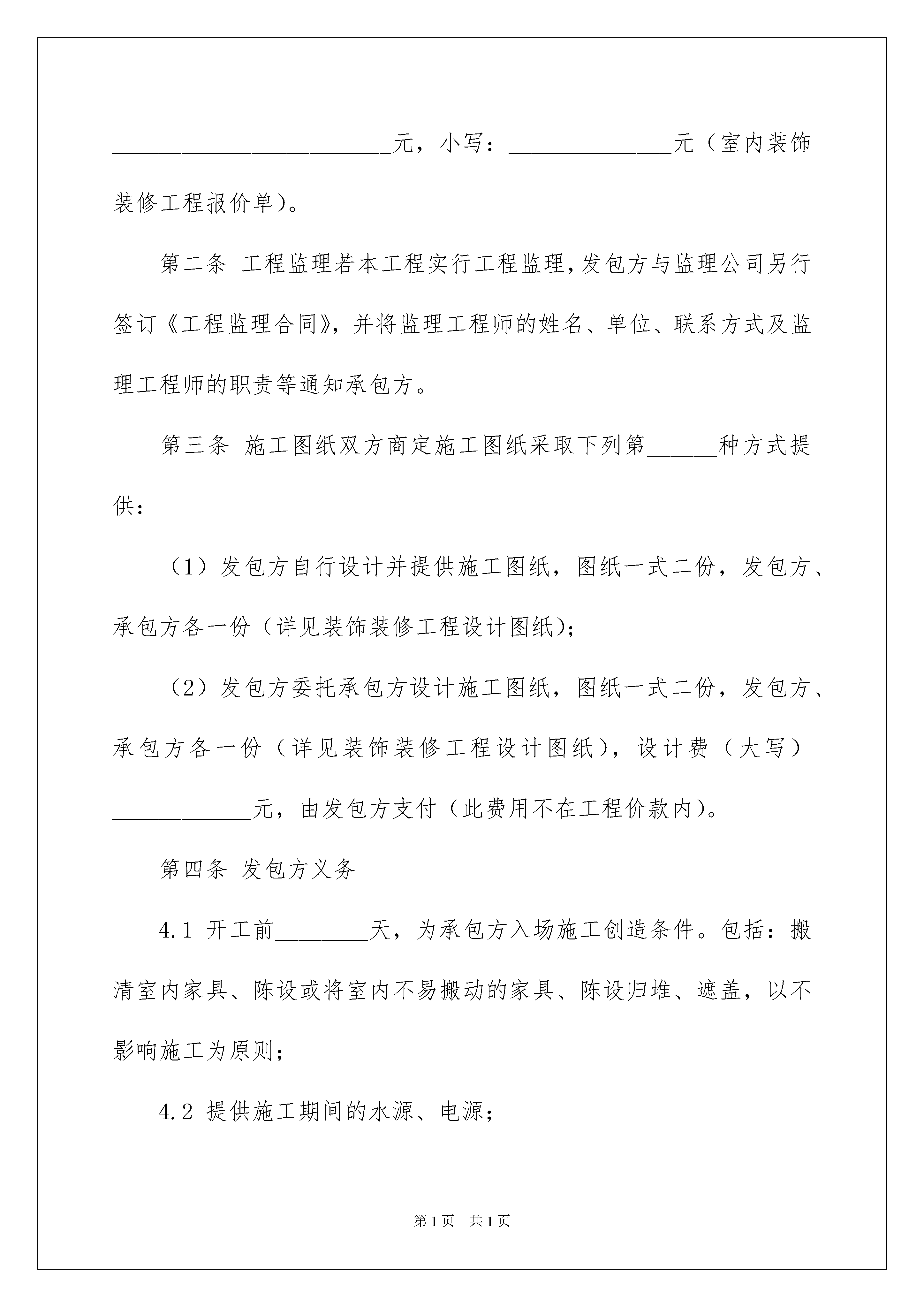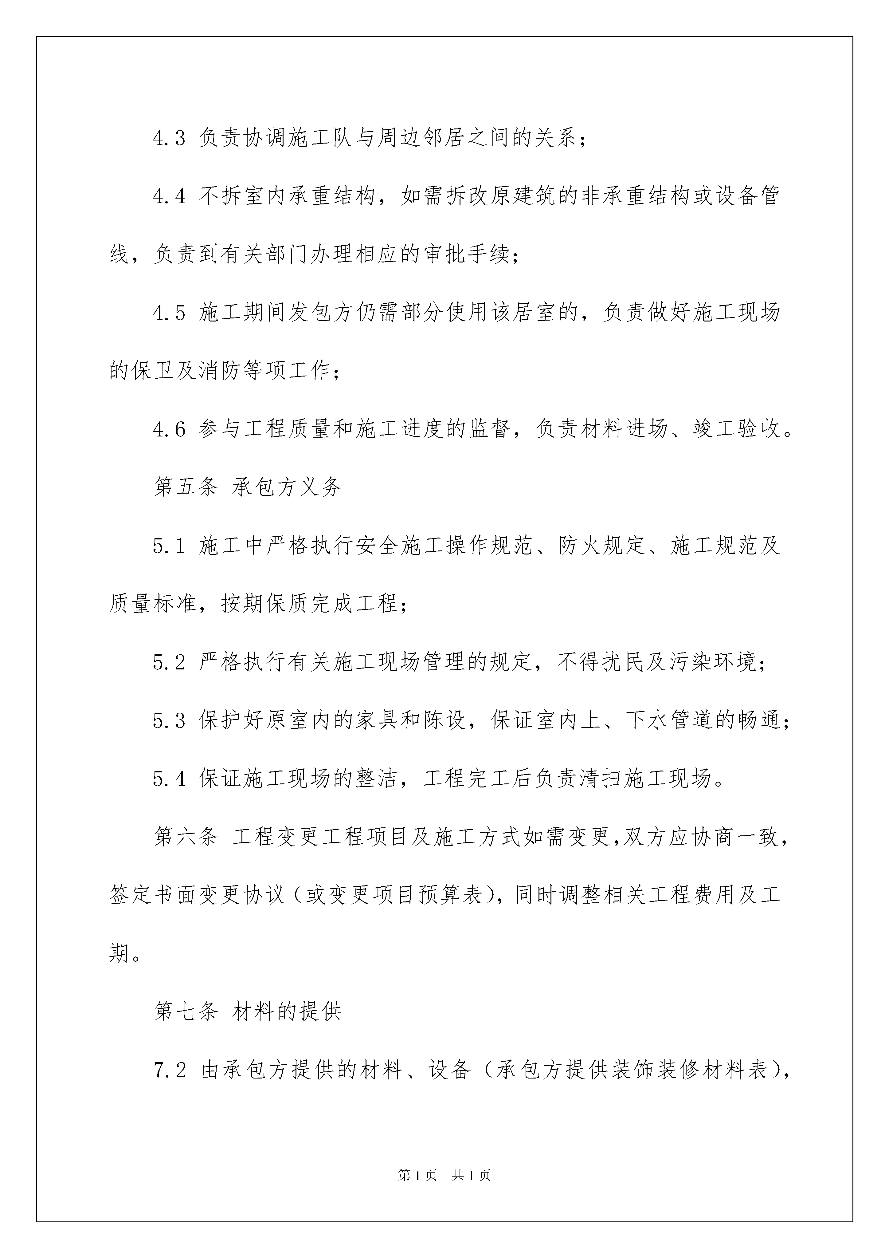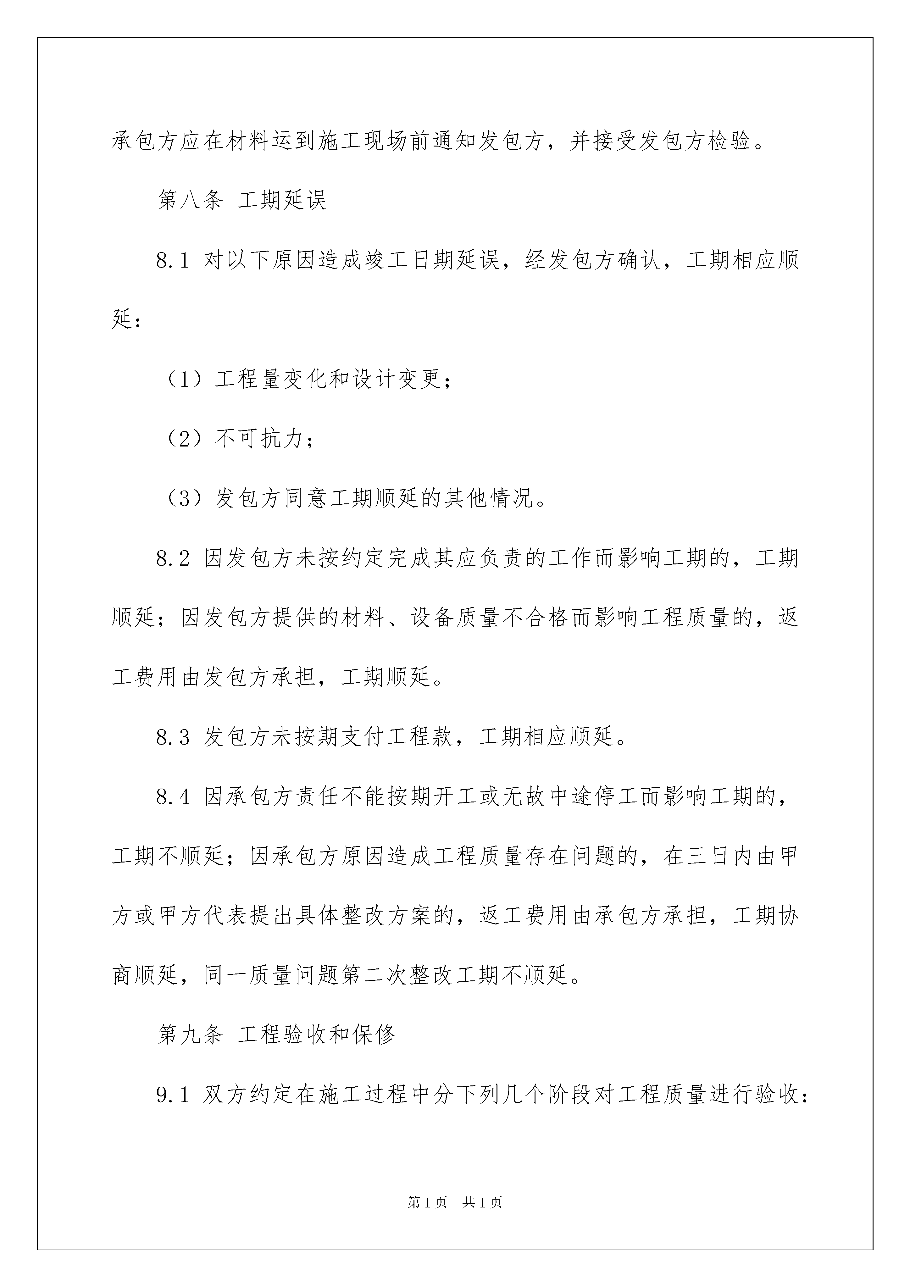2022精选装修合同模板8篇精选装修合同模板8篇在人们愈发重视契约的社会中,合同出现的次数越来越多,合同是企业发展中一个非常重要的因素。知道吗,写合同可是有方法的哦,下面是我收集整理的装修合同8篇,欢迎大家借鉴与参考,希望对大家有所帮助。装修合同篇1发包方:地址:委托代理人:身份证号:电话:承包方:地址:委托代理人:身份证号:电话:依照《中华人民共和国合同法》及有关法律、法规的规定,结合室内装饰装修工程施工的特点,双方在协商一致的基础上,就发包方的室内装修工程(以下简称工程)的有关事宜,达成如下协议:第一条工程概况1.1工程地点:______________________________________。1.2工程内容及做法:见合同附件:室内装饰装修工程施工项目预算表。1.3工程承包方式:双方商定采取下列第______种承包方式。(1)承包方包工、包料;(2)承包方包工、部分包料(承包方提供装饰装修材料表),发包方提供部分材料(发包方提供装饰装修材料表);(3)承包方包工、发包方包料(发包方提供装饰装修材料明细表)。1.4工程期限________个工作日,开工日期________年____月____日,竣工日期______年____月____日。1.5合同价款:本合同工程造价为(大写):________________________元,小写:______________元(室内装饰装修工程报价单)。第二条工程监理若本工程实行工程监理,发包方与监理公司另行签订《工程监理合同》,并将监理工程师的姓名、单位、联系方式及监理工程师的职责等通知承包方。第三条施工图纸双方商定施工图纸采取下列第______种方式提供:(1)发包方自行设计并提供施工图纸,图纸一式二份,发包方、承包方各一份(详见装饰装修工程设计图纸);(2)发包方委托承包方设计施工图纸,图纸一式二份,发包方、承包方各一份(详见装饰装修工程设计图纸),设计费(大写)____________元,由发包方支付(此费用不在工程价款内)。第四条发包方义务4.1开工前________天,为承包方入场施工创造条件。包括:搬清室内家具、陈设或将室内不易搬动的家具、陈设归堆、遮盖,以不影响施工为原则;4.2提供施工期间的水源、电源;4.3负责协调施工队与周边邻居之间的关系;4.4不拆室内承重结构,如需拆改原建筑的非承重结构或设备管线,负责到有关部门办理相应的审批手续;4.5施工期间发包方仍需部分使用该居室的,负责做好施工现场的保卫及消防等项工作;4.6参与工程质量和施工进度的监督,负责材料进场、竣工验收。第五条承包方义务5.1施工中严格执行安全施工操作规范、防火规定、施工规范及质量标准,按期保质完成工程;5.2严格执行有关施工现场管理的规定,不得扰民及污染环境;5.3保护好原室内的家具和陈设,保证室内上、下水管道的畅通;5.4保证施工现场的整洁,工程完工后负责清扫施工现场。第六条工程变更工程项目及施工方式如需变更,双方应协商一致,签定书面变更协议(或变更项目预算表),同时调整相关工程费用及工期。第七条材料的提供7.2由承包方提供的材料、设备(承包方提供装饰装修材料表),承包方应在材料运到施工现场前通知发包方,并接受发包方检验。第八条工期延误8.1对以下原因造成竣工日期延误,经发包方确认,工期相应顺延:(1)工程量变化和设计变更;(2)不可抗力;(3)发包方同意工期顺延的其他情况。8.2因发包方未按约定完成其应负责的工作而影响工期的,工期顺延;因发包方提供的材料、设备质量不合格而影响工程质量的,返工费用由发包方承担,工期顺延。8.3发包方未按期支付工程款,工期相应顺延。8.4因承包方责任不能按期开工或无故中途停工而影响工期的,工期不顺延;因承包方原因造成工程质量存在问题的,在三日内由甲方或甲方代表提出具体整改方案的,返工费用由承包方承担,工期协商顺延,同一质量问题第二次整改工期不顺延。第九条工程验收和保修9.1双方约定在施工过程中分下列几个阶段对工程质量进行验收:(1)水电施工改造完工;开关插座定位验收;防水层经48小时试水不漏;(2)泥工粉砌新墙完毕,墙、地砖铺贴完工;(3)木工吊顶,木制品完工;(4)油漆工程完工;(5)全部工程完工。承包方应提前两天通知发包方进行验收,阶段验收合格后应填写工程验收单(室内装饰装修工程验收单)。9.2工程竣工后,承包方应通知发包方验收,发包方应自接到验收通知后两天内组织验收,填写工程验收单(室内装饰装修工程验收单)。在工程款结清后,办理移交手续。9.3本工程自验收合格双方签字之日起保修期为12个月,1