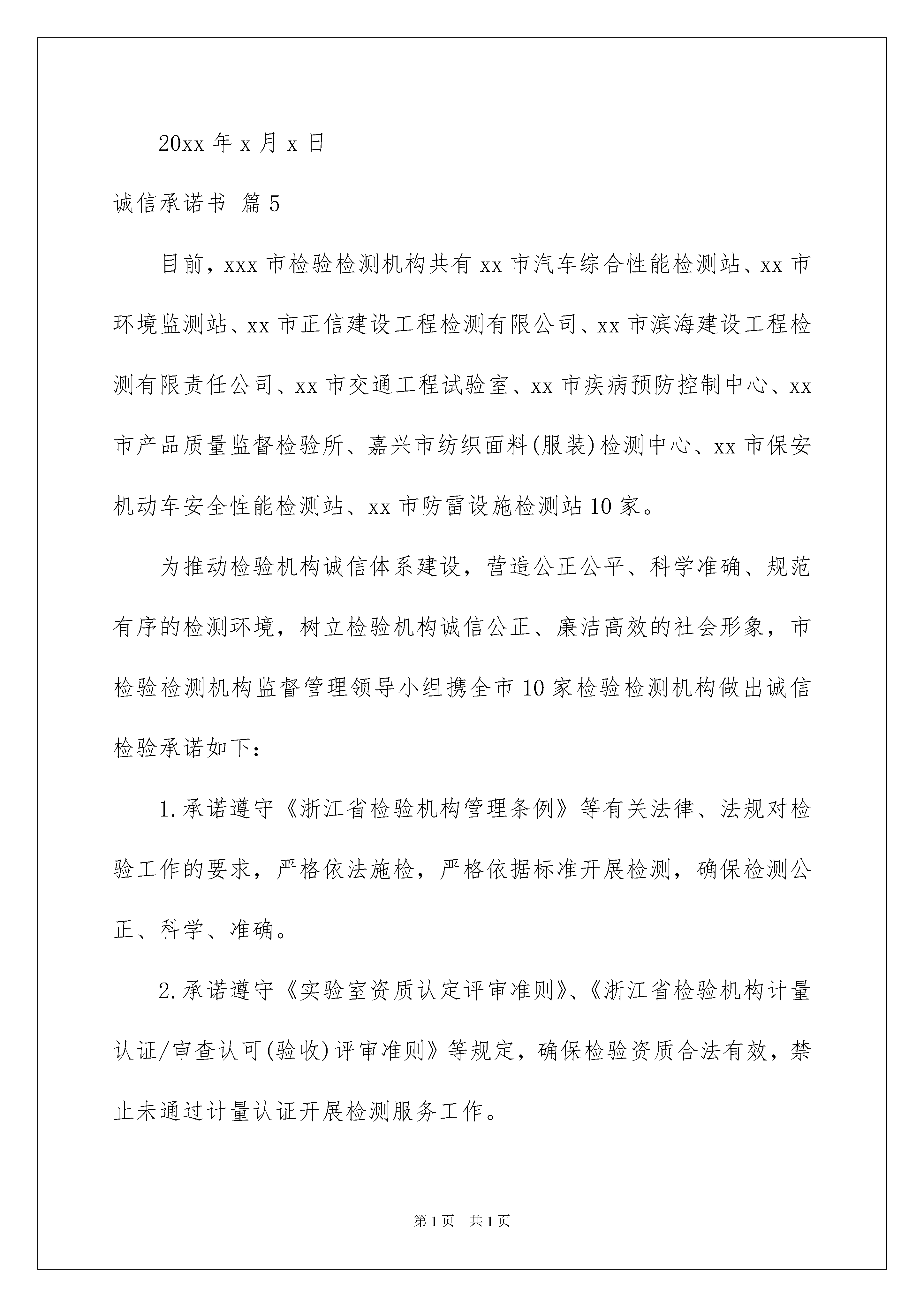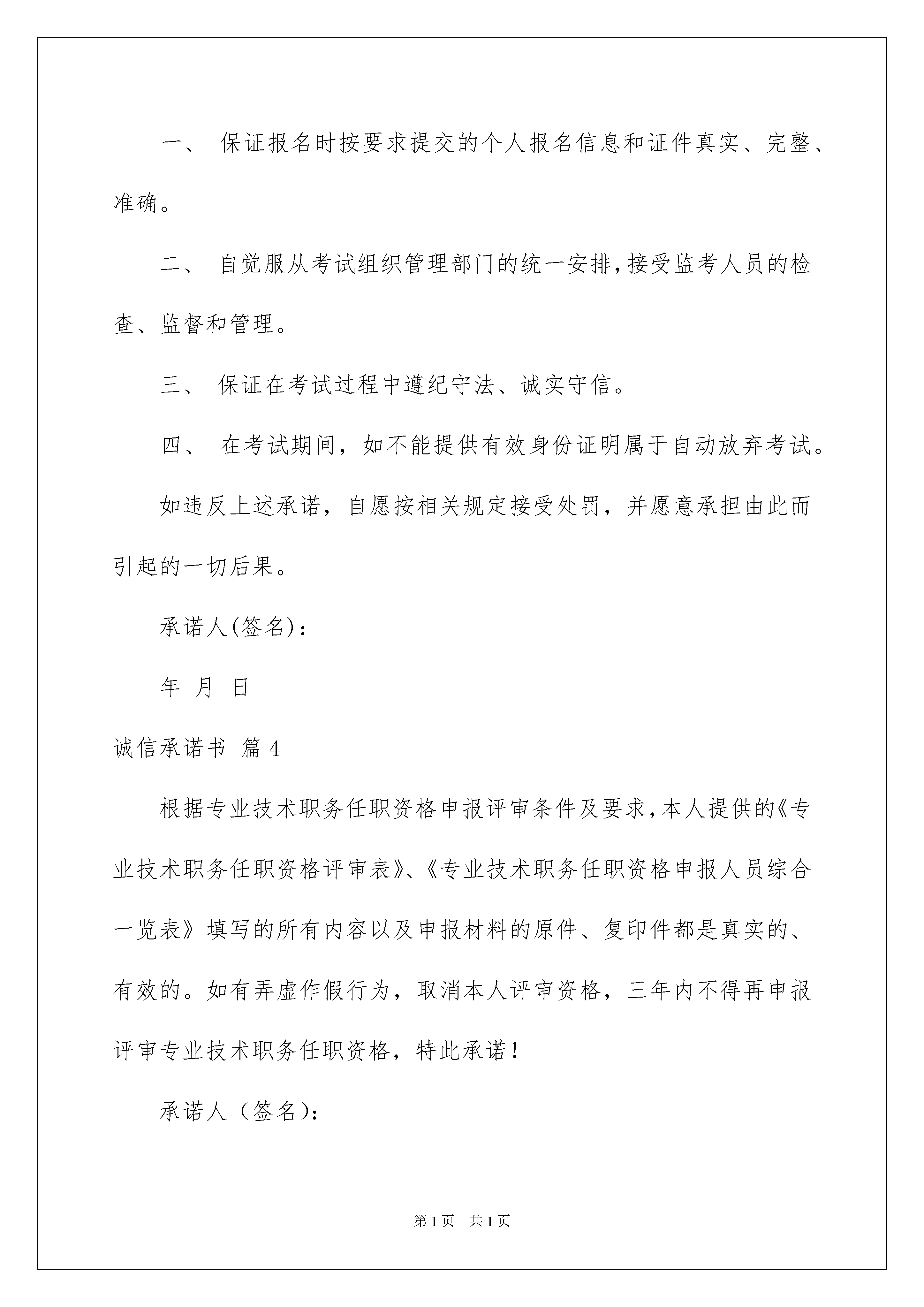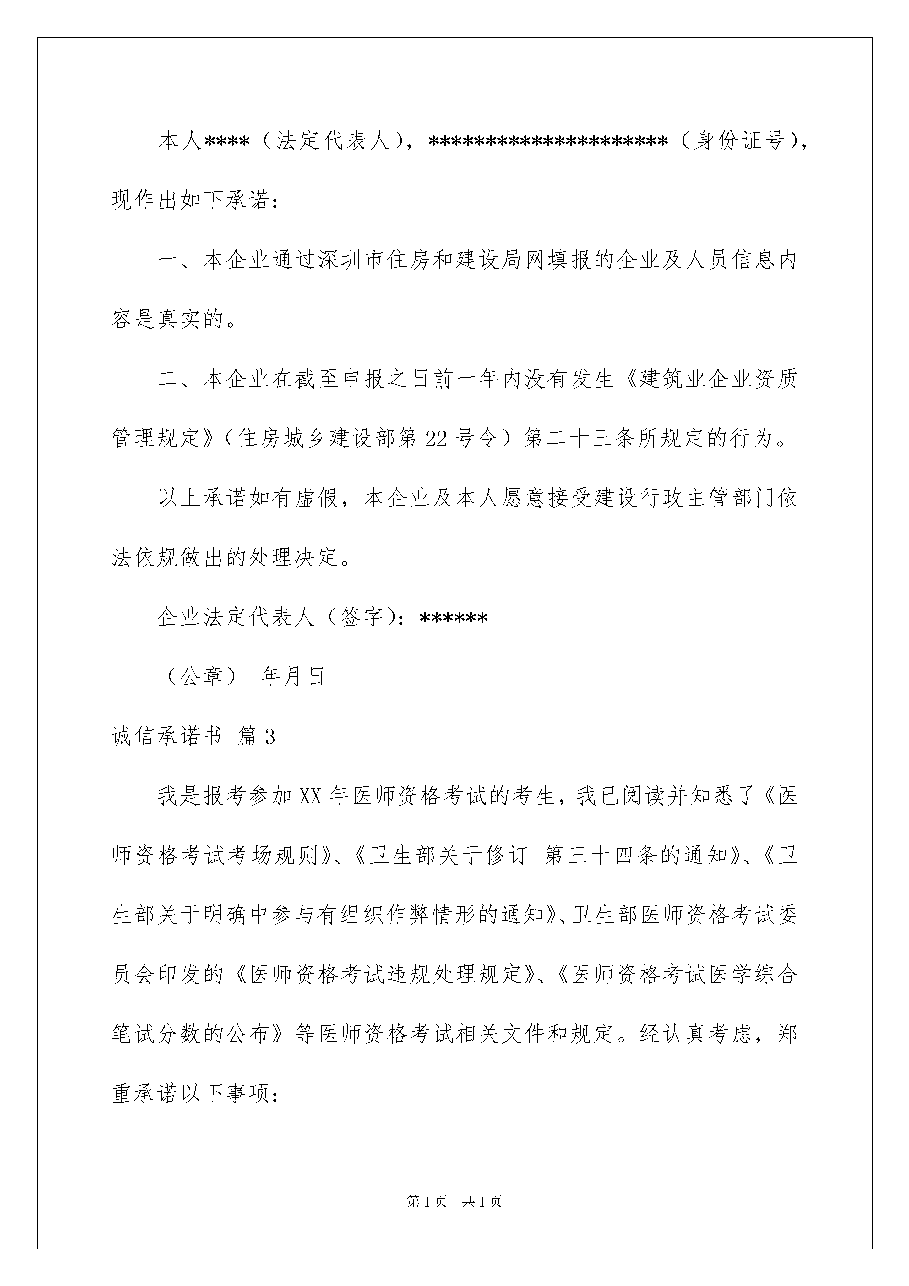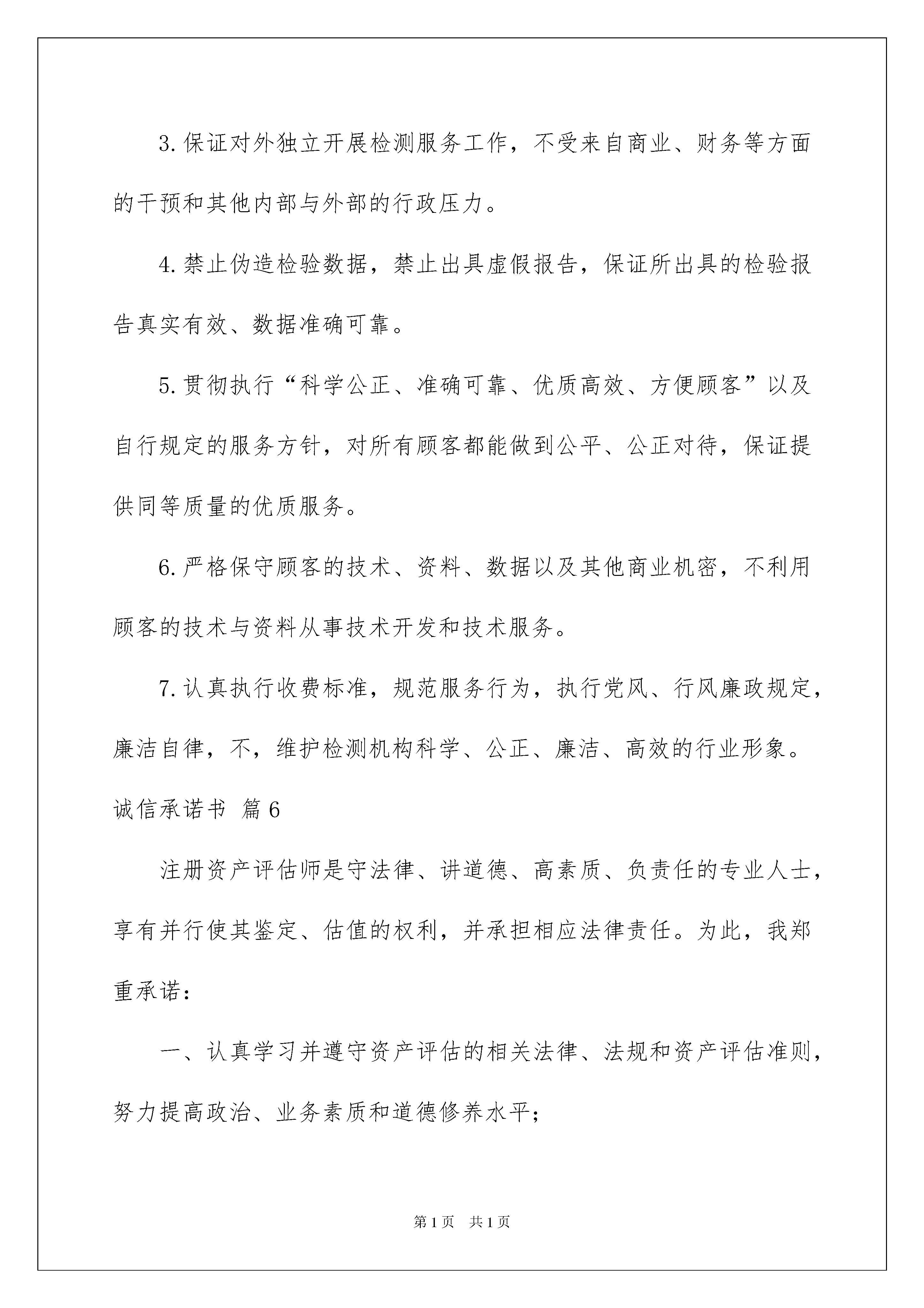 2022精选诚信承诺书十篇精选诚信承诺书十篇在当下社会,很多地方都会使用到承诺书,承诺书是签署人内心真实意愿的表示,忌搞形式、走过场,忌出于无奈。还是对承诺书一筹莫展吗?以下是我为大家整理的诚信承诺书10篇,仅供参考,欢迎大家阅读。诚信承诺书篇1根据国家、省、市人事职改部门制定出台的评审条件及要求,本人承诺在申报评审(或通过考试获得)专业技术职务任职资格过程中诚实守信,所提交的《专业技术职务任职资格评审表》、《评审专业技术职务任职资格简表》填写的所有内容以及其它申报材料的原件、复印件都是真实、准确、有效的。如有弄虚作假、违法、违纪、违规行为,自愿取消本人评审(考试)资格,三年内不得再申报评审考试,并自愿承担因此造成的一切相关责任及后果,接受相应处罚。申报人签名:诚信承诺书篇2本人****(法定代表人),*********************(身份证号),现作出如下承诺:一、本企业通过深圳市住房和建设局网填报的企业及人员信息内容是真实的。二、本企业在截至申报之日前一年内没有发生《建筑业企业资质管理规定》(住房城乡建设部第22号令)第二十三条所规定的行为。以上承诺如有虚假,本企业及本人愿意接受建设行政主管部门依法依规做出的处理决定。企业法定代表人(签字):******(公章)年月日诚信承诺书篇3我是报考参加XX年医师资格考试的考生,我已阅读并知悉了《医师资格考试考场规则》、《卫生部关于修订第三十四条的通知》、《卫生部关于明确中参与有组织作弊情形的通知》、卫生部医师资格考试委员会印发的《医师资格考试违规处理规定》、《医师资格考试医学综合笔试分数的公布》等医师资格考试相关文件和规定。经认真考虑,郑重承诺以下事项:一、保证报名时按要求提交的个人报名信息和证件真实、完整、准确。二、自觉服从考试组织管理部门的统一安排,接受监考人员的检查、监督和管理。三、保证在考试过程中遵纪守法、诚实守信。四、在考试期间,如不能提供有效身份证明属于自动放弃考试。如违反上述承诺,自愿按相关规定接受处罚,并愿意承担由此而引起的一切后果。承诺人(签名):年月日诚信承诺书篇4根据专业技术职务任职资格申报评审条件及要求,本人提供的《专业技术职务任职资格评审表》、《专业技术职务任职资格申报人员综合一览表》填写的所有内容以及申报材料的原件、复印件都是真实的、有效的。如有弄虚作假行为,取消本人评审资格,三年内不得再申报评审专业技术职务任职资格,特此承诺!承诺人(签名):20xx年x月x日诚信承诺书篇5目前,xxx市检验检测机构共有xx市汽车综合性能检测站、xx市环境监测站、xx市正信建设工程检测有限公司、xx市滨海建设工程检测有限责任公司、xx市交通工程试验室、xx市疾病预防控制中心、xx市产品质量监督检验所、嘉兴市纺织面料(服装)检测中心、xx市保安机动车安全性能检测站、xx市防雷设施检测站10家。为推动检验机构诚信体系建设,营造公正公平、科学准确、规范有序的检测环境,树立检验机构诚信公正、廉洁高效的社会形象,市检验检测机构监督管理领导小组携全市10家检验检测机构做出诚信检验承诺如下:1.承诺遵守《浙江省检验机构管理条例》等有关法律、法规对检验工作的要求,严格依法施检,严格依据标准开展检测,确保检测公正、科学、准确。2.承诺遵守《实验室资质认定评审准则》、《浙江省检验机构计量认证/审查认可(验收)评审准则》等规定,确保检验资质合法有效,禁止未通过计量认证开展检测服务工作。3.保证对外独立开展检测服务工作,不受来自商业、财务等方面的干预和其他内部与外部的行政压力。4.禁止伪造检验数据,禁止出具虚假报告,保证所出具的检验报告真实有效、数据准确可靠。5.贯彻执行“科学公正、准确可靠、优质高效、方便顾客”以及自行规定的服务方针,对所有顾客都能做到公平、公正对待,保证提供同等质量的优质服务。6.严格保守顾客的技术、资料、数据以及其他商业机密,不利用顾客的技术与资料从事技术开发和技术服务。7.认真执行收费标准,规范服务行为,执行党风、行风廉政规定,廉洁自律,不,维护检测机构科学、公正、廉洁、高效的行业形象。诚信承诺书篇6注册资产评估师是守法律、讲道德、高素质、负责任的专业人士,享有并行使其鉴定、估值的权利,并承担相应法律责任。为此,我郑重承诺:一、认真学习并遵守资产评估的相关法律、法规和资产评估准则,努力提高政治、业务素质和道德修养水平;二、恪守“独立、客观、公正”的执业原则,执业过程中不受委托方或相关当事方影响,积极维护资产评估各方当事人的合法权益;三、坚持“诚信为本,操守为重”的执业理念,诚实正直,勤勉尽责,不弄虚作假,