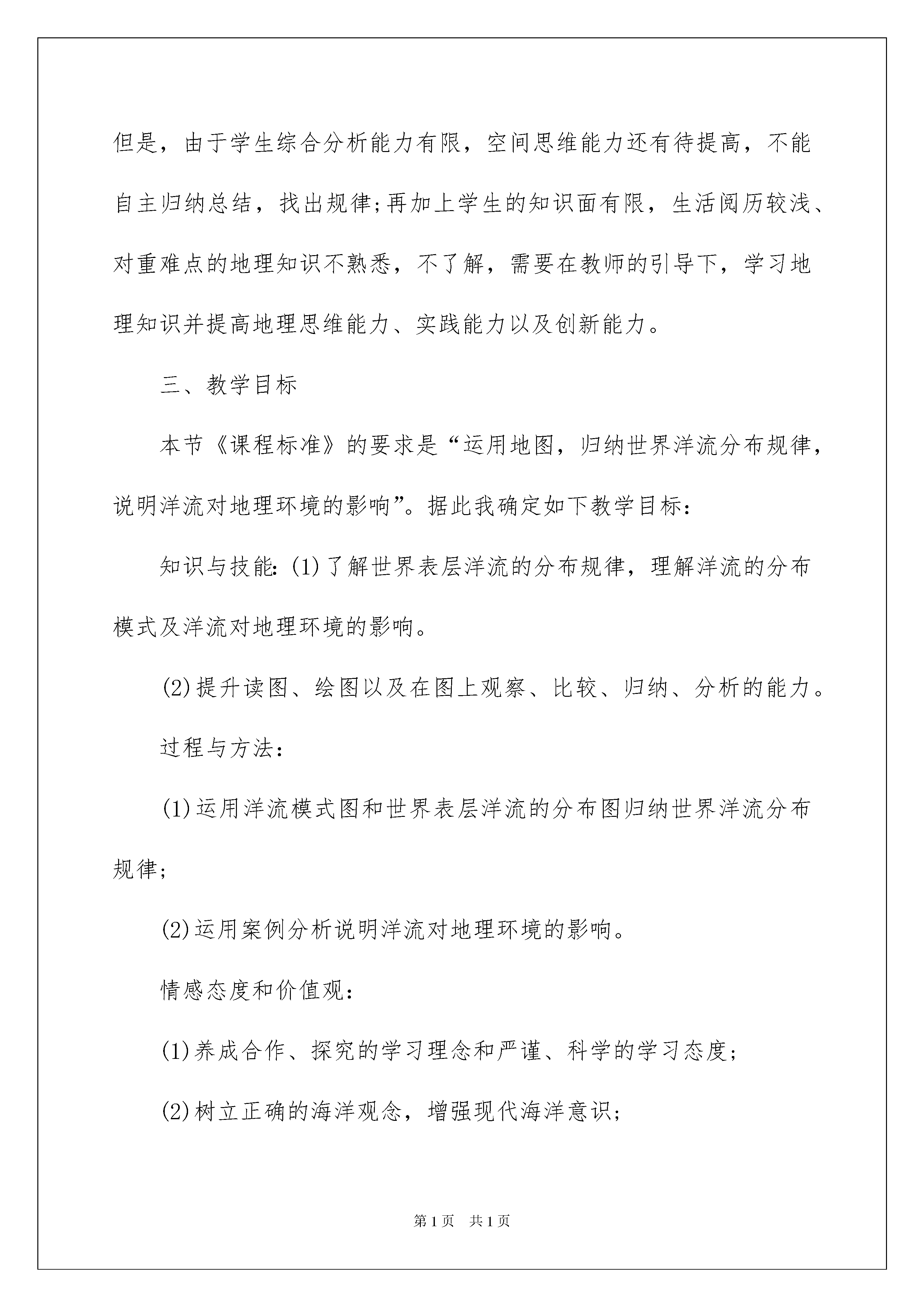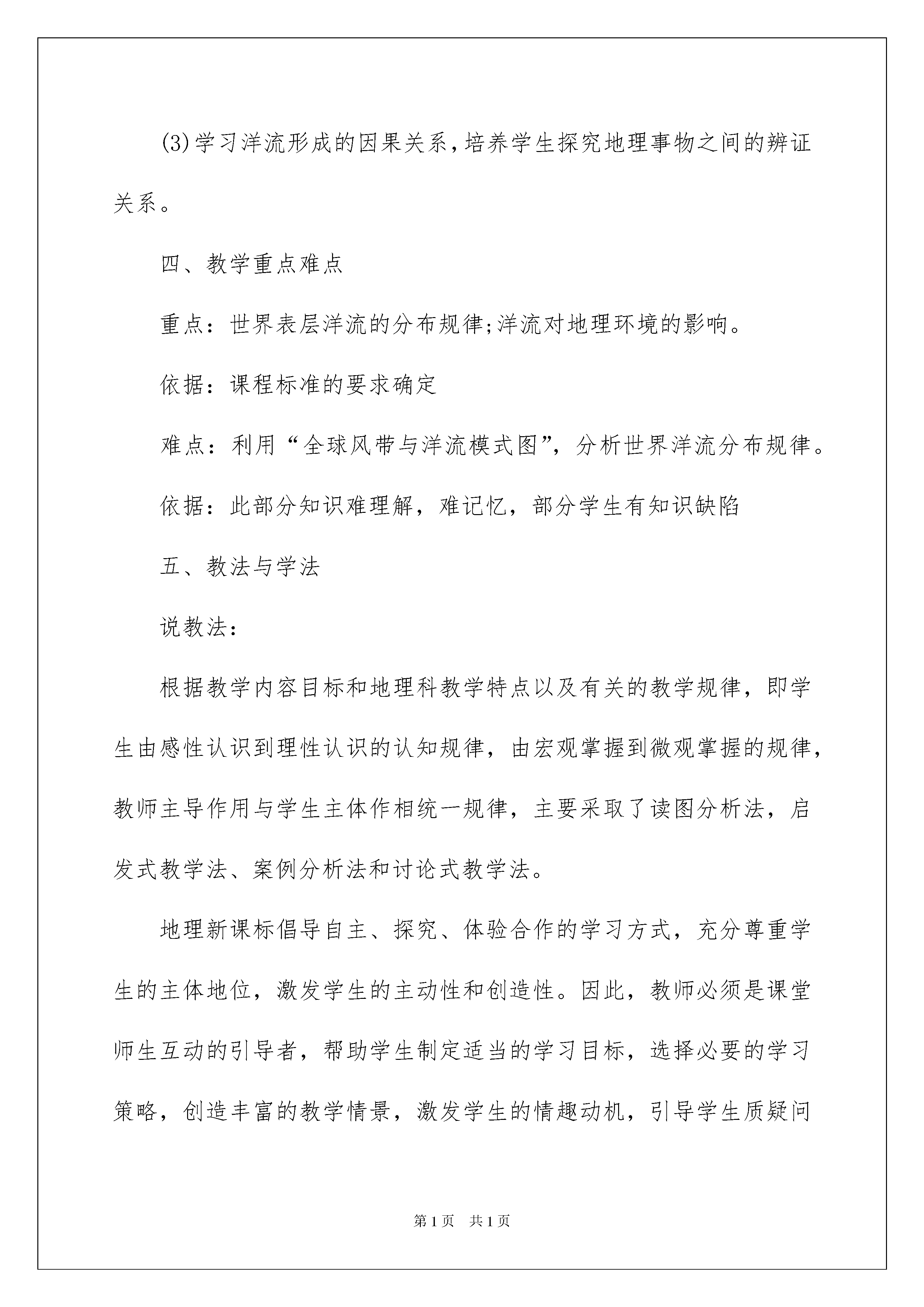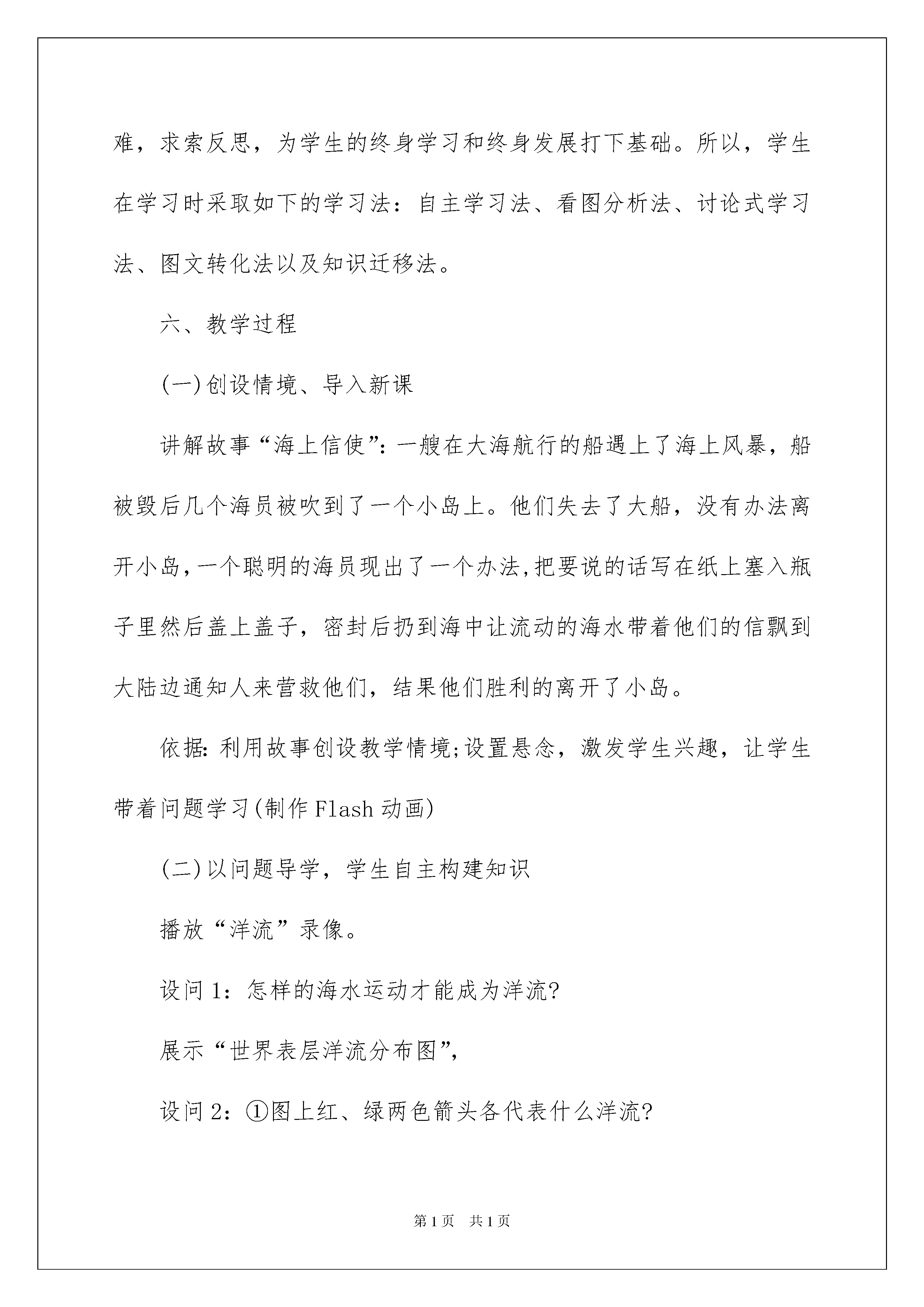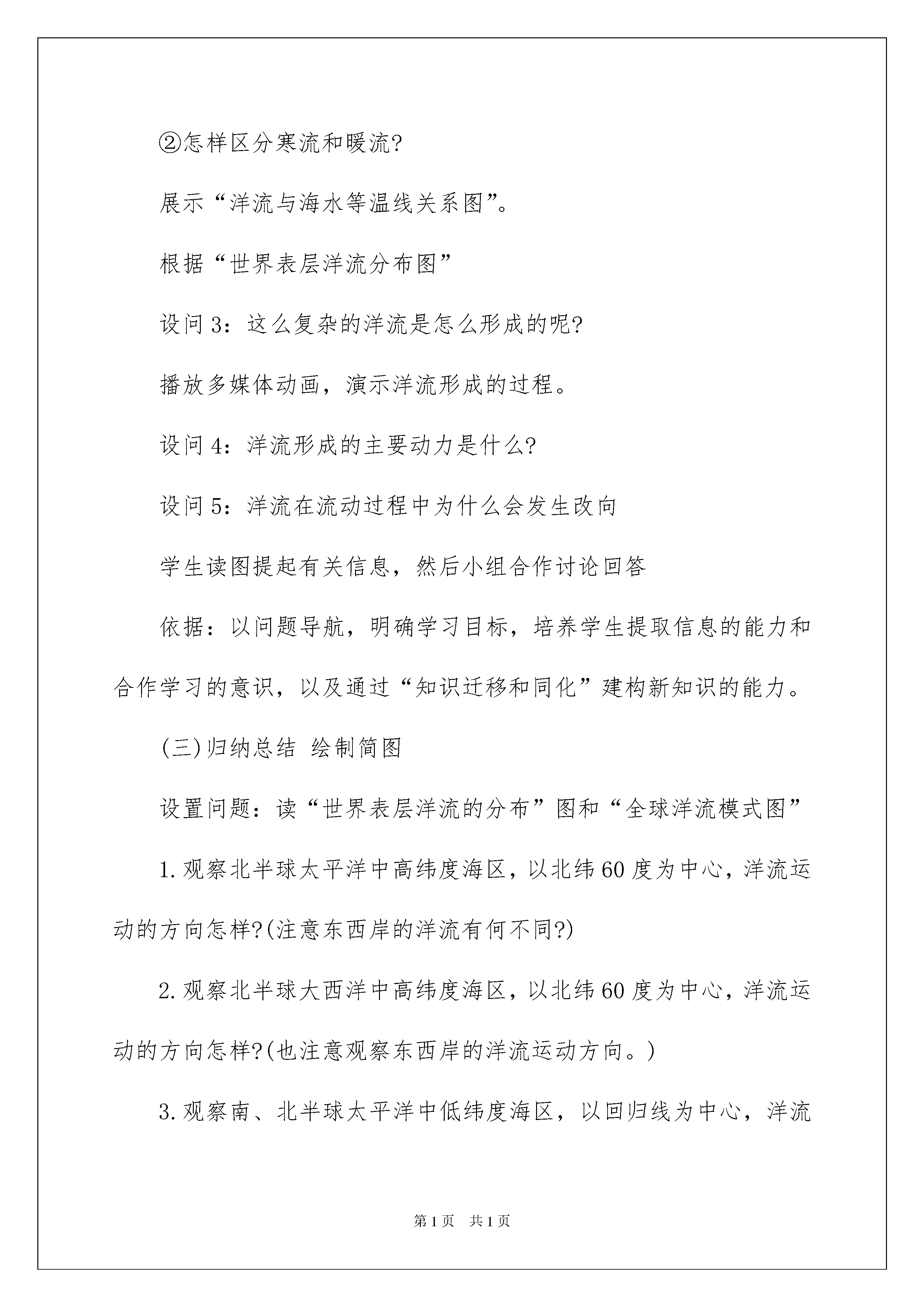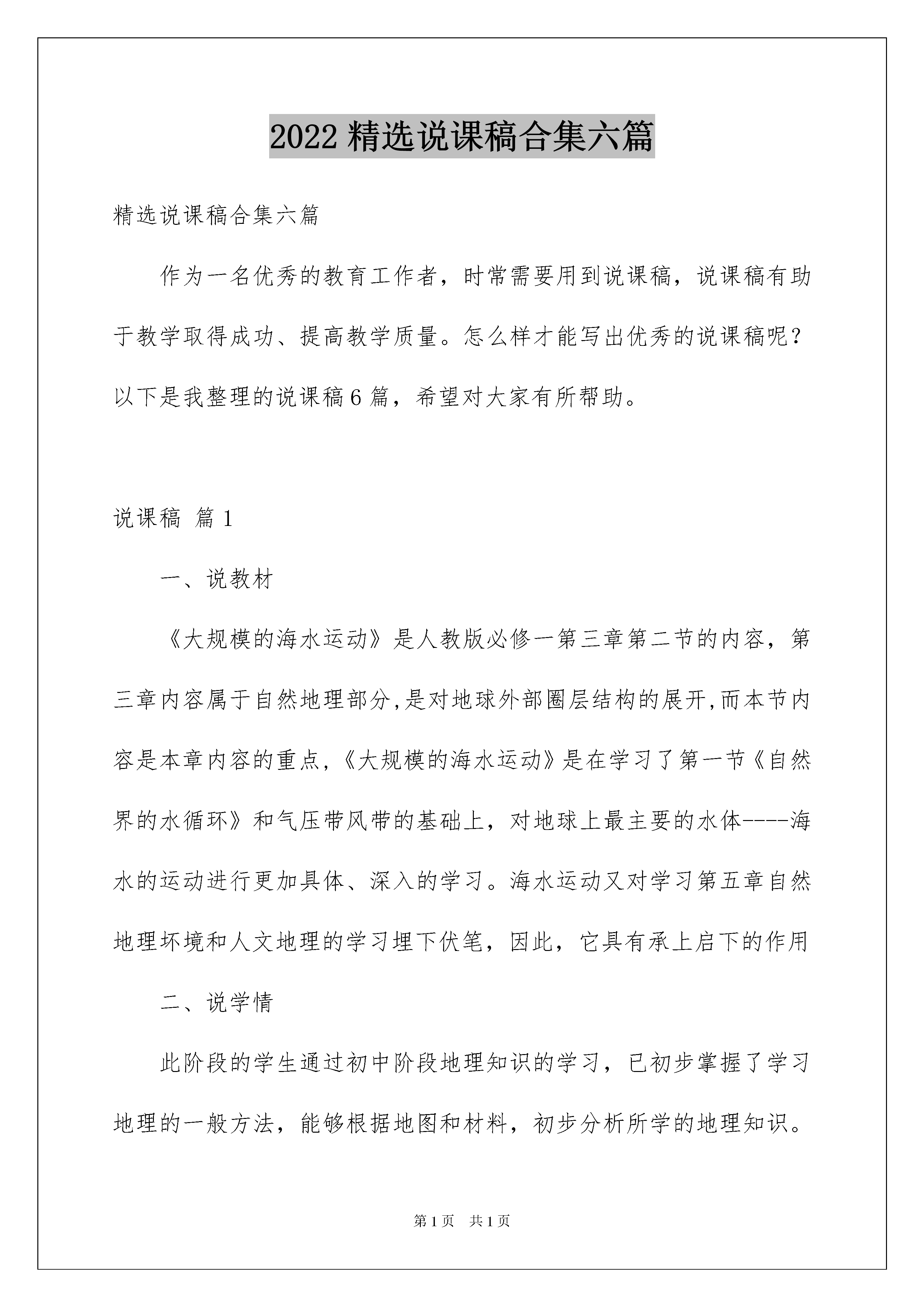 2022精选说课稿合集六篇精选说课稿合集六篇作为一名优秀的教育工作者,时常需要用到说课稿,说课稿有助于教学取得成功、提高教学质量。怎么样才能写出优秀的说课稿呢?以下是我整理的说课稿6篇,希望对大家有所帮助。说课稿篇1一、说教材《大规模的海水运动》是人教版必修一第三章第二节的内容,第三章内容属于自然地理部分,是对地球外部圈层结构的展开,而本节内容是本章内容的重点,《大规模的海水运动》是在学习了第一节《自然界的水循环》和气压带风带的基础上,对地球上最主要的水体----海水的运动进行更加具体、深入的学习。海水运动又对学习第五章自然地理坏境和人文地理的学习埋下伏笔,因此,它具有承上启下的作用二、说学情此阶段的学生通过初中阶段地理知识的学习,已初步掌握了学习地理的一般方法,能够根据地图和材料,初步分析所学的地理知识。但是,由于学生综合分析能力有限,空间思维能力还有待提高,不能自主归纳总结,找出规律;再加上学生的知识面有限,生活阅历较浅、对重难点的地理知识不熟悉,不了解,需要在教师的引导下,学习地理知识并提高地理思维能力、实践能力以及创新能力。三、教学目标本节《课程标准》的要求是“运用地图,归纳世界洋流分布规律,说明洋流对地理环境的影响”。据此我确定如下教学目标:知识与技能:(1)了解世界表层洋流的分布规律,理解洋流的分布模式及洋流对地理环境的影响。(2)提升读图、绘图以及在图上观察、比较、归纳、分析的能力。过程与方法:(1)运用洋流模式图和世界表层洋流的分布图归纳世界洋流分布规律;(2)运用案例分析说明洋流对地理环境的影响。情感态度和价值观:(1)养成合作、探究的学习理念和严谨、科学的学习态度;(2)树立正确的海洋观念,增强现代海洋意识;(3)学习洋流形成的因果关系,培养学生探究地理事物之间的辨证关系。四、教学重点难点重点:世界表层洋流的分布规律;洋流对地理环境的影响。依据:课程标准的要求确定难点:利用“全球风带与洋流模式图”,分析世界洋流分布规律。依据:此部分知识难理解,难记忆,部分学生有知识缺陷五、教法与学法说教法:根据教学内容目标和地理科教学特点以及有关的教学规律,即学生由感性认识到理性认识的认知规律,由宏观掌握到微观掌握的规律,教师主导作用与学生主体作相统一规律,主要采取了读图分析法,启发式教学法、案例分析法和讨论式教学法。地理新课标倡导自主、探究、体验合作的学习方式,充分尊重学生的主体地位,激发学生的主动性和创造性。因此,教师必须是课堂师生互动的引导者,帮助学生制定适当的学习目标,选择必要的学习策略,创造丰富的教学情景,激发学生的情趣动机,引导学生质疑问难,求索反思,为学生的终身学习和终身发展打下基础。所以,学生在学习时采取如下的学习法:自主学习法、看图分析法、讨论式学习法、图文转化法以及知识迁移法。六、教学过程(一)创设情境、导入新课讲解故事“海上信使”:一艘在大海航行的船遇上了海上风暴,船被毁后几个海员被吹到了一个小岛上。他们失去了大船,没有办法离开小岛,一个聪明的海员现出了一个办法,把要说的话写在纸上塞入瓶子里然后盖上盖子,密封后扔到海中让流动的海水带着他们的信飘到大陆边通知人来营救他们,结果他们胜利的离开了小岛。依据:利用故事创设教学情境;设置悬念,激发学生兴趣,让学生带着问题学习(制作Flash动画)(二)以问题导学,学生自主构建知识播放“洋流”录像。设问1:怎样的海水运动才能成为洋流?展示“世界表层洋流分布图”,设问2:①图上红、绿两色箭头各代表什么洋流?②怎样区分寒流和暖流?展示“洋流与海水等温线关系图”。根据“世界表层洋流分布图”设问3:这么复杂的洋流是怎么形成的呢?播放多媒体动画,演示洋流形成的过程。设问4:洋流形成的主要动力是什么?设问5:洋流在流动过程中为什么会发生改向学生读图提起有关信息,然后小组合作讨论回答依据:以问题导航,明确学习目标,培养学生提取信息的能力和合作学习的意识,以及通过“知识迁移和同化”建构新知识的能力。(三)归纳总结绘制简图设置问题:读“世界表层洋流的分布”图和“全球洋流模式图”1.观察北半球太平洋中高纬度海区,以北纬60度为中心,洋流运动的方向怎样?(注意东西岸的洋流有何不同?)2.观察北半球大西洋中高纬度海区,以北纬60度为中心,洋流运动的方向怎样?(也注意观察东西岸的洋流运动方向。)3.观察南、北半球太平洋中低纬度海区,以回归线为中心,洋流运动方向怎样?还有其他大洋与其类似吗?你能归纳出它们的规律吗学生活动:学生读图,从图中提取相关信息,归纳总结世界表层洋流的分布规律。将归纳出的洋流分布画成简单的模式图。(提示:注意纬度位